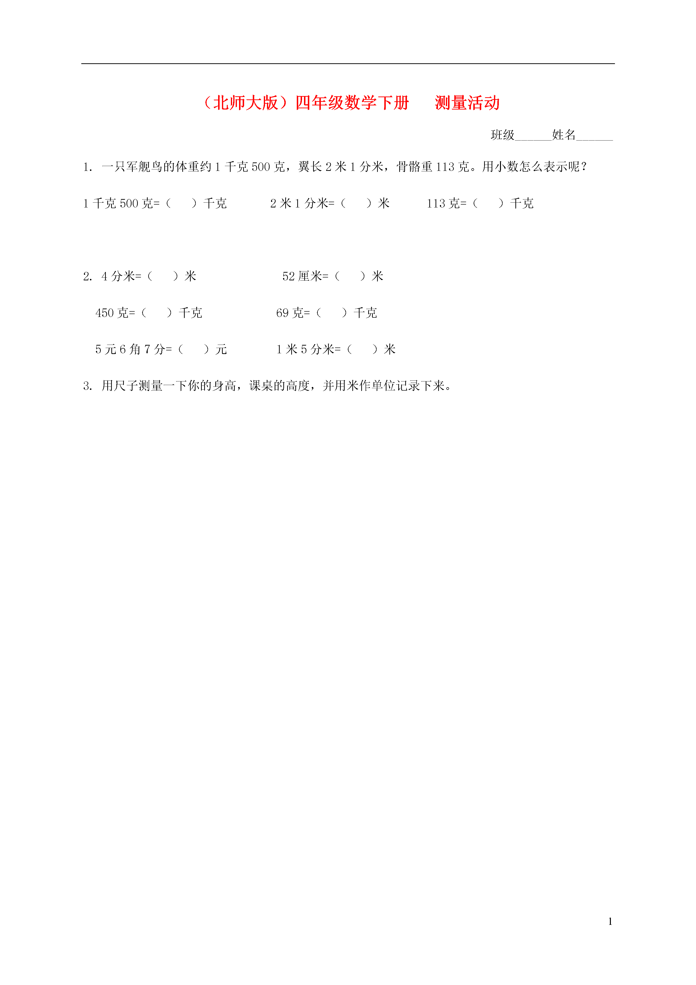 1(北师大版)四年级数学下册测量活动班级______姓名______1.一只军舰鸟的体重约1千克500克,翼长2米1分米,骨骼重113克。用小数怎么表示呢?1千克500克=()千克2米1分米=()米113克=()千克2.4分米=()米52厘米=()米450克=()千克69克=()千克5元6角7分=()元1米5分米=()米3.用尺子测量一下你的身高,课桌的高度,并用米作单位记录下来。