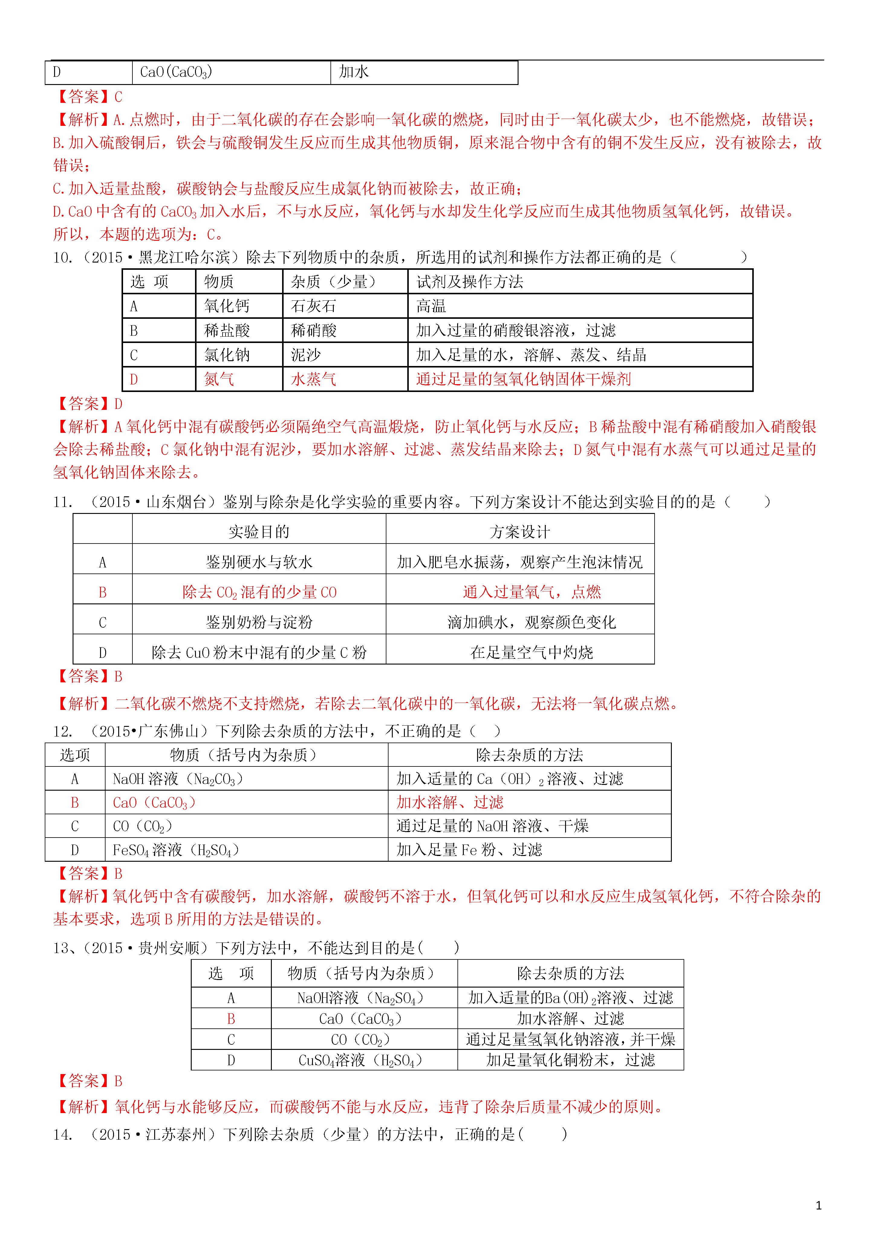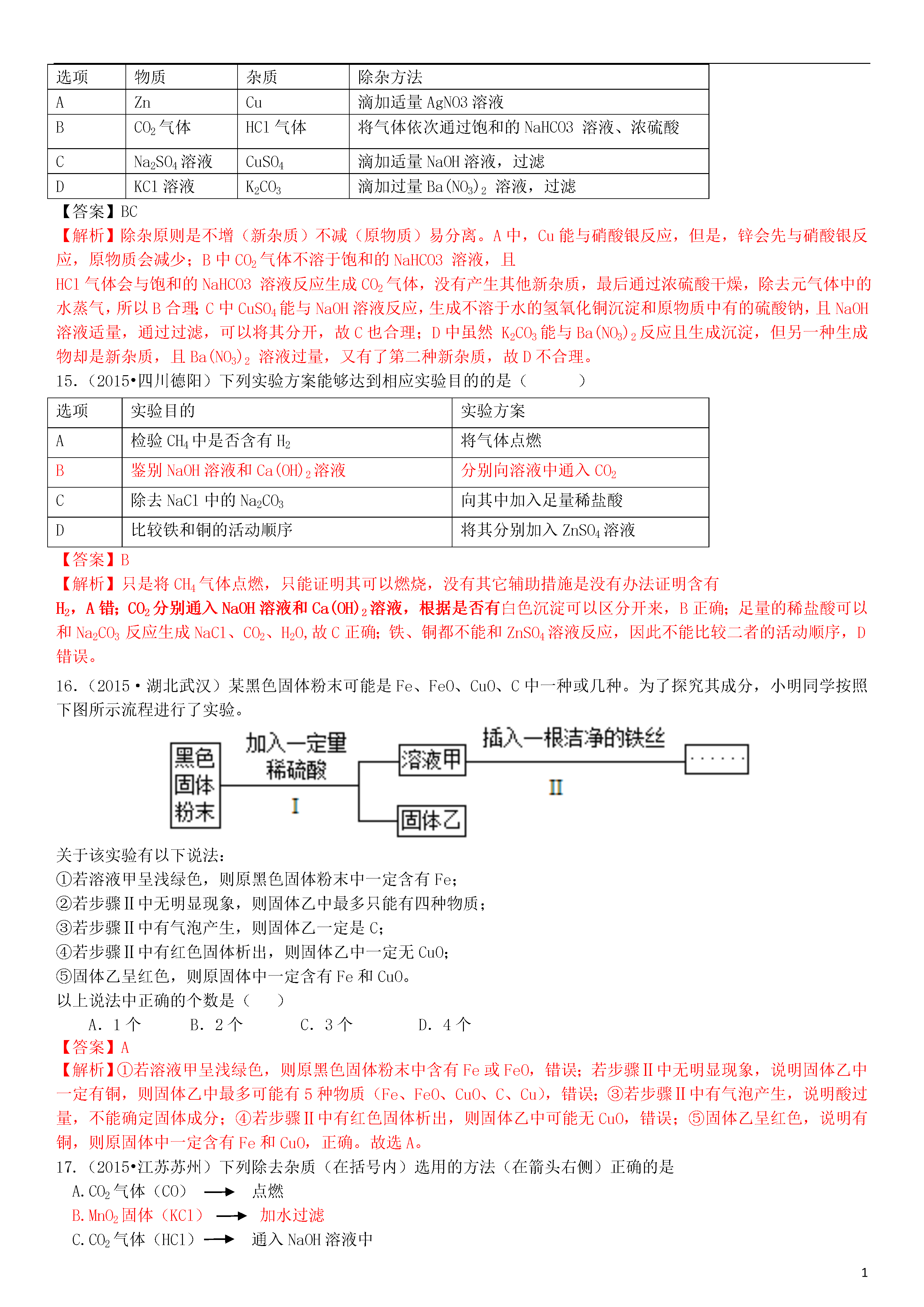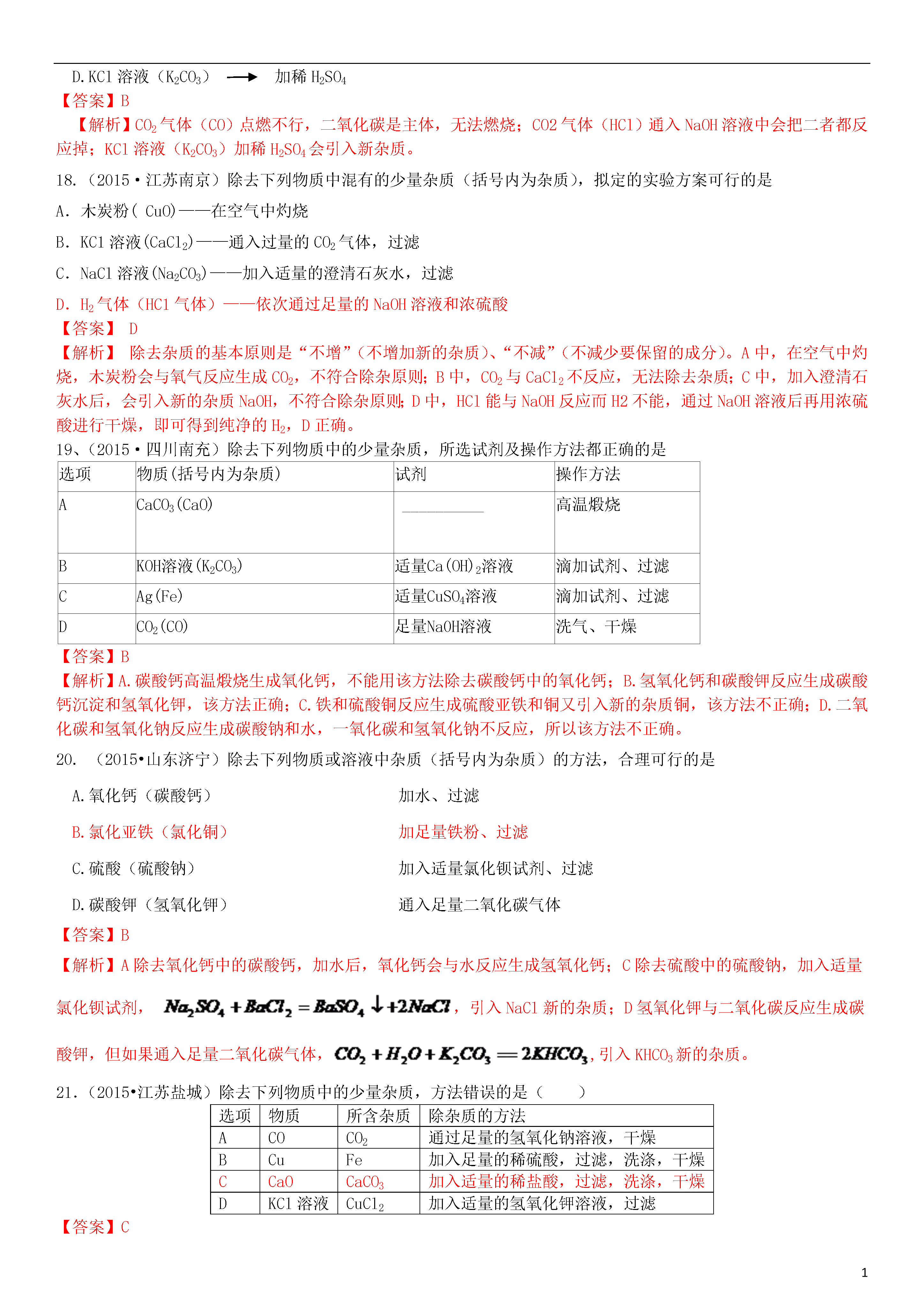 1考点31物质的分离与提纯一、选择题1.(2015•辽宁本溪)下列实验方案设计不合理的是()选项实验内容操作或所用试剂A鉴别铁粉和木炭粉观察颜色B鉴别氯化铵和氯化钾加熟石灰,混合研磨C除去铜中混有的氧化铜加过量稀硫酸,过滤D除去氧化钙中混有的碳酸钙高温煅烧A.AB.BC.CD.D【答案】A【解析】铁粉和木炭粉都是黑色,不能通过观察颜色鉴别,A错误;熟石灰和氯化铵反应生成氨气,产生刺激性气味,而氯化钾不能,B正确;氧化铜和硫酸反应,铜和硫酸不反应,C正确;碳酸钙高温下分解生成氧化钙和二氧化碳,D正确。2.(2015·四川雅安)除去下列各物质中的少量杂质,所选用的试剂、方法均正确的是()编号物质杂质试剂除杂操作方法ACO2CO——点燃BCaOCaCO3水过滤、蒸发CNaNO3溶液Na2CO3适量CaCl2溶液过滤D铜粉铁粉过量盐酸过滤、洗涤、干燥【答案】D【解析】二氧化碳中的一氧化碳无法燃烧,A错误;水与氧化钙发生反应但不能与碳酸钙发生反应,不能用水除去氧化钙中的碳酸钙,B错误;适量氯化钙可将碳酸钠转化为碳酸钙和氯化钠,过滤可除去碳酸钙,但可溶性的氯化钠成为硝酸钠中新的杂质,C错误;过量盐酸可将铁溶解,但不与铜发生反应,过滤、洗涤、干燥后可得纯铜,D正确。3.(2015·甘肃武威)下列除去杂质所用的药品或方法,不正确的是()选项物质杂质除杂药品或方法ACaCl2溶液盐酸过量的碳酸钙、过滤BCaOCaCO3适量稀盐酸CN2O2灼热的铜网DCOCO2足量的氢氧化钠溶液、浓硫酸【答案】B【解析】稀盐酸既可以和杂质CaCO反应,又可以与原物质CaO反应,因此错误,违背了不减少原有物质的原则。4.(2015·甘肃兰州)除去下列各物质中的少量杂质,所用试剂、方法正确的是()选项物质杂质试剂、方法ACO2CO点燃BFe粉Cu粉稀盐酸,过滤CMgCl2溶液盐酸适量的氢氧化钠溶液DFeSO4溶液CuSO4过量铁粉,过滤【答案】D【解析】一氧化碳在二氧化碳的氛围中无法点燃,A错误;盐酸不能与铜反应,不但没把铜除去,还将被保护的物质铁给反应掉了,B错误;用适量氢氧化钠可以将少量的盐酸除去,且但生成了新杂质氯化钠,C错误;铁可以跟硫酸铜反应,生成铜与硫酸亚铁,过量铁粉与置换出来的铜可以过滤除去,D正确。5.(2015•山东潍坊)下列实验方案不能达到目的的是实验目的实验方案A鉴别AgNO3溶液与NaNO3溶液分别滴加稀盐酸,振荡,观察是否产生沉淀B除去CO中混有的CO2将混合气体通过灼热的氧化铜C鉴别纯铝和硬铝将两者相互刻画,比较硬度D检验集气瓶中是否集满氧气将带火星的木条伸入集气瓶口,观察木条能否复燃【答案】B【解析】除去CO中混有的CO2,可用碱溶液吸收,若将混合气体通过灼热的氧化铜,除去了CO,除去了被提纯的气体,故B错误;鉴别AgNO3溶液与NaNO3溶液可用稀盐酸,HCl+AgNO3==AgCl↓+HNO3有白色沉淀生成;合金的硬度通常比纯金属的硬度大,故鉴别纯铝和硬铝可将两者相互刻画。6.(2015·山东枣庄)要除去下列各物质中混有的少量杂质,所选试剂不正确的是序号物质杂质所选试剂ANaOHNa2CO3适量稀盐酸BMnO2KCl足量水CCuCuO足量稀硫酸DCaCl2溶液盐酸足量CaCO3【答案】A【解析】除去杂质的基本原则是:所选试剂或方法既不能除掉要保留的物质,也不能在除杂过程中引入新的杂质。A中,氢氧化钠属于碱,碳酸钠属于盐,向两者的混合溶液中加入盐酸后,盐酸先与NaOH发生反应(中和反应优先发生),故A所选试剂不正确;B中,MnO2难溶于水,KCl易溶于水,加入足量水后过滤即可除去KCl,B正确;C中,Cu不能与稀硫酸反应而CuO能反应被溶解,因此C所选试剂可行;D中,加入碳酸钙后,能与混合溶液中的盐酸反应生成CaCl2、H2O和CO2,CO2作为气体逸散到空气中,剩下的就是纯净的CaCl2溶液,D正确。7、(2015·四川眉山)除去下到物质中的少量杂质,试剂选择正确的是()选项物质杂质试剂ANaNO3Na2CO3CaCl2BZnSO4CuSO4Zn粉CCO2COO2DCuOCuH2SO4【答案】B【解析】A、碳酸钠与氯化钙反应生成碳酸钙沉淀和氯化钠,引入了新的杂质氯化钠,故A错;B、锌与硫酸铜反应生成铜和硫酸锌,过滤可得到硫酸锌,没有引入新的杂质,故B正确;C、二氧化碳既不能燃烧也不支持燃烧,所以二氧化碳中含有一氧化碳,不能用燃烧的方法除掉,故C错;D、硫酸与氧化铜反应,不能和铜反应,故D错。8、(2015·湖北荆州)为了除去粗盐中的Ca2+、Mg2+、SO42-等离子,可将粗盐溶于水后进行如下操作:①加入适量盐酸,②加过量NaOH溶液,③加过量Na2CO3溶液,④