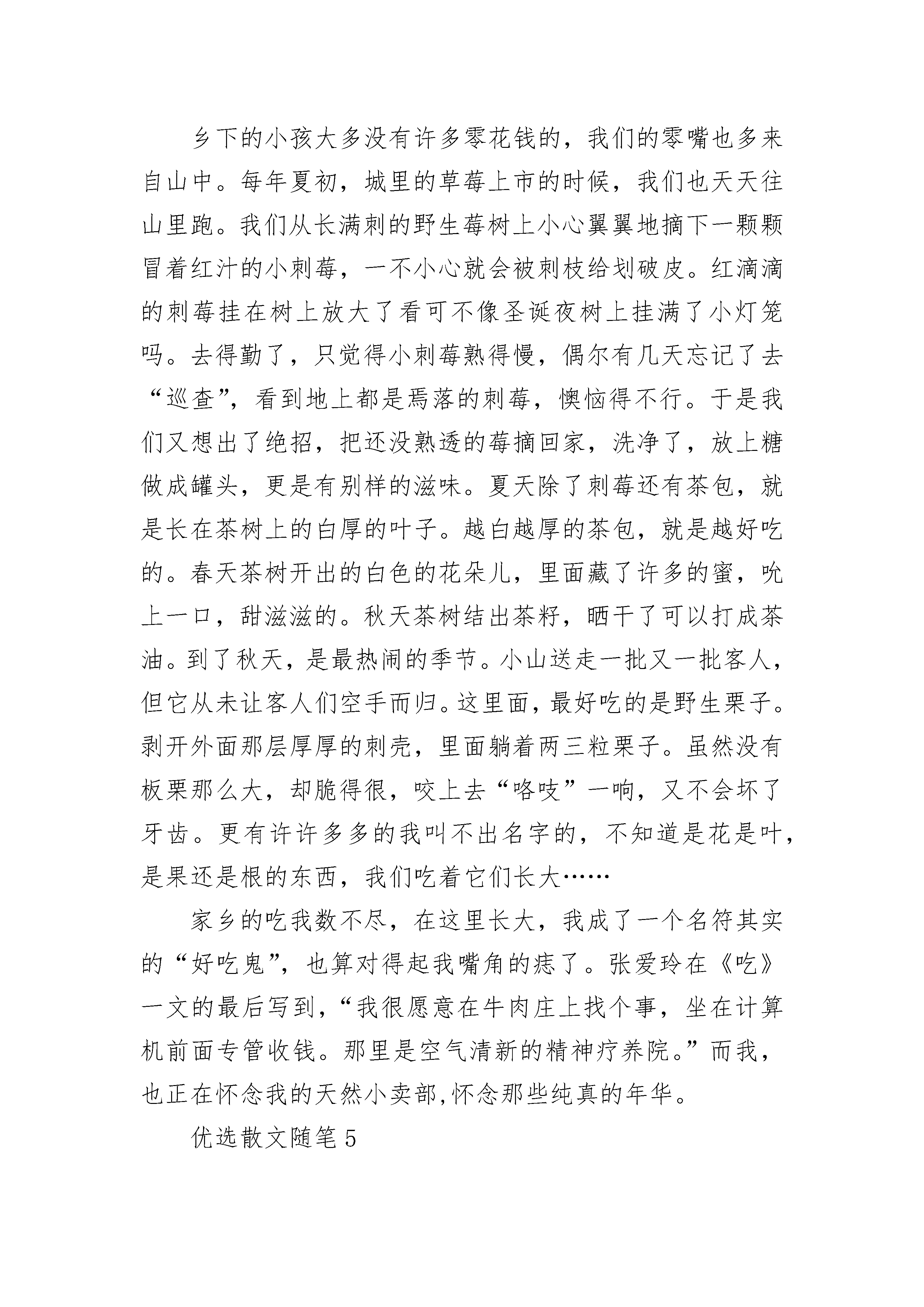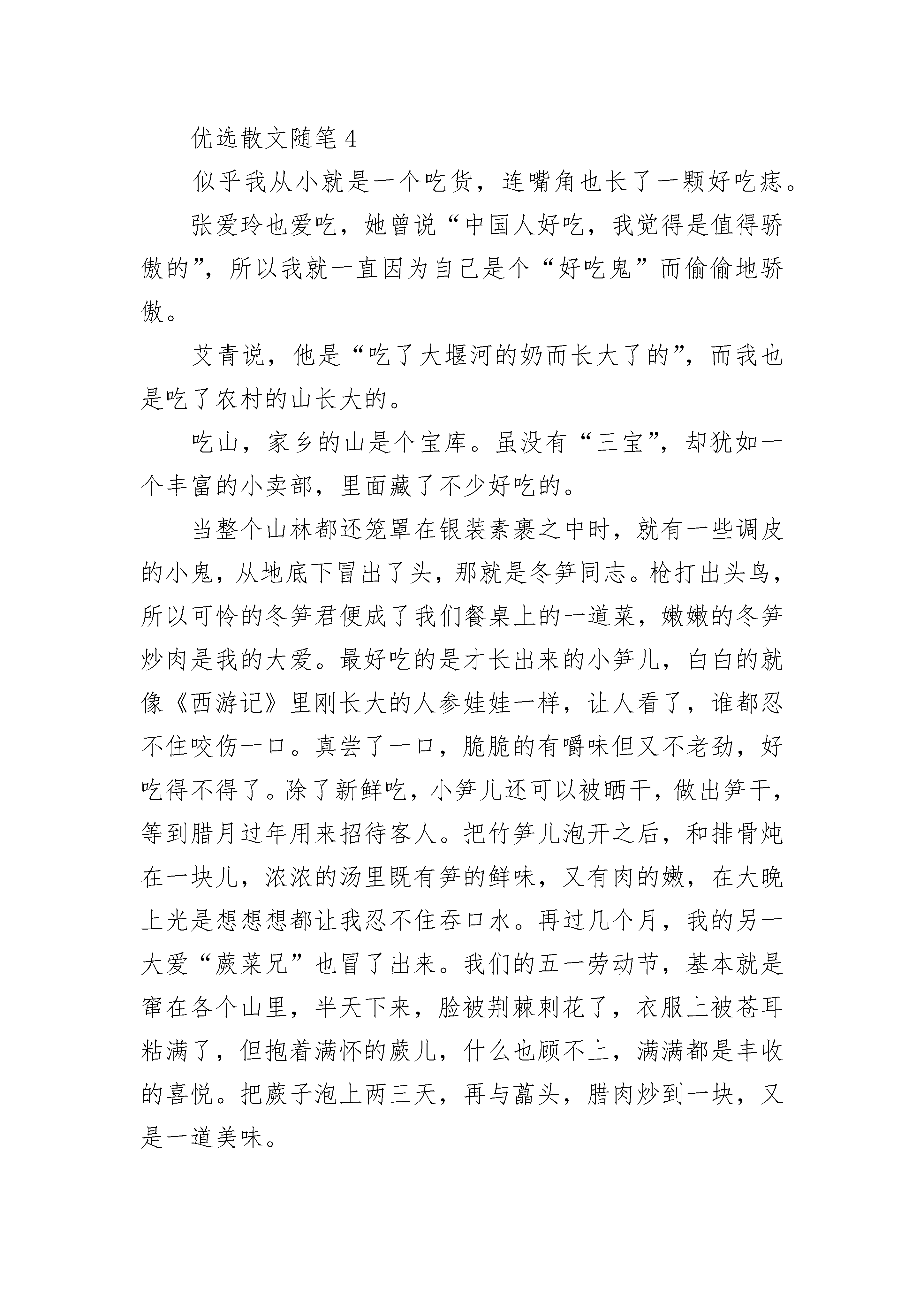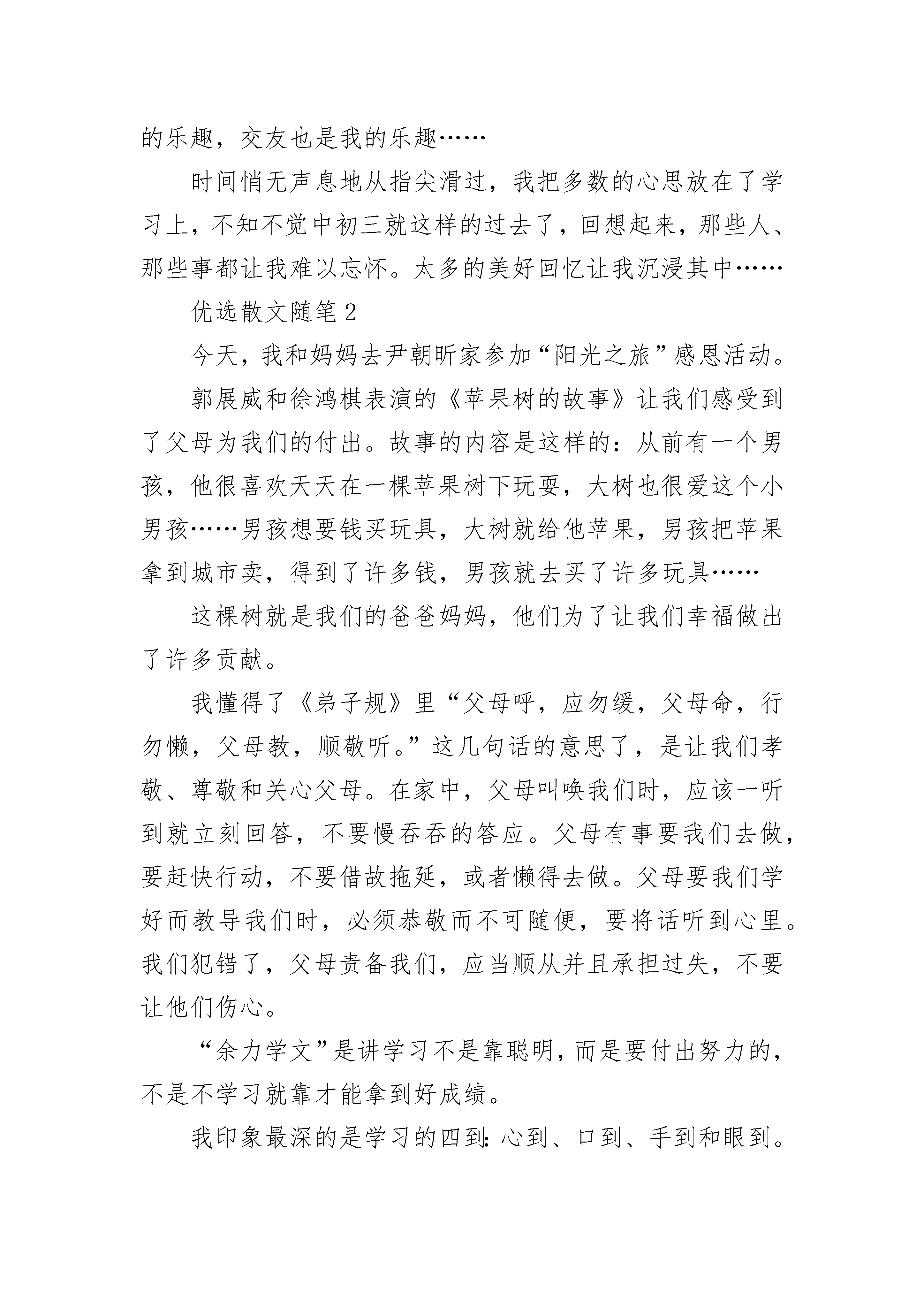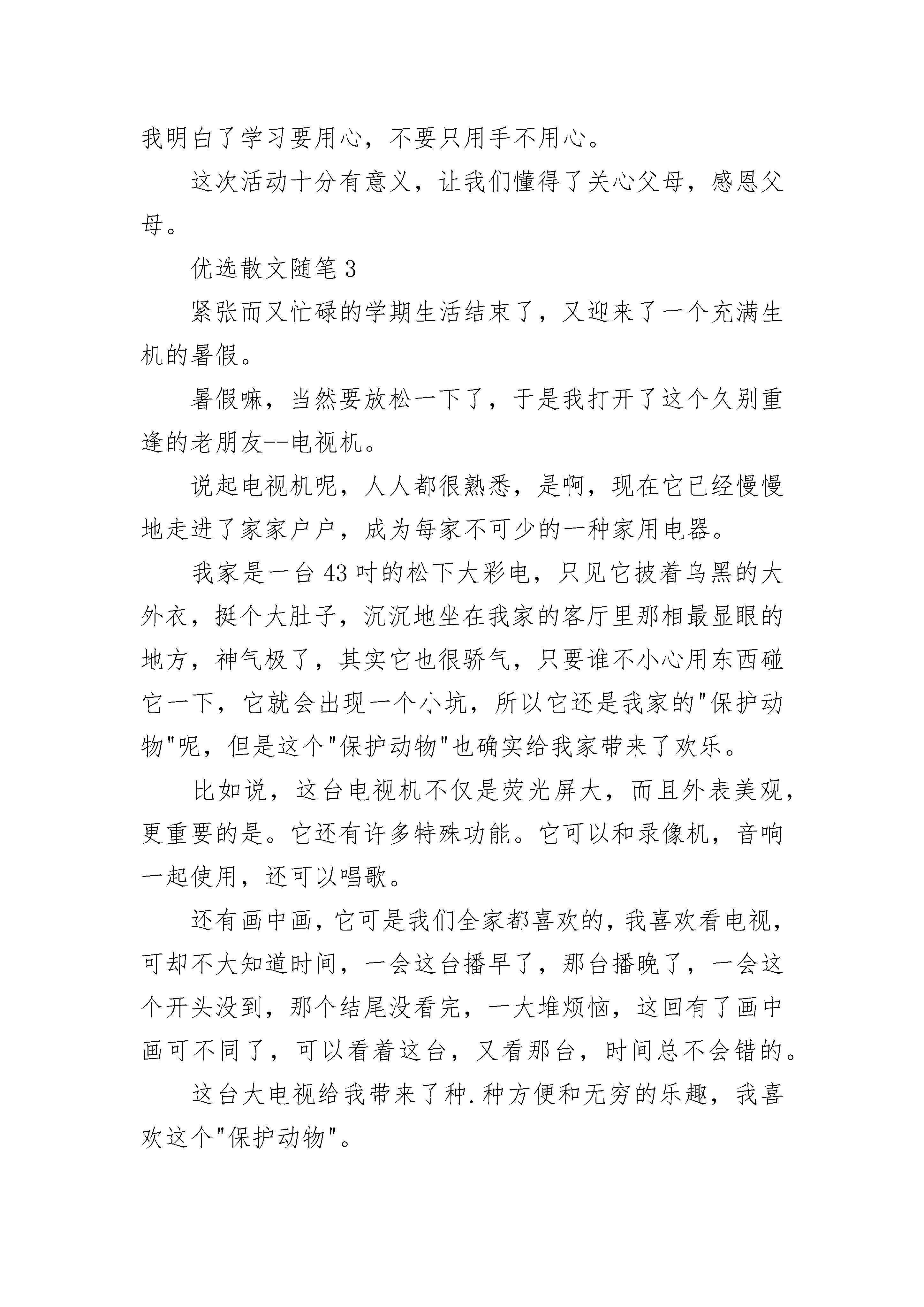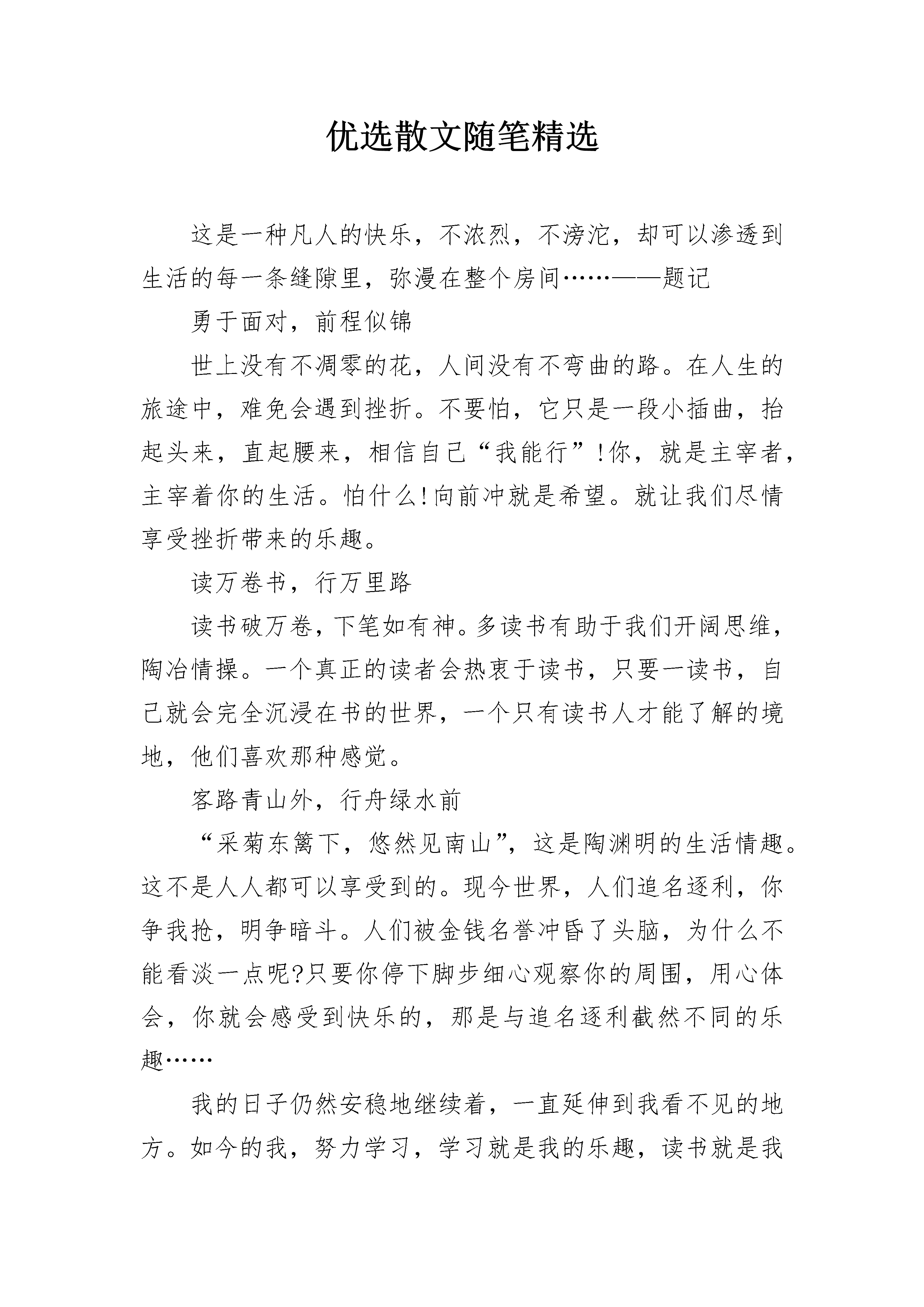 优选散文随笔精选这是一种凡人的快乐,不浓烈,不滂沱,却可以渗透到生活的每一条缝隙里,弥漫在整个房间……——题记勇于面对,前程似锦世上没有不凋零的花,人间没有不弯曲的路。在人生的旅途中,难免会遇到挫折。不要怕,它只是一段小插曲,抬起头来,直起腰来,相信自己“我能行”!你,就是主宰者,主宰着你的生活。怕什么!向前冲就是希望。就让我们尽情享受挫折带来的乐趣。读万卷书,行万里路读书破万卷,下笔如有神。多读书有助于我们开阔思维,陶冶情操。一个真正的读者会热衷于读书,只要一读书,自己就会完全沉浸在书的世界,一个只有读书人才能了解的境地,他们喜欢那种感觉。客路青山外,行舟绿水前“采菊东篱下,悠然见南山”,这是陶渊明的生活情趣。这不是人人都可以享受到的。现今世界,人们追名逐利,你争我抢,明争暗斗。人们被金钱名誉冲昏了头脑,为什么不能看淡一点呢?只要你停下脚步细心观察你的周围,用心体会,你就会感受到快乐的,那是与追名逐利截然不同的乐趣……我的日子仍然安稳地继续着,一直延伸到我看不见的地方。如今的我,努力学习,学习就是我的乐趣,读书就是我的乐趣,交友也是我的乐趣……时间悄无声息地从指尖滑过,我把多数的心思放在了学习上,不知不觉中初三就这样的过去了,回想起来,那些人、那些事都让我难以忘怀。太多的美好回忆让我沉浸其中……优选散文随笔2今天,我和妈妈去尹朝昕家参加“阳光之旅”感恩活动。郭展威和徐鸿棋表演的《苹果树的故事》让我们感受到了父母为我们的付出。故事的内容是这样的:从前有一个男孩,他很喜欢天天在一棵苹果树下玩耍,大树也很爱这个小男孩……男孩想要钱买玩具,大树就给他苹果,男孩把苹果拿到城市卖,得到了许多钱,男孩就去买了许多玩具……这棵树就是我们的爸爸妈妈,他们为了让我们幸福做出了许多贡献。我懂得了《弟子规》里“父母呼,应勿缓,父母命,行勿懒,父母教,顺敬听。”这几句话的意思了,是让我们孝敬、尊敬和关心父母。在家中,父母叫唤我们时,应该一听到就立刻回答,不要慢吞吞的答应。父母有事要我们去做,要赶快行动,不要借故拖延,或者懒得去做。父母要我们学好而教导我们时,必须恭敬而不可随便,要将话听到心里。我们犯错了,父母责备我们,应当顺从并且承担过失,不要让他们伤心。“余力学文”是讲学习不是靠聪明,而是要付出努力的,不是不学习就靠才能拿到好成绩。我印象最深的是学习的四到:心到、口到、手到和眼到。我明白了学习要用心,不要只用手不用心。这次活动十分有意义,让我们懂得了关心父母,感恩父母。优选散文随笔3紧张而又忙碌的学期生活结束了,又迎来了一个充满生机的暑假。暑假嘛,当然要放松一下了,于是我打开了这个久别重逢的老朋友--电视机。说起电视机呢,人人都很熟悉,是啊,现在它已经慢慢地走进了家家户户,成为每家不可少的一种家用电器。我家是一台43吋的松下大彩电,只见它披着乌黑的大外衣,挺个大肚子,沉沉地坐在我家的客厅里那相最显眼的地方,神气极了,其实它也很骄气,只要谁不小心用东西碰它一下,它就会出现一个小坑,所以它还是我家的"保护动物"呢,但是这个"保护动物"也确实给我家带来了欢乐。比如说,这台电视机不仅是荧光屏大,而且外表美观,更重要的是。它还有许多特殊功能。它可以和录像机,音响一起使用,还可以唱歌。还有画中画,它可是我们全家都喜欢的,我喜欢看电视,可却不大知道时间,一会这台播早了,那台播晚了,一会这个开头没到,那个结尾没看完,一大堆烦恼,这回有了画中画可不同了,可以看着这台,又看那台,时间总不会错的。这台大电视给我带来了种.种方便和无穷的乐趣,我喜欢这个"保护动物"。优选散文随笔4似乎我从小就是一个吃货,连嘴角也长了一颗好吃痣。张爱玲也爱吃,她曾说“中国人好吃,我觉得是值得骄傲的”,所以我就一直因为自己是个“好吃鬼”而偷偷地骄傲。艾青说,他是“吃了大堰河的奶而长大了的”,而我也是吃了农村的山长大的。吃山,家乡的山是个宝库。虽没有“三宝”,却犹如一个丰富的小卖部,里面藏了不少好吃的。当整个山林都还笼罩在银装素裹之中时,就有一些调皮的小鬼,从地底下冒出了头,那就是冬笋同志。枪打出头鸟,所以可怜的冬笋君便成了我们餐桌上的一道菜,嫩嫩的冬笋炒肉是我的大爱。最好吃的是才长出来的小笋儿,白白的就像《西游记》里刚长大的人参娃娃一样,让人看了,谁都忍不住咬伤一口。真尝了一口,脆脆的有嚼味但又不老劲,好吃得不得了。除了新鲜吃,小笋儿还可以被晒干,做出笋干,等到腊月过年用来招待客人。把竹笋儿泡开之后,和排骨炖在一块儿,浓浓的汤里既有笋的鲜味,又有肉的嫩,在大晚上光是想想想都让我忍不住吞口水。再过几个月,我的另一大爱“蕨菜兄”也冒了出来。我们的五一劳动节,基本就是窜在各个山里,半天下来,脸被荆棘刺花了,衣服上被苍耳粘满了,但抱着满怀的蕨儿,什么也顾不上,满满都是丰收的喜悦。把蕨子泡上两三天,