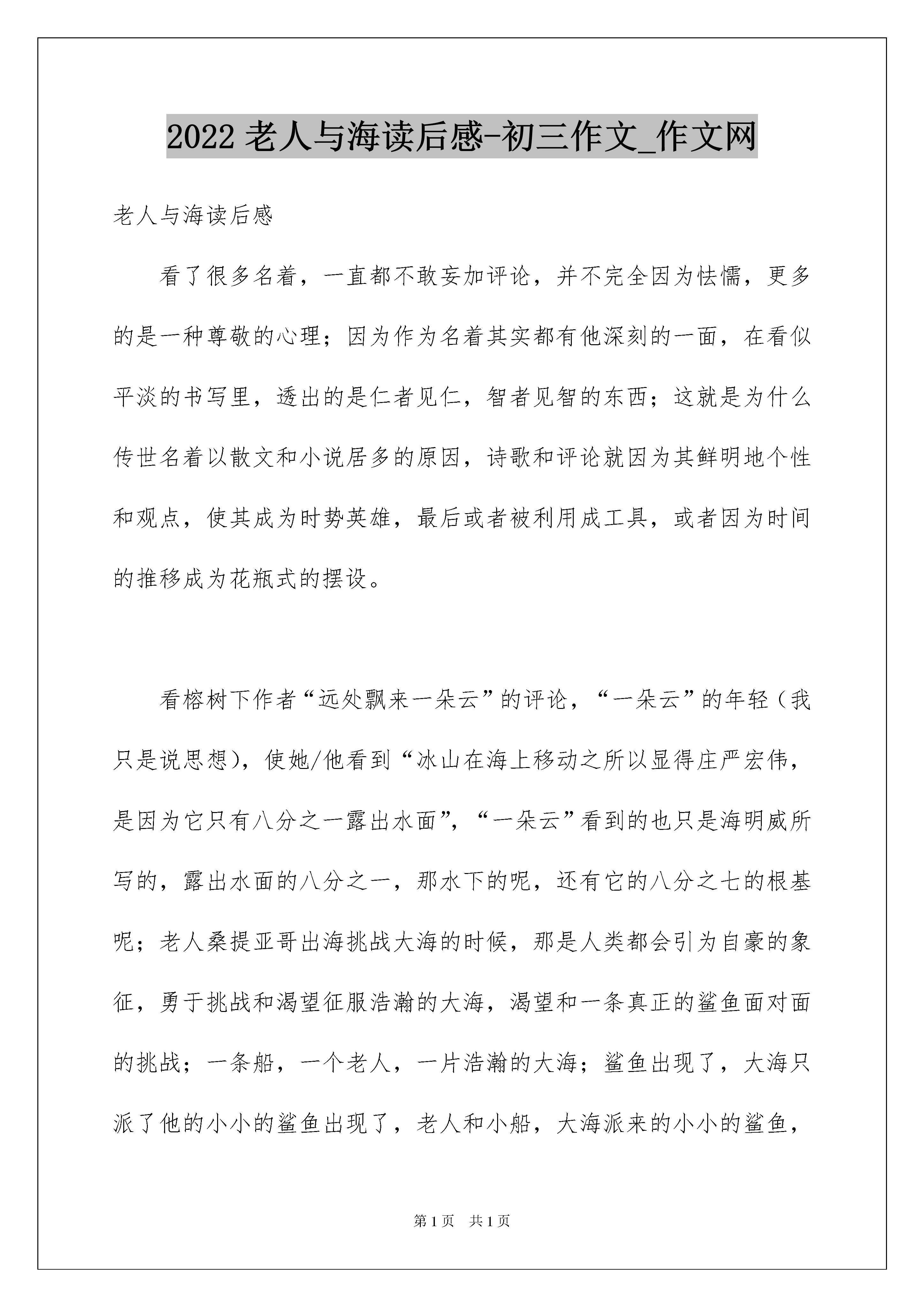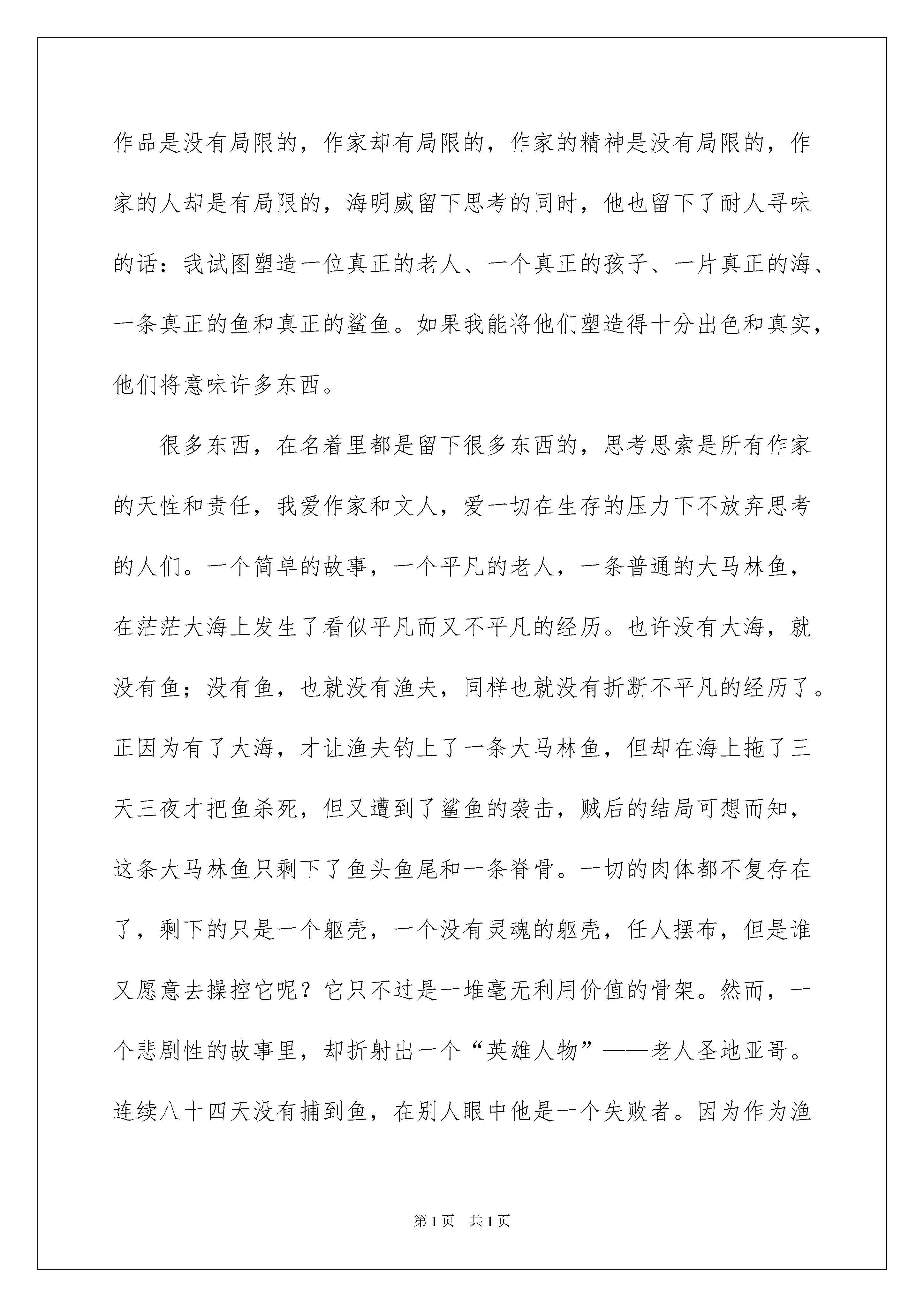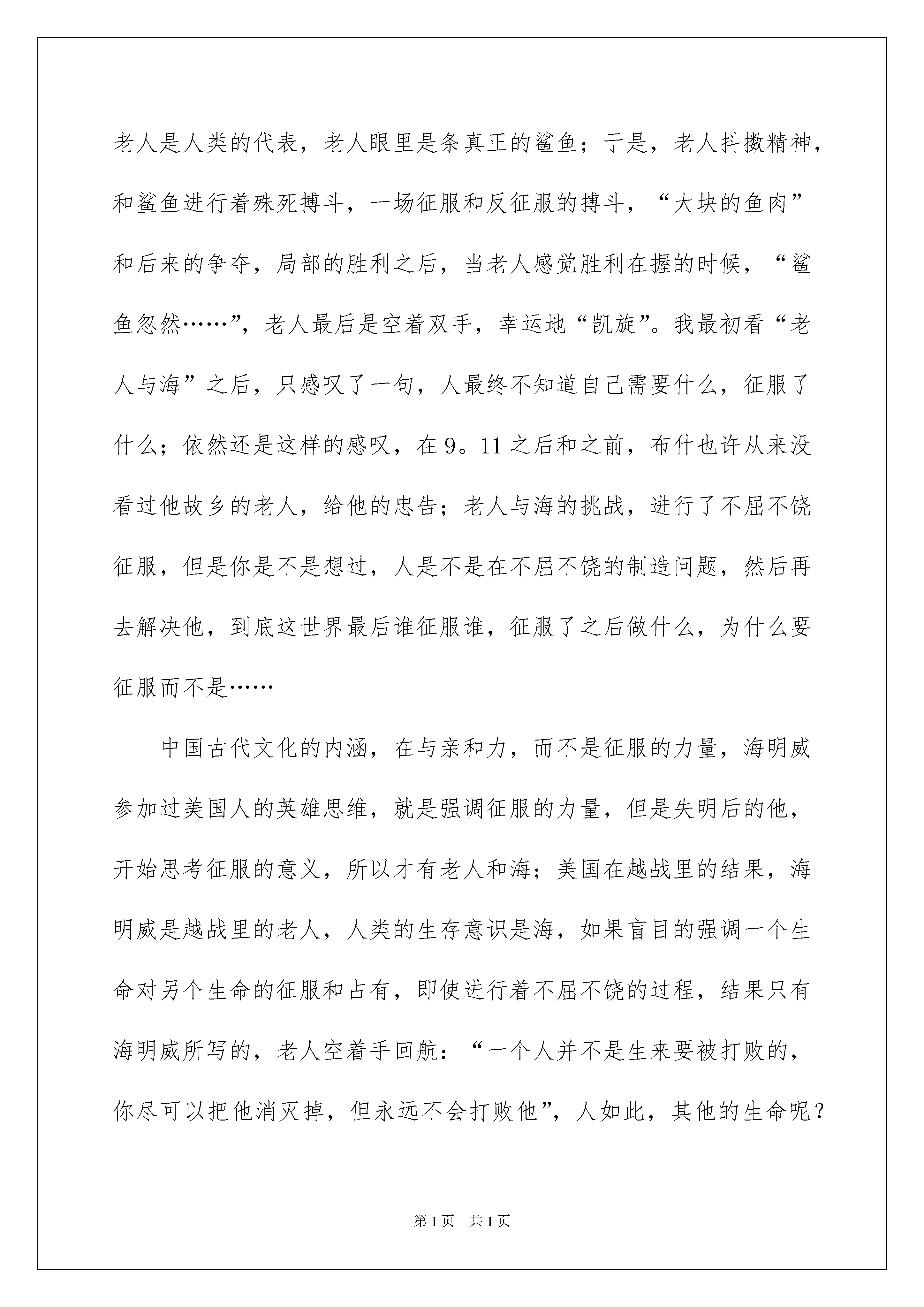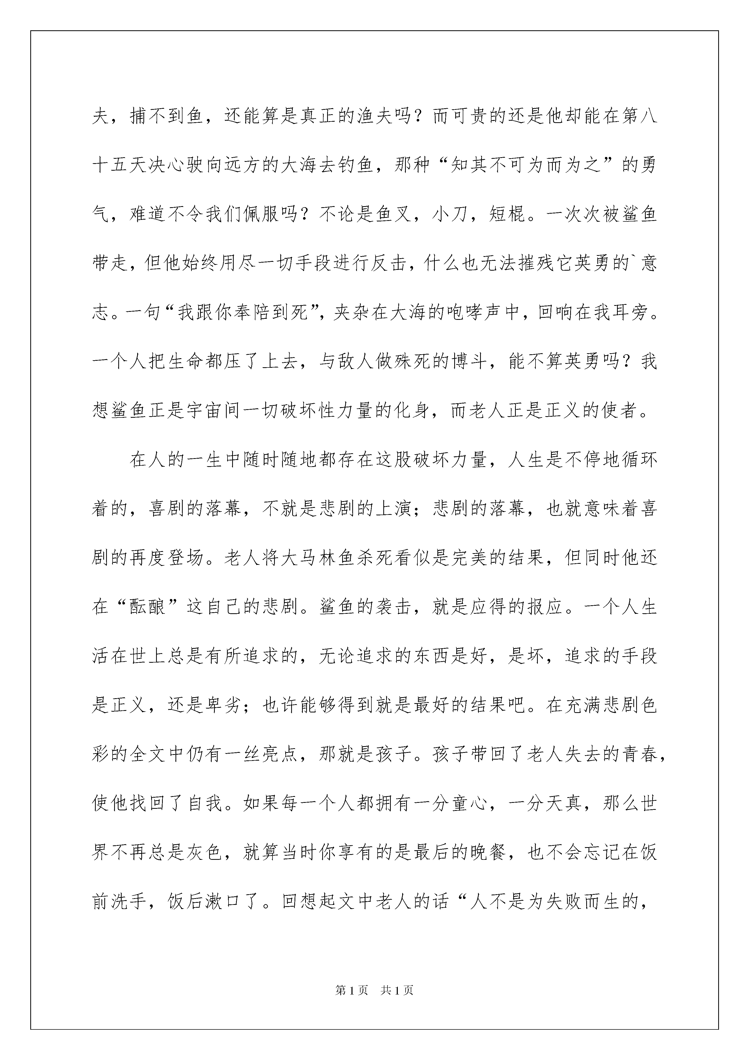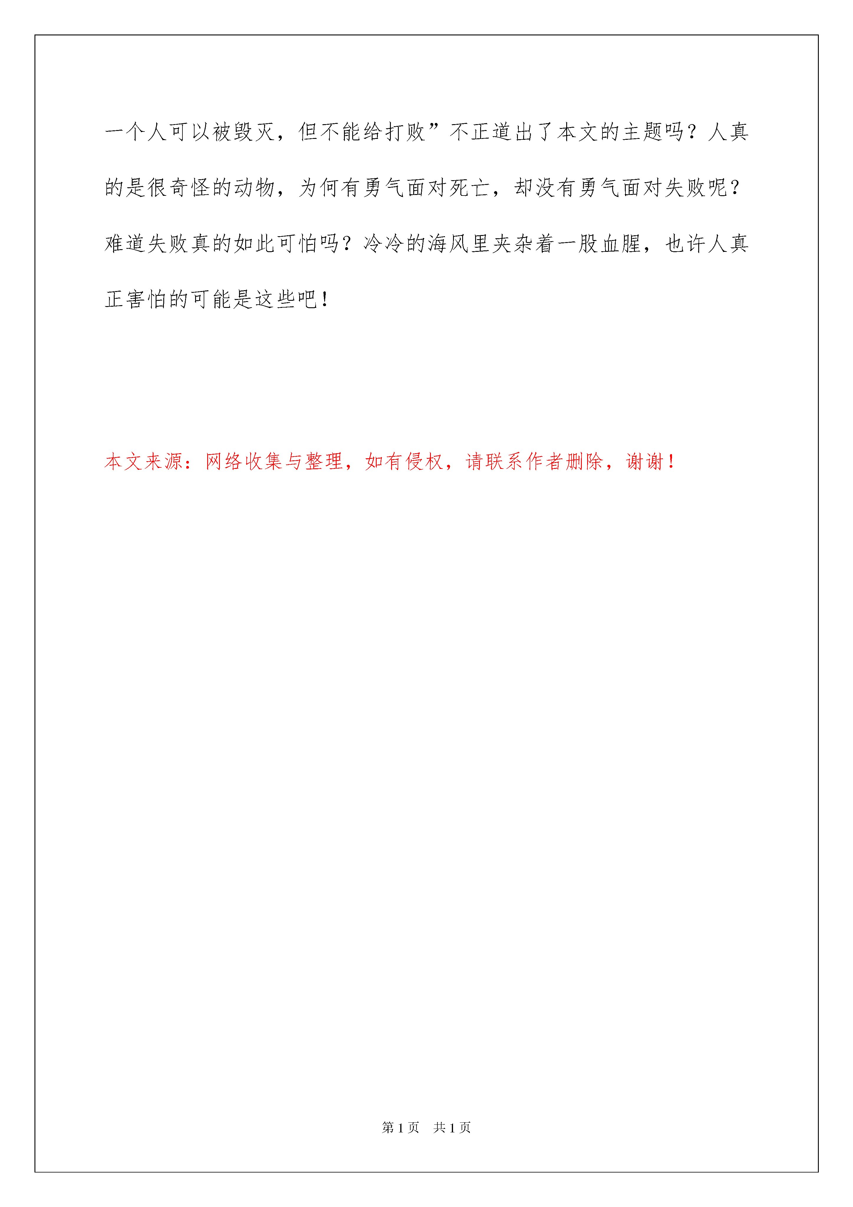 2022老人与海读后感-初三作文_作文网老人与海读后感看了很多名着,一直都不敢妄加评论,并不完全因为怯懦,更多的是一种尊敬的心理;因为作为名着其实都有他深刻的一面,在看似平淡的书写里,透出的是仁者见仁,智者见智的东西;这就是为什么传世名着以散文和小说居多的原因,诗歌和评论就因为其鲜明地个性和观点,使其成为时势英雄,最后或者被利用成工具,或者因为时间的推移成为花瓶式的摆设。看榕树下作者“远处飘来一朵云”的评论,“一朵云”的年轻(我只是说思想),使她/他看到“冰山在海上移动之所以显得庄严宏伟,是因为它只有八分之一露出水面”,“一朵云”看到的也只是海明威所写的,露出水面的八分之一,那水下的呢,还有它的八分之七的根基呢;老人桑提亚哥出海挑战大海的时候,那是人类都会引为自豪的象征,勇于挑战和渴望征服浩瀚的大海,渴望和一条真正的鲨鱼面对面的挑战;一条船,一个老人,一片浩瀚的大海;鲨鱼出现了,大海只派了他的小小的鲨鱼出现了,老人和小船,大海派来的小小的鲨鱼,老人是人类的代表,老人眼里是条真正的鲨鱼;于是,老人抖擞精神,和鲨鱼进行着殊死搏斗,一场征服和反征服的搏斗,“大块的鱼肉”和后来的争夺,局部的胜利之后,当老人感觉胜利在握的时候,“鲨鱼忽然……”,老人最后是空着双手,幸运地“凯旋”。我最初看“老人与海”之后,只感叹了一句,人最终不知道自己需要什么,征服了什么;依然还是这样的感叹,在9。11之后和之前,布什也许从来没看过他故乡的老人,给他的忠告;老人与海的挑战,进行了不屈不饶征服,但是你是不是想过,人是不是在不屈不饶的制造问题,然后再去解决他,到底这世界最后谁征服谁,征服了之后做什么,为什么要征服而不是……中国古代文化的内涵,在与亲和力,而不是征服的力量,海明威参加过美国人的英雄思维,就是强调征服的力量,但是失明后的他,开始思考征服的意义,所以才有老人和海;美国在越战里的结果,海明威是越战里的老人,人类的生存意识是海,如果盲目的强调一个生命对另个生命的征服和占有,即使进行着不屈不饶的过程,结果只有海明威所写的,老人空着手回航:“一个人并不是生来要被打败的,你尽可以把他消灭掉,但永远不会打败他”,人如此,其他的生命呢?作品是没有局限的,作家却有局限的,作家的精神是没有局限的,作家的人却是有局限的,海明威留下思考的同时,他也留下了耐人寻味的话:我试图塑造一位真正的老人、一个真正的孩子、一片真正的海、一条真正的鱼和真正的鲨鱼。如果我能将他们塑造得十分出色和真实,他们将意味许多东西。很多东西,在名着里都是留下很多东西的,思考思索是所有作家的天性和责任,我爱作家和文人,爱一切在生存的压力下不放弃思考的人们。一个简单的故事,一个平凡的老人,一条普通的大马林鱼,在茫茫大海上发生了看似平凡而又不平凡的经历。也许没有大海,就没有鱼;没有鱼,也就没有渔夫,同样也就没有折断不平凡的经历了。正因为有了大海,才让渔夫钓上了一条大马林鱼,但却在海上拖了三天三夜才把鱼杀死,但又遭到了鲨鱼的袭击,贼后的结局可想而知,这条大马林鱼只剩下了鱼头鱼尾和一条脊骨。一切的肉体都不复存在了,剩下的只是一个躯壳,一个没有灵魂的躯壳,任人摆布,但是谁又愿意去操控它呢?它只不过是一堆毫无利用价值的骨架。然而,一个悲剧性的故事里,却折射出一个“英雄人物”——老人圣地亚哥。连续八十四天没有捕到鱼,在别人眼中他是一个失败者。因为作为渔夫,捕不到鱼,还能算是真正的渔夫吗?而可贵的还是他却能在第八十五天决心驶向远方的大海去钓鱼,那种“知其不可为而为之”的勇气,难道不令我们佩服吗?不论是鱼叉,小刀,短棍。一次次被鲨鱼带走,但他始终用尽一切手段进行反击,什么也无法摧残它英勇的`意志。一句“我跟你奉陪到死”,夹杂在大海的咆哮声中,回响在我耳旁。一个人把生命都压了上去,与敌人做殊死的博斗,能不算英勇吗?我想鲨鱼正是宇宙间一切破坏性力量的化身,而老人正是正义的使者。在人的一生中随时随地都存在这股破坏力量,人生是不停地循环着的,喜剧的落幕,不就是悲剧的上演;悲剧的落幕,也就意味着喜剧的再度登场。老人将大马林鱼杀死看似是完美的结果,但同时他还在“酝酿”这自己的悲剧。鲨鱼的袭击,就是应得的报应。一个人生活在世上总是有所追求的,无论追求的东西是好,是坏,追求的手段是正义,还是卑劣;也许能够得到就是最好的结果吧。在充满悲剧色彩的全文中仍有一丝亮点,那就是孩子。孩子带回了老人失去的青春,使他找回了自我。如果每一个人都拥有一分童心,一分天真,那么世界不再总是灰色,就算当时你享有的是最后的晚餐,也不会忘记在饭前洗手,饭后漱口了。回想起文中老人的话“人不是为失败而生的,一