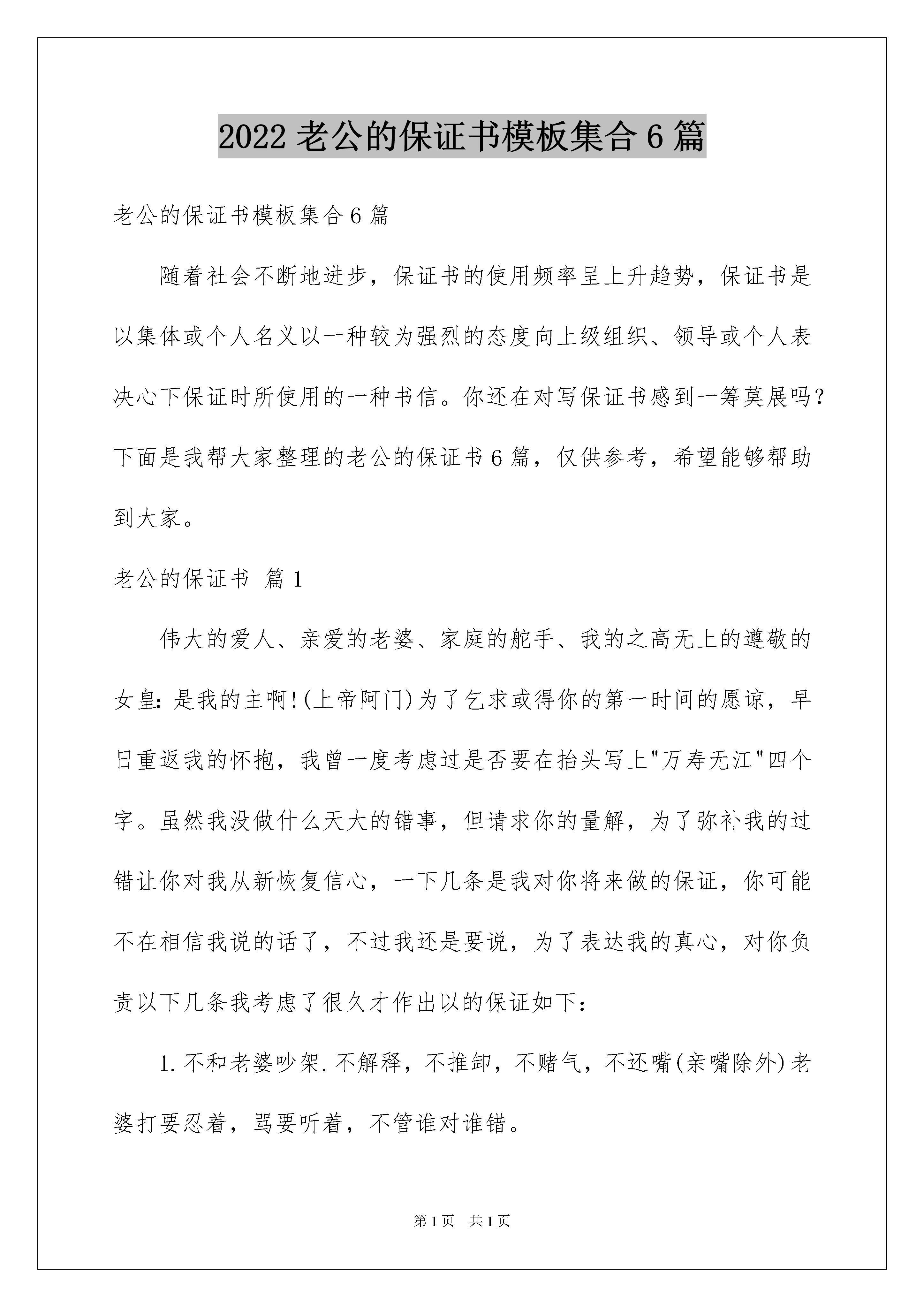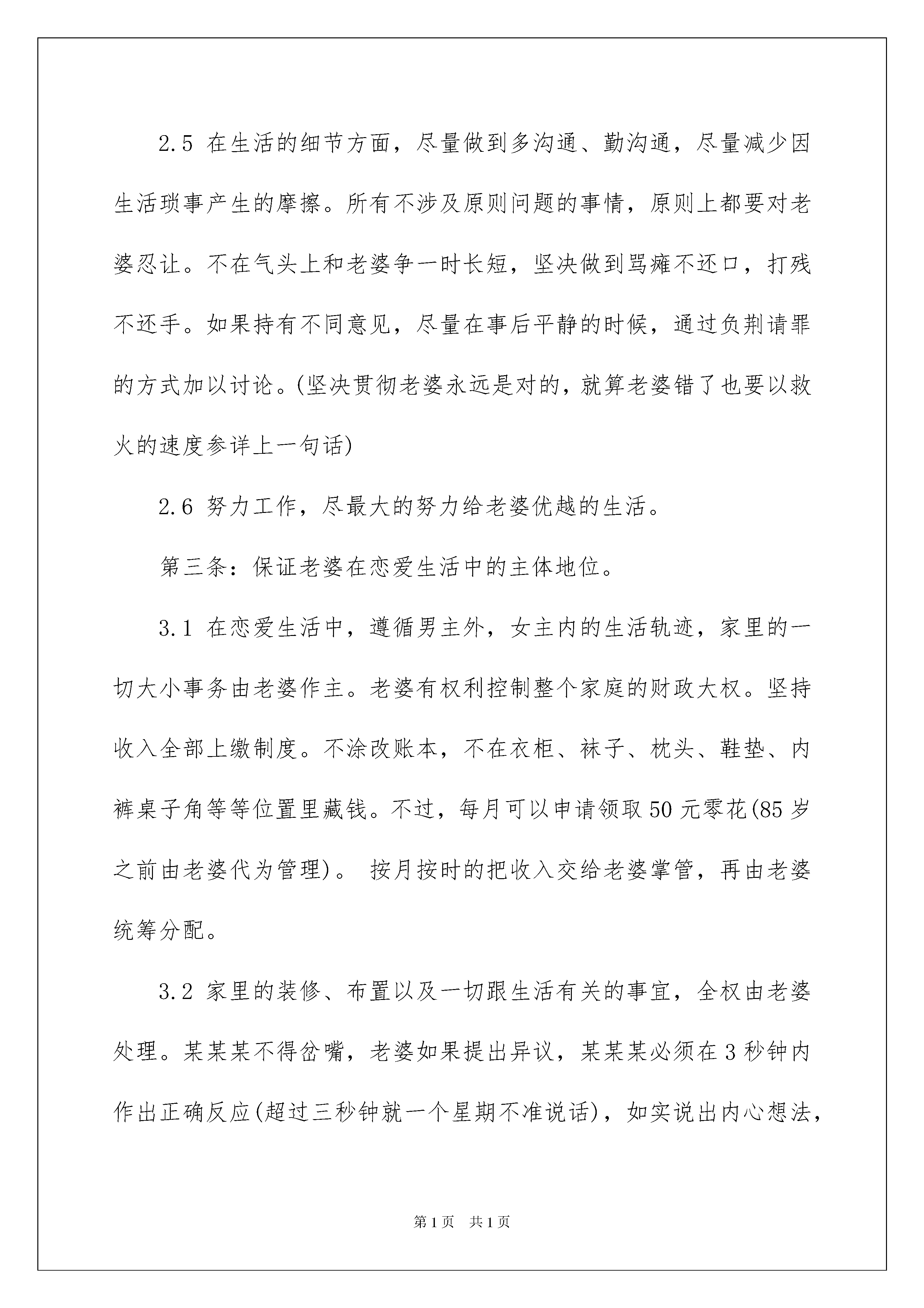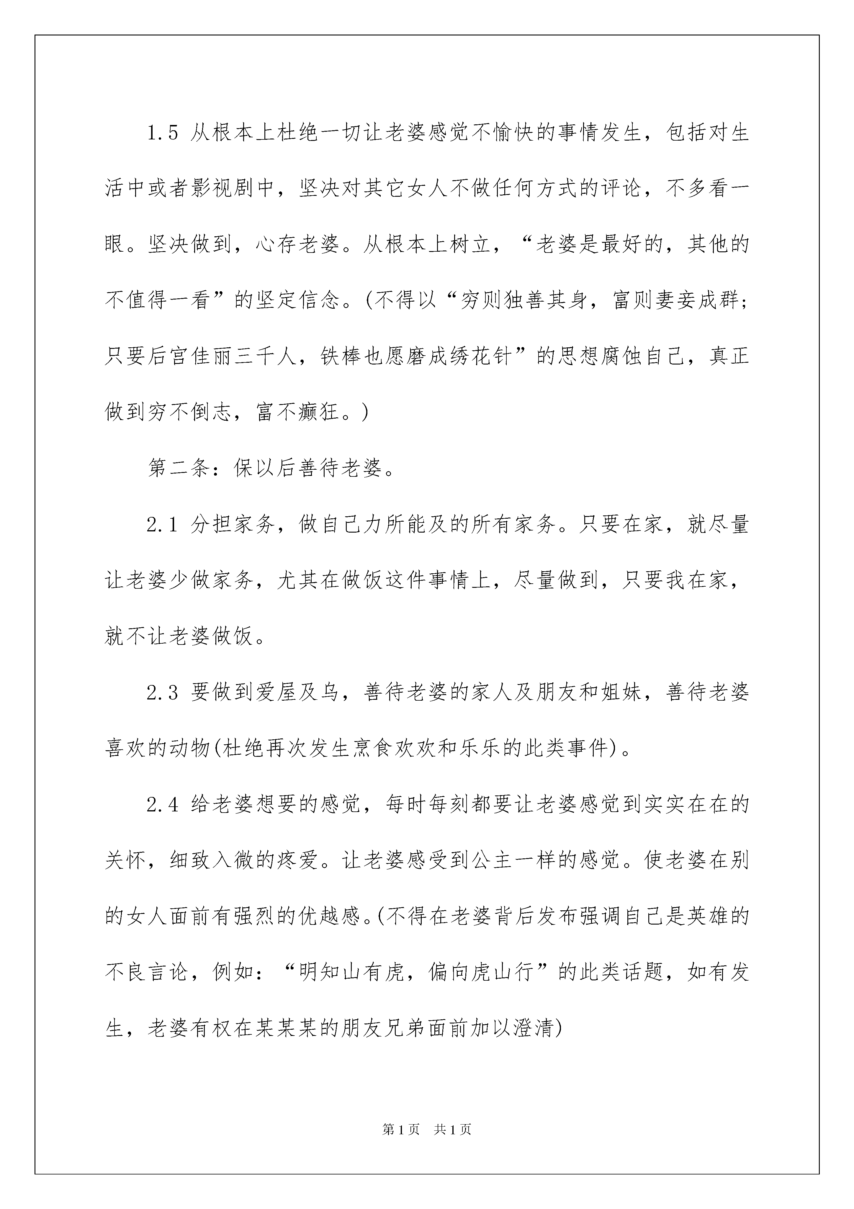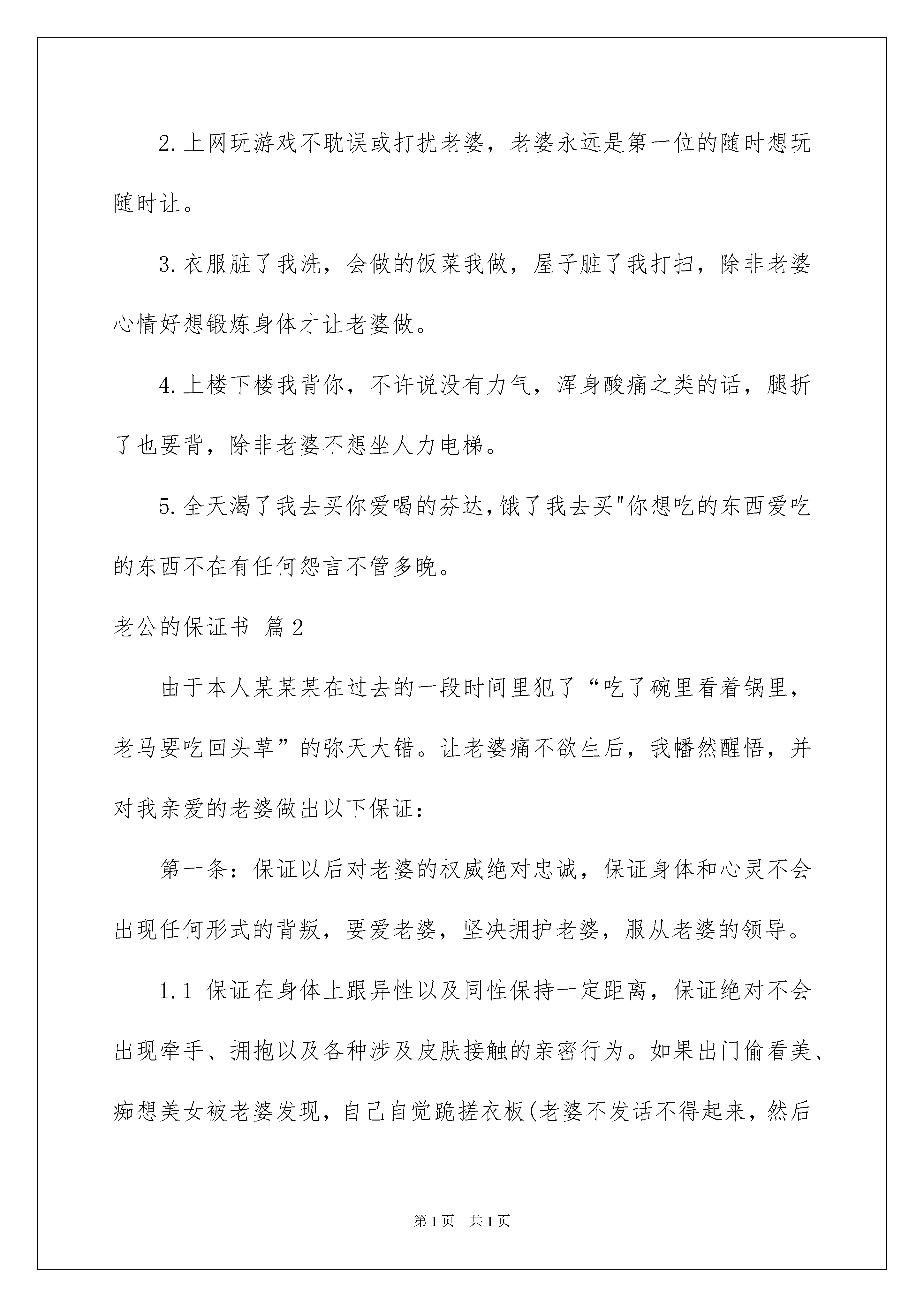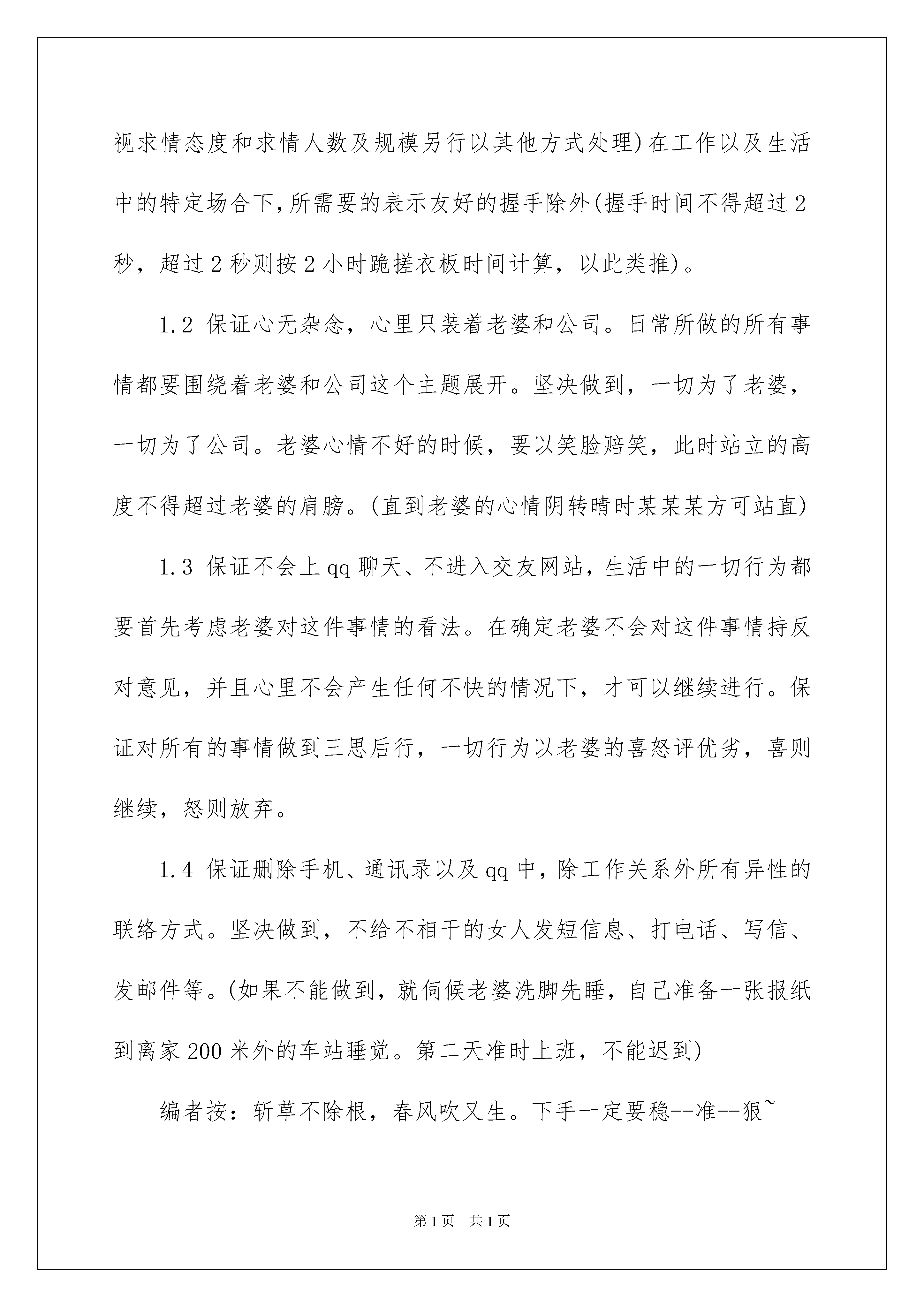 2022老公的保证书模板集合6篇老公的保证书模板集合6篇随着社会不断地进步,保证书的使用频率呈上升趋势,保证书是以集体或个人名义以一种较为强烈的态度向上级组织、领导或个人表决心下保证时所使用的一种书信。你还在对写保证书感到一筹莫展吗?下面是我帮大家整理的老公的保证书6篇,仅供参考,希望能够帮助到大家。老公的保证书篇1伟大的爱人、亲爱的老婆、家庭的舵手、我的之高无上的遵敬的女皇:是我的主啊!(上帝阿门)为了乞求或得你的第一时间的愿谅,早日重返我的怀抱,我曾一度考虑过是否要在抬头写上"万寿无江"四个字。虽然我没做什么天大的错事,但请求你的量解,为了弥补我的过错让你对我从新恢复信心,一下几条是我对你将来做的保证,你可能不在相信我说的话了,不过我还是要说,为了表达我的真心,对你负责以下几条我考虑了很久才作出以的保证如下:1.不和老婆吵架.不解释,不推卸,不赌气,不还嘴(亲嘴除外)老婆打要忍着,骂要听着,不管谁对谁错。2.上网玩游戏不耽误或打扰老婆,老婆永远是第一位的随时想玩随时让。3.衣服脏了我洗,会做的饭菜我做,屋子脏了我打扫,除非老婆心情好想锻炼身体才让老婆做。4.上楼下楼我背你,不许说没有力气,浑身酸痛之类的话,腿折了也要背,除非老婆不想坐人力电梯。5.全天渴了我去买你爱喝的芬达,饿了我去买"你想吃的东西爱吃的东西不在有任何怨言不管多晚。老公的保证书篇2由于本人某某某在过去的一段时间里犯了“吃了碗里看着锅里,老马要吃回头草”的弥天大错。让老婆痛不欲生后,我幡然醒悟,并对我亲爱的老婆做出以下保证:第一条:保证以后对老婆的权威绝对忠诚,保证身体和心灵不会出现任何形式的背叛,要爱老婆,坚决拥护老婆,服从老婆的领导。1.1保证在身体上跟异性以及同性保持一定距离,保证绝对不会出现牵手、拥抱以及各种涉及皮肤接触的亲密行为。如果出门偷看美、痴想美女被老婆发现,自己自觉跪搓衣板(老婆不发话不得起来,然后视求情态度和求情人数及规模另行以其他方式处理)在工作以及生活中的特定场合下,所需要的表示友好的握手除外(握手时间不得超过2秒,超过2秒则按2小时跪搓衣板时间计算,以此类推)。1.2保证心无杂念,心里只装着老婆和公司。日常所做的所有事情都要围绕着老婆和公司这个主题展开。坚决做到,一切为了老婆,一切为了公司。老婆心情不好的时候,要以笑脸赔笑,此时站立的高度不得超过老婆的肩膀。(直到老婆的心情阴转晴时某某某方可站直)1.3保证不会上qq聊天、不进入交友网站,生活中的一切行为都要首先考虑老婆对这件事情的看法。在确定老婆不会对这件事情持反对意见,并且心里不会产生任何不快的情况下,才可以继续进行。保证对所有的事情做到三思后行,一切行为以老婆的喜怒评优劣,喜则继续,怒则放弃。1.4保证删除手机、通讯录以及qq中,除工作关系外所有异性的联络方式。坚决做到,不给不相干的女人发短信息、打电话、写信、发邮件等。(如果不能做到,就伺候老婆洗脚先睡,自己准备一张报纸到离家200米外的车站睡觉。第二天准时上班,不能迟到)编者按:斩草不除根,春风吹又生。下手一定要稳--准--狠~1.5从根本上杜绝一切让老婆感觉不愉快的事情发生,包括对生活中或者影视剧中,坚决对其它女人不做任何方式的评论,不多看一眼。坚决做到,心存老婆。从根本上树立,“老婆是最好的,其他的不值得一看”的坚定信念。(不得以“穷则独善其身,富则妻妾成群;只要后宫佳丽三千人,铁棒也愿磨成绣花针”的思想腐蚀自己,真正做到穷不倒志,富不癫狂。)第二条:保以后善待老婆。2.1分担家务,做自己力所能及的所有家务。只要在家,就尽量让老婆少做家务,尤其在做饭这件事情上,尽量做到,只要我在家,就不让老婆做饭。2.3要做到爱屋及乌,善待老婆的家人及朋友和姐妹,善待老婆喜欢的动物(杜绝再次发生烹食欢欢和乐乐的此类事件)。2.4给老婆想要的感觉,每时每刻都要让老婆感觉到实实在在的关怀,细致入微的疼爱。让老婆感受到公主一样的感觉。使老婆在别的女人面前有强烈的优越感。(不得在老婆背后发布强调自己是英雄的不良言论,例如:“明知山有虎,偏向虎山行”的此类话题,如有发生,老婆有权在某某某的朋友兄弟面前加以澄清)2.5在生活的细节方面,尽量做到多沟通、勤沟通,尽量减少因生活琐事产生的摩擦。所有不涉及原则问题的事情,原则上都要对老婆忍让。不在气头上和老婆争一时长短,坚决做到骂瘫不还口,打残不还手。如果持有不同意见,尽量在事后平静的时候,通过负荆请罪的方式加以讨论。(坚决贯彻老婆永远是对的,就算老婆错了也要以救火的速度参详上一句话)2.6努力工作,尽最大的努力给老婆优越的生活。第三条:保证老婆在恋