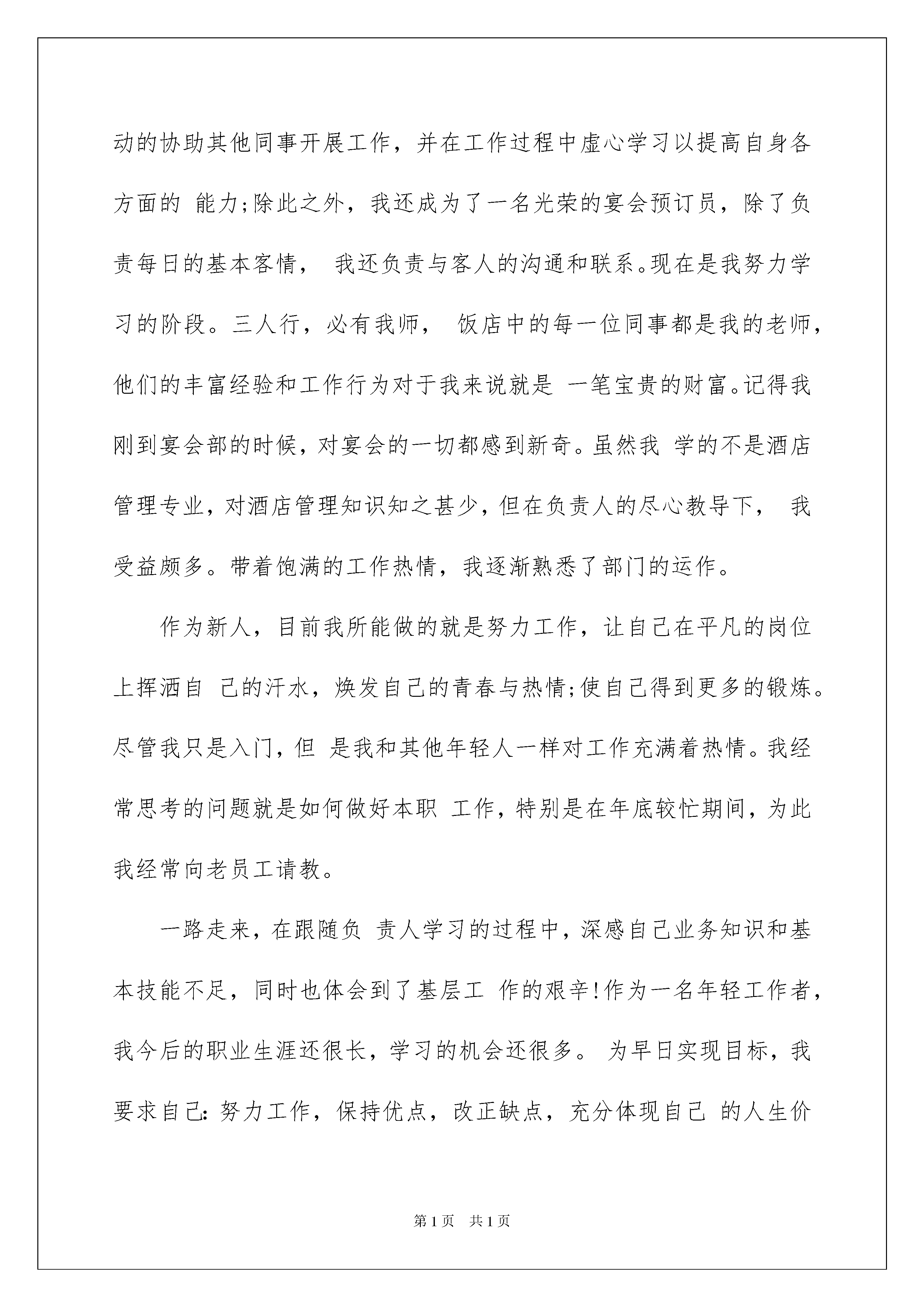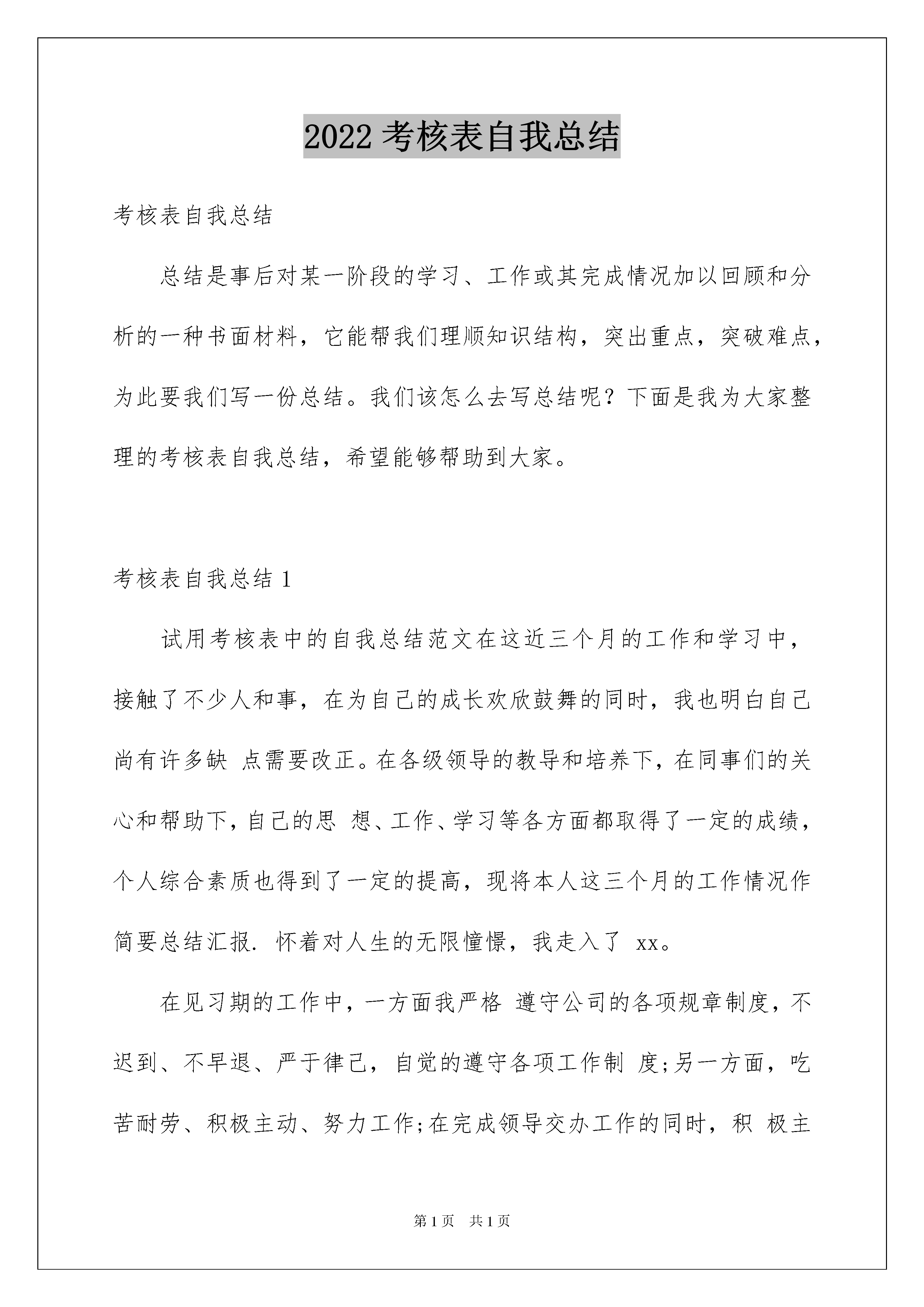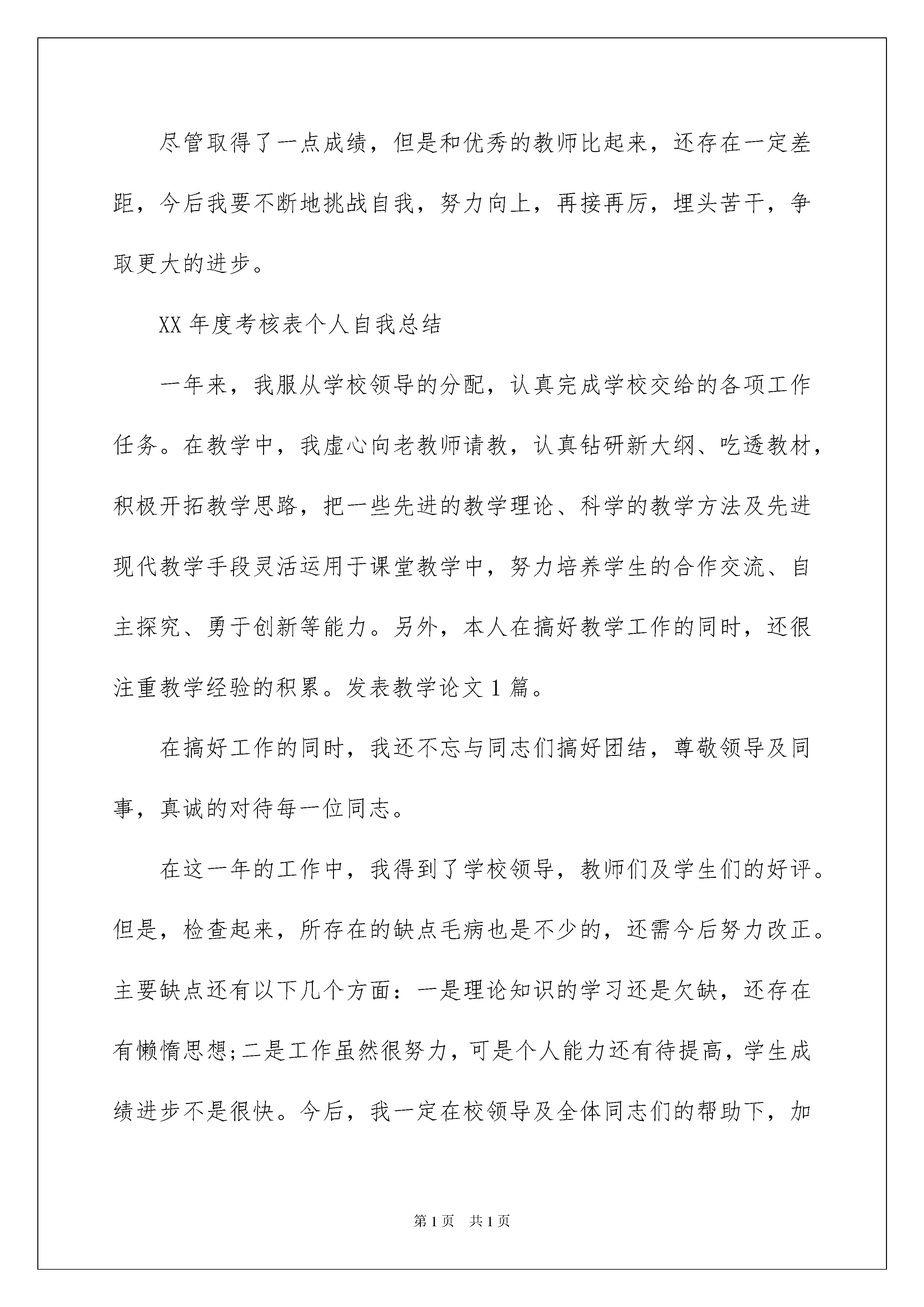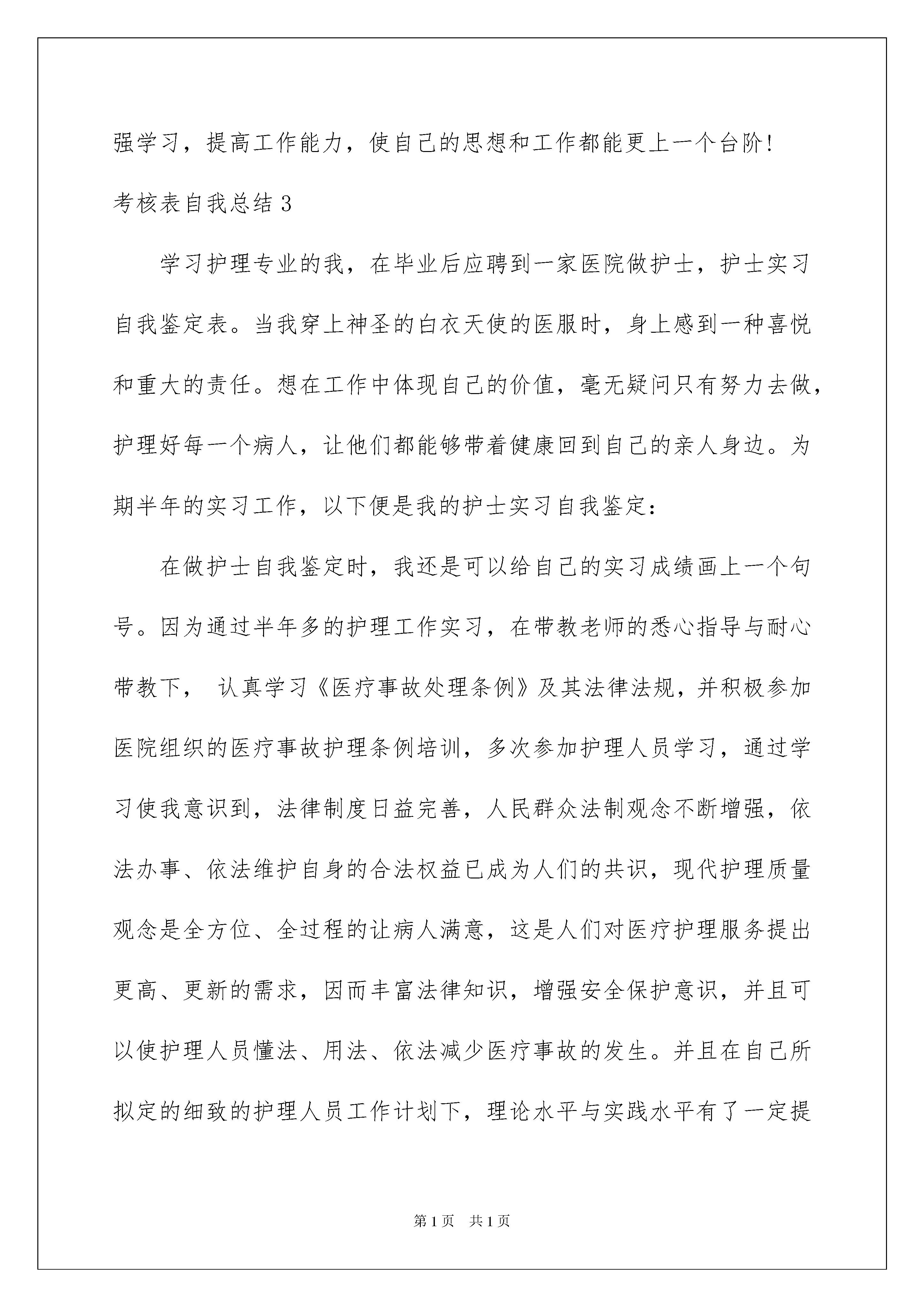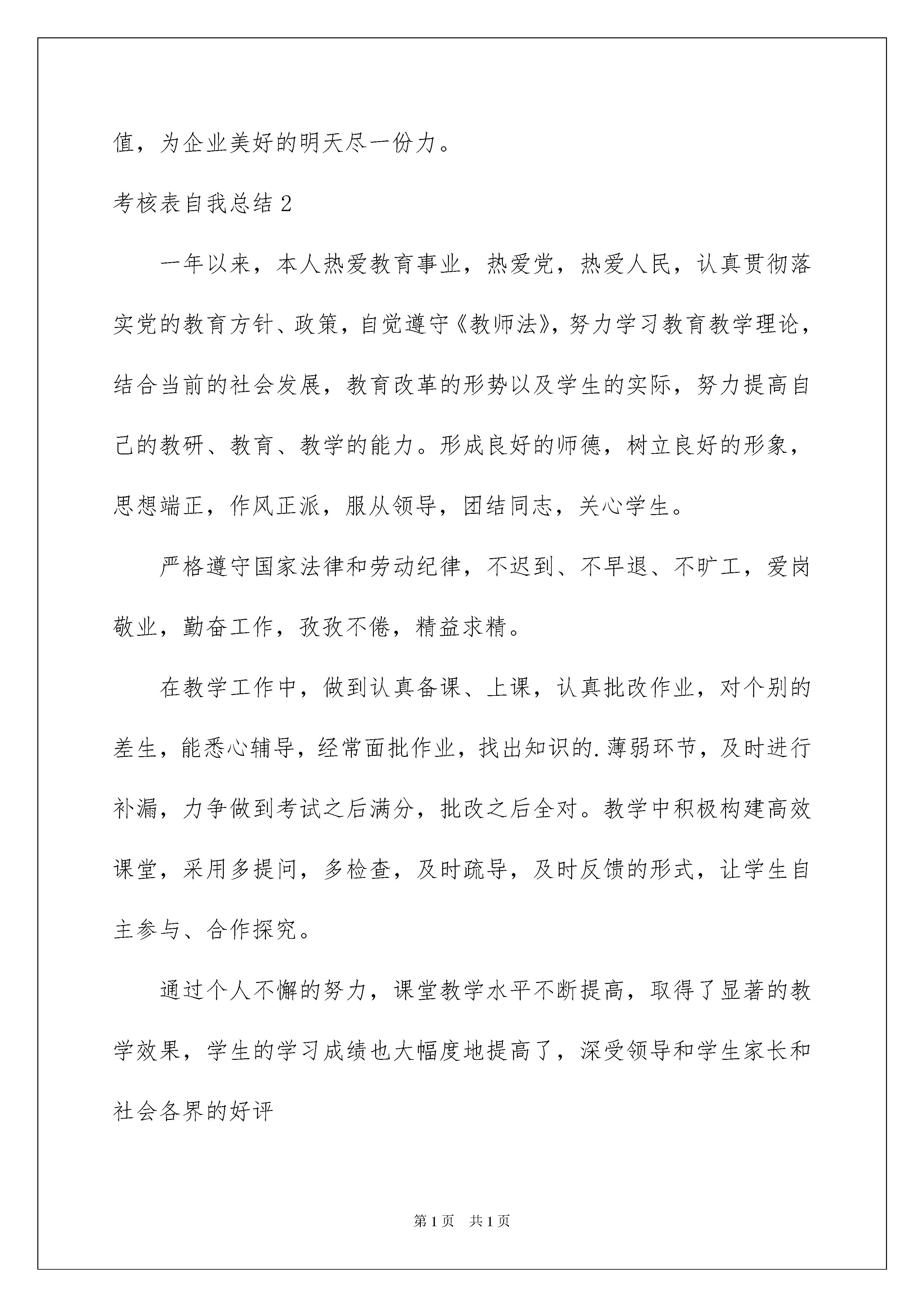 2022考核表自我总结考核表自我总结总结是事后对某一阶段的学习、工作或其完成情况加以回顾和分析的一种书面材料,它能帮我们理顺知识结构,突出重点,突破难点,为此要我们写一份总结。我们该怎么去写总结呢?下面是我为大家整理的考核表自我总结,希望能够帮助到大家。考核表自我总结1试用考核表中的自我总结范文在这近三个月的工作和学习中,接触了不少人和事,在为自己的成长欢欣鼓舞的同时,我也明白自己尚有许多缺点需要改正。在各级领导的教导和培养下,在同事们的关心和帮助下,自己的思想、工作、学习等各方面都取得了一定的成绩,个人综合素质也得到了一定的提高,现将本人这三个月的工作情况作简要总结汇报.怀着对人生的无限憧憬,我走入了xx。在见习期的工作中,一方面我严格遵守公司的各项规章制度,不迟到、不早退、严于律己,自觉的遵守各项工作制度;另一方面,吃苦耐劳、积极主动、努力工作;在完成领导交办工作的同时,积极主动的协助其他同事开展工作,并在工作过程中虚心学习以提高自身各方面的能力;除此之外,我还成为了一名光荣的宴会预订员,除了负责每日的基本客情,我还负责与客人的沟通和联系。现在是我努力学习的阶段。三人行,必有我师,饭店中的每一位同事都是我的老师,他们的丰富经验和工作行为对于我来说就是一笔宝贵的财富。记得我刚到宴会部的时候,对宴会的一切都感到新奇。虽然我学的不是酒店管理专业,对酒店管理知识知之甚少,但在负责人的尽心教导下,我受益颇多。带着饱满的工作热情,我逐渐熟悉了部门的运作。作为新人,目前我所能做的就是努力工作,让自己在平凡的岗位上挥洒自己的汗水,焕发自己的青春与热情;使自己得到更多的锻炼。尽管我只是入门,但是我和其他年轻人一样对工作充满着热情。我经常思考的问题就是如何做好本职工作,特别是在年底较忙期间,为此我经常向老员工请教。一路走来,在跟随负责人学习的过程中,深感自己业务知识和基本技能不足,同时也体会到了基层工作的艰辛!作为一名年轻工作者,我今后的职业生涯还很长,学习的机会还很多。为早日实现目标,我要求自己:努力工作,保持优点,改正缺点,充分体现自己的人生价值,为企业美好的明天尽一份力。考核表自我总结2一年以来,本人热爱教育事业,热爱党,热爱人民,认真贯彻落实党的教育方针、政策,自觉遵守《教师法》,努力学习教育教学理论,结合当前的社会发展,教育改革的形势以及学生的实际,努力提高自己的教研、教育、教学的能力。形成良好的师德,树立良好的形象,思想端正,作风正派,服从领导,团结同志,关心学生。严格遵守国家法律和劳动纪律,不迟到、不早退、不旷工,爱岗敬业,勤奋工作,孜孜不倦,精益求精。在教学工作中,做到认真备课、上课,认真批改作业,对个别的差生,能悉心辅导,经常面批作业,找出知识的.薄弱环节,及时进行补漏,力争做到考试之后满分,批改之后全对。教学中积极构建高效课堂,采用多提问,多检查,及时疏导,及时反馈的形式,让学生自主参与、合作探究。通过个人不懈的努力,课堂教学水平不断提高,取得了显著的教学效果,学生的学习成绩也大幅度地提高了,深受领导和学生家长和社会各界的好评尽管取得了一点成绩,但是和优秀的教师比起来,还存在一定差距,今后我要不断地挑战自我,努力向上,再接再厉,埋头苦干,争取更大的进步。XX年度考核表个人自我总结一年来,我服从学校领导的分配,认真完成学校交给的各项工作任务。在教学中,我虚心向老教师请教,认真钻研新大纲、吃透教材,积极开拓教学思路,把一些先进的教学理论、科学的教学方法及先进现代教学手段灵活运用于课堂教学中,努力培养学生的合作交流、自主探究、勇于创新等能力。另外,本人在搞好教学工作的同时,还很注重教学经验的积累。发表教学论文1篇。在搞好工作的同时,我还不忘与同志们搞好团结,尊敬领导及同事,真诚的对待每一位同志。在这一年的工作中,我得到了学校领导,教师们及学生们的好评。但是,检查起来,所存在的缺点毛病也是不少的,还需今后努力改正。主要缺点还有以下几个方面:一是理论知识的学习还是欠缺,还存在有懒惰思想;二是工作虽然很努力,可是个人能力还有待提高,学生成绩进步不是很快。今后,我一定在校领导及全体同志们的帮助下,加强学习,提高工作能力,使自己的思想和工作都能更上一个台阶!考核表自我总结3学习护理专业的我,在毕业后应聘到一家医院做护士,护士实习自我鉴定表。当我穿上神圣的白衣天使的医服时,身上感到一种喜悦和重大的责任。想在工作中体现自己的价值,毫无疑问只有努力去做,护理好每一个病人,让他们都能够带着健康回到自己的亲人身边。为期半年的实习工作,以下便是我的护士实习自我鉴定:在做护士自我鉴定时,我还是可以