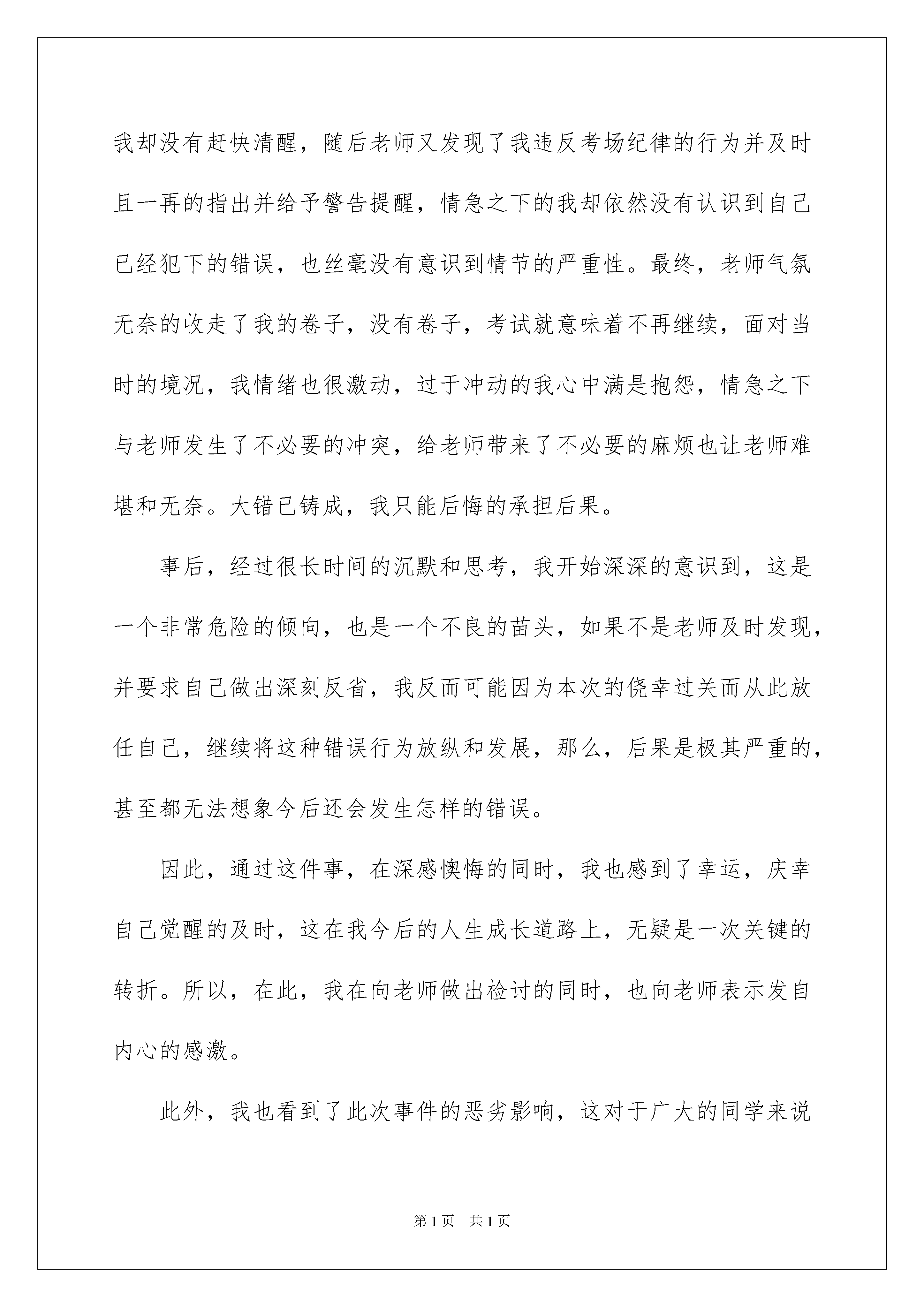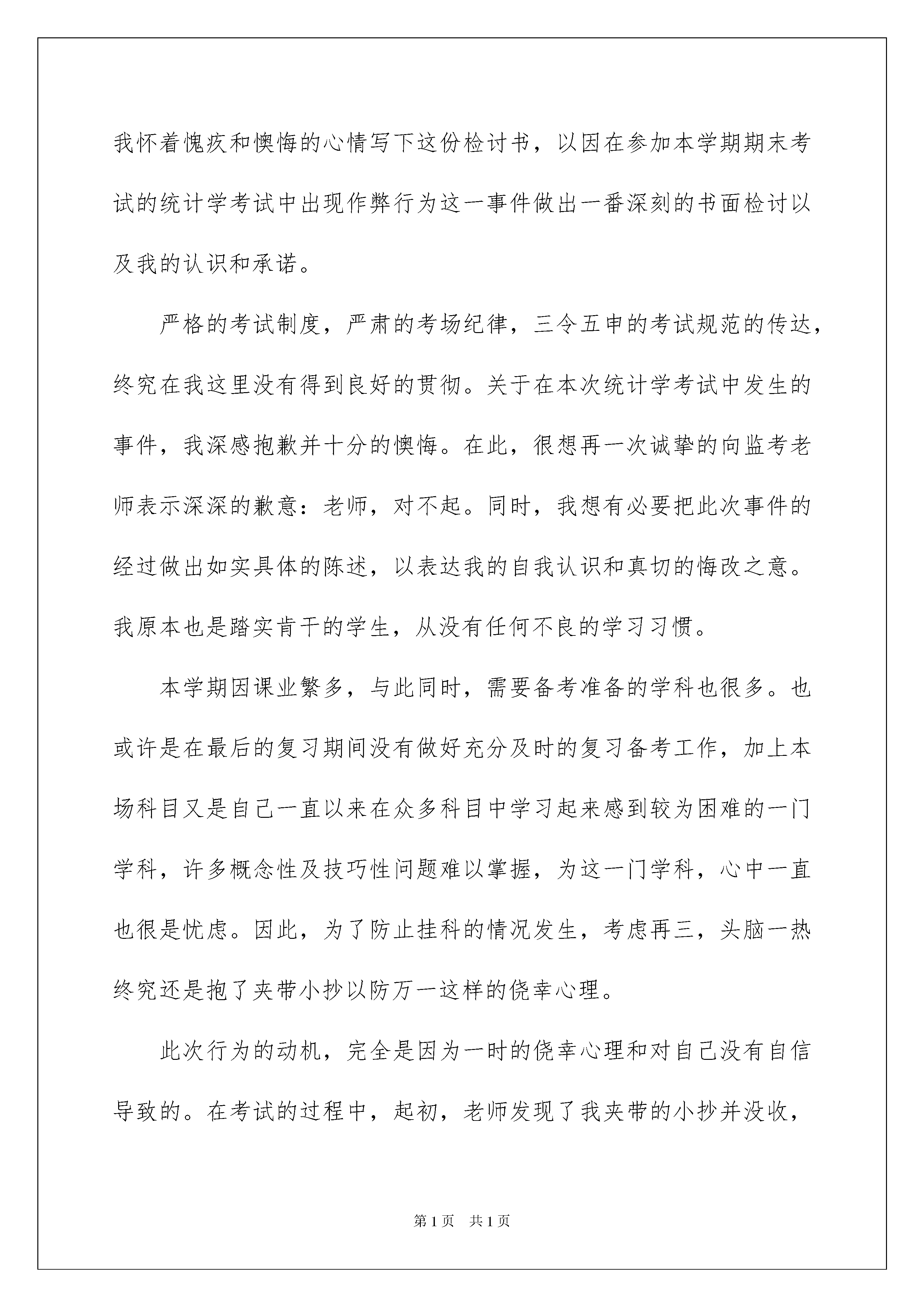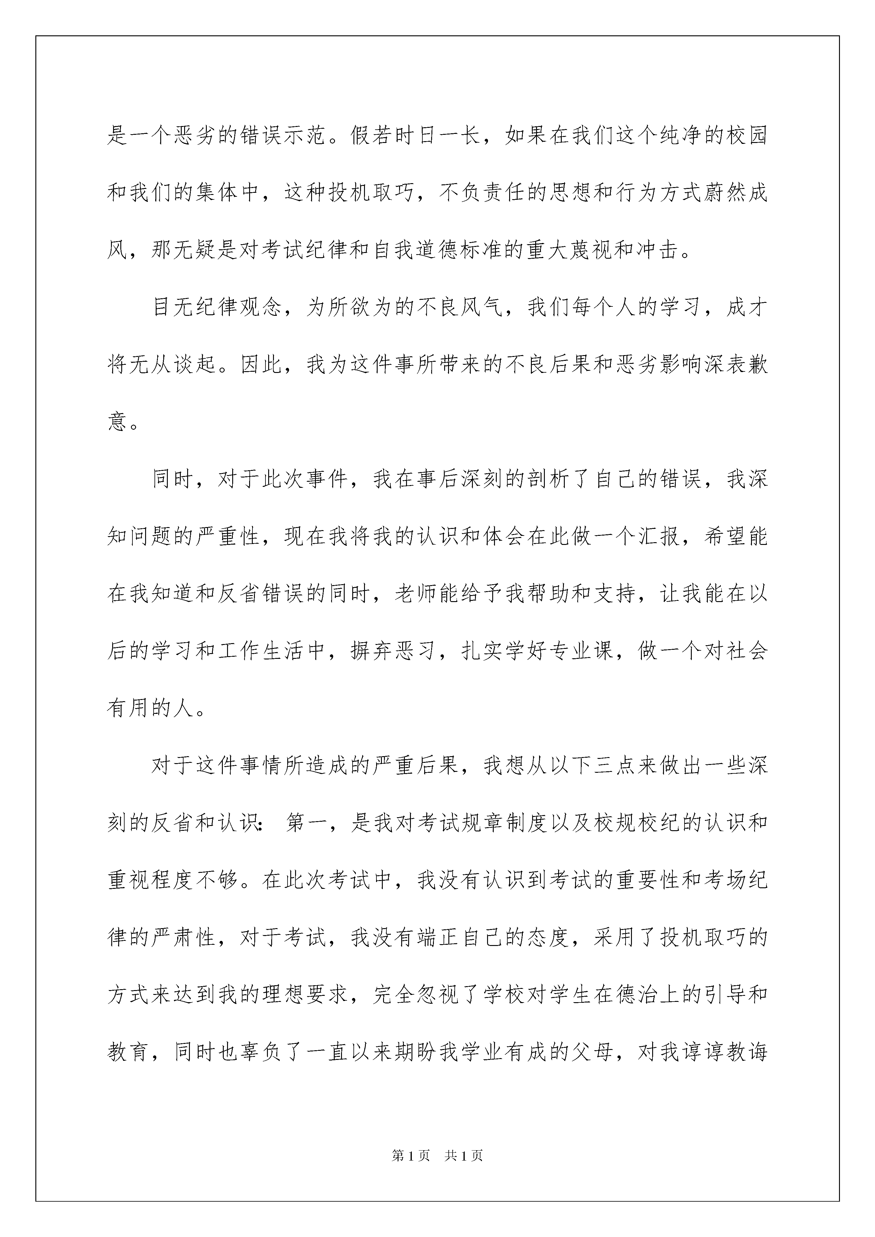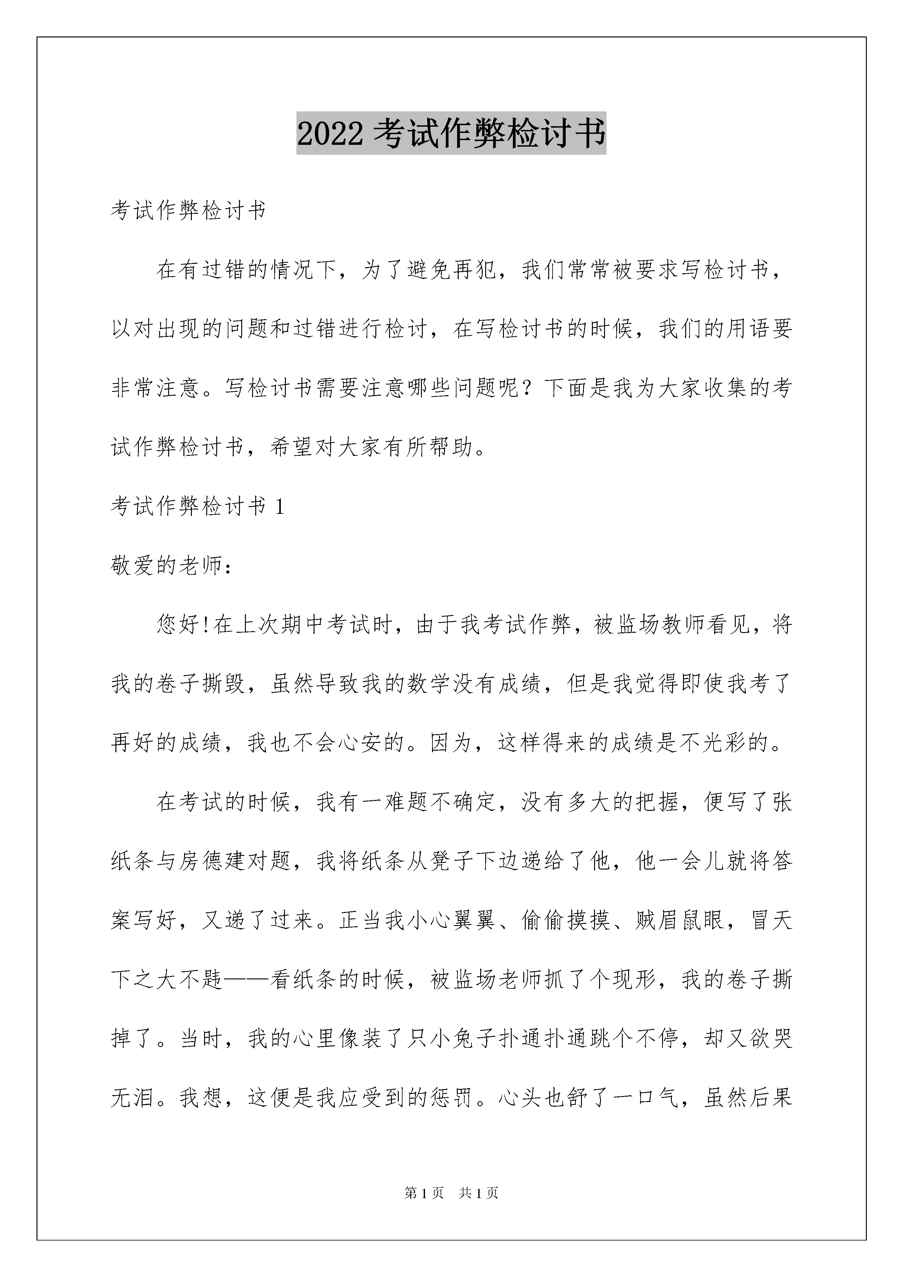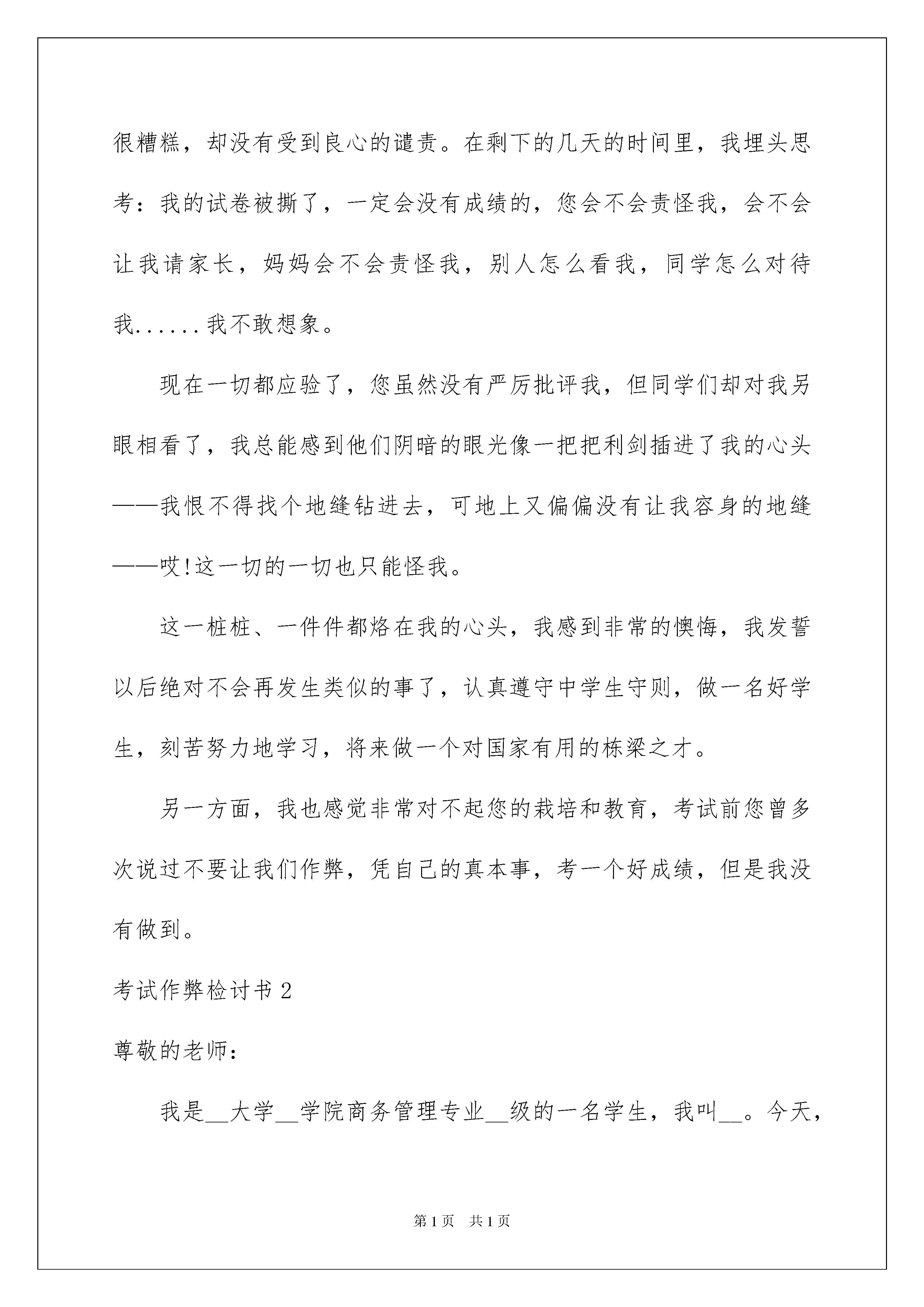 2022考试作弊检讨书考试作弊检讨书在有过错的情况下,为了避免再犯,我们常常被要求写检讨书,以对出现的问题和过错进行检讨,在写检讨书的时候,我们的用语要非常注意。写检讨书需要注意哪些问题呢?下面是我为大家收集的考试作弊检讨书,希望对大家有所帮助。考试作弊检讨书1敬爱的老师:您好!在上次期中考试时,由于我考试作弊,被监场教师看见,将我的卷子撕毁,虽然导致我的数学没有成绩,但是我觉得即使我考了再好的成绩,我也不会心安的。因为,这样得来的成绩是不光彩的。在考试的时候,我有一难题不确定,没有多大的把握,便写了张纸条与房德建对题,我将纸条从凳子下边递给了他,他一会儿就将答案写好,又递了过来。正当我小心翼翼、偷偷摸摸、贼眉鼠眼,冒天下之大不韪——看纸条的时候,被监场老师抓了个现形,我的卷子撕掉了。当时,我的心里像装了只小兔子扑通扑通跳个不停,却又欲哭无泪。我想,这便是我应受到的惩罚。心头也舒了一口气,虽然后果很糟糕,却没有受到良心的谴责。在剩下的几天的时间里,我埋头思考:我的试卷被撕了,一定会没有成绩的,您会不会责怪我,会不会让我请家长,妈妈会不会责怪我,别人怎么看我,同学怎么对待我......我不敢想象。现在一切都应验了,您虽然没有严厉批评我,但同学们却对我另眼相看了,我总能感到他们阴暗的眼光像一把把利剑插进了我的心头——我恨不得找个地缝钻进去,可地上又偏偏没有让我容身的地缝——哎!这一切的一切也只能怪我。这一桩桩、一件件都烙在我的心头,我感到非常的懊悔,我发誓以后绝对不会再发生类似的事了,认真遵守中学生守则,做一名好学生,刻苦努力地学习,将来做一个对国家有用的栋梁之才。另一方面,我也感觉非常对不起您的栽培和教育,考试前您曾多次说过不要让我们作弊,凭自己的真本事,考一个好成绩,但是我没有做到。考试作弊检讨书2尊敬的老师:我是__大学__学院商务管理专业__级的一名学生,我叫__。今天,我怀着愧疚和懊悔的心情写下这份检讨书,以因在参加本学期期末考试的统计学考试中出现作弊行为这一事件做出一番深刻的书面检讨以及我的认识和承诺。严格的考试制度,严肃的考场纪律,三令五申的考试规范的传达,终究在我这里没有得到良好的贯彻。关于在本次统计学考试中发生的事件,我深感抱歉并十分的懊悔。在此,很想再一次诚挚的向监考老师表示深深的歉意:老师,对不起。同时,我想有必要把此次事件的经过做出如实具体的陈述,以表达我的自我认识和真切的悔改之意。我原本也是踏实肯干的学生,从没有任何不良的学习习惯。本学期因课业繁多,与此同时,需要备考准备的学科也很多。也或许是在最后的复习期间没有做好充分及时的复习备考工作,加上本场科目又是自己一直以来在众多科目中学习起来感到较为困难的一门学科,许多概念性及技巧性问题难以掌握,为这一门学科,心中一直也很是忧虑。因此,为了防止挂科的情况发生,考虑再三,头脑一热终究还是抱了夹带小抄以防万一这样的侥幸心理。此次行为的动机,完全是因为一时的侥幸心理和对自己没有自信导致的。在考试的过程中,起初,老师发现了我夹带的小抄并没收,我却没有赶快清醒,随后老师又发现了我违反考场纪律的行为并及时且一再的指出并给予警告提醒,情急之下的我却依然没有认识到自己已经犯下的错误,也丝毫没有意识到情节的严重性。最终,老师气氛无奈的收走了我的卷子,没有卷子,考试就意味着不再继续,面对当时的境况,我情绪也很激动,过于冲动的我心中满是抱怨,情急之下与老师发生了不必要的冲突,给老师带来了不必要的麻烦也让老师难堪和无奈。大错已铸成,我只能后悔的承担后果。事后,经过很长时间的沉默和思考,我开始深深的意识到,这是一个非常危险的倾向,也是一个不良的苗头,如果不是老师及时发现,并要求自己做出深刻反省,我反而可能因为本次的侥幸过关而从此放任自己,继续将这种错误行为放纵和发展,那么,后果是极其严重的,甚至都无法想象今后还会发生怎样的错误。因此,通过这件事,在深感懊悔的同时,我也感到了幸运,庆幸自己觉醒的及时,这在我今后的人生成长道路上,无疑是一次关键的转折。所以,在此,我在向老师做出检讨的同时,也向老师表示发自内心的感激。此外,我也看到了此次事件的恶劣影响,这对于广大的同学来说是一个恶劣的错误示范。假若时日一长,如果在我们这个纯净的校园和我们的集体中,这种投机取巧,不负责任的思想和行为方式蔚然成风,那无疑是对考试纪律和自我道德标准的重大蔑视和冲击。目无纪律观念,为所欲为的不良风气,我们每个人的学习,成才将无从谈起。因此,我为这件事所带来的不良后果和恶劣影响深表歉意。同时,对于此次事件,我在事后深刻的剖析了自己的错误,我深知问题的严重性,现在