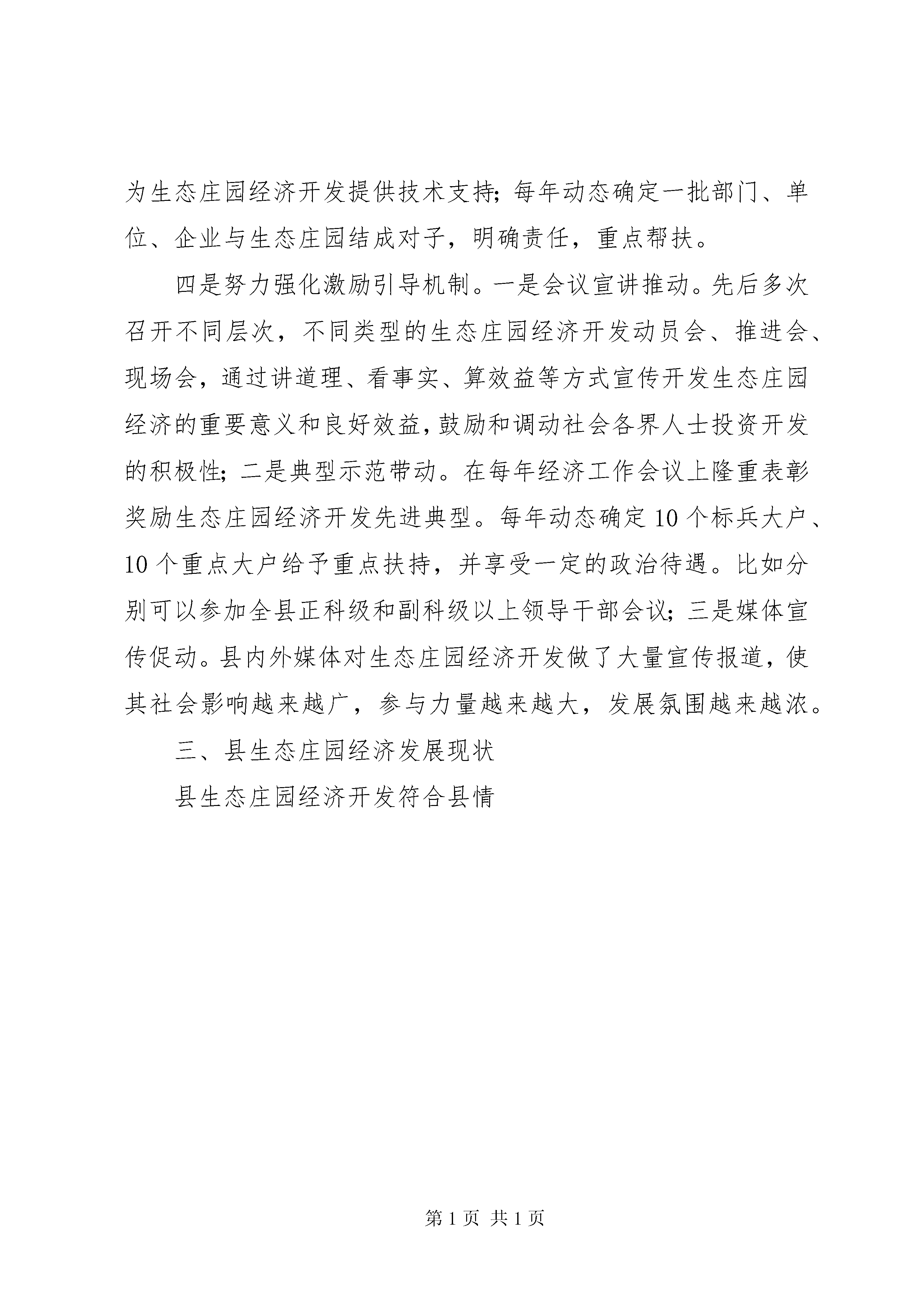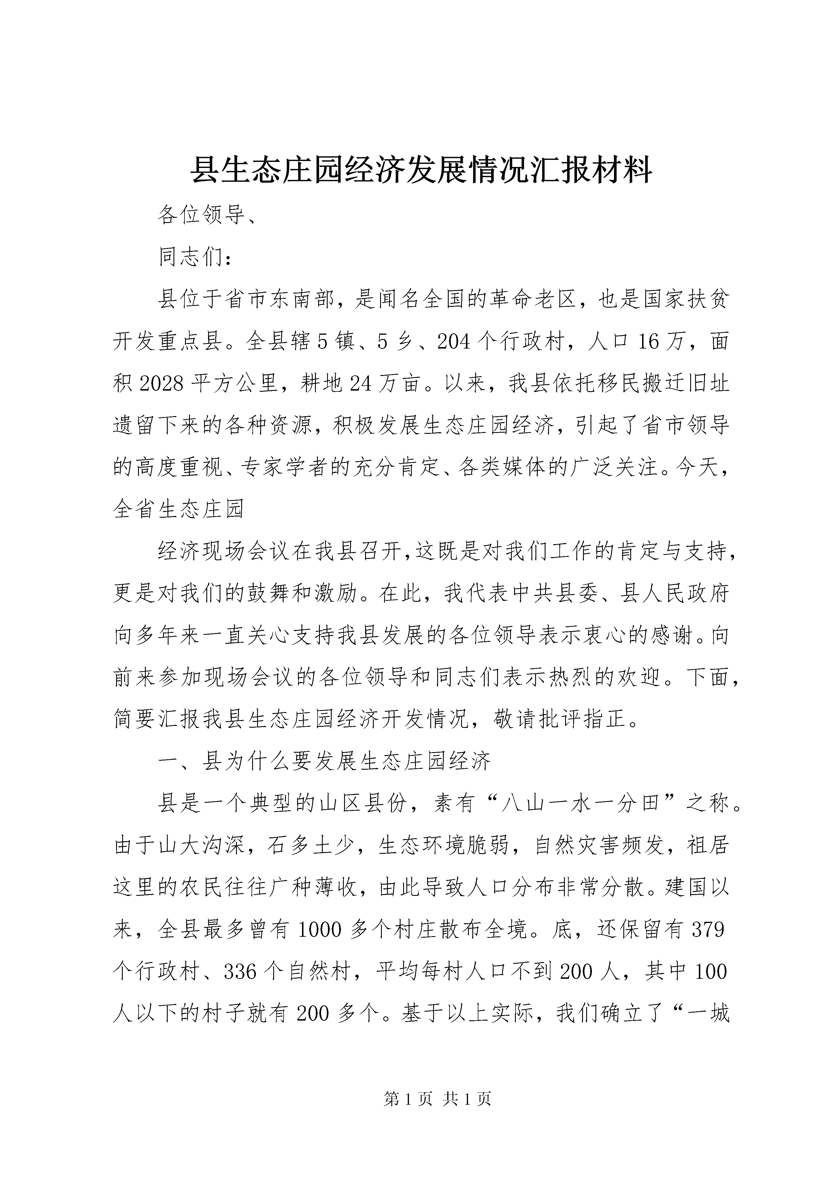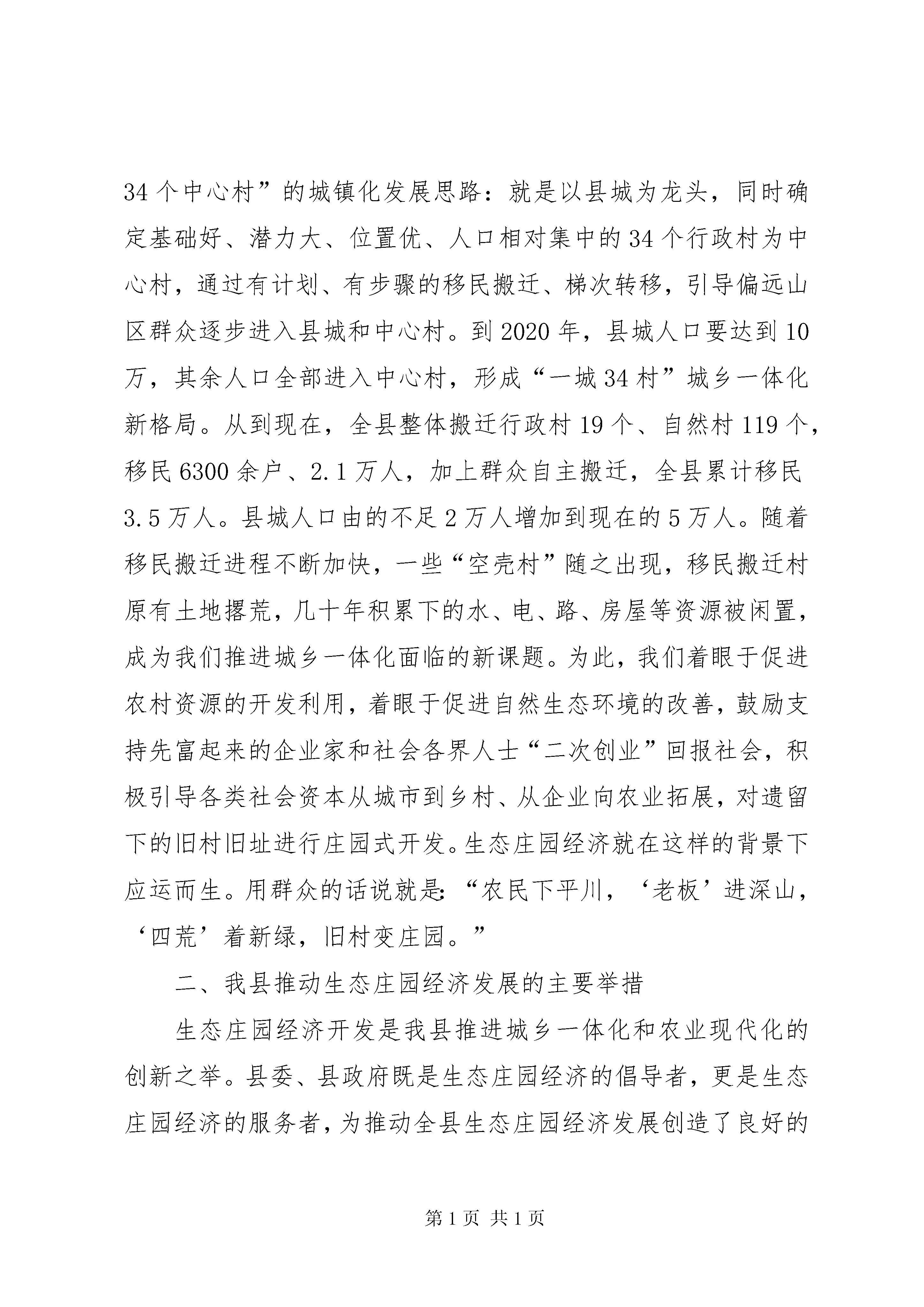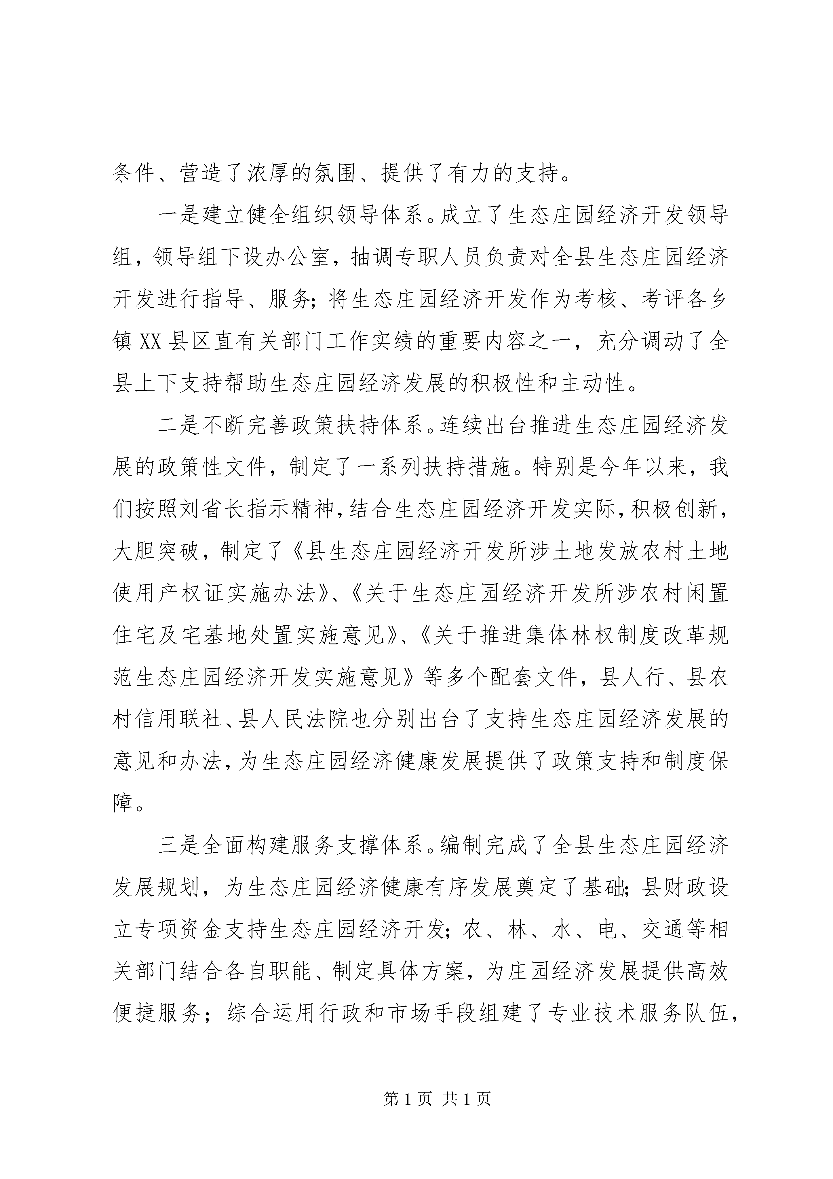 县生态庄园经济发展情况汇报材料各位领导、同志们:县位于省市东南部,是闻名全国的革命老区,也是国家扶贫开发重点县。全县辖5镇、5乡、204个行政村,人口16万,面积2028平方公里,耕地24万亩。以来,我县依托移民搬迁旧址遗留下来的各种资源,积极发展生态庄园经济,引起了省市领导的高度重视、专家学者的充分肯定、各类媒体的广泛关注。今天,全省生态庄园经济现场会议在我县召开,这既是对我们工作的肯定与支持,更是对我们的鼓舞和激励。在此,我代表中共县委、县人民政府向多年来一直关心支持我县发展的各位领导表示衷心的感谢。向前来参加现场会议的各位领导和同志们表示热烈的欢迎。下面,简要汇报我县生态庄园经济开发情况,敬请批评指正。一、县为什么要发展生态庄园经济县是一个典型的山区县份,素有“八山一水一分田”之称。由于山大沟深,石多土少,生态环境脆弱,自然灾害频发,祖居这里的农民往往广种薄收,由此导致人口分布非常分散。建国以来,全县最多曾有1000多个村庄散布全境。底,还保留有379个行政村、336个自然村,平均每村人口不到200人,其中100人以下的村子就有200多个。基于以上实际,我们确立了“一城34个中心村”的城镇化发展思路:就是以县城为龙头,同时确定基础好、潜力大、位置优、人口相对集中的34个行政村为中心村,通过有计划、有步骤的移民搬迁、梯次转移,引导偏远山区群众逐步进入县城和中心村。到2020年,县城人口要达到10万,其余人口全部进入中心村,形成“一城34村”城乡一体化新格局。从到现在,全县整体搬迁行政村19个、自然村119个,移民6300余户、2.1万人,加上群众自主搬迁,全县累计移民3.5万人。县城人口由的不足2万人增加到现在的5万人。随着移民搬迁进程不断加快,一些“空壳村”随之出现,移民搬迁村原有土地撂荒,几十年积累下的水、电、路、房屋等资源被闲置,成为我们推进城乡一体化面临的新课题。为此,我们着眼于促进农村资源的开发利用,着眼于促进自然生态环境的改善,鼓励支持先富起来的企业家和社会各界人士“二次创业”回报社会,积极引导各类社会资本从城市到乡村、从企业向农业拓展,对遗留下的旧村旧址进行庄园式开发。生态庄园经济就在这样的背景下应运而生。用群众的话说就是:“农民下平川,‘老板’进深山,‘四荒’着新绿,旧村变庄园。”二、我县推动生态庄园经济发展的主要举措生态庄园经济开发是我县推进城乡一体化和农业现代化的创新之举。县委、县政府既是生态庄园经济的倡导者,更是生态庄园经济的服务者,为推动全县生态庄园经济发展创造了良好的条件、营造了浓厚的氛围、提供了有力的支持。一是建立健全组织领导体系。成立了生态庄园经济开发领导组,领导组下设办公室,抽调专职人员负责对全县生态庄园经济开发进行指导、服务;将生态庄园经济开发作为考核、考评各乡镇XX县区直有关部门工作实绩的重要内容之一,充分调动了全县上下支持帮助生态庄园经济发展的积极性和主动性。二是不断完善政策扶持体系。连续出台推进生态庄园经济发展的政策性文件,制定了一系列扶持措施。特别是今年以来,我们按照刘省长指示精神,结合生态庄园经济开发实际,积极创新,大胆突破,制定了《县生态庄园经济开发所涉土地发放农村土地使用产权证实施办法》、《关于生态庄园经济开发所涉农村闲置住宅及宅基地处置实施意见》、《关于推进集体林权制度改革规范生态庄园经济开发实施意见》等多个配套文件,县人行、县农村信用联社、县人民法院也分别出台了支持生态庄园经济发展的意见和办法,为生态庄园经济健康发展提供了政策支持和制度保障。三是全面构建服务支撑体系。编制完成了全县生态庄园经济发展规划,为生态庄园经济健康有序发展奠定了基础;县财政设立专项资金支持生态庄园经济开发;农、林、水、电、交通等相关部门结合各自职能、制定具体方案,为庄园经济发展提供高效便捷服务;综合运用行政和市场手段组建了专业技术服务队伍,为生态庄园经济开发提供技术支持;每年动态确定一批部门、单位、企业与生态庄园结成对子,明确责任,重点帮扶。四是努力强化激励引导机制。一是会议宣讲推动。先后多次召开不同层次,不同类型的生态庄园经济开发动员会、推进会、现场会,通过讲道理、看事实、算效益等方式宣传开发生态庄园经济的重要意义和良好效益,鼓励和调动社会各界人士投资开发的积极性;二是典型示范带动。在每年经济工作会议上隆重表彰奖励生态庄园经济开发先进典型。每年动态确定10个标兵大户、10个重点大户给予重点扶持,并享受一定的政治待遇。比如分别可以参加全县正科级和副科级以上领导干部会议;三是媒体宣传促动。县内外媒体对生态庄园经济开发做了大量宣传报道,使其社会影响越来越广,参与力量越来越大,发展氛围越来越浓。三、县生态庄园经济发展现状县生态庄园经济开发符合县情