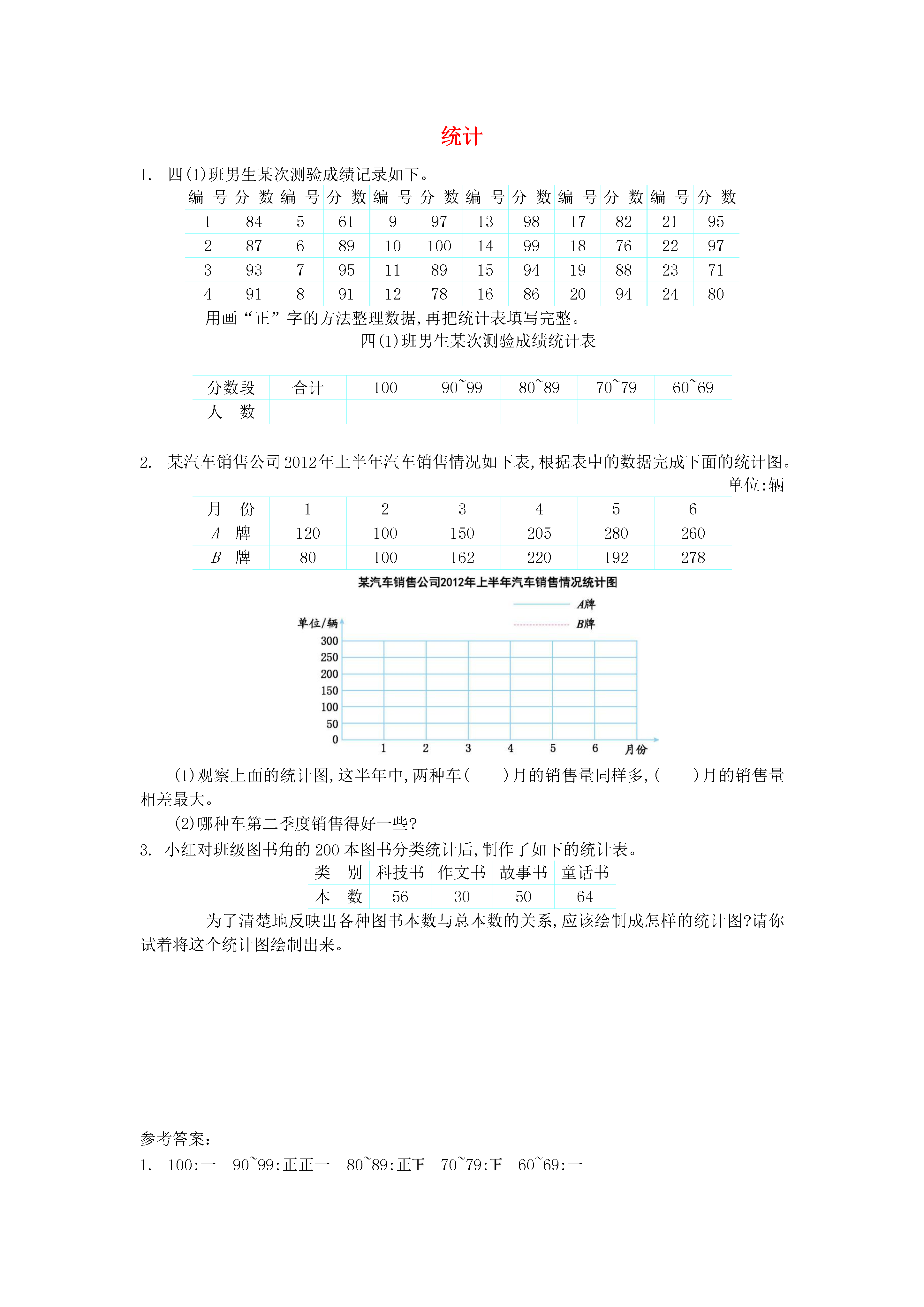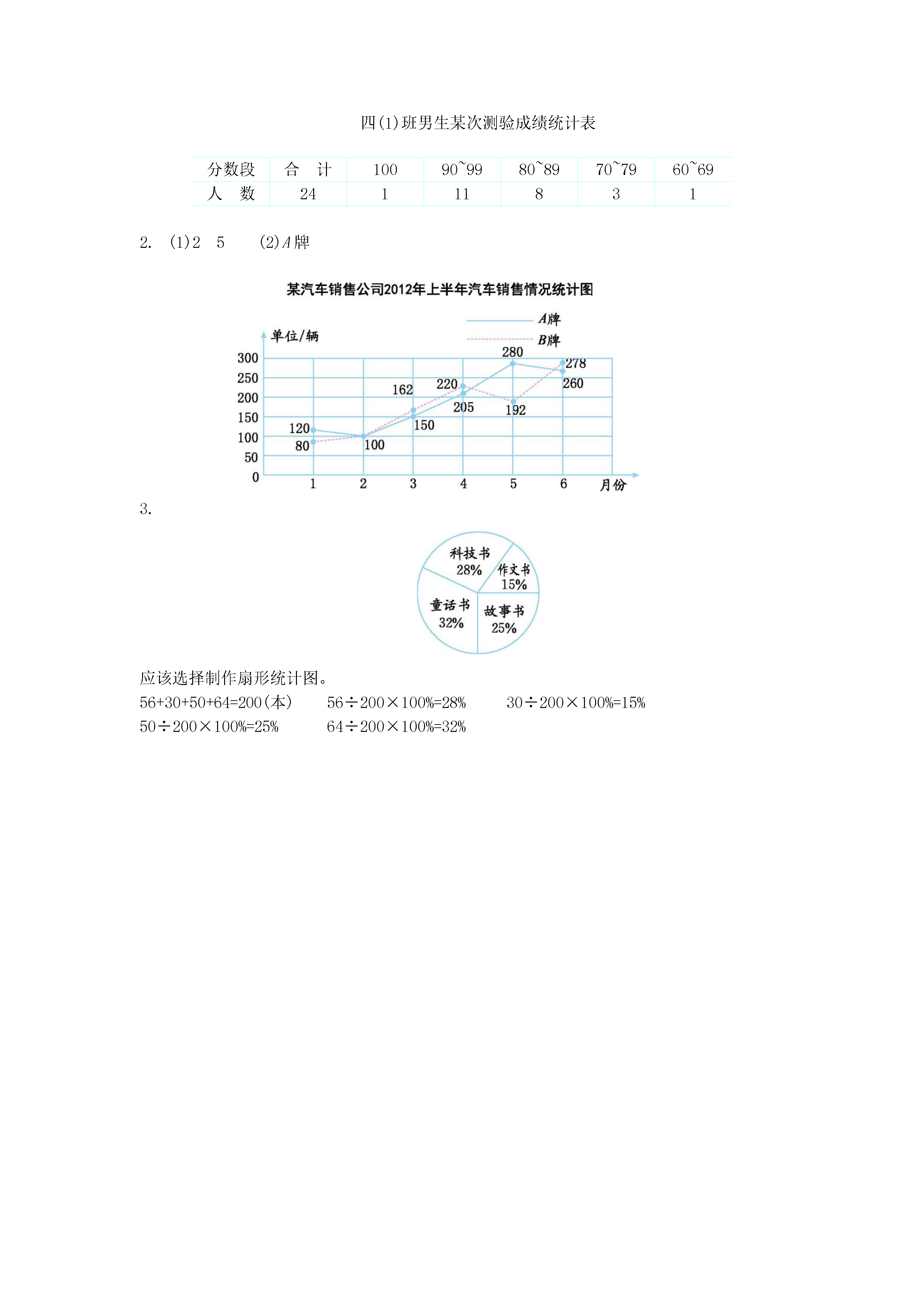 统计四(1)班男生某次测验成绩记录如下。编号分数编号分数编号分数编号分数编号分数编号分数1845619971398178221952876891010014991876229739379511891594198823714918911278168620942480用画“正”字的方法整理数据,再把统计表填写完整。四(1)班男生某次测验成绩统计表分数段合计10090~9980~8970~7960~69人数某汽车销售公司2012年上半年汽车销售情况如下表,根据表中的数据完成下面的统计图。单位:辆月份123456A牌120100150205280260B牌80100162220192278(1)观察上面的统计图,这半年中,两种车()月的销售量同样多,()月的销售量相差最大。(2)哪种车第二季度销售得好一些?3.小红对班级图书角的200本图书分类统计后,制作了如下的统计表。类别科技书作文书故事书童话书本数56305064为了清楚地反映出各种图书本数与总本数的关系,应该绘制成怎样的统计图?请你试着将这个统计图绘制出来。参考答案:100:一90~99:正正一80~89:正70~79:60~69:一四(1)班男生某次测验成绩统计表分数段合计10090~9980~8970~7960~69人数24111831(1)25(2)A牌应该选择制作扇形统计图。56+30+50+64=200(本)56÷200×100%=28%30÷200×100%=15%50÷200×100%=25%64÷200×100%=32%