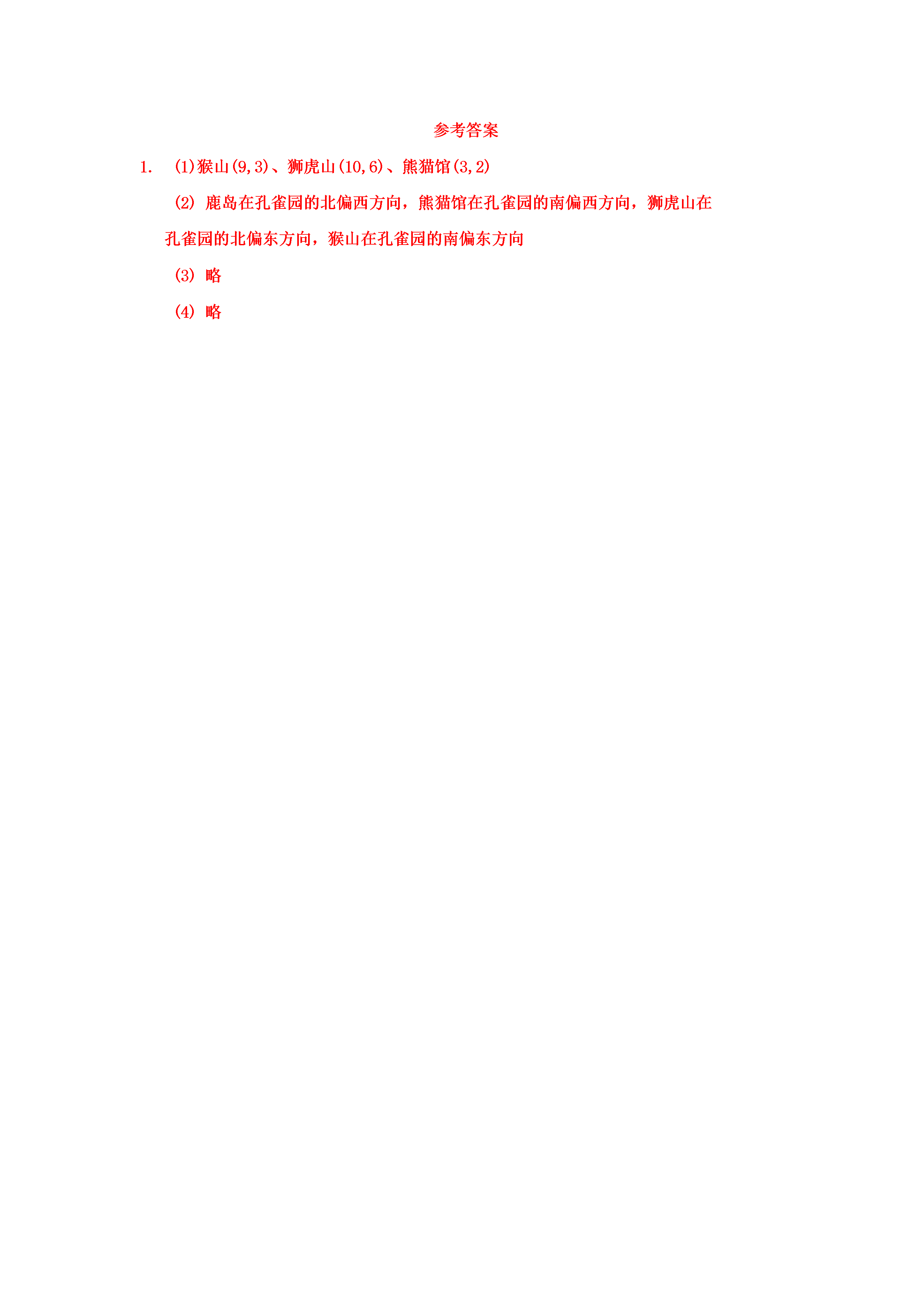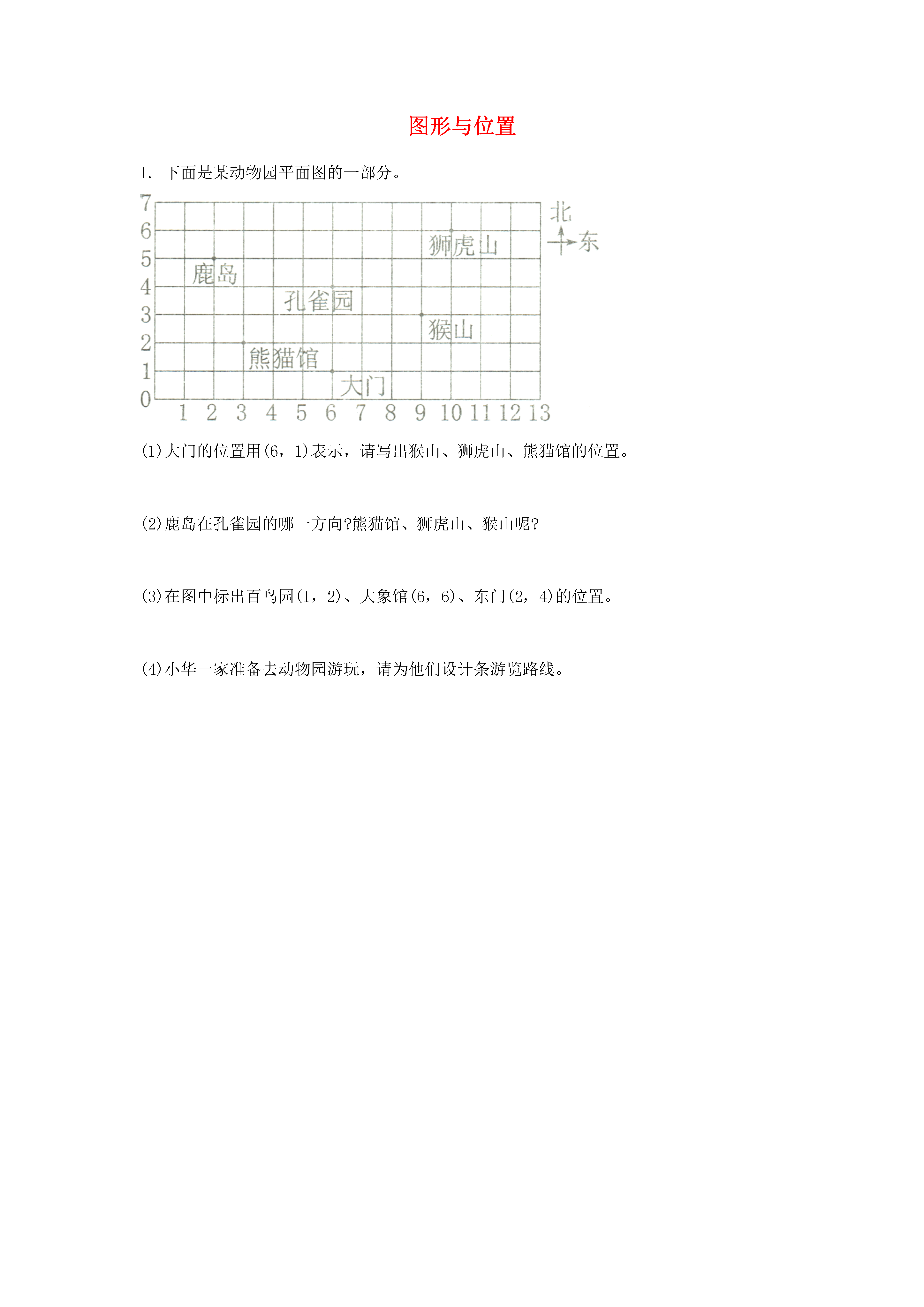 图形与位置下面是某动物园平面图的一部分。(1)大门的位置用(6,1)表示,请写出猴山、狮虎山、熊猫馆的位置。(2)鹿岛在孔雀园的哪一方向?熊猫馆、狮虎山、猴山呢?(3)在图中标出百鸟园(1,2)、大象馆(6,6)、东门(2,4)的位置。(4)小华一家准备去动物园游玩,请为他们设计条游览路线。参考答案(1)猴山(9,3)、狮虎山(10,6)、熊猫馆(3,2)鹿岛在孔雀园的北偏西方向,熊猫馆在孔雀园的南偏西方向,狮虎山在孔雀园的北偏东方向,猴山在孔雀园的南偏东方向略略