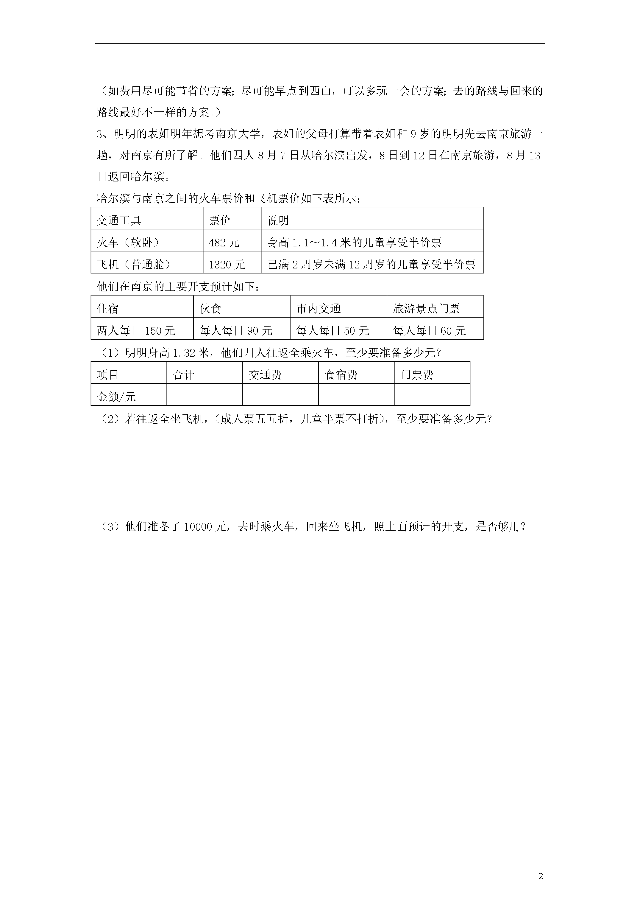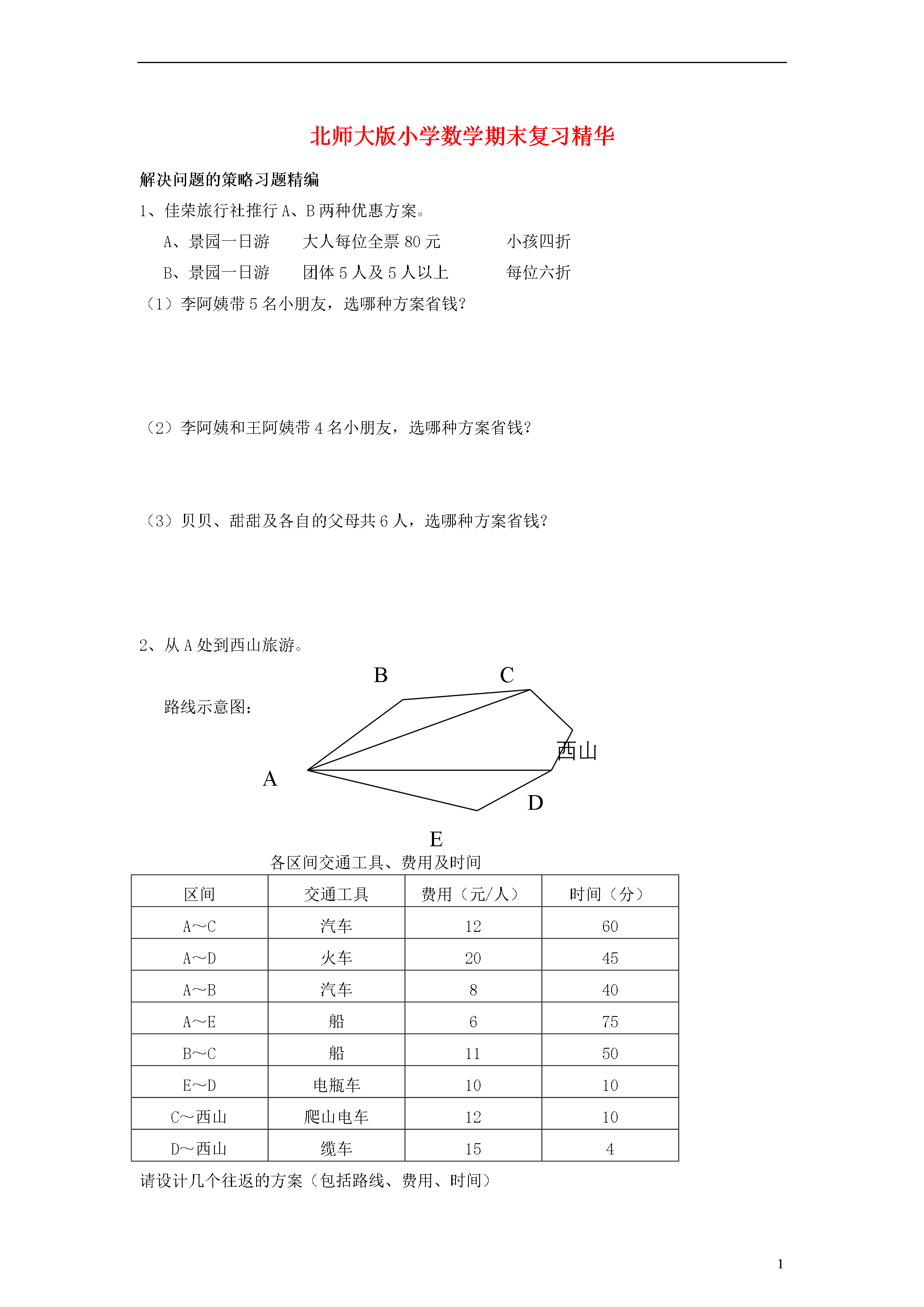 2北师大版小学数学期末复习精华解决问题的策略习题精编1、佳荣旅行社推行A、B两种优惠方案。A、景园一日游大人每位全票80元小孩四折B、景园一日游团体5人及5人以上每位六折(1)李阿姨带5名小朋友,选哪种方案省钱?(2)李阿姨和王阿姨带4名小朋友,选哪种方案省钱?(3)贝贝、甜甜及各自的父母共6人,选哪种方案省钱?CB2、从A处到西山旅游。路线示意图:西山ADE各区间交通工具、费用及时间区间交通工具费用(元/人)时间(分)A~C汽车1260A~D火车2045A~B汽车840A~E船675B~C船1150E~D电瓶车1010C~西山爬山电车1210D~西山缆车154请设计几个往返的方案(包括路线、费用、时间)(如费用尽可能节省的方案;尽可能早点到西山,可以多玩一会的方案;去的路线与回来的路线最好不一样的方案。)3、明明的表姐明年想考南京大学,表姐的父母打算带着表姐和9岁的明明先去南京旅游一趟,对南京有所了解。他们四人8月7日从哈尔滨出发,8日到12日在南京旅游,8月13日返回哈尔滨。哈尔滨与南京之间的火车票价和飞机票价如下表所示:交通工具票价说明火车(软卧)482元身高1.1~1.4米的儿童享受半价票飞机(普通舱)1320元已满2周岁未满12周岁的儿童享受半价票他们在南京的主要开支预计如下:住宿伙食市内交通旅游景点门票两人每日150元每人每日90元每人每日50元每人每日60元(1)明明身高1.32米,他们四人往返全乘火车,至少要准备多少元?项目合计交通费食宿费门票费金额/元(2)若往返全坐飞机,(成人票五五折,儿童半票不打折),至少要准备多少元?(3)他们准备了10000元,去时乘火车,回来坐飞机,照上面预计的开支,是否够用?