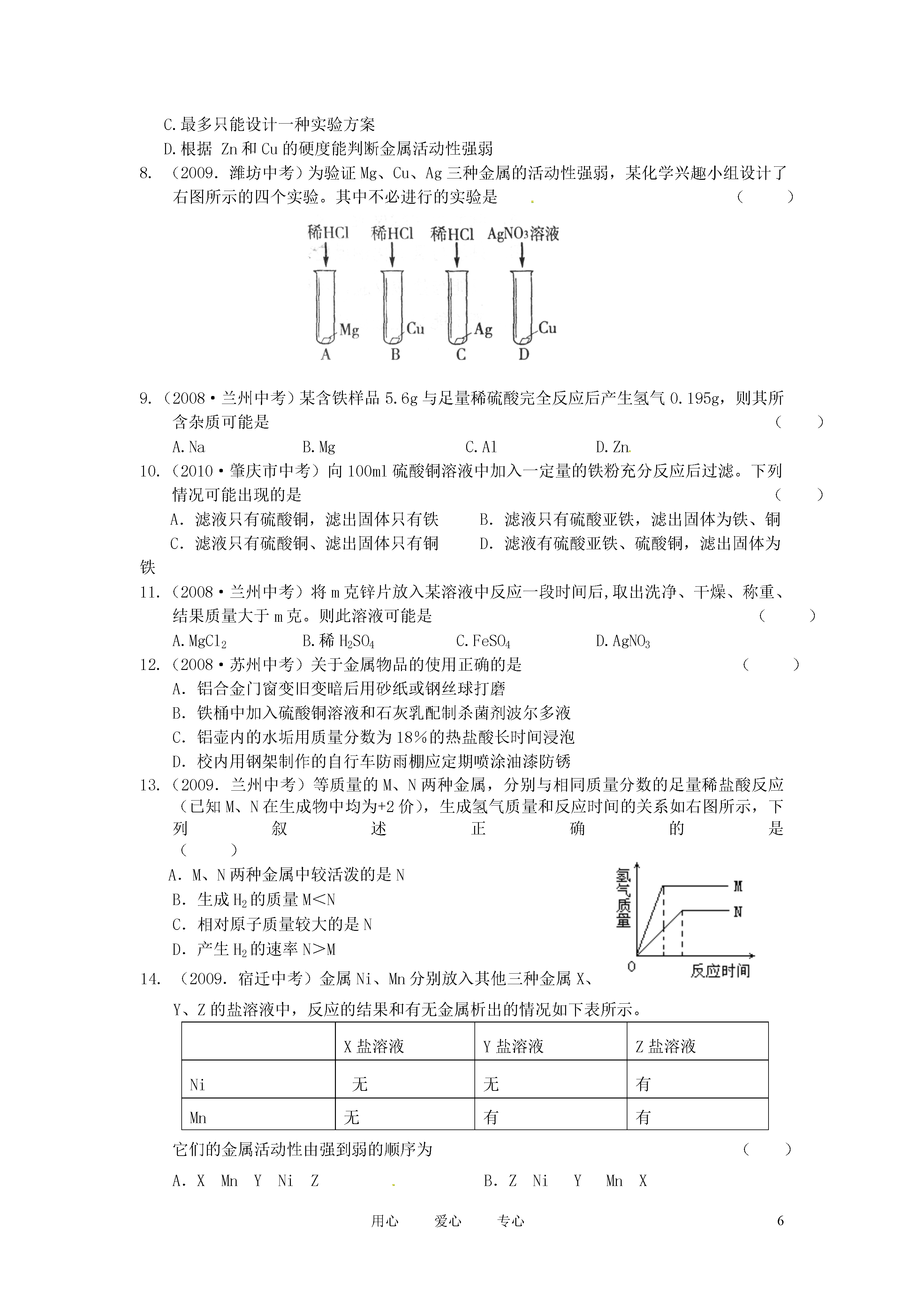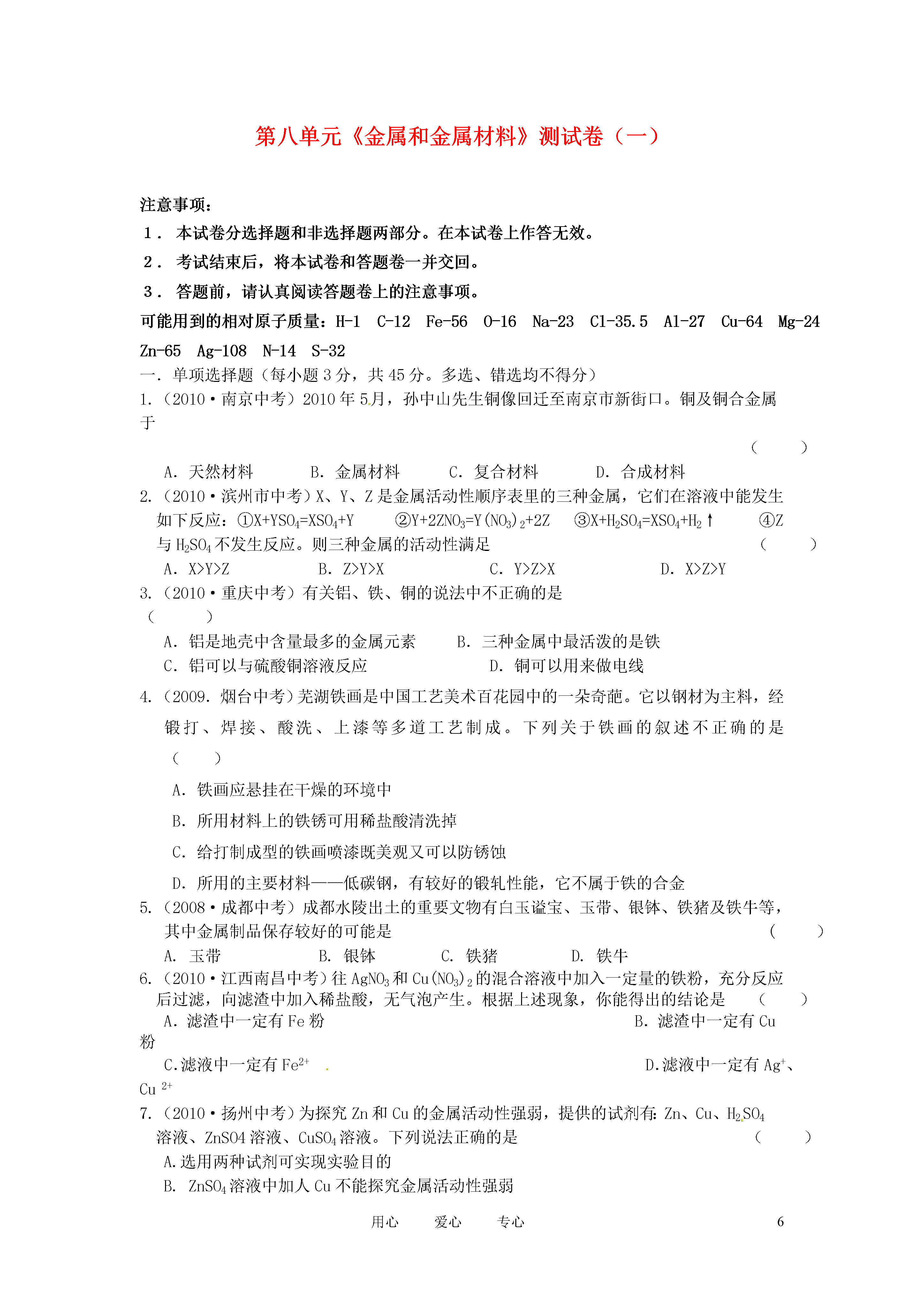 6用心爱心专心第八单元《金属和金属材料》测试卷(一)注意事项:本试卷分选择题和非选择题两部分。在本试卷上作答无效。考试结束后,将本试卷和答题卷一并交回。答题前,请认真阅读答题卷上的注意事项。可能用到的相对原子质量:H-1C-12Fe-56O-16Na-23Cl-35.5Al-27Cu-64Mg-24Zn-65Ag-108N-14S-32一.单项选择题(每小题3分,共45分。多选、错选均不得分)1.(2010·南京中考)2010年5月,孙中山先生铜像回迁至南京市新街口。铜及铜合金属于()A.天然材料B.金属材料C.复合材料D.合成材料2.(2010·滨州市中考)X、Y、Z是金属活动性顺序表里的三种金属,它们在溶液中能发生如下反应:①X+YSO4=XSO4+Y②Y+2ZNO3=Y(NO3)2+2Z③X+H2SO4=XSO4+H2↑④Z与H2SO4不发生反应。则三种金属的活动性满足()A.X>Y>ZB.Z>Y>XC.Y>Z>XD.X>Z>Y3.(2010·重庆中考)有关铝、铁、铜的说法中不正确的是()A.铝是地壳中含量最多的金属元素B.三种金属中最活泼的是铁C.铝可以与硫酸铜溶液反应D.铜可以用来做电线4.(2009.烟台中考)芜湖铁画是中国工艺美术百花园中的一朵奇葩。它以钢材为主料,经锻打、焊接、酸洗、上漆等多道工艺制成。下列关于铁画的叙述不正确的是()A.铁画应悬挂在干燥的环境中B.所用材料上的铁锈可用稀盐酸清洗掉C.给打制成型的铁画喷漆既美观又可以防锈蚀D.所用的主要材料——低碳钢,有较好的锻轧性能,它不属于铁的合金5.(2008·成都中考)成都水陵出土的重要文物有白玉谥宝、玉带、银钵、铁猪及铁牛等,其中金属制品保存较好的可能是()A.玉带B.银钵C.铁猪D.铁牛6.(2010·江西南昌中考)往AgNO3和Cu(NO3)2的混合溶液中加入一定量的铁粉,充分反应后过滤,向滤渣中加入稀盐酸,无气泡产生。根据上述现象,你能得出的结论是()A.滤渣中一定有Fe粉B.滤渣中一定有Cu粉C.滤液中一定有Fe2+D.滤液中一定有Ag+、Cu2+7.(2010·扬州中考)为探究Zn和Cu的金属活动性强弱,提供的试剂有:Zn、Cu、H2SO4溶液、ZnSO4溶液、CuSO4溶液。下列说法正确的是()A.选用两种试剂可实现实验目的B.ZnSO4溶液中加人Cu不能探究金属活动性强弱C.最多只能设计一种实验方案D.根据Zn和Cu的硬度能判断金属活动性强弱8.(2009.潍坊中考)为验证Mg、Cu、Ag三种金属的活动性强弱,某化学兴趣小组设计了右图所示的四个实验。其中不必进行的实验是()9.(2008·兰州中考)某含铁样品5.6g与足量稀硫酸完全反应后产生氢气0.195g,则其所含杂质可能是()A.NaB.MgC.AlD.Zn10.(2010·肇庆市中考)向100ml硫酸铜溶液中加入一定量的铁粉充分反应后过滤。下列情况可能出现的是()A.滤液只有硫酸铜,滤出固体只有铁B.滤液只有硫酸亚铁,滤出固体为铁、铜C.滤液只有硫酸铜、滤出固体只有铜D.滤液有硫酸亚铁、硫酸铜,滤出固体为铁11.(2008·兰州中考)将m克锌片放入某溶液中反应一段时间后,取出洗净、干燥、称重、结果质量大于m克。则此溶液可能是()A.MgCl2B.稀H2SO4C.FeSO4D.AgNO312.(2008·苏州中考)关于金属物品的使用正确的是()A.铝合金门窗变旧变暗后用砂纸或钢丝球打磨B.铁桶中加入硫酸铜溶液和石灰乳配制杀菌剂波尔多液C.铝壶内的水垢用质量分数为18%的热盐酸长时间浸泡D.校内用钢架制作的自行车防雨棚应定期喷涂油漆防锈13.(2009.兰州中考)等质量的M、N两种金属,分别与相同质量分数的足量稀盐酸反应(已知M、N在生成物中均为+2价),生成氢气质量和反应时间的关系如右图所示,下列叙述正确的是()A.M、N两种金属中较活泼的是NB.生成H2的质量M<NC.相对原子质量较大的是ND.产生H2的速率N>M14.(2009.宿迁中考)金属Ni、Mn分别放入其他三种金属X、Y、Z的盐溶液中,反应的结果和有无金属析出的情况如下表所示。X盐溶液Y盐溶液Z盐溶液Ni无无有Mn无有有它们的金属活动性由强到弱的顺序为()A.XMnYNiZB.ZNiYMnXC.ZMnYNiXD.XMnNiYZ15.(2008·宜昌中考)向氧化铜和铁粉的混合物中加入一定量的稀硫酸,微热,充分反应后过滤。以下判断错误的是()A.