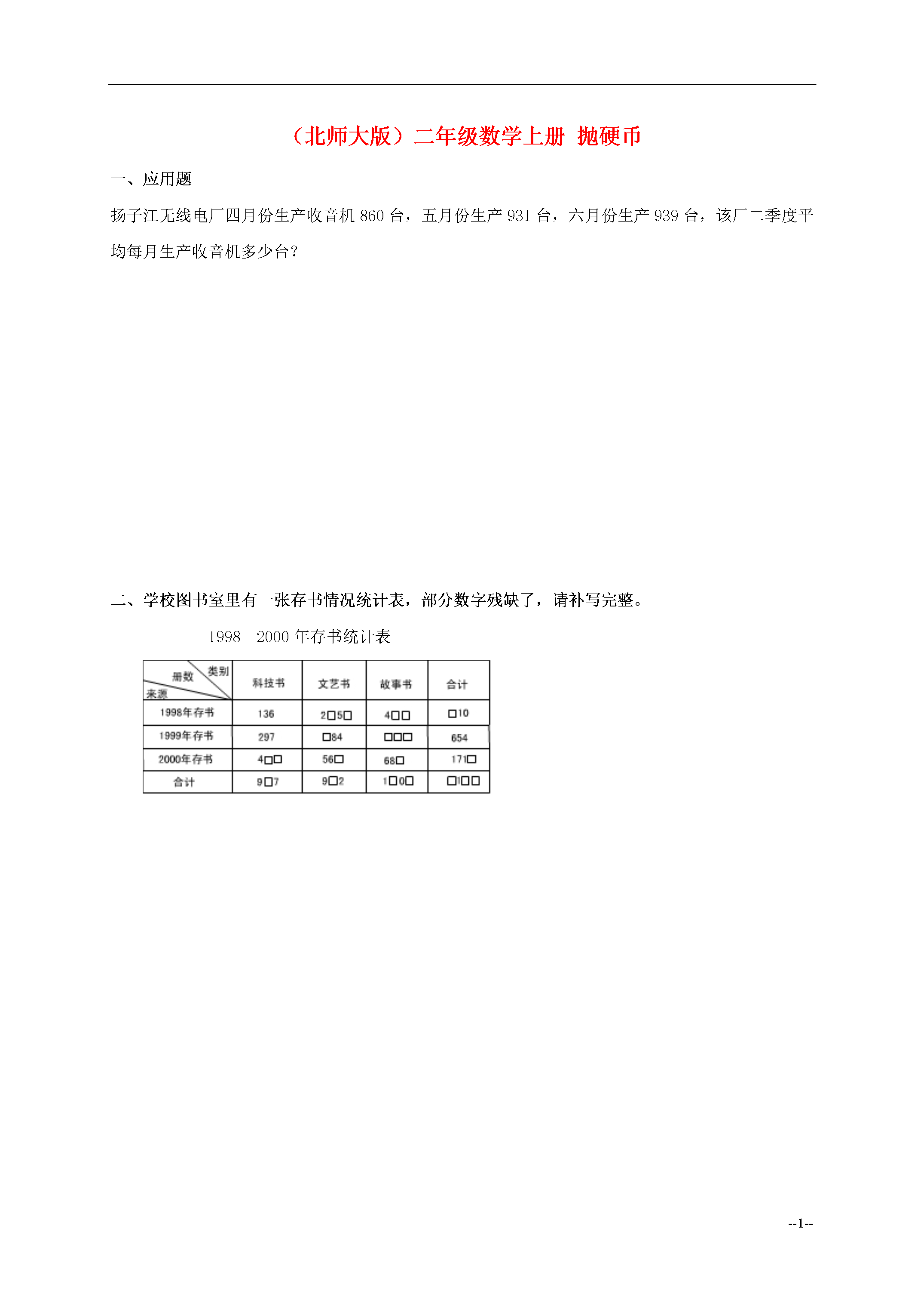--1--(北师大版)二年级数学上册抛硬币一、应用题扬子江无线电厂四月份生产收音机860台,五月份生产931台,六月份生产939台,该厂二季度平均每月生产收音机多少台?二、学校图书室里有一张存书情况统计表,部分数字残缺了,请补写完整。1998—2000年存书统计表