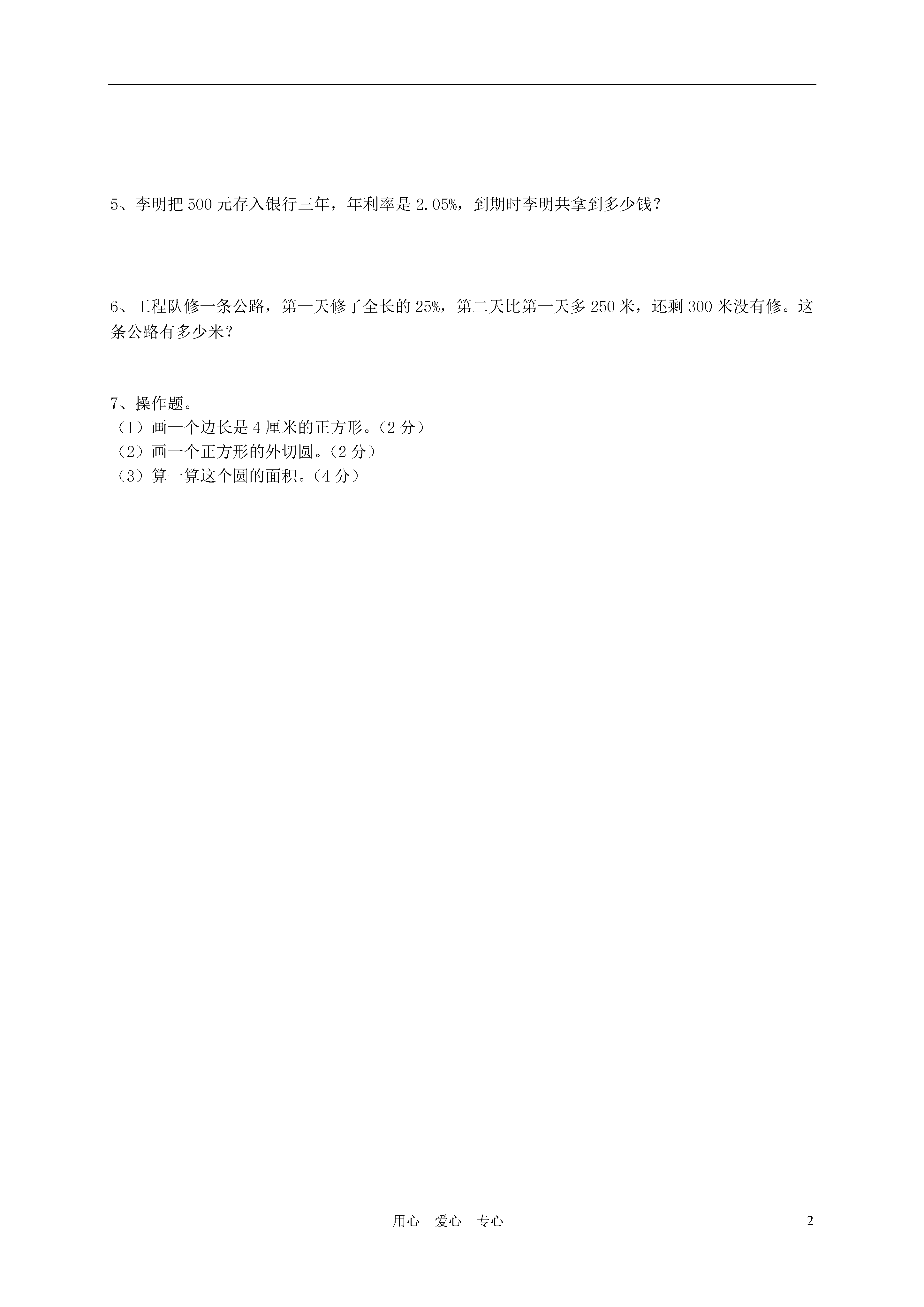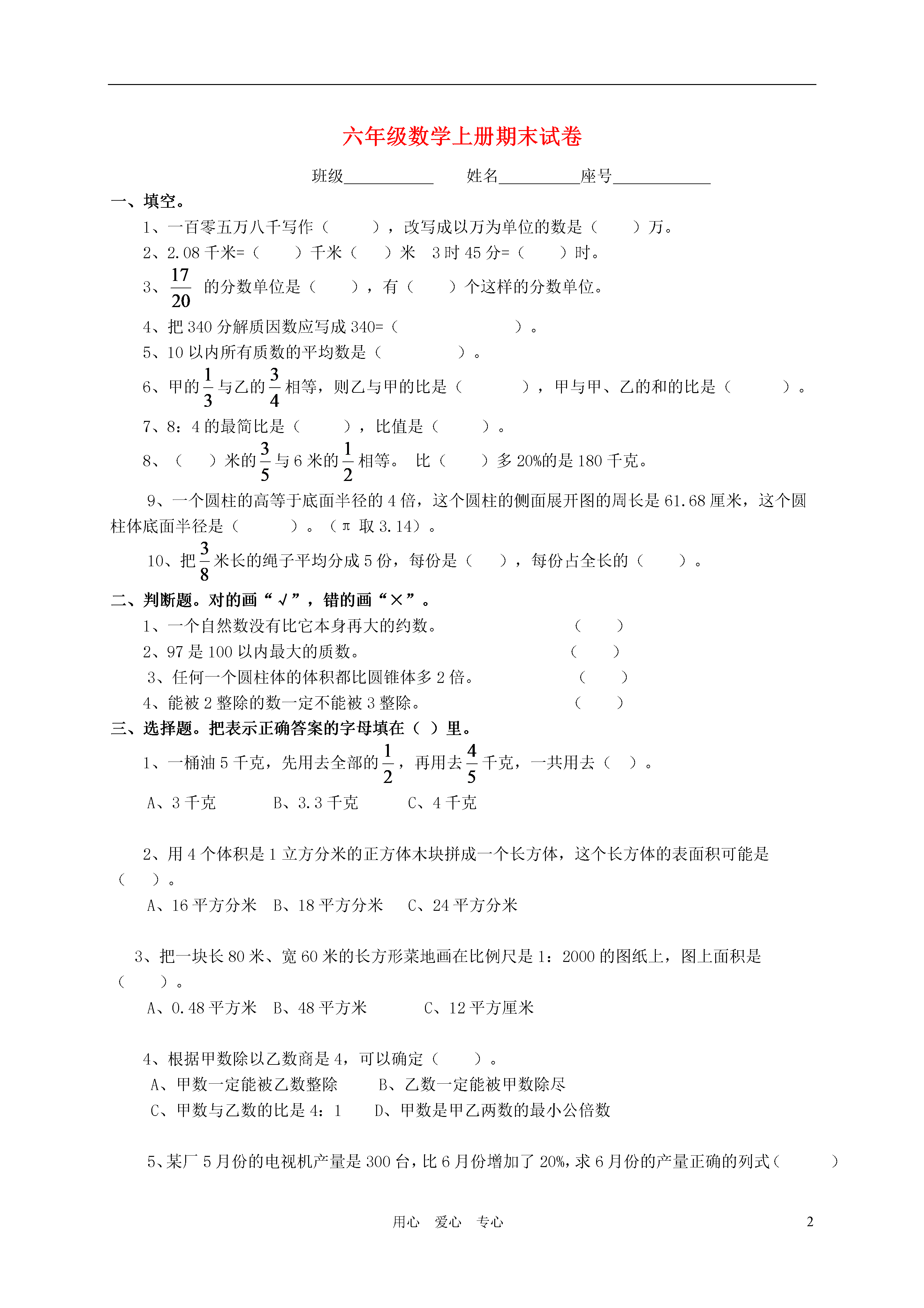 2用心爱心专心六年级数学上册期末试卷班级姓名座号一、填空。1、一百零五万八千写作(),改写成以万为单位的数是()万。2、2.08千米=()千米()米3时45分=()时。3、的分数单位是(),有()个这样的分数单位。4、把340分解质因数应写成340=()。5、10以内所有质数的平均数是()。6、甲的与乙的相等,则乙与甲的比是(),甲与甲、乙的和的比是()。7、8:4的最简比是(),比值是()。8、()米的与6米的相等。比()多20%的是180千克。9、一个圆柱的高等于底面半径的4倍,这个圆柱的侧面展开图的周长是61.68厘米,这个圆柱体底面半径是()。(π取3.14)。10、把米长的绳子平均分成5份,每份是(),每份占全长的()。二、判断题。对的画“√”,错的画“×”。1、一个自然数没有比它本身再大的约数。()2、97是100以内最大的质数。()3、任何一个圆柱体的体积都比圆锥体多2倍。()4、能被2整除的数一定不能被3整除。()三、选择题。把表示正确答案的字母填在()里。1、一桶油5千克,先用去全部的,再用去千克,一共用去()。A、3千克B、3.3千克C、4千克2、用4个体积是1立方分米的正方体木块拼成一个长方体,这个长方体的表面积可能是()。A、16平方分米B、18平方分米C、24平方分米3、把一块长80米、宽60米的长方形菜地画在比例尺是1:2000的图纸上,图上面积是()。A、0.48平方米B、48平方米C、12平方厘米4、根据甲数除以乙数商是4,可以确定()。A、甲数一定能被乙数整除B、乙数一定能被甲数除尽C、甲数与乙数的比是4:1D、甲数是甲乙两数的最小公倍数5、某厂5月份的电视机产量是300台,比6月份增加了20%,求6月份的产量正确的列式()A、300×(1+20%)B、300×(1-20%)C、300÷(1+20%)D、300÷(1-20%)四、计算。1、直接写出得数。200÷20%=98%+2%=500×125%=125%-35%=160÷40%=1-27%=70×3%=25÷2.5%=2、能简算的要简算。25×25×0.4×899×25+25×23+23×4÷15+56×20×(0.25-0.2)÷4%-25五、列式计算。1、560的40%比它的多多少?2、一个数的15%比12.8多,求这个数。(用方程解)3、13.6减去9.4的差,除以,商是多少?六、应用题。1、机床厂第一季度生产机床570台,比计划多生产90台,超额完成计划的百分之几?2、张老师借来一本书,第一天看了全书的30%,第二天看了全书的40%,两天共看了70页,这本书一共多少页?3、一个圆形玻璃,底面周长是18.84分米,这个玻璃的面积是多少平方分米?4、配制一种农药,药与水的比是1:500,现有农药5050千克,需要药和水各多少千克?5、李明把500元存入银行三年,年利率是2.05%,到期时李明共拿到多少钱?6、工程队修一条公路,第一天修了全长的25%,第二天比第一天多250米,还剩300米没有修。这条公路有多少米?7、操作题。(1)画一个边长是4厘米的正方形。(2分)(2)画一个正方形的外切圆。(2分)(3)算一算这个圆的面积。(4分)