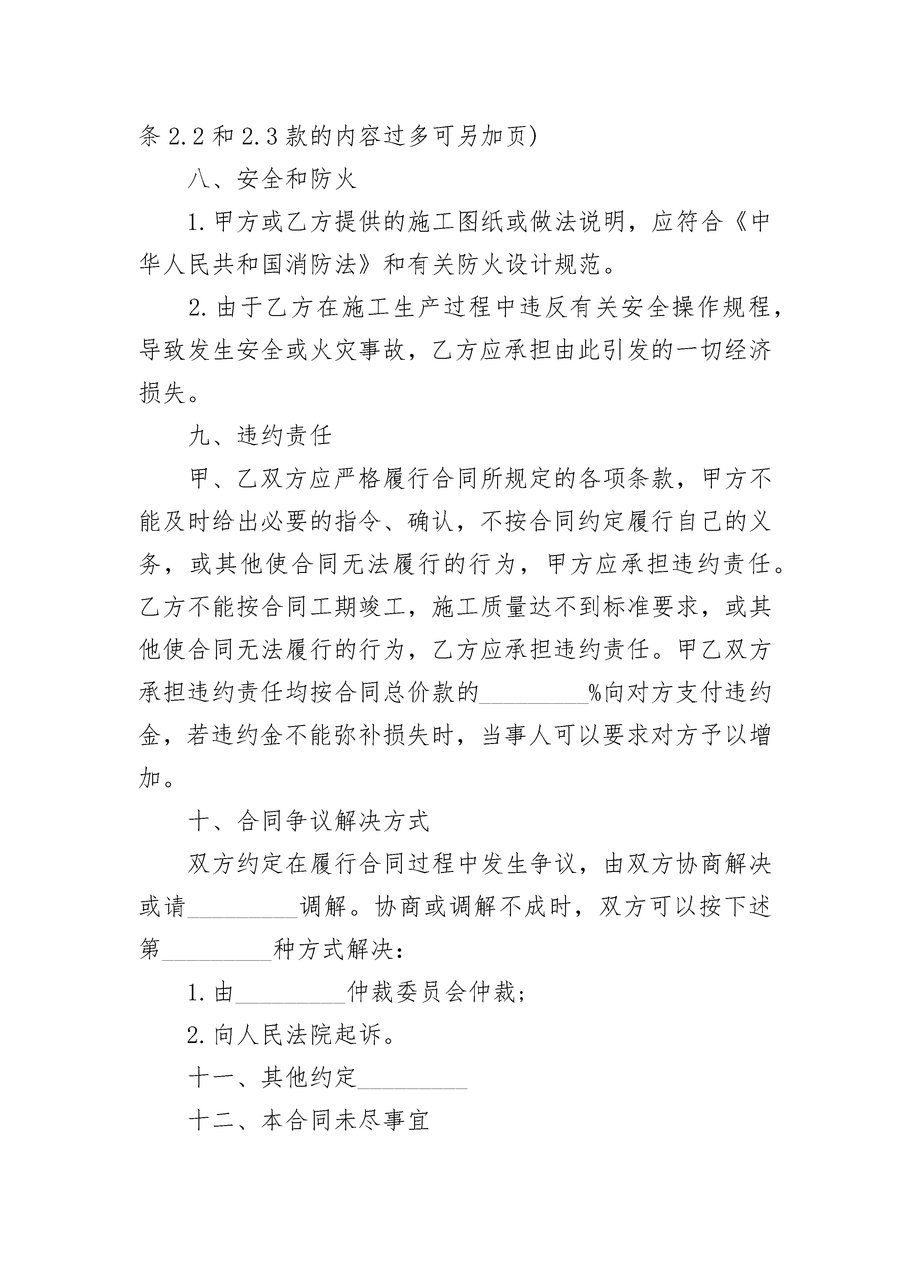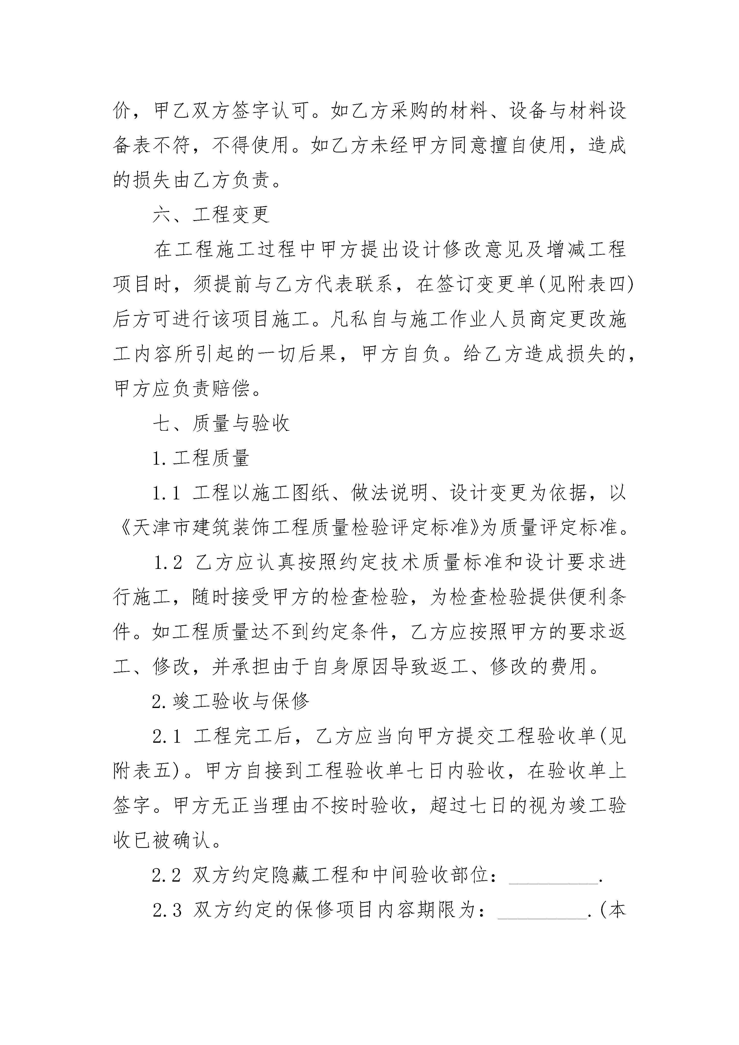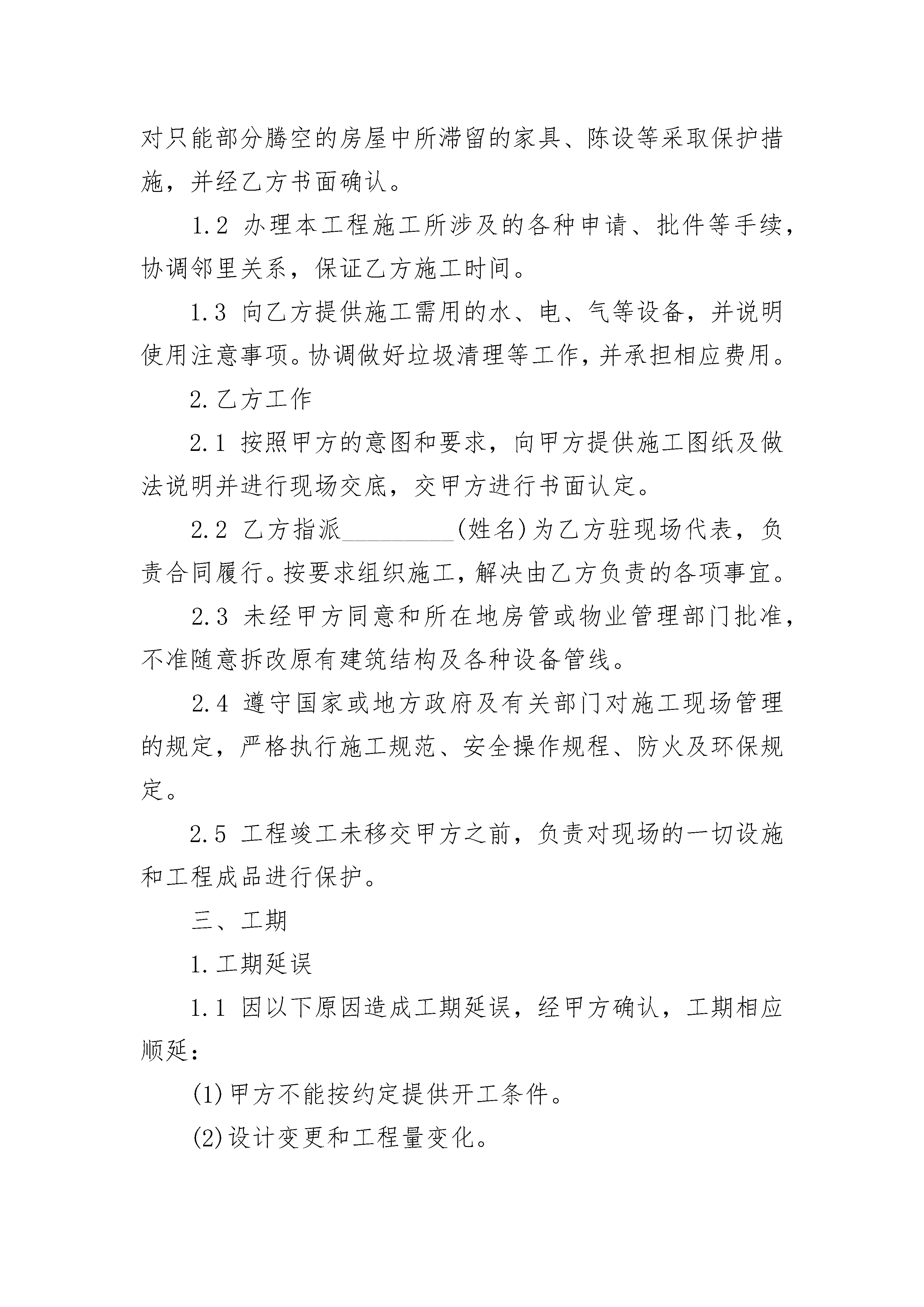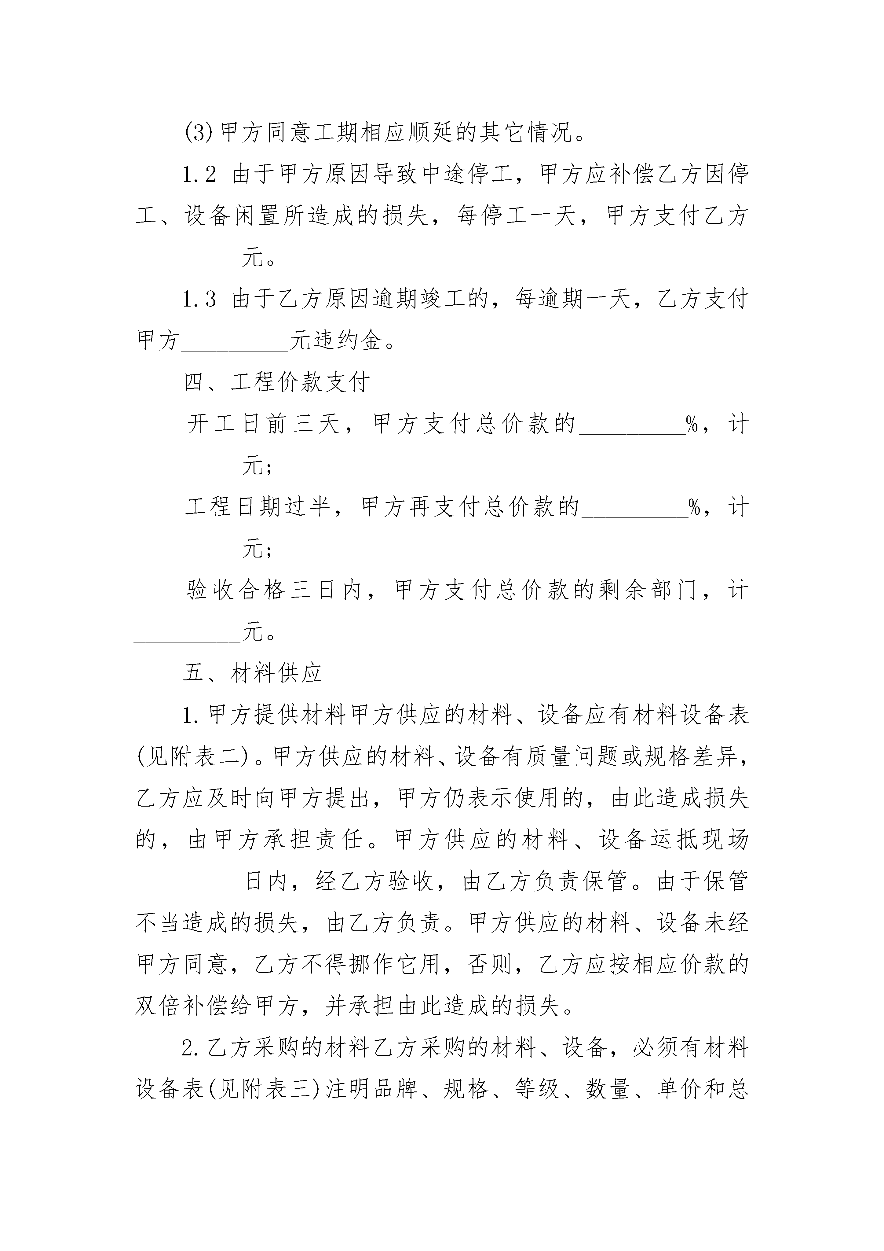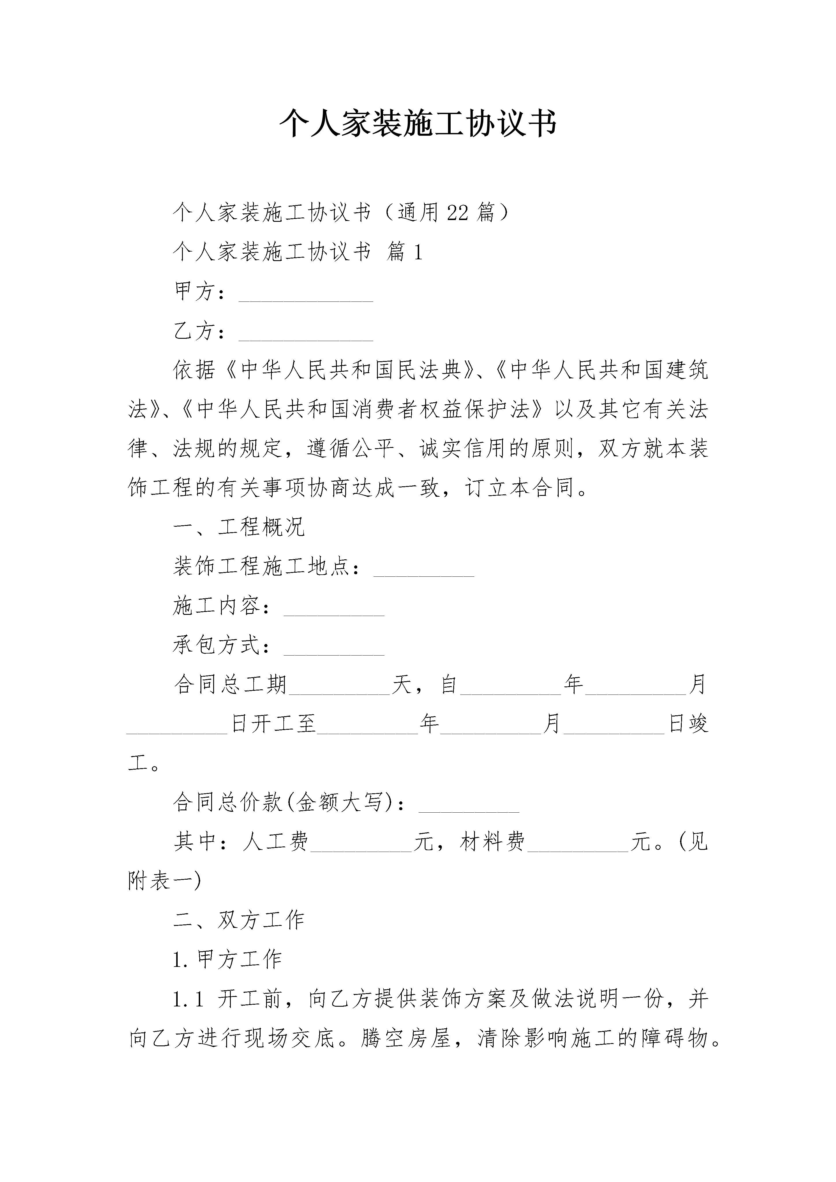 个人家装施工协议书个人家装施工协议书(通用22篇)个人家装施工协议书篇1甲方:____________乙方:____________依据《中华人民共和国民法典》、《中华人民共和国建筑法》、《中华人民共和国消费者权益保护法》以及其它有关法律、法规的规定,遵循公平、诚实信用的原则,双方就本装饰工程的有关事项协商达成一致,订立本合同。一、工程概况装饰工程施工地点:_________施工内容:_________承包方式:_________合同总工期_________天,自_________年_________月_________日开工至_________年_________月_________日竣工。合同总价款(金额大写):_________其中:人工费_________元,材料费_________元。(见附表一)二、双方工作1.甲方工作1.1开工前,向乙方提供装饰方案及做法说明一份,并向乙方进行现场交底。腾空房屋,清除影响施工的障碍物。对只能部分腾空的房屋中所滞留的家具、陈设等采取保护措施,并经乙方书面确认。1.2办理本工程施工所涉及的各种申请、批件等手续,协调邻里关系,保证乙方施工时间。1.3向乙方提供施工需用的水、电、气等设备,并说明使用注意事项。协调做好垃圾清理等工作,并承担相应费用。2.乙方工作2.1按照甲方的意图和要求,向甲方提供施工图纸及做法说明并进行现场交底,交甲方进行书面认定。2.2乙方指派_________(姓名)为乙方驻现场代表,负责合同履行。按要求组织施工,解决由乙方负责的各项事宜。2.3未经甲方同意和所在地房管或物业管理部门批准,不准随意拆改原有建筑结构及各种设备管线。2.4遵守国家或地方政府及有关部门对施工现场管理的规定,严格执行施工规范、安全操作规程、防火及环保规定。2.5工程竣工未移交甲方之前,负责对现场的一切设施和工程成品进行保护。三、工期1.工期延误1.1因以下原因造成工期延误,经甲方确认,工期相应顺延:(1)甲方不能按约定提供开工条件。(2)设计变更和工程量变化。(3)甲方同意工期相应顺延的其它情况。1.2由于甲方原因导致中途停工,甲方应补偿乙方因停工、设备闲置所造成的损失,每停工一天,甲方支付乙方_________元。1.3由于乙方原因逾期竣工的,每逾期一天,乙方支付甲方_________元违约金。四、工程价款支付开工日前三天,甲方支付总价款的_________%,计_________元;工程日期过半,甲方再支付总价款的_________%,计_________元;验收合格三日内,甲方支付总价款的剩余部门,计_________元。五、材料供应1.甲方提供材料甲方供应的材料、设备应有材料设备表(见附表二)。甲方供应的材料、设备有质量问题或规格差异,乙方应及时向甲方提出,甲方仍表示使用的,由此造成损失的,由甲方承担责任。甲方供应的材料、设备运抵现场_________日内,经乙方验收,由乙方负责保管。由于保管不当造成的损失,由乙方负责。甲方供应的材料、设备未经甲方同意,乙方不得挪作它用,否则,乙方应按相应价款的双倍补偿给甲方,并承担由此造成的损失。2.乙方采购的材料乙方采购的材料、设备,必须有材料设备表(见附表三)注明品牌、规格、等级、数量、单价和总价,甲乙双方签字认可。如乙方采购的材料、设备与材料设备表不符,不得使用。如乙方未经甲方同意擅自使用,造成的损失由乙方负责。六、工程变更在工程施工过程中甲方提出设计修改意见及增减工程项目时,须提前与乙方代表联系,在签订变更单(见附表四)后方可进行该项目施工。凡私自与施工作业人员商定更改施工内容所引起的一切后果,甲方自负。给乙方造成损失的,甲方应负责赔偿。七、质量与验收1.工程质量1.1工程以施工图纸、做法说明、设计变更为依据,以《天津市建筑装饰工程质量检验评定标准》为质量评定标准。1.2乙方应认真按照约定技术质量标准和设计要求进行施工,随时接受甲方的检查检验,为检查检验提供便利条件。如工程质量达不到约定条件,乙方应按照甲方的要求返工、修改,并承担由于自身原因导致返工、修改的费用。2.竣工验收与保修2.1工程完工后,乙方应当向甲方提交工程验收单(见附表五)。甲方自接到工程验收单七日内验收,在验收单上签字。甲方无正当理由不按时验收,超过七日的视为竣工验收已被确认。2.2双方约定隐藏工程和中间验收部位:_________.2.3双方约定的保修项目内容期限为:_________.(本条2.2和2.3款的内容过多可另加页)八、安全和防火1.甲方或乙方提供的施工图纸或做法说明,应符合《中华人民共和国消防法》和有关防火设计规范。2.由于乙方在施工生产过程中违反有关安全操作规程,导致发生安全或火灾事故,乙方应承担由此引发的一切经济损失。九、违约责任甲、乙双方应严格履行合