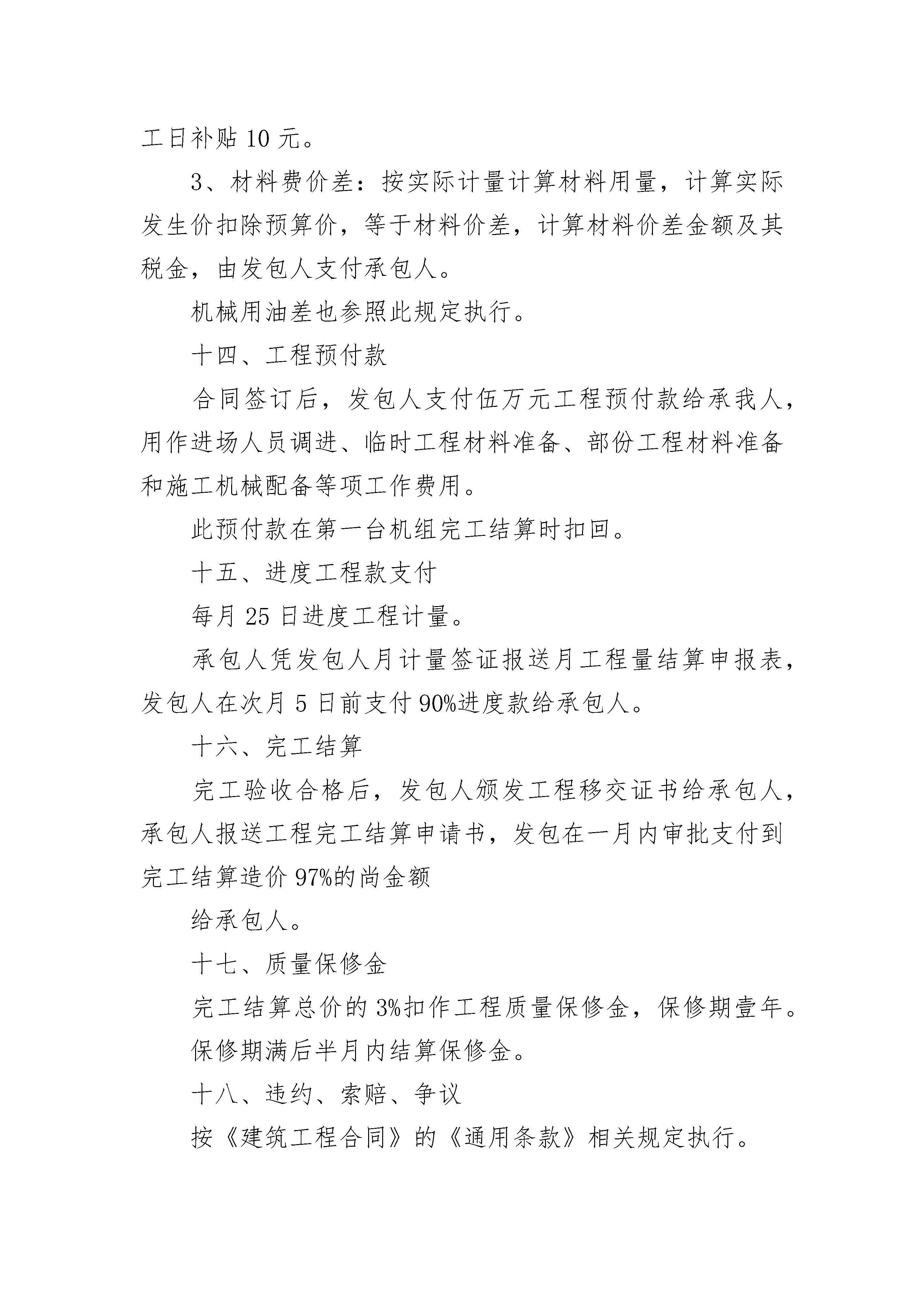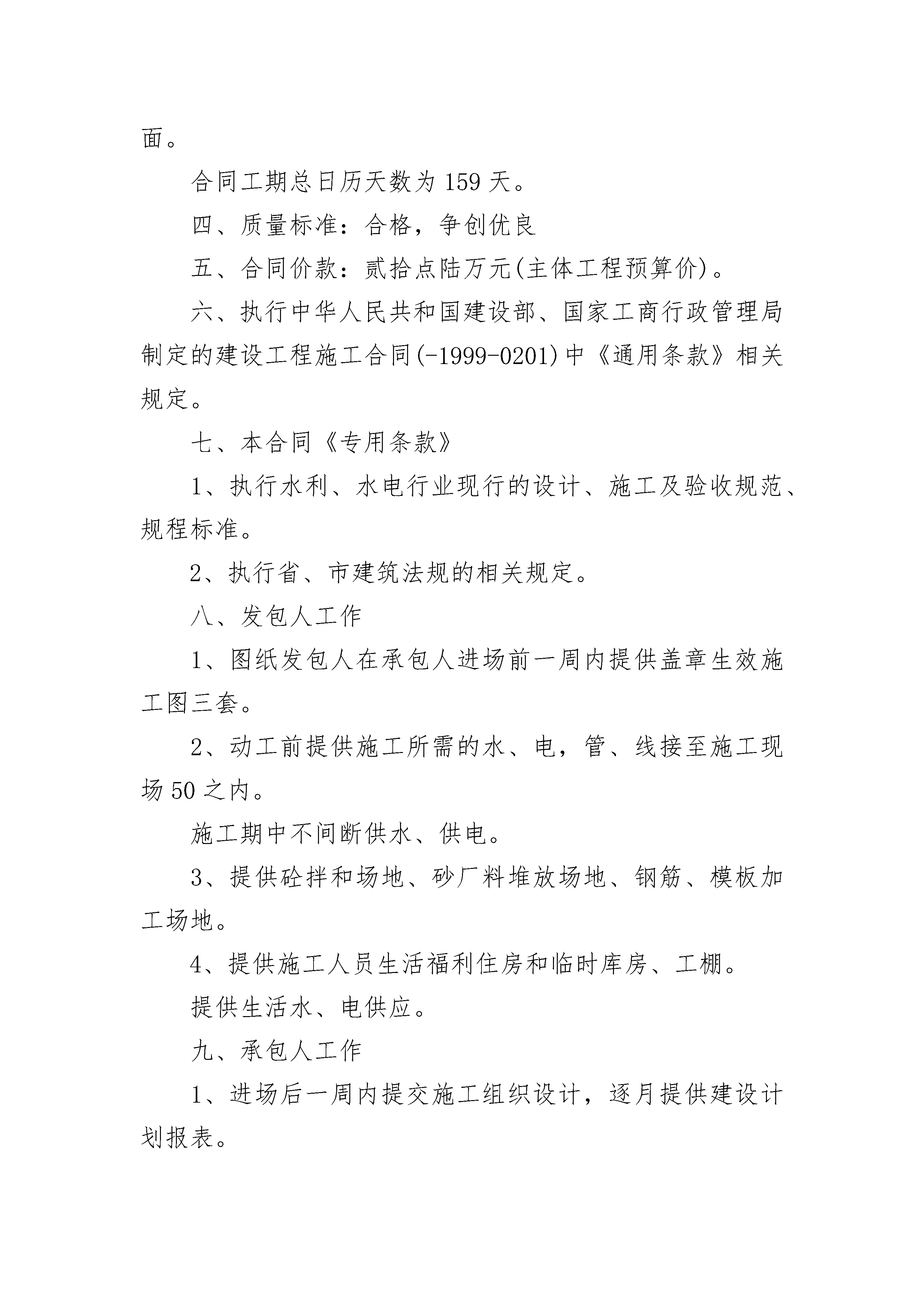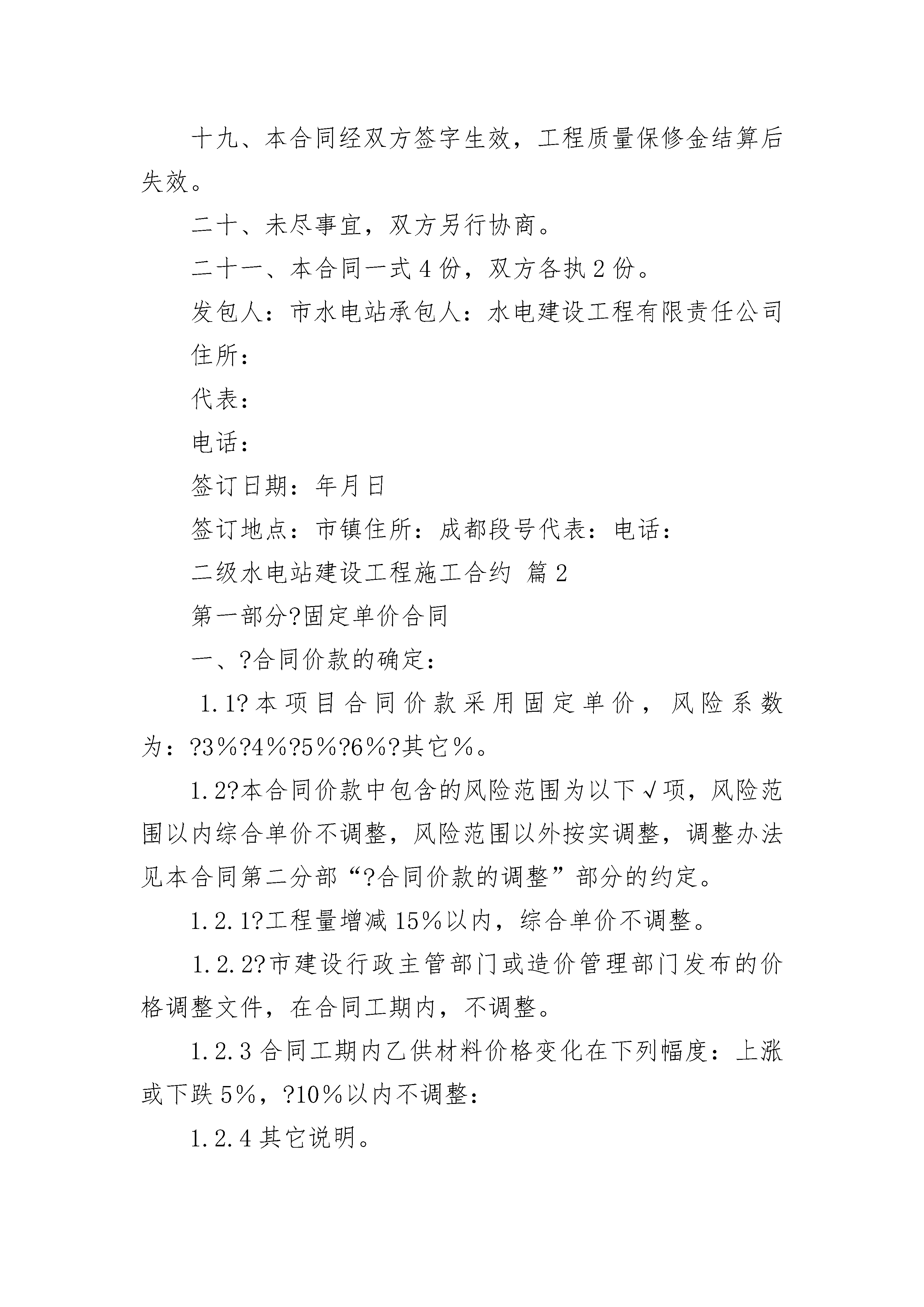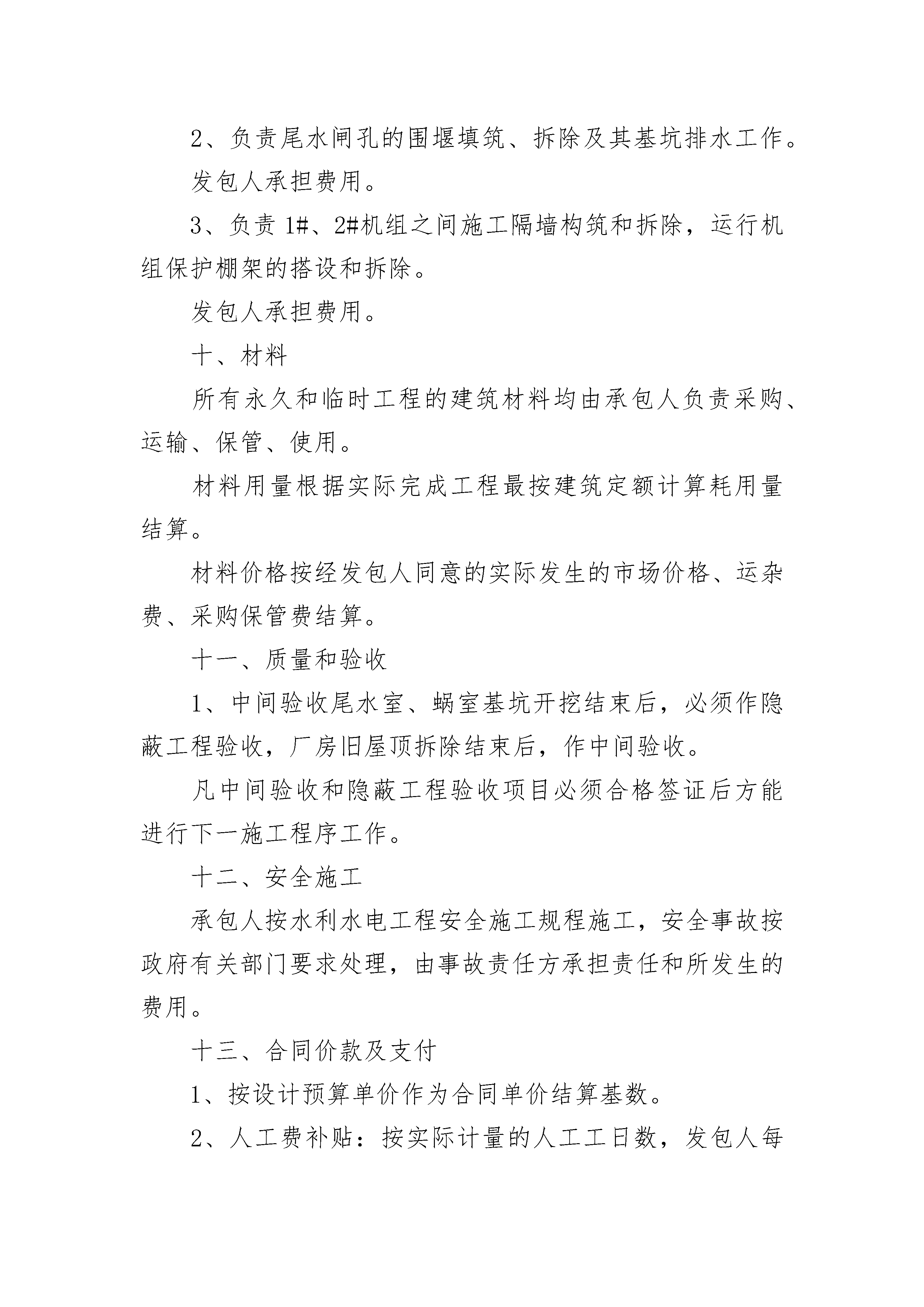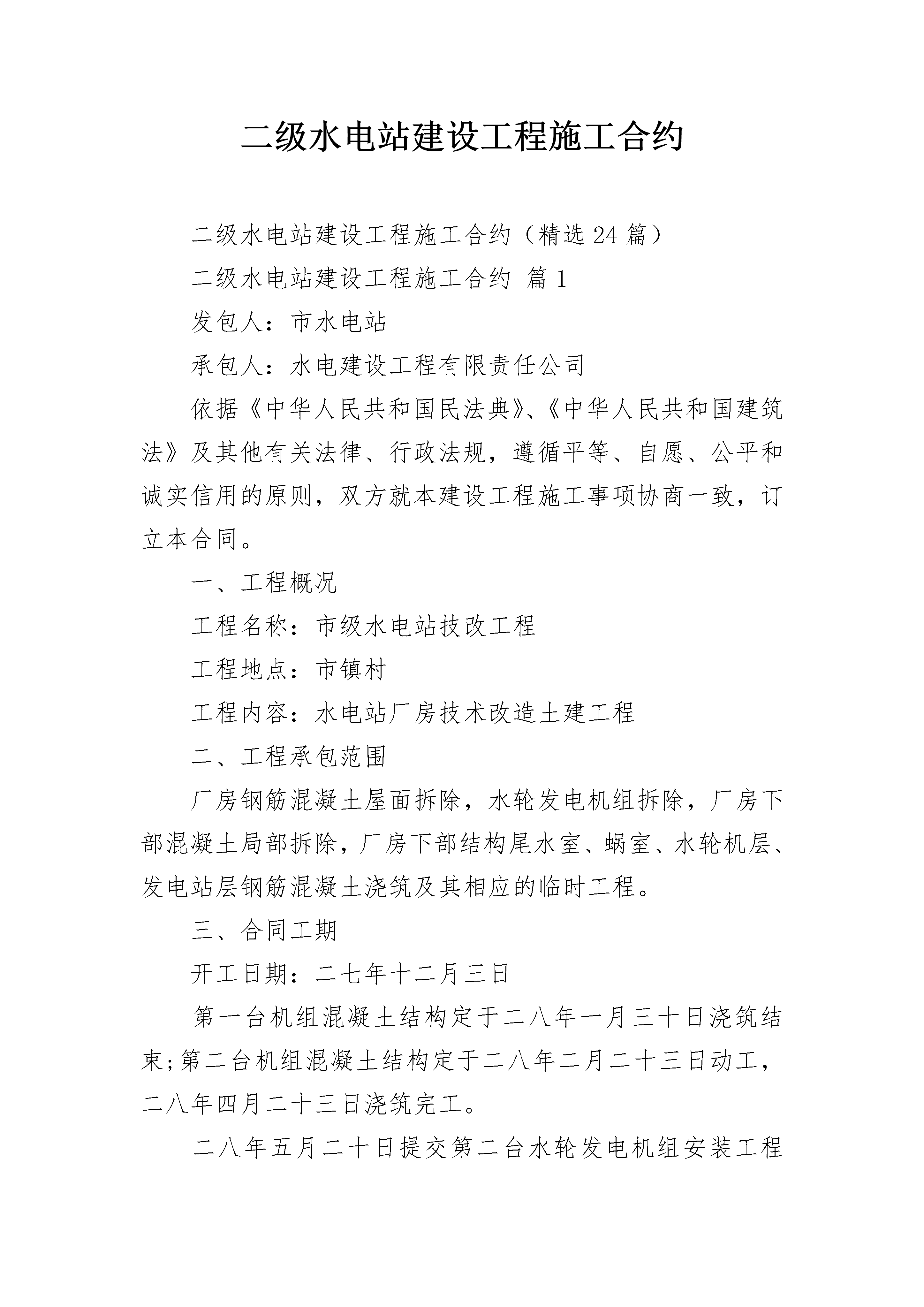 二级水电站建设工程施工合约二级水电站建设工程施工合约(精选24篇)二级水电站建设工程施工合约篇1发包人:市水电站承包人:水电建设工程有限责任公司依据《中华人民共和国民法典》、《中华人民共和国建筑法》及其他有关法律、行政法规,遵循平等、自愿、公平和诚实信用的原则,双方就本建设工程施工事项协商一致,订立本合同。一、工程概况工程名称:市级水电站技改工程工程地点:市镇村工程内容:水电站厂房技术改造土建工程二、工程承包范围厂房钢筋混凝土屋面拆除,水轮发电机组拆除,厂房下部混凝土局部拆除,厂房下部结构尾水室、蜗室、水轮机层、发电站层钢筋混凝土浇筑及其相应的临时工程。三、合同工期开工日期:二七年十二月三日第一台机组混凝土结构定于二八年一月三十日浇筑结束;第二台机组混凝土结构定于二八年二月二十三日动工,二八年四月二十三日浇筑完工。二八年五月二十日提交第二台水轮发电机组安装工程面。合同工期总日历天数为159天。四、质量标准:合格,争创优良五、合同价款:贰拾点陆万元(主体工程预算价)。六、执行中华人民共和国建设部、国家工商行政管理局制定的建设工程施工合同(-1999-0201)中《通用条款》相关规定。七、本合同《专用条款》1、执行水利、水电行业现行的设计、施工及验收规范、规程标准。2、执行省、市建筑法规的相关规定。八、发包人工作1、图纸发包人在承包人进场前一周内提供盖章生效施工图三套。2、动工前提供施工所需的水、电,管、线接至施工现场50之内。施工期中不间断供水、供电。3、提供砼拌和场地、砂厂料堆放场地、钢筋、模板加工场地。4、提供施工人员生活福利住房和临时库房、工棚。提供生活水、电供应。九、承包人工作1、进场后一周内提交施工组织设计,逐月提供建设计划报表。2、负责尾水闸孔的围堰填筑、拆除及其基坑排水工作。发包人承担费用。3、负责1#、2#机组之间施工隔墙构筑和拆除,运行机组保护棚架的搭设和拆除。发包人承担费用。十、材料所有永久和临时工程的建筑材料均由承包人负责采购、运输、保管、使用。材料用量根据实际完成工程最按建筑定额计算耗用量结算。材料价格按经发包人同意的实际发生的市场价格、运杂费、采购保管费结算。十一、质量和验收1、中间验收尾水室、蜗室基坑开挖结束后,必须作隐蔽工程验收,厂房旧屋顶拆除结束后,作中间验收。凡中间验收和隐蔽工程验收项目必须合格签证后方能进行下一施工程序工作。十二、安全施工承包人按水利水电工程安全施工规程施工,安全事故按政府有关部门要求处理,由事故责任方承担责任和所发生的费用。十三、合同价款及支付1、按设计预算单价作为合同单价结算基数。2、人工费补贴:按实际计量的人工工日数,发包人每工日补贴10元。3、材料费价差:按实际计量计算材料用量,计算实际发生价扣除预算价,等于材料价差,计算材料价差金额及其税金,由发包人支付承包人。机械用油差也参照此规定执行。十四、工程预付款合同签订后,发包人支付伍万元工程预付款给承我人,用作进场人员调进、临时工程材料准备、部份工程材料准备和施工机械配备等项工作费用。此预付款在第一台机组完工结算时扣回。十五、进度工程款支付每月25日进度工程计量。承包人凭发包人月计量签证报送月工程量结算申报表,发包人在次月5日前支付90%进度款给承包人。十六、完工结算完工验收合格后,发包人颁发工程移交证书给承包人,承包人报送工程完工结算申请书,发包在一月内审批支付到完工结算造价97%的尚金额给承包人。十七、质量保修金完工结算总价的3%扣作工程质量保修金,保修期壹年。保修期满后半月内结算保修金。十八、违约、索赔、争议按《建筑工程合同》的《通用条款》相关规定执行。十九、本合同经双方签字生效,工程质量保修金结算后失效。二十、未尽事宜,双方另行协商。二十一、本合同一式4份,双方各执2份。发包人:市水电站承包人:水电建设工程有限责任公司住所:代表:电话:签订日期:年月日签订地点:市镇住所:成都段号代表:电话:二级水电站建设工程施工合约篇2第一部分?固定单价合同一、?合同价款的确定:1.1?本项目合同价款采用固定单价,风险系数为:?3%?4%?5%?6%?其它%。1.2?本合同价款中包含的风险范围为以下√项,风险范围以内综合单价不调整,风险范围以外按实调整,调整办法见本合同第二分部“?合同价款的调整”部分的约定。1.2.1?工程量增减15%以内,综合单价不调整。1.2.2?市建设行政主管部门或造价管理部门发布的价格调整文件,在合同工期内,不调整。1.2.3合同工期内乙供材料价格变化在下列幅度:上涨或下跌5%,?10%以内不调整:1.2.4其它说明。二、合同价款的调整:2.1?工程量的调整原则本项目超出工程量清单及风险范围的工程量均按实调整,调整原则为按实际发生计量,承包人提出,发包人确认。2.2?合同价款的调整2.2.1?市建设行