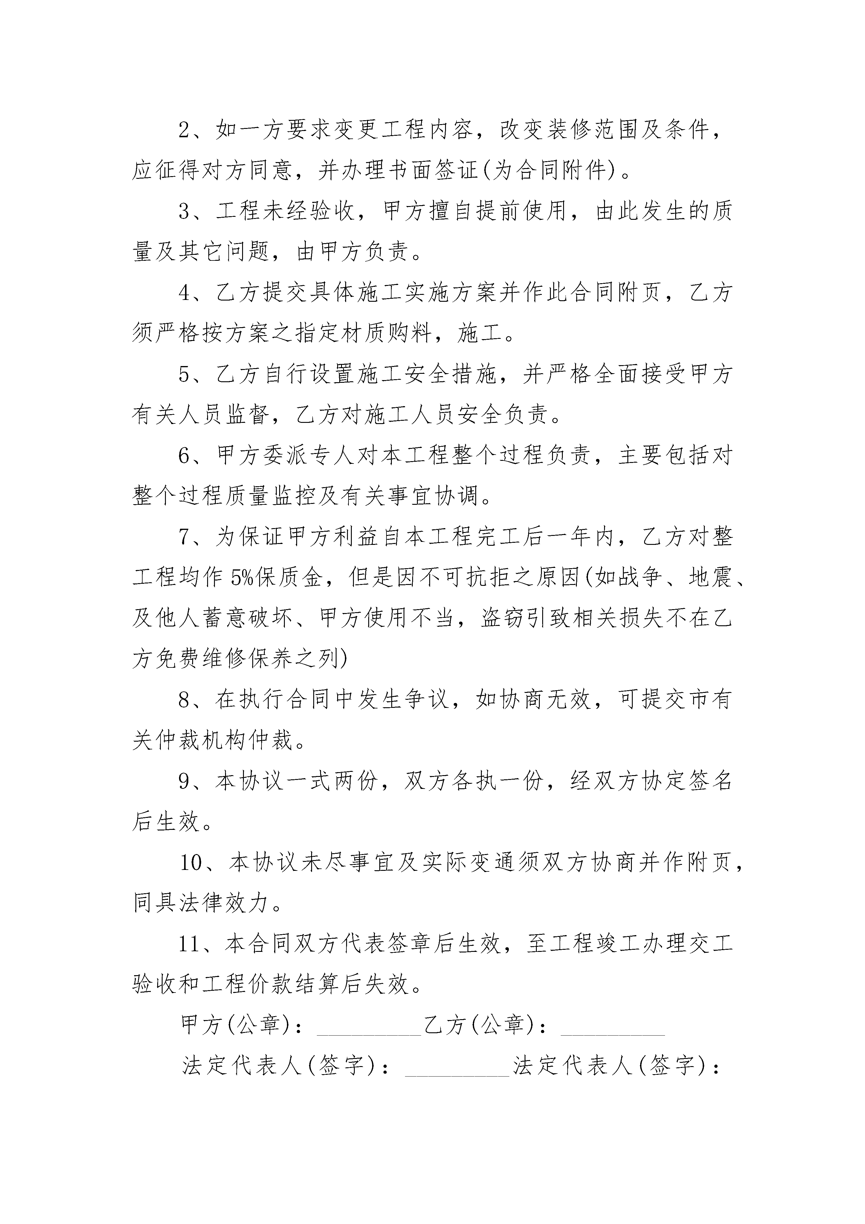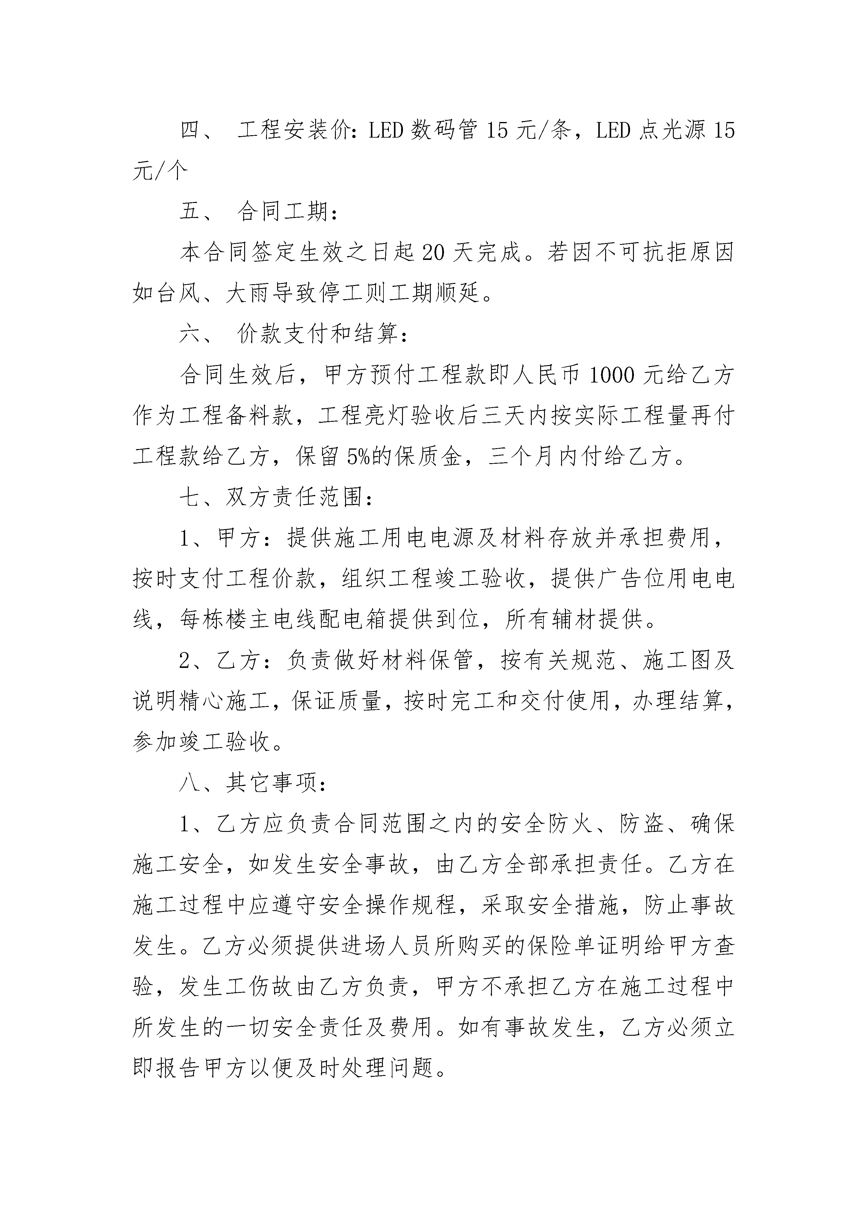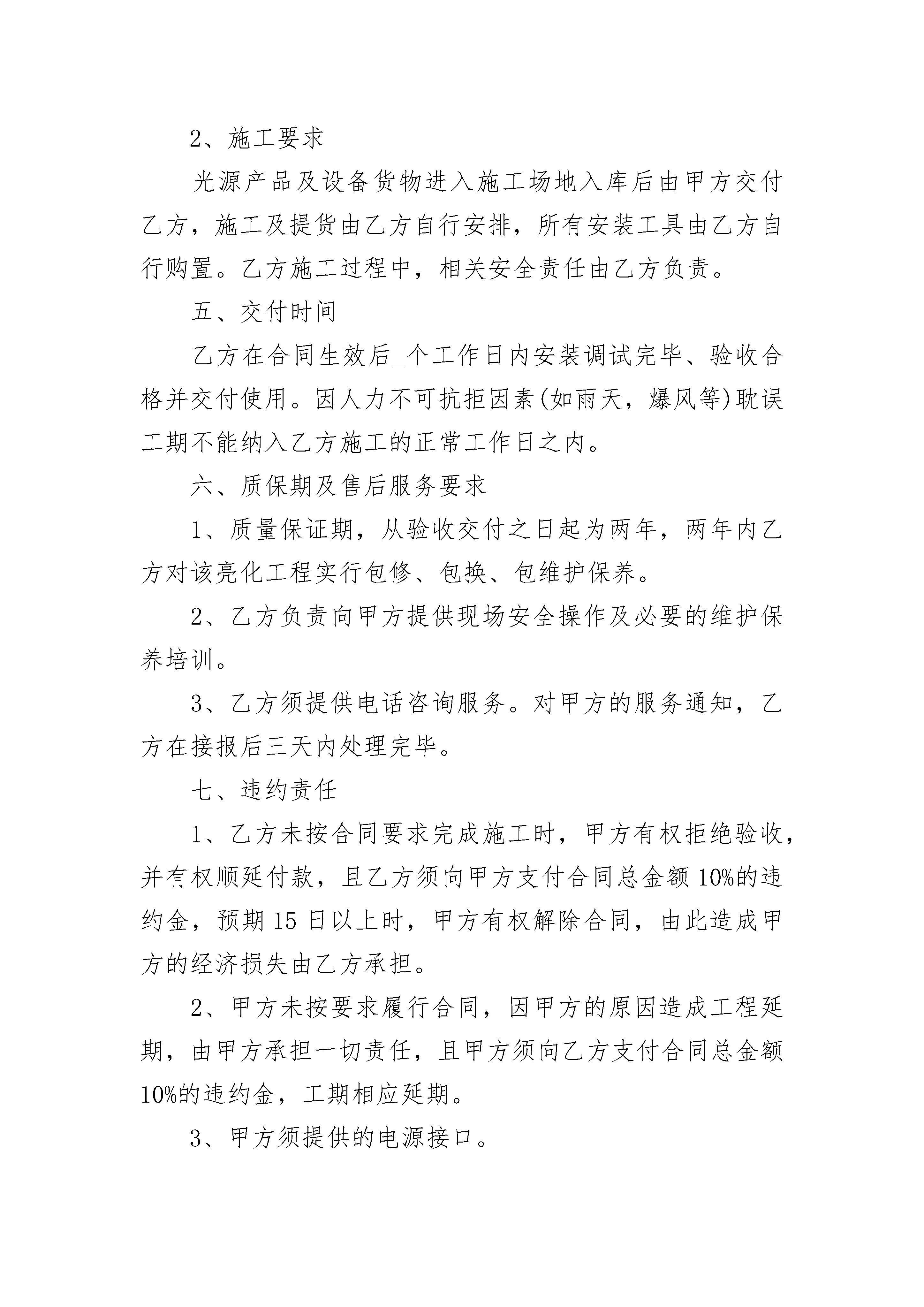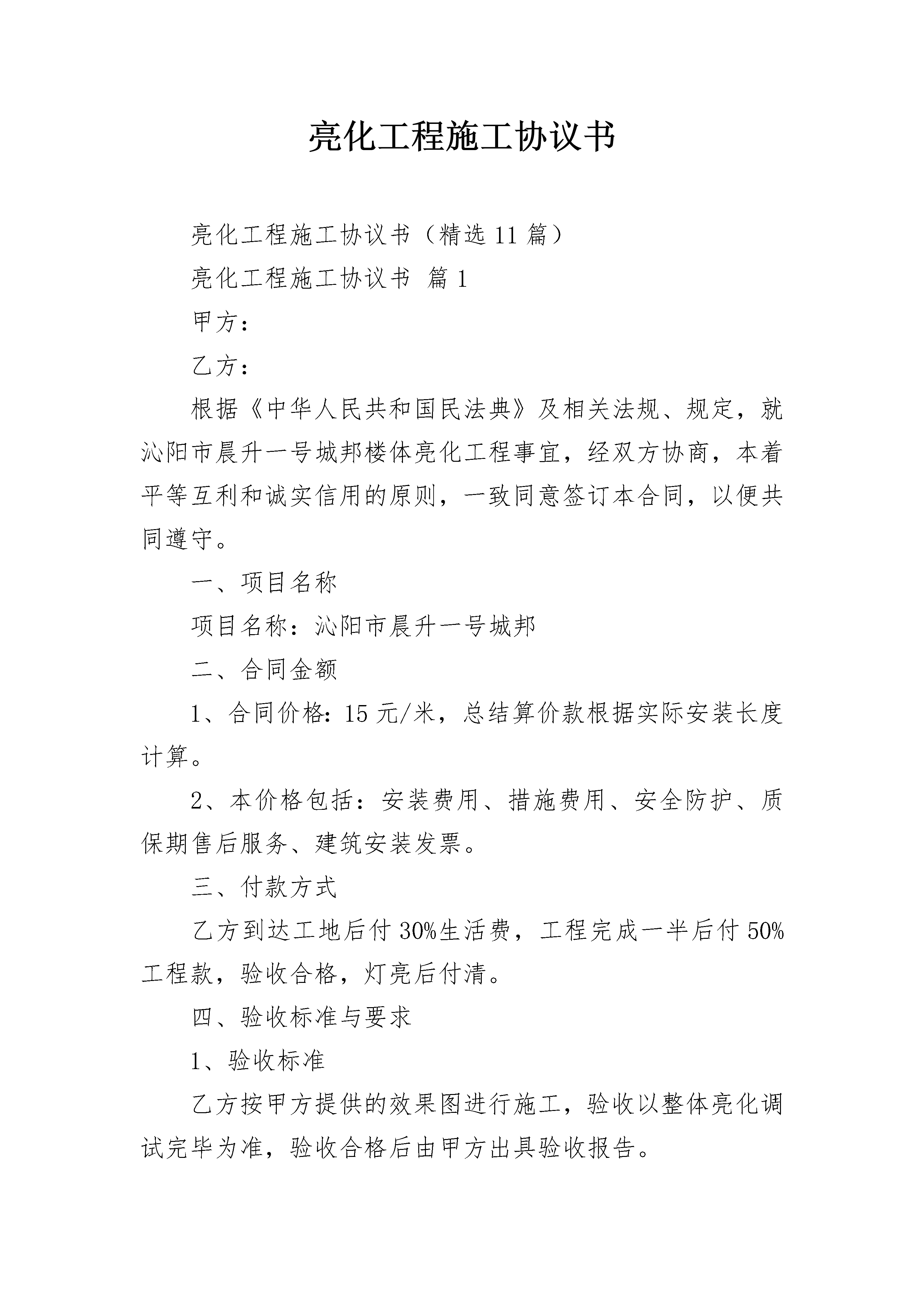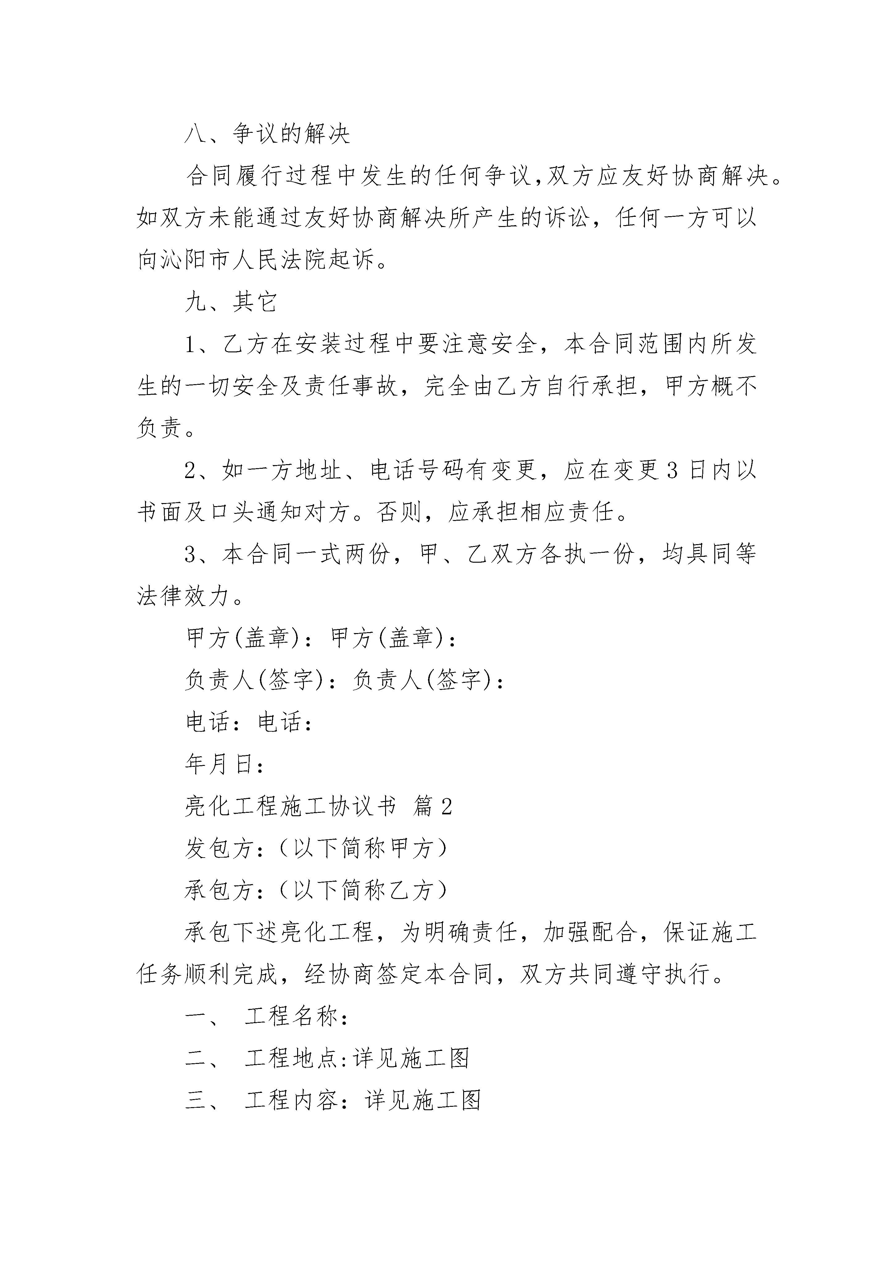 亮化工程施工协议书亮化工程施工协议书(精选11篇)亮化工程施工协议书篇1甲方:乙方:根据《中华人民共和国民法典》及相关法规、规定,就沁阳市晨升一号城邦楼体亮化工程事宜,经双方协商,本着平等互利和诚实信用的原则,一致同意签订本合同,以便共同遵守。一、项目名称项目名称:沁阳市晨升一号城邦二、合同金额1、合同价格:15元/米,总结算价款根据实际安装长度计算。2、本价格包括:安装费用、措施费用、安全防护、质保期售后服务、建筑安装发票。三、付款方式乙方到达工地后付30%生活费,工程完成一半后付50%工程款,验收合格,灯亮后付清。四、验收标准与要求1、验收标准乙方按甲方提供的效果图进行施工,验收以整体亮化调试完毕为准,验收合格后由甲方出具验收报告。2、施工要求光源产品及设备货物进入施工场地入库后由甲方交付乙方,施工及提货由乙方自行安排,所有安装工具由乙方自行购置。乙方施工过程中,相关安全责任由乙方负责。五、交付时间乙方在合同生效后_个工作日内安装调试完毕、验收合格并交付使用。因人力不可抗拒因素(如雨天,爆风等)耽误工期不能纳入乙方施工的正常工作日之内。六、质保期及售后服务要求1、质量保证期,从验收交付之日起为两年,两年内乙方对该亮化工程实行包修、包换、包维护保养。2、乙方负责向甲方提供现场安全操作及必要的维护保养培训。3、乙方须提供电话咨询服务。对甲方的服务通知,乙方在接报后三天内处理完毕。七、违约责任1、乙方未按合同要求完成施工时,甲方有权拒绝验收,并有权顺延付款,且乙方须向甲方支付合同总金额10%的违约金,预期15日以上时,甲方有权解除合同,由此造成甲方的经济损失由乙方承担。2、甲方未按要求履行合同,因甲方的原因造成工程延期,由甲方承担一切责任,且甲方须向乙方支付合同总金额10%的违约金,工期相应延期。3、甲方须提供的电源接口。八、争议的解决合同履行过程中发生的任何争议,双方应友好协商解决。如双方未能通过友好协商解决所产生的诉讼,任何一方可以向沁阳市人民法院起诉。九、其它1、乙方在安装过程中要注意安全,本合同范围内所发生的一切安全及责任事故,完全由乙方自行承担,甲方概不负责。2、如一方地址、电话号码有变更,应在变更3日内以书面及口头通知对方。否则,应承担相应责任。3、本合同一式两份,甲、乙双方各执一份,均具同等法律效力。甲方(盖章):甲方(盖章):负责人(签字):负责人(签字):电话:电话:年月日:亮化工程施工协议书篇2发包方:(以下简称甲方)承包方:(以下简称乙方)承包下述亮化工程,为明确责任,加强配合,保证施工任务顺利完成,经协商签定本合同,双方共同遵守执行。一、工程名称:二、工程地点:详见施工图三、工程内容:详见施工图四、工程安装价:LED数码管15元/条,LED点光源15元/个五、合同工期:本合同签定生效之日起20天完成。若因不可抗拒原因如台风、大雨导致停工则工期顺延。六、价款支付和结算:合同生效后,甲方预付工程款即人民币1000元给乙方作为工程备料款,工程亮灯验收后三天内按实际工程量再付工程款给乙方,保留5%的保质金,三个月内付给乙方。七、双方责任范围:1、甲方:提供施工用电电源及材料存放并承担费用,按时支付工程价款,组织工程竣工验收,提供广告位用电电线,每栋楼主电线配电箱提供到位,所有辅材提供。2、乙方:负责做好材料保管,按有关规范、施工图及说明精心施工,保证质量,按时完工和交付使用,办理结算,参加竣工验收。八、其它事项:1、乙方应负责合同范围之内的安全防火、防盗、确保施工安全,如发生安全事故,由乙方全部承担责任。乙方在施工过程中应遵守安全操作规程,采取安全措施,防止事故发生。乙方必须提供进场人员所购买的保险单证明给甲方查验,发生工伤故由乙方负责,甲方不承担乙方在施工过程中所发生的一切安全责任及费用。如有事故发生,乙方必须立即报告甲方以便及时处理问题。2、如一方要求变更工程内容,改变装修范围及条件,应征得对方同意,并办理书面签证(为合同附件)。3、工程未经验收,甲方擅自提前使用,由此发生的质量及其它问题,由甲方负责。4、乙方提交具体施工实施方案并作此合同附页,乙方须严格按方案之指定材质购料,施工。5、乙方自行设置施工安全措施,并严格全面接受甲方有关人员监督,乙方对施工人员安全负责。6、甲方委派专人对本工程整个过程负责,主要包括对整个过程质量监控及有关事宜协调。7、为保证甲方利益自本工程完工后一年内,乙方对整工程均作5%保质金,但是因不可抗拒之原因(如战争、地震、及他人蓄意破坏、甲方使用不当,盗窃引致相关损失不在乙方免费维修保养之列)8、在执行合同中发生争议,如协商无效,可提交市有关仲裁机构仲裁。9、本协议一式两份,双方各执一份,经双方协定签名后生效。10、本协议未尽事宜及实际变通须双方协商并作附页,同具法律效力。11、