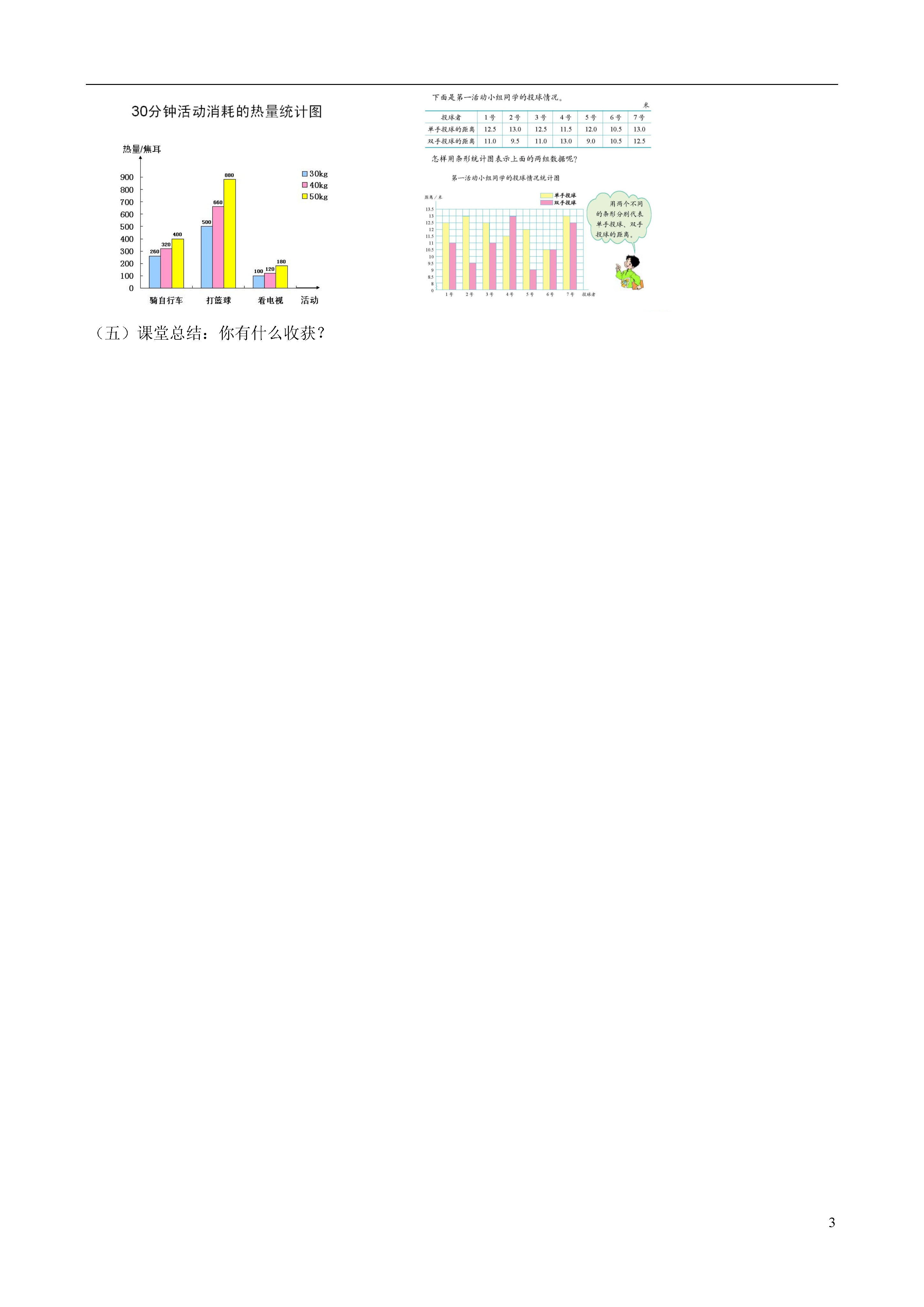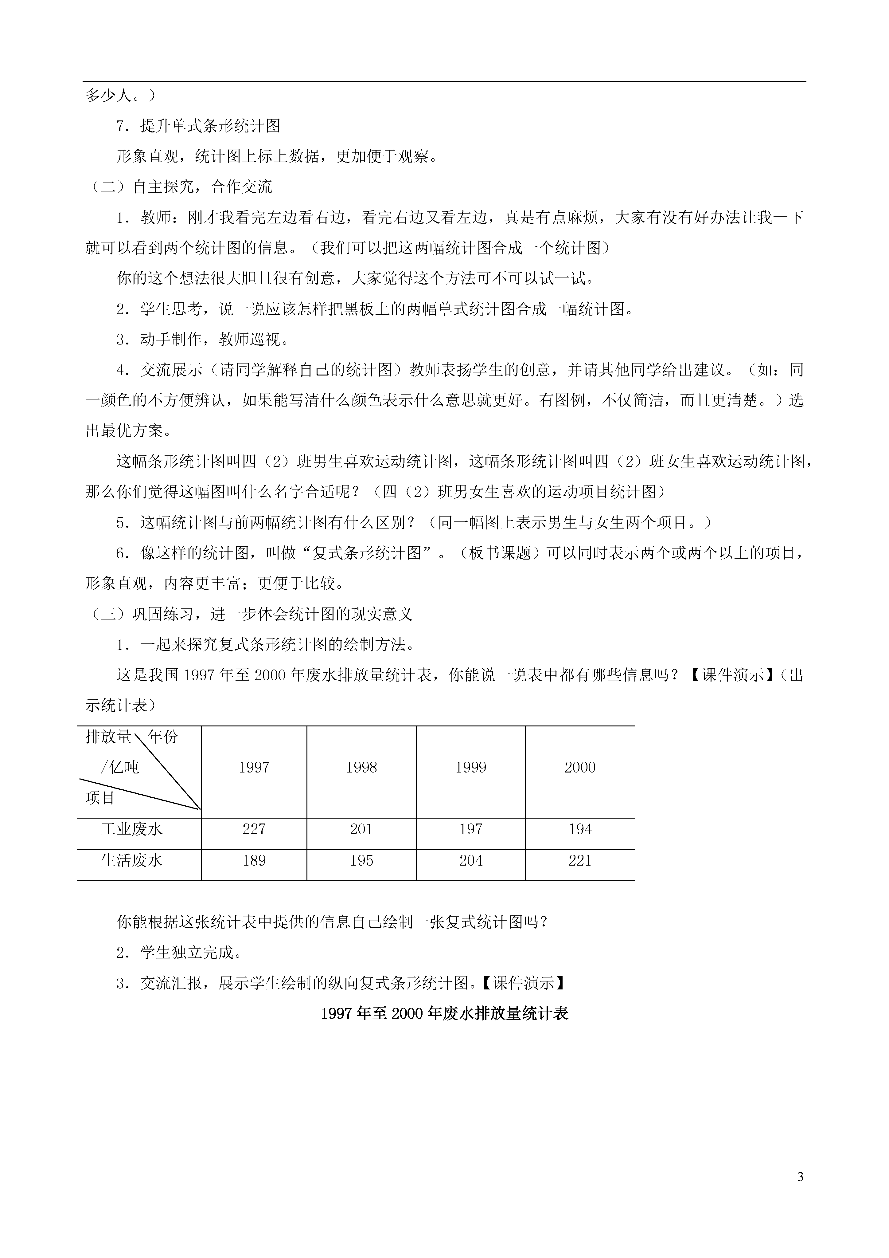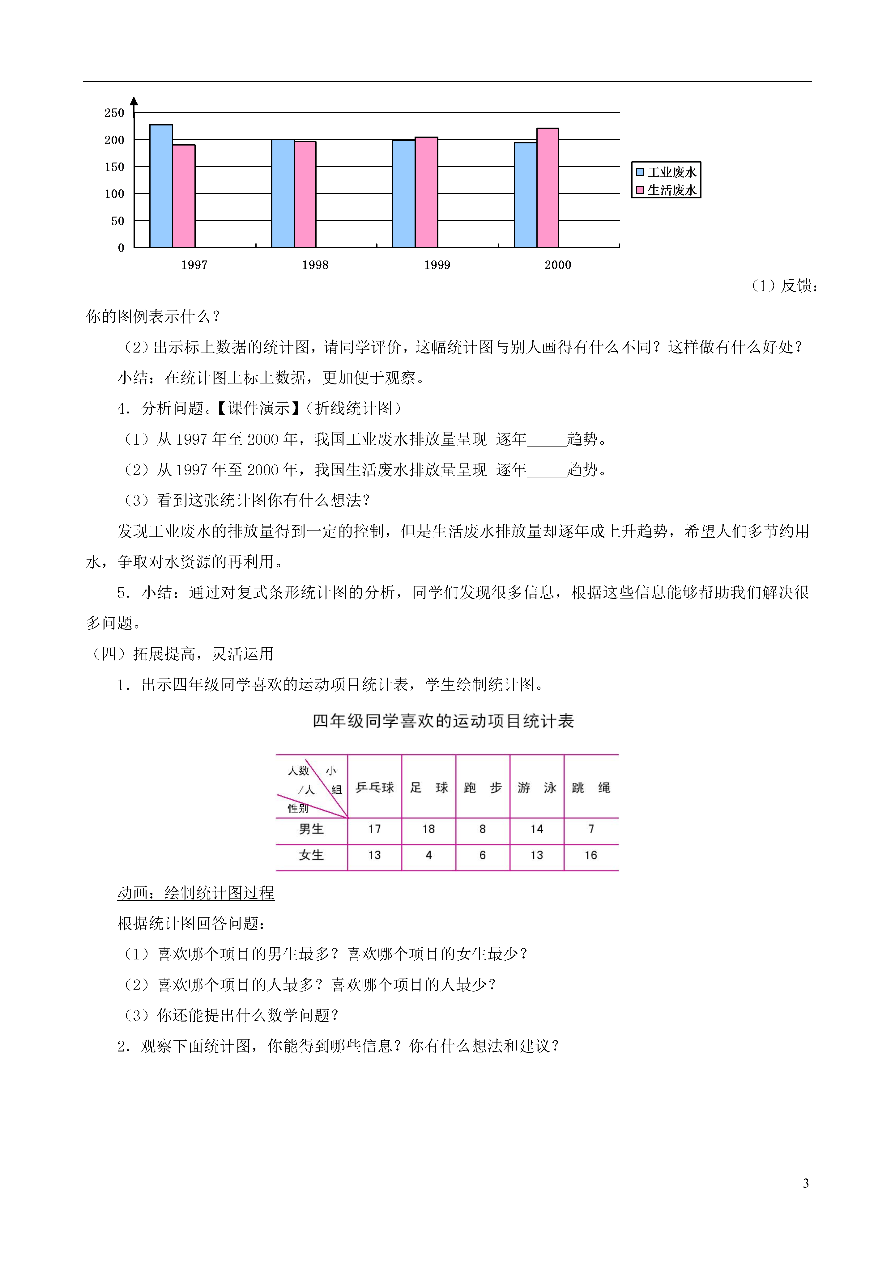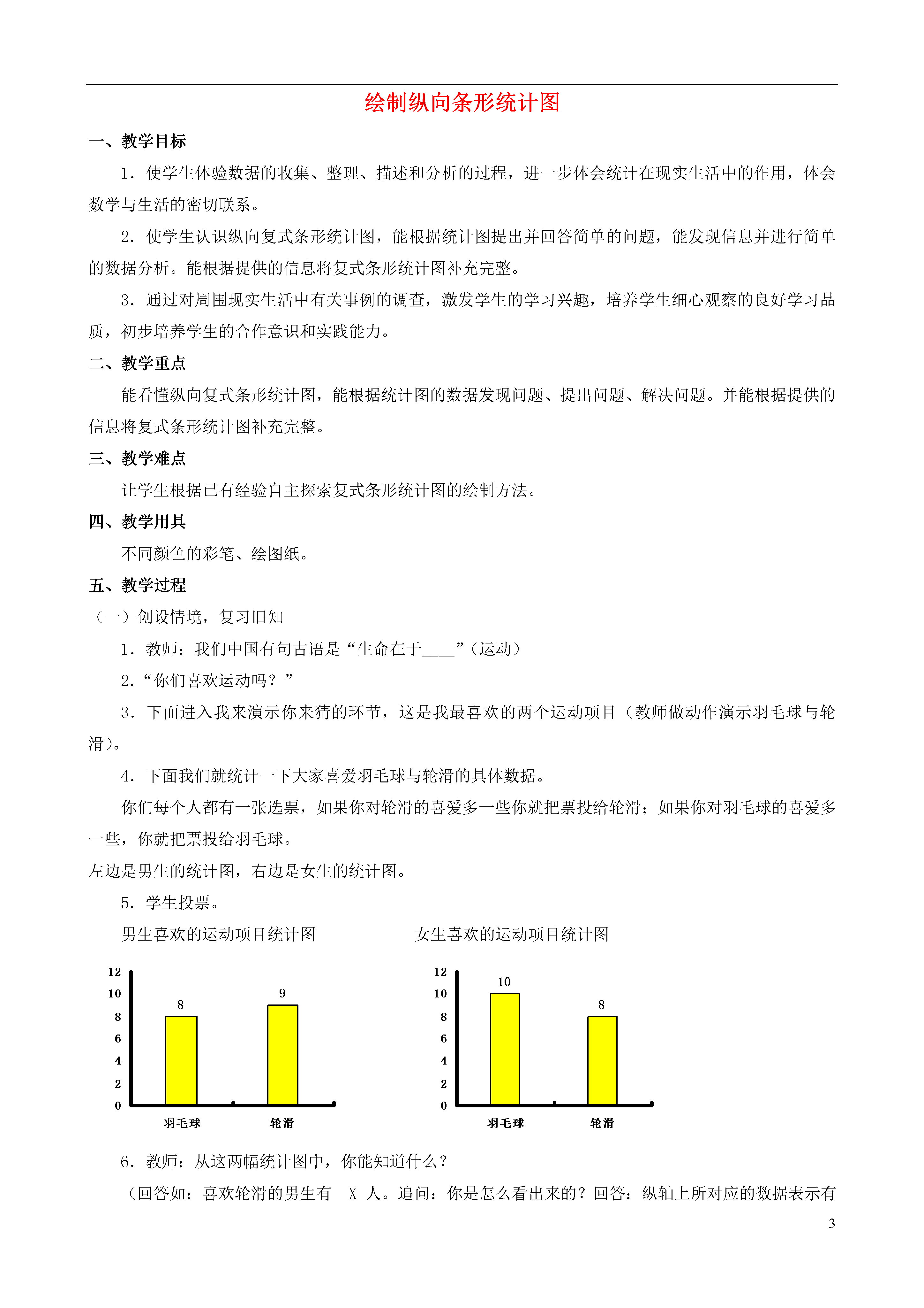 3绘制纵向条形统计图一、教学目标1.使学生体验数据的收集、整理、描述和分析的过程,进一步体会统计在现实生活中的作用,体会数学与生活的密切联系。2.使学生认识纵向复式条形统计图,能根据统计图提出并回答简单的问题,能发现信息并进行简单的数据分析。能根据提供的信息将复式条形统计图补充完整。3.通过对周围现实生活中有关事例的调查,激发学生的学习兴趣,培养学生细心观察的良好学习品质,初步培养学生的合作意识和实践能力。二、教学重点能看懂纵向复式条形统计图,能根据统计图的数据发现问题、提出问题、解决问题。并能根据提供的信息将复式条形统计图补充完整。三、教学难点让学生根据已有经验自主探索复式条形统计图的绘制方法。四、教学用具不同颜色的彩笔、绘图纸。五、教学过程(一)创设情境,复习旧知1.教师:我们中国有句古语是“生命在于____”(运动)2.“你们喜欢运动吗?”3.下面进入我来演示你来猜的环节,这是我最喜欢的两个运动项目(教师做动作演示羽毛球与轮滑)。4.下面我们就统计一下大家喜爱羽毛球与轮滑的具体数据。你们每个人都有一张选票,如果你对轮滑的喜爱多一些你就把票投给轮滑;如果你对羽毛球的喜爱多一些,你就把票投给羽毛球。左边是男生的统计图,右边是女生的统计图。5.学生投票。男生喜欢的运动项目统计图女生喜欢的运动项目统计图6.教师:从这两幅统计图中,你能知道什么?(回答如:喜欢轮滑的男生有X人。追问:你是怎么看出来的?回答:纵轴上所对应的数据表示有多少人。)7.提升单式条形统计图形象直观,统计图上标上数据,更加便于观察。(二)自主探究,合作交流1.教师:刚才我看完左边看右边,看完右边又看左边,真是有点麻烦,大家有没有好办法让我一下就可以看到两个统计图的信息。(我们可以把这两幅统计图合成一个统计图)你的这个想法很大胆且很有创意,大家觉得这个方法可不可以试一试。2.学生思考,说一说应该怎样把黑板上的两幅单式统计图合成一幅统计图。3.动手制作,教师巡视。4.交流展示(请同学解释自己的统计图)教师表扬学生的创意,并请其他同学给出建议。(如:同一颜色的不方便辨认,如果能写清什么颜色表示什么意思就更好。有图例,不仅简洁,而且更清楚。)选出最优方案。这幅条形统计图叫四(2)班男生喜欢运动统计图,这幅条形统计图叫四(2)班女生喜欢运动统计图,那么你们觉得这幅图叫什么名字合适呢?(四(2)班男女生喜欢的运动项目统计图)5.这幅统计图与前两幅统计图有什么区别?(同一幅图上表示男生与女生两个项目。)6.像这样的统计图,叫做“复式条形统计图”。(板书课题)可以同时表示两个或两个以上的项目,形象直观,内容更丰富;更便于比较。(三)巩固练习,进一步体会统计图的现实意义1.一起来探究复式条形统计图的绘制方法。这是我国1997年至2000年废水排放量统计表,你能说一说表中都有哪些信息吗?【课件演示】(出示统计表)排放量年份/亿吨项目1997199819992000工业废水227201197194生活废水189195204221你能根据这张统计表中提供的信息自己绘制一张复式统计图吗?2.学生独立完成。3.交流汇报,展示学生绘制的纵向复式条形统计图。【课件演示】1997年至2000年废水排放量统计表(1)反馈:你的图例表示什么?(2)出示标上数据的统计图,请同学评价,这幅统计图与别人画得有什么不同?这样做有什么好处?小结:在统计图上标上数据,更加便于观察。4.分析问题。【课件演示】(折线统计图)(1)从1997年至2000年,我国工业废水排放量呈现逐年_____趋势。(2)从1997年至2000年,我国生活废水排放量呈现逐年_____趋势。(3)看到这张统计图你有什么想法?发现工业废水的排放量得到一定的控制,但是生活废水排放量却逐年成上升趋势,希望人们多节约用水,争取对水资源的再利用。5.小结:通过对复式条形统计图的分析,同学们发现很多信息,根据这些信息能够帮助我们解决很多问题。(四)拓展提高,灵活运用1.出示四年级同学喜欢的运动项目统计表,学生绘制统计图。动画:绘制统计图过程根据统计图回答问题:(1)喜欢哪个项目的男生最多?喜欢哪个项目的女生最少?(2)喜欢哪个项目的人最多?喜欢哪个项目的人最少?(3)你还能提出什么数学问题?2.观察下面统计图,你能得到哪些信息?你有什么想法和建议?(五)课堂总结:你有什么收获?