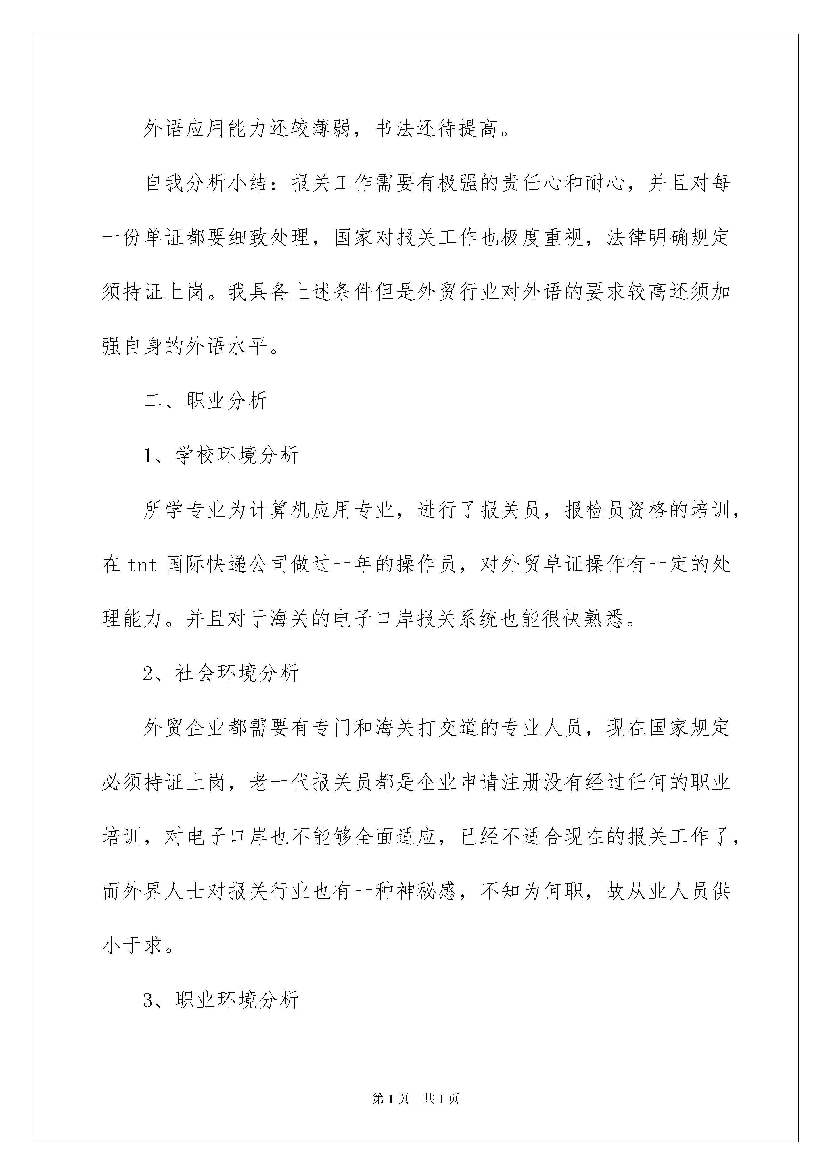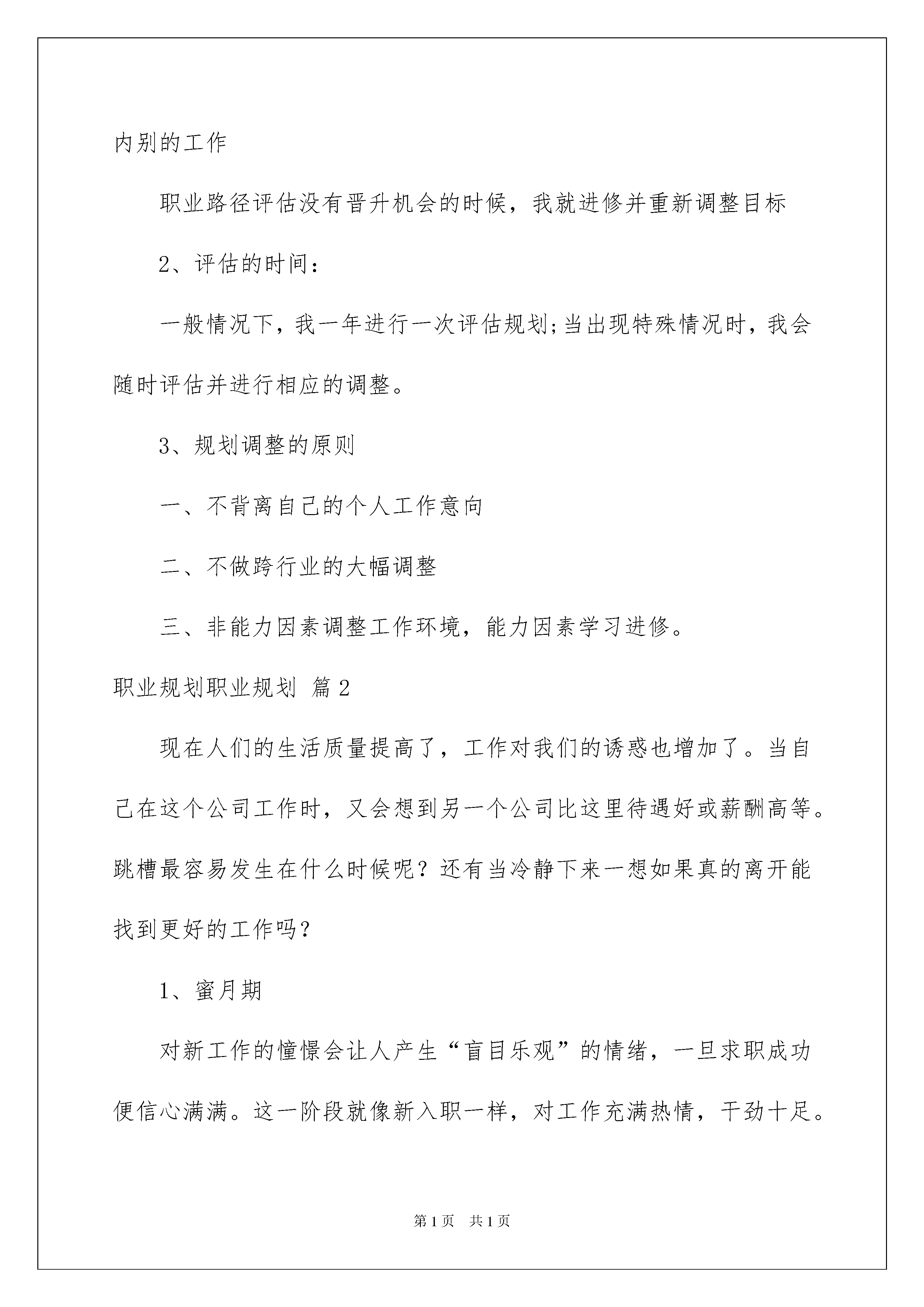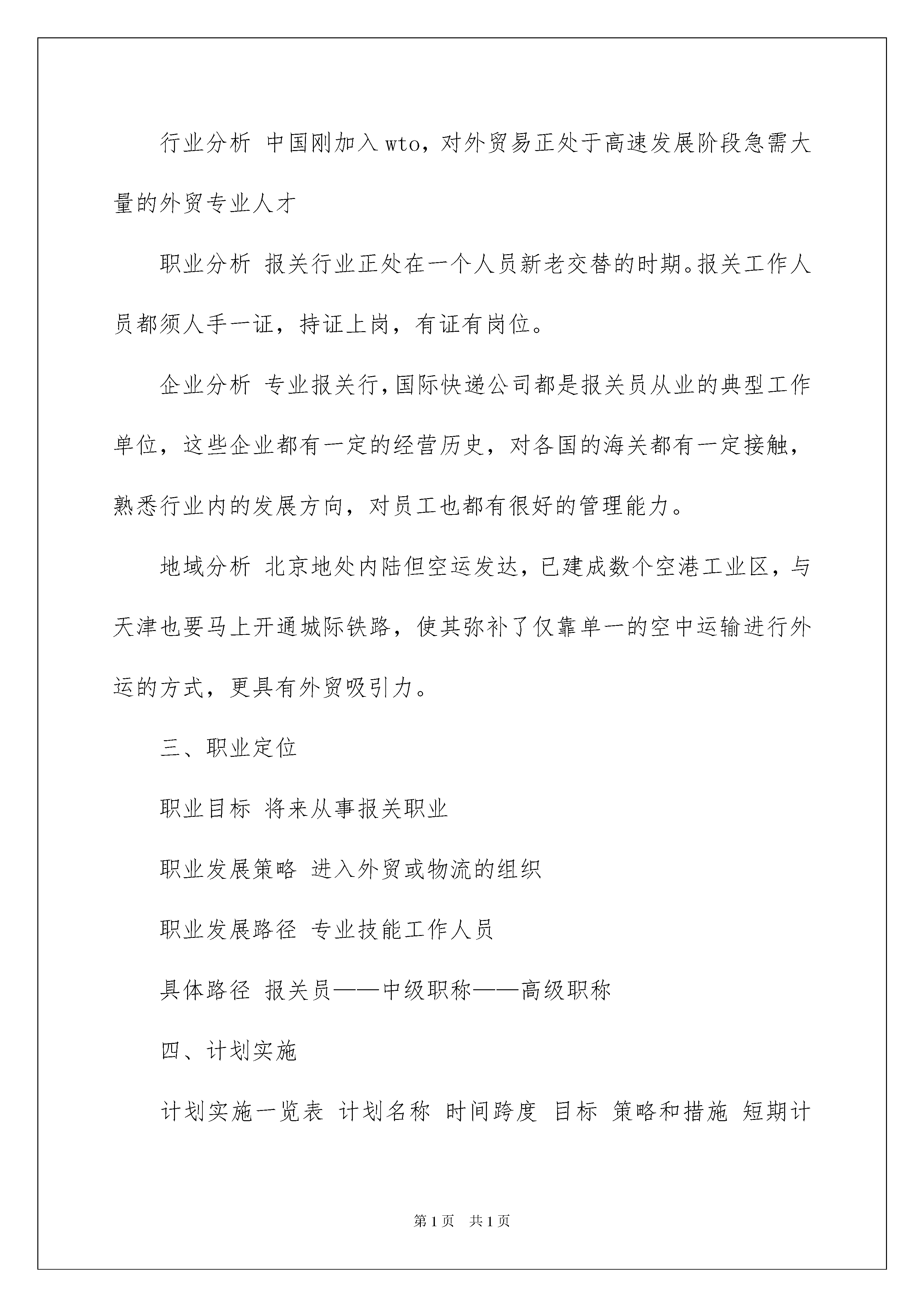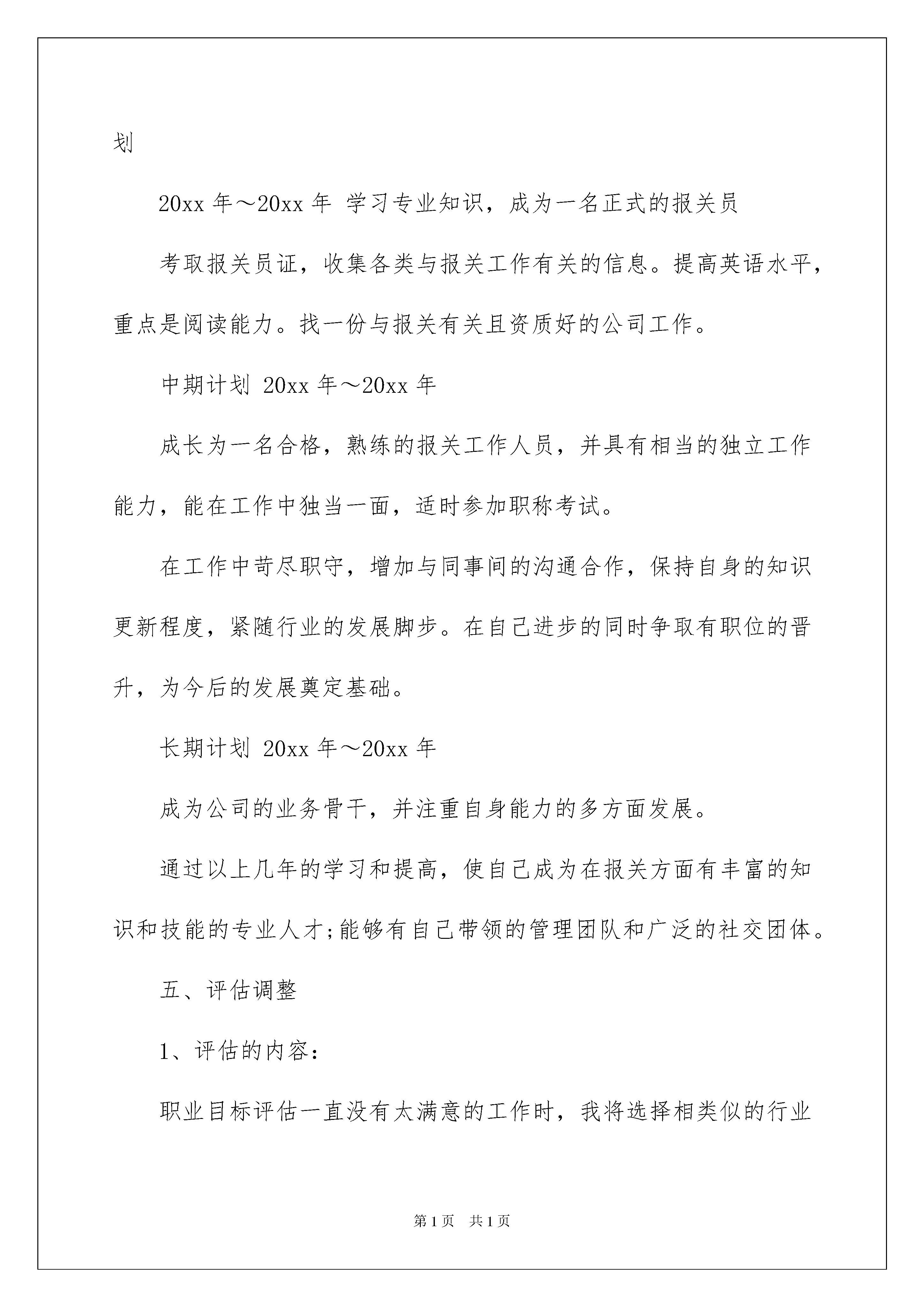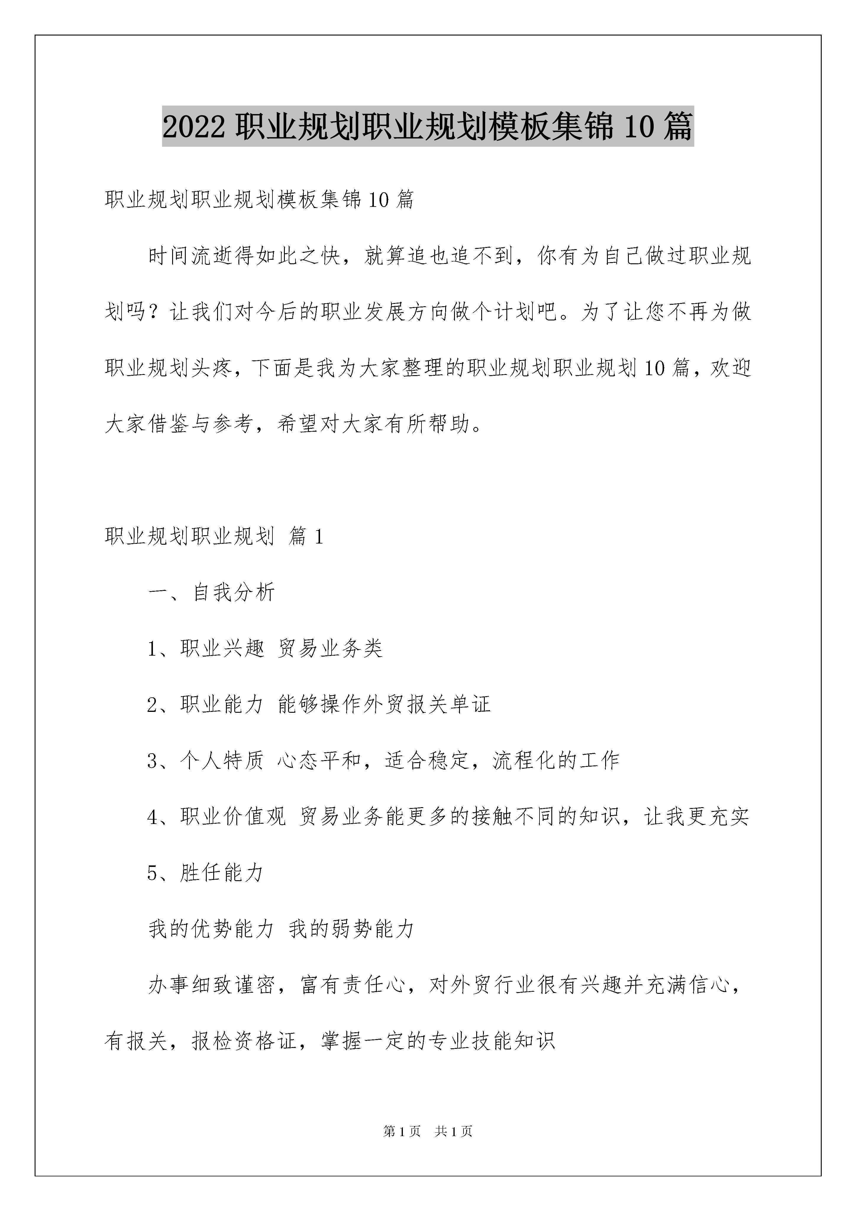 2022职业规划职业规划模板集锦10篇职业规划职业规划模板集锦10篇时间流逝得如此之快,就算追也追不到,你有为自己做过职业规划吗?让我们对今后的职业发展方向做个计划吧。为了让您不再为做职业规划头疼,下面是我为大家整理的职业规划职业规划10篇,欢迎大家借鉴与参考,希望对大家有所帮助。职业规划职业规划篇1一、自我分析1、职业兴趣贸易业务类2、职业能力能够操作外贸报关单证3、个人特质心态平和,适合稳定,流程化的工作4、职业价值观贸易业务能更多的接触不同的知识,让我更充实5、胜任能力我的优势能力我的弱势能力办事细致谨密,富有责任心,对外贸行业很有兴趣并充满信心,有报关,报检资格证,掌握一定的专业技能知识外语应用能力还较薄弱,书法还待提高。自我分析小结:报关工作需要有极强的责任心和耐心,并且对每一份单证都要细致处理,国家对报关工作也极度重视,法律明确规定须持证上岗。我具备上述条件但是外贸行业对外语的要求较高还须加强自身的外语水平。二、职业分析1、学校环境分析所学专业为计算机应用专业,进行了报关员,报检员资格的培训,在tnt国际快递公司做过一年的操作员,对外贸单证操作有一定的处理能力。并且对于海关的电子口岸报关系统也能很快熟悉。2、社会环境分析外贸企业都需要有专门和海关打交道的专业人员,现在国家规定必须持证上岗,老一代报关员都是企业申请注册没有经过任何的职业培训,对电子口岸也不能够全面适应,已经不适合现在的报关工作了,而外界人士对报关行业也有一种神秘感,不知为何职,故从业人员供小于求。3、职业环境分析行业分析中国刚加入wto,对外贸易正处于高速发展阶段急需大量的外贸专业人才职业分析报关行业正处在一个人员新老交替的时期。报关工作人员都须人手一证,持证上岗,有证有岗位。企业分析专业报关行,国际快递公司都是报关员从业的典型工作单位,这些企业都有一定的经营历史,对各国的海关都有一定接触,熟悉行业内的发展方向,对员工也都有很好的管理能力。地域分析北京地处内陆但空运发达,已建成数个空港工业区,与天津也要马上开通城际铁路,使其弥补了仅靠单一的空中运输进行外运的方式,更具有外贸吸引力。三、职业定位职业目标将来从事报关职业职业发展策略进入外贸或物流的组织职业发展路径专业技能工作人员具体路径报关员——中级职称——高级职称四、计划实施计划实施一览表计划名称时间跨度目标策略和措施短期计划20xx年~20xx年学习专业知识,成为一名正式的报关员考取报关员证,收集各类与报关工作有关的信息。提高英语水平,重点是阅读能力。找一份与报关有关且资质好的公司工作。中期计划20xx年~20xx年成长为一名合格,熟练的报关工作人员,并具有相当的独立工作能力,能在工作中独当一面,适时参加职称考试。在工作中苛尽职守,增加与同事间的沟通合作,保持自身的知识更新程度,紧随行业的发展脚步。在自己进步的同时争取有职位的晋升,为今后的发展奠定基础。长期计划20xx年~20xx年成为公司的业务骨干,并注重自身能力的多方面发展。通过以上几年的学习和提高,使自己成为在报关方面有丰富的知识和技能的专业人才;能够有自己带领的管理团队和广泛的社交团体。五、评估调整1、评估的内容:职业目标评估一直没有太满意的工作时,我将选择相类似的行业内别的工作职业路径评估没有晋升机会的时候,我就进修并重新调整目标2、评估的时间:一般情况下,我一年进行一次评估规划;当出现特殊情况时,我会随时评估并进行相应的调整。3、规划调整的原则一、不背离自己的个人工作意向二、不做跨行业的大幅调整三、非能力因素调整工作环境,能力因素学习进修。职业规划职业规划篇2现在人们的生活质量提高了,工作对我们的诱惑也增加了。当自己在这个公司工作时,又会想到另一个公司比这里待遇好或薪酬高等。跳槽最容易发生在什么时候呢?还有当冷静下来一想如果真的离开能找到更好的工作吗?1、蜜月期对新工作的憧憬会让人产生“盲目乐观”的情绪,一旦求职成功便信心满满。这一阶段就像新入职一样,对工作充满热情,干劲十足。2、受挫期时间长了,当发现工作和预期不一致,自己并不那么重视时,积极性很容易受到打击,产生受挫心理。3、低迷期累积的挫败感和失落感让人后悔、迷惘,甚至想再跳槽。此时,最重要的是调整心态、转移生活重心,比如降低对收入、职位等的预期,培养一些业余爱好等,而不要沉迷于抱怨、懊恼之中。4、着陆期经过了心理考验,多数人会对工作渐渐领会,逐渐融入新的企业文化,客观看待得失,在心态上开始“着陆”。此时,要及时提醒自己不要好高骛远,试图一步登天,而要多向老员工学习经验,给自己“充足电”。所以不能职场要懂得,该去该留,不能以自
