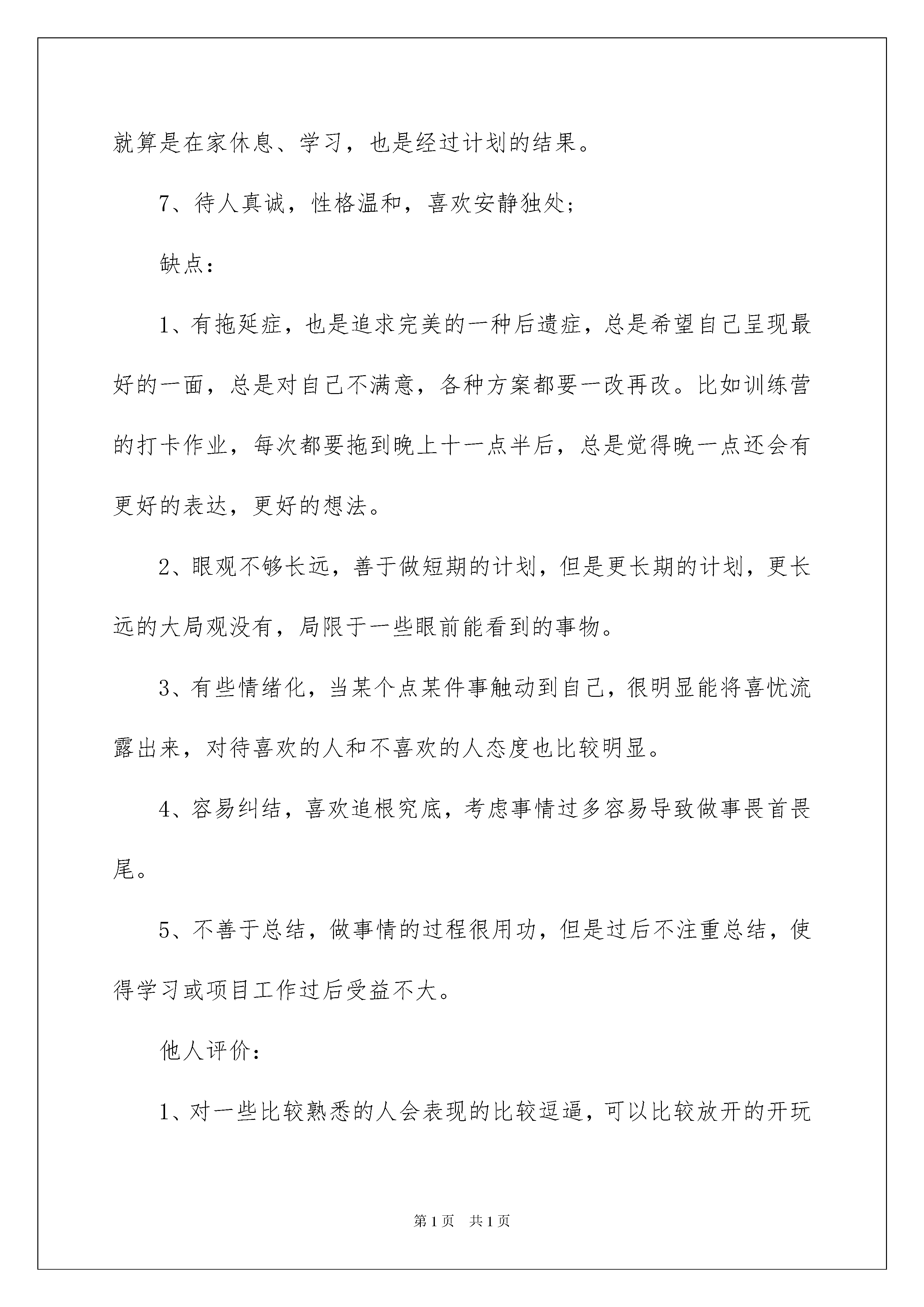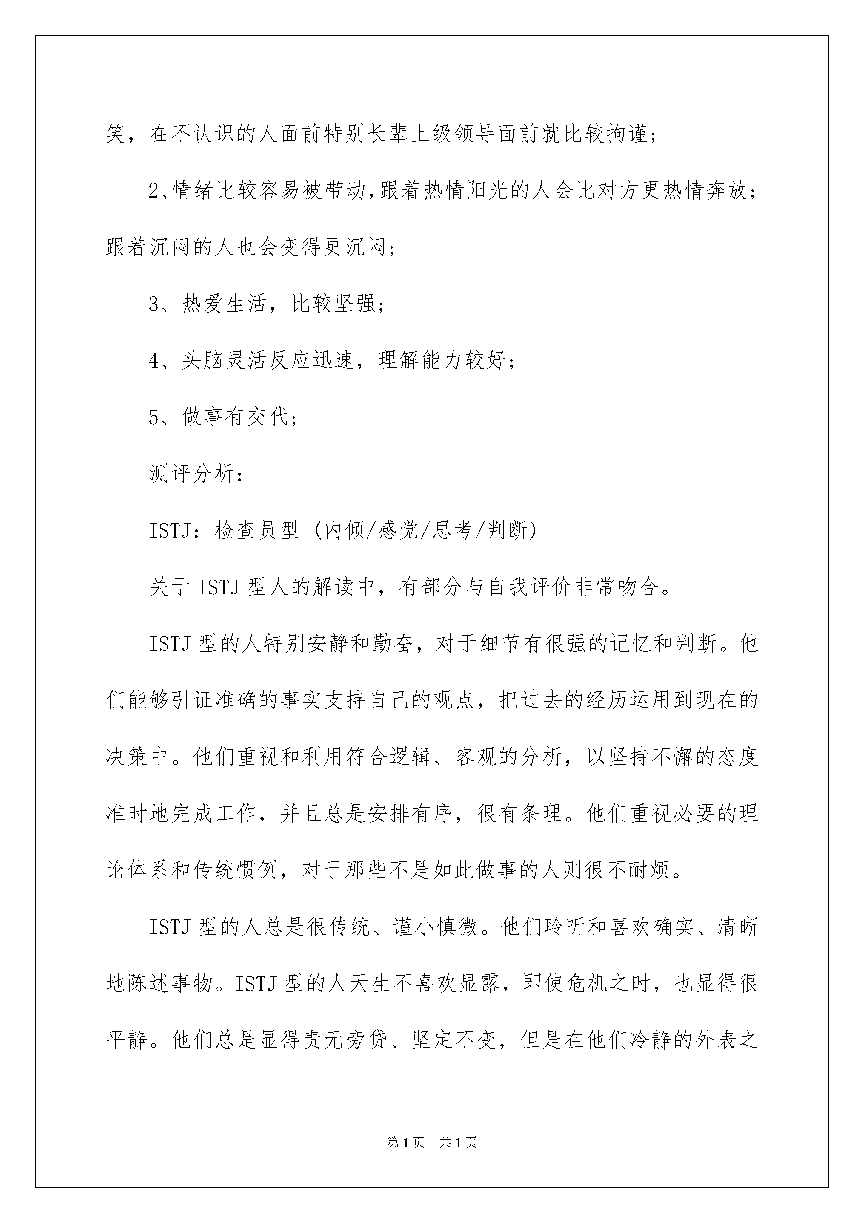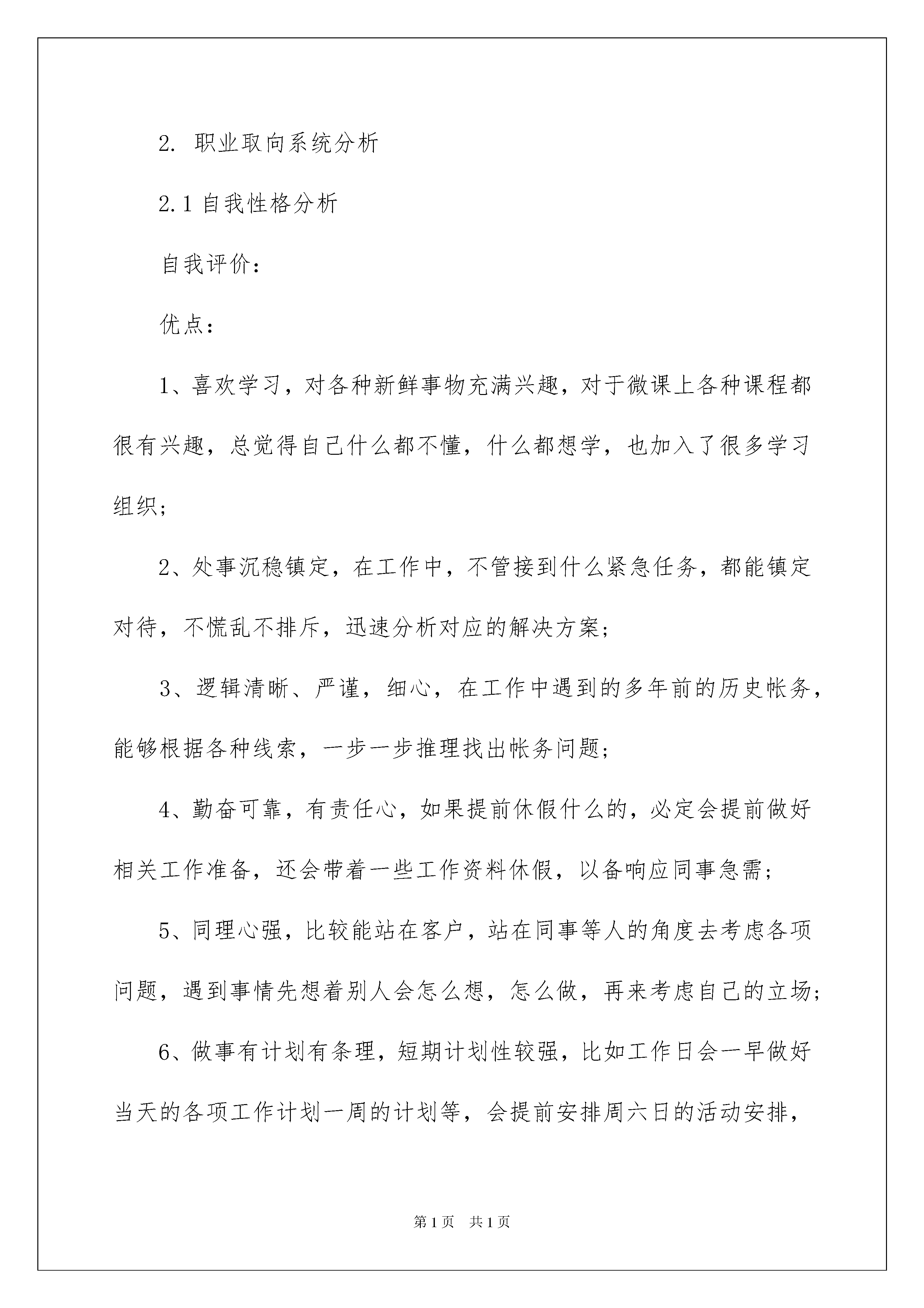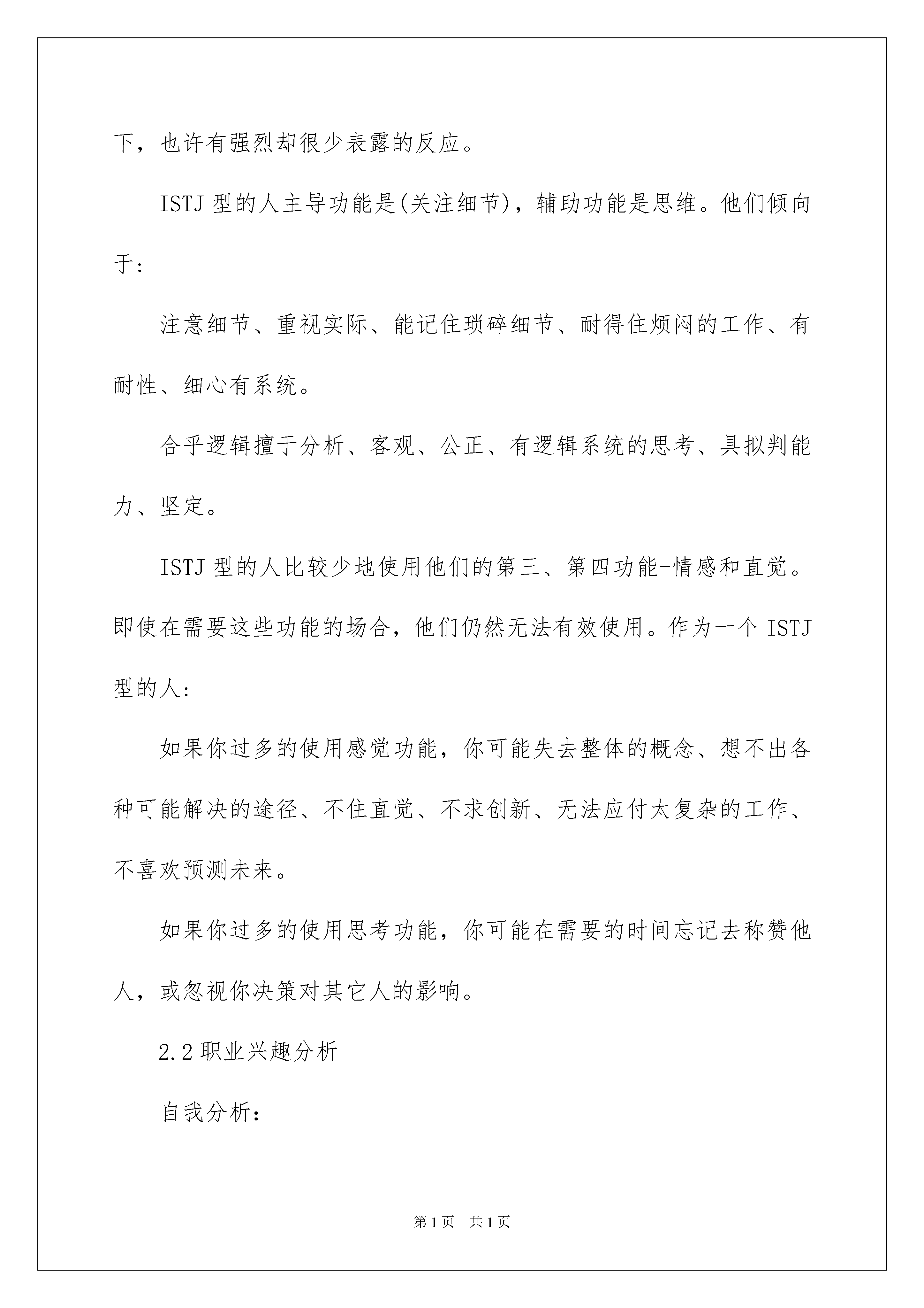 2022职业规划职业规划范文6篇职业规划职业规划范文6篇在我们无暇顾及时间时,时间早已匆匆流逝,我们又有了新的工作,该为自己做一个职业规划了。到底应如何做职业规划呢?以下是我帮大家整理的职业规划职业规划6篇,希望能够帮助到大家。职业规划职业规划篇11.基本信息姓名:××性别:女出生年月:1985年8月学历:本科专业:食品科学毕业院校:华南某理工工作状态:在职薪资待遇:年薪约十万婚姻状况:未婚2.职业取向系统分析2.1自我性格分析自我评价:优点:1、喜欢学习,对各种新鲜事物充满兴趣,对于微课上各种课程都很有兴趣,总觉得自己什么都不懂,什么都想学,也加入了很多学习组织;2、处事沉稳镇定,在工作中,不管接到什么紧急任务,都能镇定对待,不慌乱不排斥,迅速分析对应的解决方案;3、逻辑清晰、严谨,细心,在工作中遇到的多年前的历史帐务,能够根据各种线索,一步一步推理找出帐务问题;4、勤奋可靠,有责任心,如果提前休假什么的,必定会提前做好相关工作准备,还会带着一些工作资料休假,以备响应同事急需;5、同理心强,比较能站在客户,站在同事等人的角度去考虑各项问题,遇到事情先想着别人会怎么想,怎么做,再来考虑自己的立场;6、做事有计划有条理,短期计划性较强,比如工作日会一早做好当天的各项工作计划一周的计划等,会提前安排周六日的活动安排,就算是在家休息、学习,也是经过计划的结果。7、待人真诚,性格温和,喜欢安静独处;缺点:1、有拖延症,也是追求完美的一种后遗症,总是希望自己呈现最好的一面,总是对自己不满意,各种方案都要一改再改。比如训练营的打卡作业,每次都要拖到晚上十一点半后,总是觉得晚一点还会有更好的表达,更好的想法。2、眼观不够长远,善于做短期的计划,但是更长期的计划,更长远的大局观没有,局限于一些眼前能看到的事物。3、有些情绪化,当某个点某件事触动到自己,很明显能将喜忧流露出来,对待喜欢的人和不喜欢的人态度也比较明显。4、容易纠结,喜欢追根究底,考虑事情过多容易导致做事畏首畏尾。5、不善于总结,做事情的过程很用功,但是过后不注重总结,使得学习或项目工作过后受益不大。他人评价:1、对一些比较熟悉的人会表现的比较逗逼,可以比较放开的开玩笑,在不认识的人面前特别长辈上级领导面前就比较拘谨;2、情绪比较容易被带动,跟着热情阳光的人会比对方更热情奔放;跟着沉闷的人也会变得更沉闷;3、热爱生活,比较坚强;4、头脑灵活反应迅速,理解能力较好;5、做事有交代;测评分析:ISTJ:检查员型(内倾/感觉/思考/判断)关于ISTJ型人的解读中,有部分与自我评价非常吻合。ISTJ型的人特别安静和勤奋,对于细节有很强的记忆和判断。他们能够引证准确的事实支持自己的观点,把过去的经历运用到现在的决策中。他们重视和利用符合逻辑、客观的分析,以坚持不懈的态度准时地完成工作,并且总是安排有序,很有条理。他们重视必要的理论体系和传统惯例,对于那些不是如此做事的人则很不耐烦。ISTJ型的人总是很传统、谨小慎微。他们聆听和喜欢确实、清晰地陈述事物。ISTJ型的人天生不喜欢显露,即使危机之时,也显得很平静。他们总是显得责无旁贷、坚定不变,但是在他们冷静的外表之下,也许有强烈却很少表露的反应。ISTJ型的人主导功能是(关注细节),辅助功能是思维。他们倾向于:注意细节、重视实际、能记住琐碎细节、耐得住烦闷的工作、有耐性、细心有系统。合乎逻辑擅于分析、客观、公正、有逻辑系统的思考、具拟判能力、坚定。ISTJ型的人比较少地使用他们的第三、第四功能-情感和直觉。即使在需要这些功能的场合,他们仍然无法有效使用。作为一个ISTJ型的人:如果你过多的使用感觉功能,你可能失去整体的概念、想不出各种可能解决的途径、不住直觉、不求创新、无法应付太复杂的工作、不喜欢预测未来。如果你过多的使用思考功能,你可能在需要的时间忘记去称赞他人,或忽视你决策对其它人的影响。2.2职业兴趣分析自我分析:1.能产生实际社会效益的工作2.能与人有所交流协调3.能被相关同事或客户认可需要4.能在大项目中担任重要角色5.能发挥思维缜密、细心沉稳的性格优势测评分析:结果:ESI(事业型、社会型、调查型)综合解读:习惯以利益衡量做事的价值,做事有较强的目的性,关心社会问题,愿意发挥自己的社会作用,考虑问题理性,做事喜欢精确,喜欢逻辑分析和推理,不断探讨未知的领域。1、企业型:(E)共同特征:追求权力、权威和物质财富,具有领导才能。喜欢竞争、敢冒风险、有野心、抱负。为人务实,习惯以利益得失,权利、地位、金钱等来衡量做事的价值,做事有较强的目的性。典型职业:喜欢要求具备经营、管理、劝服、