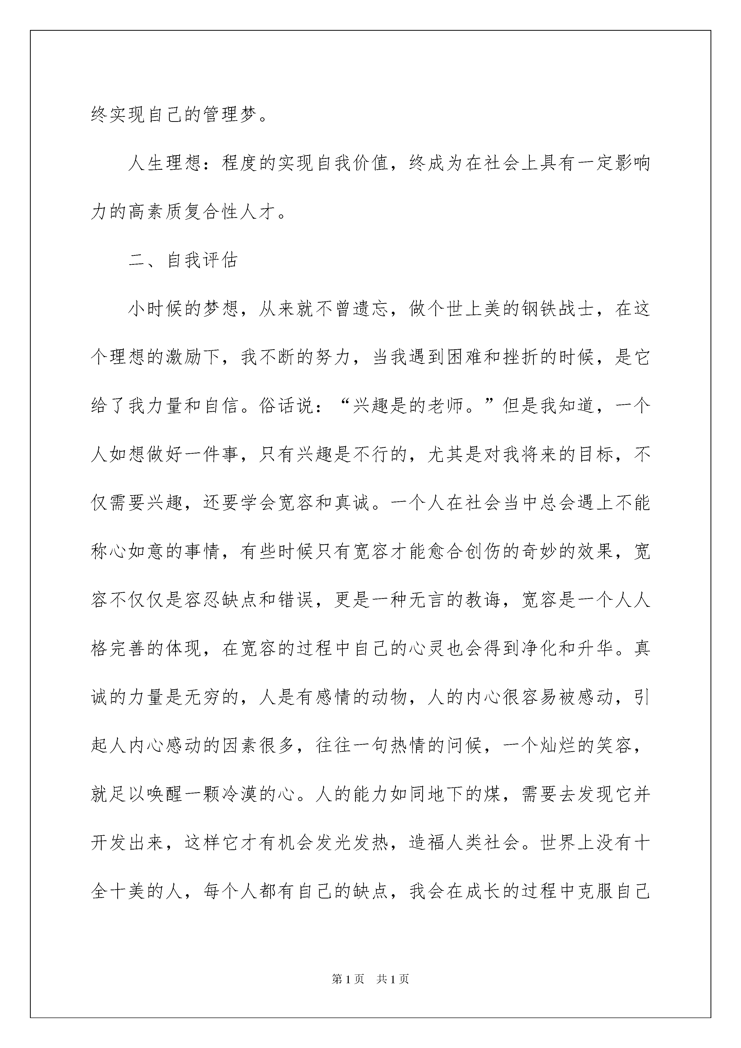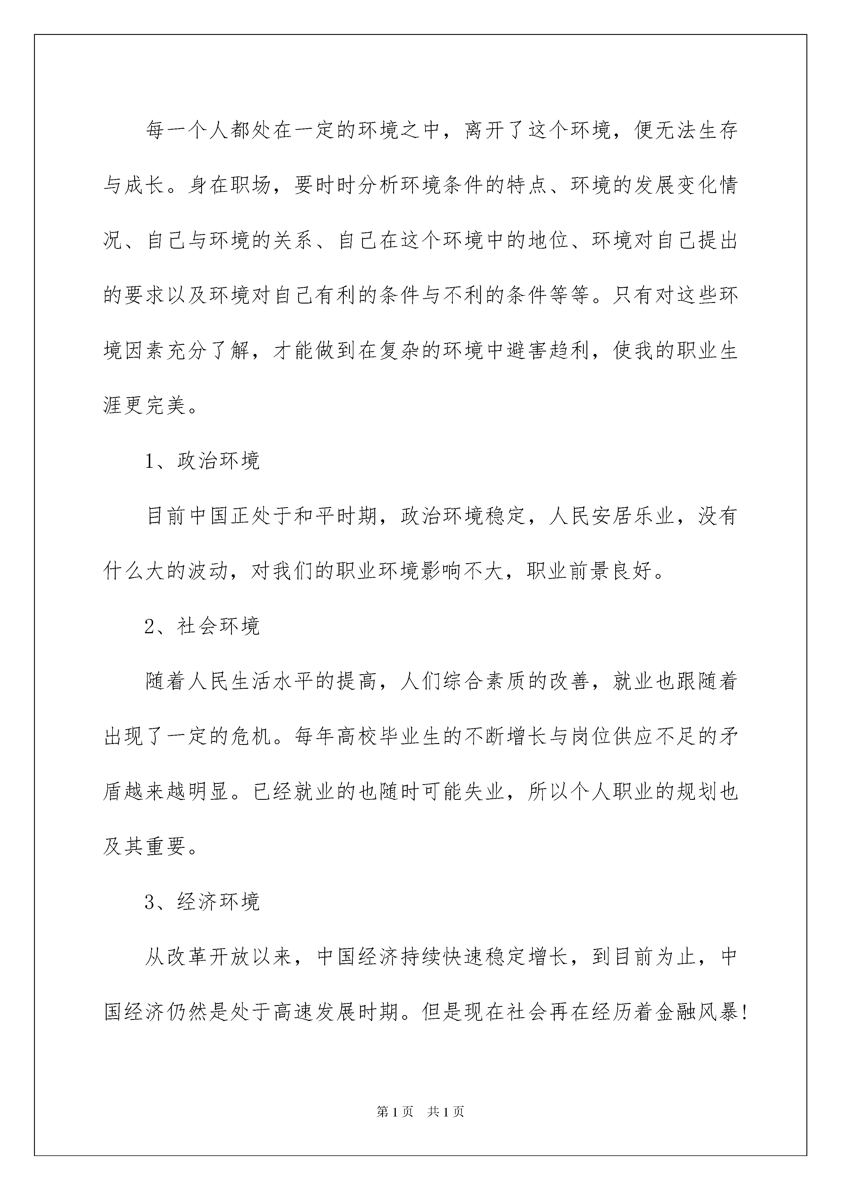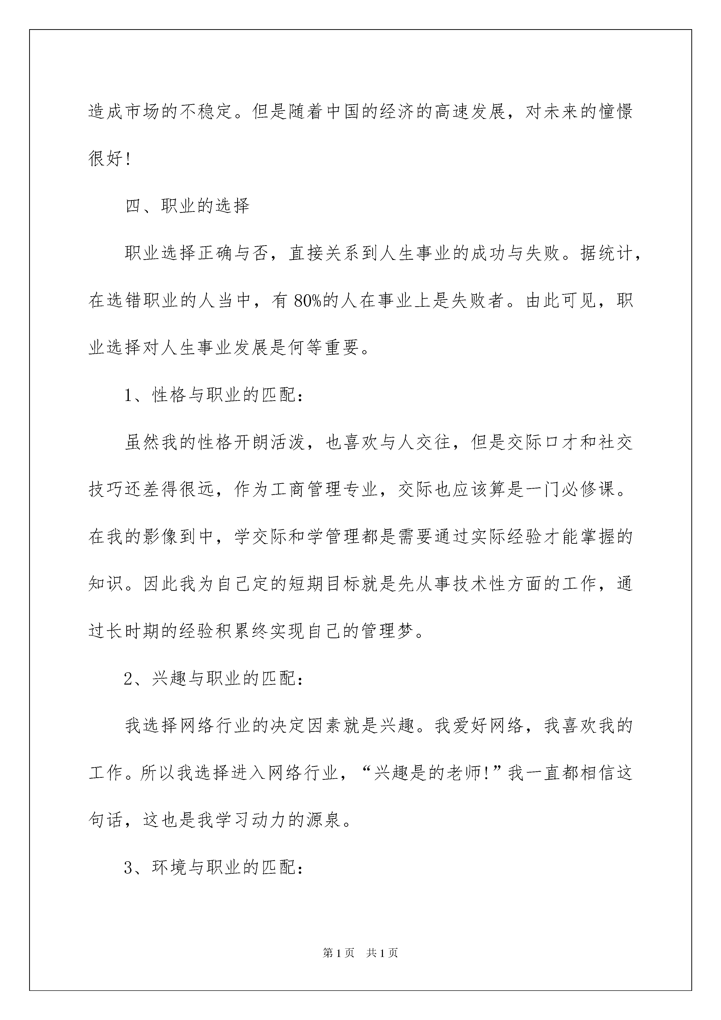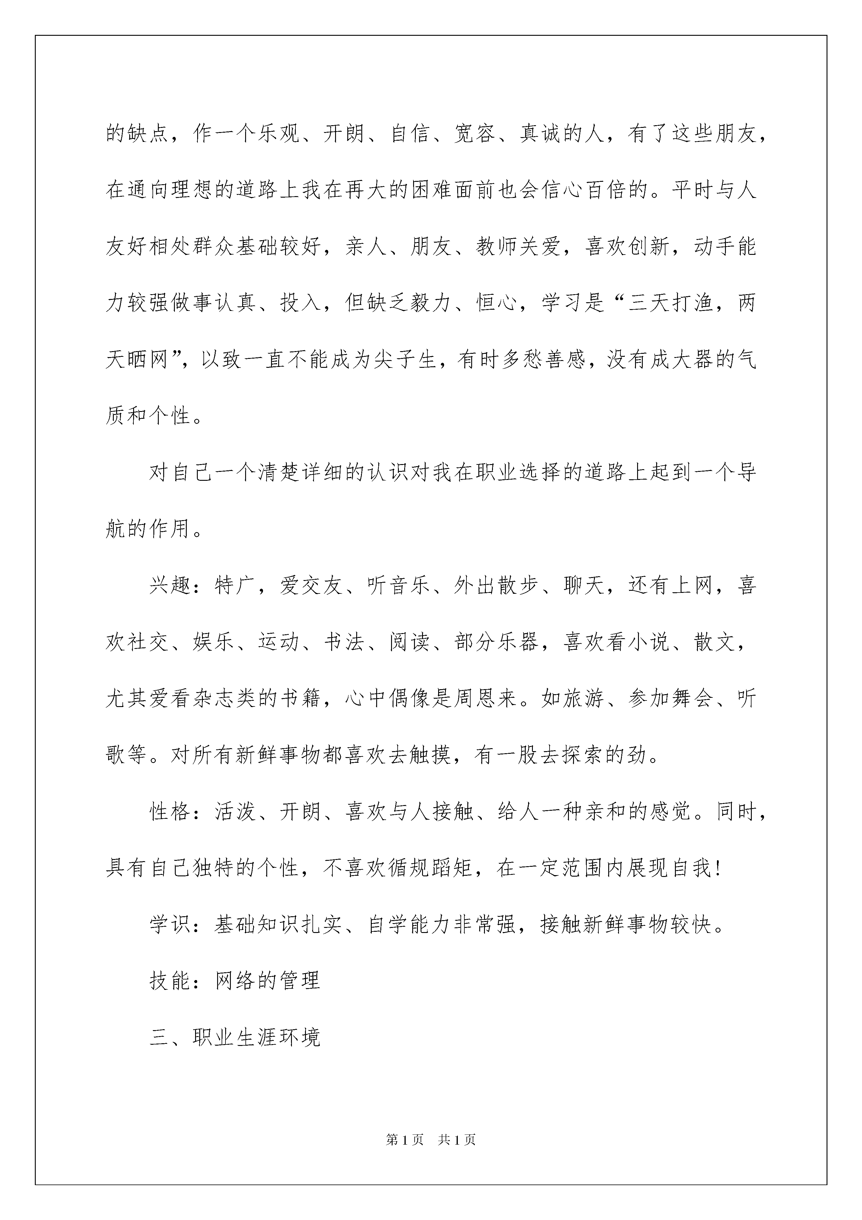 2022职业规划职业规划锦集7篇职业规划职业规划锦集7篇日子如同白驹过隙,不经意间,我们的工作又将告一段落了,我们又将会有新的际遇,这也意味着,需要开始写职业规划了。但是你知道怎样才能写的好吗?下面是我整理的职业规划职业规划7篇,供大家参考借鉴,希望可以帮助到有需要的朋友。职业规划职业规划篇1随着计算机的远程信息化处理应用的高速发展和广泛应用,网络已成为经济发展的强大动力。计算机网络工程是计算机技术和通信技术密切结合而形成的新兴的技术领域,尤其在当今互联网迅猛发展和网络经济蓬勃繁荣的形势下,网络工程技术成为信息技术界关注的热门技术之一,也是迅速发展并在信息社会中得到广泛应用的一门综合性学科,网络工程师正是这一学科的主宰力量。一、确定志向职业理想:作为学网络工程的,的志向就是走向企业的队伍当中去。结合自身独有的特点,理想是进入网络工程行业,从低层做起,终实现自己的管理梦。人生理想:程度的实现自我价值,终成为在社会上具有一定影响力的高素质复合性人才。二、自我评估小时候的梦想,从来就不曾遗忘,做个世上美的钢铁战士,在这个理想的激励下,我不断的努力,当我遇到困难和挫折的时候,是它给了我力量和自信。俗话说:“兴趣是的老师。”但是我知道,一个人如想做好一件事,只有兴趣是不行的,尤其是对我将来的目标,不仅需要兴趣,还要学会宽容和真诚。一个人在社会当中总会遇上不能称心如意的事情,有些时候只有宽容才能愈合创伤的奇妙的效果,宽容不仅仅是容忍缺点和错误,更是一种无言的教诲,宽容是一个人人格完善的体现,在宽容的过程中自己的心灵也会得到净化和升华。真诚的力量是无穷的,人是有感情的动物,人的内心很容易被感动,引起人内心感动的因素很多,往往一句热情的问候,一个灿烂的笑容,就足以唤醒一颗冷漠的心。人的能力如同地下的煤,需要去发现它并开发出来,这样它才有机会发光发热,造福人类社会。世界上没有十全十美的人,每个人都有自己的缺点,我会在成长的过程中克服自己的缺点,作一个乐观、开朗、自信、宽容、真诚的人,有了这些朋友,在通向理想的道路上我在再大的困难面前也会信心百倍的。平时与人友好相处群众基础较好,亲人、朋友、教师关爱,喜欢创新,动手能力较强做事认真、投入,但缺乏毅力、恒心,学习是“三天打渔,两天晒网”,以致一直不能成为尖子生,有时多愁善感,没有成大器的气质和个性。对自己一个清楚详细的认识对我在职业选择的道路上起到一个导航的作用。兴趣:特广,爱交友、听音乐、外出散步、聊天,还有上网,喜欢社交、娱乐、运动、书法、阅读、部分乐器,喜欢看小说、散文,尤其爱看杂志类的书籍,心中偶像是周恩来。如旅游、参加舞会、听歌等。对所有新鲜事物都喜欢去触摸,有一股去探索的劲。性格:活泼、开朗、喜欢与人接触、给人一种亲和的感觉。同时,具有自己独特的个性,不喜欢循规蹈矩,在一定范围内展现自我!学识:基础知识扎实、自学能力非常强,接触新鲜事物较快。技能:网络的管理三、职业生涯环境每一个人都处在一定的环境之中,离开了这个环境,便无法生存与成长。身在职场,要时时分析环境条件的特点、环境的发展变化情况、自己与环境的关系、自己在这个环境中的地位、环境对自己提出的要求以及环境对自己有利的条件与不利的条件等等。只有对这些环境因素充分了解,才能做到在复杂的环境中避害趋利,使我的职业生涯更完美。1、政治环境目前中国正处于和平时期,政治环境稳定,人民安居乐业,没有什么大的波动,对我们的职业环境影响不大,职业前景良好。2、社会环境随着人民生活水平的提高,人们综合素质的改善,就业也跟随着出现了一定的危机。每年高校毕业生的不断增长与岗位供应不足的矛盾越来越明显。已经就业的也随时可能失业,所以个人职业的规划也及其重要。3、经济环境从改革开放以来,中国经济持续快速稳定增长,到目前为止,中国经济仍然是处于高速发展时期。但是现在社会再在经历着金融风暴!造成市场的不稳定。但是随着中国的经济的高速发展,对未来的憧憬很好!四、职业的选择职业选择正确与否,直接关系到人生事业的成功与失败。据统计,在选错职业的人当中,有80%的人在事业上是失败者。由此可见,职业选择对人生事业发展是何等重要。1、性格与职业的匹配:虽然我的性格开朗活泼,也喜欢与人交往,但是交际口才和社交技巧还差得很远,作为工商管理专业,交际也应该算是一门必修课。在我的影像到中,学交际和学管理都是需要通过实际经验才能掌握的知识。因此我为自己定的短期目标就是先从事技术性方面的工作,通过长时期的经验积累终实现自己的管理梦。2、兴趣与职业的匹配:我选择网络行业的决定因素就是兴趣。我爱好网络,我喜欢我的工作。所以我选择进入网络