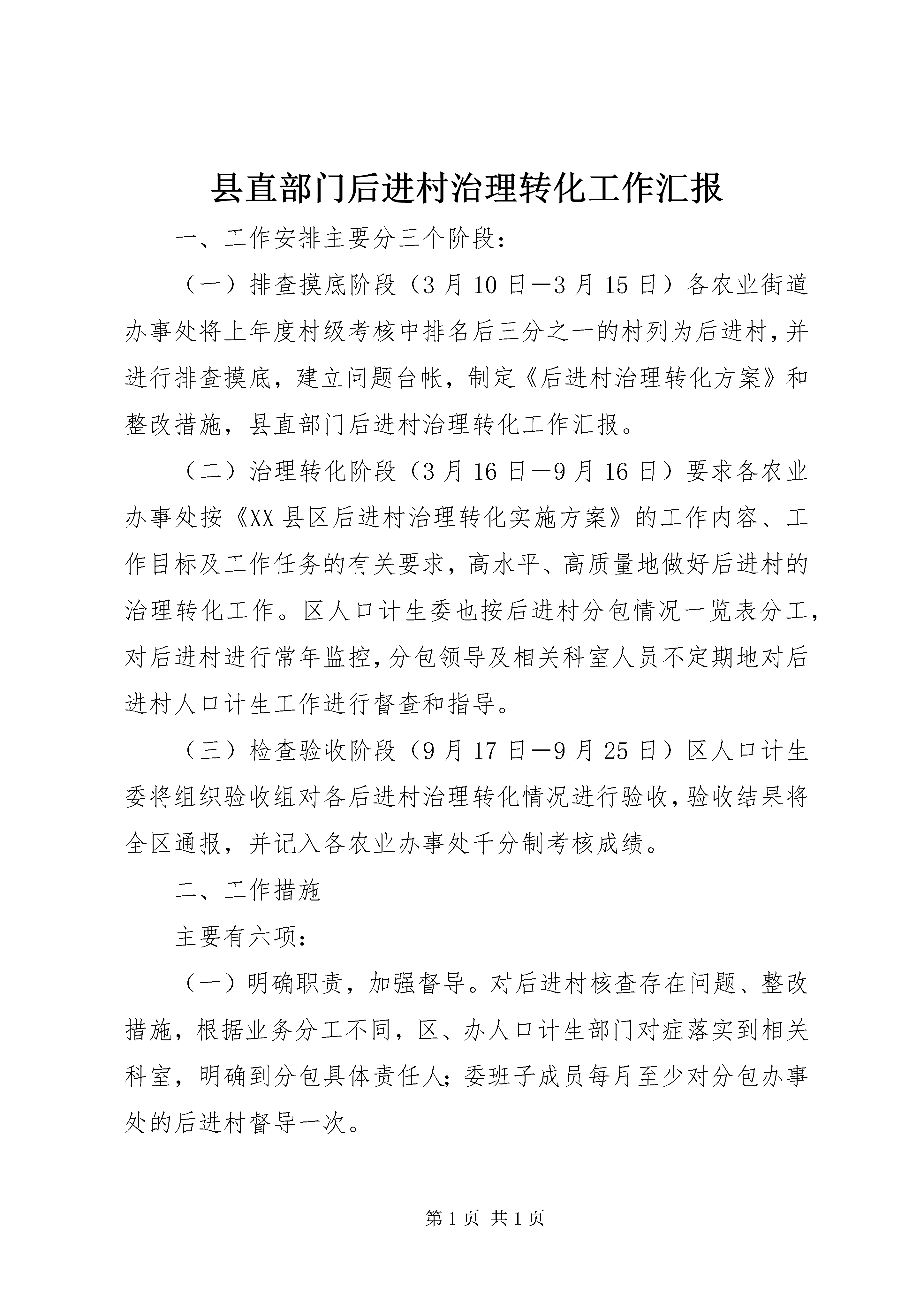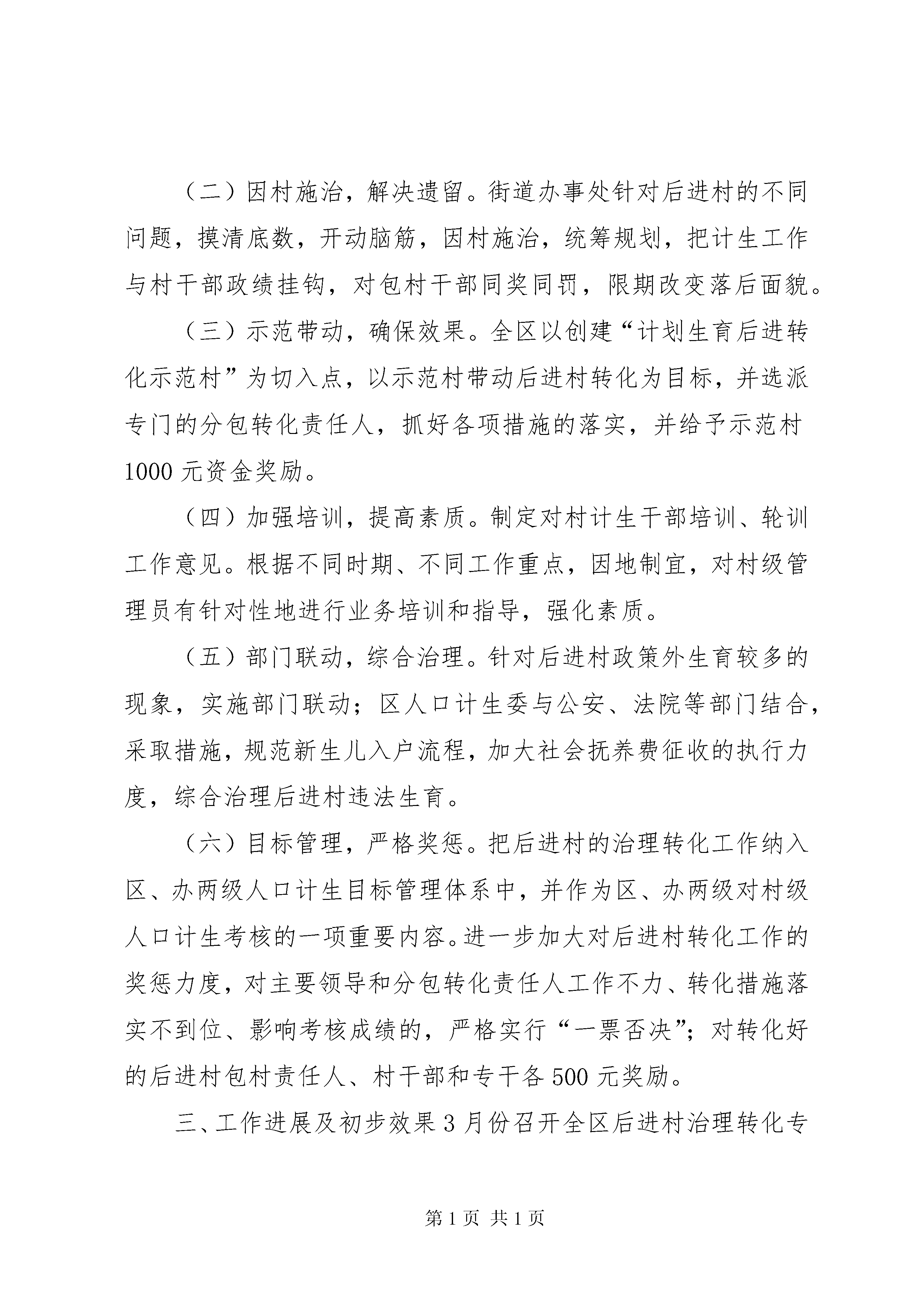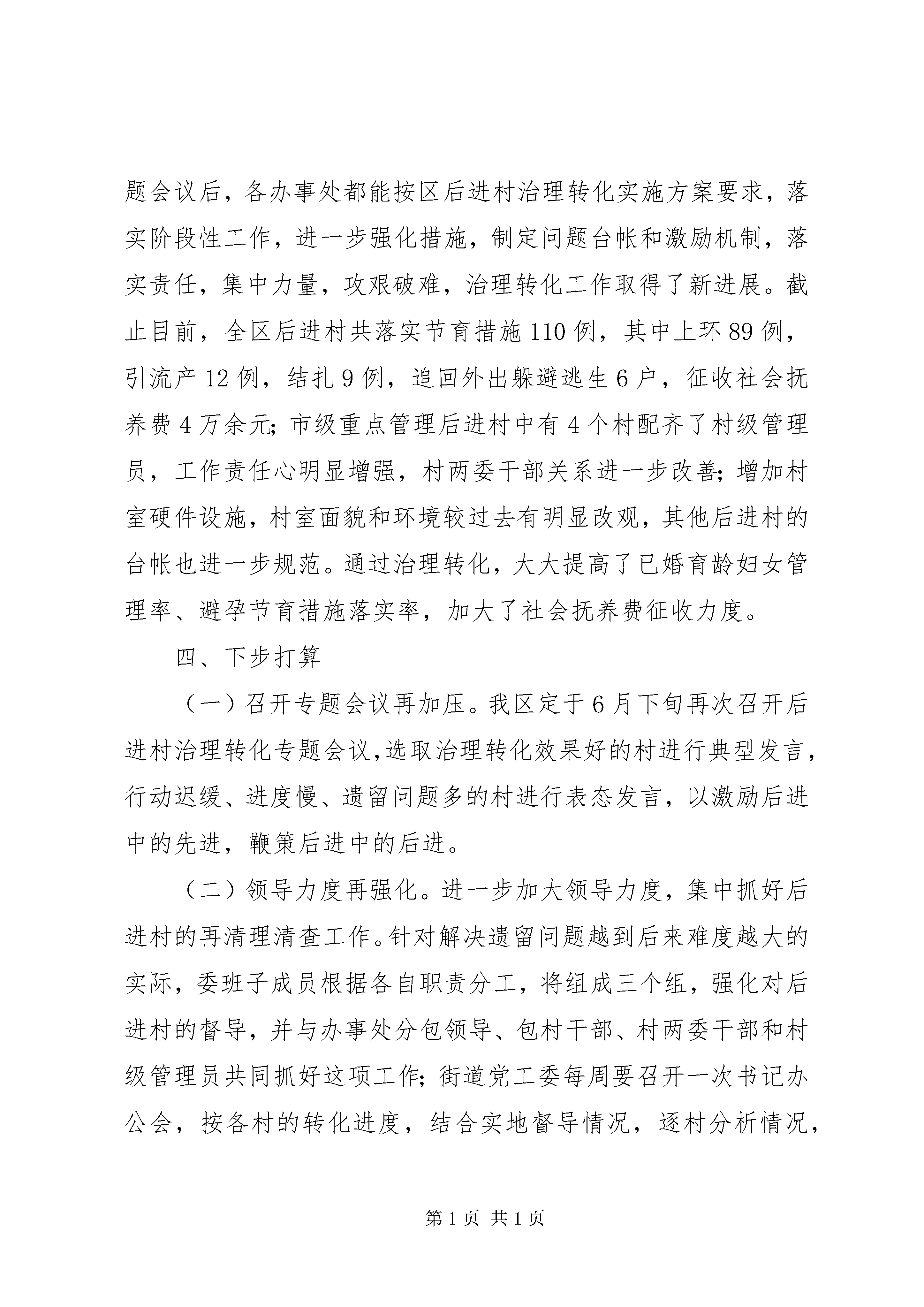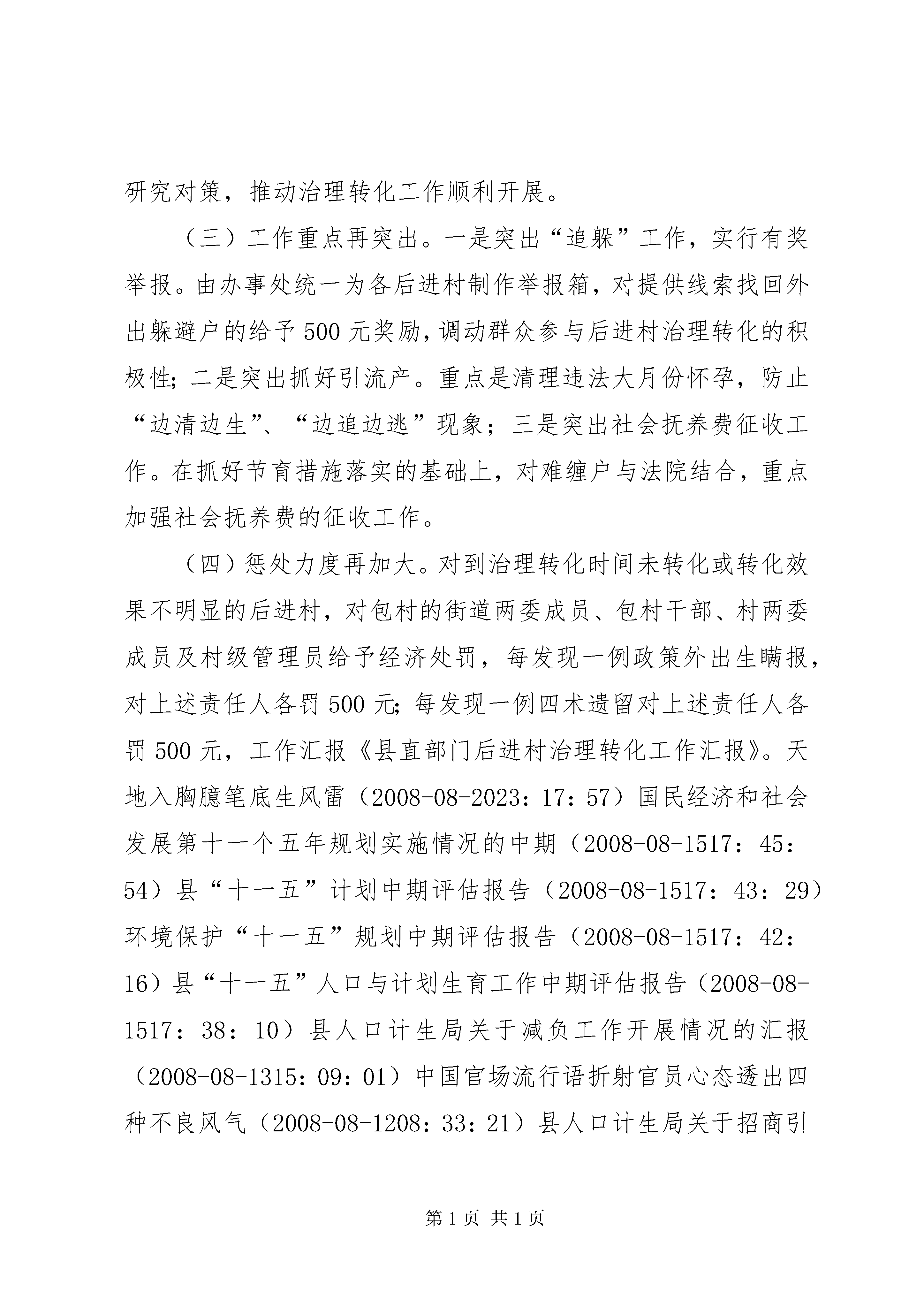 县直部门后进村治理转化工作汇报一、工作安排主要分三个阶段:(一)排查摸底阶段(3月10日-3月15日)各农业街道办事处将上年度村级考核中排名后三分之一的村列为后进村,并进行排查摸底,建立问题台帐,制定《后进村治理转化方案》和整改措施,县直部门后进村治理转化工作汇报。(二)治理转化阶段(3月16日-9月16日)要求各农业办事处按《XX县区后进村治理转化实施方案》的工作内容、工作目标及工作任务的有关要求,高水平、高质量地做好后进村的治理转化工作。区人口计生委也按后进村分包情况一览表分工,对后进村进行常年监控,分包领导及相关科室人员不定期地对后进村人口计生工作进行督查和指导。(三)检查验收阶段(9月17日-9月25日)区人口计生委将组织验收组对各后进村治理转化情况进行验收,验收结果将全区通报,并记入各农业办事处千分制考核成绩。二、工作措施主要有六项:(一)明确职责,加强督导。对后进村核查存在问题、整改措施,根据业务分工不同,区、办人口计生部门对症落实到相关科室,明确到分包具体责任人;委班子成员每月至少对分包办事处的后进村督导一次。(二)因村施治,解决遗留。街道办事处针对后进村的不同问题,摸清底数,开动脑筋,因村施治,统筹规划,把计生工作与村干部政绩挂钩,对包村干部同奖同罚,限期改变落后面貌。(三)示范带动,确保效果。全区以创建“计划生育后进转化示范村”为切入点,以示范村带动后进村转化为目标,并选派专门的分包转化责任人,抓好各项措施的落实,并给予示范村1000元资金奖励。(四)加强培训,提高素质。制定对村计生干部培训、轮训工作意见。根据不同时期、不同工作重点,因地制宜,对村级管理员有针对性地进行业务培训和指导,强化素质。(五)部门联动,综合治理。针对后进村政策外生育较多的现象,实施部门联动;区人口计生委与公安、法院等部门结合,采取措施,规范新生儿入户流程,加大社会抚养费征收的执行力度,综合治理后进村违法生育。(六)目标管理,严格奖惩。把后进村的治理转化工作纳入区、办两级人口计生目标管理体系中,并作为区、办两级对村级人口计生考核的一项重要内容。进一步加大对后进村转化工作的奖惩力度,对主要领导和分包转化责任人工作不力、转化措施落实不到位、影响考核成绩的,严格实行“一票否决”;对转化好的后进村包村责任人、村干部和专干各500元奖励。三、工作进展及初步效果3月份召开全区后进村治理转化专题会议后,各办事处都能按区后进村治理转化实施方案要求,落实阶段性工作,进一步强化措施,制定问题台帐和激励机制,落实责任,集中力量,攻艰破难,治理转化工作取得了新进展。截止目前,全区后进村共落实节育措施110例,其中上环89例,引流产12例,结扎9例,追回外出躲避逃生6户,征收社会抚养费4万余元;市级重点管理后进村中有4个村配齐了村级管理员,工作责任心明显增强,村两委干部关系进一步改善;增加村室硬件设施,村室面貌和环境较过去有明显改观,其他后进村的台帐也进一步规范。通过治理转化,大大提高了已婚育龄妇女管理率、避孕节育措施落实率,加大了社会抚养费征收力度。四、下步打算(一)召开专题会议再加压。我区定于6月下旬再次召开后进村治理转化专题会议,选取治理转化效果好的村进行典型发言,行动迟缓、进度慢、遗留问题多的村进行表态发言,以激励后进中的先进,鞭策后进中的后进。(二)领导力度再强化。进一步加大领导力度,集中抓好后进村的再清理清查工作。针对解决遗留问题越到后来难度越大的实际,委班子成员根据各自职责分工,将组成三个组,强化对后进村的督导,并与办事处分包领导、包村干部、村两委干部和村级管理员共同抓好这项工作;街道党工委每周要召开一次书记办公会,按各村的转化进度,结合实地督导情况,逐村分析情况,研究对策,推动治理转化工作顺利开展。(三)工作重点再突出。一是突出“追躲”工作,实行有奖举报。由办事处统一为各后进村制作举报箱,对提供线索找回外出躲避户的给予500元奖励,调动群众参与后进村治理转化的积极性;二是突出抓好引流产。重点是清理违法大月份怀孕,防止“边清边生”、“边追边逃”现象;三是突出社会抚养费征收工作。在抓好节育措施落实的基础上,对难缠户与法院结合,重点加强社会抚养费的征收工作。(四)惩处力度再加大。对到治理转化时间未转化或转化效果不明显的后进村,对包村的街道两委成员、包村干部、村两委成员及村级管理员给予经济处罚,每发现一例政策外出生瞒报,对上述责任人各罚500元;每发现一例四术遗留对上述责任人各罚500元,工作汇报《县直部门后进村治理转化工作汇报》。天地入胸臆笔底生风雷(2008-08-2023:17:57)国民经济和社会发展第十一个五年规划实施情况的中期(2008-08-1517:45:54)县“十一五”计划中期评估报告(2008-08-151
