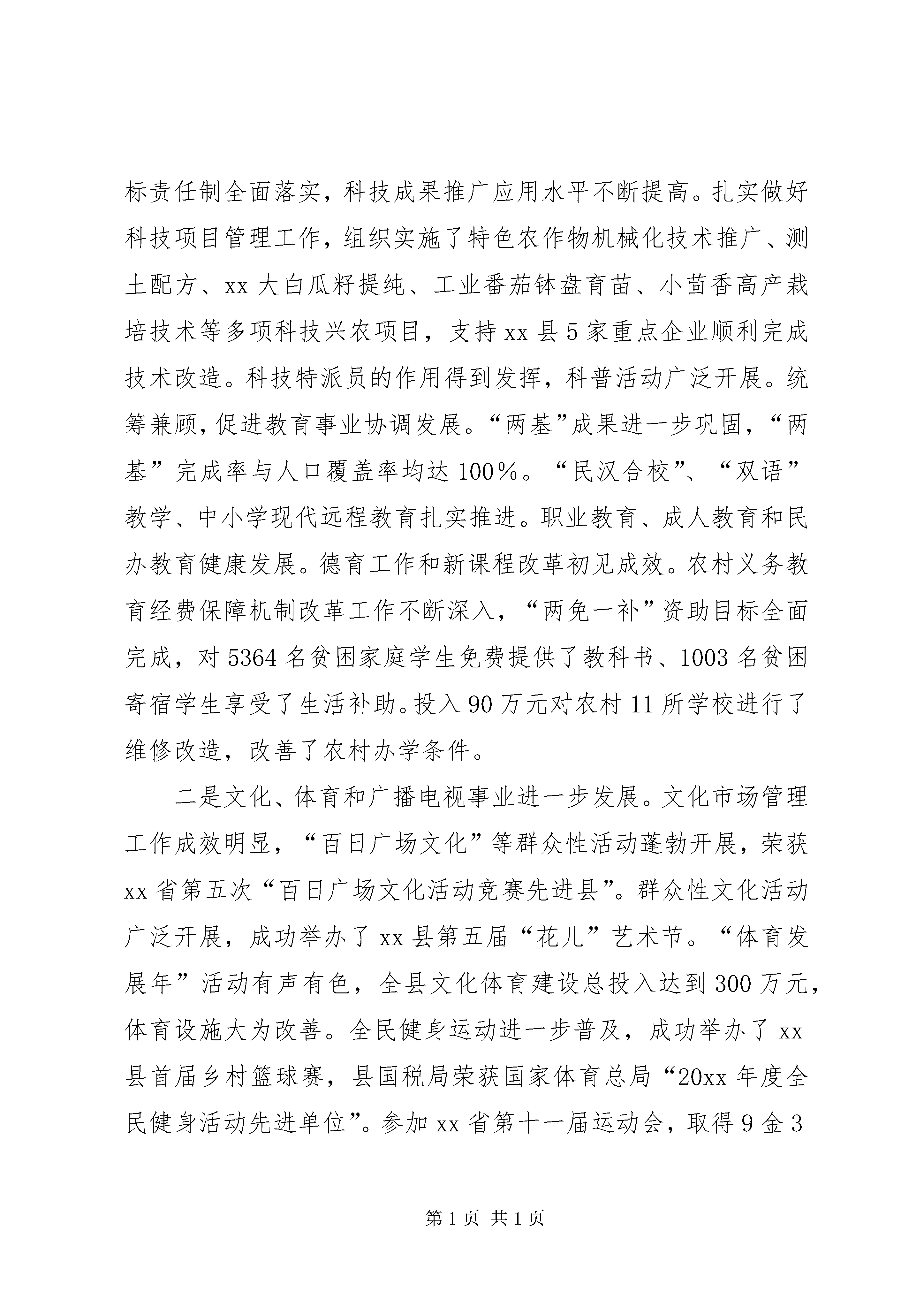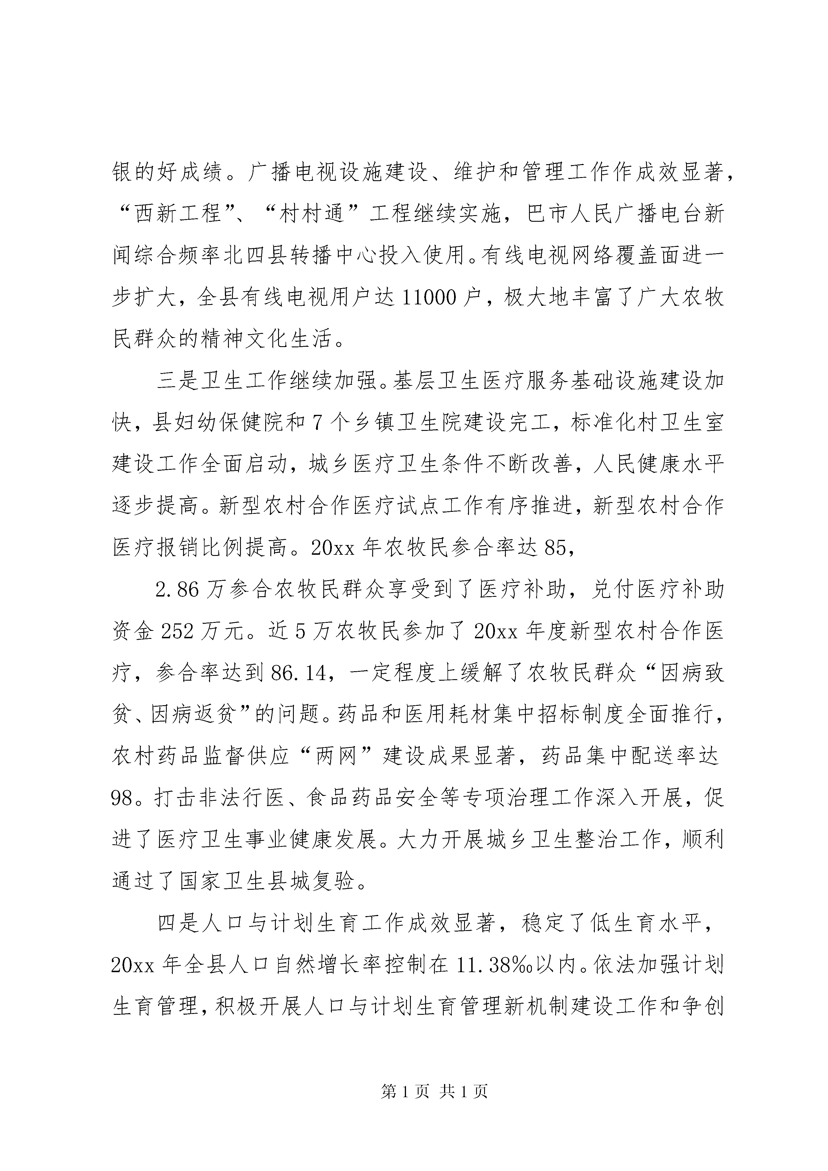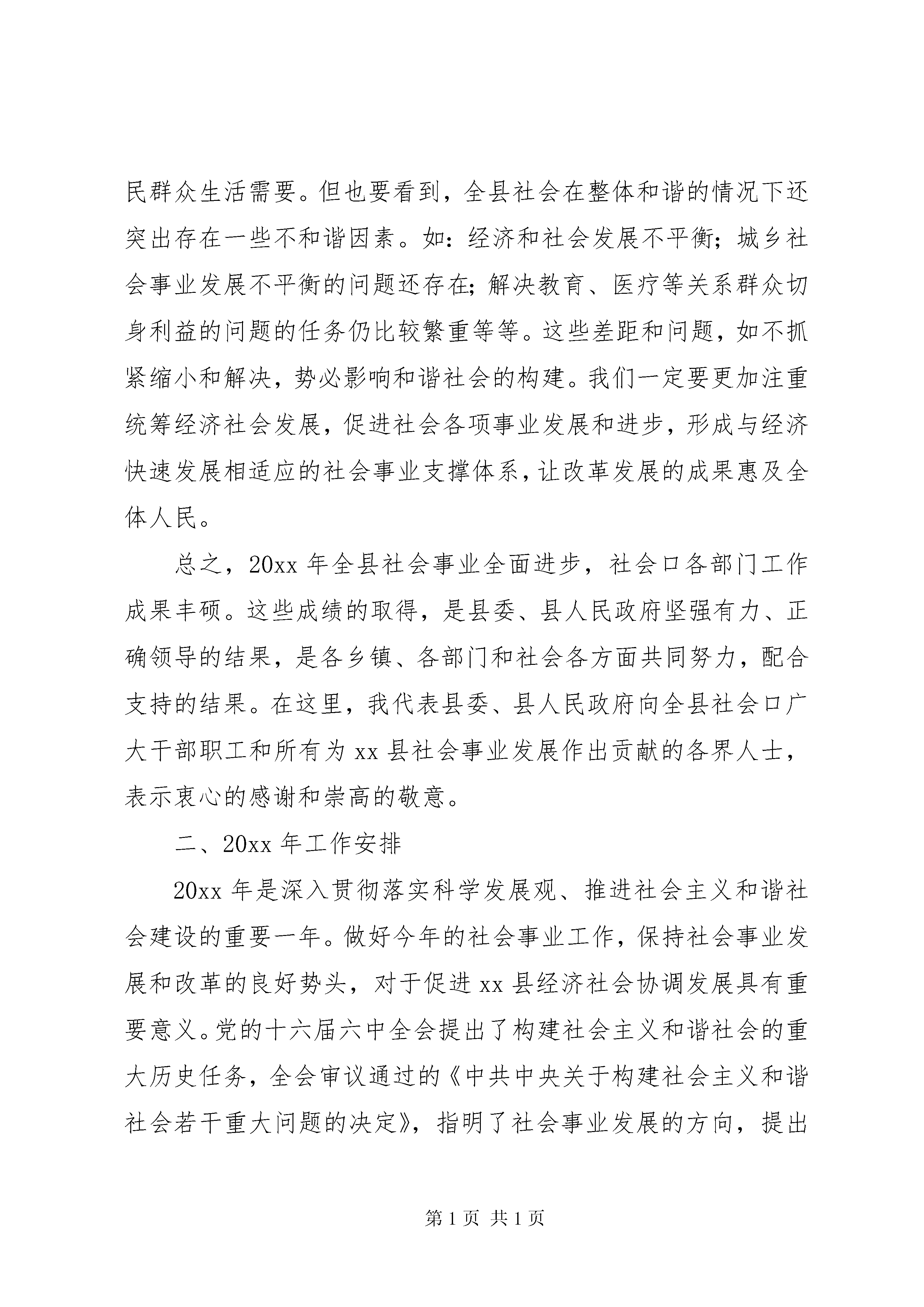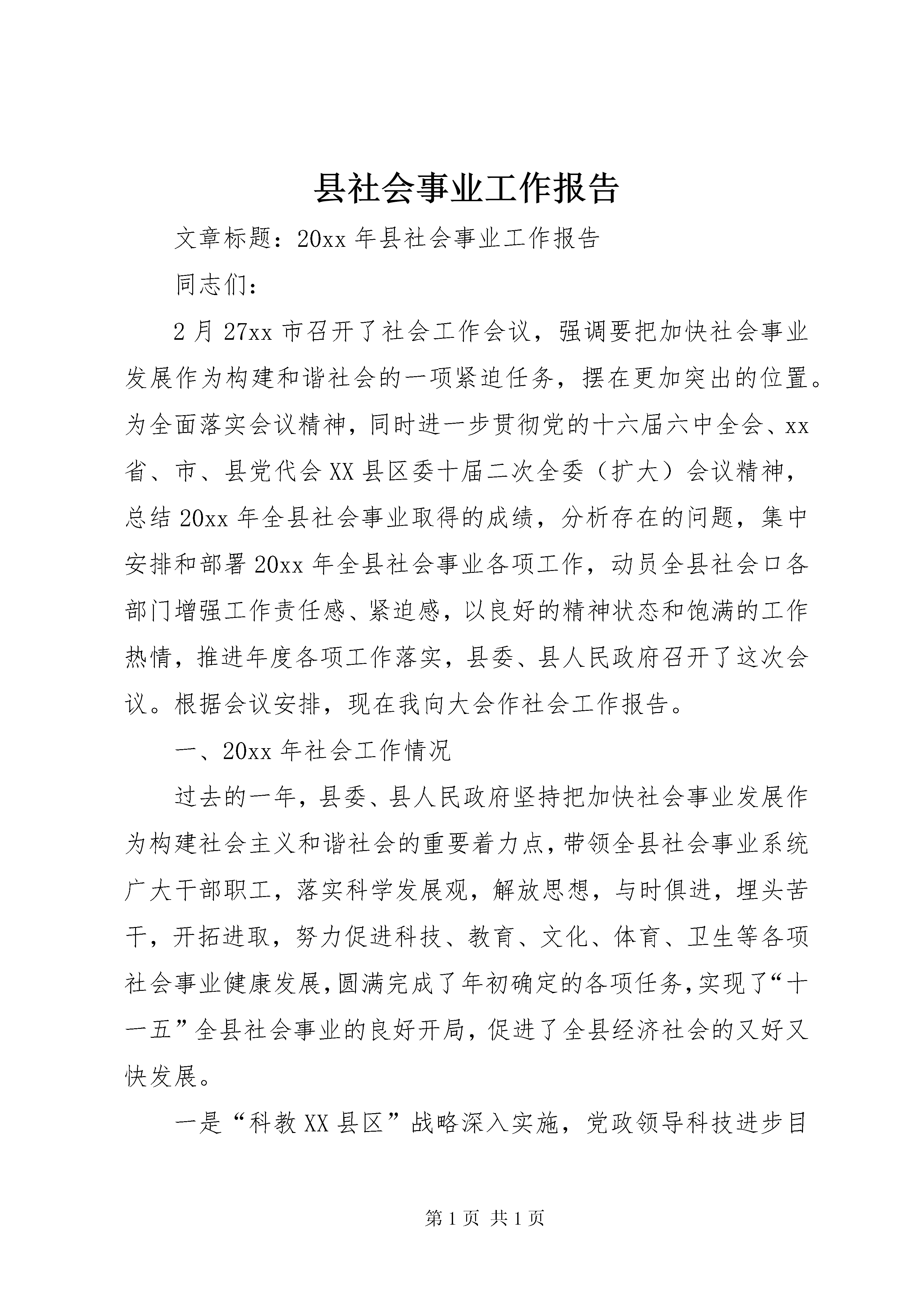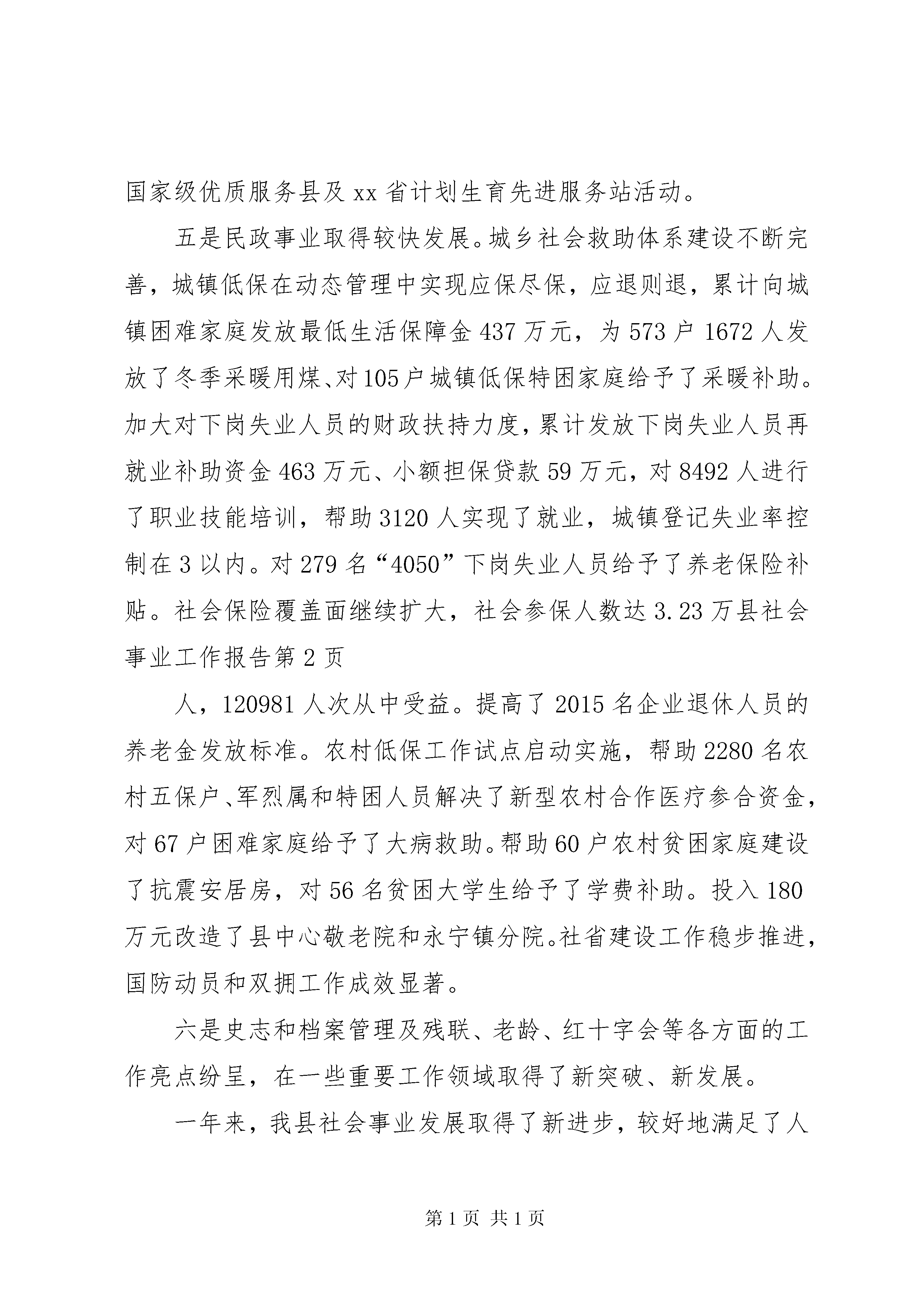 县社会事业工作报告文章标题:20xx年县社会事业工作报告同志们:2月27xx市召开了社会工作会议,强调要把加快社会事业发展作为构建和谐社会的一项紧迫任务,摆在更加突出的位置。为全面落实会议精神,同时进一步贯彻党的十六届六中全会、xx省、市、县党代会XX县区委十届二次全委(扩大)会议精神,总结20xx年全县社会事业取得的成绩,分析存在的问题,集中安排和部署20xx年全县社会事业各项工作,动员全县社会口各部门增强工作责任感、紧迫感,以良好的精神状态和饱满的工作热情,推进年度各项工作落实,县委、县人民政府召开了这次会议。根据会议安排,现在我向大会作社会工作报告。一、20xx年社会工作情况过去的一年,县委、县人民政府坚持把加快社会事业发展作为构建社会主义和谐社会的重要着力点,带领全县社会事业系统广大干部职工,落实科学发展观,解放思想,与时俱进,埋头苦干,开拓进取,努力促进科技、教育、文化、体育、卫生等各项社会事业健康发展,圆满完成了年初确定的各项任务,实现了“十一五”全县社会事业的良好开局,促进了全县经济社会的又好又快发展。一是“科教XX县区”战略深入实施,党政领导科技进步目标责任制全面落实,科技成果推广应用水平不断提高。扎实做好科技项目管理工作,组织实施了特色农作物机械化技术推广、测土配方、xx大白瓜籽提纯、工业番茄钵盘育苗、小茴香高产栽培技术等多项科技兴农项目,支持xx县5家重点企业顺利完成技术改造。科技特派员的作用得到发挥,科普活动广泛开展。统筹兼顾,促进教育事业协调发展。“两基”成果进一步巩固,“两基”完成率与人口覆盖率均达100%。“民汉合校”、“双语”教学、中小学现代远程教育扎实推进。职业教育、成人教育和民办教育健康发展。德育工作和新课程改革初见成效。农村义务教育经费保障机制改革工作不断深入,“两免一补”资助目标全面完成,对5364名贫困家庭学生免费提供了教科书、1003名贫困寄宿学生享受了生活补助。投入90万元对农村11所学校进行了维修改造,改善了农村办学条件。二是文化、体育和广播电视事业进一步发展。文化市场管理工作成效明显,“百日广场文化”等群众性活动蓬勃开展,荣获xx省第五次“百日广场文化活动竞赛先进县”。群众性文化活动广泛开展,成功举办了xx县第五届“花儿”艺术节。“体育发展年”活动有声有色,全县文化体育建设总投入达到300万元,体育设施大为改善。全民健身运动进一步普及,成功举办了xx县首届乡村篮球赛,县国税局荣获国家体育总局“20xx年度全民健身活动先进单位”。参加xx省第十一届运动会,取得9金3银的好成绩。广播电视设施建设、维护和管理工作作成效显著,“西新工程”、“村村通”工程继续实施,巴市人民广播电台新闻综合频率北四县转播中心投入使用。有线电视网络覆盖面进一步扩大,全县有线电视用户达11000户,极大地丰富了广大农牧民群众的精神文化生活。三是卫生工作继续加强。基层卫生医疗服务基础设施建设加快,县妇幼保健院和7个乡镇卫生院建设完工,标准化村卫生室建设工作全面启动,城乡医疗卫生条件不断改善,人民健康水平逐步提高。新型农村合作医疗试点工作有序推进,新型农村合作医疗报销比例提高。20xx年农牧民参合率达85,2.86万参合农牧民群众享受到了医疗补助,兑付医疗补助资金252万元。近5万农牧民参加了20xx年度新型农村合作医疗,参合率达到86.14,一定程度上缓解了农牧民群众“因病致贫、因病返贫”的问题。药品和医用耗材集中招标制度全面推行,农村药品监督供应“两网”建设成果显著,药品集中配送率达98。打击非法行医、食品药品安全等专项治理工作深入开展,促进了医疗卫生事业健康发展。大力开展城乡卫生整治工作,顺利通过了国家卫生县城复验。四是人口与计划生育工作成效显著,稳定了低生育水平,20xx年全县人口自然增长率控制在11.38‰以内。依法加强计划生育管理,积极开展人口与计划生育管理新机制建设工作和争创国家级优质服务县及xx省计划生育先进服务站活动。五是民政事业取得较快发展。城乡社会救助体系建设不断完善,城镇低保在动态管理中实现应保尽保,应退则退,累计向城镇困难家庭发放最低生活保障金437万元,为573户1672人发放了冬季采暖用煤、对105户城镇低保特困家庭给予了采暖补助。加大对下岗失业人员的财政扶持力度,累计发放下岗失业人员再就业补助资金463万元、小额担保贷款59万元,对8492人进行了职业技能培训,帮助3120人实现了就业,城镇登记失业率控制在3以内。对279名“4050”下岗失业人员给予了养老保险补贴。社会保险覆盖面继续扩大,社会参保人数达3.23万县社会事业工作报告人,120981人次从中受益。提高了2015名企业退休人员的养老金发放标准。农村低保工作试点启动实施,帮助2280名农村五