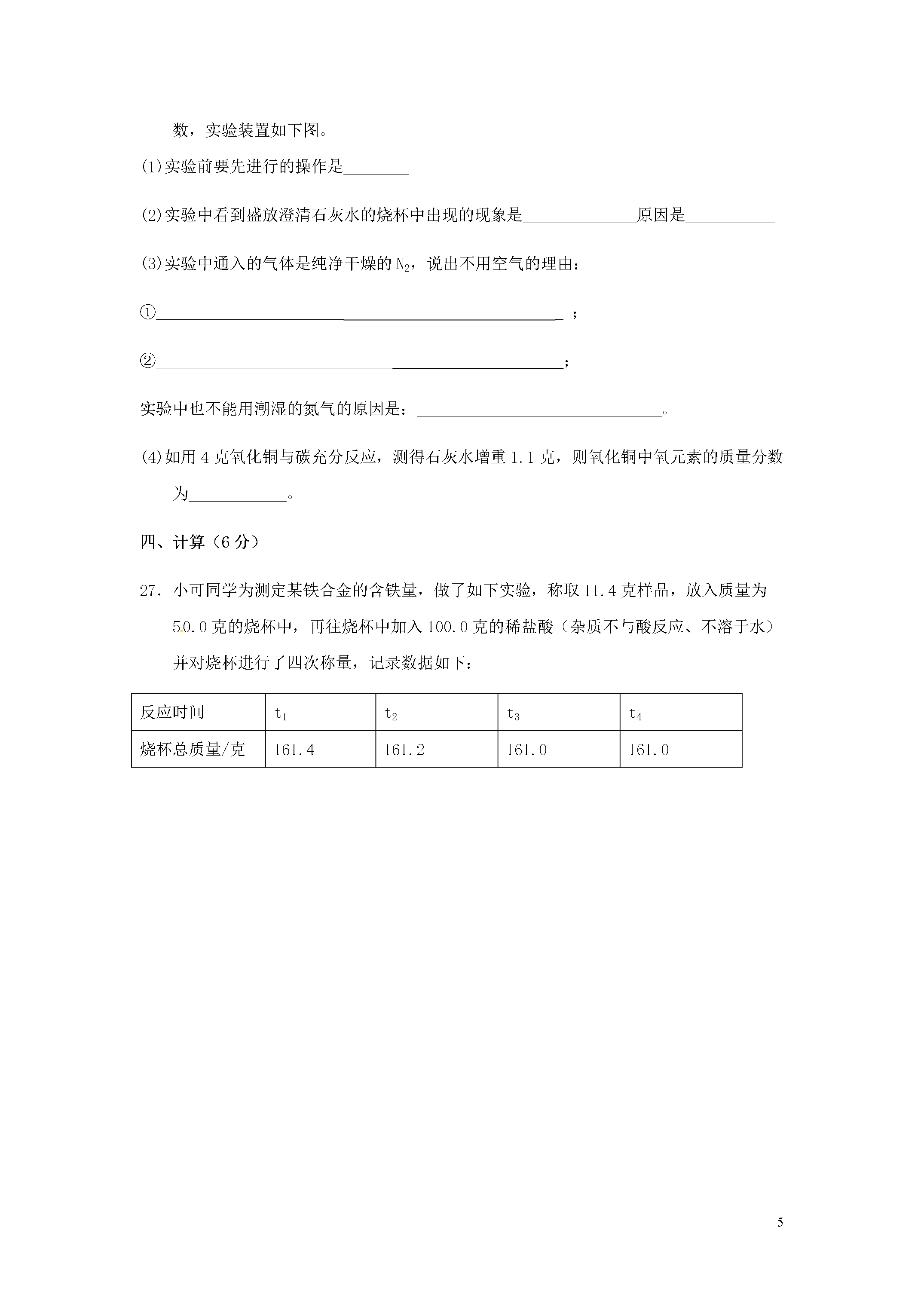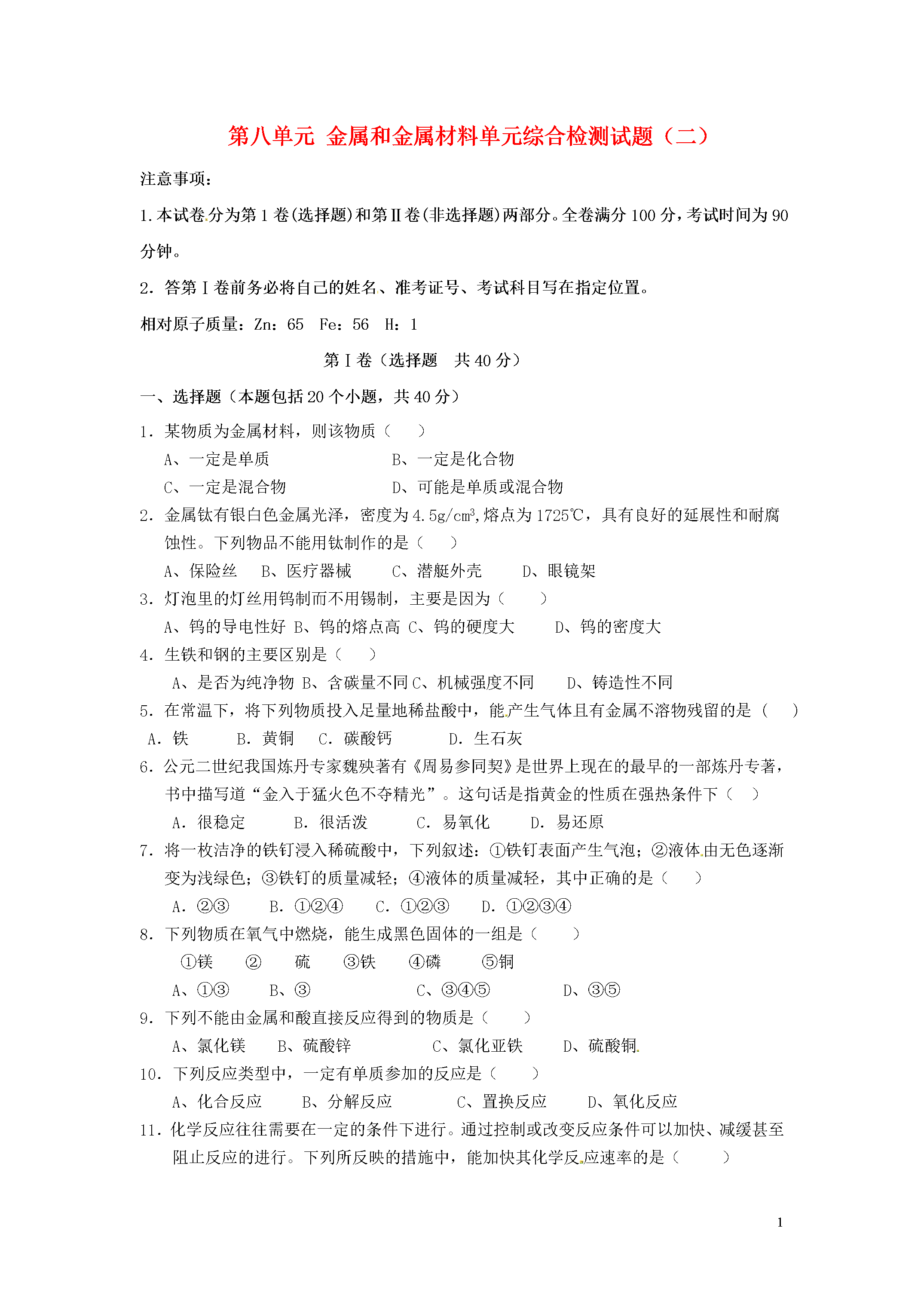 5第八单元金属和金属材料单元综合检测试题(二)注意事项:1.本试卷分为第1卷(选择题)和第Ⅱ卷(非选择题)两部分。全卷满分100分,考试时间为90分钟。2.答第Ⅰ卷前务必将自己的姓名、准考证号、考试科目写在指定位置。相对原子质量:Zn:65Fe:56H:1第Ⅰ卷(选择题共40分)一、选择题(本题包括20个小题,共40分)1.某物质为金属材料,则该物质()A、一定是单质B、一定是化合物C、一定是混合物D、可能是单质或混合物2.金属钛有银白色金属光泽,密度为4.5g/cm3,熔点为1725℃,具有良好的延展性和耐腐蚀性。下列物品不能用钛制作的是()A、保险丝B、医疗器械C、潜艇外壳D、眼镜架3.灯泡里的灯丝用钨制而不用锡制,主要是因为()A、钨的导电性好B、钨的熔点高C、钨的硬度大D、钨的密度大4.生铁和钢的主要区别是()A、是否为纯净物B、含碳量不同C、机械强度不同D、铸造性不同5.在常温下,将下列物质投入足量地稀盐酸中,能产生气体且有金属不溶物残留的是()A.铁B.黄铜C.碳酸钙D.生石灰6.公元二世纪我国炼丹专家魏殃著有《周易参同契》是世界上现在的最早的一部炼丹专著,书中描写道“金入于猛火色不夺精光”。这句话是指黄金的性质在强热条件下()A.很稳定B.很活泼C.易氧化D.易还原7.将一枚洁净的铁钉浸入稀硫酸中,下列叙述:①铁钉表面产生气泡;②液体由无色逐渐变为浅绿色;③铁钉的质量减轻;④液体的质量减轻,其中正确的是()A.②③B.①②④C.①②③D.①②③④8.下列物质在氧气中燃烧,能生成黑色固体的一组是()①镁②硫③铁④磷⑤铜A、①③B、③C、③④⑤D、③⑤9.下列不能由金属和酸直接反应得到的物质是()A、氯化镁B、硫酸锌C、氯化亚铁D、硫酸铜10.下列反应类型中,一定有单质参加的反应是()A、化合反应B、分解反应C、置换反应D、氧化反应11.化学反应往往需要在一定的条件下进行。通过控制或改变反应条件可以加快、减缓甚至阻止反应的进行。下列所反映的措施中,能加快其化学反应速率的是()A.铁门表面喷漆B.冰箱保存食物C.用扇子扇煤炉火,火会更旺D.将木头电线杆埋入地下的部分用火微微烧焦12.下列各种情况下,埋在地下的铸铁管道被锈蚀的速率最慢的是()A.在潮湿、疏松、透气的土壤中B.在含铁元素较多的酸性土壤中C.在潮湿、致密、不透气的土壤中D.在干燥、致密、不透气的土壤中13、在车船表面刷油漆的目的是()A.防止钢铁生锈且美观B.可以增大硬度防止撞坏C.增大厚度、防止磨损D.改变铁的颜色14.生活中废弃的铁锅、铝制易拉罐、铜线等可以归为一类加以回收利用,它们属于A.铁矿石B.金属或合金C.氧化物D.非金属单质15.下列每组金属是按活动性由弱到强的顺序排列的是()A.K、Hg、ZnB.Ag、Al、AuC.Mg、Fe、CuD.Pt、Pb、Na16.有x、y、z三种金属,如果把x和y分别放人稀硫酸中,x溶解并产生氢气,而Y不反应;如果把y和z分别放入硝酸银溶液中,过一会儿,在y表面有银析出,而z没有变化。根据以上实验事实,判断x、y和z的金属活动顺序正确的是()A.X>y>ZB.X>Z>y,C.Z>y>XD.Z>X>y,17.我们的家庭生活中有一个铁桶,现有四种溶液,能用该桶盛放的是()A.盐酸B.稀硫酸C.硫酸铜溶液D.白酒18.比较铜和银的金属活动性强弱,可选用的药品是()A.稀盐酸B.稀硫酸C.硫酸锌溶液D.硝酸汞溶液19.取锌与另一种金属的合金7克,与足量的稀硫酸充分反应后得到氢气0.2克,则该合金中的另一种金属是()A.铁B.镁C.铝D.铜20.在天平的两个托盘上各放一个烧杯,杯中盛有相同的稀硫酸,此时天平平衡。如果一边放少许锌粒,另一边放入相同质量的铁,两者完全溶解后,天平指针()A、偏向有锌的一边B、偏向有铁的一边C、不偏转D、无法判断第Ⅱ卷(非选择题共60分)注意:必须用蓝、黑色钢笔或圆珠笔答题,答案写在指定位置。第Ⅰ卷选择题答题卡:题目12345678910答案题目11121314151617181920答案二.填空与简答(本题包括6个小题,共30分)21.某工厂排放的废水中含有废硫酸和硫酸铜,为了防止污染,变废为宝,在废水处理池中投入过量的废铁屑,充分反应后过滤,得到的固体是,将滤液蒸发后得到的固体是,有关的化学方程式为22.比较、分析、归纳是学习化学的有效方法。现有反应:①Zn+CuCl2═ZnCl2+Cu②Cu+2AgNO3═Cu(NO3)2+2Ag③Cl2+2NaBr═2NaCl+Br2④Br2+2NaI═2NaBr+I2(1)通过比较、分析,可以发现上述四个反应有相似之处,均属于反应再分析这四个反应前后各元素的化合价,我们还会发现一个相似之处:(2)分析反应①和②,可以得到ZnCuAg三种金属的活动性由强到