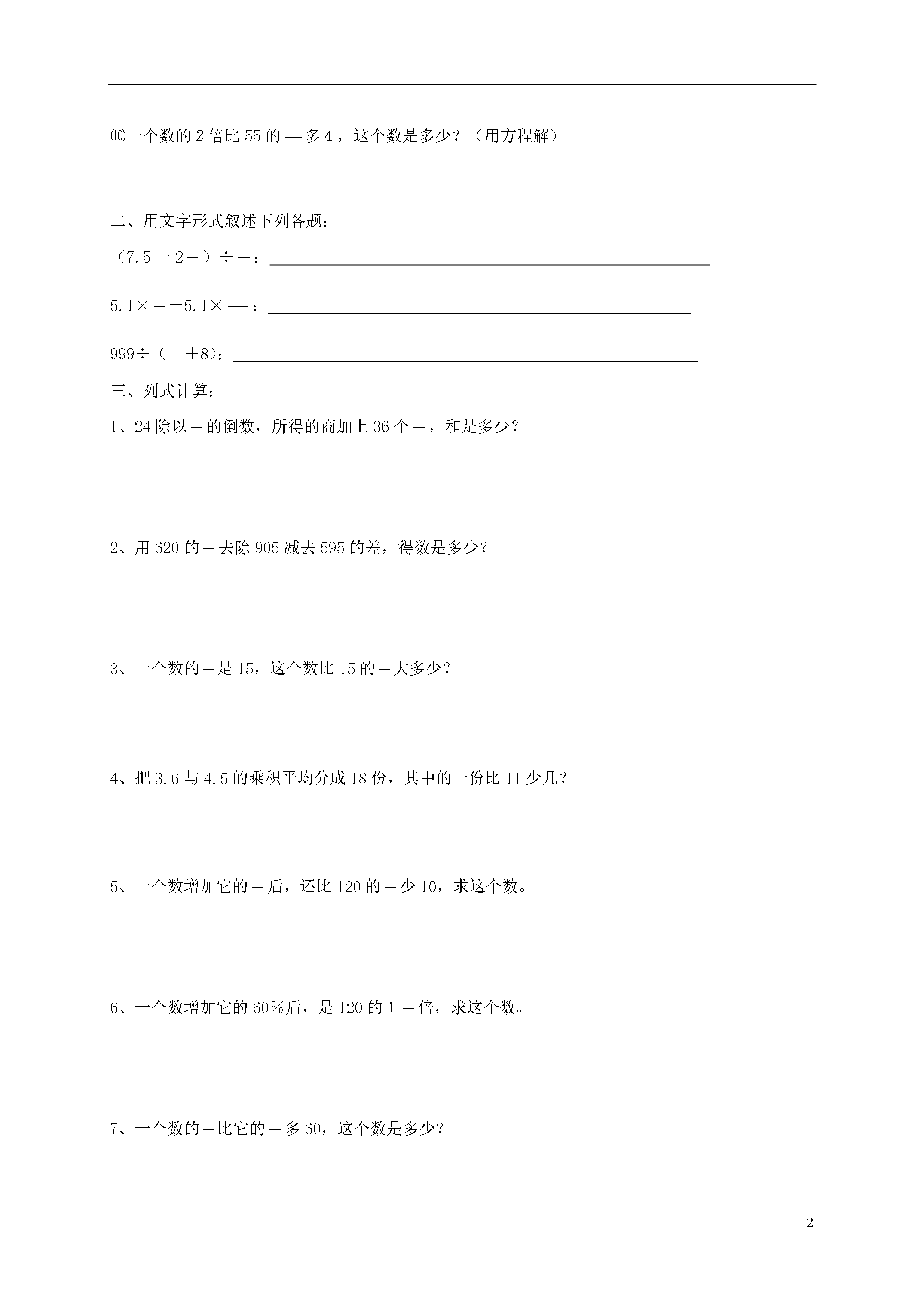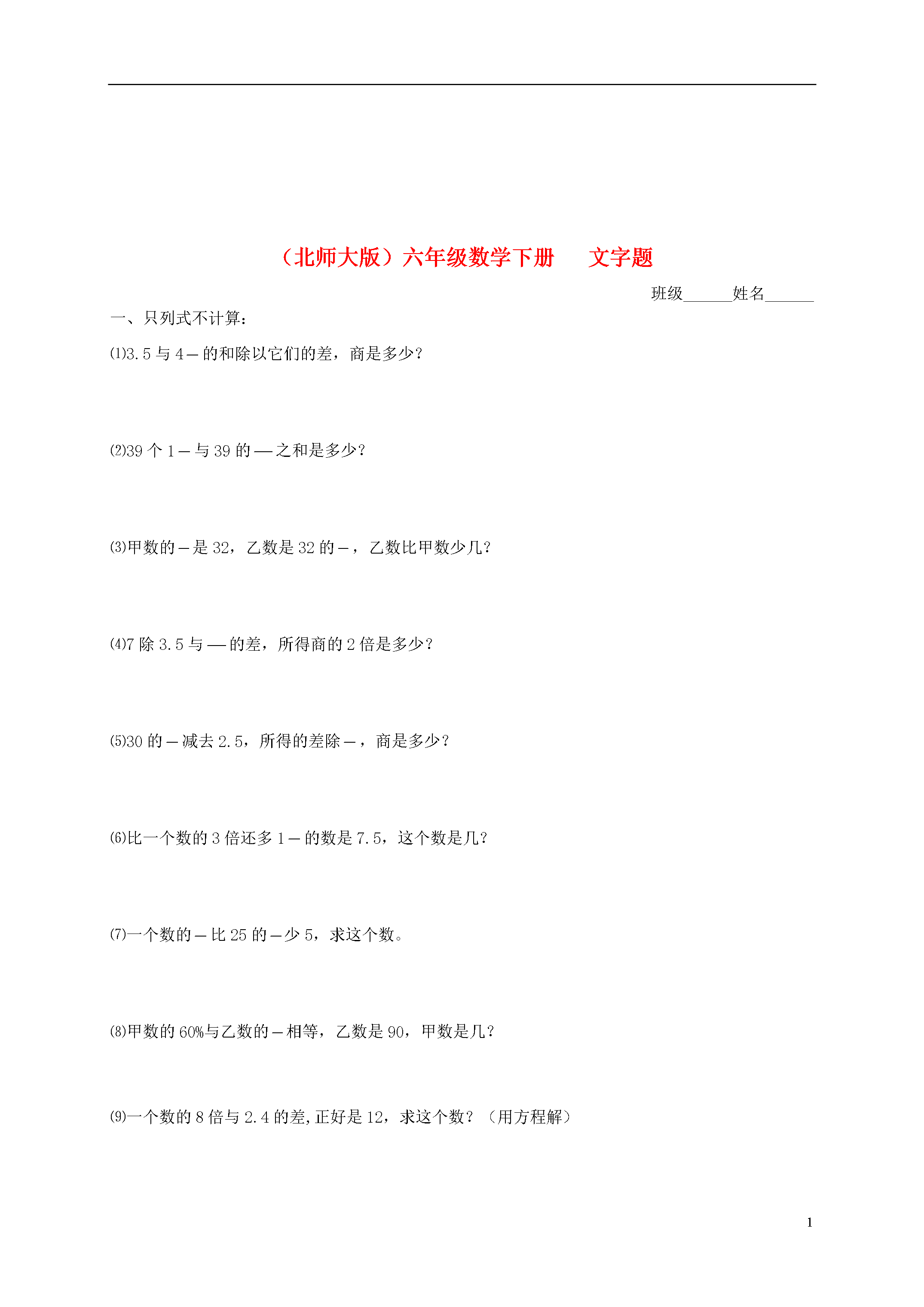 3(北师大版)六年级数学下册文字题班级______姓名______一、只列式不计算:⑴3.5与4的和除以它们的差,商是多少?⑵39个1与39的之和是多少?⑶甲数的是32,乙数是32的,乙数比甲数少几?⑷7除3.5与的差,所得商的2倍是多少?⑸30的减去2.5,所得的差除,商是多少?⑹比一个数的3倍还多1的数是7.5,这个数是几?⑺一个数的比25的少5,求这个数。⑻甲数的60%与乙数的相等,乙数是90,甲数是几?⑼一个数的8倍与2.4的差,正好是12,求这个数?(用方程解)⑽一个数的2倍比55的多4,这个数是多少?(用方程解)二、用文字形式叙述下列各题:(7.5一2)÷:5.1×-5.1×:999÷(+8):三、列式计算:1、24除以的倒数,所得的商加上36个,和是多少?2、用620的去除905减去595的差,得数是多少?3、一个数的是15,这个数比15的大多少?4、把3.6与4.5的乘积平均分成18份,其中的一份比11少几?5、一个数增加它的后,还比120的少10,求这个数。6、一个数增加它的60%后,是120的1倍,求这个数。7、一个数的比它的多60,这个数是多少?8、的倒数加上2.4乘以0.8的积,和是多少?9、某数的3倍减去4.2,差等于的倒数,求这个数。(用方程解)10、丙数是甲、乙平均数的,甲、乙两数的和是924,求甲、乙、丙三数的平均数。