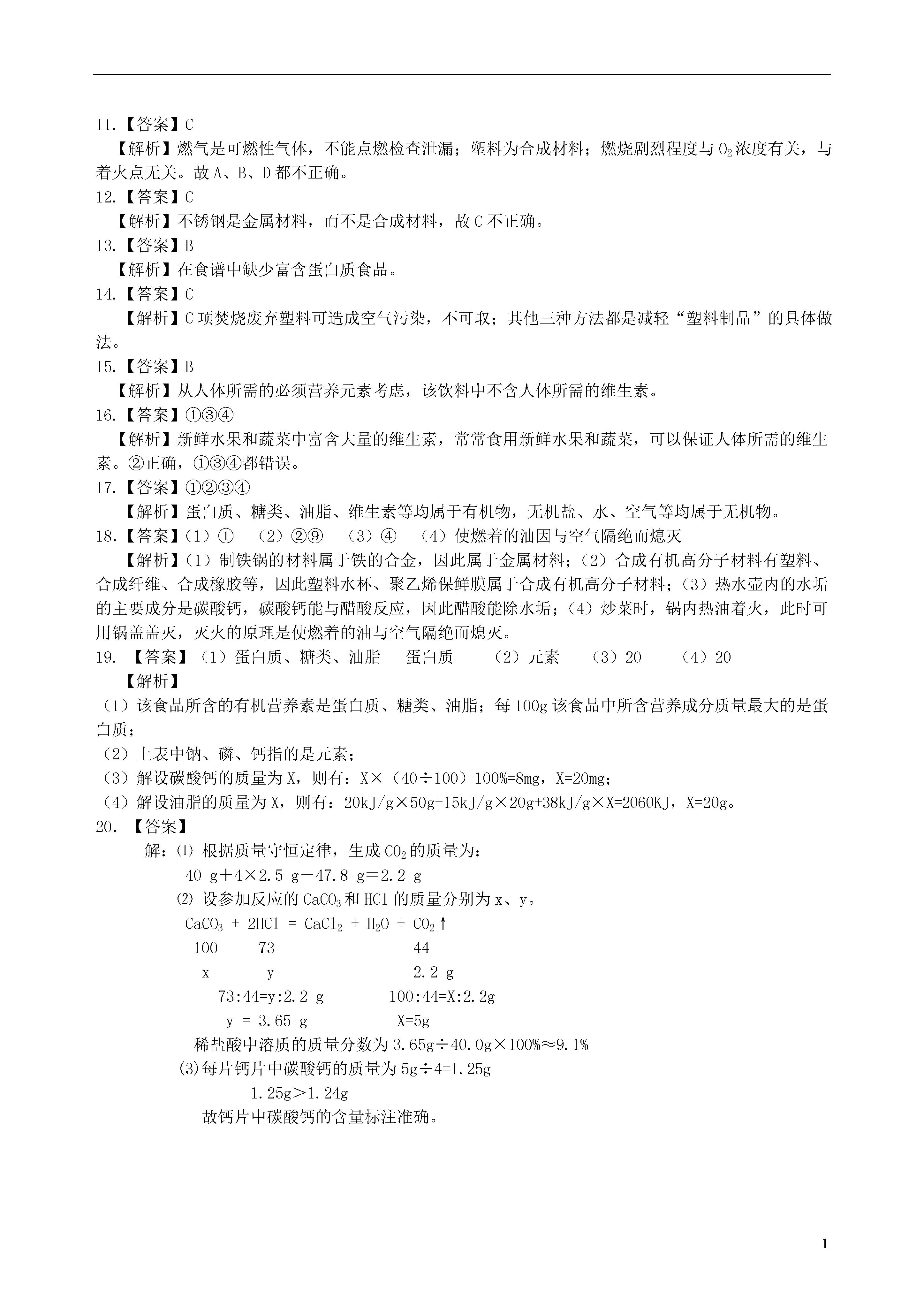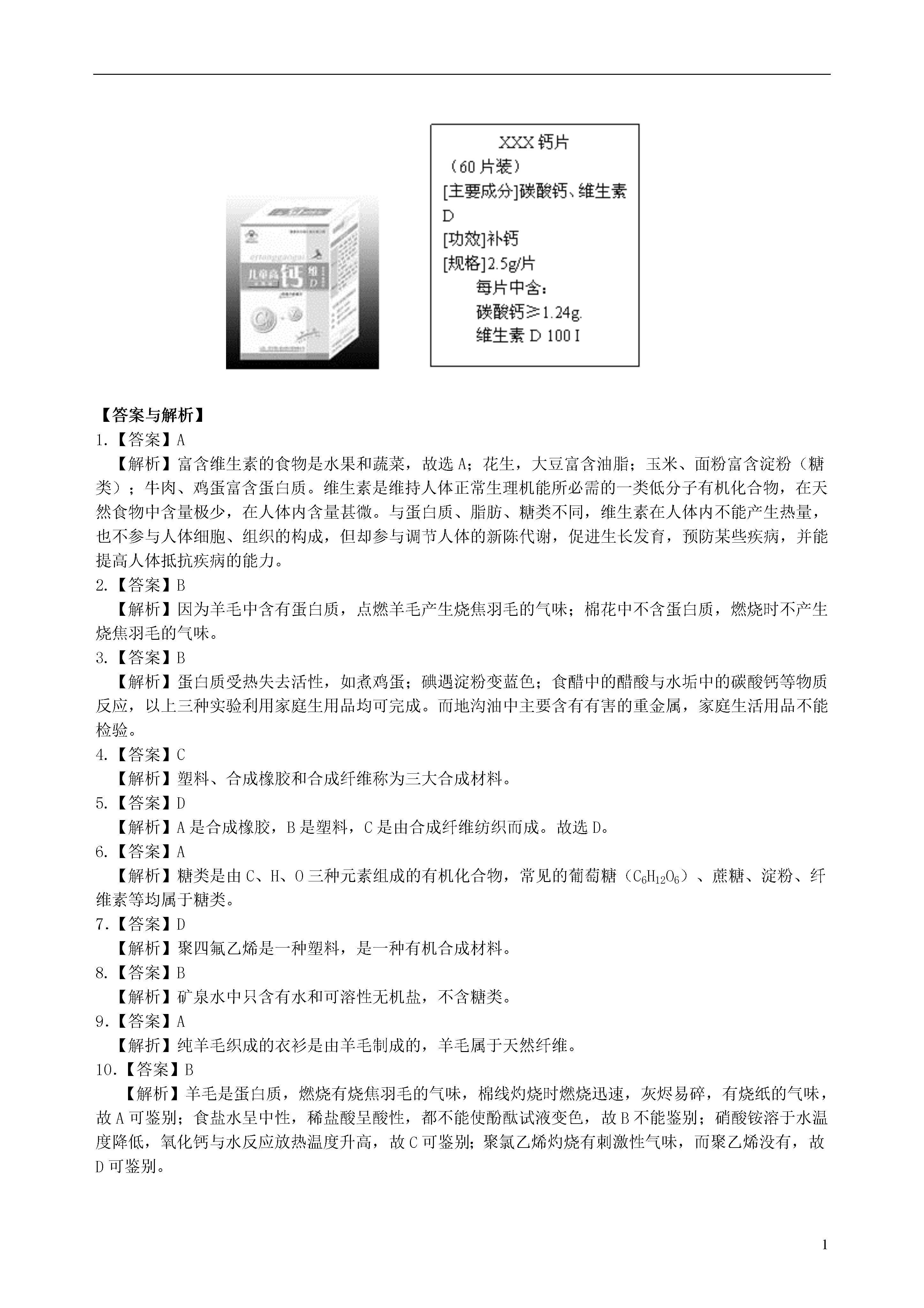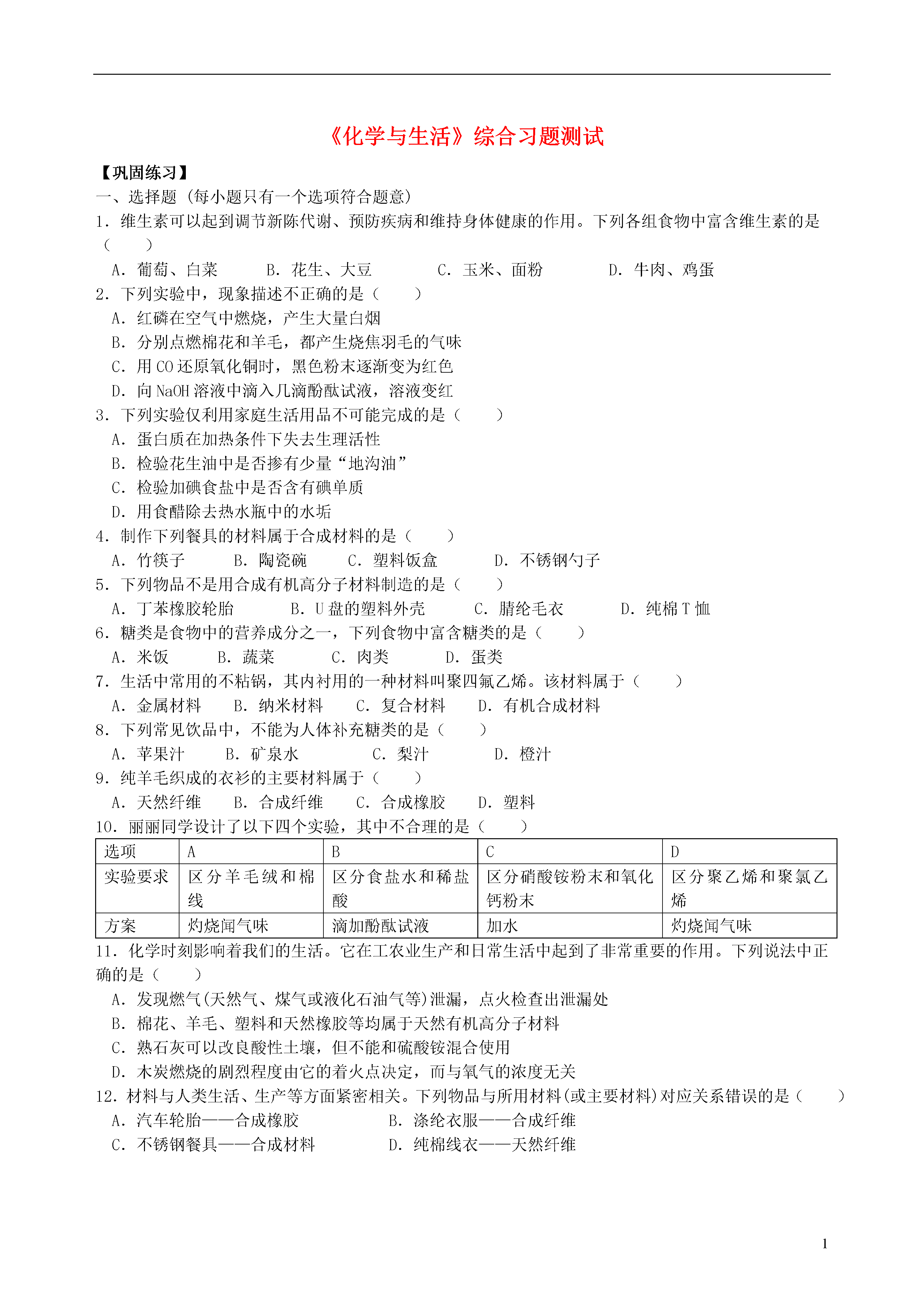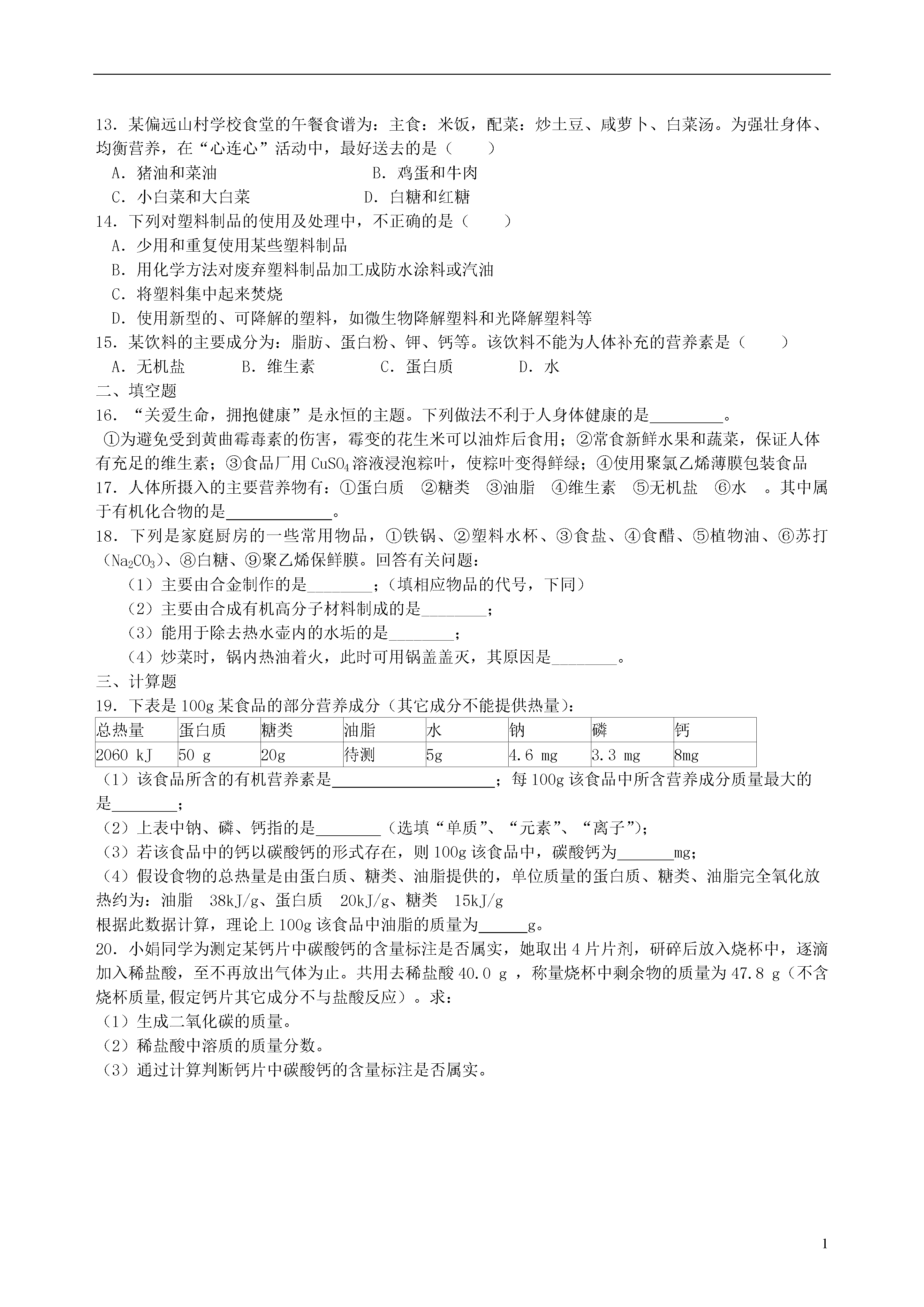 1《化学与生活》综合习题测试【巩固练习】选择题(每小题只有一个选项符合题意)1.维生素可以起到调节新陈代谢、预防疾病和维持身体健康的作用。下列各组食物中富含维生素的是()A.葡萄、白菜B.花生、大豆C.玉米、面粉D.牛肉、鸡蛋2.下列实验中,现象描述不正确的是()A.红磷在空气中燃烧,产生大量白烟B.分别点燃棉花和羊毛,都产生烧焦羽毛的气味C.用CO还原氧化铜时,黑色粉末逐渐变为红色D.向NaOH溶液中滴入几滴酚酞试液,溶液变红3.下列实验仅利用家庭生活用品不可能完成的是()A.蛋白质在加热条件下失去生理活性B.检验花生油中是否掺有少量“地沟油”C.检验加碘食盐中是否含有碘单质D.用食醋除去热水瓶中的水垢4.制作下列餐具的材料属于合成材料的是()A.竹筷子B.陶瓷碗C.塑料饭盒D.不锈钢勺子5.下列物品不是用合成有机高分子材料制造的是()A.丁苯橡胶轮胎B.U盘的塑料外壳C.腈纶毛衣D.纯棉T恤6.糖类是食物中的营养成分之一,下列食物中富含糖类的是()A.米饭B.蔬菜C.肉类D.蛋类7.生活中常用的不粘锅,其内衬用的一种材料叫聚四氟乙烯。该材料属于()A.金属材料B.纳米材料C.复合材料D.有机合成材料8.下列常见饮品中,不能为人体补充糖类的是()A.苹果汁B.矿泉水C.梨汁D.橙汁9.纯羊毛织成的衣衫的主要材料属于()A.天然纤维B.合成纤维C.合成橡胶D.塑料10.丽丽同学设计了以下四个实验,其中不合理的是()选项ABCD实验要求区分羊毛绒和棉线区分食盐水和稀盐酸区分硝酸铵粉末和氧化钙粉末区分聚乙烯和聚氯乙烯方案灼烧闻气味滴加酚酞试液加水灼烧闻气味11.化学时刻影响着我们的生活。它在工农业生产和日常生活中起到了非常重要的作用。下列说法中正确的是()A.发现燃气(天然气、煤气或液化石油气等)泄漏,点火检查出泄漏处B.棉花、羊毛、塑料和天然橡胶等均属于天然有机高分子材料C.熟石灰可以改良酸性土壤,但不能和硫酸铵混合使用D.木炭燃烧的剧烈程度由它的着火点决定,而与氧气的浓度无关12.材料与人类生活、生产等方面紧密相关。下列物品与所用材料(或主要材料)对应关系错误的是()A.汽车轮胎——合成橡胶B.涤纶衣服——合成纤维C.不锈钢餐具——合成材料D.纯棉线衣——天然纤维13.某偏远山村学校食堂的午餐食谱为:主食:米饭,配菜:炒土豆、咸萝卜、白菜汤。为强壮身体、均衡营养,在“心连心”活动中,最好送去的是()A.猪油和菜油B.鸡蛋和牛肉C.小白菜和大白菜D.白糖和红糖14.下列对塑料制品的使用及处理中,不正确的是()A.少用和重复使用某些塑料制品B.用化学方法对废弃塑料制品加工成防水涂料或汽油C.将塑料集中起来焚烧D.使用新型的、可降解的塑料,如微生物降解塑料和光降解塑料等15.某饮料的主要成分为:脂肪、蛋白粉、钾、钙等。该饮料不能为人体补充的营养素是()A.无机盐B.维生素C.蛋白质D.水二、填空题16.“关爱生命,拥抱健康”是永恒的主题。下列做法不利于人身体健康的是。①为避免受到黄曲霉毒素的伤害,霉变的花生米可以油炸后食用;②常食新鲜水果和蔬菜,保证人体有充足的维生素;③食品厂用CuSO4溶液浸泡粽叶,使粽叶变得鲜绿;④使用聚氯乙烯薄膜包装食品17.人体所摄入的主要营养物有:①蛋白质②糖类③油脂④维生素⑤无机盐⑥水。其中属于有机化合物的是。18.下列是家庭厨房的一些常用物品,①铁锅、②塑料水杯、③食盐、④食醋、⑤植物油、⑥苏打(Na2CO3)、⑧白糖、⑨聚乙烯保鲜膜。回答有关问题:(1)主要由合金制作的是________;(填相应物品的代号,下同)(2)主要由合成有机高分子材料制成的是________;(3)能用于除去热水壶内的水垢的是________;(4)炒菜时,锅内热油着火,此时可用锅盖盖灭,其原因是________。三、计算题19.下表是100g某食品的部分营养成分(其它成分不能提供热量):总热量蛋白质糖类油脂水钠磷钙2060kJ50g20g待测5g4.6mg3.3mg8mg(1)该食品所含的有机营养素是;每100g该食品中所含营养成分质量最大的是;(2)上表中钠、磷、钙指的是(选填“单质”、“元素”、“离子”);(3)若该食品中的钙以碳酸钙的形式存在,则100g该食品中,碳酸钙为mg;(4)假设食物的总热量是由蛋白质、糖类、油脂提供的,单位质量的蛋白质、糖类、油脂完全氧化放热约为:油脂38kJ/g、蛋白质20kJ/g、糖类15kJ/g根据此数据计算,理论上100g该食品中油脂的质量为g。20.小娟同学为测定某钙片中碳酸钙的含量标注是否属实,她取出4片片剂,研碎后放入