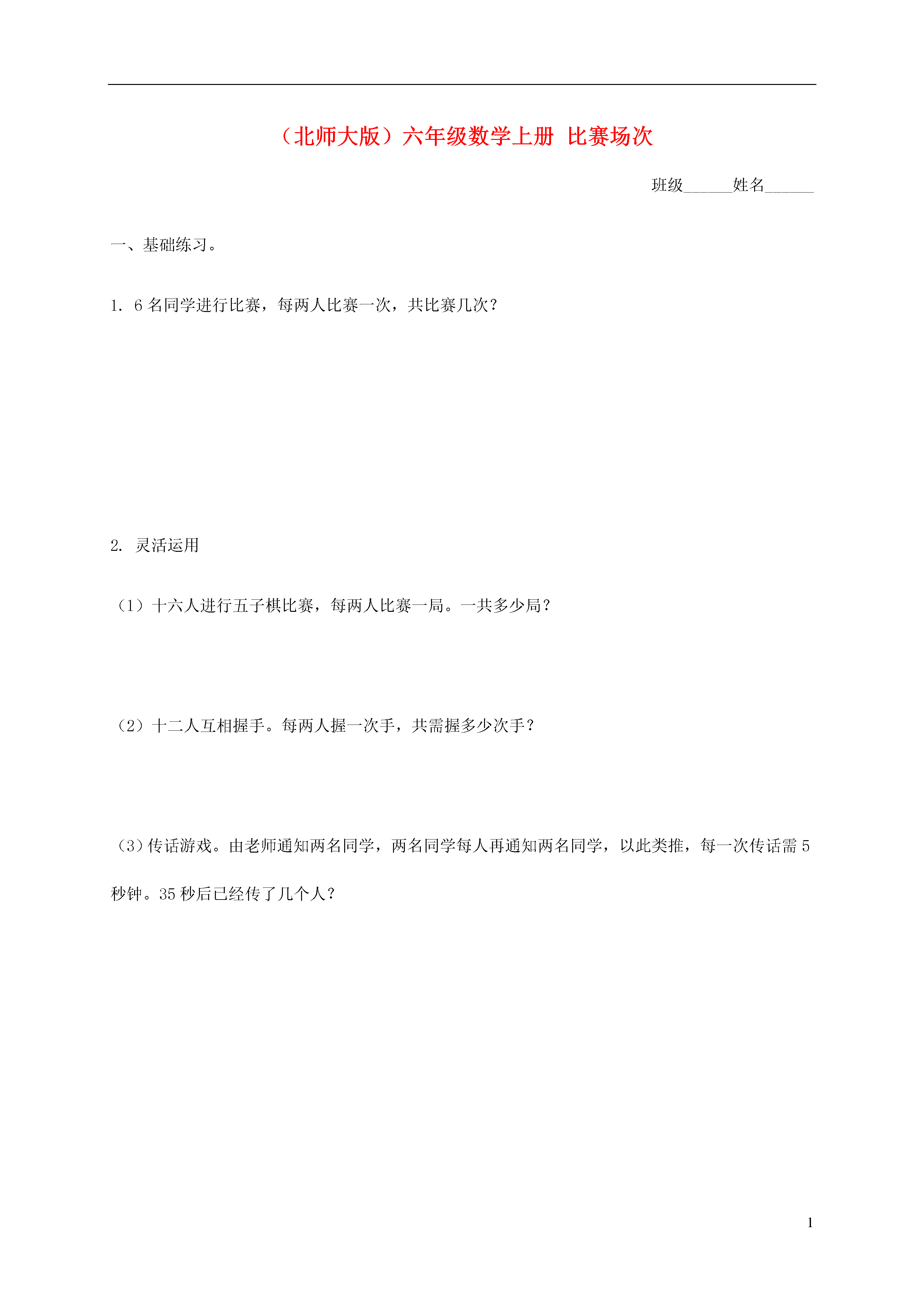 1(北师大版)六年级数学上册比赛场次班级______姓名______一、基础练习。1.6名同学进行比赛,每两人比赛一次,共比赛几次?2.灵活运用(1)十六人进行五子棋比赛,每两人比赛一局。一共多少局?(2)十二人互相握手。每两人握一次手,共需握多少次手?(3)传话游戏。由老师通知两名同学,两名同学每人再通知两名同学,以此类推,每一次传话需5秒钟。35秒后已经传了几个人?