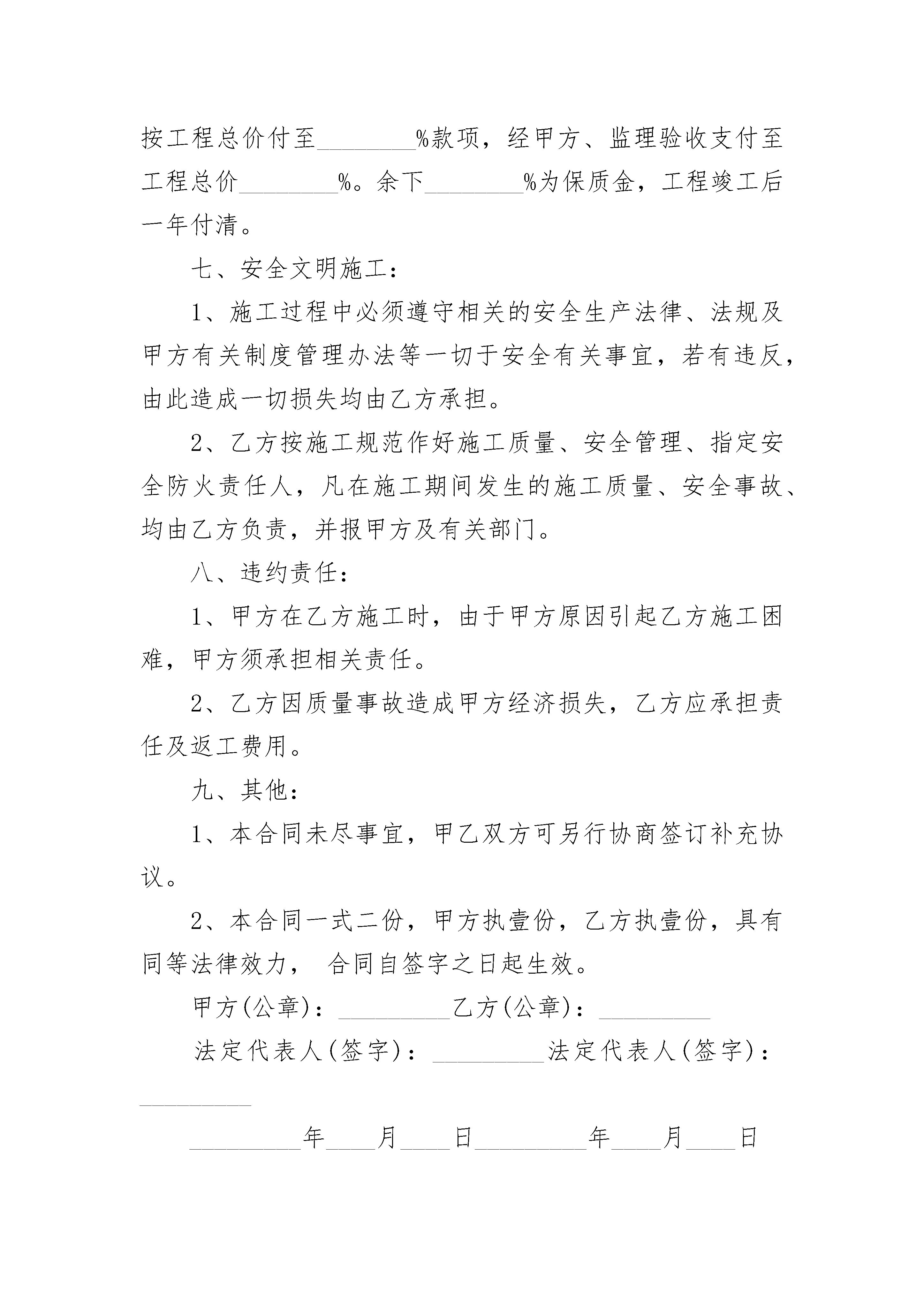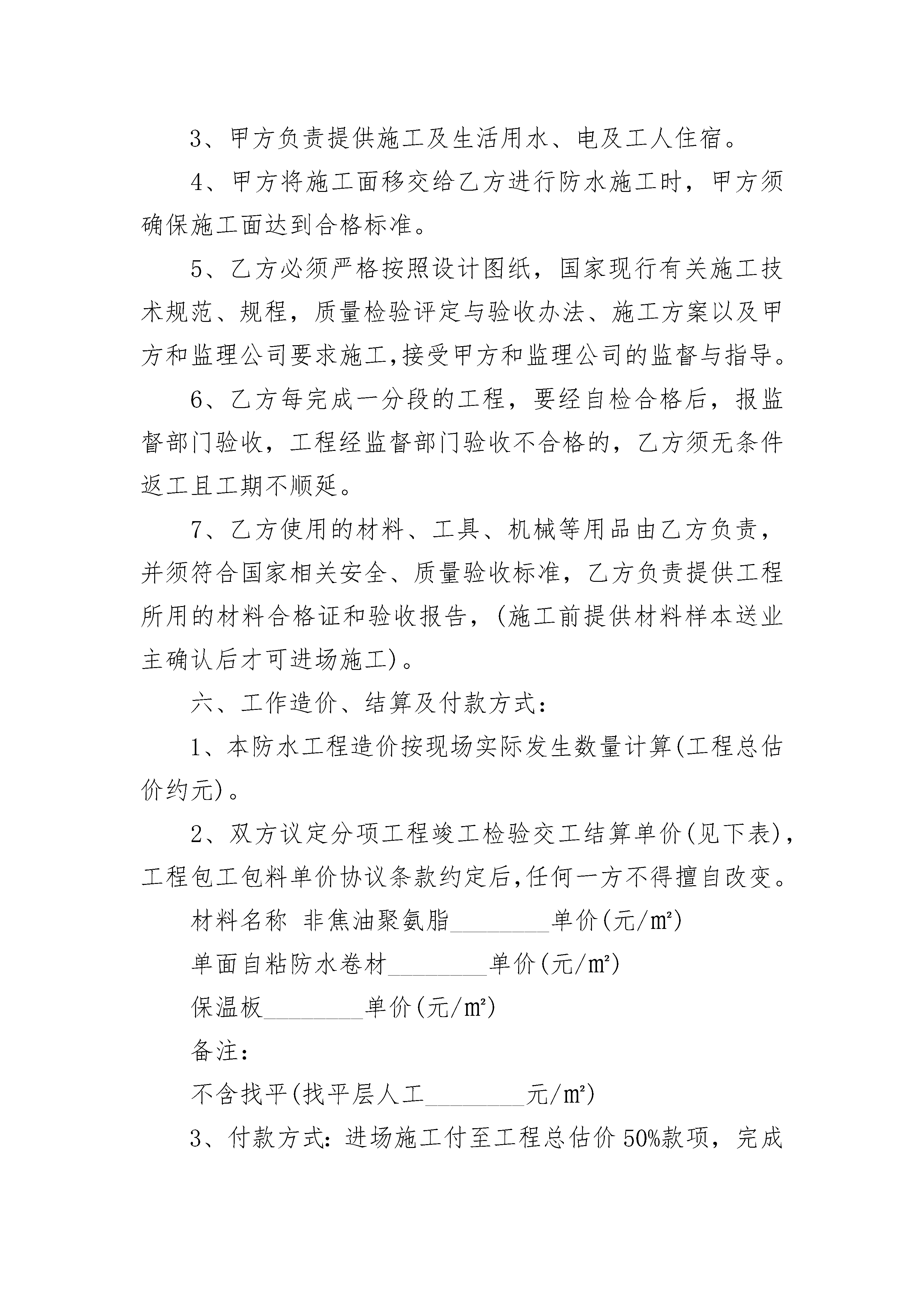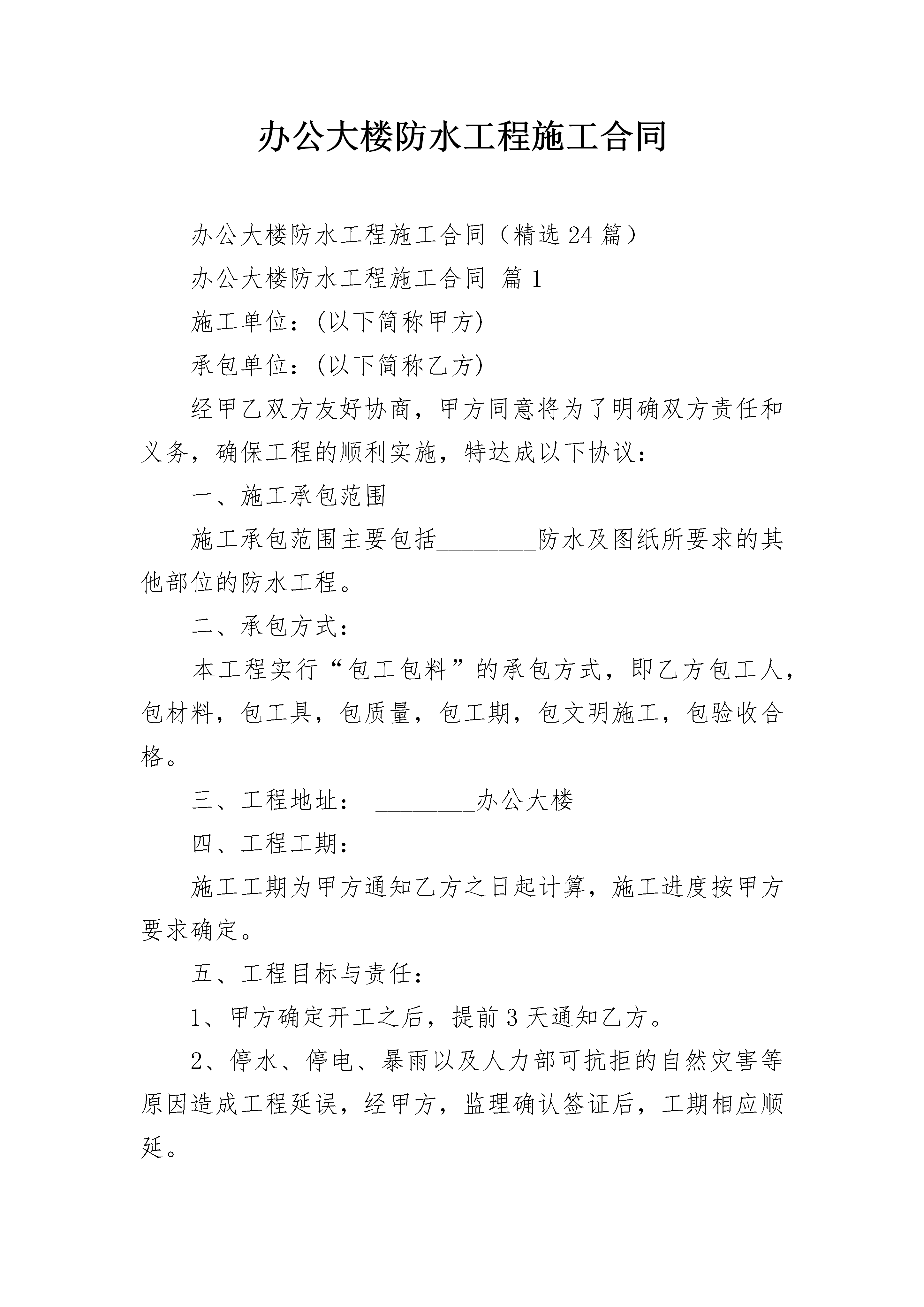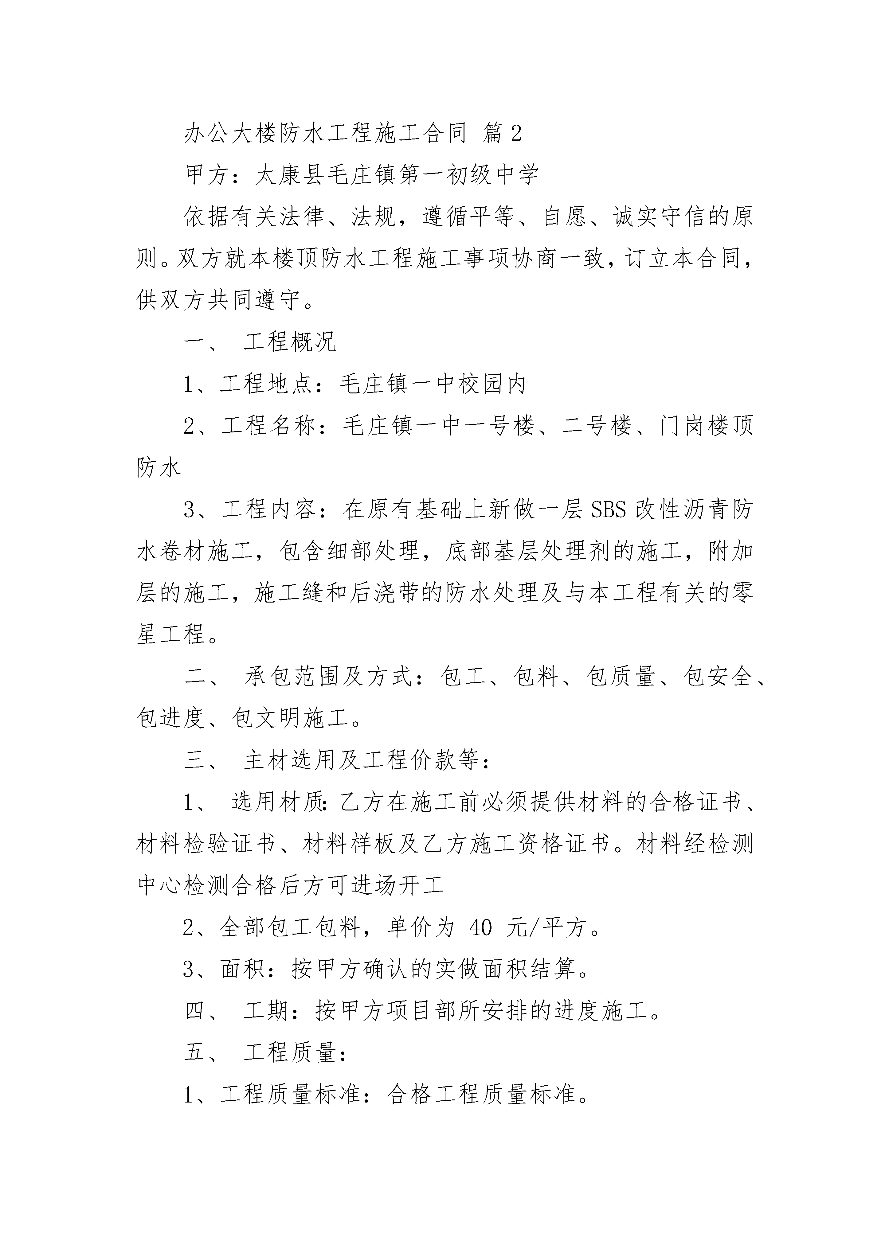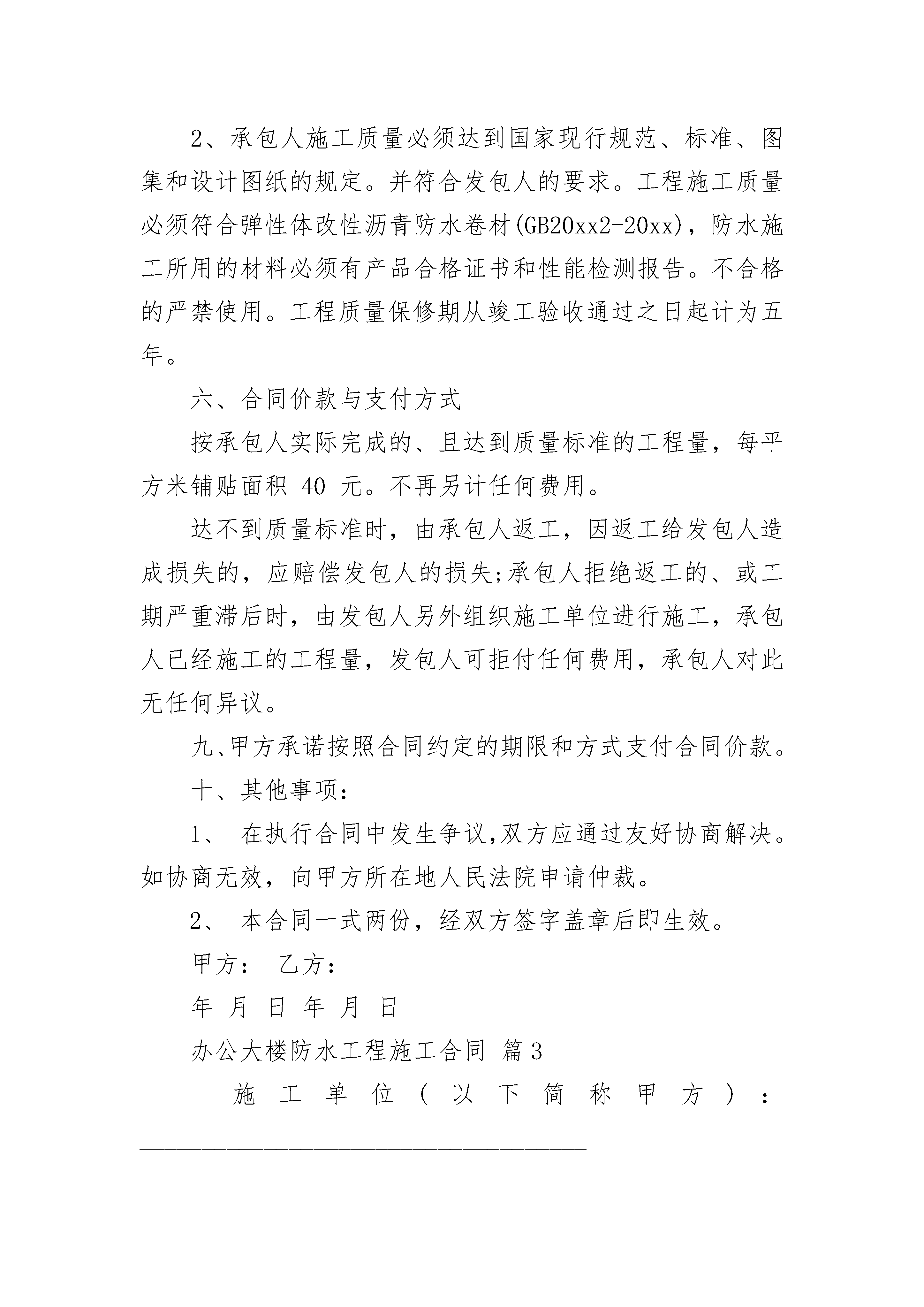 办公大楼防水工程施工合同办公大楼防水工程施工合同(精选24篇)办公大楼防水工程施工合同篇1施工单位:(以下简称甲方)承包单位:(以下简称乙方)经甲乙双方友好协商,甲方同意将为了明确双方责任和义务,确保工程的顺利实施,特达成以下协议:一、施工承包范围施工承包范围主要包括________防水及图纸所要求的其他部位的防水工程。二、承包方式:本工程实行“包工包料”的承包方式,即乙方包工人,包材料,包工具,包质量,包工期,包文明施工,包验收合格。三、工程地址:________办公大楼四、工程工期:施工工期为甲方通知乙方之日起计算,施工进度按甲方要求确定。五、工程目标与责任:1、甲方确定开工之后,提前3天通知乙方。2、停水、停电、暴雨以及人力部可抗拒的自然灾害等原因造成工程延误,经甲方,监理确认签证后,工期相应顺延。3、甲方负责提供施工及生活用水、电及工人住宿。4、甲方将施工面移交给乙方进行防水施工时,甲方须确保施工面达到合格标准。5、乙方必须严格按照设计图纸,国家现行有关施工技术规范、规程,质量检验评定与验收办法、施工方案以及甲方和监理公司要求施工,接受甲方和监理公司的监督与指导。6、乙方每完成一分段的工程,要经自检合格后,报监督部门验收,工程经监督部门验收不合格的,乙方须无条件返工且工期不顺延。7、乙方使用的材料、工具、机械等用品由乙方负责,并须符合国家相关安全、质量验收标准,乙方负责提供工程所用的材料合格证和验收报告,(施工前提供材料样本送业主确认后才可进场施工)。六、工作造价、结算及付款方式:1、本防水工程造价按现场实际发生数量计算(工程总估价约元)。2、双方议定分项工程竣工检验交工结算单价(见下表),工程包工包料单价协议条款约定后,任何一方不得擅自改变。材料名称非焦油聚氨脂________单价(元/㎡)单面自粘防水卷材________单价(元/㎡)保温板________单价(元/㎡)备注:不含找平(找平层人工________元/㎡)3、付款方式:进场施工付至工程总估价50%款项,完成按工程总价付至________%款项,经甲方、监理验收支付至工程总价________%。余下________%为保质金,工程竣工后一年付清。七、安全文明施工:1、施工过程中必须遵守相关的安全生产法律、法规及甲方有关制度管理办法等一切于安全有关事宜,若有违反,由此造成一切损失均由乙方承担。2、乙方按施工规范作好施工质量、安全管理、指定安全防火责任人,凡在施工期间发生的施工质量、安全事故、均由乙方负责,并报甲方及有关部门。八、违约责任:1、甲方在乙方施工时,由于甲方原因引起乙方施工困难,甲方须承担相关责任。2、乙方因质量事故造成甲方经济损失,乙方应承担责任及返工费用。九、其他:1、本合同未尽事宜,甲乙双方可另行协商签订补充协议。2、本合同一式二份,甲方执壹份,乙方执壹份,具有同等法律效力,合同自签字之日起生效。甲方(公章):_________乙方(公章):_________法定代表人(签字):_________法定代表人(签字):__________________年____月____日_________年____月____日办公大楼防水工程施工合同篇2甲方:太康县毛庄镇第一初级中学依据有关法律、法规,遵循平等、自愿、诚实守信的原则。双方就本楼顶防水工程施工事项协商一致,订立本合同,供双方共同遵守。一、工程概况1、工程地点:毛庄镇一中校园内2、工程名称:毛庄镇一中一号楼、二号楼、门岗楼顶防水3、工程内容:在原有基础上新做一层SBS改性沥青防水卷材施工,包含细部处理,底部基层处理剂的施工,附加层的施工,施工缝和后浇带的防水处理及与本工程有关的零星工程。二、承包范围及方式:包工、包料、包质量、包安全、包进度、包文明施工。三、主材选用及工程价款等:1、选用材质:乙方在施工前必须提供材料的合格证书、材料检验证书、材料样板及乙方施工资格证书。材料经检测中心检测合格后方可进场开工2、全部包工包料,单价为40元/平方。3、面积:按甲方确认的实做面积结算。四、工期:按甲方项目部所安排的进度施工。五、工程质量:1、工程质量标准:合格工程质量标准。2、承包人施工质量必须达到国家现行规范、标准、图集和设计图纸的规定。并符合发包人的要求。工程施工质量必须符合弹性体改性沥青防水卷材(GB20xx2-20xx),防水施工所用的材料必须有产品合格证书和性能检测报告。不合格的严禁使用。工程质量保修期从竣工验收通过之日起计为五年。六、合同价款与支付方式按承包人实际完成的、且达到质量标准的工程量,每平方米铺贴面积40元。不再另计任何费用。达不到质量标准时,由承包人返工,因返工给发包人造成损失的,应赔偿发包人的损失;承包人拒绝返工的、或工期严重滞后时,由发包人另外组织施工单位进行施工,承