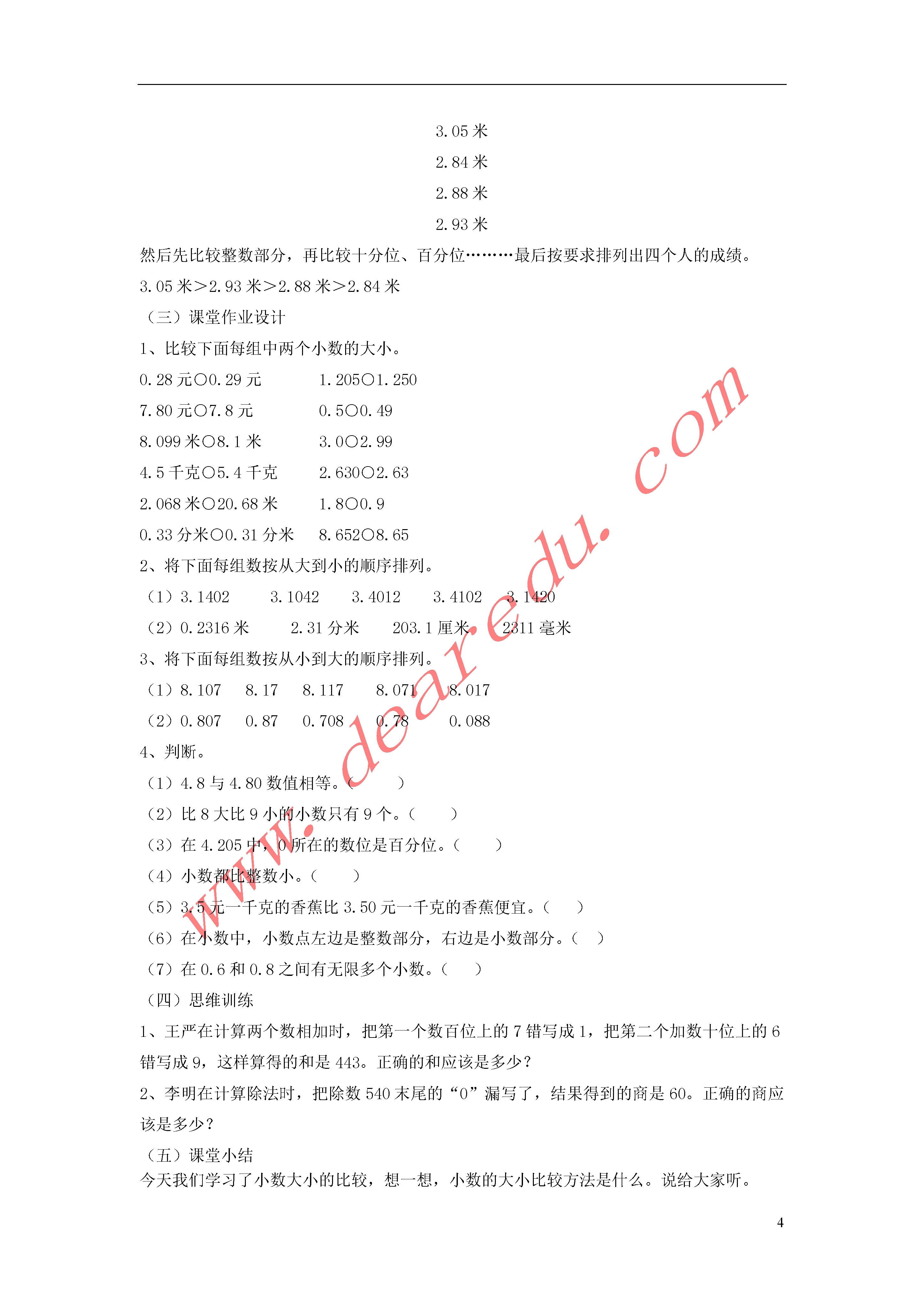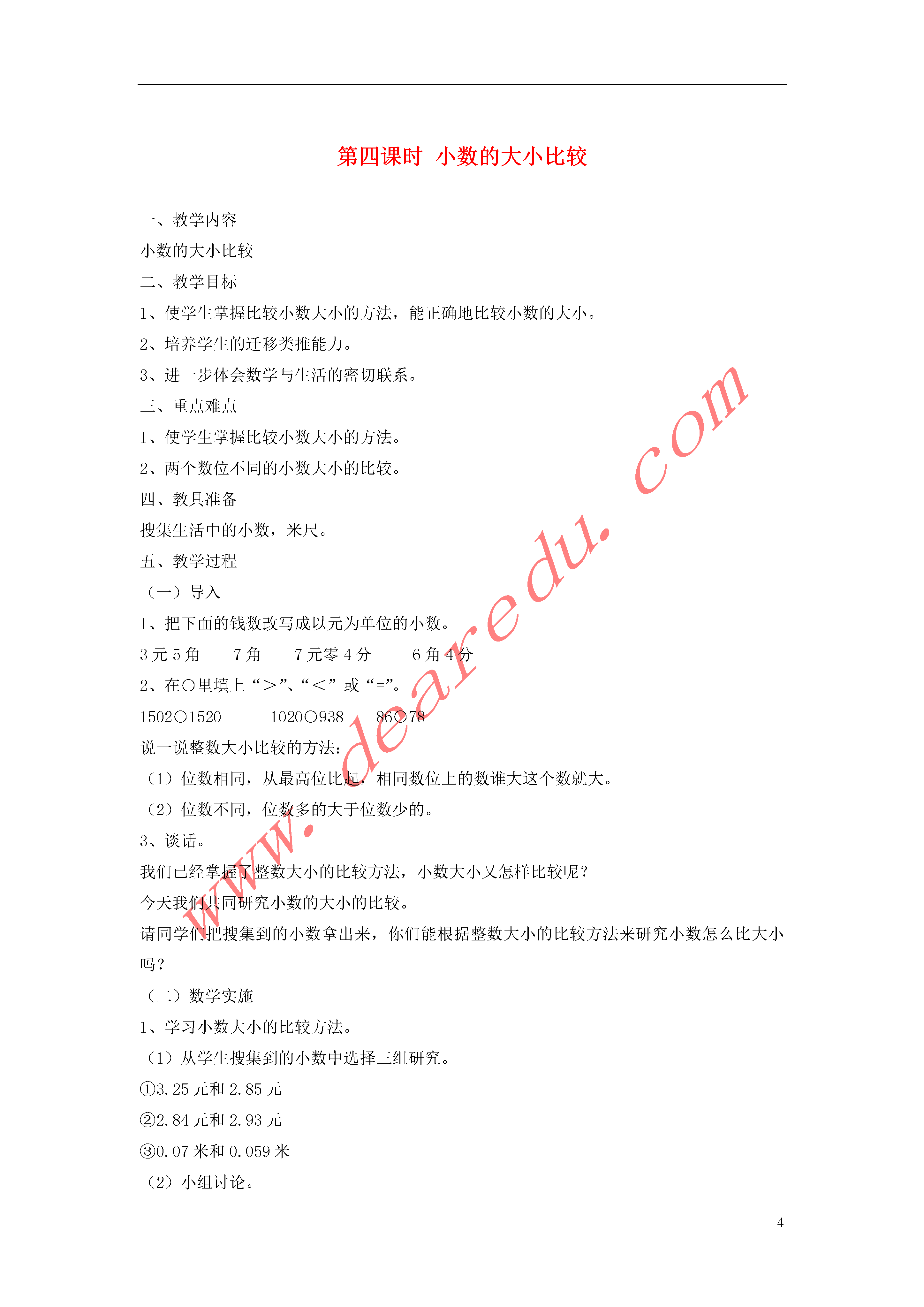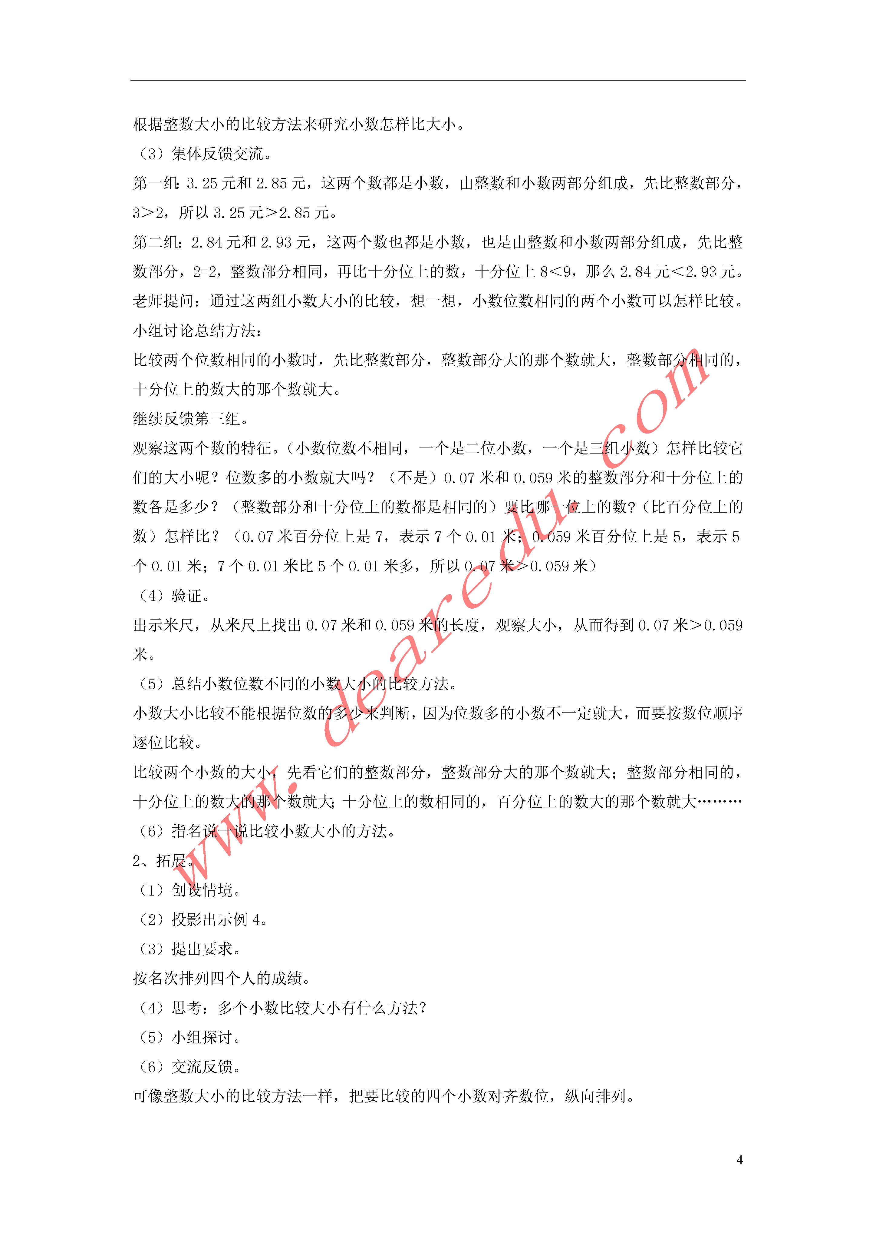 4第四课时小数的大小比较一、教学内容小数的大小比较二、教学目标1、使学生掌握比较小数大小的方法,能正确地比较小数的大小。2、培养学生的迁移类推能力。3、进一步体会数学与生活的密切联系。三、重点难点1、使学生掌握比较小数大小的方法。2、两个数位不同的小数大小的比较。四、教具准备搜集生活中的小数,米尺。五、教学过程(一)导入1、把下面的钱数改写成以元为单位的小数。3元5角7角7元零4分6角4分2、在○里填上“>”、“<”或“=”。1502○15201020○93886○78说一说整数大小比较的方法:(1)位数相同,从最高位比起,相同数位上的数谁大这个数就大。(2)位数不同,位数多的大于位数少的。3、谈话。我们已经掌握了整数大小的比较方法,小数大小又怎样比较呢?今天我们共同研究小数的大小的比较。请同学们把搜集到的小数拿出来,你们能根据整数大小的比较方法来研究小数怎么比大小吗?(二)数学实施1、学习小数大小的比较方法。(1)从学生搜集到的小数中选择三组研究。①3.25元和2.85元②2.84元和2.93元③0.07米和0.059米(2)小组讨论。根据整数大小的比较方法来研究小数怎样比大小。(3)集体反馈交流。第一组:3.25元和2.85元,这两个数都是小数,由整数和小数两部分组成,先比整数部分,3>2,所以3.25元>2.85元。第二组:2.84元和2.93元,这两个数也都是小数,也是由整数和小数两部分组成,先比整数部分,2=2,整数部分相同,再比十分位上的数,十分位上8<9,那么2.84元<2.93元。老师提问:通过这两组小数大小的比较,想一想,小数位数相同的两个小数可以怎样比较。小组讨论总结方法:比较两个位数相同的小数时,先比整数部分,整数部分大的那个数就大,整数部分相同的,十分位上的数大的那个数就大。继续反馈第三组。观察这两个数的特征。(小数位数不相同,一个是二位小数,一个是三组小数)怎样比较它们的大小呢?位数多的小数就大吗?(不是)0.07米和0.059米的整数部分和十分位上的数各是多少?(整数部分和十分位上的数都是相同的)要比哪一位上的数?(比百分位上的数)怎样比?(0.07米百分位上是7,表示7个0.01米;0.059米百分位上是5,表示5个0.01米;7个0.01米比5个0.01米多,所以0.07米>0.059米)(4)验证。出示米尺,从米尺上找出0.07米和0.059米的长度,观察大小,从而得到0.07米>0.059米。(5)总结小数位数不同的小数大小的比较方法。小数大小比较不能根据位数的多少来判断,因为位数多的小数不一定就大,而要按数位顺序逐位比较。比较两个小数的大小,先看它们的整数部分,整数部分大的那个数就大;整数部分相同的,十分位上的数大的那个数就大;十分位上的数相同的,百分位上的数大的那个数就大………(6)指名说一说比较小数大小的方法。2、拓展。(1)创设情境。(2)投影出示例4。(3)提出要求。按名次排列四个人的成绩。(4)思考:多个小数比较大小有什么方法?(5)小组探讨。(6)交流反馈。可像整数大小的比较方法一样,把要比较的四个小数对齐数位,纵向排列。3.05米2.84米2.88米2.93米然后先比较整数部分,再比较十分位、百分位………最后按要求排列出四个人的成绩。3.05米>2.93米>2.88米>2.84米(三)课堂作业设计1、比较下面每组中两个小数的大小。0.28元○0.29元1.205○1.2507.80元○7.8元0.5○0.498.099米○8.1米3.0○2.994.5千克○5.4千克2.630○2.632.068米○20.68米1.8○0.90.33分米○0.31分米8.652○8.652、将下面每组数按从大到小的顺序排列。(1)3.14023.10423.40123.41023.1420(2)0.2316米2.31分米203.1厘米2311毫米3、将下面每组数按从小到大的顺序排列。(1)8.1078.178.1178.0718.017(2)0.8070.870.7080.780.0884、判断。(1)4.8与4.80数值相等。()(2)比8大比9小的小数只有9个。()(3)在4.205中,0所在的数位是百分位。()(4)小数都比整数小。()(5)3.5元一千克的香蕉比3.50元一千克的香蕉便宜。()(6)在小数中,小数点左边是整数部分,右边是小数部分。()(7)在0.6和0.8之间有无限多个小数。()(四)思维训练1、王严在计算两个数相加时,把第一个数百位上的7错写成1,把第二个加数十位上的6错写成9,这样算得的