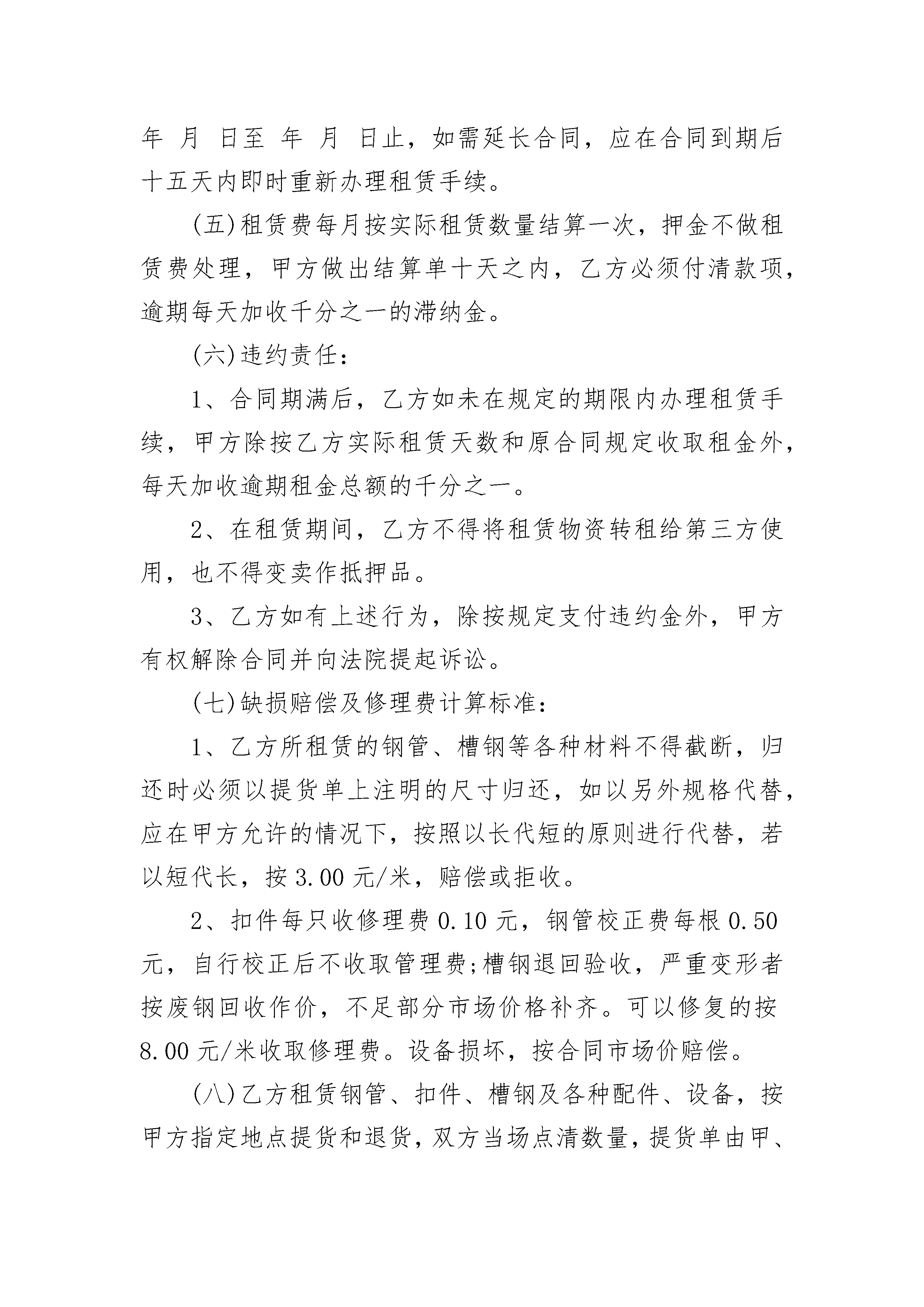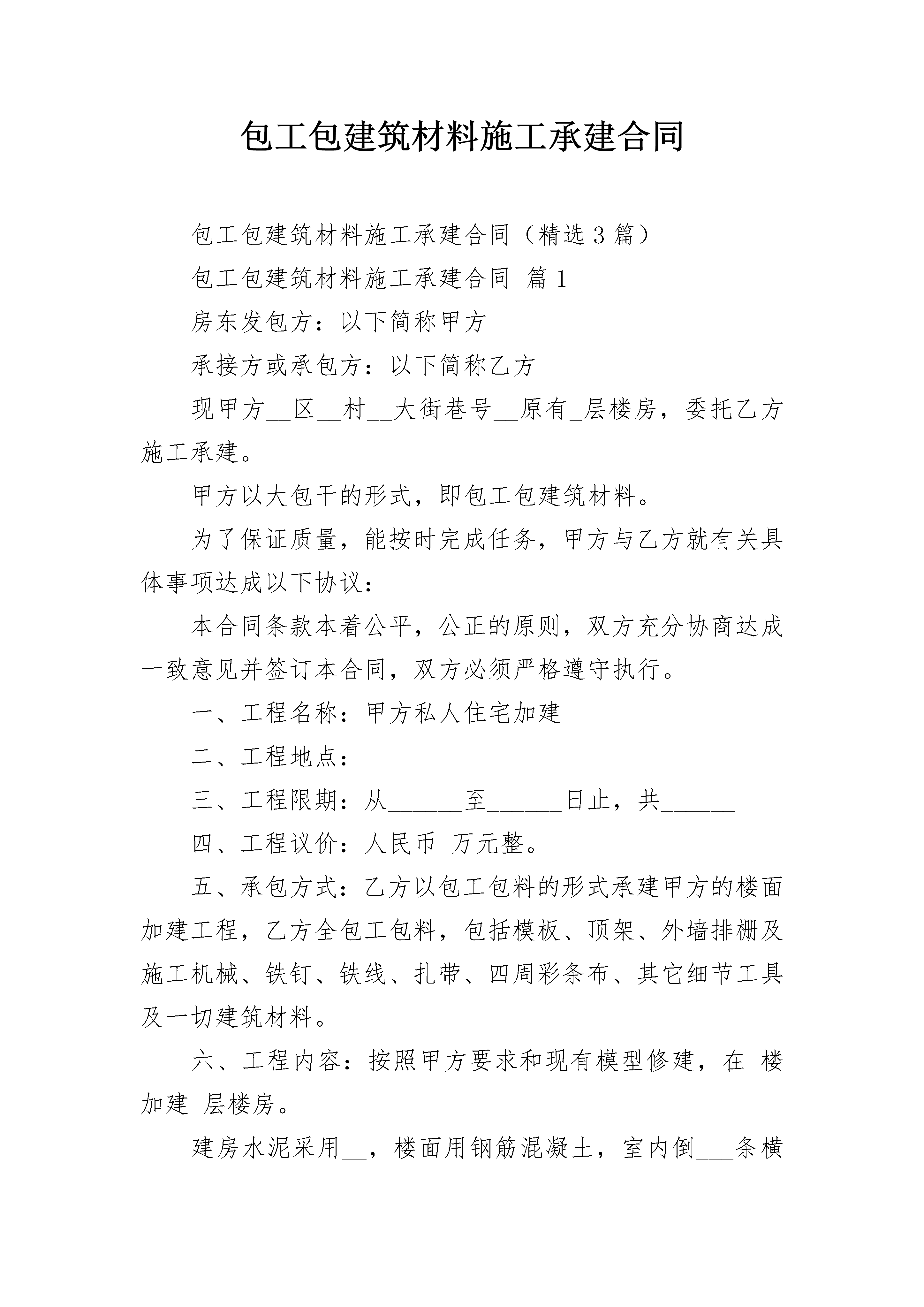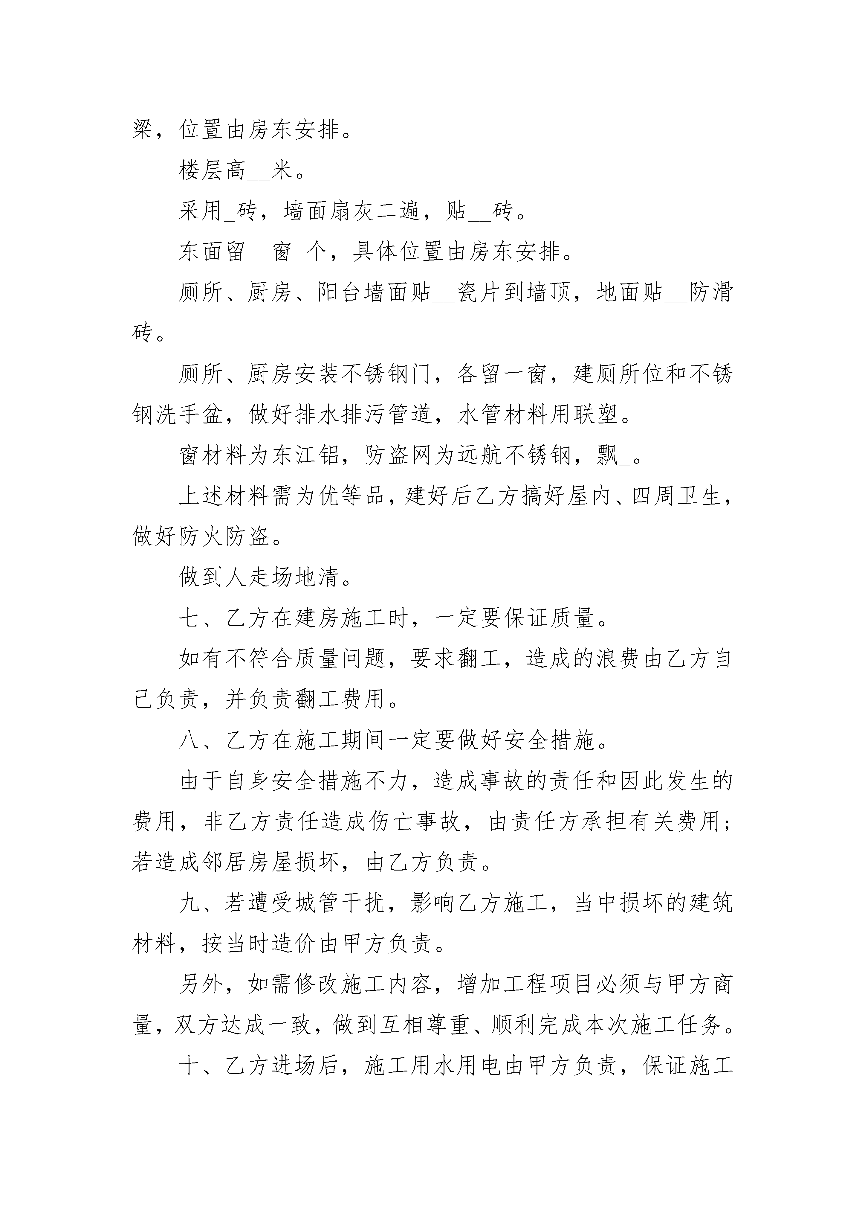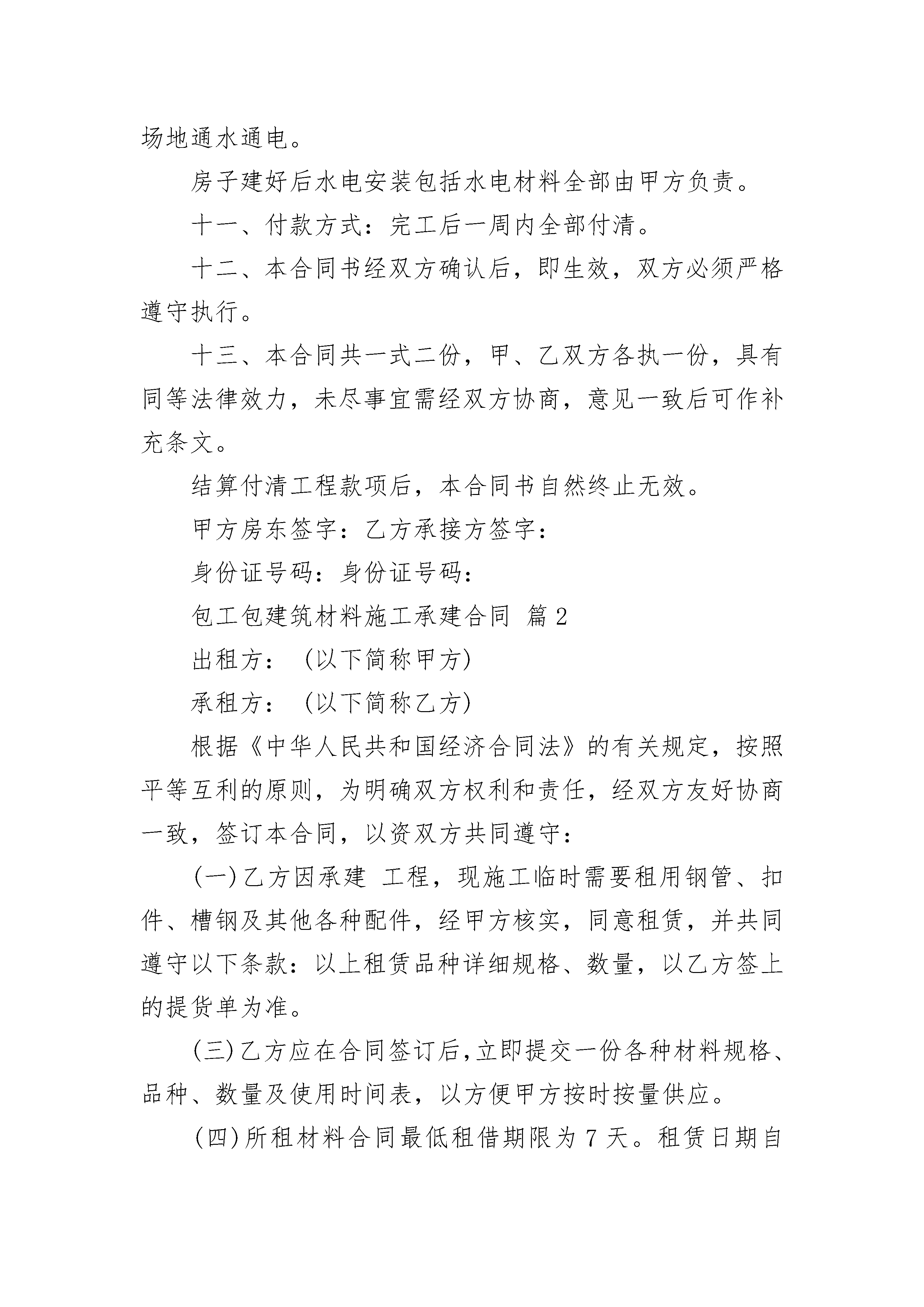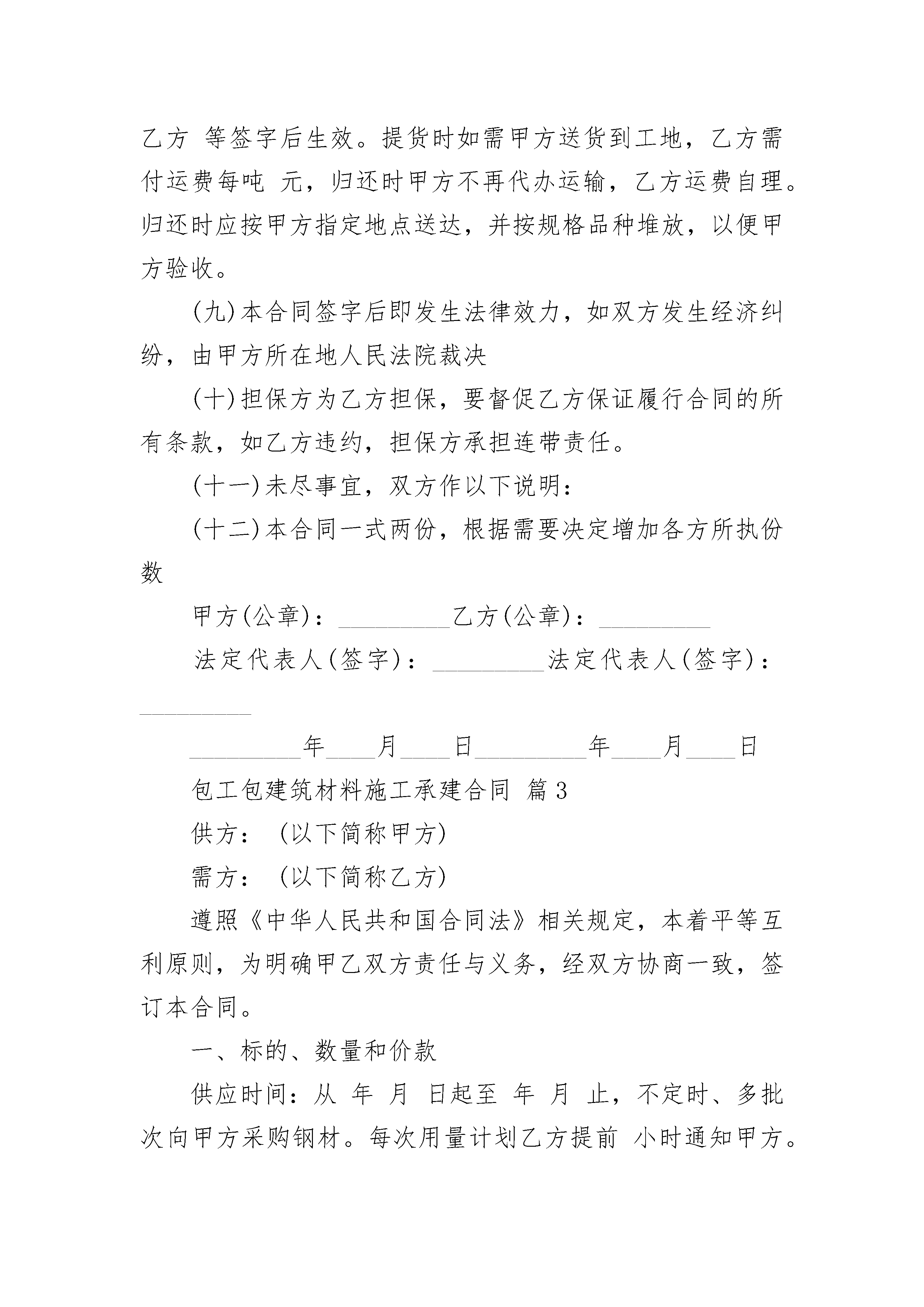 包工包建筑材料施工承建合同包工包建筑材料施工承建合同(精选3篇)包工包建筑材料施工承建合同篇1房东发包方:以下简称甲方承接方或承包方:以下简称乙方现甲方__区__村__大街巷号__原有_层楼房,委托乙方施工承建。甲方以大包干的形式,即包工包建筑材料。为了保证质量,能按时完成任务,甲方与乙方就有关具体事项达成以下协议:本合同条款本着公平,公正的原则,双方充分协商达成一致意见并签订本合同,双方必须严格遵守执行。一、工程名称:甲方私人住宅加建二、工程地点:三、工程限期:从______至______日止,共______四、工程议价:人民币_万元整。五、承包方式:乙方以包工包料的形式承建甲方的楼面加建工程,乙方全包工包料,包括模板、顶架、外墙排栅及施工机械、铁钉、铁线、扎带、四周彩条布、其它细节工具及一切建筑材料。六、工程内容:按照甲方要求和现有模型修建,在_楼加建_层楼房。建房水泥采用__,楼面用钢筋混凝土,室内倒___条横梁,位置由房东安排。楼层高__米。采用_砖,墙面扇灰二遍,贴__砖。东面留__窗_个,具体位置由房东安排。厕所、厨房、阳台墙面贴__瓷片到墙顶,地面贴__防滑砖。厕所、厨房安装不锈钢门,各留一窗,建厕所位和不锈钢洗手盆,做好排水排污管道,水管材料用联塑。窗材料为东江铝,防盗网为远航不锈钢,飘_。上述材料需为优等品,建好后乙方搞好屋内、四周卫生,做好防火防盗。做到人走场地清。七、乙方在建房施工时,一定要保证质量。如有不符合质量问题,要求翻工,造成的浪费由乙方自己负责,并负责翻工费用。八、乙方在施工期间一定要做好安全措施。由于自身安全措施不力,造成事故的责任和因此发生的费用,非乙方责任造成伤亡事故,由责任方承担有关费用;若造成邻居房屋损坏,由乙方负责。九、若遭受城管干扰,影响乙方施工,当中损坏的建筑材料,按当时造价由甲方负责。另外,如需修改施工内容,增加工程项目必须与甲方商量,双方达成一致,做到互相尊重、顺利完成本次施工任务。十、乙方进场后,施工用水用电由甲方负责,保证施工场地通水通电。房子建好后水电安装包括水电材料全部由甲方负责。十一、付款方式:完工后一周内全部付清。十二、本合同书经双方确认后,即生效,双方必须严格遵守执行。十三、本合同共一式二份,甲、乙双方各执一份,具有同等法律效力,未尽事宜需经双方协商,意见一致后可作补充条文。结算付清工程款项后,本合同书自然终止无效。甲方房东签字:乙方承接方签字:身份证号码:身份证号码:包工包建筑材料施工承建合同篇2出租方:(以下简称甲方)承租方:(以下简称乙方)根据《中华人民共和国经济合同法》的有关规定,按照平等互利的原则,为明确双方权利和责任,经双方友好协商一致,签订本合同,以资双方共同遵守:(一)乙方因承建工程,现施工临时需要租用钢管、扣件、槽钢及其他各种配件,经甲方核实,同意租赁,并共同遵守以下条款:以上租赁品种详细规格、数量,以乙方签上的提货单为准。(三)乙方应在合同签订后,立即提交一份各种材料规格、品种、数量及使用时间表,以方便甲方按时按量供应。(四)所租材料合同最低租借期限为7天。租赁日期自年月日至年月日止,如需延长合同,应在合同到期后十五天内即时重新办理租赁手续。(五)租赁费每月按实际租赁数量结算一次,押金不做租赁费处理,甲方做出结算单十天之内,乙方必须付清款项,逾期每天加收千分之一的滞纳金。(六)违约责任:1、合同期满后,乙方如未在规定的期限内办理租赁手续,甲方除按乙方实际租赁天数和原合同规定收取租金外,每天加收逾期租金总额的千分之一。2、在租赁期间,乙方不得将租赁物资转租给第三方使用,也不得变卖作抵押品。3、乙方如有上述行为,除按规定支付违约金外,甲方有权解除合同并向法院提起诉讼。(七)缺损赔偿及修理费计算标准:1、乙方所租赁的钢管、槽钢等各种材料不得截断,归还时必须以提货单上注明的尺寸归还,如以另外规格代替,应在甲方允许的情况下,按照以长代短的原则进行代替,若以短代长,按3.00元/米,赔偿或拒收。2、扣件每只收修理费0.10元,钢管校正费每根0.50元,自行校正后不收取管理费;槽钢退回验收,严重变形者按废钢回收作价,不足部分市场价格补齐。可以修复的按8.00元/米收取修理费。设备损坏,按合同市场价赔偿。(八)乙方租赁钢管、扣件、槽钢及各种配件、设备,按甲方指定地点提货和退货,双方当场点清数量,提货单由甲、乙方等签字后生效。提货时如需甲方送货到工地,乙方需付运费每吨元,归还时甲方不再代办运输,乙方运费自理。归还时应按甲方指定地点送达,并按规格品种堆放,以便甲方验收。(九)本合同签字后即发生法律效力,如双方发生经济纠纷,由甲方所在地人民法院裁决(十)担保方为乙方担保,要督促乙方保证履行合同的所有条款,如乙方违约,担保方承担连带责任。(十一)未尽事宜,双方作