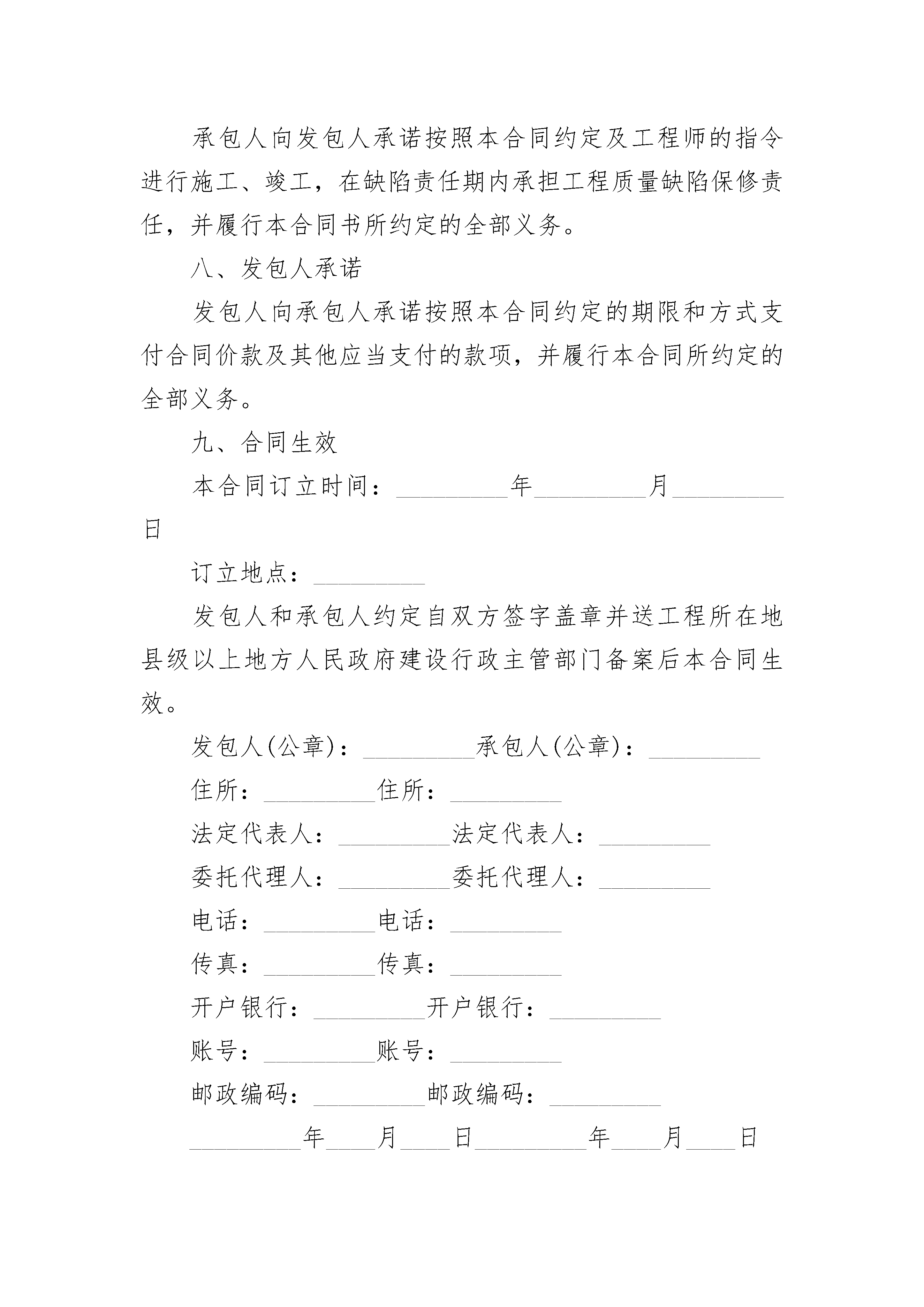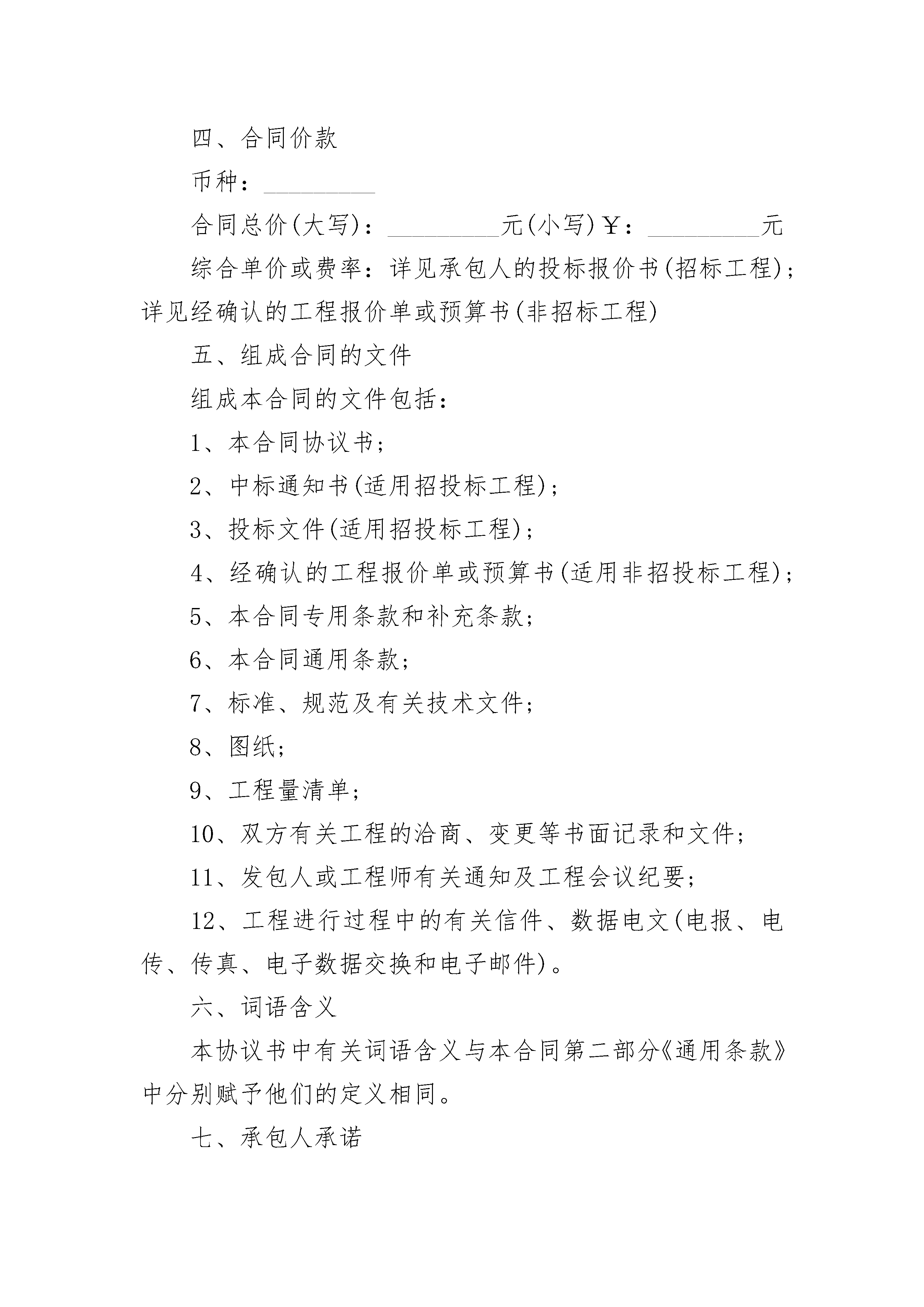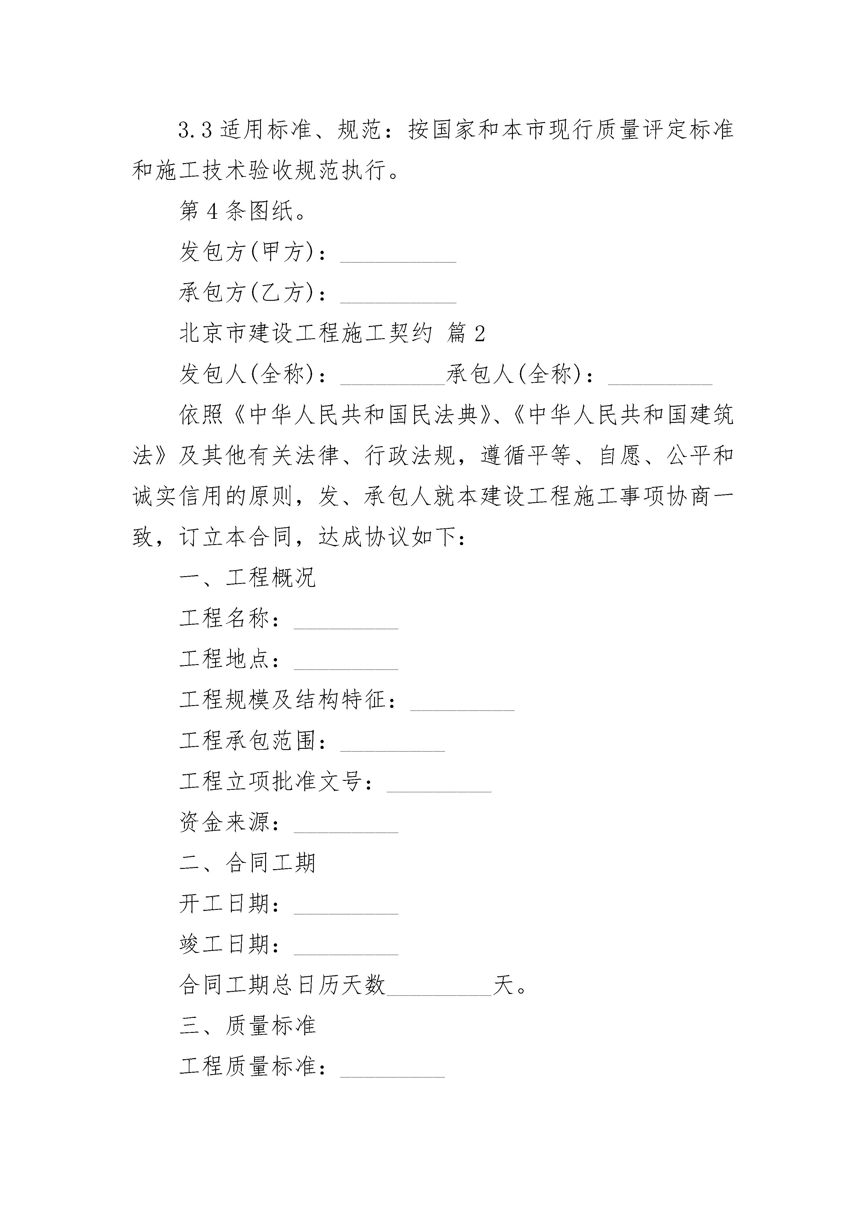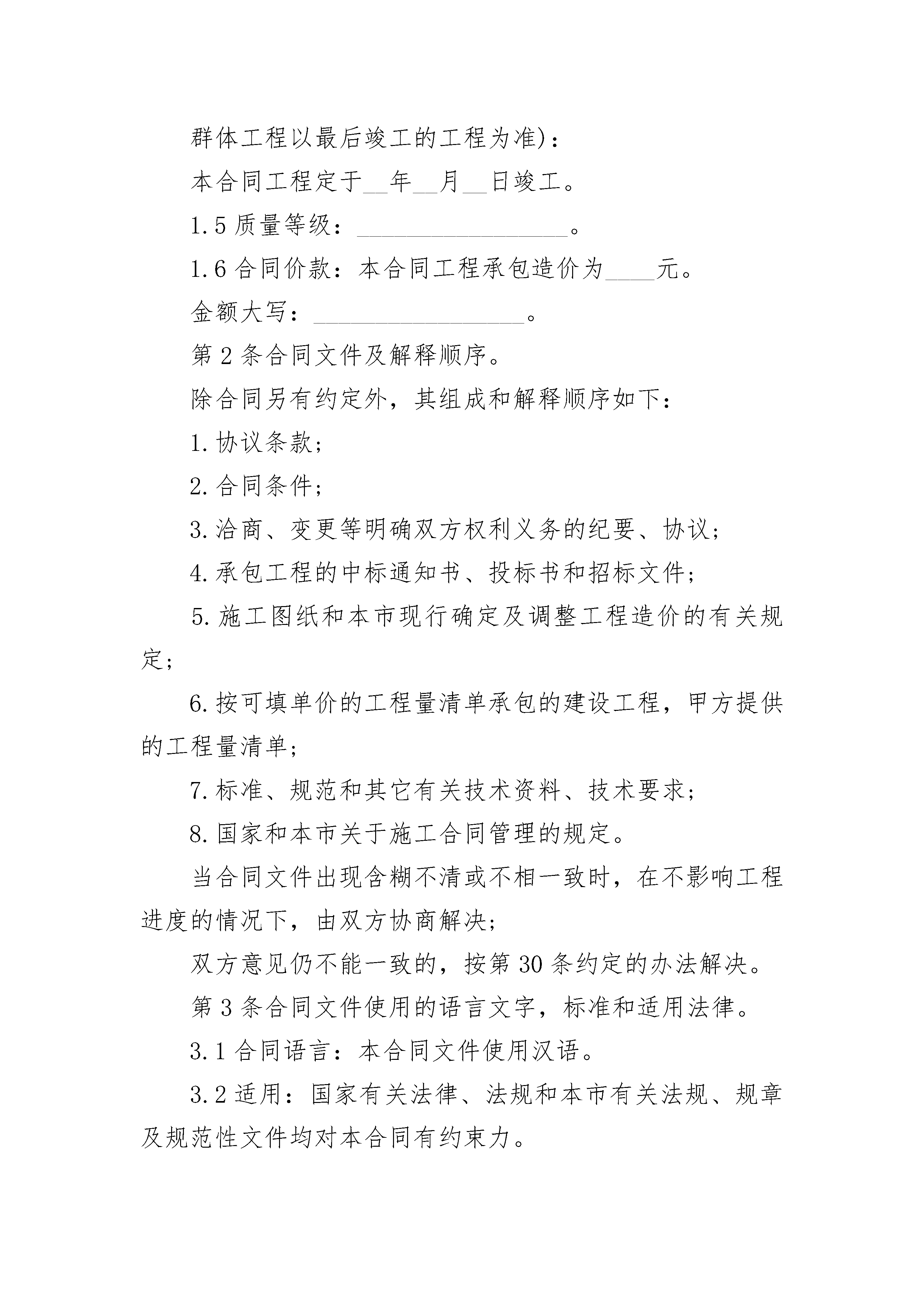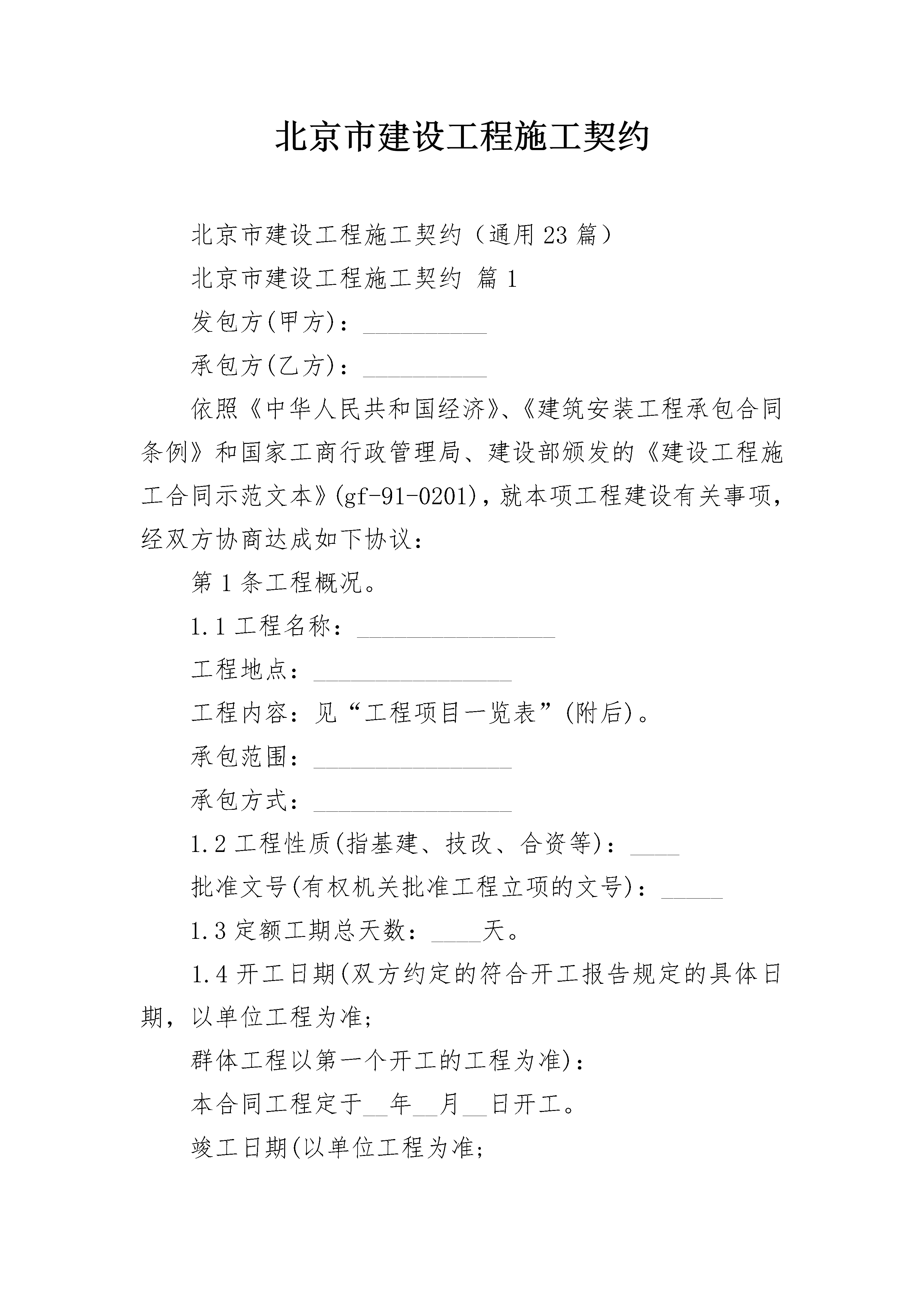 北京市建设工程施工契约北京市建设工程施工契约(通用23篇)北京市建设工程施工契约篇1发包方(甲方):__________承包方(乙方):__________依照《中华人民共和国经济》、《建筑安装工程承包合同条例》和国家工商行政管理局、建设部颁发的《建设工程施工合同示范文本》(gf-91-0201),就本项工程建设有关事项,经双方协商达成如下协议:第1条工程概况。1.1工程名称:________________工程地点:________________工程内容:见“工程项目一览表”(附后)。承包范围:________________承包方式:________________1.2工程性质(指基建、技改、合资等):____批准文号(有权机关批准工程立项的文号):_____1.3定额工期总天数:____天。1.4开工日期(双方约定的符合开工报告规定的具体日期,以单位工程为准;群体工程以第一个开工的工程为准):本合同工程定于__年__月__日开工。竣工日期(以单位工程为准;群体工程以最后竣工的工程为准):本合同工程定于__年__月__日竣工。1.5质量等级:_________________。1.6合同价款:本合同工程承包造价为____元。金额大写:_________________。第2条合同文件及解释顺序。除合同另有约定外,其组成和解释顺序如下:1.协议条款;2.合同条件;3.洽商、变更等明确双方权利义务的纪要、协议;4.承包工程的中标通知书、投标书和招标文件;5.施工图纸和本市现行确定及调整工程造价的有关规定;6.按可填单价的工程量清单承包的建设工程,甲方提供的工程量清单;7.标准、规范和其它有关技术资料、技术要求;8.国家和本市关于施工合同管理的规定。当合同文件出现含糊不清或不相一致时,在不影响工程进度的情况下,由双方协商解决;双方意见仍不能一致的,按第30条约定的办法解决。第3条合同文件使用的语言文字,标准和适用法律。3.1合同语言:本合同文件使用汉语。3.2适用:国家有关法律、法规和本市有关法规、规章及规范性文件均对本合同有约束力。3.3适用标准、规范:按国家和本市现行质量评定标准和施工技术验收规范执行。第4条图纸。发包方(甲方):__________承包方(乙方):__________北京市建设工程施工契约篇2发包人(全称):_________承包人(全称):_________依照《中华人民共和国民法典》、《中华人民共和国建筑法》及其他有关法律、行政法规,遵循平等、自愿、公平和诚实信用的原则,发、承包人就本建设工程施工事项协商一致,订立本合同,达成协议如下:一、工程概况工程名称:_________工程地点:_________工程规模及结构特征:_________工程承包范围:_________工程立项批准文号:_________资金来源:_________二、合同工期开工日期:_________竣工日期:_________合同工期总日历天数_________天。三、质量标准工程质量标准:_________四、合同价款币种:_________合同总价(大写):_________元(小写)¥:_________元综合单价或费率:详见承包人的投标报价书(招标工程);详见经确认的工程报价单或预算书(非招标工程)五、组成合同的文件组成本合同的文件包括:1、本合同协议书;2、中标通知书(适用招投标工程);3、投标文件(适用招投标工程);4、经确认的工程报价单或预算书(适用非招投标工程);5、本合同专用条款和补充条款;6、本合同通用条款;7、标准、规范及有关技术文件;8、图纸;9、工程量清单;10、双方有关工程的洽商、变更等书面记录和文件;11、发包人或工程师有关通知及工程会议纪要;12、工程进行过程中的有关信件、数据电文(电报、电传、传真、电子数据交换和电子邮件)。六、词语含义本协议书中有关词语含义与本合同第二部分《通用条款》中分别赋予他们的定义相同。七、承包人承诺承包人向发包人承诺按照本合同约定及工程师的指令进行施工、竣工,在缺陷责任期内承担工程质量缺陷保修责任,并履行本合同书所约定的全部义务。八、发包人承诺发包人向承包人承诺按照本合同约定的期限和方式支付合同价款及其他应当支付的款项,并履行本合同所约定的全部义务。九、合同生效本合同订立时间:_________年_________月_________日订立地点:_________发包人和承包人约定自双方签字盖章并送工程所在地县级以上地方人民政府建设行政主管部门备案后本合同生效。发包人(公章):_________承包人(公章):_________住所:_________住所:_________法定代表人:_________法定代表人:_________委托代理人:________