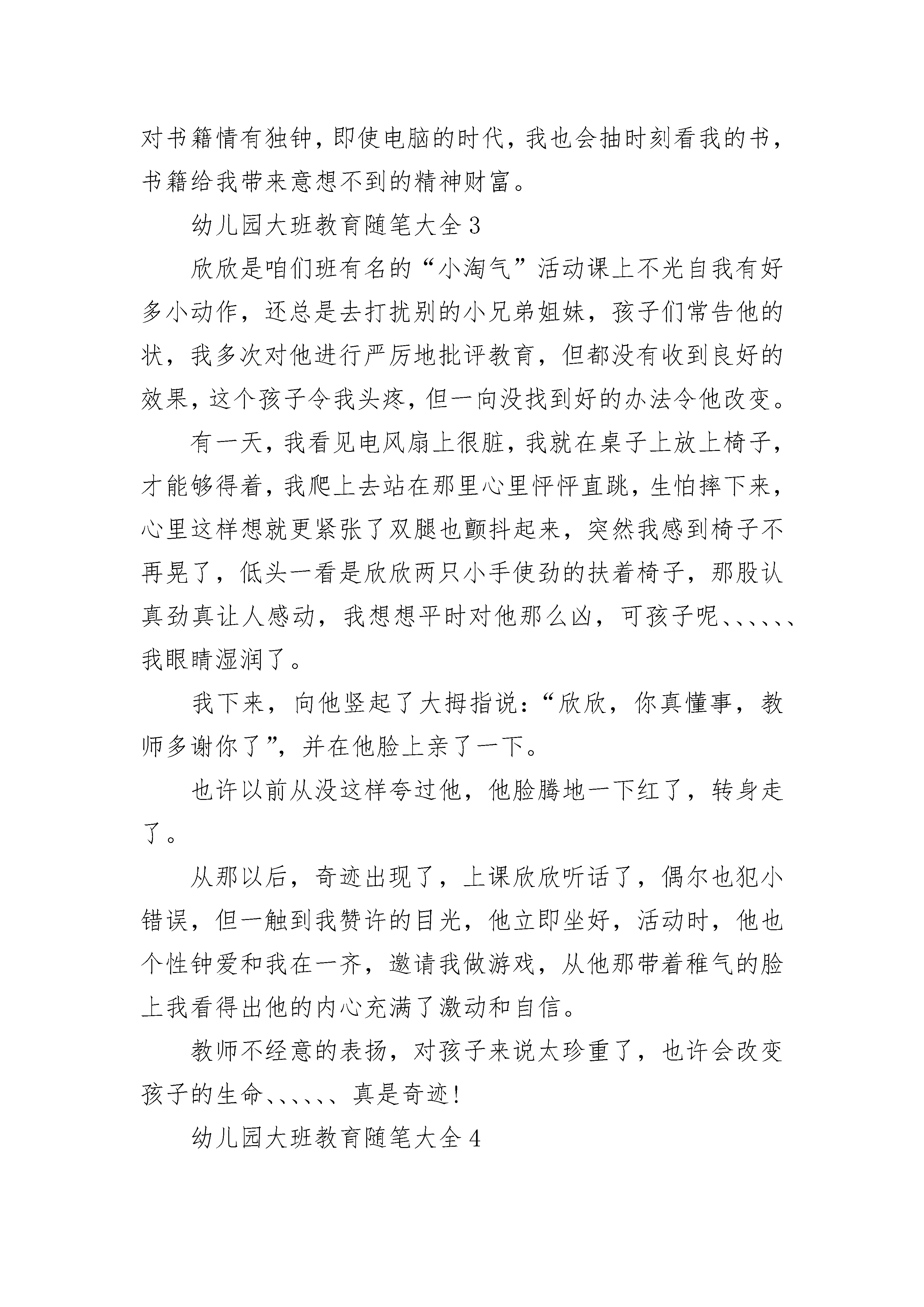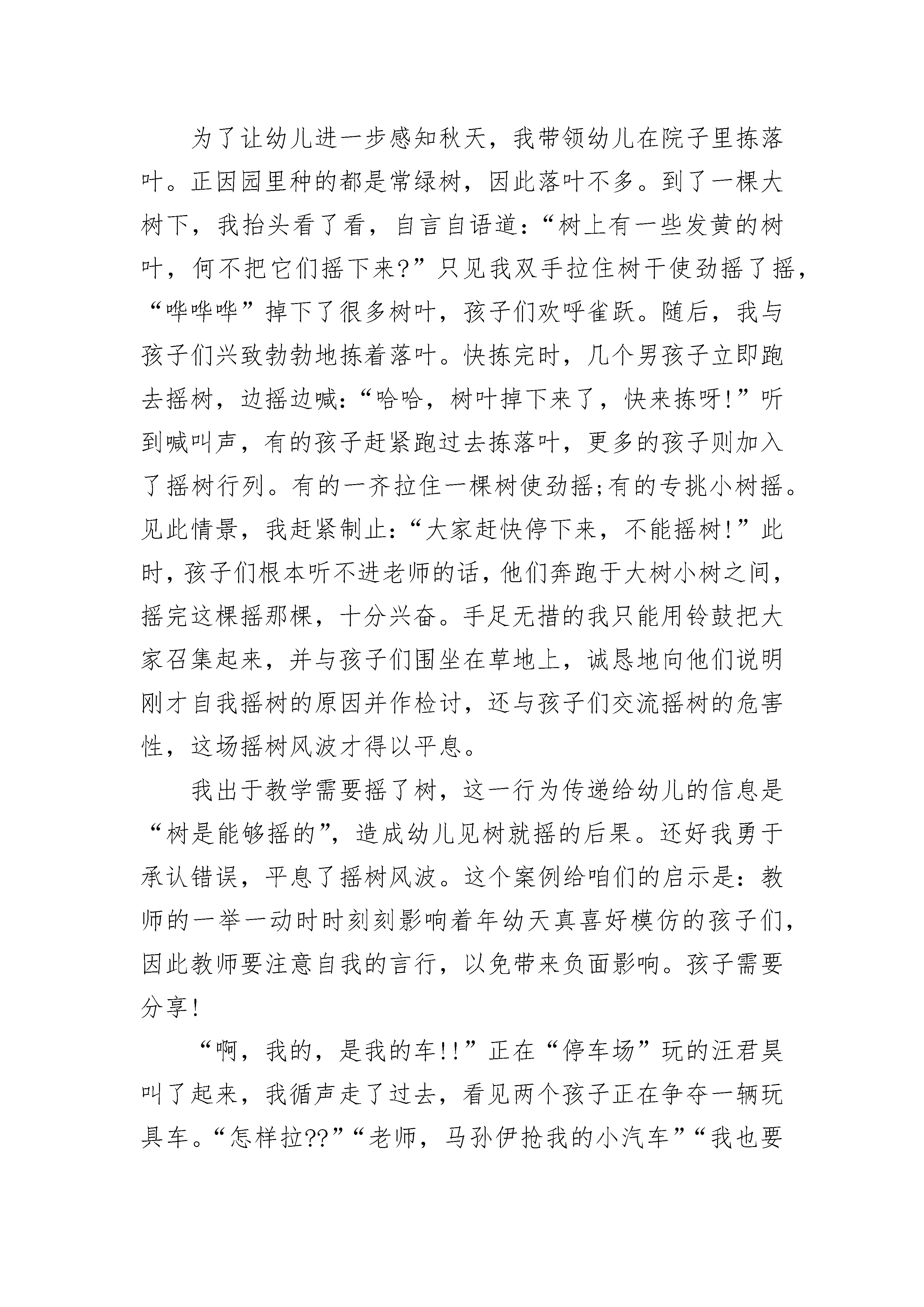 幼儿园大班教育随笔大全每一天早操和户外活动前的排队真让人头疼。我发出“站队”的口令后,孩子们就会疯狂的向站队的地方冲去。有的孩子连小椅子都顾不上放好,就迅速跑过去,你推我,我挤你.经常会听到:“教师,他插队”、“我站在这儿”。站在前面的几个孩子,有的抱着我的腿,有的抓住我的手,有的拉着我的衣服,我只能用更大的声音盖过他们,或者一一把他们的手拿开,批评他们一顿,可效果不大。我琢磨老这么乱可不是事儿,于是着手调查其中的原因。我把几个总爱挤的孩子叫到身边问:“你们为什么排队时总爱挤?”“我想当排头!”“你们为什么想当排头呢?”“当排头多好,当排头在前走,离教师最近,能帮教师干活,还能得到表扬……”。我又把经常当排头的幼儿叫到身边问:“你们钟爱当排头吗?”有的孩子说:“钟爱。”有的孩子说:“有时钟爱,有时不钟爱。”在每次的活动中,每位幼儿都争着去做,但教师只是选取几个平时潜质比较强的幼儿担任。时刻长了,潜质强的幼儿只能被动的理解,潜质弱的仅有羡慕的眼光。怎样才能使每一位幼儿得到锻炼,又能让他们互相谦让着排好队呢?我决定和孩子们一齐讨论一下,听一听他们的意见。于是,我说:“那咱们一齐来想个办法吧!”孩子们你一言我一语各抒己见。我又来问孩子:“大家都想当排头,可排头只能有一个,咱们怎样办才能让大家都能当上排头呢?”陈天赐说:“能够看谁的表现好,就让谁当排头。”其他孩子立刻反对:“不行,这样还是有很多人当不上的。”马亦心说:“能够轮换着当,这天你当,明天我当。”孩子们争论不休。最终咱们确定“轮流当排头”。每一天选两名小兄弟姐妹当排头。当排头时要聚精会神。新的轮流当排头建立后,孩子们都很高兴,他们再也不去挤着当排头了。我也归纳反思了自我的不足。咱们总是请潜质强的孩子帮教师做事,只注重孩子的义务而忽视了孩子的权利,只注重孩子的服从而忽视—了孩子的自主。日久天长,咱们就剥夺了潜质强的孩子选取的权利,也剥夺了潜质弱的孩子自我锻炼、自我发展的权利。孩子们都只是在人生最出的起跑线上,作为教师有必要把锻炼的机会分给每个孩子。不是吗?幼儿园大班教育随笔大全2看到此刻的孩子进入图书馆的自如,不由得让我记起小时候对图书的奢望……那还是小学三年级的时候,每一天最大的奢侈就是看小人书,有幸教咱们数学的韩教师就兼管着学校的图书,韩教师是一个平易近人,不苟言笑的中年男教师,给咱们留下最深刻的的记忆就是长长地脖子,一走进教室首先出现的就是韩教师特有象征的脖子,咱们还偷偷的给教师起外号呢!“长脖子教师”,可是,咱们只敢在私底下偷偷的议论,可从来不敢叫出声来,那时的我最感兴趣的就是上数学课,不是正因我的数学成绩太好,而是为了得到看小人书的允许,正因每当韩教师给咱们布置完数学作业,他就蹲在门口,等待咱们的完成,这个时候也是咱们纪律最好,作业速度最快、最认真的时刻,正因谁做的作业全对了,就有看一本小人书的权利,你想,那是多么愉悦的时刻啊,也就是从那时起,我的数学成绩一向都是考一百分的缘故吧,所以,那时候的咱们,谁先拿到小人书,就是最大的奖励,远比奖励一个铅笔头来的欲望大。(小时候班主任教师每当周六上午放学时,会把一周学生们捡来的铅笔头,根据表现分到个人手里,这就是当时最好的物质奖励。)看看此刻的孩子,随着新图书不断地增加,想看就看,想买就买,有时候还不懂得去珍惜,家里的新书到处都是,什么全彩的、动画的、连载的、漫画、带香味的、带声音的,真是无奇不有,无所不能,正正因物质生活的提高,此刻的孩子们远没有咱们那时对图书的珍惜。来之不易的感觉,也许仅有“物以稀为贵”才该有的吧,说归说,图书的不断改善,为此刻的孩子领悟知识带来了方便,孩子们能够尽情的在知识的海洋中畅游,并且还能够根据画面资料随手进行粘贴与创作,既动脑又动手,有时候咱们大人看不懂得,小孩子也会看得津津有味,真所谓是,时代的提高,书籍的变迁。此刻随便走进一家书店,琳琅满目的书籍装满各个架子,不一样的书籍分布明确,让看书的人一目了然,既省时又省事,你看吧,原先看书可是小孩才有的功夫,此刻是一家人都在不断地充实自我,“好的书籍,让人受益终生”,真是领悟的时代啊!所以,我珍惜我每次进图书馆的机会,我更会对书籍情有独钟,即使电脑的时代,我也会抽时刻看我的书,书籍给我带来意想不到的精神财富。幼儿园大班教育随笔大全3欣欣是咱们班有名的“小淘气”活动课上不光自我有好多小动作,还总是去打扰别的小兄弟姐妹,孩子们常告他的状,我多次对他进行严厉地批评教育,但都没有收到良好的效果,这个孩子令我头疼,但一向没找到好的办法令他改变。有一天,我看见电风扇上很脏,我就在桌子上放上椅子,才能够得着,我爬上去站在那里心里怦怦直跳,生怕摔下来,心里这样想就更紧张了双腿也颤抖起来,突然我感到椅子不再晃了,低头一看是欣欣两只小手使劲的扶着椅子,那股认真劲真让人
