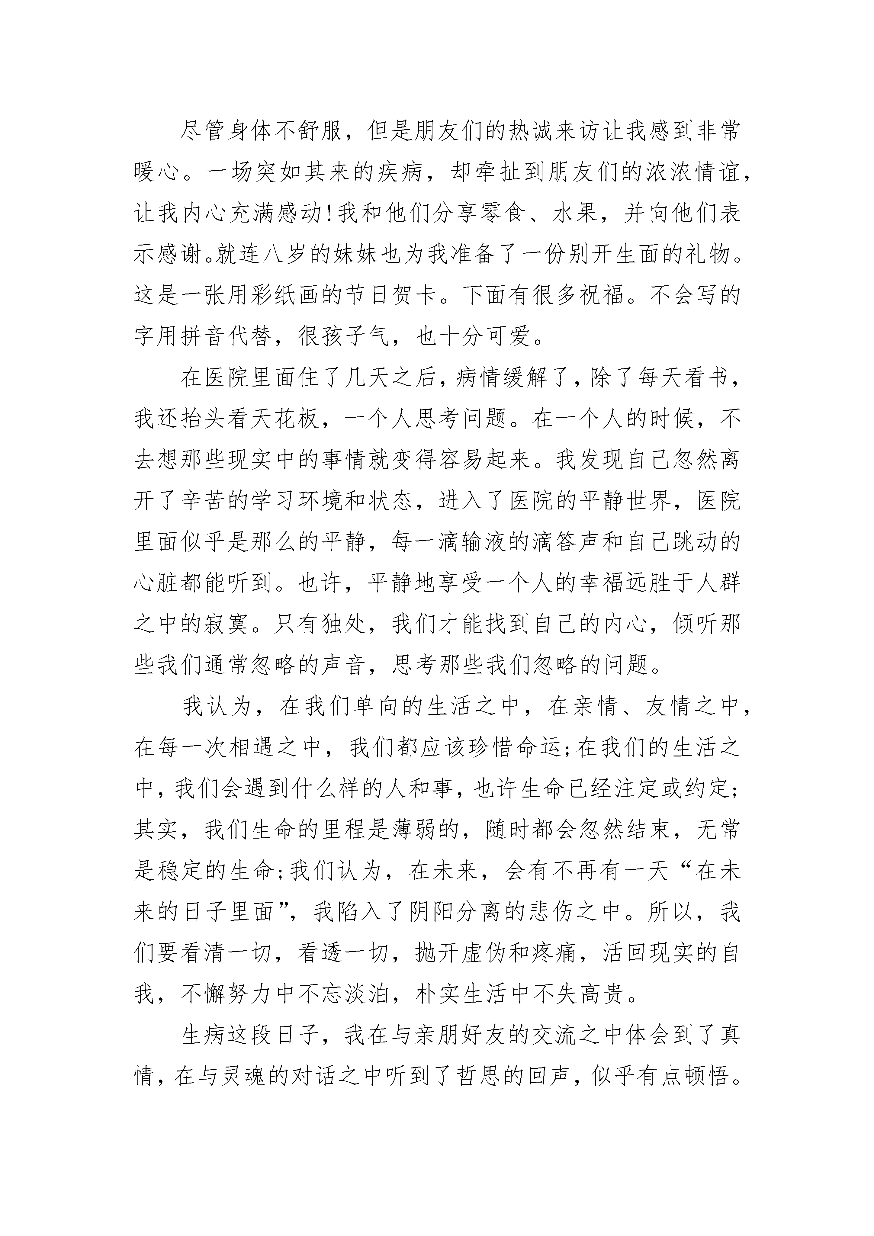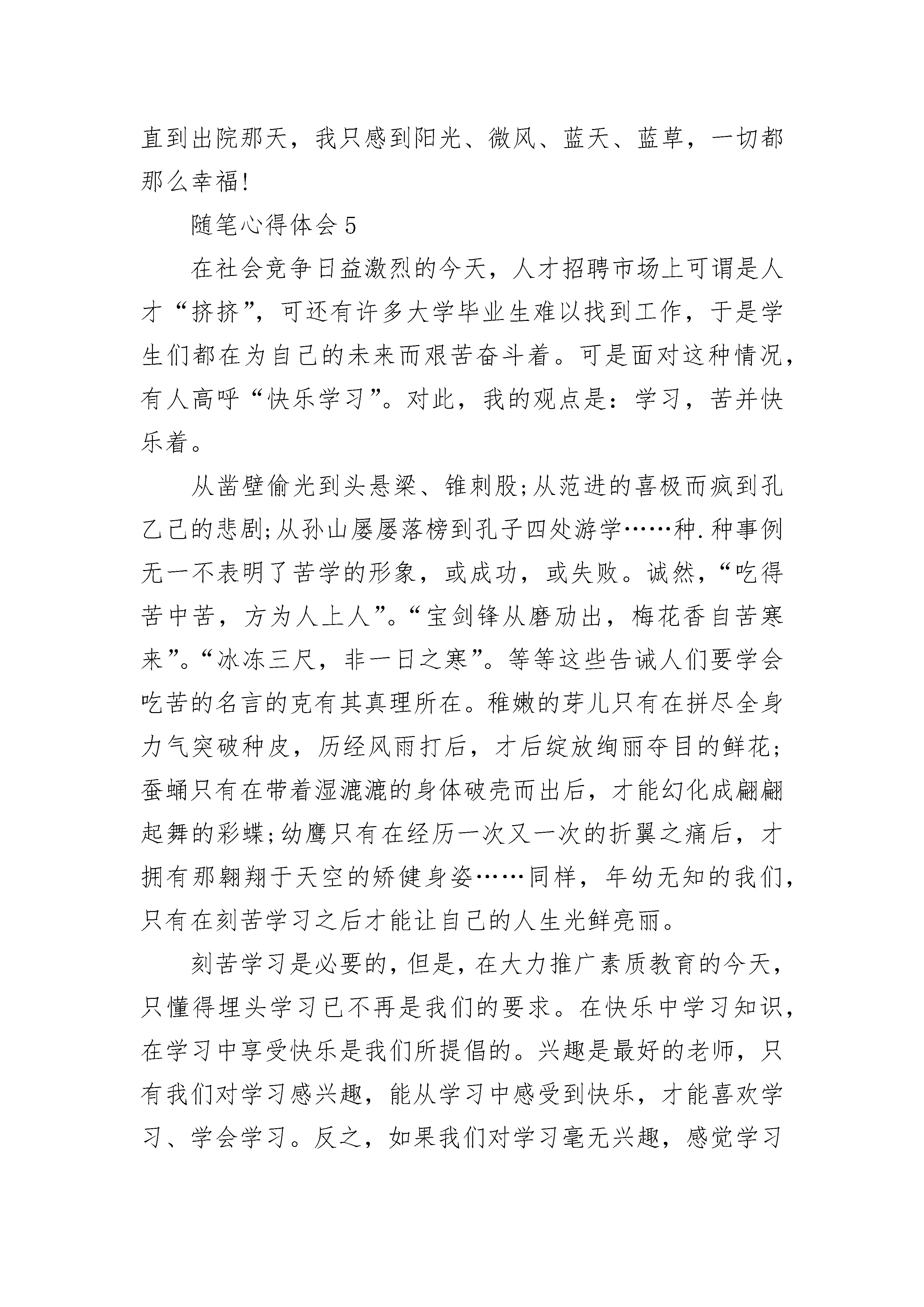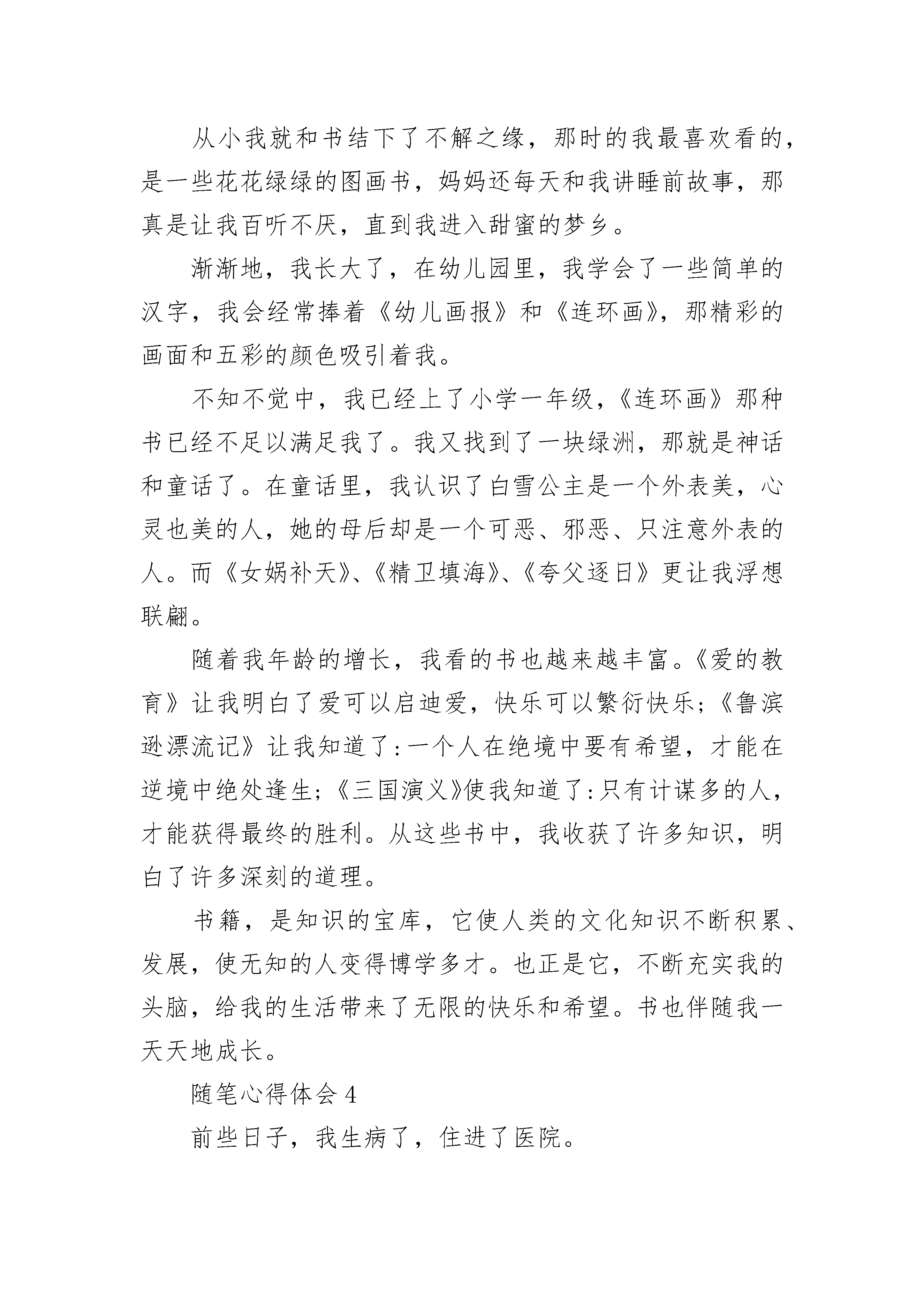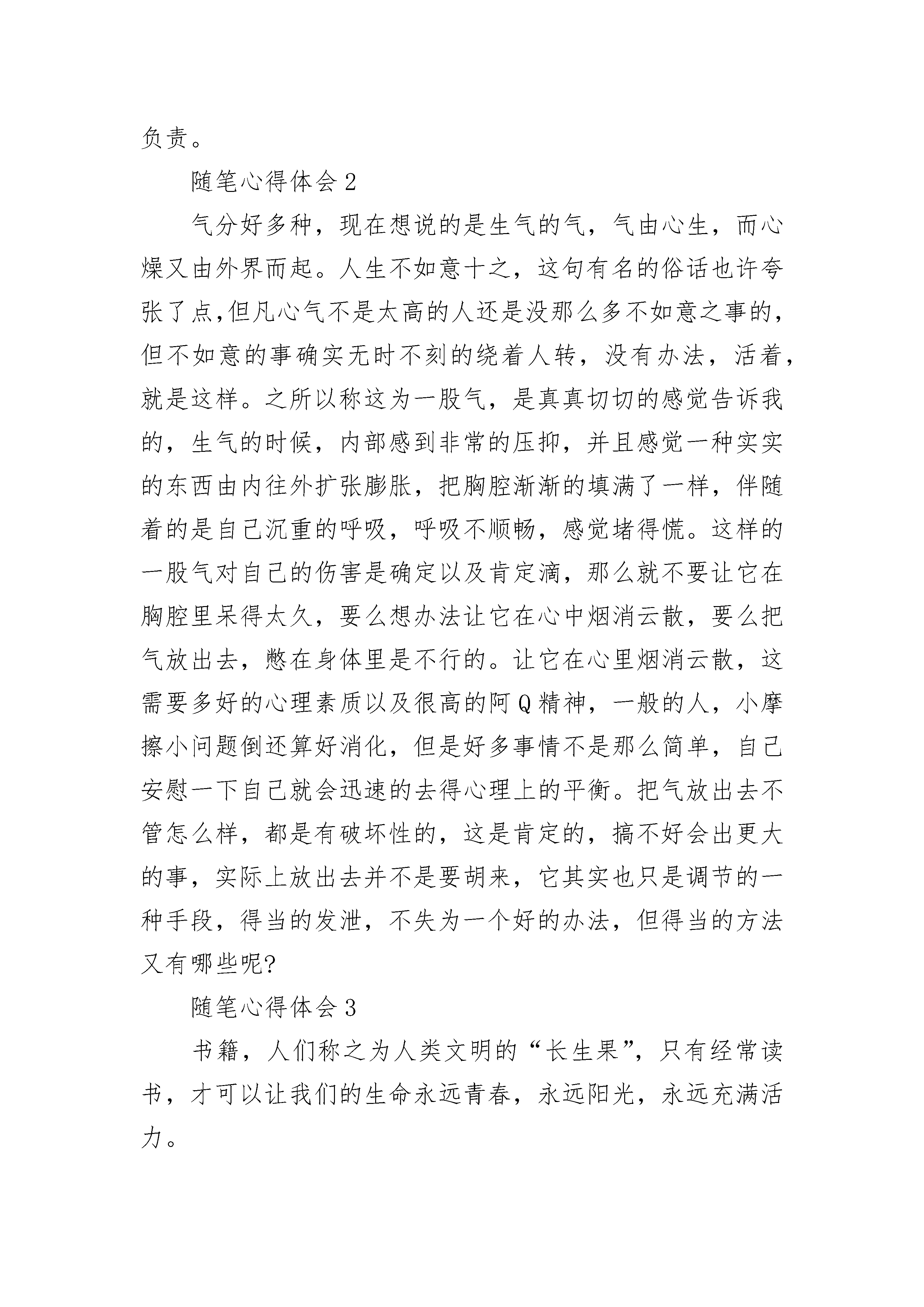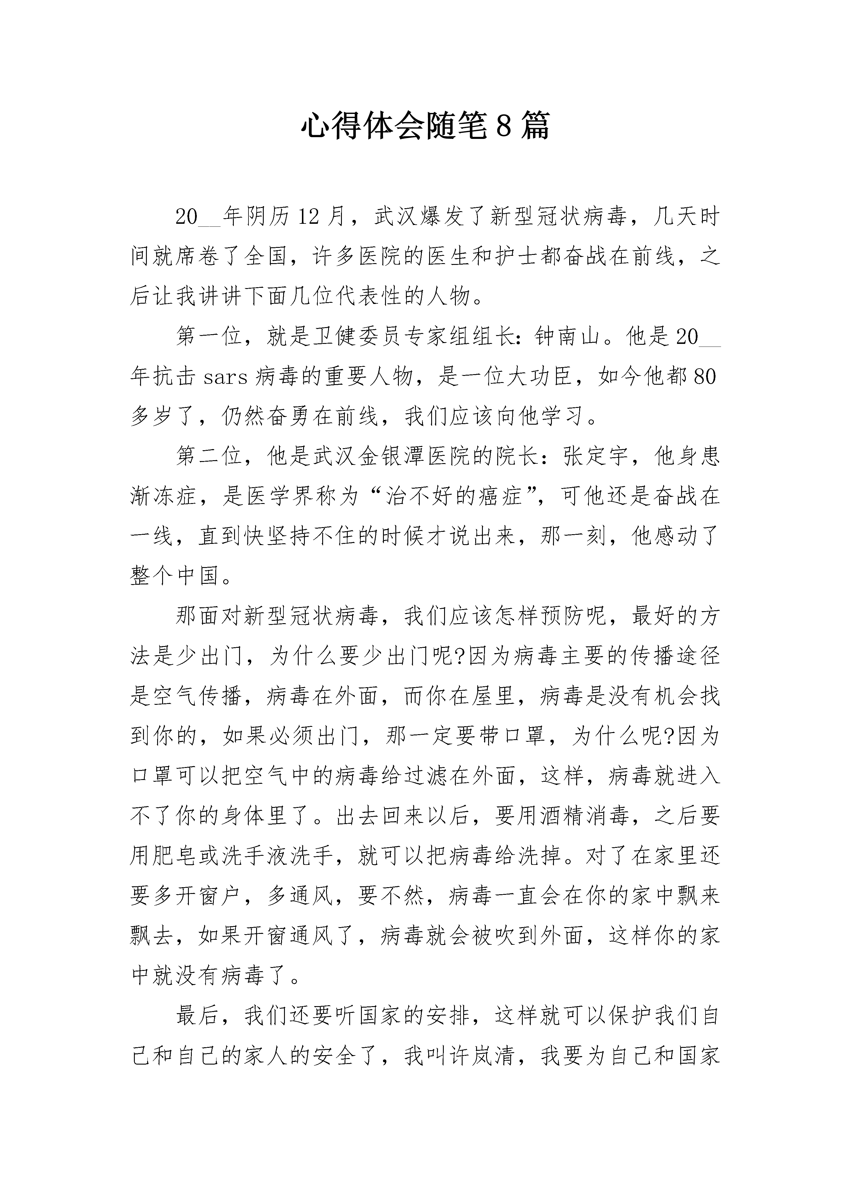 心得体会随笔8篇20__年阴历12月,武汉爆发了新型冠状病毒,几天时间就席卷了全国,许多医院的医生和护士都奋战在前线,之后让我讲讲下面几位代表性的人物。第一位,就是卫健委员专家组组长:钟南山。他是20__年抗击sars病毒的重要人物,是一位大功臣,如今他都80多岁了,仍然奋勇在前线,我们应该向他学习。第二位,他是武汉金银潭医院的院长:张定宇,他身患渐冻症,是医学界称为“治不好的癌症”,可他还是奋战在一线,直到快坚持不住的时候才说出来,那一刻,他感动了整个中国。那面对新型冠状病毒,我们应该怎样预防呢,最好的方法是少出门,为什么要少出门呢?因为病毒主要的传播途径是空气传播,病毒在外面,而你在屋里,病毒是没有机会找到你的,如果必须出门,那一定要带口罩,为什么呢?因为口罩可以把空气中的病毒给过滤在外面,这样,病毒就进入不了你的身体里了。出去回来以后,要用酒精消毒,之后要用肥皂或洗手液洗手,就可以把病毒给洗掉。对了在家里还要多开窗户,多通风,要不然,病毒一直会在你的家中飘来飘去,如果开窗通风了,病毒就会被吹到外面,这样你的家中就没有病毒了。最后,我们还要听国家的安排,这样就可以保护我们自己和自己的家人的安全了,我叫许岚清,我要为自己和国家负责。随笔心得体会2气分好多种,现在想说的是生气的气,气由心生,而心燥又由外界而起。人生不如意十之,这句有名的俗话也许夸张了点,但凡心气不是太高的人还是没那么多不如意之事的,但不如意的事确实无时不刻的绕着人转,没有办法,活着,就是这样。之所以称这为一股气,是真真切切的感觉告诉我的,生气的时候,内部感到非常的压抑,并且感觉一种实实的东西由内往外扩张膨胀,把胸腔渐渐的填满了一样,伴随着的是自己沉重的呼吸,呼吸不顺畅,感觉堵得慌。这样的一股气对自己的伤害是确定以及肯定滴,那么就不要让它在胸腔里呆得太久,要么想办法让它在心中烟消云散,要么把气放出去,憋在身体里是不行的。让它在心里烟消云散,这需要多好的心理素质以及很高的阿Q精神,一般的人,小摩擦小问题倒还算好消化,但是好多事情不是那么简单,自己安慰一下自己就会迅速的去得心理上的平衡。把气放出去不管怎么样,都是有破坏性的,这是肯定的,搞不好会出更大的事,实际上放出去并不是要胡来,它其实也只是调节的一种手段,得当的发泄,不失为一个好的办法,但得当的方法又有哪些呢?随笔心得体会3书籍,人们称之为人类文明的“长生果”,只有经常读书,才可以让我们的生命永远青春,永远阳光,永远充满活力。从小我就和书结下了不解之缘,那时的我最喜欢看的,是一些花花绿绿的图画书,妈妈还每天和我讲睡前故事,那真是让我百听不厌,直到我进入甜蜜的梦乡。渐渐地,我长大了,在幼儿园里,我学会了一些简单的汉字,我会经常捧着《幼儿画报》和《连环画》,那精彩的画面和五彩的颜色吸引着我。不知不觉中,我已经上了小学一年级,《连环画》那种书已经不足以满足我了。我又找到了一块绿洲,那就是神话和童话了。在童话里,我认识了白雪公主是一个外表美,心灵也美的人,她的母后却是一个可恶、邪恶、只注意外表的人。而《女娲补天》、《精卫填海》、《夸父逐日》更让我浮想联翩。随着我年龄的增长,我看的书也越来越丰富。《爱的教育》让我明白了爱可以启迪爱,快乐可以繁衍快乐;《鲁滨逊漂流记》让我知道了:一个人在绝境中要有希望,才能在逆境中绝处逢生;《三国演义》使我知道了:只有计谋多的人,才能获得最终的胜利。从这些书中,我收获了许多知识,明白了许多深刻的道理。书籍,是知识的宝库,它使人类的文化知识不断积累、发展,使无知的人变得博学多才。也正是它,不断充实我的头脑,给我的生活带来了无限的快乐和希望。书也伴随我一天天地成长。随笔心得体会4前些日子,我生病了,住进了医院。尽管身体不舒服,但是朋友们的热诚来访让我感到非常暖心。一场突如其来的疾病,却牵扯到朋友们的浓浓情谊,让我内心充满感动!我和他们分享零食、水果,并向他们表示感谢。就连八岁的妹妹也为我准备了一份别开生面的礼物。这是一张用彩纸画的节日贺卡。下面有很多祝福。不会写的字用拼音代替,很孩子气,也十分可爱。在医院里面住了几天之后,病情缓解了,除了每天看书,我还抬头看天花板,一个人思考问题。在一个人的时候,不去想那些现实中的事情就变得容易起来。我发现自己忽然离开了辛苦的学习环境和状态,进入了医院的平静世界,医院里面似乎是那么的平静,每一滴输液的滴答声和自己跳动的心脏都能听到。也许,平静地享受一个人的幸福远胜于人群之中的寂寞。只有独处,我们才能找到自己的内心,倾听那些我们通常忽略的声音,思考那些我们忽略的问题。我认为,在我们单向的生活之中,在亲情、友情之中,在每一次相遇之中,我们都应该珍惜命运;在我们的生活之中,我们会遇到什么样的人和事,也许生命已经注定或约定;其实,我们生命的里程是薄弱的,随时都会忽然