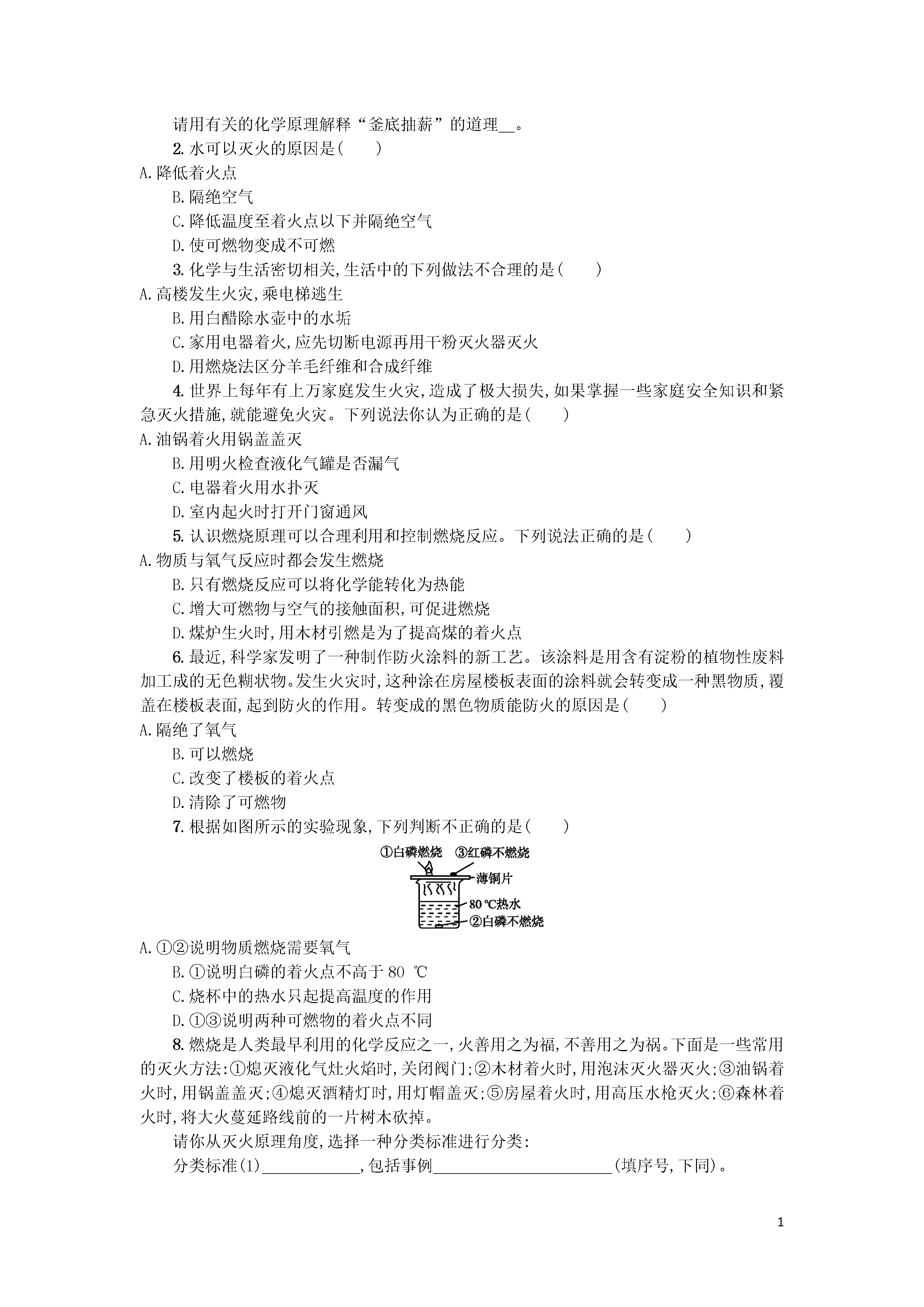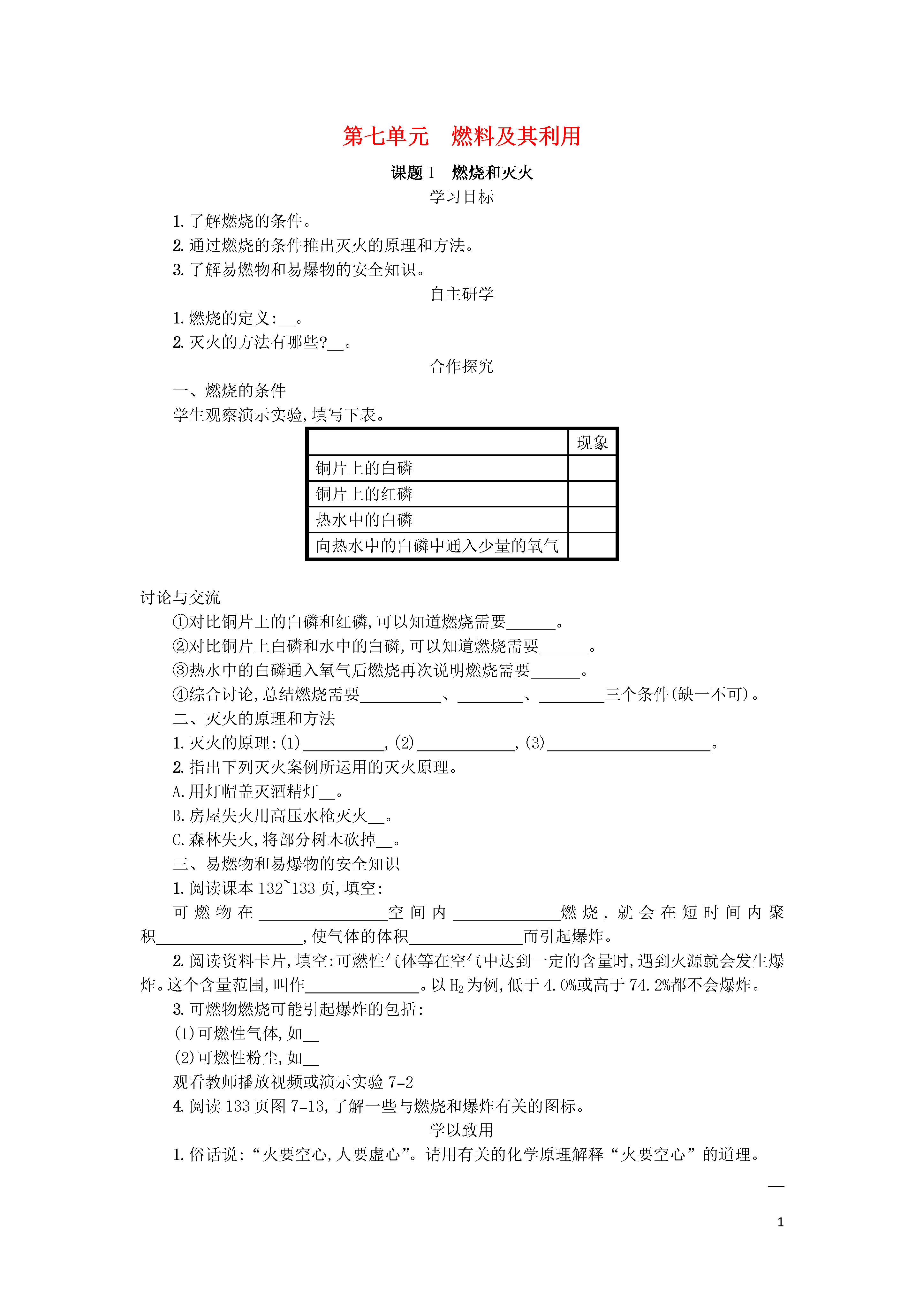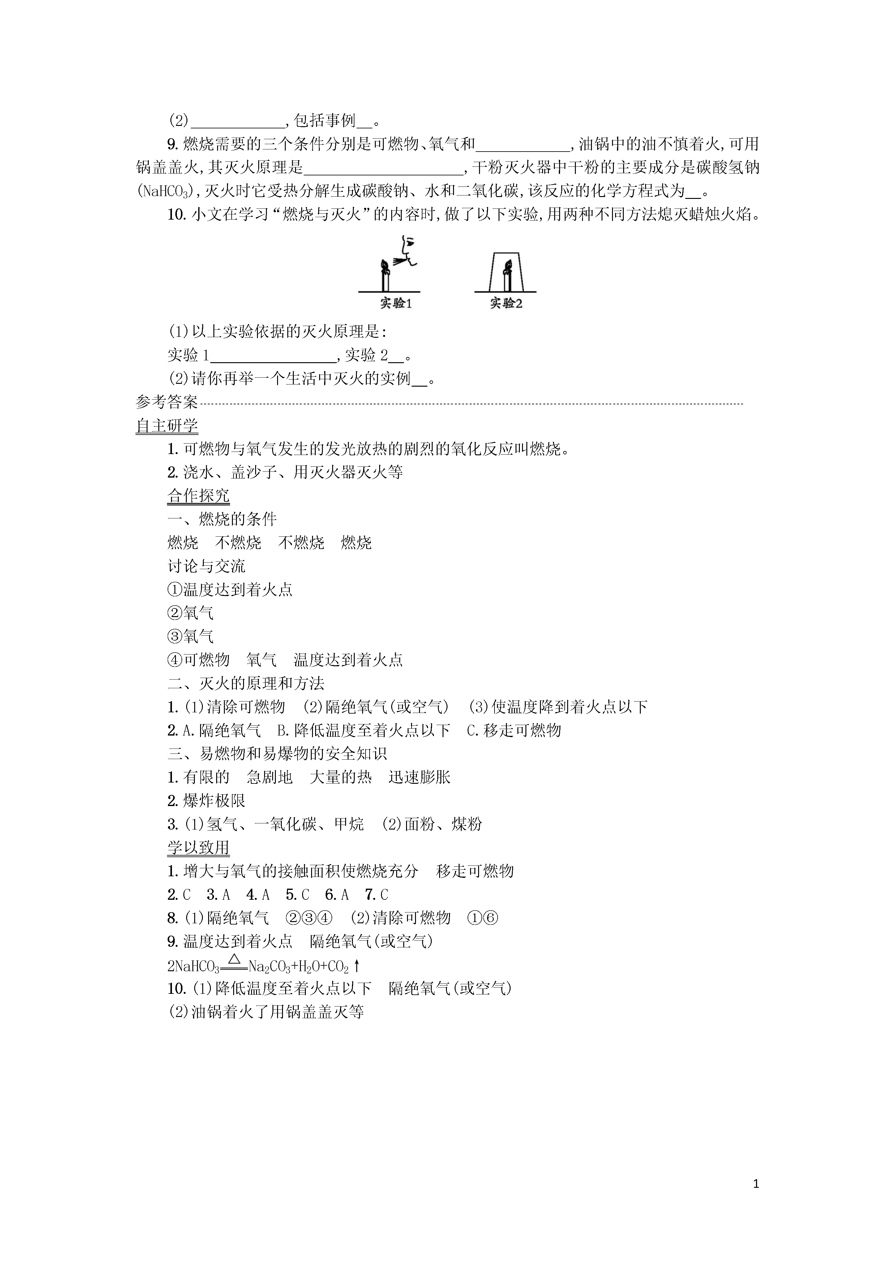 1第七单元燃料及其利用课题1燃烧和灭火学习目标1.了解燃烧的条件。2.通过燃烧的条件推出灭火的原理和方法。3.了解易燃物和易爆物的安全知识。自主研学1.燃烧的定义:。2.灭火的方法有哪些?。合作探究一、燃烧的条件学生观察演示实验,填写下表。现象铜片上的白磷铜片上的红磷热水中的白磷向热水中的白磷中通入少量的氧气讨论与交流①对比铜片上的白磷和红磷,可以知道燃烧需要。②对比铜片上白磷和水中的白磷,可以知道燃烧需要。③热水中的白磷通入氧气后燃烧再次说明燃烧需要。④综合讨论,总结燃烧需要、、三个条件(缺一不可)。二、灭火的原理和方法1.灭火的原理:(1),(2),(3)。2.指出下列灭火案例所运用的灭火原理。A.用灯帽盖灭酒精灯。B.房屋失火用高压水枪灭火。C.森林失火,将部分树木砍掉。三、易燃物和易爆物的安全知识1.阅读课本132~133页,填空:可燃物在空间内燃烧,就会在短时间内聚积,使气体的体积而引起爆炸。2.阅读资料卡片,填空:可燃性气体等在空气中达到一定的含量时,遇到火源就会发生爆炸。这个含量范围,叫作。以H2为例,低于4.0%或高于74.2%都不会爆炸。3.可燃物燃烧可能引起爆炸的包括:(1)可燃性气体,如(2)可燃性粉尘,如观看教师播放视频或演示实验724.阅读133页图713,了解一些与燃烧和爆炸有关的图标。学以致用1.俗话说:“火要空心,人要虚心”。请用有关的化学原理解释“火要空心”的道理。请用有关的化学原理解释“釜底抽薪”的道理。2.水可以灭火的原因是()A.降低着火点B.隔绝空气C.降低温度至着火点以下并隔绝空气D.使可燃物变成不可燃3.化学与生活密切相关,生活中的下列做法不合理的是()A.高楼发生火灾,乘电梯逃生B.用白醋除水壶中的水垢C.家用电器着火,应先切断电源再用干粉灭火器灭火D.用燃烧法区分羊毛纤维和合成纤维4.世界上每年有上万家庭发生火灾,造成了极大损失,如果掌握一些家庭安全知识和紧急灭火措施,就能避免火灾。下列说法你认为正确的是()A.油锅着火用锅盖盖灭B.用明火检查液化气罐是否漏气C.电器着火用水扑灭D.室内起火时打开门窗通风5.认识燃烧原理可以合理利用和控制燃烧反应。下列说法正确的是()A.物质与氧气反应时都会发生燃烧B.只有燃烧反应可以将化学能转化为热能C.增大可燃物与空气的接触面积,可促进燃烧D.煤炉生火时,用木材引燃是为了提高煤的着火点6.最近,科学家发明了一种制作防火涂料的新工艺。该涂料是用含有淀粉的植物性废料加工成的无色糊状物。发生火灾时,这种涂在房屋楼板表面的涂料就会转变成一种黑物质,覆盖在楼板表面,起到防火的作用。转变成的黑色物质能防火的原因是()A.隔绝了氧气B.可以燃烧C.改变了楼板的着火点D.清除了可燃物7.根据如图所示的实验现象,下列判断不正确的是()A.①②说明物质燃烧需要氧气B.①说明白磷的着火点不高于80℃C.烧杯中的热水只起提高温度的作用D.①③说明两种可燃物的着火点不同8.燃烧是人类最早利用的化学反应之一,火善用之为福,不善用之为祸。下面是一些常用的灭火方法:①熄灭液化气灶火焰时,关闭阀门;②木材着火时,用泡沫灭火器灭火;③油锅着火时,用锅盖盖灭;④熄灭酒精灯时,用灯帽盖灭;⑤房屋着火时,用高压水枪灭火;⑥森林着火时,将大火蔓延路线前的一片树木砍掉。请你从灭火原理角度,选择一种分类标准进行分类:分类标准(1),包括事例(填序号,下同)。(2),包括事例。9.燃烧需要的三个条件分别是可燃物、氧气和,油锅中的油不慎着火,可用锅盖盖火,其灭火原理是,干粉灭火器中干粉的主要成分是碳酸氢钠(NaHCO3),灭火时它受热分解生成碳酸钠、水和二氧化碳,该反应的化学方程式为。10.小文在学习“燃烧与灭火”的内容时,做了以下实验,用两种不同方法熄灭蜡烛火焰。(1)以上实验依据的灭火原理是:实验1,实验2。(2)请你再举一个生活中灭火的实例。参考答案自主研学1.可燃物与氧气发生的发光放热的剧烈的氧化反应叫燃烧。2.浇水、盖沙子、用灭火器灭火等合作探究一、燃烧的条件燃烧不燃烧不燃烧燃烧讨论与交流①温度达到着火点②氧气③氧气④可燃物氧气温度达到着火点二、灭火的原理和方法1.(1)清除可燃物(2)隔绝氧气(或空气)(3)使温度降到着火点以下2.A.隔绝氧气B.降低温度至着火点以下C.移走可燃物三、易燃物和易爆物的安全知识1.有限的急剧地大量的热迅速膨胀2.爆炸极限3.(1)氢气、一氧化碳、甲烷(2)面粉、煤粉学以致用1.增大与氧气的接触面积使燃烧充分