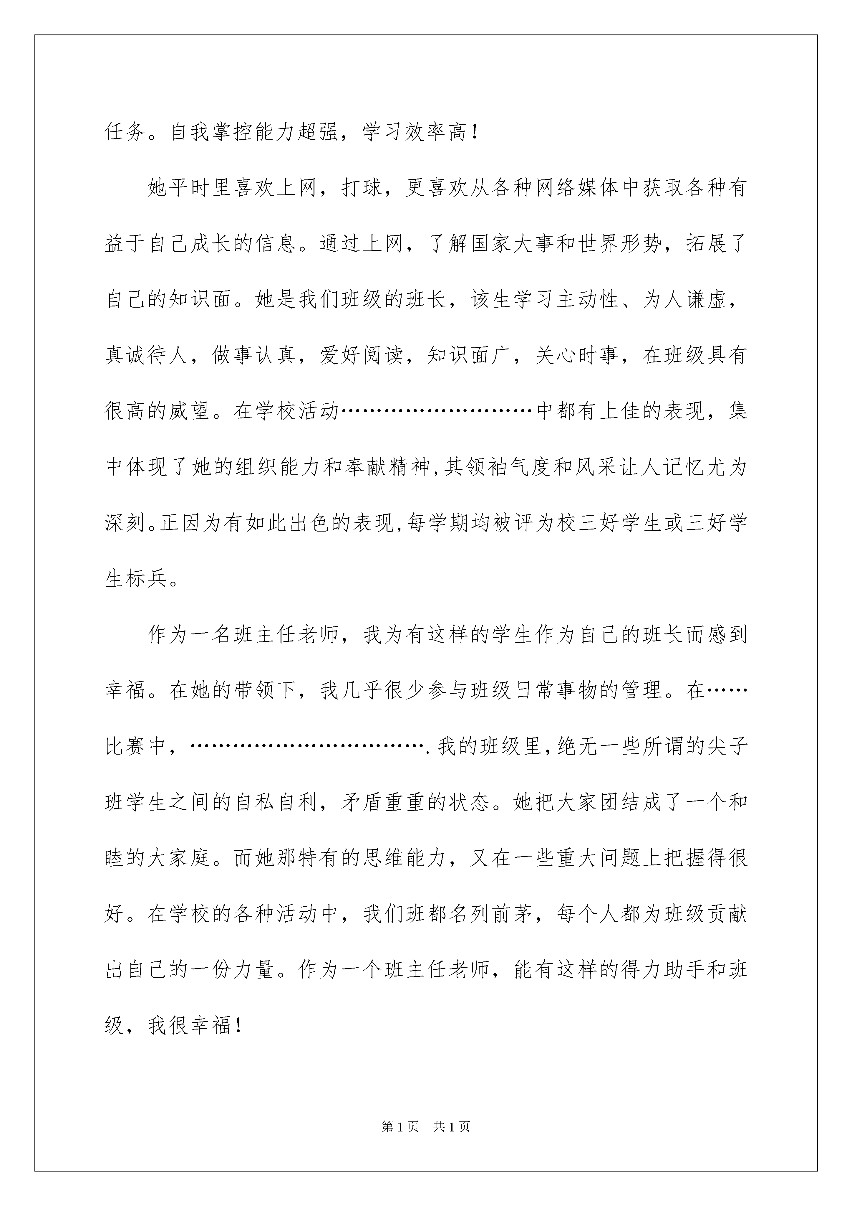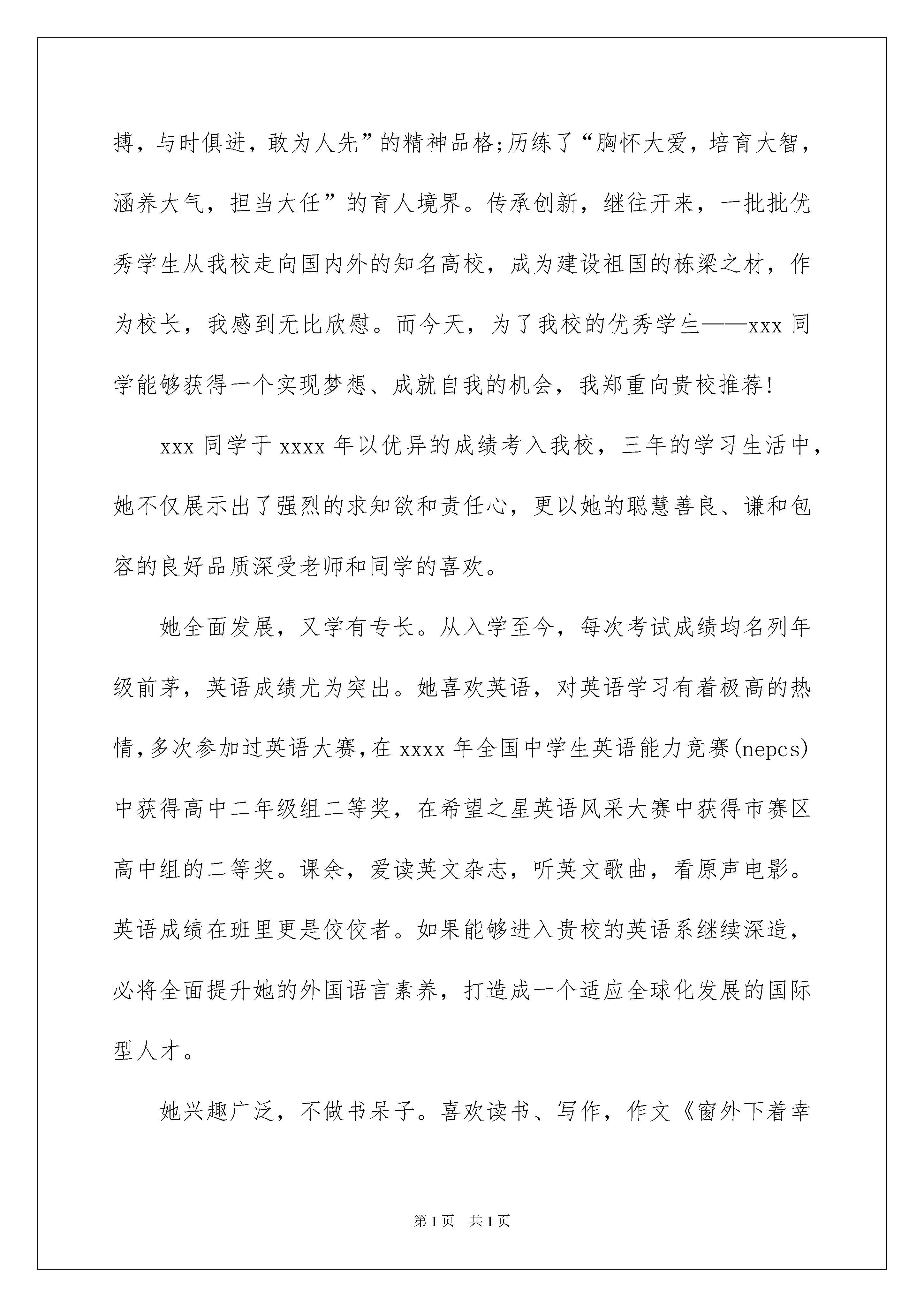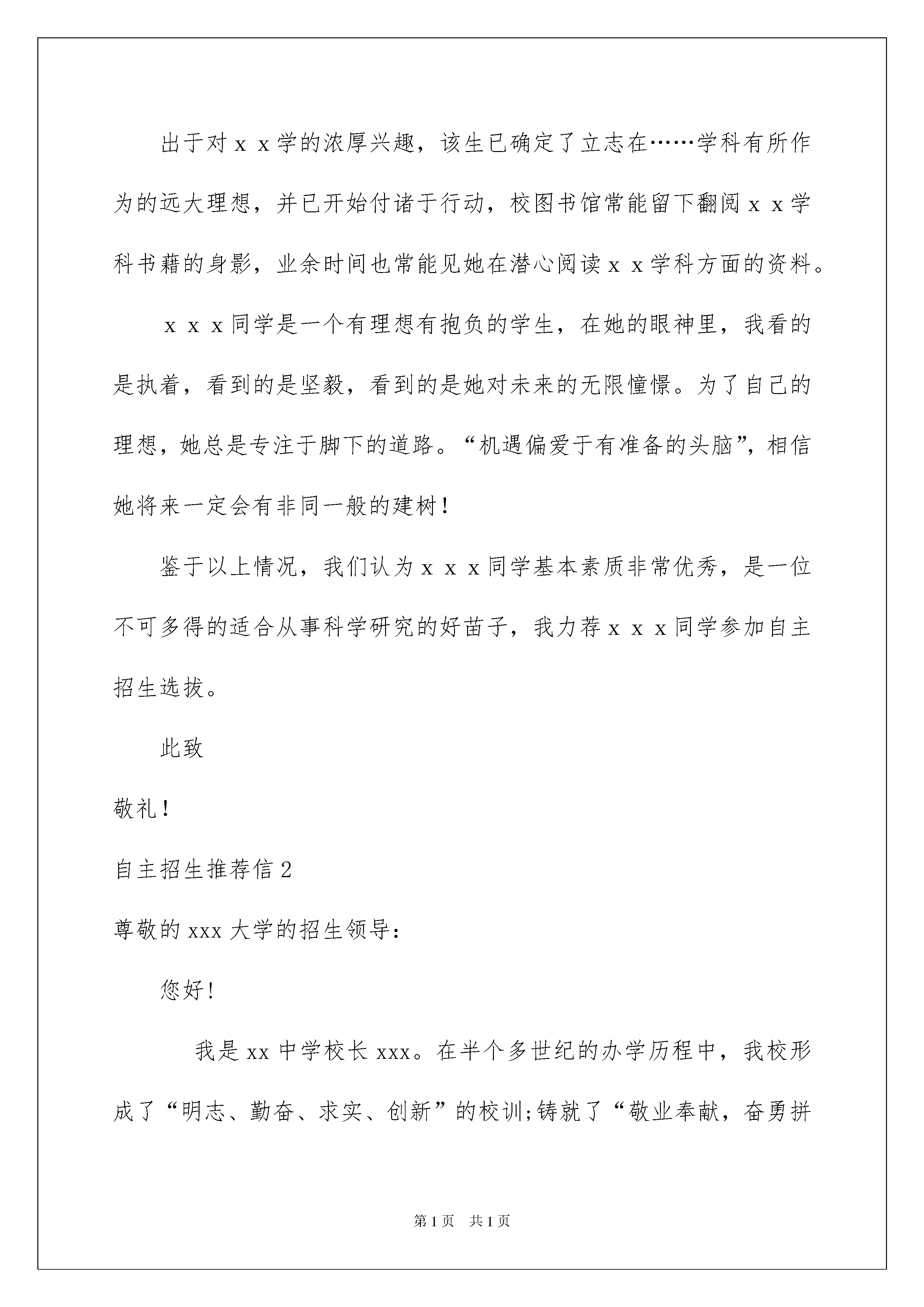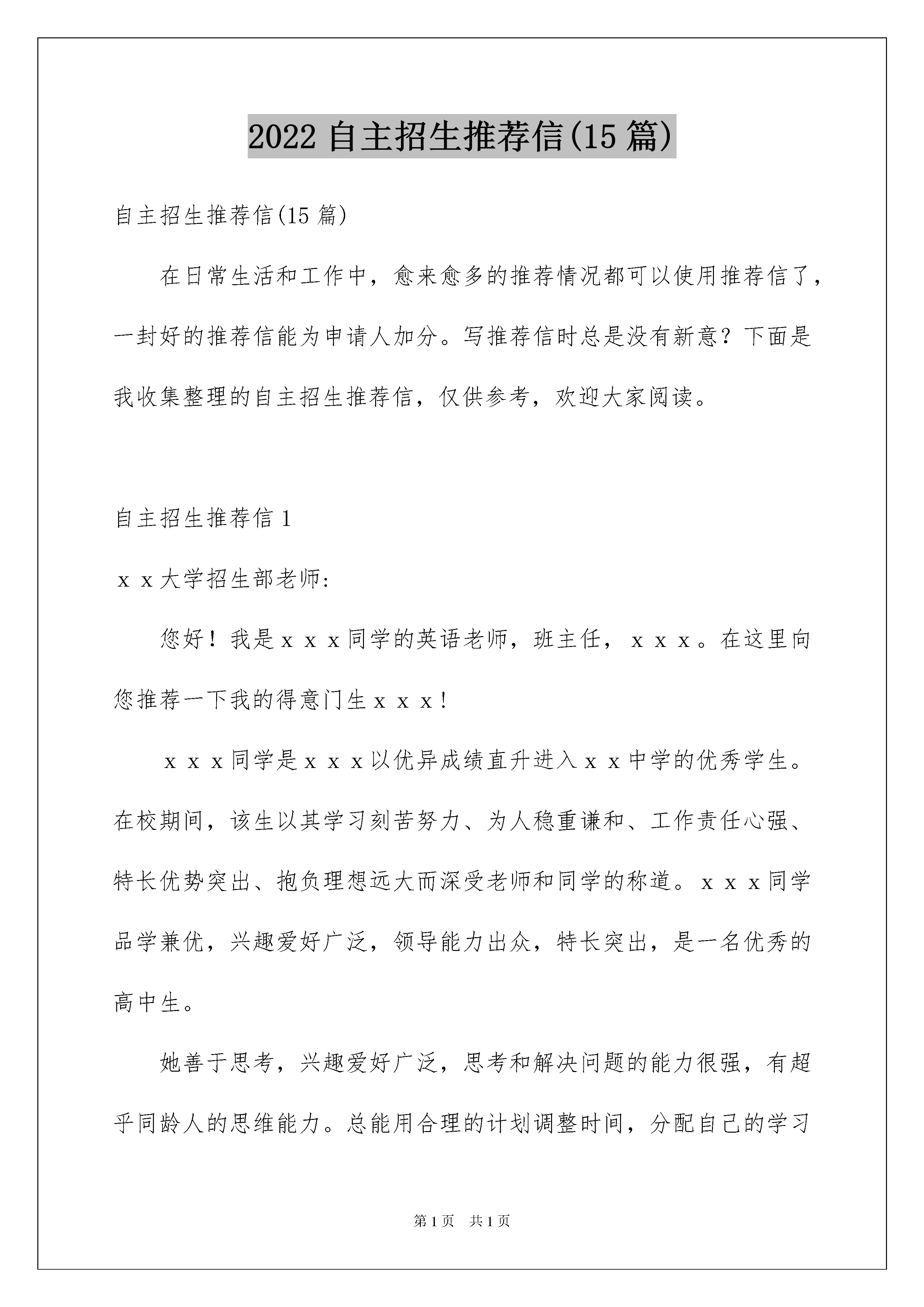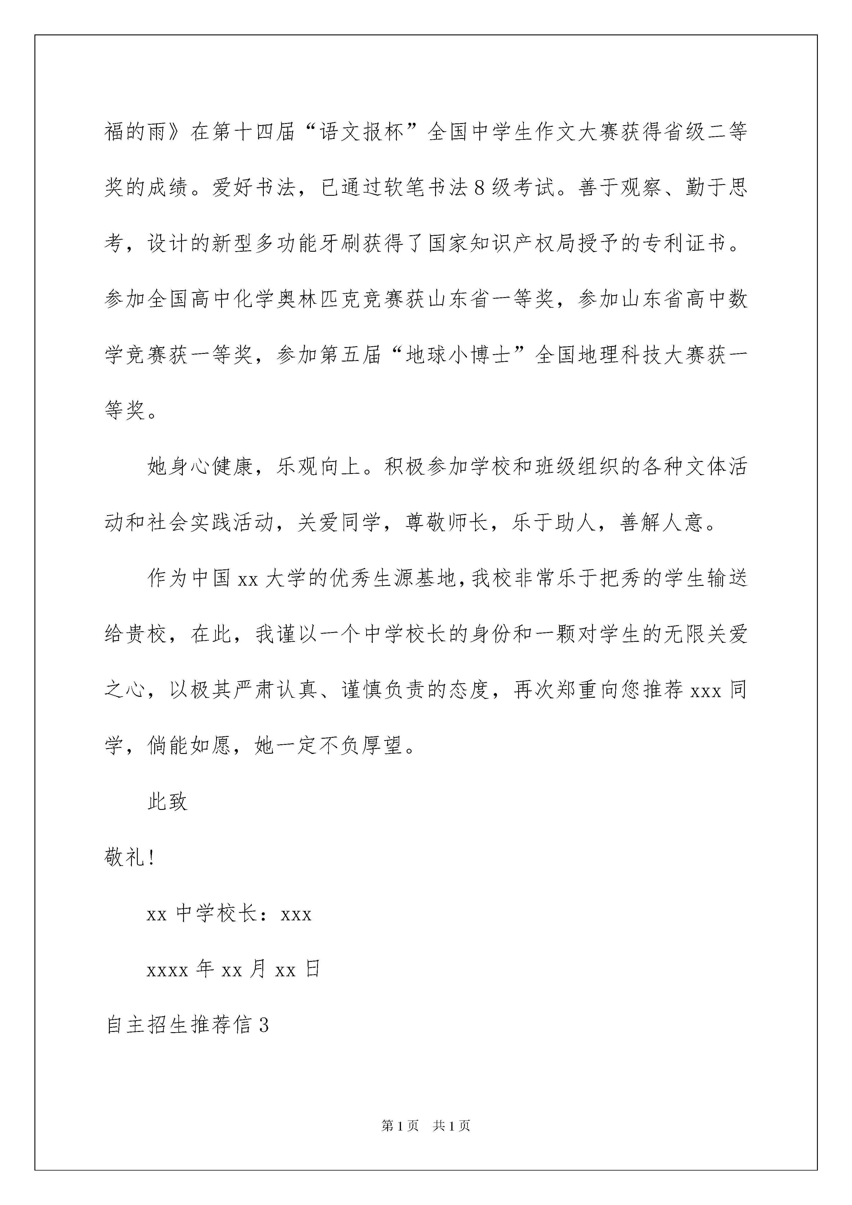 2022自主招生推荐信(15篇)自主招生推荐信(15篇)在日常生活和工作中,愈来愈多的推荐情况都可以使用推荐信了,一封好的推荐信能为申请人加分。写推荐信时总是没有新意?下面是我收集整理的自主招生推荐信,仅供参考,欢迎大家阅读。自主招生推荐信1xx大学招生部老师:您好!我是xxx同学的英语老师,班主任,xxx。在这里向您推荐一下我的得意门生xxx!xxx同学是xxx以优异成绩直升进入xx中学的优秀学生。在校期间,该生以其学习刻苦努力、为人稳重谦和、工作责任心强、特长优势突出、抱负理想远大而深受老师和同学的称道。xxx同学品学兼优,兴趣爱好广泛,领导能力出众,特长突出,是一名优秀的高中生。她善于思考,兴趣爱好广泛,思考和解决问题的能力很强,有超乎同龄人的思维能力。总能用合理的计划调整时间,分配自己的学习任务。自我掌控能力超强,学习效率高!她平时里喜欢上网,打球,更喜欢从各种网络媒体中获取各种有益于自己成长的信息。通过上网,了解国家大事和世界形势,拓展了自己的知识面。她是我们班级的班长,该生学习主动性、为人谦虚,真诚待人,做事认真,爱好阅读,知识面广,关心时事,在班级具有很高的威望。在学校活动………………………中都有上佳的表现,集中体现了她的组织能力和奉献精神,其领袖气度和风采让人记忆尤为深刻。正因为有如此出色的表现,每学期均被评为校三好学生或三好学生标兵。作为一名班主任老师,我为有这样的学生作为自己的班长而感到幸福。在她的带领下,我几乎很少参与班级日常事物的管理。在……比赛中,…………………………….我的班级里,绝无一些所谓的尖子班学生之间的自私自利,矛盾重重的状态。她把大家团结成了一个和睦的大家庭。而她那特有的思维能力,又在一些重大问题上把握得很好。在学校的各种活动中,我们班都名列前茅,每个人都为班级贡献出自己的一份力量。作为一个班主任老师,能有这样的得力助手和班级,我很幸福!出于对xx学的浓厚兴趣,该生已确定了立志在……学科有所作为的远大理想,并已开始付诸于行动,校图书馆常能留下翻阅xx学科书藉的身影,业余时间也常能见她在潜心阅读xx学科方面的资料。xxx同学是一个有理想有抱负的学生,在她的眼神里,我看的是执着,看到的是坚毅,看到的是她对未来的无限憧憬。为了自己的理想,她总是专注于脚下的道路。“机遇偏爱于有准备的头脑”,相信她将来一定会有非同一般的建树!鉴于以上情况,我们认为xxx同学基本素质非常优秀,是一位不可多得的适合从事科学研究的好苗子,我力荐xxx同学参加自主招生选拔。此致敬礼!自主招生推荐信2尊敬的xxx大学的招生领导:您好!我是xx中学校长xxx。在半个多世纪的办学历程中,我校形成了“明志、勤奋、求实、创新”的校训;铸就了“敬业奉献,奋勇拼搏,与时俱进,敢为人先”的精神品格;历练了“胸怀大爱,培育大智,涵养大气,担当大任”的育人境界。传承创新,继往开来,一批批优秀学生从我校走向国内外的知名高校,成为建设祖国的栋梁之材,作为校长,我感到无比欣慰。而今天,为了我校的优秀学生——xxx同学能够获得一个实现梦想、成就自我的机会,我郑重向贵校推荐!xxx同学于xxxx年以优异的成绩考入我校,三年的学习生活中,她不仅展示出了强烈的求知欲和责任心,更以她的聪慧善良、谦和包容的良好品质深受老师和同学的喜欢。她全面发展,又学有专长。从入学至今,每次考试成绩均名列年级前茅,英语成绩尤为突出。她喜欢英语,对英语学习有着极高的热情,多次参加过英语大赛,在xxxx年全国中学生英语能力竞赛(nepcs)中获得高中二年级组二等奖,在希望之星英语风采大赛中获得市赛区高中组的二等奖。课余,爱读英文杂志,听英文歌曲,看原声电影。英语成绩在班里更是佼佼者。如果能够进入贵校的英语系继续深造,必将全面提升她的外国语言素养,打造成一个适应全球化发展的国际型人才。她兴趣广泛,不做书呆子。喜欢读书、写作,作文《窗外下着幸福的雨》在第十四届“语文报杯”全国中学生作文大赛获得省级二等奖的成绩。爱好书法,已通过软笔书法8级考试。善于观察、勤于思考,设计的新型多功能牙刷获得了国家知识产权局授予的专利证书。参加全国高中化学奥林匹克竞赛获山东省一等奖,参加山东省高中数学竞赛获一等奖,参加第五届“地球小博士”全国地理科技大赛获一等奖。她身心健康,乐观向上。积极参加学校和班级组织的各种文体活动和社会实践活动,关爱同学,尊敬师长,乐于助人,善解人意。作为中国xx大学的优秀生源基地,我校非常乐于把秀的学生输送给贵校,在此,我谨以一个中学校长的身份和一颗对学生的无限关爱之心,以极其严肃认真、谨慎负责的态度,再次郑重向您推荐xxx