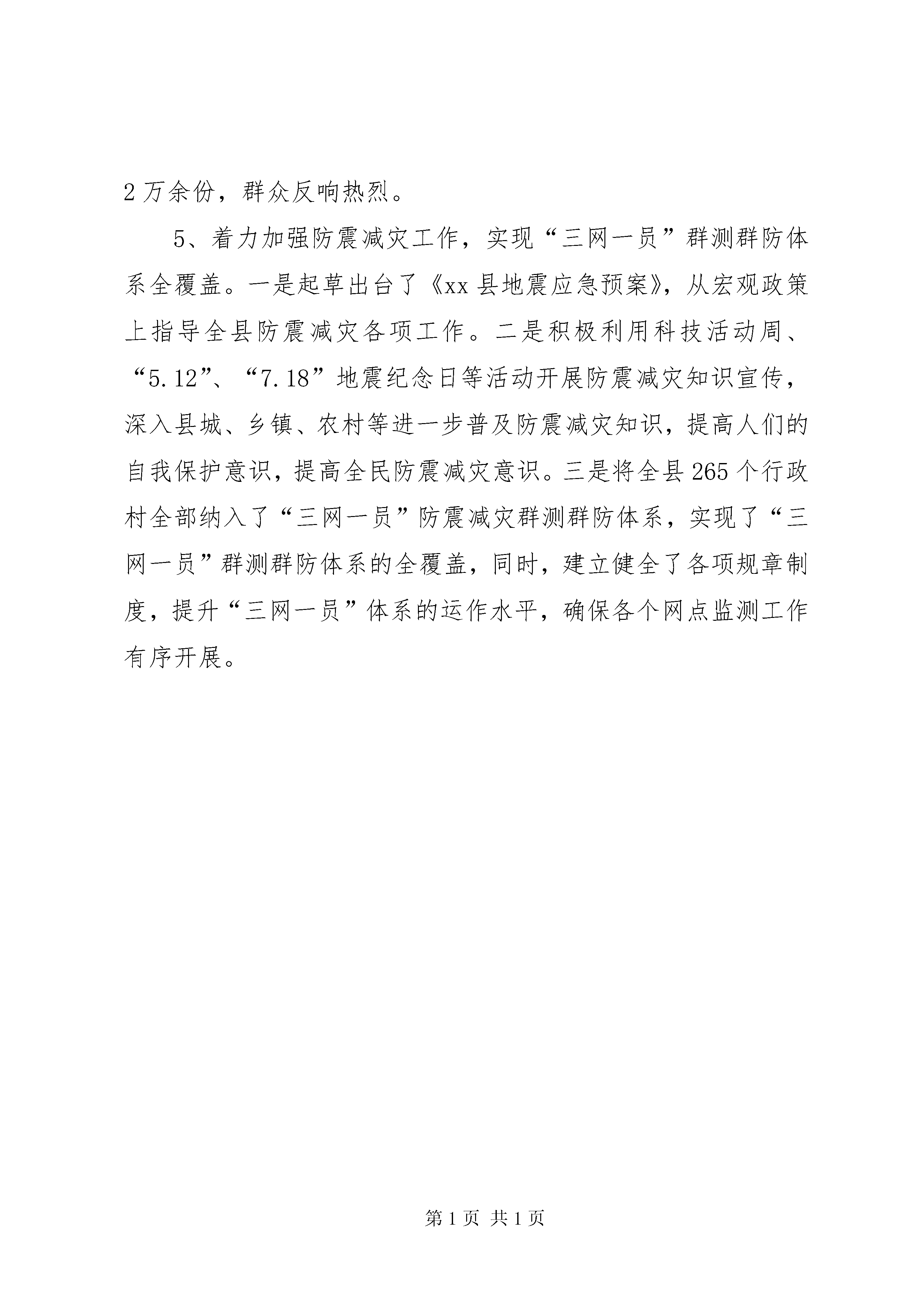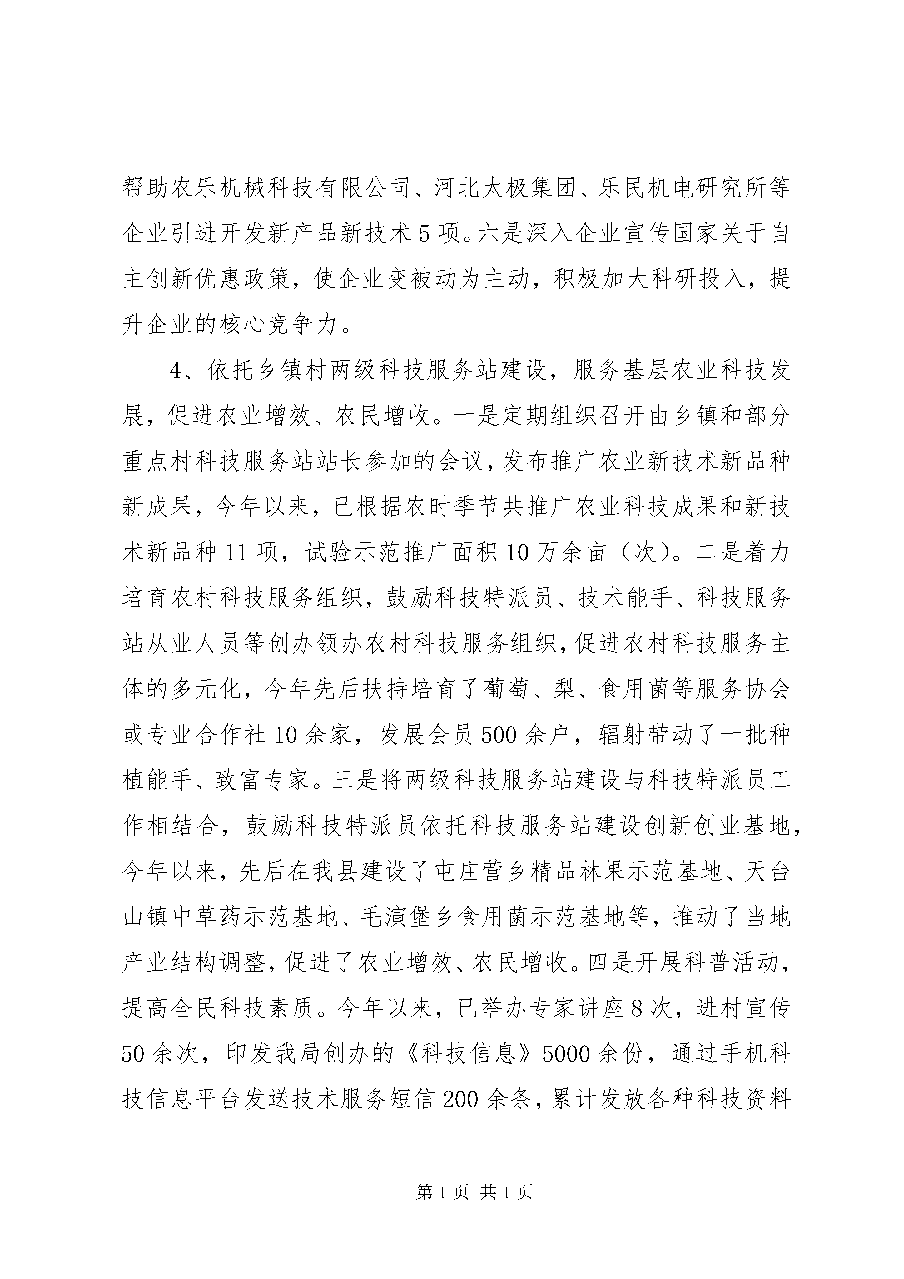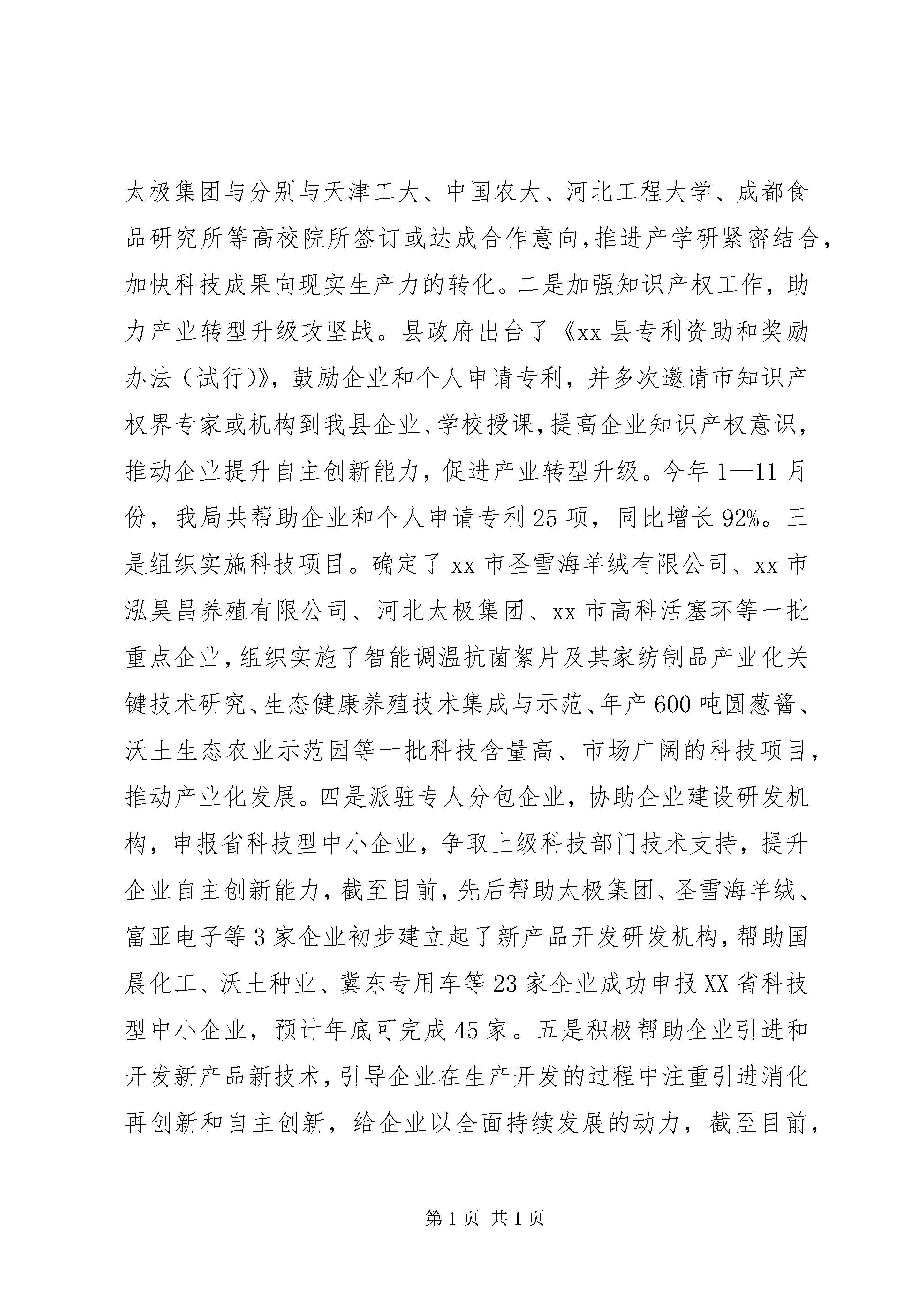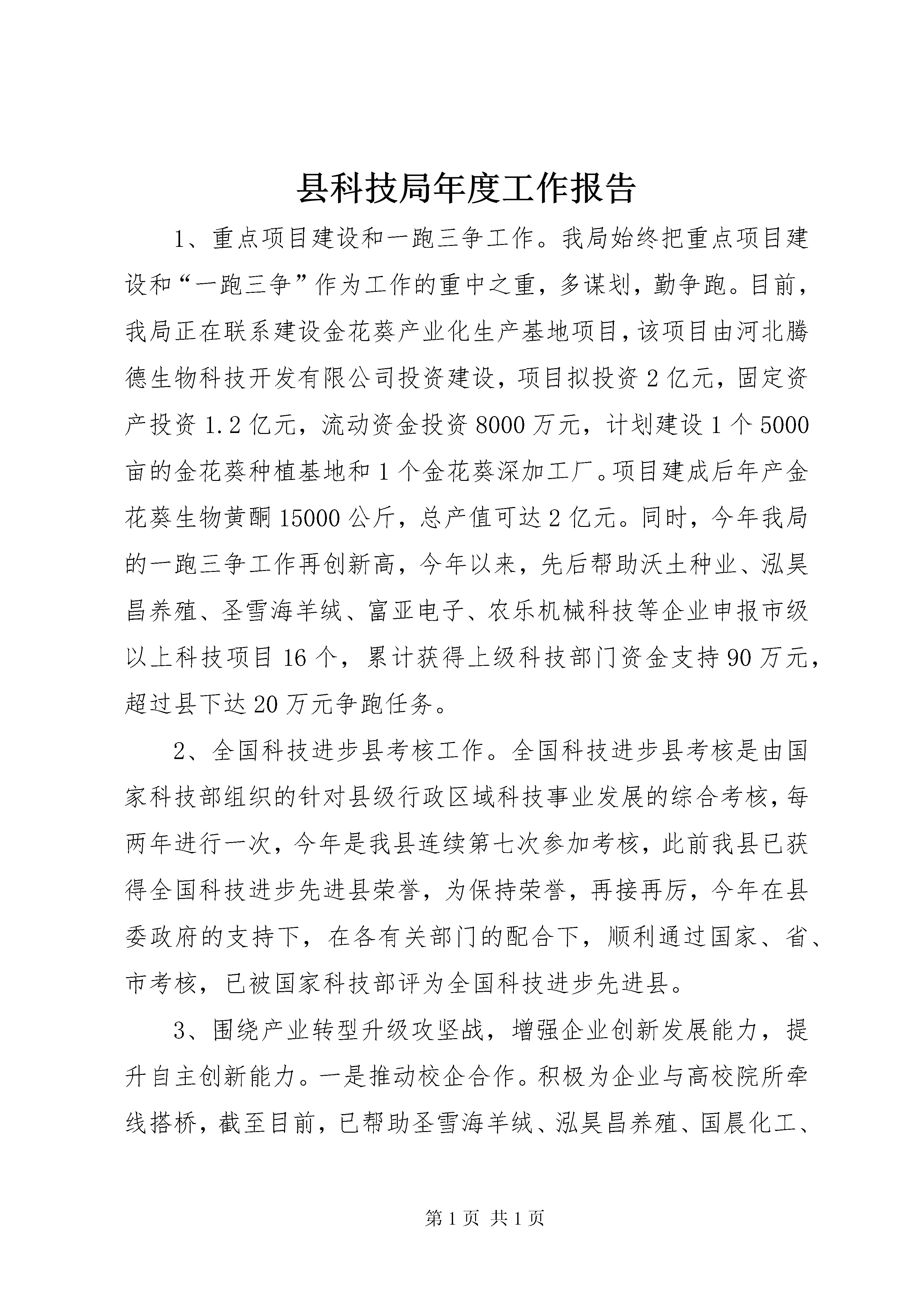 县科技局年度工作报告1、重点项目建设和一跑三争工作。我局始终把重点项目建设和“一跑三争”作为工作的重中之重,多谋划,勤争跑。目前,我局正在联系建设金花葵产业化生产基地项目,该项目由河北腾德生物科技开发有限公司投资建设,项目拟投资2亿元,固定资产投资1.2亿元,流动资金投资8000万元,计划建设1个5000亩的金花葵种植基地和1个金花葵深加工厂。项目建成后年产金花葵生物黄酮15000公斤,总产值可达2亿元。同时,今年我局的一跑三争工作再创新高,今年以来,先后帮助沃土种业、泓昊昌养殖、圣雪海羊绒、富亚电子、农乐机械科技等企业申报市级以上科技项目16个,累计获得上级科技部门资金支持90万元,超过县下达20万元争跑任务。2、全国科技进步县考核工作。全国科技进步县考核是由国家科技部组织的针对县级行政区域科技事业发展的综合考核,每两年进行一次,今年是我县连续第七次参加考核,此前我县已获得全国科技进步先进县荣誉,为保持荣誉,再接再厉,今年在县委政府的支持下,在各有关部门的配合下,顺利通过国家、省、市考核,已被国家科技部评为全国科技进步先进县。3、围绕产业转型升级攻坚战,增强企业创新发展能力,提升自主创新能力。一是推动校企合作。积极为企业与高校院所牵线搭桥,截至目前,已帮助圣雪海羊绒、泓昊昌养殖、国晨化工、太极集团与分别与天津工大、中国农大、河北工程大学、成都食品研究所等高校院所签订或达成合作意向,推进产学研紧密结合,加快科技成果向现实生产力的转化。二是加强知识产权工作,助力产业转型升级攻坚战。县政府出台了《xx县专利资助和奖励办法(试行)》,鼓励企业和个人申请专利,并多次邀请市知识产权界专家或机构到我县企业、学校授课,提高企业知识产权意识,推动企业提升自主创新能力,促进产业转型升级。今年1—11月份,我局共帮助企业和个人申请专利25项,同比增长92%。三是组织实施科技项目。确定了xx市圣雪海羊绒有限公司、xx市泓昊昌养殖有限公司、河北太极集团、xx市高科活塞环等一批重点企业,组织实施了智能调温抗菌絮片及其家纺制品产业化关键技术研究、生态健康养殖技术集成与示范、年产600吨圆葱酱、沃土生态农业示范园等一批科技含量高、市场广阔的科技项目,推动产业化发展。四是派驻专人分包企业,协助企业建设研发机构,申报省科技型中小企业,争取上级科技部门技术支持,提升企业自主创新能力,截至目前,先后帮助太极集团、圣雪海羊绒、富亚电子等3家企业初步建立起了新产品开发研发机构,帮助国晨化工、沃土种业、冀东专用车等23家企业成功申报XX省科技型中小企业,预计年底可完成45家。五是积极帮助企业引进和开发新产品新技术,引导企业在生产开发的过程中注重引进消化再创新和自主创新,给企业以全面持续发展的动力,截至目前,帮助农乐机械科技有限公司、河北太极集团、乐民机电研究所等企业引进开发新产品新技术5项。六是深入企业宣传国家关于自主创新优惠政策,使企业变被动为主动,积极加大科研投入,提升企业的核心竞争力。4、依托乡镇村两级科技服务站建设,服务基层农业科技发展,促进农业增效、农民增收。一是定期组织召开由乡镇和部分重点村科技服务站站长参加的会议,发布推广农业新技术新品种新成果,今年以来,已根据农时季节共推广农业科技成果和新技术新品种11项,试验示范推广面积10万余亩(次)。二是着力培育农村科技服务组织,鼓励科技特派员、技术能手、科技服务站从业人员等创办领办农村科技服务组织,促进农村科技服务主体的多元化,今年先后扶持培育了葡萄、梨、食用菌等服务协会或专业合作社10余家,发展会员500余户,辐射带动了一批种植能手、致富专家。三是将两级科技服务站建设与科技特派员工作相结合,鼓励科技特派员依托科技服务站建设创新创业基地,今年以来,先后在我县建设了屯庄营乡精品林果示范基地、天台山镇中草药示范基地、毛演堡乡食用菌示范基地等,推动了当地产业结构调整,促进了农业增效、农民增收。四是开展科普活动,提高全民科技素质。今年以来,已举办专家讲座8次,进村宣传50余次,印发我局创办的《科技信息》5000余份,通过手机科技信息平台发送技术服务短信200余条,累计发放各种科技资料2万余份,群众反响热烈。5、着力加强防震减灾工作,实现“三网一员”群测群防体系全覆盖。一是起草出台了《xx县地震应急预案》,从宏观政策上指导全县防震减灾各项工作。二是积极利用科技活动周、“5.12”、“7.18”地震纪念日等活动开展防震减灾知识宣传,深入县城、乡镇、农村等进一步普及防震减灾知识,提高人们的自我保护意识,提高全民防震减灾意识。三是将全县265个行政村全部纳入了“三网一员”防震减灾群测群防体系,实现了“三网一员”群测群防体系的全覆盖,同时,建立健全了各项规章制度,提升“三网一员”体系的运作水平,确保各个网