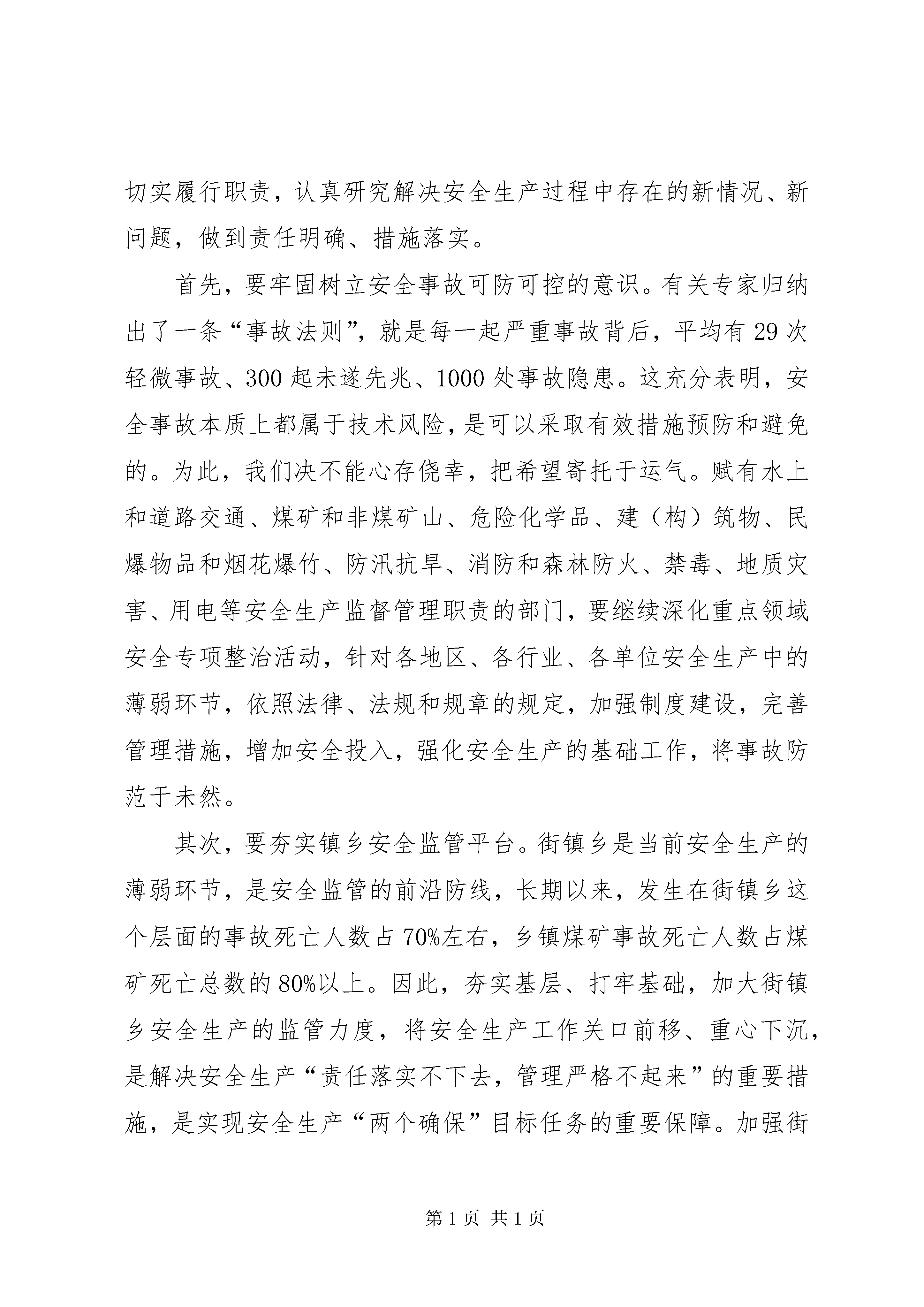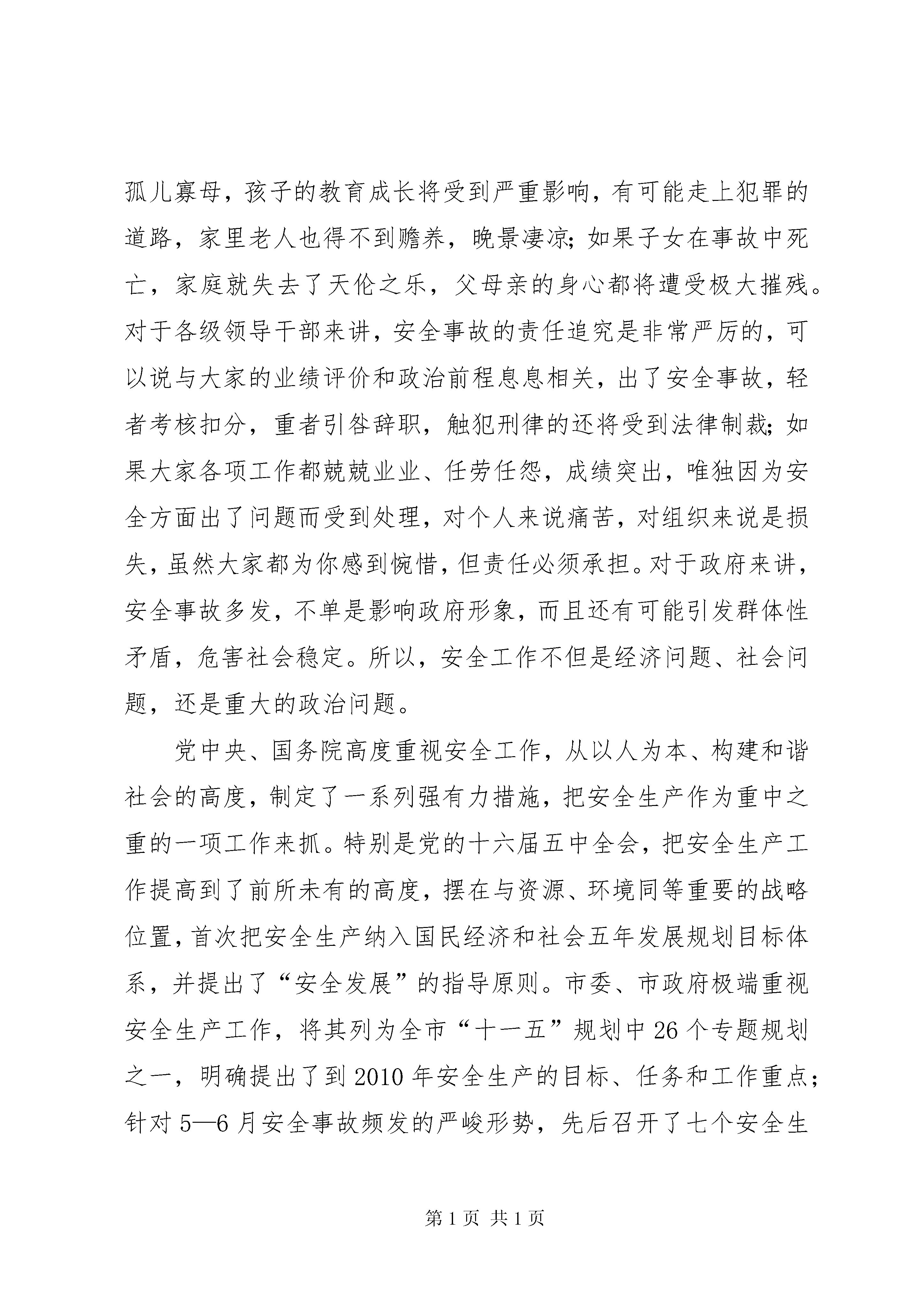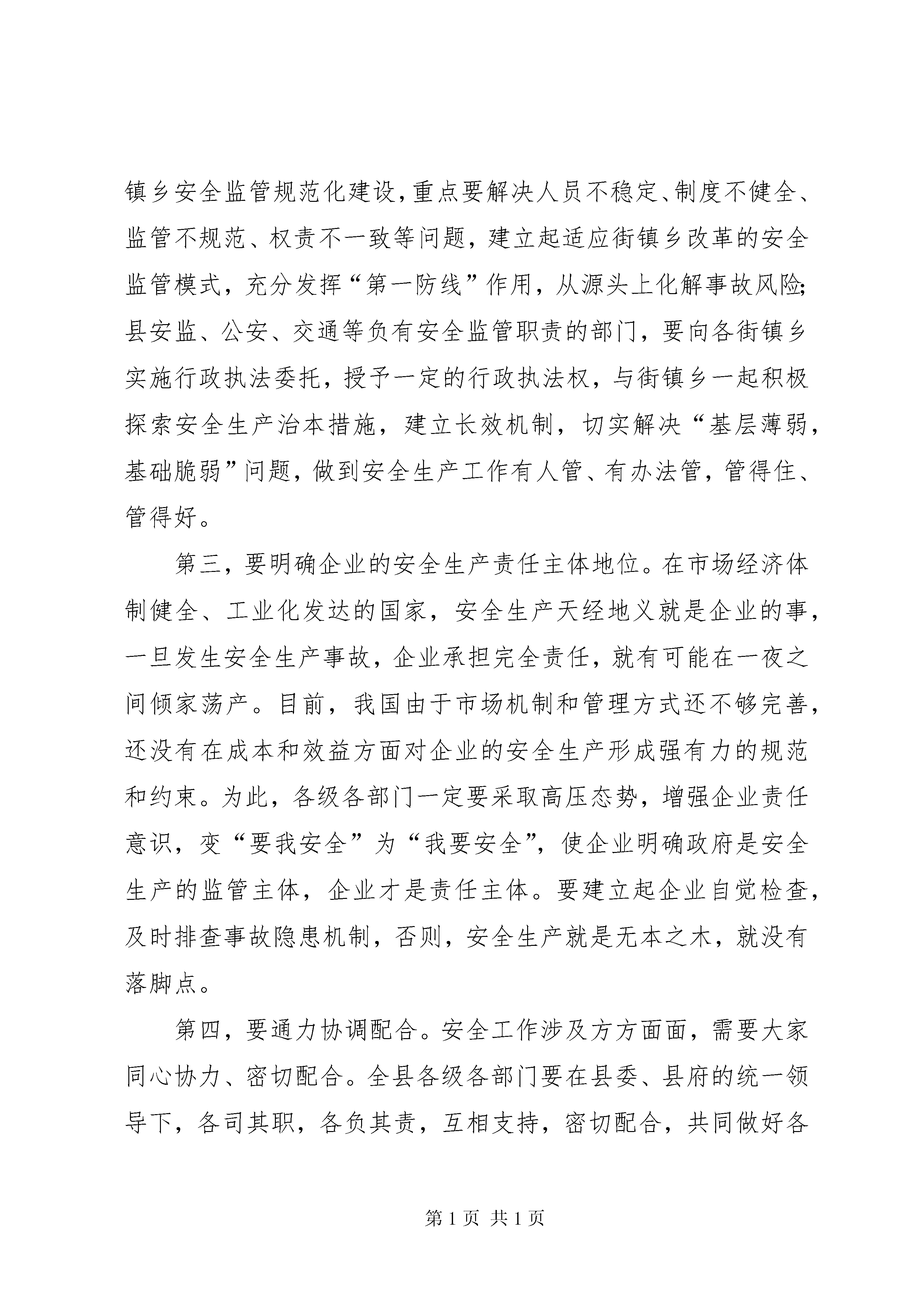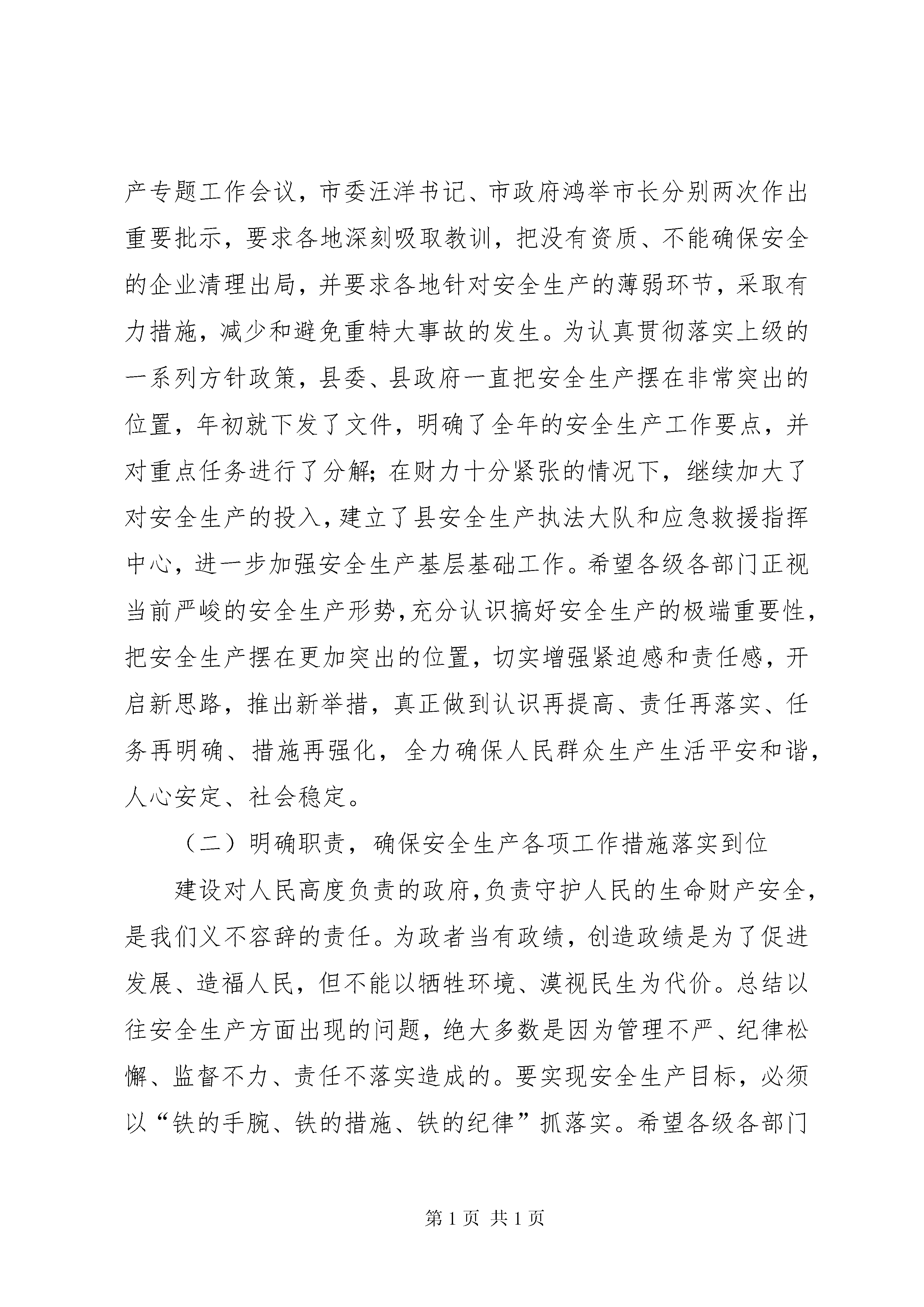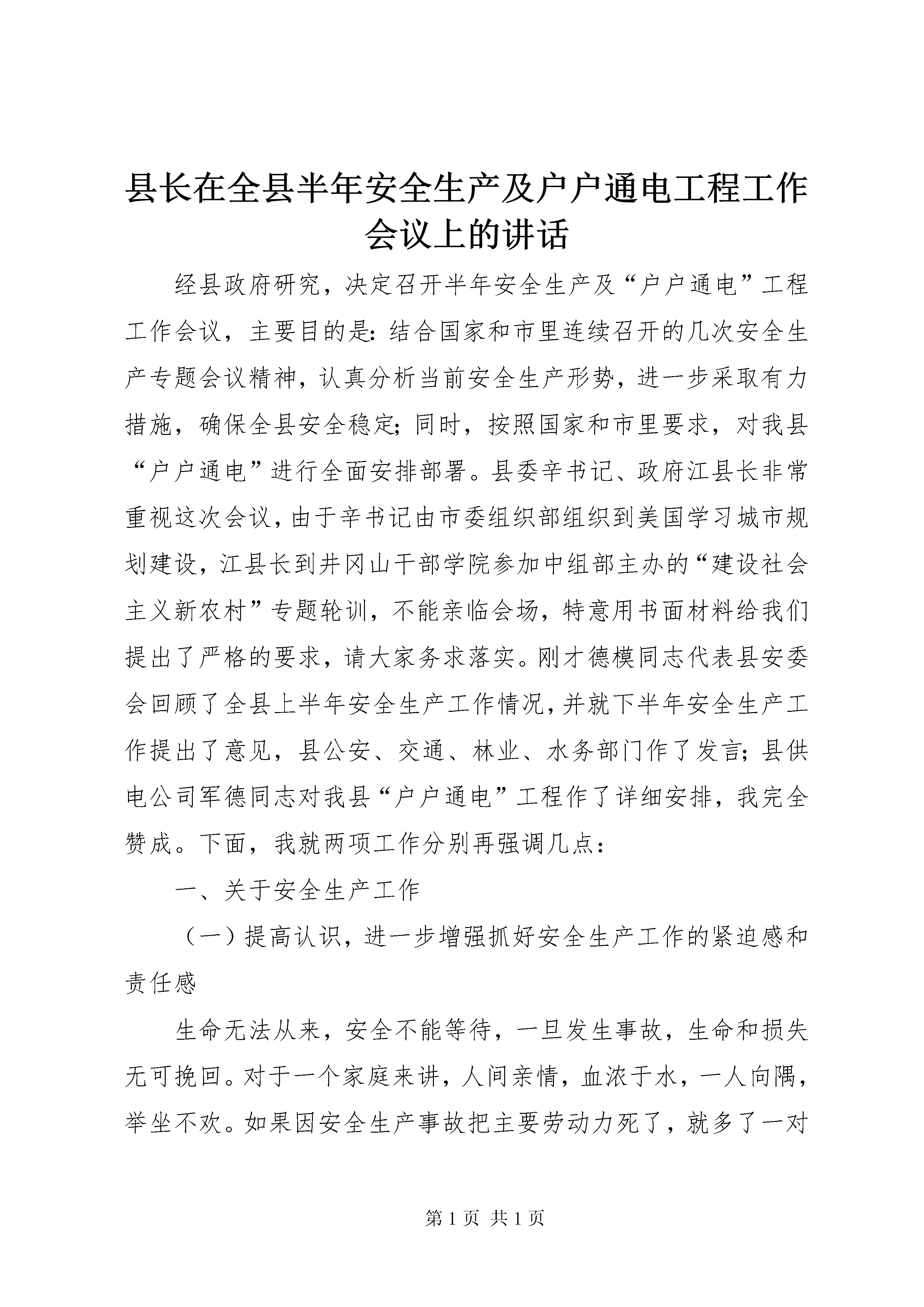 县长在全县半年安全生产及户户通电工程工作会议上的讲话经县政府研究,决定召开半年安全生产及“户户通电”工程工作会议,主要目的是:结合国家和市里连续召开的几次安全生产专题会议精神,认真分析当前安全生产形势,进一步采取有力措施,确保全县安全稳定;同时,按照国家和市里要求,对我县“户户通电”进行全面安排部署。县委辛书记、政府江县长非常重视这次会议,由于辛书记由市委组织部组织到美国学习城市规划建设,江县长到井冈山干部学院参加中组部主办的“建设社会主义新农村”专题轮训,不能亲临会场,特意用书面材料给我们提出了严格的要求,请大家务求落实。刚才德模同志代表县安委会回顾了全县上半年安全生产工作情况,并就下半年安全生产工作提出了意见,县公安、交通、林业、水务部门作了发言;县供电公司军德同志对我县“户户通电”工程作了详细安排,我完全赞成。下面,我就两项工作分别再强调几点:一、关于安全生产工作(一)提高认识,进一步增强抓好安全生产工作的紧迫感和责任感生命无法从来,安全不能等待,一旦发生事故,生命和损失无可挽回。对于一个家庭来讲,人间亲情,血浓于水,一人向隅,举坐不欢。如果因安全生产事故把主要劳动力死了,就多了一对孤儿寡母,孩子的教育成长将受到严重影响,有可能走上犯罪的道路,家里老人也得不到赡养,晚景凄凉;如果子女在事故中死亡,家庭就失去了天伦之乐,父母亲的身心都将遭受极大摧残。对于各级领导干部来讲,安全事故的责任追究是非常严厉的,可以说与大家的业绩评价和政治前程息息相关,出了安全事故,轻者考核扣分,重者引咎辞职,触犯刑律的还将受到法律制裁;如果大家各项工作都兢兢业业、任劳任怨,成绩突出,唯独因为安全方面出了问题而受到处理,对个人来说痛苦,对组织来说是损失,虽然大家都为你感到惋惜,但责任必须承担。对于政府来讲,安全事故多发,不单是影响政府形象,而且还有可能引发群体性矛盾,危害社会稳定。所以,安全工作不但是经济问题、社会问题,还是重大的政治问题。党中央、国务院高度重视安全工作,从以人为本、构建和谐社会的高度,制定了一系列强有力措施,把安全生产作为重中之重的一项工作来抓。特别是党的十六届五中全会,把安全生产工作提高到了前所未有的高度,摆在与资源、环境同等重要的战略位置,首次把安全生产纳入国民经济和社会五年发展规划目标体系,并提出了“安全发展”的指导原则。市委、市政府极端重视安全生产工作,将其列为全市“十一五”规划中26个专题规划之一,明确提出了到2010年安全生产的目标、任务和工作重点;针对5—6月安全事故频发的严峻形势,先后召开了七个安全生产专题工作会议,市委汪洋书记、市政府鸿举市长分别两次作出重要批示,要求各地深刻吸取教训,把没有资质、不能确保安全的企业清理出局,并要求各地针对安全生产的薄弱环节,采取有力措施,减少和避免重特大事故的发生。为认真贯彻落实上级的一系列方针政策,县委、县政府一直把安全生产摆在非常突出的位置,年初就下发了文件,明确了全年的安全生产工作要点,并对重点任务进行了分解;在财力十分紧张的情况下,继续加大了对安全生产的投入,建立了县安全生产执法大队和应急救援指挥中心,进一步加强安全生产基层基础工作。希望各级各部门正视当前严峻的安全生产形势,充分认识搞好安全生产的极端重要性,把安全生产摆在更加突出的位置,切实增强紧迫感和责任感,开启新思路,推出新举措,真正做到认识再提高、责任再落实、任务再明确、措施再强化,全力确保人民群众生产生活平安和谐,人心安定、社会稳定。(二)明确职责,确保安全生产各项工作措施落实到位建设对人民高度负责的政府,负责守护人民的生命财产安全,是我们义不容辞的责任。为政者当有政绩,创造政绩是为了促进发展、造福人民,但不能以牺牲环境、漠视民生为代价。总结以往安全生产方面出现的问题,绝大多数是因为管理不严、纪律松懈、监督不力、责任不落实造成的。要实现安全生产目标,必须以“铁的手腕、铁的措施、铁的纪律”抓落实。希望各级各部门切实履行职责,认真研究解决安全生产过程中存在的新情况、新问题,做到责任明确、措施落实。首先,要牢固树立安全事故可防可控的意识。有关专家归纳出了一条“事故法则”,就是每一起严重事故背后,平均有29次轻微事故、300起未遂先兆、1000处事故隐患。这充分表明,安全事故本质上都属于技术风险,是可以采取有效措施预防和避免的。为此,我们决不能心存侥幸,把希望寄托于运气。赋有水上和道路交通、煤矿和非煤矿山、危险化学品、建(构)筑物、民爆物品和烟花爆竹、防汛抗旱、消防和森林防火、禁毒、地质灾害、用电等安全生产监督管理职责的部门,要继续深化重点领域安全专项整治活动,针对各地区、各行业、各单位安全生产中的薄弱环节,依照法律、法规和规章的规定,加强制度建设,完善管理措施,增加安全投入,强化安全生产的基础