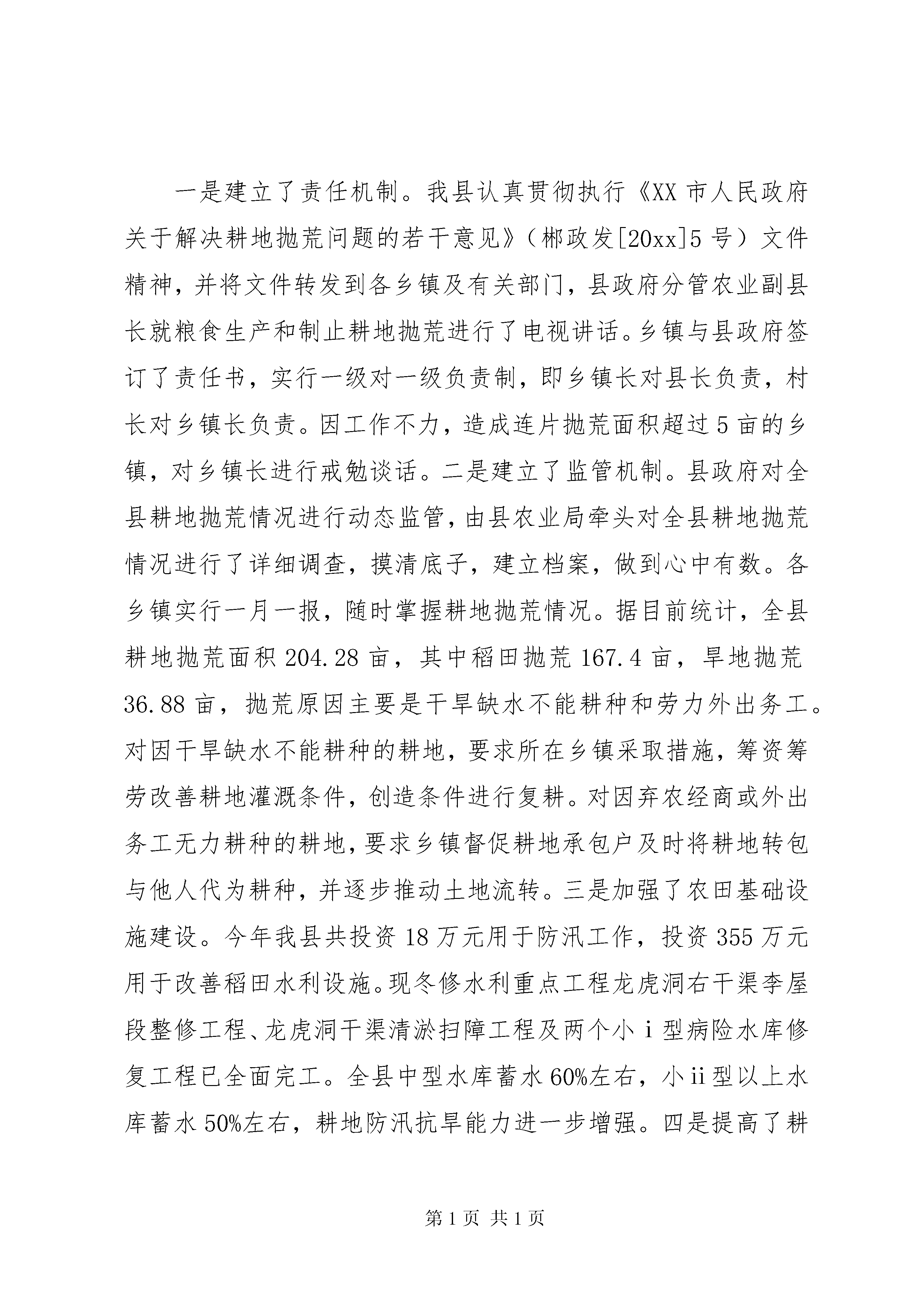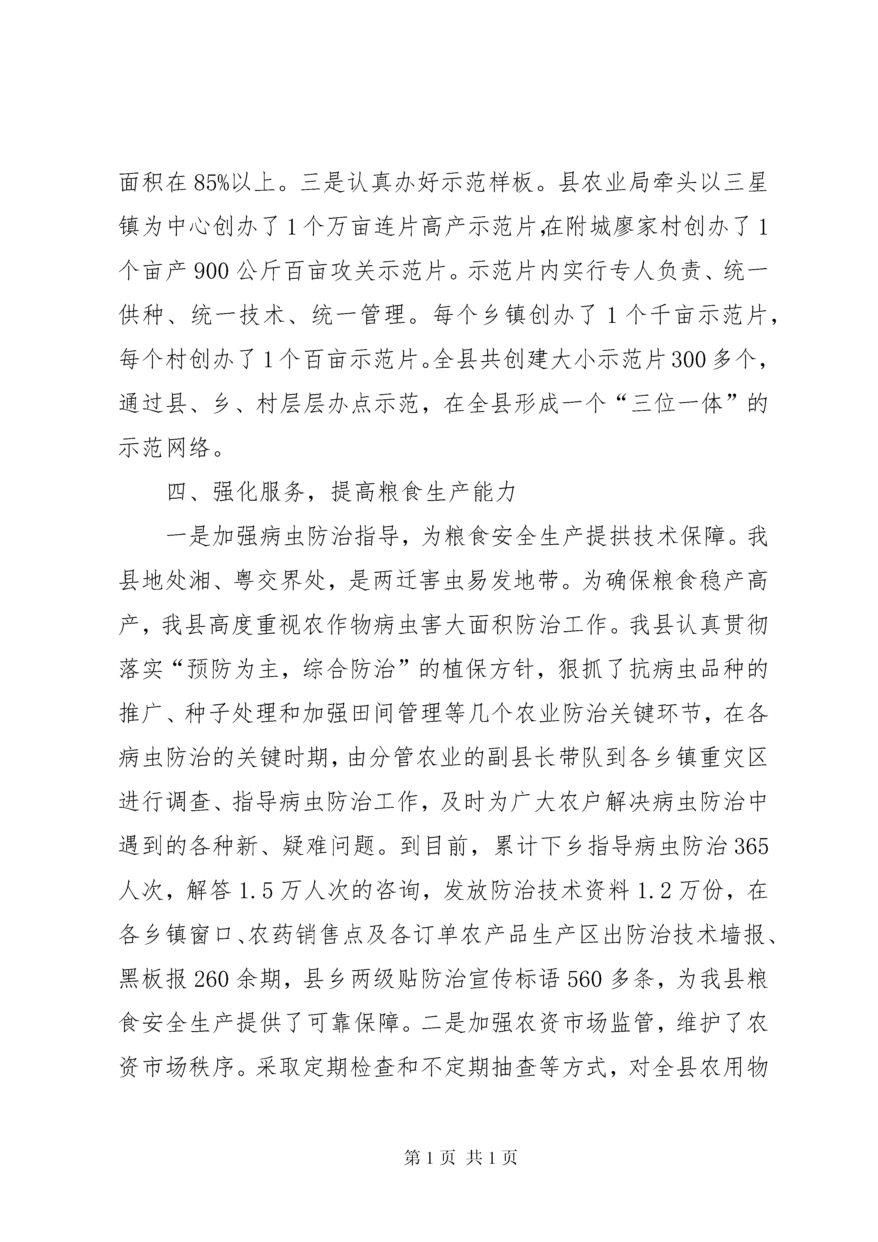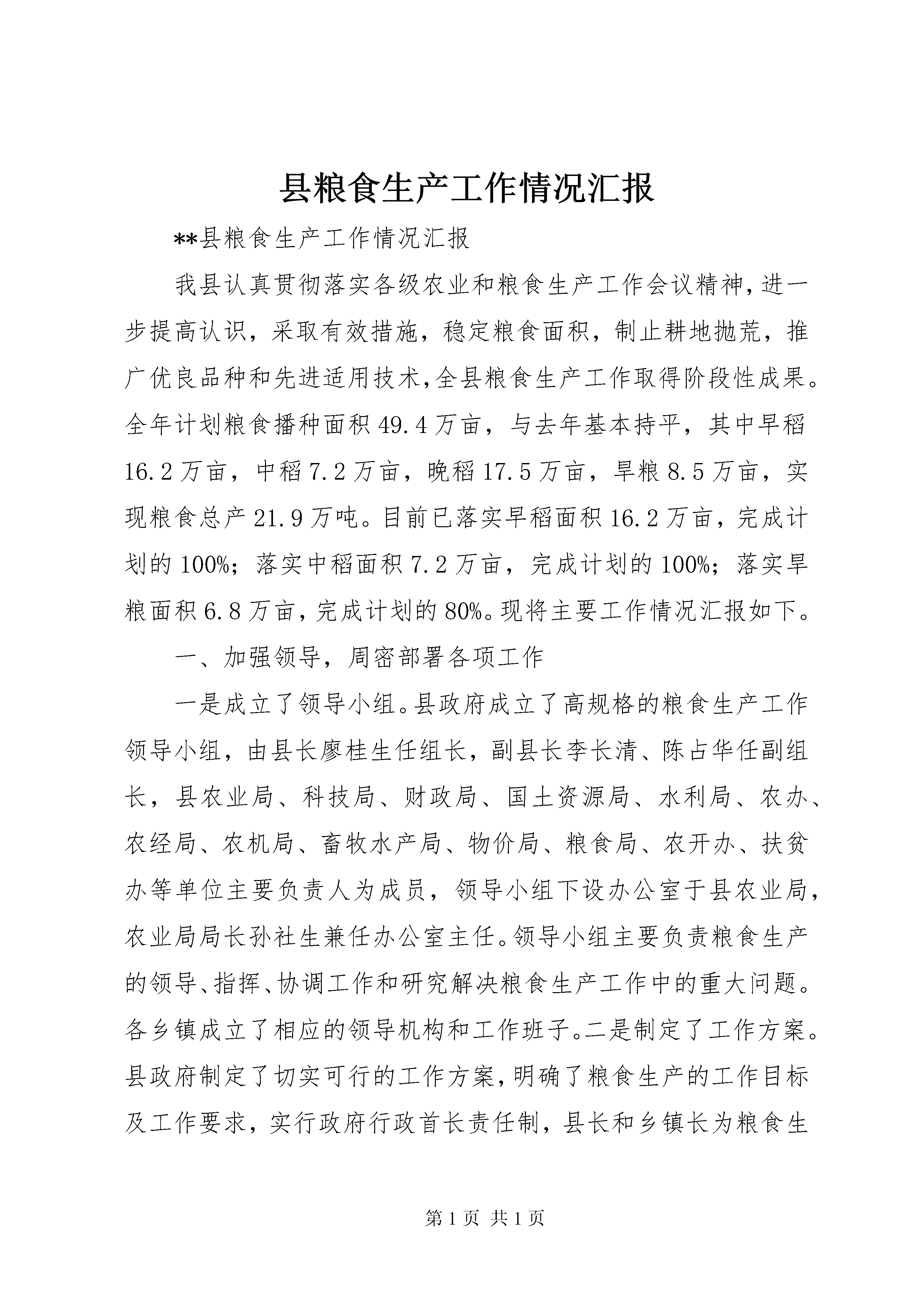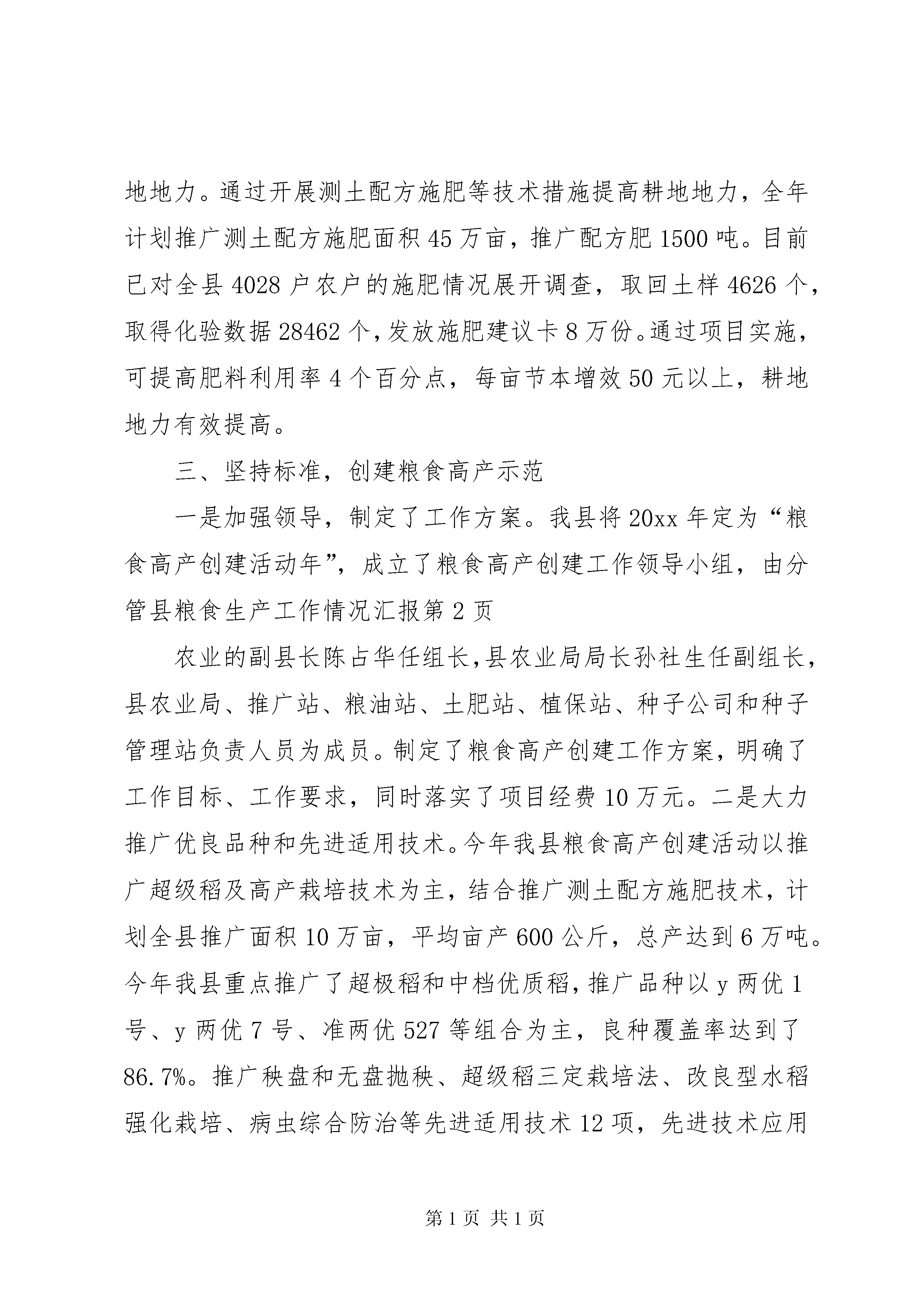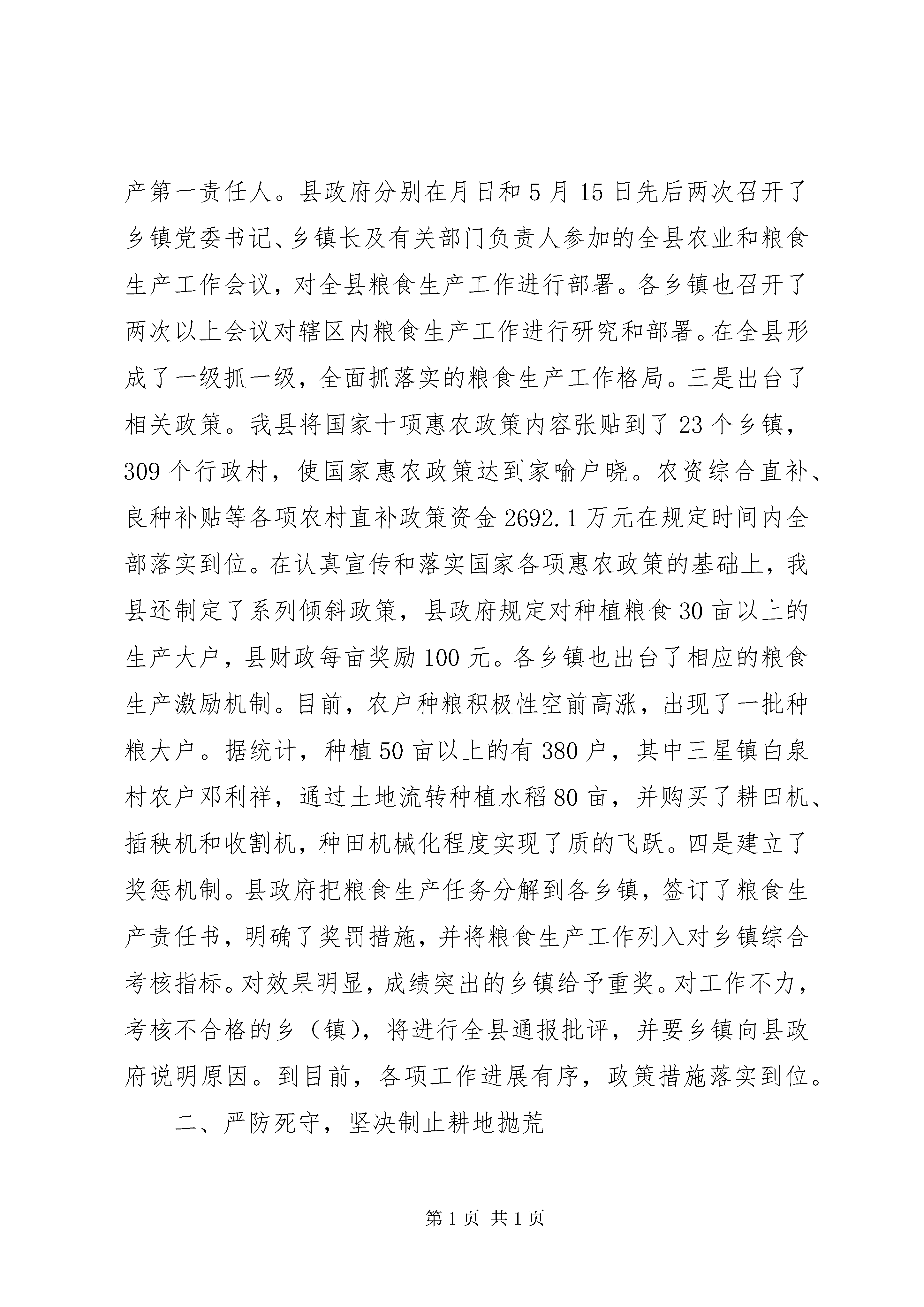 县粮食生产工作情况汇报**县粮食生产工作情况汇报我县认真贯彻落实各级农业和粮食生产工作会议精神,进一步提高认识,采取有效措施,稳定粮食面积,制止耕地抛荒,推广优良品种和先进适用技术,全县粮食生产工作取得阶段性成果。全年计划粮食播种面积49.4万亩,与去年基本持平,其中早稻16.2万亩,中稻7.2万亩,晚稻17.5万亩,旱粮8.5万亩,实现粮食总产21.9万吨。目前已落实早稻面积16.2万亩,完成计划的100%;落实中稻面积7.2万亩,完成计划的100%;落实旱粮面积6.8万亩,完成计划的80%。现将主要工作情况汇报如下。一、加强领导,周密部署各项工作一是成立了领导小组。县政府成立了高规格的粮食生产工作领导小组,由县长廖桂生任组长,副县长李长清、陈占华任副组长,县农业局、科技局、财政局、国土资源局、水利局、农办、农经局、农机局、畜牧水产局、物价局、粮食局、农开办、扶贫办等单位主要负责人为成员,领导小组下设办公室于县农业局,农业局局长孙社生兼任办公室主任。领导小组主要负责粮食生产的领导、指挥、协调工作和研究解决粮食生产工作中的重大问题。各乡镇成立了相应的领导机构和工作班子。二是制定了工作方案。县政府制定了切实可行的工作方案,明确了粮食生产的工作目标及工作要求,实行政府行政首长责任制,县长和乡镇长为粮食生产第一责任人。县政府分别在月日和5月15日先后两次召开了乡镇党委书记、乡镇长及有关部门负责人参加的全县农业和粮食生产工作会议,对全县粮食生产工作进行部署。各乡镇也召开了两次以上会议对辖区内粮食生产工作进行研究和部署。在全县形成了一级抓一级,全面抓落实的粮食生产工作格局。三是出台了相关政策。我县将国家十项惠农政策内容张贴到了23个乡镇,309个行政村,使国家惠农政策达到家喻户晓。农资综合直补、良种补贴等各项农村直补政策资金2692.1万元在规定时间内全部落实到位。在认真宣传和落实国家各项惠农政策的基础上,我县还制定了系列倾斜政策,县政府规定对种植粮食30亩以上的生产大户,县财政每亩奖励100元。各乡镇也出台了相应的粮食生产激励机制。目前,农户种粮积极性空前高涨,出现了一批种粮大户。据统计,种植50亩以上的有380户,其中三星镇白泉村农户邓利祥,通过土地流转种植水稻80亩,并购买了耕田机、插秧机和收割机,种田机械化程度实现了质的飞跃。四是建立了奖惩机制。县政府把粮食生产任务分解到各乡镇,签订了粮食生产责任书,明确了奖罚措施,并将粮食生产工作列入对乡镇综合考核指标。对效果明显,成绩突出的乡镇给予重奖。对工作不力,考核不合格的乡(镇),将进行全县通报批评,并要乡镇向县政府说明原因。到目前,各项工作进展有序,政策措施落实到位。二、严防死守,坚决制止耕地抛荒一是建立了责任机制。我县认真贯彻执行《XX市人民政府关于解决耕地抛荒问题的若干意见》(郴政发[20xx]5号)文件精神,并将文件转发到各乡镇及有关部门,县政府分管农业副县长就粮食生产和制止耕地抛荒进行了电视讲话。乡镇与县政府签订了责任书,实行一级对一级负责制,即乡镇长对县长负责,村长对乡镇长负责。因工作不力,造成连片抛荒面积超过5亩的乡镇,对乡镇长进行戒勉谈话。二是建立了监管机制。县政府对全县耕地抛荒情况进行动态监管,由县农业局牵头对全县耕地抛荒情况进行了详细调查,摸清底子,建立档案,做到心中有数。各乡镇实行一月一报,随时掌握耕地抛荒情况。据目前统计,全县耕地抛荒面积204.28亩,其中稻田抛荒167.4亩,旱地抛荒36.88亩,抛荒原因主要是干旱缺水不能耕种和劳力外出务工。对因干旱缺水不能耕种的耕地,要求所在乡镇采取措施,筹资筹劳改善耕地灌溉条件,创造条件进行复耕。对因弃农经商或外出务工无力耕种的耕地,要求乡镇督促耕地承包户及时将耕地转包与他人代为耕种,并逐步推动土地流转。三是加强了农田基础设施建设。今年我县共投资18万元用于防汛工作,投资355万元用于改善稻田水利设施。现冬修水利重点工程龙虎洞右干渠李屋段整修工程、龙虎洞干渠清淤扫障工程及两个小ⅰ型病险水库修复工程已全面完工。全县中型水库蓄水60%左右,小ⅱ型以上水库蓄水50%左右,耕地防汛抗旱能力进一步增强。四是提高了耕地地力。通过开展测土配方施肥等技术措施提高耕地地力,全年计划推广测土配方施肥面积45万亩,推广配方肥1500吨。目前已对全县4028户农户的施肥情况展开调查,取回土样4626个,取得化验数据28462个,发放施肥建议卡8万份。通过项目实施,可提高肥料利用率4个百分点,每亩节本增效50元以上,耕地地力有效提高。三、坚持标准,创建粮食高产示范一是加强领导,制定了工作方案。我县将20xx年定为“粮食高产创建活动年”,成立了粮食高产创建工作领导小组,由分管县粮食生产工作情况汇报农业的副县长陈占华任