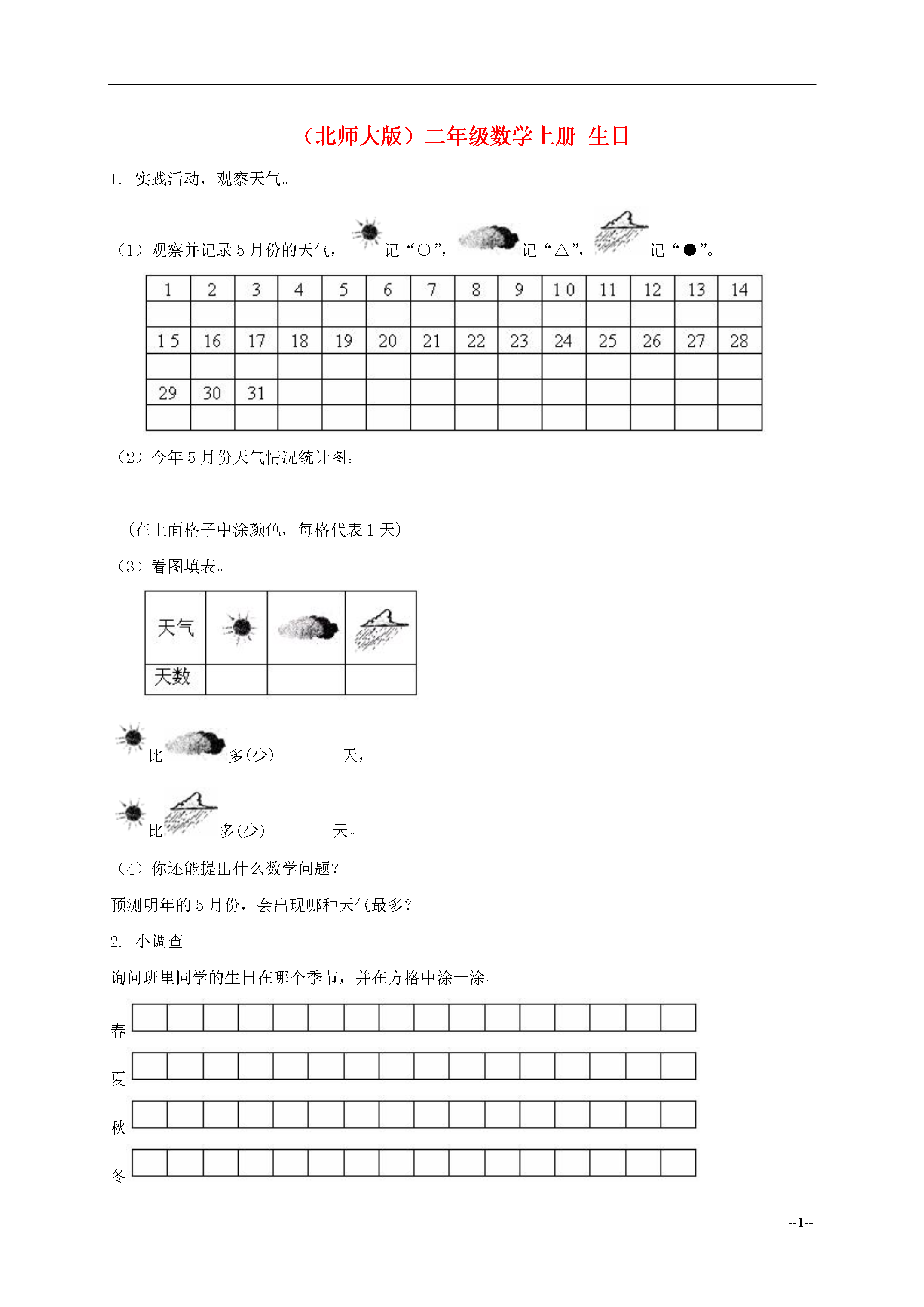 --2--(北师大版)二年级数学上册生日1.实践活动,观察天气。(1)观察并记录5月份的天气,记“○”,记“△”,记“●”。(2)今年5月份天气情况统计图。(在上面格子中涂颜色,每格代表1天)(3)看图填表。比多(少)________天,比多(少)________天。(4)你还能提出什么数学问题?预测明年的5月份,会出现哪种天气最多?2.小调查询问班里同学的生日在哪个季节,并在方格中涂一涂。春夏秋冬(1)从统计图中可以看出,共调查了()名同学。(2)()季过生日的同学最多,()季过生日的同学最少。(3)春季和夏季过生日的同学共有()名。(4)你还能得到什么信息?