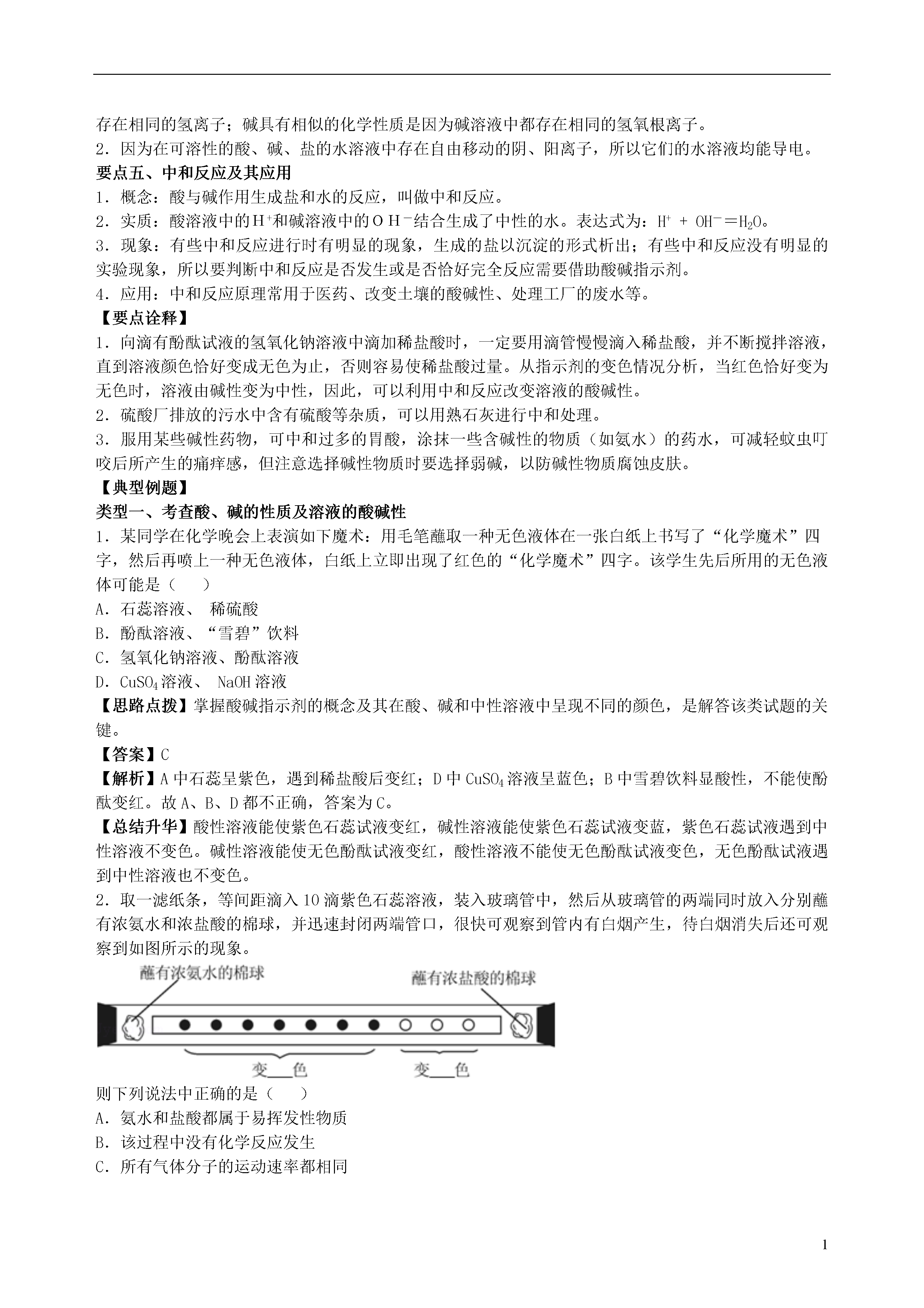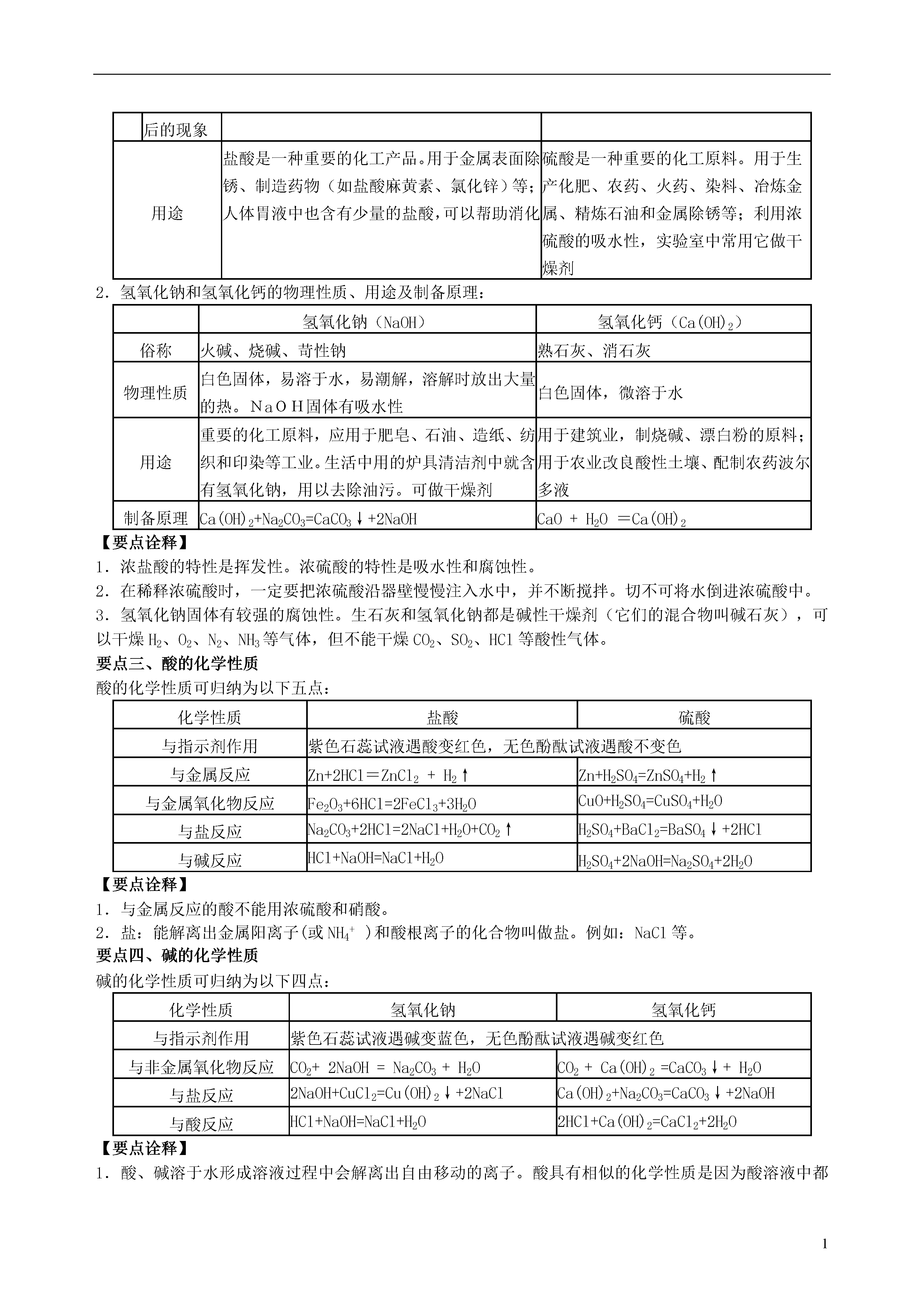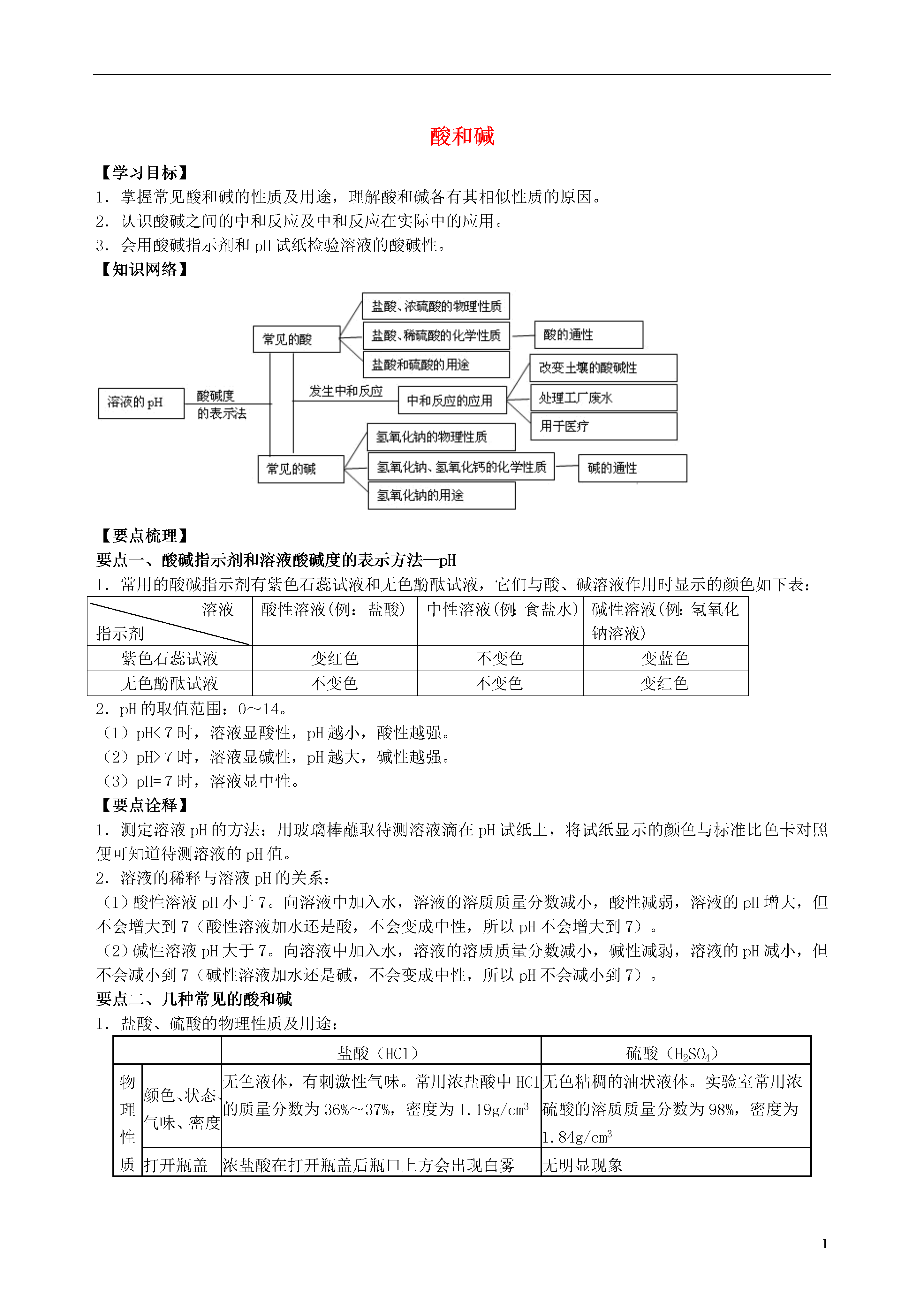 1酸和碱【学习目标】1.掌握常见酸和碱的性质及用途,理解酸和碱各有其相似性质的原因。2.认识酸碱之间的中和反应及中和反应在实际中的应用。3.会用酸碱指示剂和pH试纸检验溶液的酸碱性。【知识网络】【要点梳理】要点一、酸碱指示剂和溶液酸碱度的表示方法—pH1.常用的酸碱指示剂有紫色石蕊试液和无色酚酞试液,它们与酸、碱溶液作用时显示的颜色如下表:溶液指示剂酸性溶液(例:盐酸)中性溶液(例:食盐水)碱性溶液(例:氢氧化钠溶液)紫色石蕊试液变红色不变色变蓝色无色酚酞试液不变色不变色变红色2.pH的取值范围:0~14。(1)pH<7时,溶液显酸性,pH越小,酸性越强。(2)pH>7时,溶液显碱性,pH越大,碱性越强。(3)pH=7时,溶液显中性。【要点诠释】1.测定溶液pH的方法:用玻璃棒蘸取待测溶液滴在pH试纸上,将试纸显示的颜色与标准比色卡对照便可知道待测溶液的pH值。2.溶液的稀释与溶液pH的关系:(1)酸性溶液pH小于7。向溶液中加入水,溶液的溶质质量分数减小,酸性减弱,溶液的pH增大,但不会增大到7(酸性溶液加水还是酸,不会变成中性,所以pH不会增大到7)。(2)碱性溶液pH大于7。向溶液中加入水,溶液的溶质质量分数减小,碱性减弱,溶液的pH减小,但不会减小到7(碱性溶液加水还是碱,不会变成中性,所以pH不会减小到7)。要点二、几种常见的酸和碱1.盐酸、硫酸的物理性质及用途:盐酸(HCl)硫酸(H2SO4)物理性质颜色、状态、气味、密度无色液体,有刺激性气味。常用浓盐酸中HCl的质量分数为36%~37%,密度为1.19g/cm3无色粘稠的油状液体。实验室常用浓硫酸的溶质质量分数为98%,密度为1.84g/cm3打开瓶盖后的现象浓盐酸在打开瓶盖后瓶口上方会出现白雾无明显现象用途盐酸是一种重要的化工产品。用于金属表面除锈、制造药物(如盐酸麻黄素、氯化锌)等;人体胃液中也含有少量的盐酸,可以帮助消化硫酸是一种重要的化工原料。用于生产化肥、农药、火药、染料、冶炼金属、精炼石油和金属除锈等;利用浓硫酸的吸水性,实验室中常用它做干燥剂2.氢氧化钠和氢氧化钙的物理性质、用途及制备原理:氢氧化钠(NaOH)氢氧化钙(Ca(OH)2)俗称火碱、烧碱、苛性钠熟石灰、消石灰物理性质白色固体,易溶于水,易潮解,溶解时放出大量的热。NaOH固体有吸水性白色固体,微溶于水用途重要的化工原料,应用于肥皂、石油、造纸、纺织和印染等工业。生活中用的炉具清洁剂中就含有氢氧化钠,用以去除油污。可做干燥剂用于建筑业,制烧碱、漂白粉的原料;用于农业改良酸性土壤、配制农药波尔多液制备原理Ca(OH)2+Na2CO3=CaCO3↓+2NaOHCaO+H2O=Ca(OH)2【要点诠释】1.浓盐酸的特性是挥发性。浓硫酸的特性是吸水性和腐蚀性。2.在稀释浓硫酸时,一定要把浓硫酸沿器壁慢慢注入水中,并不断搅拌。切不可将水倒进浓硫酸中。3.氢氧化钠固体有较强的腐蚀性。生石灰和氢氧化钠都是碱性干燥剂(它们的混合物叫碱石灰),可以干燥H2、O2、N2、NH3等气体,但不能干燥CO2、SO2、HCl等酸性气体。要点三、酸的化学性质酸的化学性质可归纳为以下五点:化学性质盐酸硫酸与指示剂作用紫色石蕊试液遇酸变红色,无色酚酞试液遇酸不变色与金属反应Zn+2HCl=ZnCl2+H2↑Zn+H2SO4=ZnSO4+H2↑与金属氧化物反应Fe2O3+6HCl=2FeCl3+3H2OCuO+H2SO4=CuSO4+H2O与盐反应Na2CO3+2HCl=2NaCl+H2O+CO2↑H2SO4+BaCl2=BaSO4↓+2HCl与碱反应HCl+NaOH=NaCl+H2OH2SO4+2NaOH=Na2SO4+2H2O【要点诠释】1.与金属反应的酸不能用浓硫酸和硝酸。2.盐:能解离出金属阳离子(或NH4+)和酸根离子的化合物叫做盐。例如:NaCl等。要点四、碱的化学性质碱的化学性质可归纳为以下四点:化学性质氢氧化钠氢氧化钙与指示剂作用紫色石蕊试液遇碱变蓝色,无色酚酞试液遇碱变红色与非金属氧化物反应CO2+2NaOH=Na2CO3+H2OCO2+Ca(OH)2=CaCO3↓+H2O与盐反应2NaOH+CuCl2=Cu(OH)2↓+2NaClCa(OH)2+Na2CO3=CaCO3↓+2NaOH与酸反应HCl+NaOH=NaCl+H2O2HCl+Ca(OH)2=CaCl2+2H2O【要点诠释】1.酸、碱溶于水形成溶液过程中会解离出自由移动的离子。酸具有相似的化学性质是因为酸溶液中都存在相同的氢离子;碱具有相似的化学性质是因为碱溶液中都存在相同的氢氧根离子。2.因为在可溶性的酸、碱、盐的水溶液中存在自由移动的阴、阳离子,所以它们的水溶液均能导电。