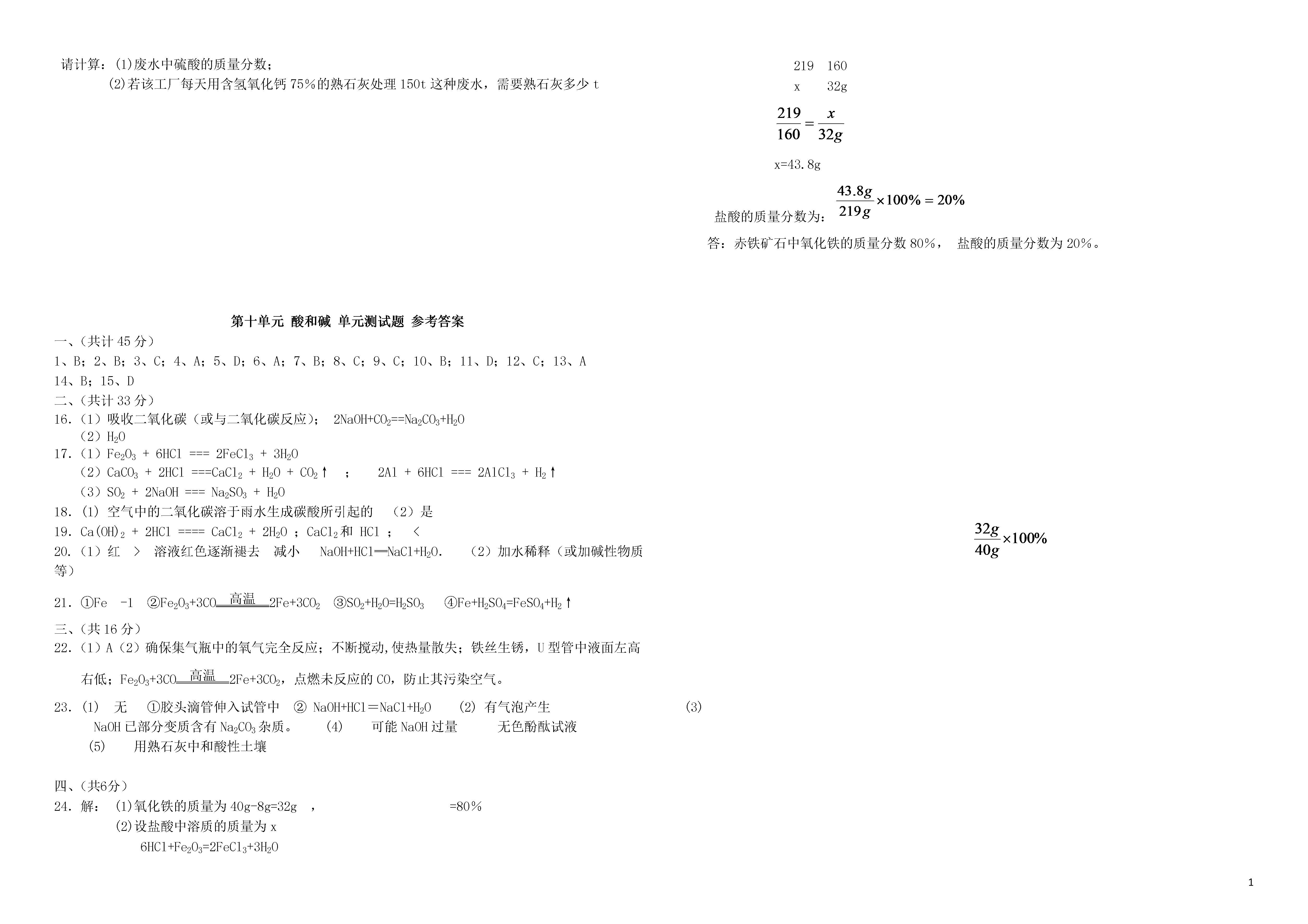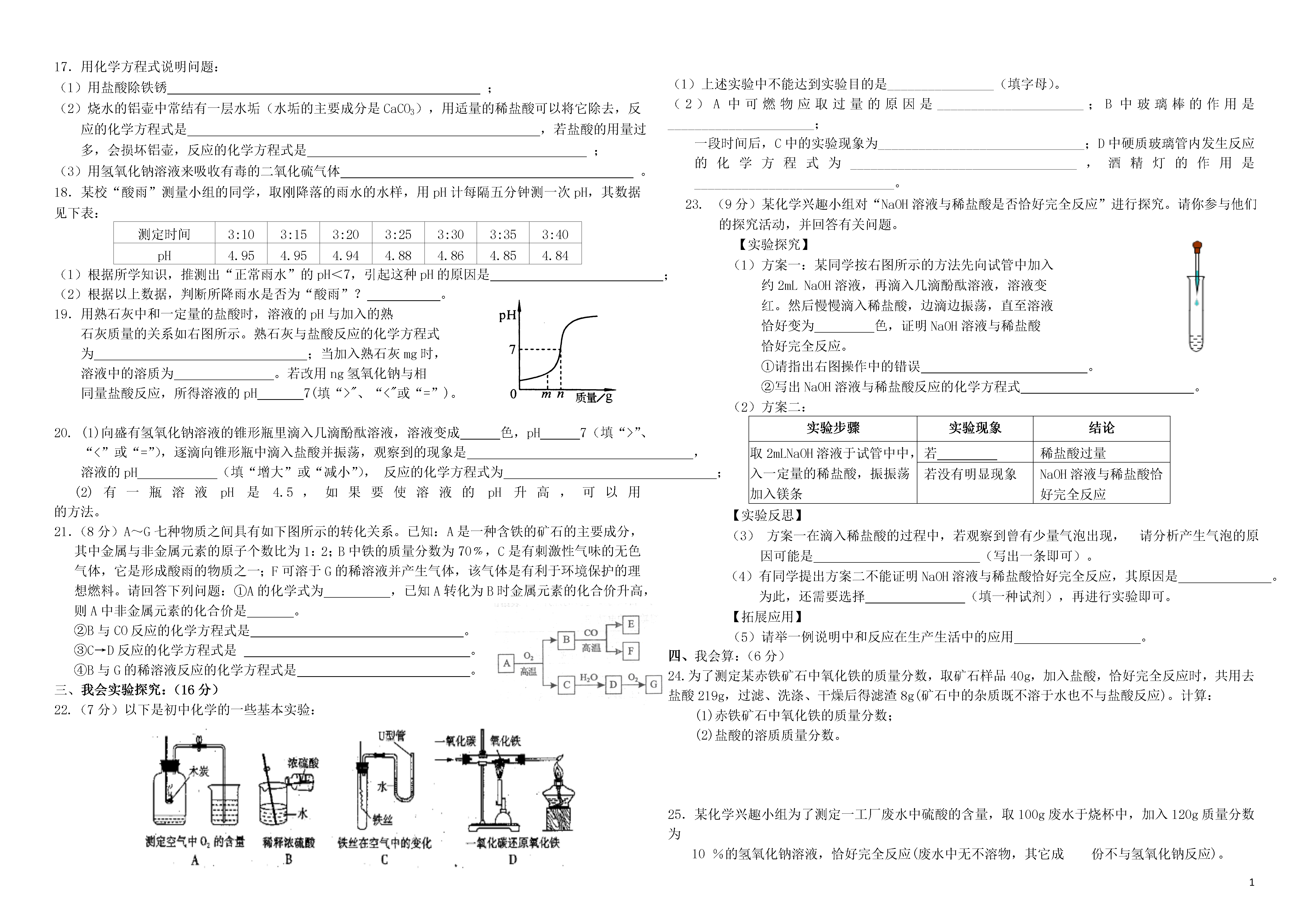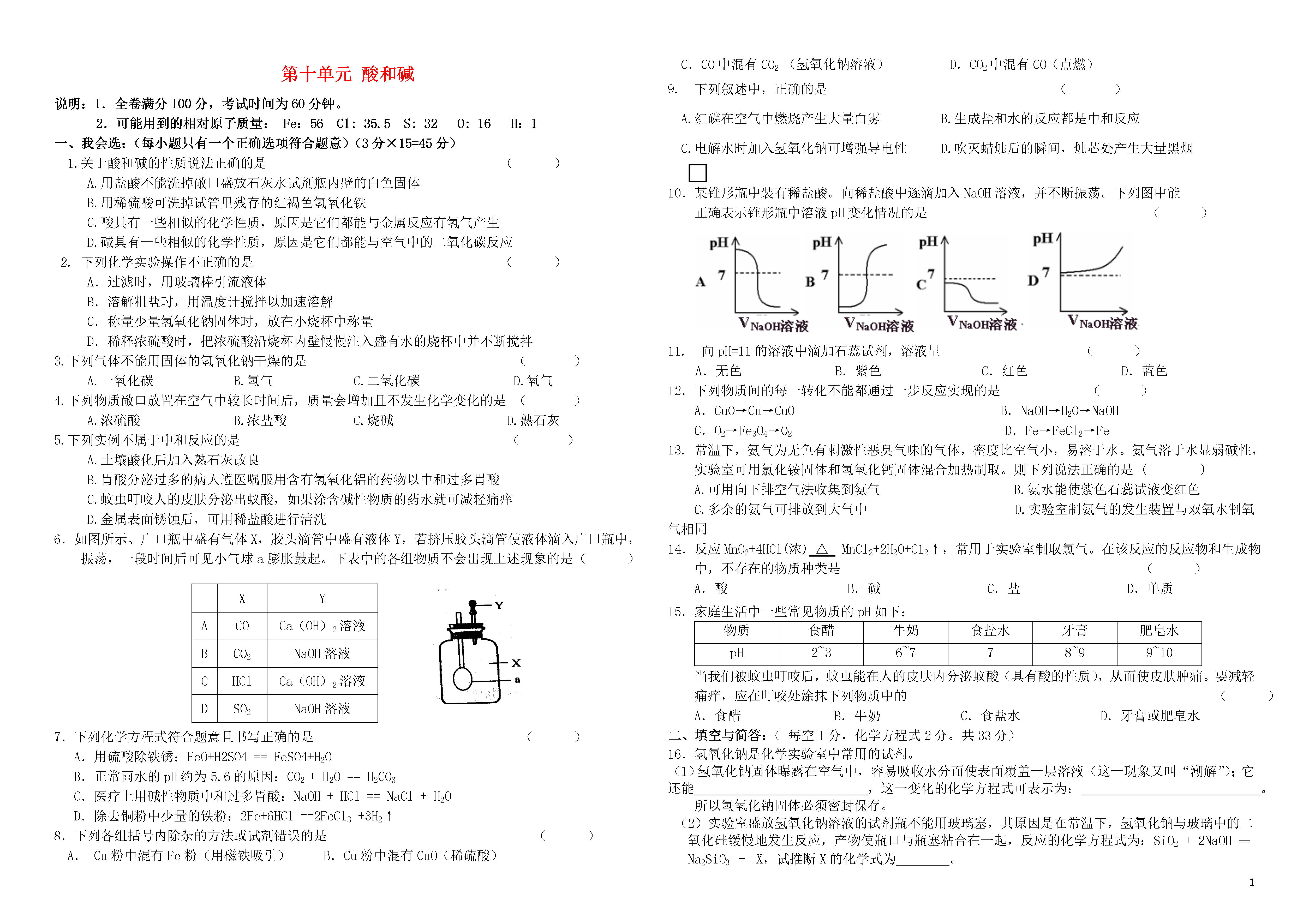 1第十单元酸和碱说明:1.全卷满分100分,考试时间为60分钟。2.可能用到的相对原子质量:Fe:56Cl:35.5S:32O:16H:1一、我会选:(每小题只有一个正确选项符合题意)(3分×15=45分)1.关于酸和碱的性质说法正确的是()A.用盐酸不能洗掉敞口盛放石灰水试剂瓶内壁的白色固体B.用稀硫酸可洗掉试管里残存的红褐色氢氧化铁C.酸具有一些相似的化学性质,原因是它们都能与金属反应有氢气产生D.碱具有一些相似的化学性质,原因是它们都能与空气中的二氧化碳反应2.下列化学实验操作不正确的是()A.过滤时,用玻璃棒引流液体B.溶解粗盐时,用温度计搅拌以加速溶解C.称量少量氢氧化钠固体时,放在小烧杯中称量D.稀释浓硫酸时,把浓硫酸沿烧杯内壁慢慢注入盛有水的烧杯中并不断搅拌3.下列气体不能用固体的氢氧化钠干燥的是()A.一氧化碳B.氢气C.二氧化碳D.氧气4.下列物质敞口放置在空气中较长时间后,质量会增加且不发生化学变化的是()A.浓硫酸B.浓盐酸C.烧碱D.熟石灰5.下列实例不属于中和反应的是()A.土壤酸化后加入熟石灰改良B.胃酸分泌过多的病人遵医嘱服用含有氢氧化铝的药物以中和过多胃酸C.蚊虫叮咬人的皮肤分泌出蚁酸,如果涂含碱性物质的药水就可减轻痛痒D.金属表面锈蚀后,可用稀盐酸进行清洗6.如图所示、广口瓶中盛有气体X,胶头滴管中盛有液体Y,若挤压胶头滴管使液体滴入广口瓶中,振荡,一段时间后可见小气球a膨胀鼓起。下表中的各组物质不会出现上述现象的是()XYACOCa(OH)2溶液BCO2NaOH溶液CHClCa(OH)2溶液DSO2NaOH溶液7.下列化学方程式符合题意且书写正确的是()A.用硫酸除铁锈:FeO+H2SO4==FeSO4+H2OB.正常雨水的pH约为5.6的原因:CO2+H2O==H2CO3C.医疗上用碱性物质中和过多胃酸:NaOH+HCl==NaCl+H2OD.除去铜粉中少量的铁粉:2Fe+6HCl==2FeCl3+3H2↑8.下列各组括号内除杂的方法或试剂错误的是()A.Cu粉中混有Fe粉(用磁铁吸引)B.Cu粉中混有CuO(稀硫酸)C.CO中混有CO2(氢氧化钠溶液)D.CO2中混有CO(点燃)9.下列叙述中,正确的是()A.红磷在空气中燃烧产生大量白雾B.生成盐和水的反应都是中和反应C.电解水时加入氢氧化钠可增强导电性D.吹灭蜡烛后的瞬间,烛芯处产生大量黑烟10.某锥形瓶中装有稀盐酸。向稀盐酸中逐滴加入NaOH溶液,并不断振荡。下列图中能正确表示锥形瓶中溶液pH变化情况的是()11.向pH=11的溶液中滴加石蕊试剂,溶液呈()A.无色B.紫色C.红色D.蓝色12.下列物质间的每一转化不能都通过一步反应实现的是()A.CuO→Cu→CuOB.NaOH→H2O→NaOHC.O2→Fe3O4→O2D.Fe→FeCl2→Fe13.常温下,氨气为无色有刺激性恶臭气味的气体,密度比空气小,易溶于水。氨气溶于水显弱碱性,实验室可用氯化铵固体和氢氧化钙固体混合加热制取。则下列说法正确的是()A.可用向下排空气法收集到氨气B.氨水能使紫色石蕊试液变红色C.多余的氨气可排放到大气中D.实验室制氨气的发生装置与双氧水制氧气相同14.反应MnO2+4HCl(浓)△MnCl2+2H2O+C12↑,常用于实验室制取氯气。在该反应的反应物和生成物中,不存在的物质种类是()A.酸B.碱C.盐D.单质15.家庭生活中一些常见物质的pH如下:物质食醋牛奶食盐水牙膏肥皂水pH2~36~778~99~10当我们被蚊虫叮咬后,蚊虫能在人的皮肤内分泌蚁酸(具有酸的性质),从而使皮肤肿痛。要减轻痛痒,应在叮咬处涂抹下列物质中的()A.食醋B.牛奶C.食盐水D.牙膏或肥皂水二、填空与简答:(每空1分,化学方程式2分。共33分)16.氢氧化钠是化学实验室中常用的试剂。(1)氢氧化钠固体曝露在空气中,容易吸收水分而使表面覆盖一层溶液(这一现象又叫“潮解”);它还能,这一变化的化学方程式可表示为:。所以氢氧化钠固体必须密封保存。(2)实验室盛放氢氧化钠溶液的试剂瓶不能用玻璃塞,其原因是在常温下,氢氧化钠与玻璃中的二氧化硅缓慢地发生反应,产物使瓶口与瓶塞粘合在一起,反应的化学方程式为:SiO2+2NaOH==Na2SiO3+X,试推断X的化学式为。17.用化学方程式说明问题:(1)用盐酸除铁锈;(2)烧水的铝壶中常结有一层水垢(水垢的主要成分是CaCO3),用适量的稀盐酸可以将它除去,反应的化学方程式是,若盐酸的用量过多,会损坏铝壶,反应的化学方程式是;(3)用氢氧化钠溶液来吸收有毒的二氧化硫气体。18.某校“