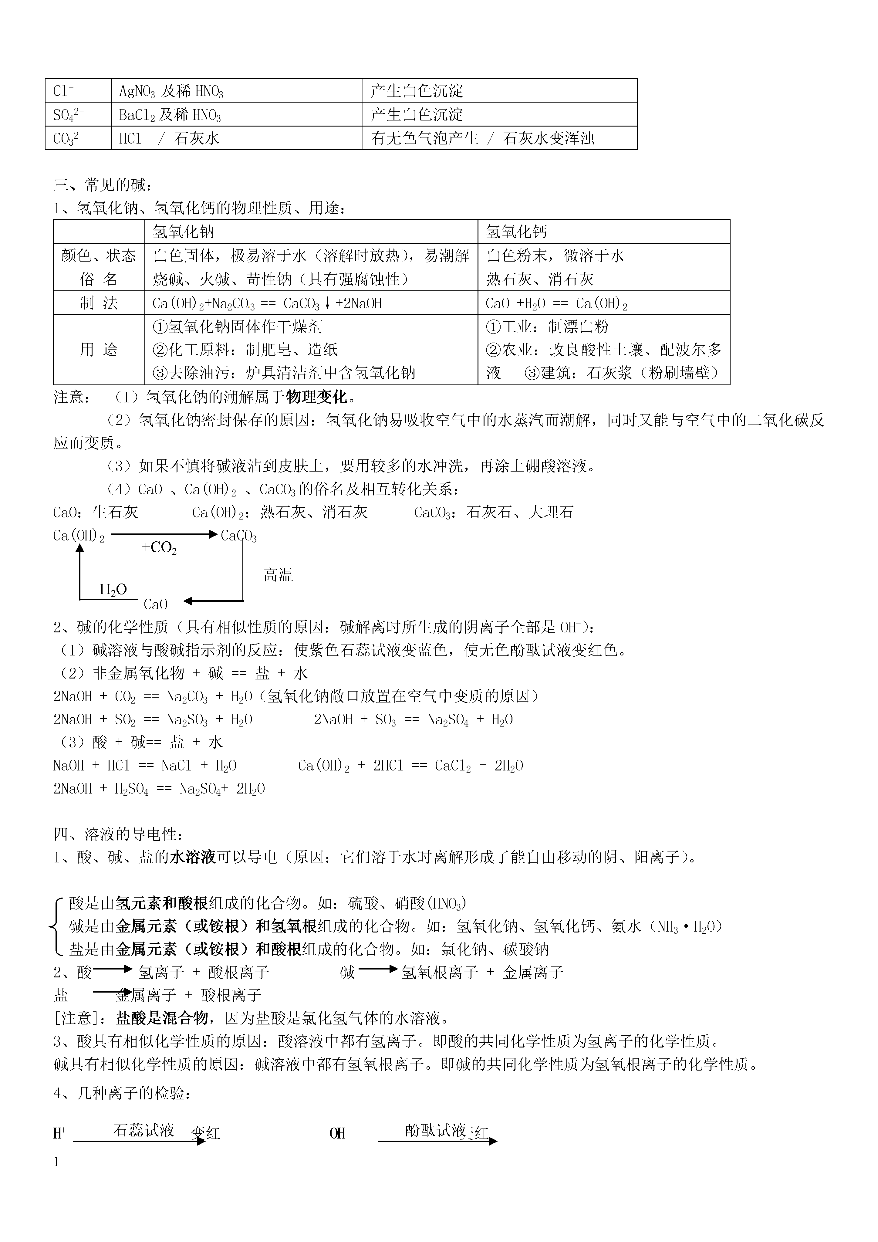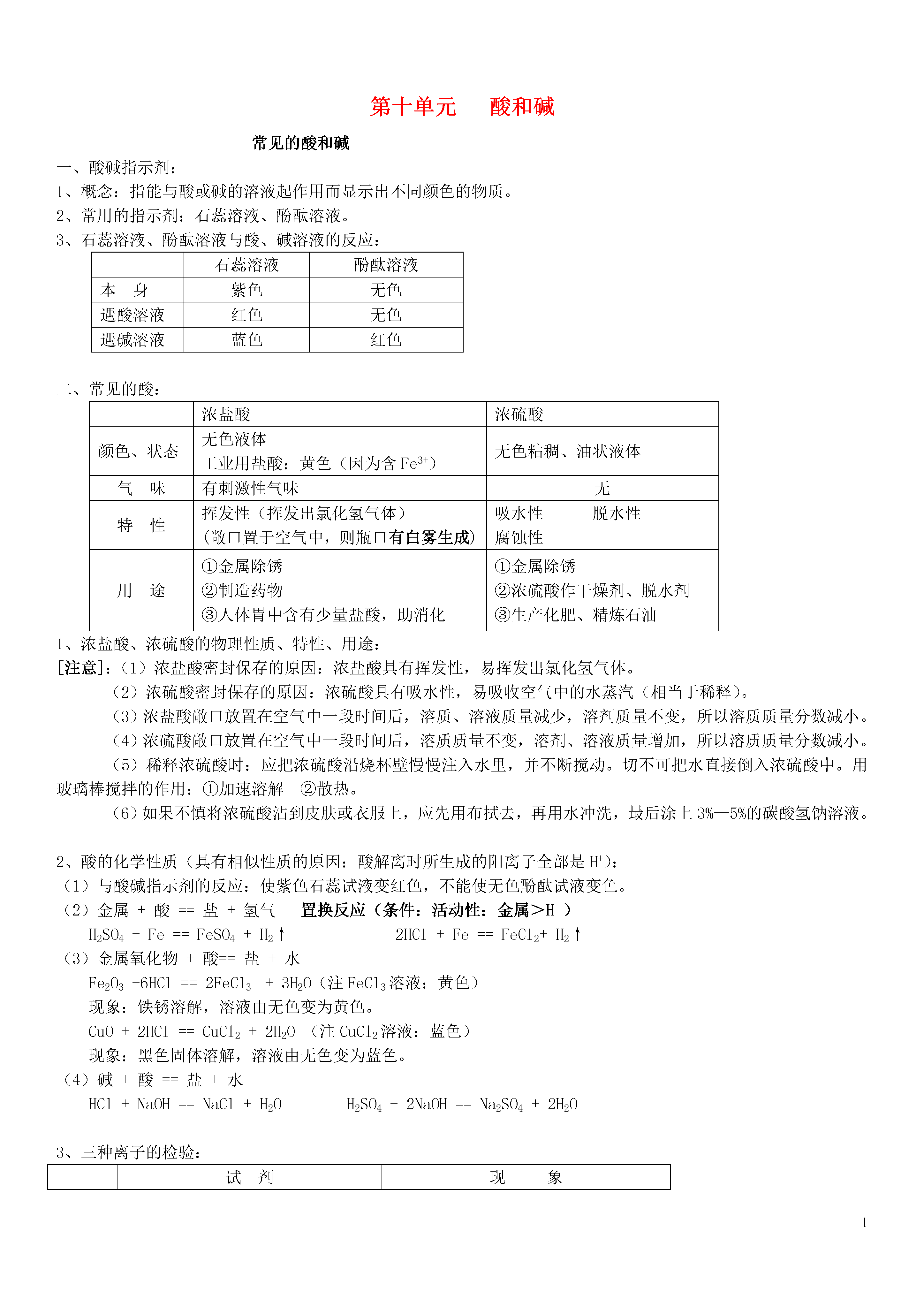 1第十单元酸和碱常见的酸和碱一、酸碱指示剂:1、概念:指能与酸或碱的溶液起作用而显示出不同颜色的物质。2、常用的指示剂:石蕊溶液、酚酞溶液。3、石蕊溶液、酚酞溶液与酸、碱溶液的反应:石蕊溶液酚酞溶液本身紫色无色遇酸溶液红色无色遇碱溶液蓝色红色二、常见的酸:浓盐酸浓硫酸颜色、状态无色液体工业用盐酸:黄色(因为含Fe3+)无色粘稠、油状液体气味有刺激性气味无特性挥发性(挥发出氯化氢气体)(敞口置于空气中,则瓶口有白雾生成)吸水性脱水性腐蚀性用途①金属除锈②制造药物③人体胃中含有少量盐酸,助消化①金属除锈②浓硫酸作干燥剂、脱水剂③生产化肥、精炼石油1、浓盐酸、浓硫酸的物理性质、特性、用途:[注意]:(1)浓盐酸密封保存的原因:浓盐酸具有挥发性,易挥发出氯化氢气体。(2)浓硫酸密封保存的原因:浓硫酸具有吸水性,易吸收空气中的水蒸汽(相当于稀释)。(3)浓盐酸敞口放置在空气中一段时间后,溶质、溶液质量减少,溶剂质量不变,所以溶质质量分数减小。(4)浓硫酸敞口放置在空气中一段时间后,溶质质量不变,溶剂、溶液质量增加,所以溶质质量分数减小。(5)稀释浓硫酸时:应把浓硫酸沿烧杯壁慢慢注入水里,并不断搅动。切不可把水直接倒入浓硫酸中。用玻璃棒搅拌的作用:①加速溶解②散热。(6)如果不慎将浓硫酸沾到皮肤或衣服上,应先用布拭去,再用水冲洗,最后涂上3%—5%的碳酸氢钠溶液。2、酸的化学性质(具有相似性质的原因:酸解离时所生成的阳离子全部是H+):(1)与酸碱指示剂的反应:使紫色石蕊试液变红色,不能使无色酚酞试液变色。(2)金属+酸==盐+氢气置换反应(条件:活动性:金属>H)H2SO4+Fe==FeSO4+H2↑2HCl+Fe==FeCl2+H2↑(3)金属氧化物+酸==盐+水Fe2O3+6HCl==2FeCl3+3H2O(注FeCl3溶液:黄色)现象:铁锈溶解,溶液由无色变为黄色。CuO+2HCl==CuCl2+2H2O(注CuCl2溶液:蓝色)现象:黑色固体溶解,溶液由无色变为蓝色。(4)碱+酸==盐+水HCl+NaOH==NaCl+H2OH2SO4+2NaOH==Na2SO4+2H2O3、三种离子的检验:试剂现象Cl-AgNO3及稀HNO3产生白色沉淀SO42-BaCl2及稀HNO3产生白色沉淀CO32-HCl/石灰水有无色气泡产生/石灰水变浑浊三、常见的碱:1、氢氧化钠、氢氧化钙的物理性质、用途:氢氧化钠氢氧化钙颜色、状态白色固体,极易溶于水(溶解时放热),易潮解白色粉末,微溶于水俗名烧碱、火碱、苛性钠(具有强腐蚀性)熟石灰、消石灰制法Ca(OH)2+Na2CO3==CaCO3↓+2NaOHCaO+H2O==Ca(OH)2用途①氢氧化钠固体作干燥剂②化工原料:制肥皂、造纸③去除油污:炉具清洁剂中含氢氧化钠①工业:制漂白粉②农业:改良酸性土壤、配波尔多液③建筑:石灰浆(粉刷墙壁)注意:(1)氢氧化钠的潮解属于物理变化。(2)氢氧化钠密封保存的原因:氢氧化钠易吸收空气中的水蒸汽而潮解,同时又能与空气中的二氧化碳反应而变质。(3)如果不慎将碱液沾到皮肤上,要用较多的水冲洗,再涂上硼酸溶液。(4)CaO、Ca(OH)2、CaCO3的俗名及相互转化关系:CaO:生石灰Ca(OH)2:熟石灰、消石灰CaCO3:石灰石、大理石+H2O+CO2Ca(OH)2CaCO3高温CaO2、碱的化学性质(具有相似性质的原因:碱解离时所生成的阴离子全部是OH-):(1)碱溶液与酸碱指示剂的反应:使紫色石蕊试液变蓝色,使无色酚酞试液变红色。(2)非金属氧化物+碱==盐+水2NaOH+CO2==Na2CO3+H2O(氢氧化钠敞口放置在空气中变质的原因)2NaOH+SO2==Na2SO3+H2O2NaOH+SO3==Na2SO4+H2O(3)酸+碱==盐+水NaOH+HCl==NaCl+H2OCa(OH)2+2HCl==CaCl2+2H2O2NaOH+H2SO4==Na2SO4+2H2O四、溶液的导电性:1、酸、碱、盐的水溶液可以导电(原因:它们溶于水时离解形成了能自由移动的阴、阳离子)。酸是由氢元素和酸根组成的化合物。如:硫酸、硝酸(HNO3)碱是由金属元素(或铵根)和氢氧根组成的化合物。如:氢氧化钠、氢氧化钙、氨水(NH3·H2O)盐是由金属元素(或铵根)和酸根组成的化合物。如:氯化钠、碳酸钠2、酸氢离子+酸根离子碱氢氧根离子+金属离子盐金属离子+酸根离子[注意]:盐酸是混合物,因为盐酸是氯化氢气体的水溶液。3、酸具有相似化学性质的原因:酸溶液中都有氢离子。即酸的共同化学性质为氢离子的化学性质。碱具有相似化学性