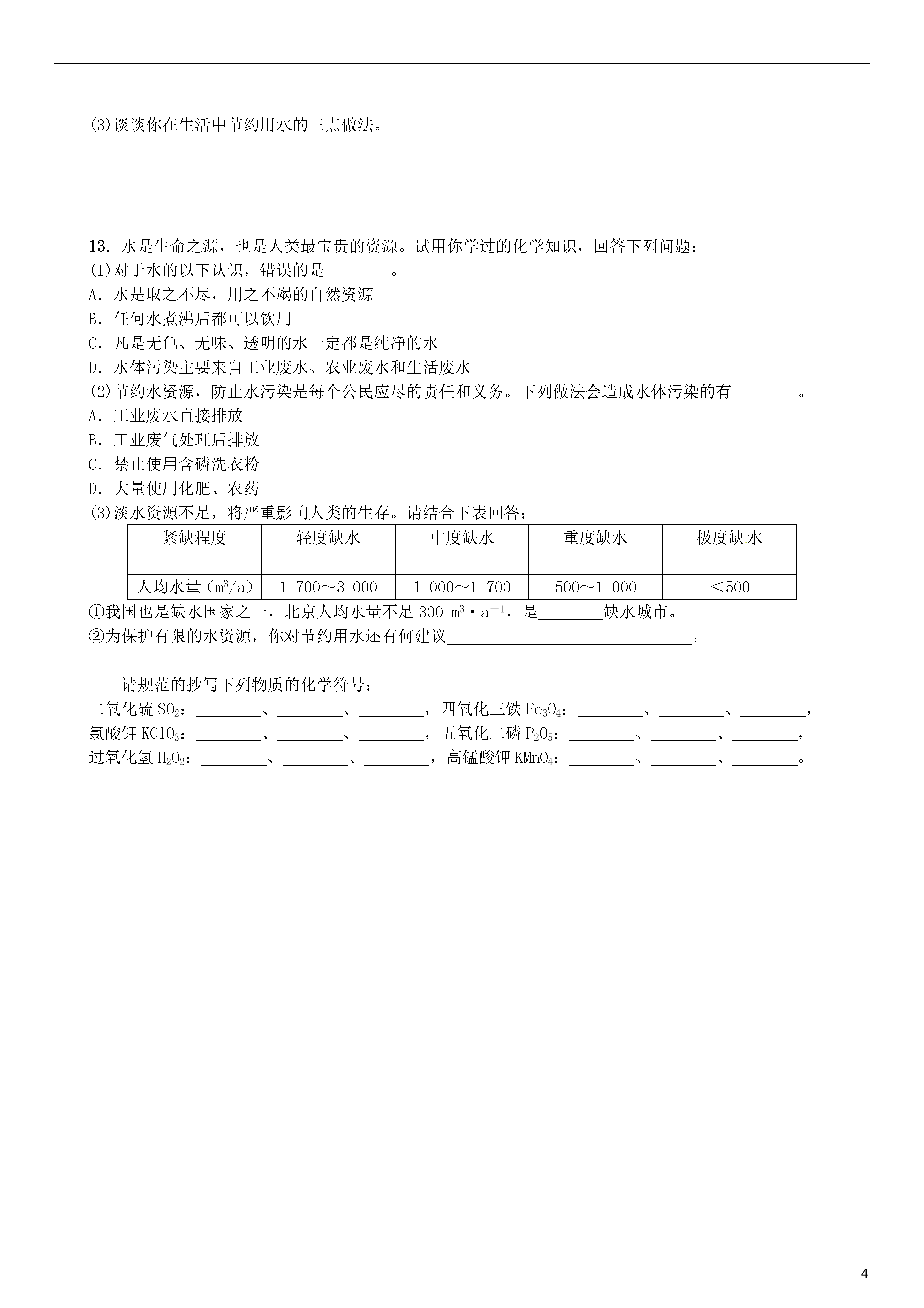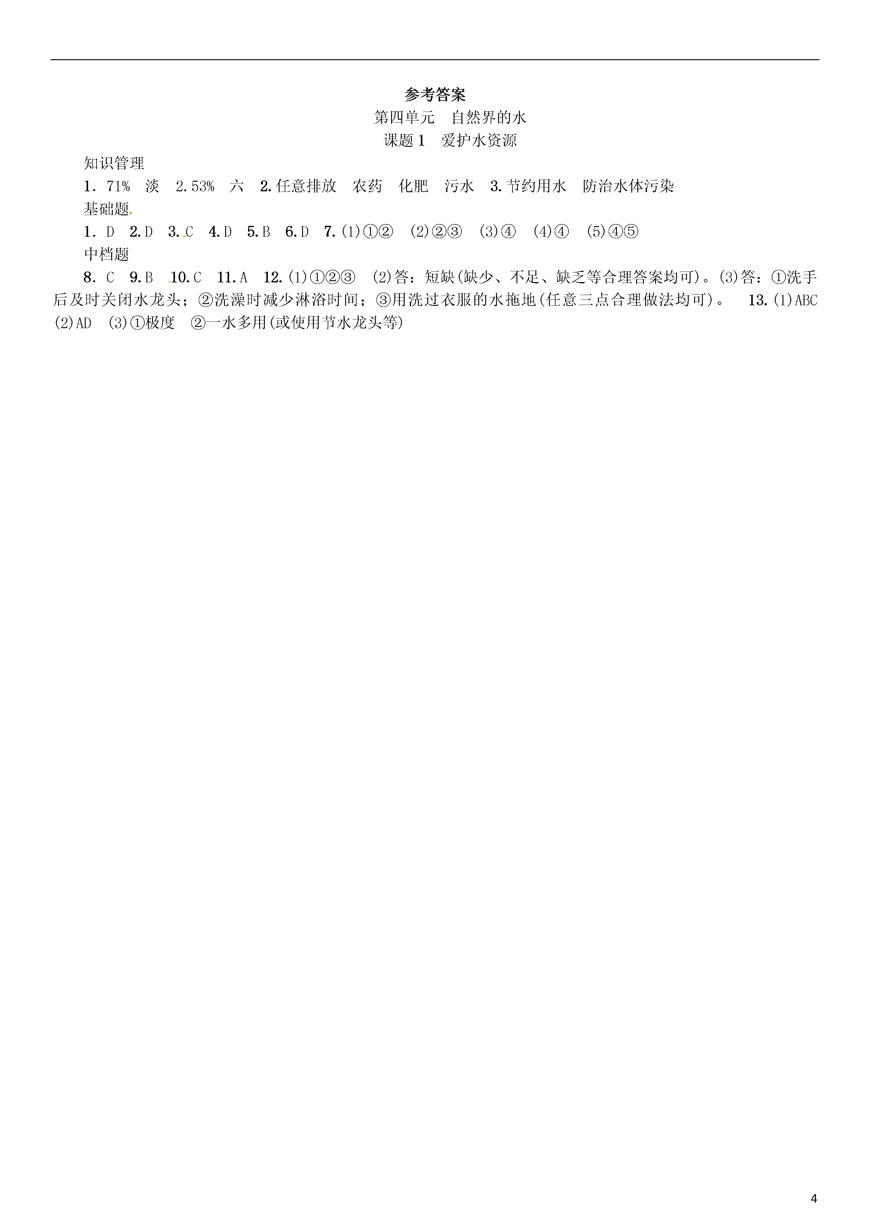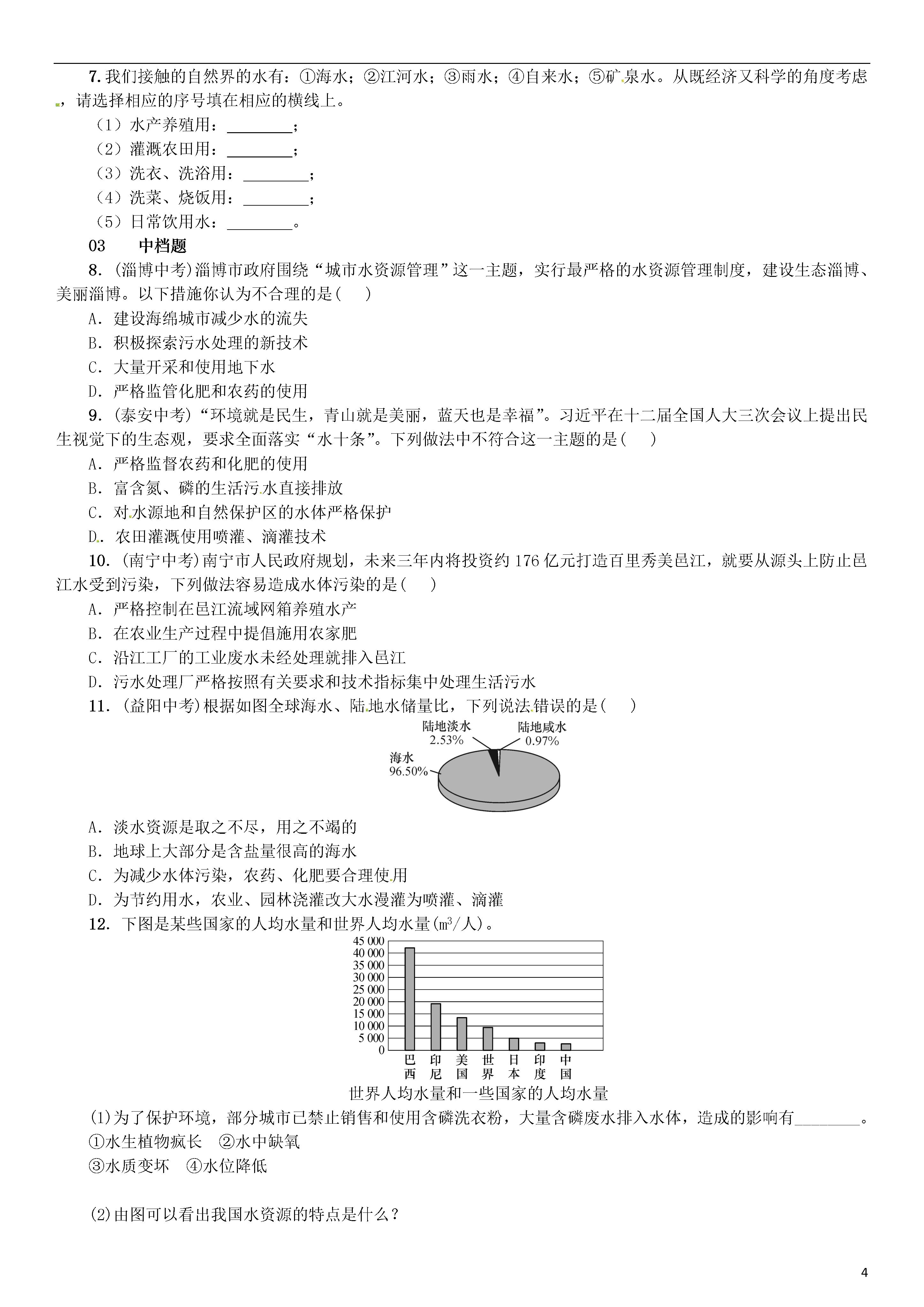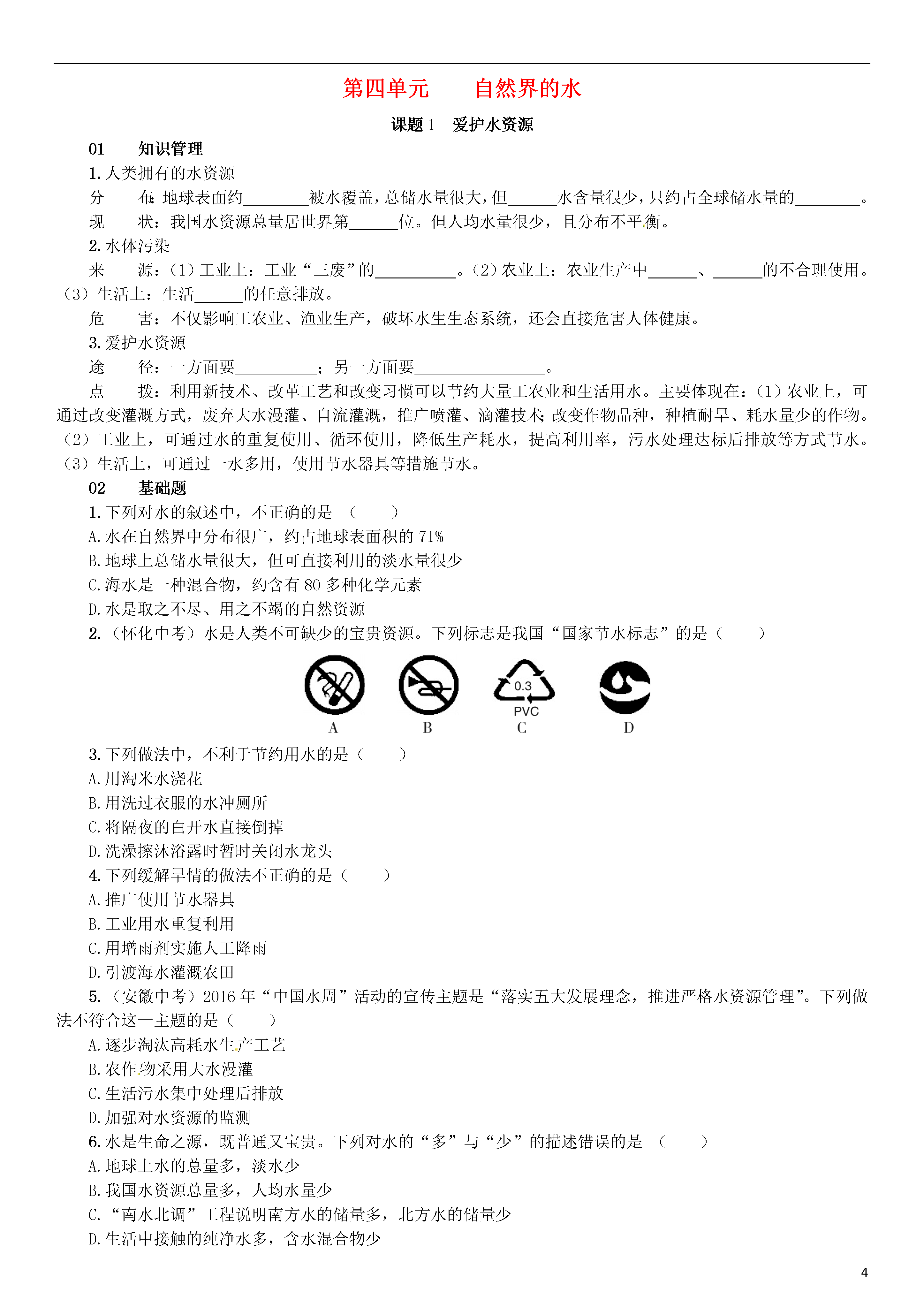 4第四单元自然界的水课题1爱护水资源01知识管理1.人类拥有的水资源分布:地球表面约被水覆盖,总储水量很大,但水含量很少,只约占全球储水量的。现状:我国水资源总量居世界第位。但人均水量很少,且分布不平衡。2.水体污染来源:(1)工业上:工业“三废”的。(2)农业上:农业生产中、的不合理使用。(3)生活上:生活的任意排放。危害:不仅影响工农业、渔业生产,破坏水生生态系统,还会直接危害人体健康。3.爱护水资源途径:一方面要;另一方面要。点拨:利用新技术、改革工艺和改变习惯可以节约大量工农业和生活用水。主要体现在:(1)农业上,可通过改变灌溉方式,废弃大水漫灌、自流灌溉,推广喷灌、滴灌技术;改变作物品种,种植耐旱、耗水量少的作物。(2)工业上,可通过水的重复使用、循环使用,降低生产耗水,提高利用率,污水处理达标后排放等方式节水。(3)生活上,可通过一水多用,使用节水器具等措施节水。02基础题1.下列对水的叙述中,不正确的是()A.水在自然界中分布很广,约占地球表面积的71%B.地球上总储水量很大,但可直接利用的淡水量很少C.海水是一种混合物,约含有80多种化学元素D.水是取之不尽、用之不竭的自然资源2.(怀化中考)水是人类不可缺少的宝贵资源。下列标志是我国“国家节水标志”的是()3.下列做法中,不利于节约用水的是()A.用淘米水浇花B.用洗过衣服的水冲厕所C.将隔夜的白开水直接倒掉D.洗澡擦沐浴露时暂时关闭水龙头4.下列缓解旱情的做法不正确的是()A.推广使用节水器具B.工业用水重复利用C.用增雨剂实施人工降雨D.引渡海水灌溉农田5.(安徽中考)2016年“中国水周”活动的宣传主题是“落实五大发展理念,推进严格水资源管理”。下列做法不符合这一主题的是()A.逐步淘汰高耗水生产工艺B.农作物采用大水漫灌C.生活污水集中处理后排放D.加强对水资源的监测6.水是生命之源,既普通又宝贵。下列对水的“多”与“少”的描述错误的是()A.地球上水的总量多,淡水少B.我国水资源总量多,人均水量少C.“南水北调”工程说明南方水的储量多,北方水的储量少D.生活中接触的纯净水多,含水混合物少7.我们接触的自然界的水有:①海水;②江河水;③雨水;④自来水;⑤矿泉水。从既经济又科学的角度考虑,请选择相应的序号填在相应的横线上。(1)水产养殖用:;(2)灌溉农田用:;(3)洗衣、洗浴用:;(4)洗菜、烧饭用:;(5)日常饮用水:。03中档题8.(淄博中考)淄博市政府围绕“城市水资源管理”这一主题,实行最严格的水资源管理制度,建设生态淄博、美丽淄博。以下措施你认为不合理的是()A.建设海绵城市减少水的流失B.积极探索污水处理的新技术C.大量开采和使用地下水D.严格监管化肥和农药的使用9.(泰安中考)“环境就是民生,青山就是美丽,蓝天也是幸福”。习近平在十二届全国人大三次会议上提出民生视觉下的生态观,要求全面落实“水十条”。下列做法中不符合这一主题的是()A.严格监督农药和化肥的使用B.富含氮、磷的生活污水直接排放C.对水源地和自然保护区的水体严格保护D.农田灌溉使用喷灌、滴灌技术10.(南宁中考)南宁市人民政府规划,未来三年内将投资约176亿元打造百里秀美邑江,就要从源头上防止邑江水受到污染,下列做法容易造成水体污染的是()A.严格控制在邑江流域网箱养殖水产B.在农业生产过程中提倡施用农家肥C.沿江工厂的工业废水未经处理就排入邑江D.污水处理厂严格按照有关要求和技术指标集中处理生活污水11.(益阳中考)根据如图全球海水、陆地水储量比,下列说法错误的是()A.淡水资源是取之不尽,用之不竭的B.地球上大部分是含盐量很高的海水C.为减少水体污染,农药、化肥要合理使用D.为节约用水,农业、园林浇灌改大水漫灌为喷灌、滴灌12.下图是某些国家的人均水量和世界人均水量(m3/人)。世界人均水量和一些国家的人均水量(1)为了保护环境,部分城市已禁止销售和使用含磷洗衣粉,大量含磷废水排入水体,造成的影响有________。①水生植物疯长②水中缺氧③水质变坏④水位降低(2)由图可以看出我国水资源的特点是什么?(3)谈谈你在生活中节约用水的三点做法。13.水是生命之源,也是人类最宝贵的资源。试用你学过的化学知识,回答下列问题:(1)对于水的以下认识,错误的是________。A.水是取之不尽,用之不竭的自然资源B.任何水煮沸后都可以饮用C.凡是无色、无味、透明的水一定都是纯净的水D.水体污染主要来自工业废水、农业废水和生活废水(2)节约水资源,防止水污染是每个公民应尽的责任和义务。下列做法