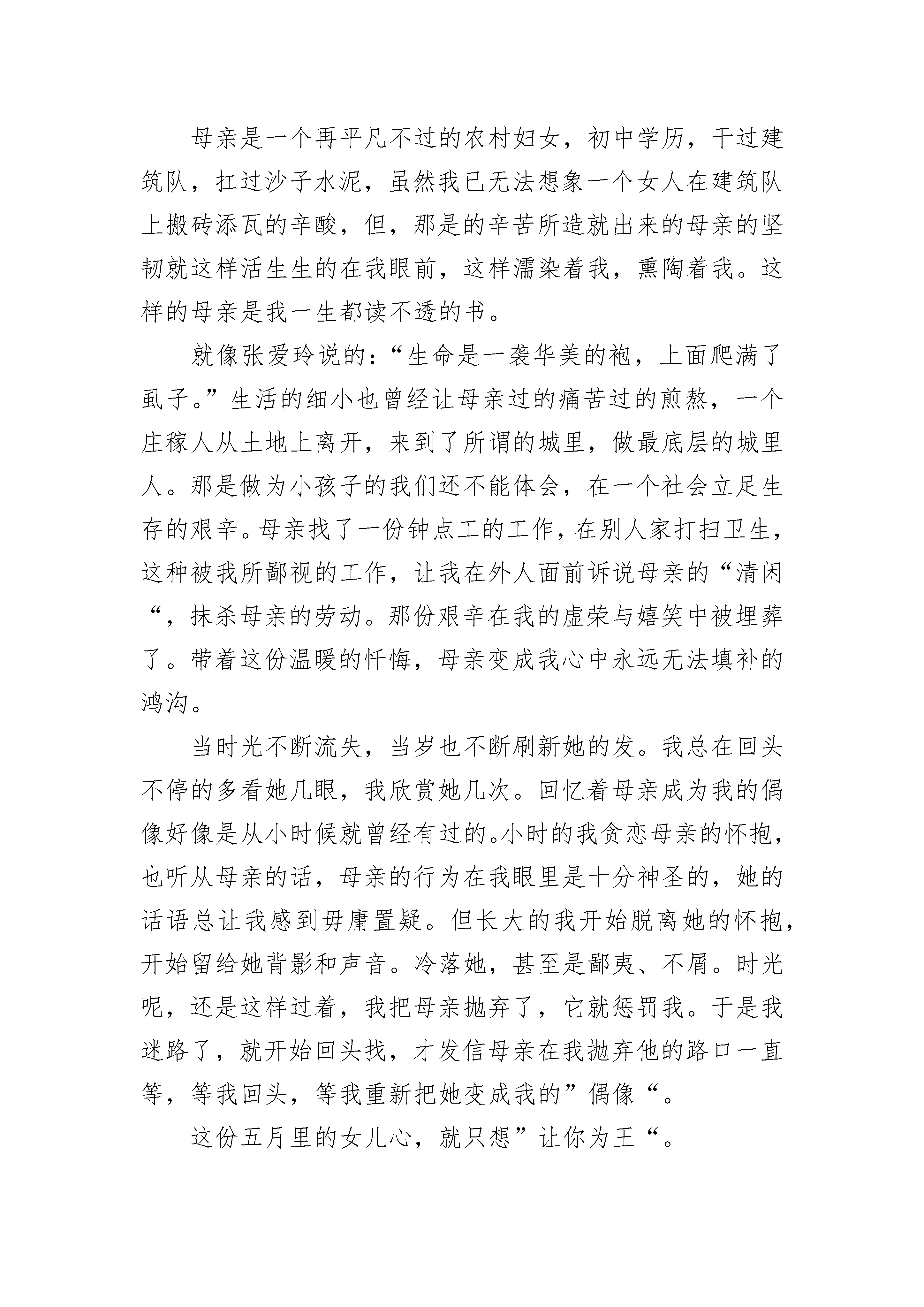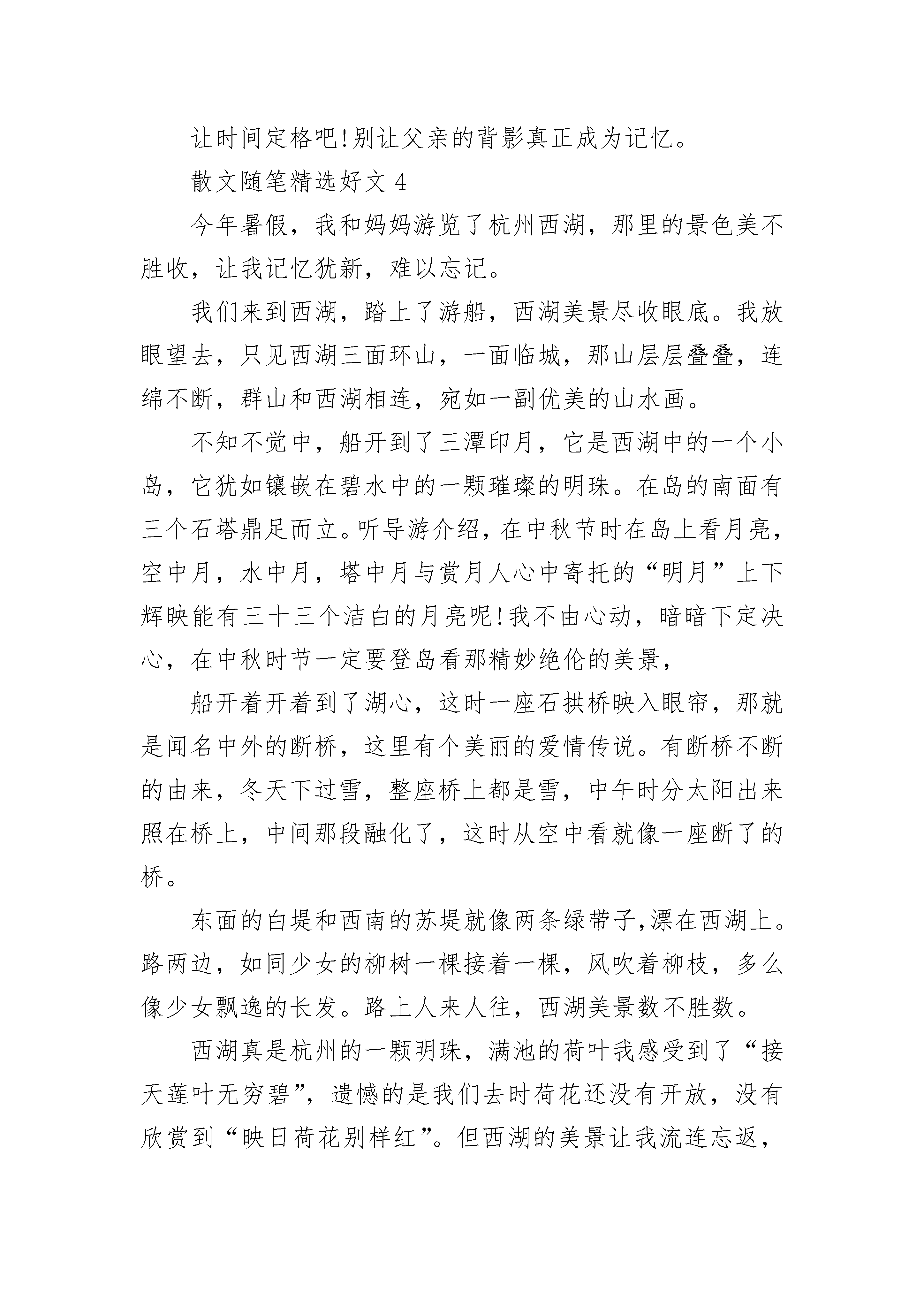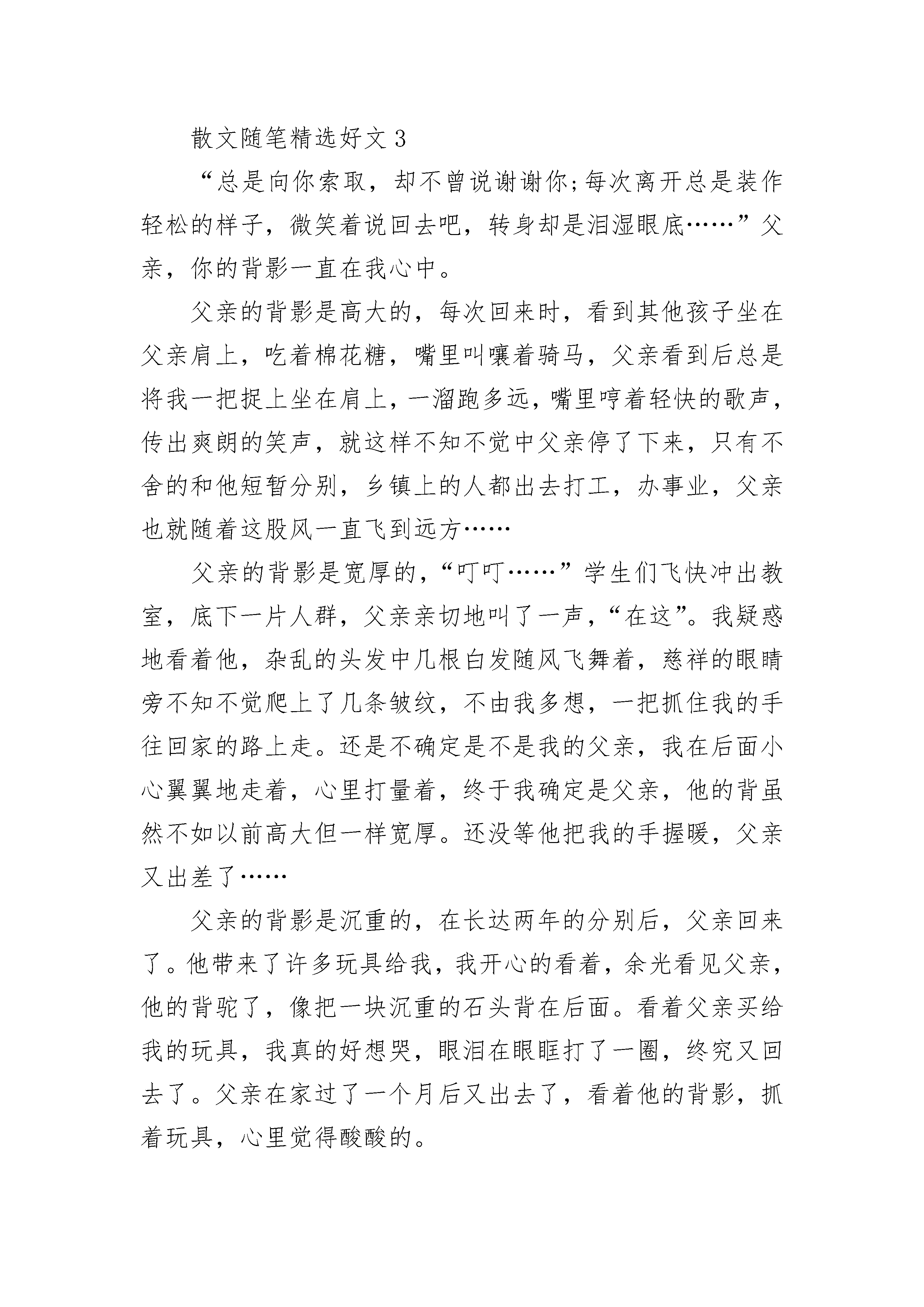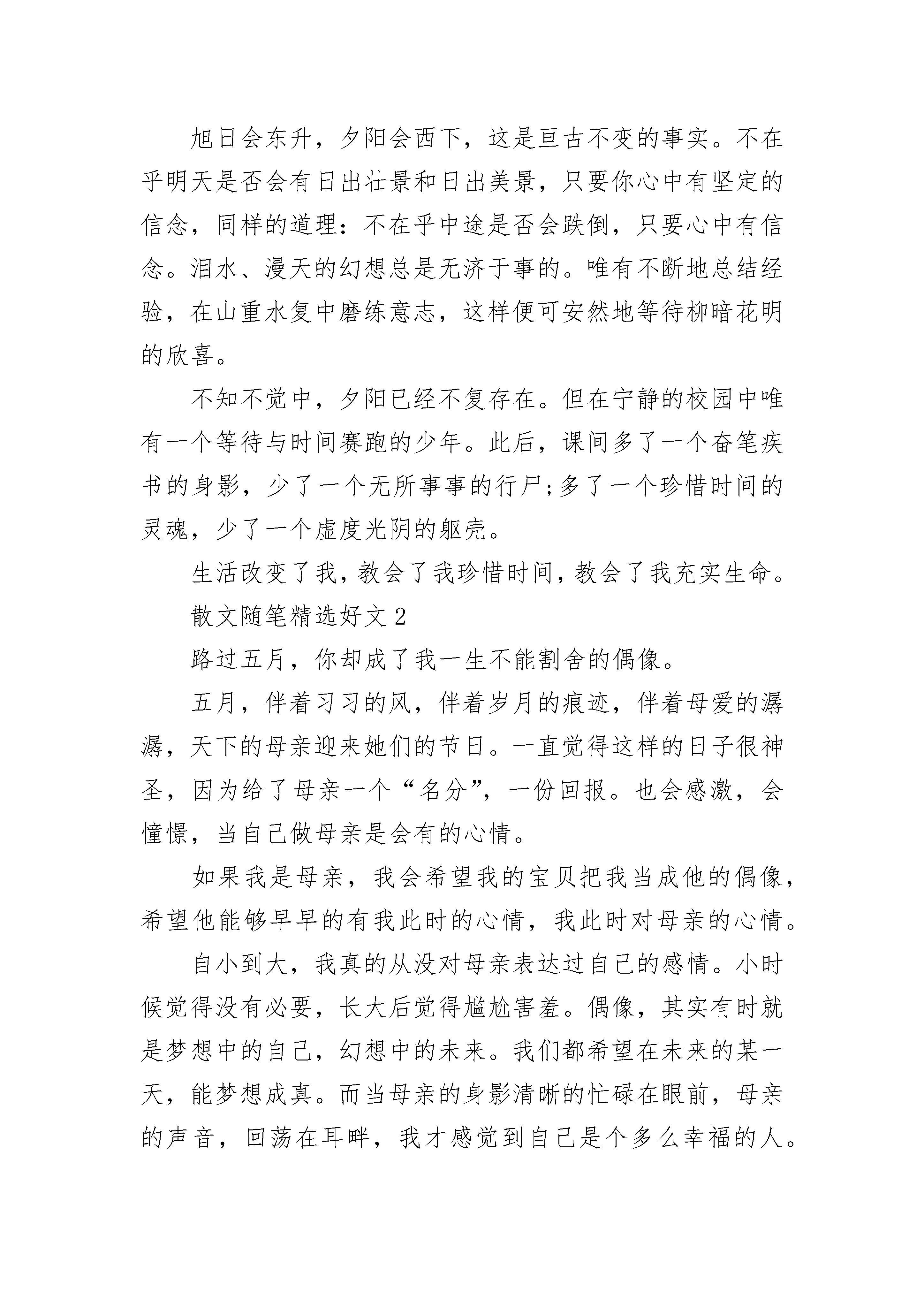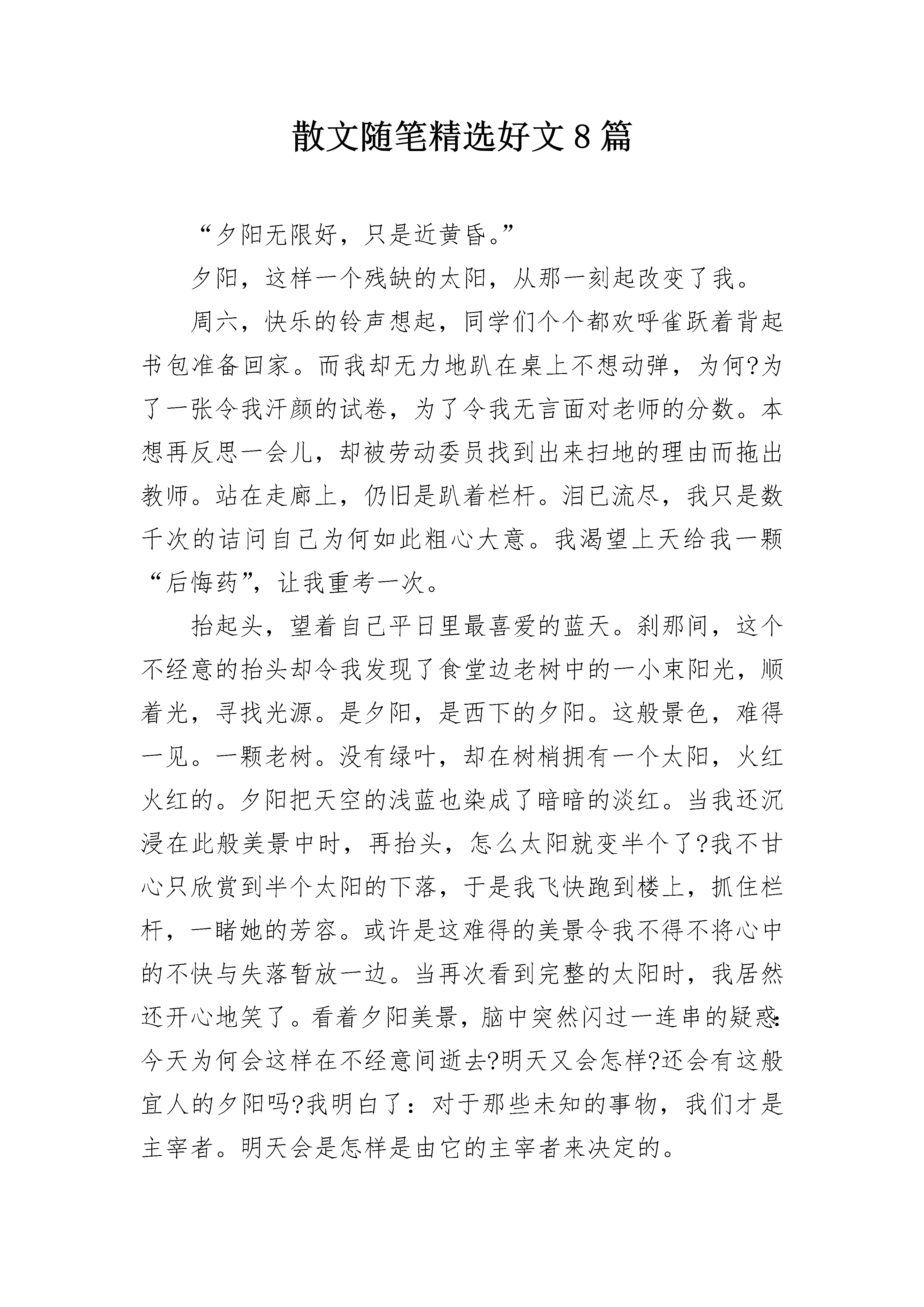 散文随笔精选好文8篇“夕阳无限好,只是近黄昏。”夕阳,这样一个残缺的太阳,从那一刻起改变了我。周六,快乐的铃声想起,同学们个个都欢呼雀跃着背起书包准备回家。而我却无力地趴在桌上不想动弹,为何?为了一张令我汗颜的试卷,为了令我无言面对老师的分数。本想再反思一会儿,却被劳动委员找到出来扫地的理由而拖出教师。站在走廊上,仍旧是趴着栏杆。泪已流尽,我只是数千次的诘问自己为何如此粗心大意。我渴望上天给我一颗“后悔药”,让我重考一次。抬起头,望着自己平日里最喜爱的蓝天。刹那间,这个不经意的抬头却令我发现了食堂边老树中的一小束阳光,顺着光,寻找光源。是夕阳,是西下的夕阳。这般景色,难得一见。一颗老树。没有绿叶,却在树梢拥有一个太阳,火红火红的。夕阳把天空的浅蓝也染成了暗暗的淡红。当我还沉浸在此般美景中时,再抬头,怎么太阳就变半个了?我不甘心只欣赏到半个太阳的下落,于是我飞快跑到楼上,抓住栏杆,一睹她的芳容。或许是这难得的美景令我不得不将心中的不快与失落暂放一边。当再次看到完整的太阳时,我居然还开心地笑了。看着夕阳美景,脑中突然闪过一连串的疑惑:今天为何会这样在不经意间逝去?明天又会怎样?还会有这般宜人的夕阳吗?我明白了:对于那些未知的事物,我们才是主宰者。明天会是怎样是由它的主宰者来决定的。旭日会东升,夕阳会西下,这是亘古不变的事实。不在乎明天是否会有日出壮景和日出美景,只要你心中有坚定的信念,同样的道理:不在乎中途是否会跌倒,只要心中有信念。泪水、漫天的幻想总是无济于事的。唯有不断地总结经验,在山重水复中磨练意志,这样便可安然地等待柳暗花明的欣喜。不知不觉中,夕阳已经不复存在。但在宁静的校园中唯有一个等待与时间赛跑的少年。此后,课间多了一个奋笔疾书的身影,少了一个无所事事的行尸;多了一个珍惜时间的灵魂,少了一个虚度光阴的躯壳。生活改变了我,教会了我珍惜时间,教会了我充实生命。散文随笔精选好文2路过五月,你却成了我一生不能割舍的偶像。五月,伴着习习的风,伴着岁月的痕迹,伴着母爱的潺潺,天下的母亲迎来她们的节日。一直觉得这样的日子很神圣,因为给了母亲一个“名分”,一份回报。也会感激,会憧憬,当自己做母亲是会有的心情。如果我是母亲,我会希望我的宝贝把我当成他的偶像,希望他能够早早的有我此时的心情,我此时对母亲的心情。自小到大,我真的从没对母亲表达过自己的感情。小时候觉得没有必要,长大后觉得尴尬害羞。偶像,其实有时就是梦想中的自己,幻想中的未来。我们都希望在未来的某一天,能梦想成真。而当母亲的身影清晰的忙碌在眼前,母亲的声音,回荡在耳畔,我才感觉到自己是个多么幸福的人。母亲是一个再平凡不过的农村妇女,初中学历,干过建筑队,扛过沙子水泥,虽然我已无法想象一个女人在建筑队上搬砖添瓦的辛酸,但,那是的辛苦所造就出来的母亲的坚韧就这样活生生的在我眼前,这样濡染着我,熏陶着我。这样的母亲是我一生都读不透的书。就像张爱玲说的:“生命是一袭华美的袍,上面爬满了虱子。”生活的细小也曾经让母亲过的痛苦过的煎熬,一个庄稼人从土地上离开,来到了所谓的城里,做最底层的城里人。那是做为小孩子的我们还不能体会,在一个社会立足生存的艰辛。母亲找了一份钟点工的工作,在别人家打扫卫生,这种被我所鄙视的工作,让我在外人面前诉说母亲的“清闲“,抹杀母亲的劳动。那份艰辛在我的虚荣与嬉笑中被埋葬了。带着这份温暖的忏悔,母亲变成我心中永远无法填补的鸿沟。当时光不断流失,当岁也不断刷新她的发。我总在回头不停的多看她几眼,我欣赏她几次。回忆着母亲成为我的偶像好像是从小时候就曾经有过的。小时的我贪恋母亲的怀抱,也听从母亲的话,母亲的行为在我眼里是十分神圣的,她的话语总让我感到毋庸置疑。但长大的我开始脱离她的怀抱,开始留给她背影和声音。冷落她,甚至是鄙夷、不屑。时光呢,还是这样过着,我把母亲抛弃了,它就惩罚我。于是我迷路了,就开始回头找,才发信母亲在我抛弃他的路口一直等,等我回头,等我重新把她变成我的”偶像“。这份五月里的女儿心,就只想”让你为王“。散文随笔精选好文3“总是向你索取,却不曾说谢谢你;每次离开总是装作轻松的样子,微笑着说回去吧,转身却是泪湿眼底……”父亲,你的背影一直在我心中。父亲的背影是高大的,每次回来时,看到其他孩子坐在父亲肩上,吃着棉花糖,嘴里叫嚷着骑马,父亲看到后总是将我一把捉上坐在肩上,一溜跑多远,嘴里哼着轻快的歌声,传出爽朗的笑声,就这样不知不觉中父亲停了下来,只有不舍的和他短暂分别,乡镇上的人都出去打工,办事业,父亲也就随着这股风一直飞到远方……父亲的背影是宽厚的,“叮叮……”学生们飞快冲出教室,底下一片人群,父亲亲切地叫了一声,“在这”。我疑惑地看着他,杂乱的头发中几根白发随风飞舞着,慈祥的眼睛旁不知不觉爬上了几条皱纹,不由我多想,一把抓住我的手往回家的路上走。还
