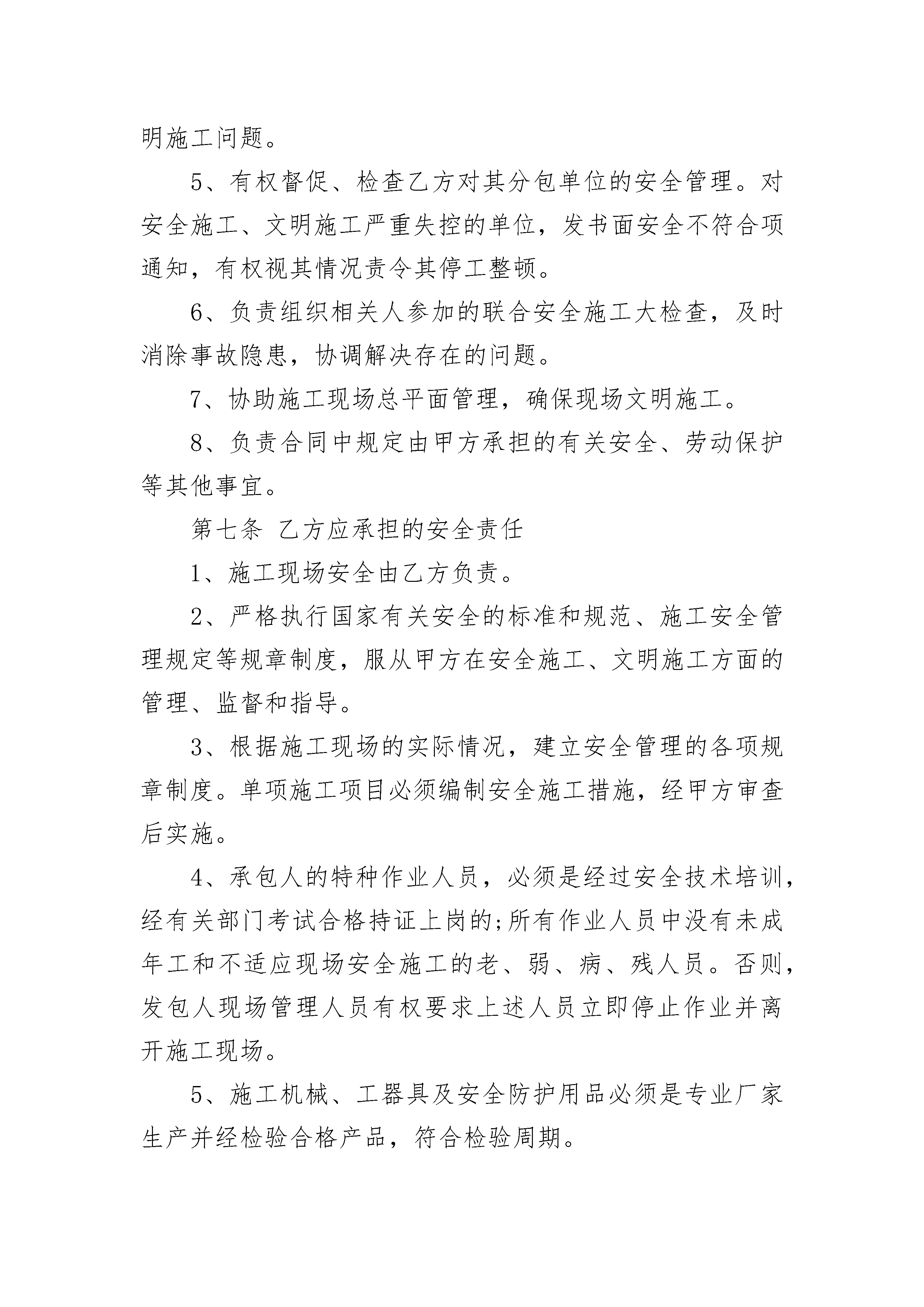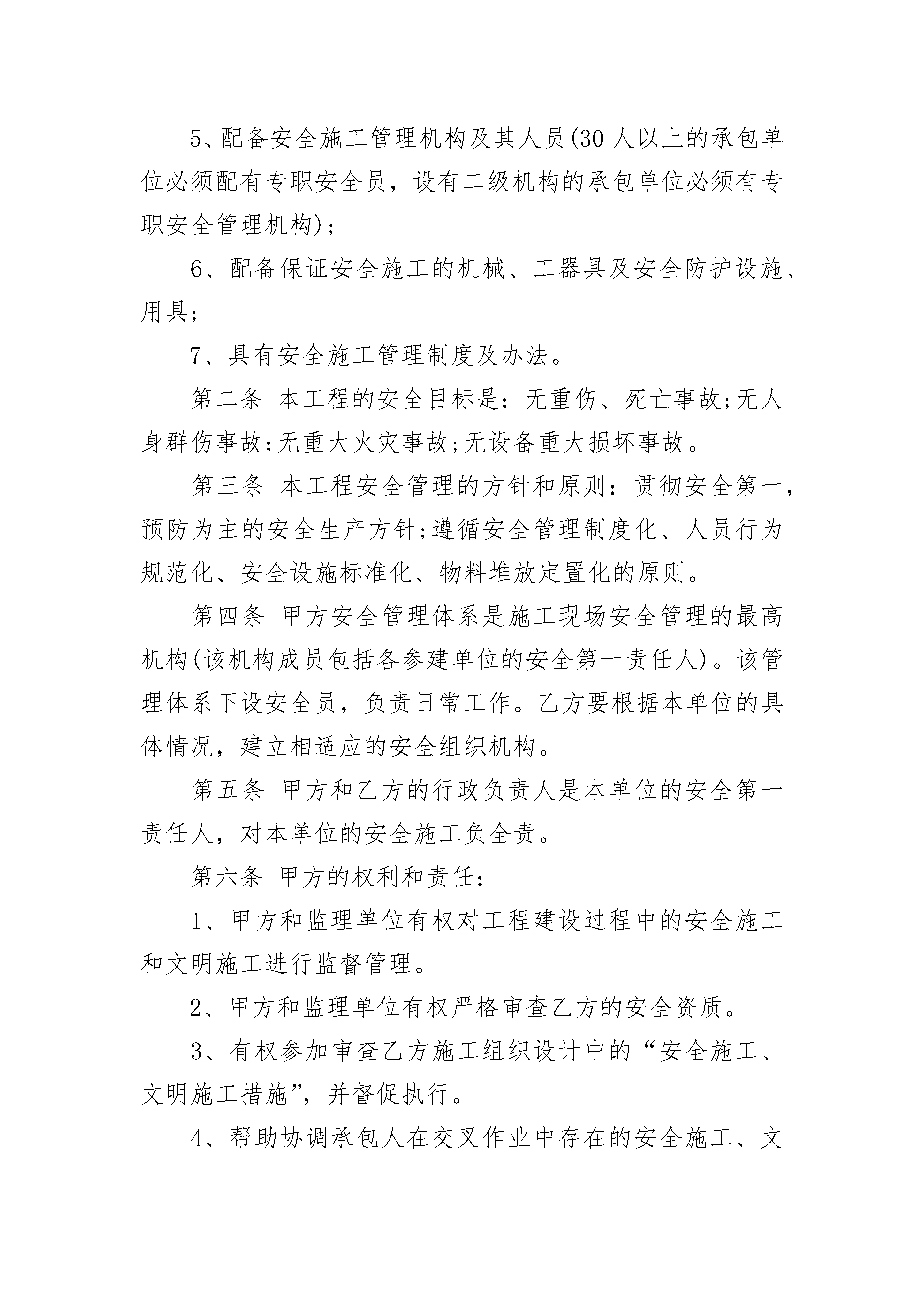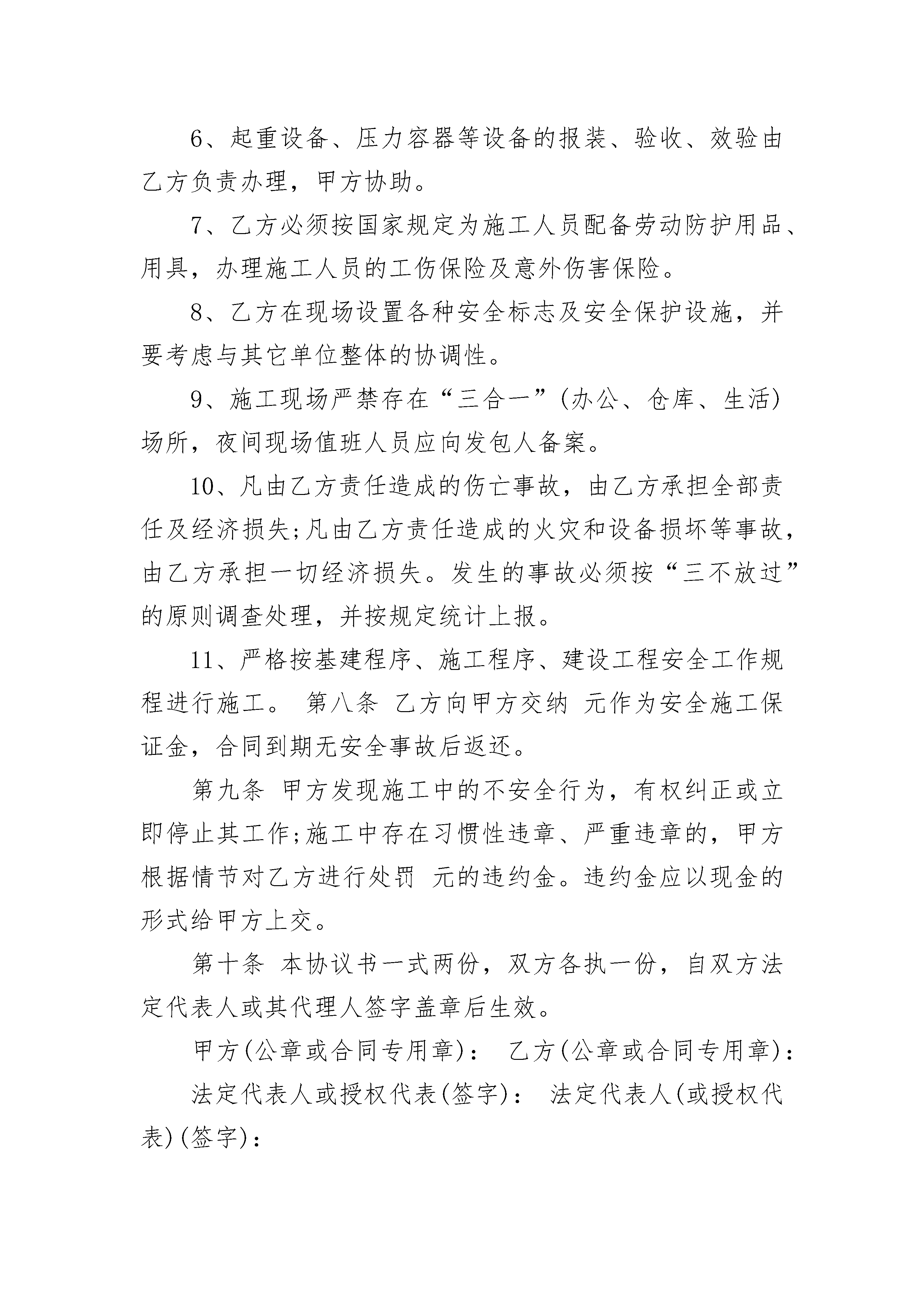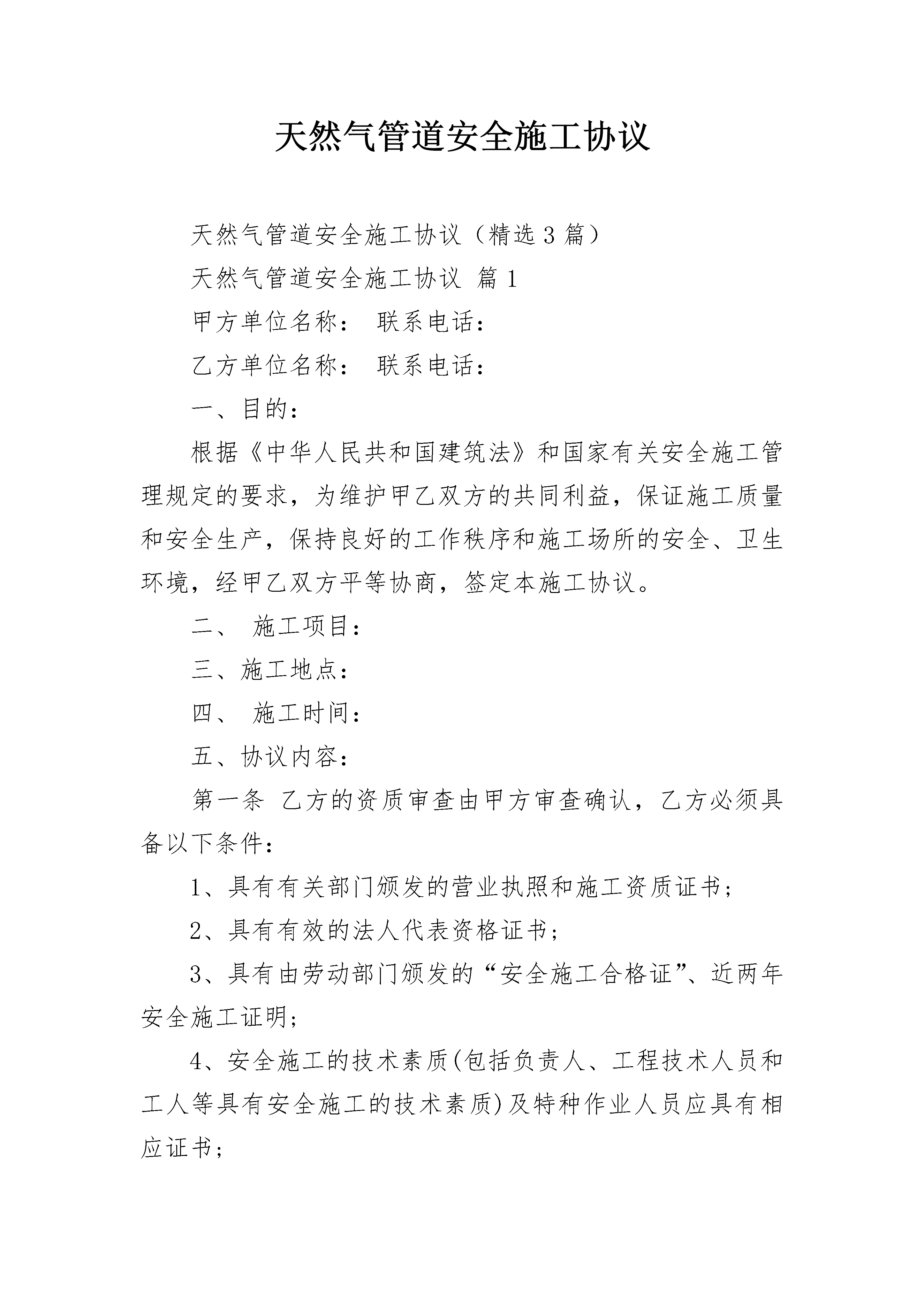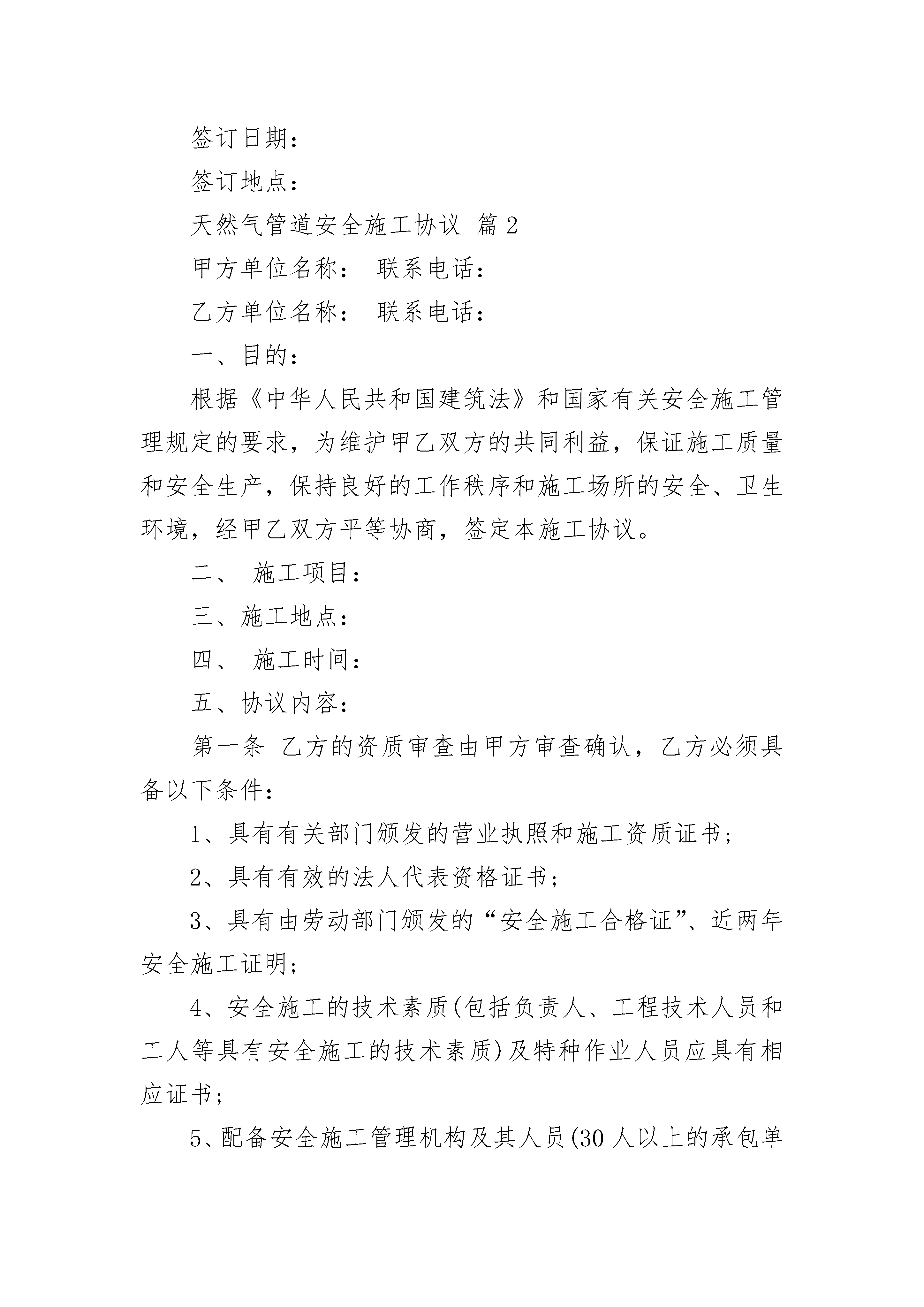 天然气管道安全施工协议天然气管道安全施工协议(精选3篇)天然气管道安全施工协议篇1甲方单位名称:联系电话:乙方单位名称:联系电话:一、目的:根据《中华人民共和国建筑法》和国家有关安全施工管理规定的要求,为维护甲乙双方的共同利益,保证施工质量和安全生产,保持良好的工作秩序和施工场所的安全、卫生环境,经甲乙双方平等协商,签定本施工协议。二、施工项目:三、施工地点:四、施工时间:五、协议内容:第一条乙方的资质审查由甲方审查确认,乙方必须具备以下条件:1、具有有关部门颁发的营业执照和施工资质证书;2、具有有效的法人代表资格证书;3、具有由劳动部门颁发的“安全施工合格证”、近两年安全施工证明;4、安全施工的技术素质(包括负责人、工程技术人员和工人等具有安全施工的技术素质)及特种作业人员应具有相应证书;5、配备安全施工管理机构及其人员(30人以上的承包单位必须配有专职安全员,设有二级机构的承包单位必须有专职安全管理机构);6、配备保证安全施工的机械、工器具及安全防护设施、用具;7、具有安全施工管理制度及办法。第二条本工程的安全目标是:无重伤、死亡事故;无人身群伤事故;无重大火灾事故;无设备重大损坏事故。第三条本工程安全管理的方针和原则:贯彻安全第一,预防为主的安全生产方针;遵循安全管理制度化、人员行为规范化、安全设施标准化、物料堆放定置化的原则。第四条甲方安全管理体系是施工现场安全管理的最高机构(该机构成员包括各参建单位的安全第一责任人)。该管理体系下设安全员,负责日常工作。乙方要根据本单位的具体情况,建立相适应的安全组织机构。第五条甲方和乙方的行政负责人是本单位的安全第一责任人,对本单位的安全施工负全责。第六条甲方的权利和责任:1、甲方和监理单位有权对工程建设过程中的安全施工和文明施工进行监督管理。2、甲方和监理单位有权严格审查乙方的安全资质。3、有权参加审查乙方施工组织设计中的“安全施工、文明施工措施”,并督促执行。4、帮助协调承包人在交叉作业中存在的安全施工、文明施工问题。5、有权督促、检查乙方对其分包单位的安全管理。对安全施工、文明施工严重失控的单位,发书面安全不符合项通知,有权视其情况责令其停工整顿。6、负责组织相关人参加的联合安全施工大检查,及时消除事故隐患,协调解决存在的问题。7、协助施工现场总平面管理,确保现场文明施工。8、负责合同中规定由甲方承担的有关安全、劳动保护等其他事宜。第七条乙方应承担的安全责任1、施工现场安全由乙方负责。2、严格执行国家有关安全的标准和规范、施工安全管理规定等规章制度,服从甲方在安全施工、文明施工方面的管理、监督和指导。3、根据施工现场的实际情况,建立安全管理的各项规章制度。单项施工项目必须编制安全施工措施,经甲方审查后实施。4、承包人的特种作业人员,必须是经过安全技术培训,经有关部门考试合格持证上岗的;所有作业人员中没有未成年工和不适应现场安全施工的老、弱、病、残人员。否则,发包人现场管理人员有权要求上述人员立即停止作业并离开施工现场。5、施工机械、工器具及安全防护用品必须是专业厂家生产并经检验合格产品,符合检验周期。6、起重设备、压力容器等设备的报装、验收、效验由乙方负责办理,甲方协助。7、乙方必须按国家规定为施工人员配备劳动防护用品、用具,办理施工人员的工伤保险及意外伤害保险。8、乙方在现场设置各种安全标志及安全保护设施,并要考虑与其它单位整体的协调性。9、施工现场严禁存在“三合一”(办公、仓库、生活)场所,夜间现场值班人员应向发包人备案。10、凡由乙方责任造成的伤亡事故,由乙方承担全部责任及经济损失;凡由乙方责任造成的火灾和设备损坏等事故,由乙方承担一切经济损失。发生的事故必须按“三不放过”的原则调查处理,并按规定统计上报。11、严格按基建程序、施工程序、建设工程安全工作规程进行施工。第八条乙方向甲方交纳元作为安全施工保证金,合同到期无安全事故后返还。第九条甲方发现施工中的不安全行为,有权纠正或立即停止其工作;施工中存在习惯性违章、严重违章的,甲方根据情节对乙方进行处罚元的违约金。违约金应以现金的形式给甲方上交。第十条本协议书一式两份,双方各执一份,自双方法定代表人或其代理人签字盖章后生效。甲方(公章或合同专用章):乙方(公章或合同专用章):法定代表人或授权代表(签字):法定代表人(或授权代表)(签字):签订日期:签订地点:天然气管道安全施工协议篇2甲方单位名称:联系电话:乙方单位名称:联系电话:一、目的:根据《中华人民共和国建筑法》和国家有关安全施工管理规定的要求,为维护甲乙双方的共同利益,保证施工质量和安全生产,保持良好的工作秩序和施工场所的安全、卫生环境,经甲乙双方平等协商,签定本施工协议。二、施工项目:三、施工地点:四、施工时间:五、协议内容:第一条乙方的资质审查由甲方审查确