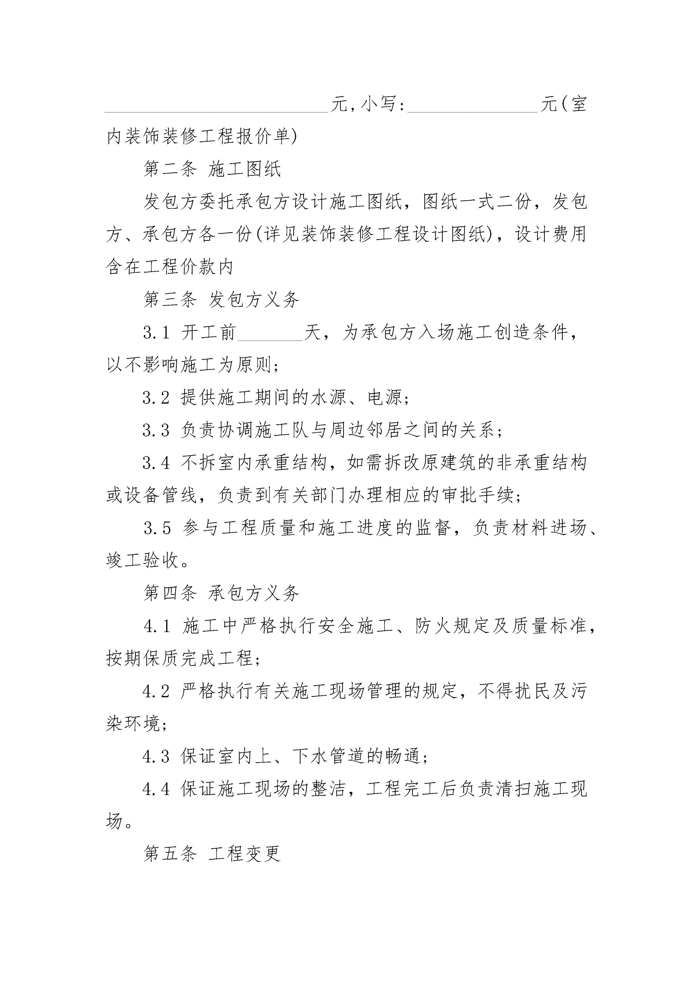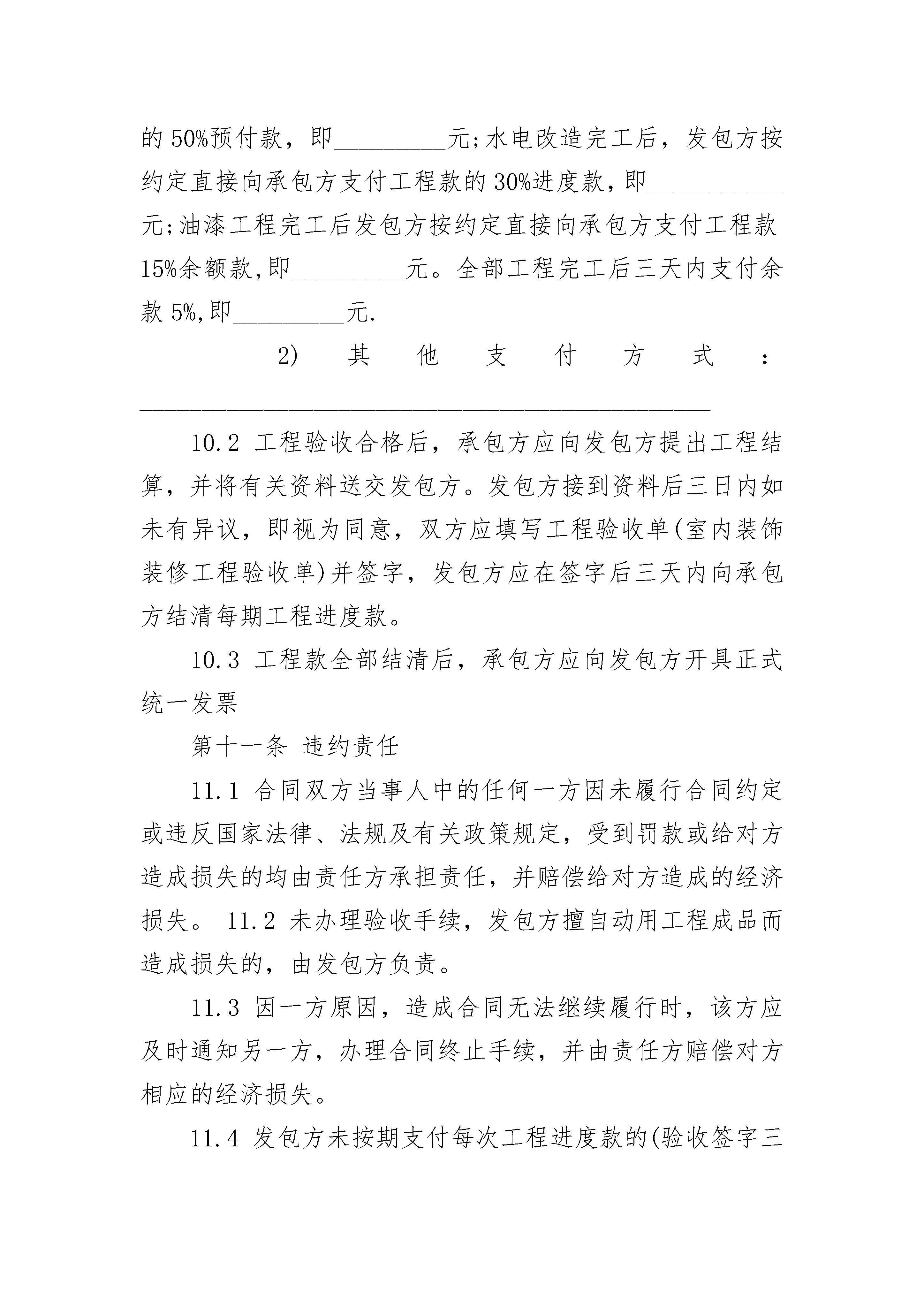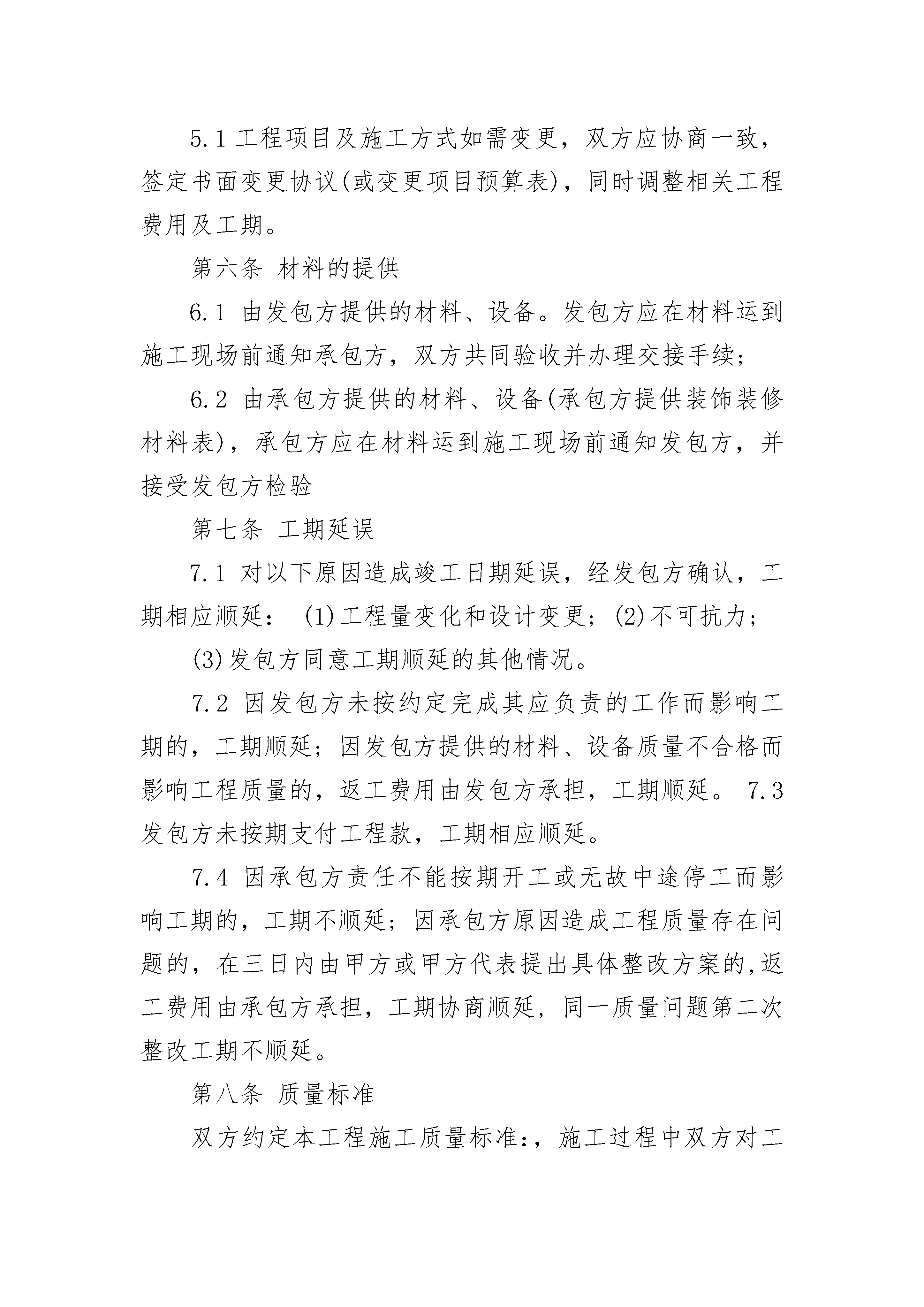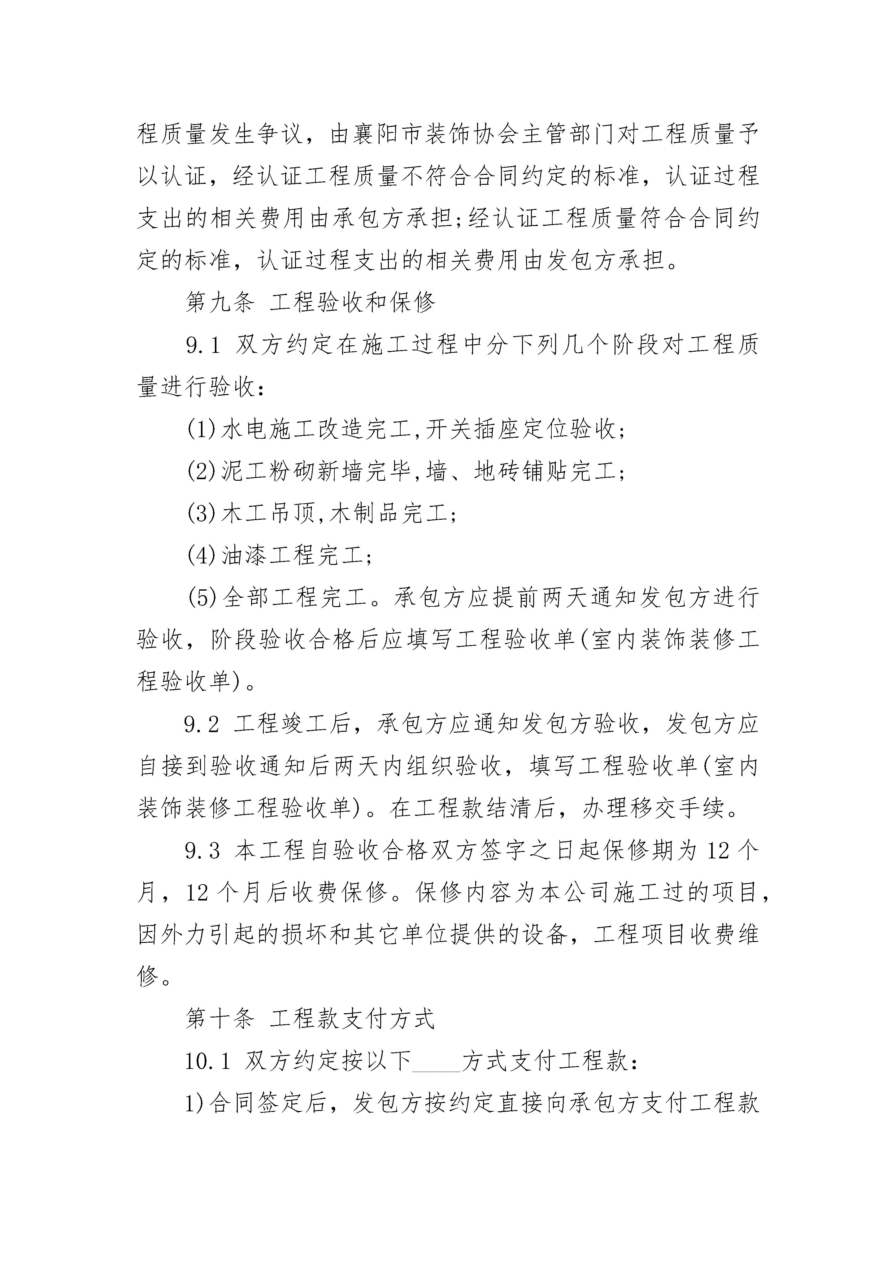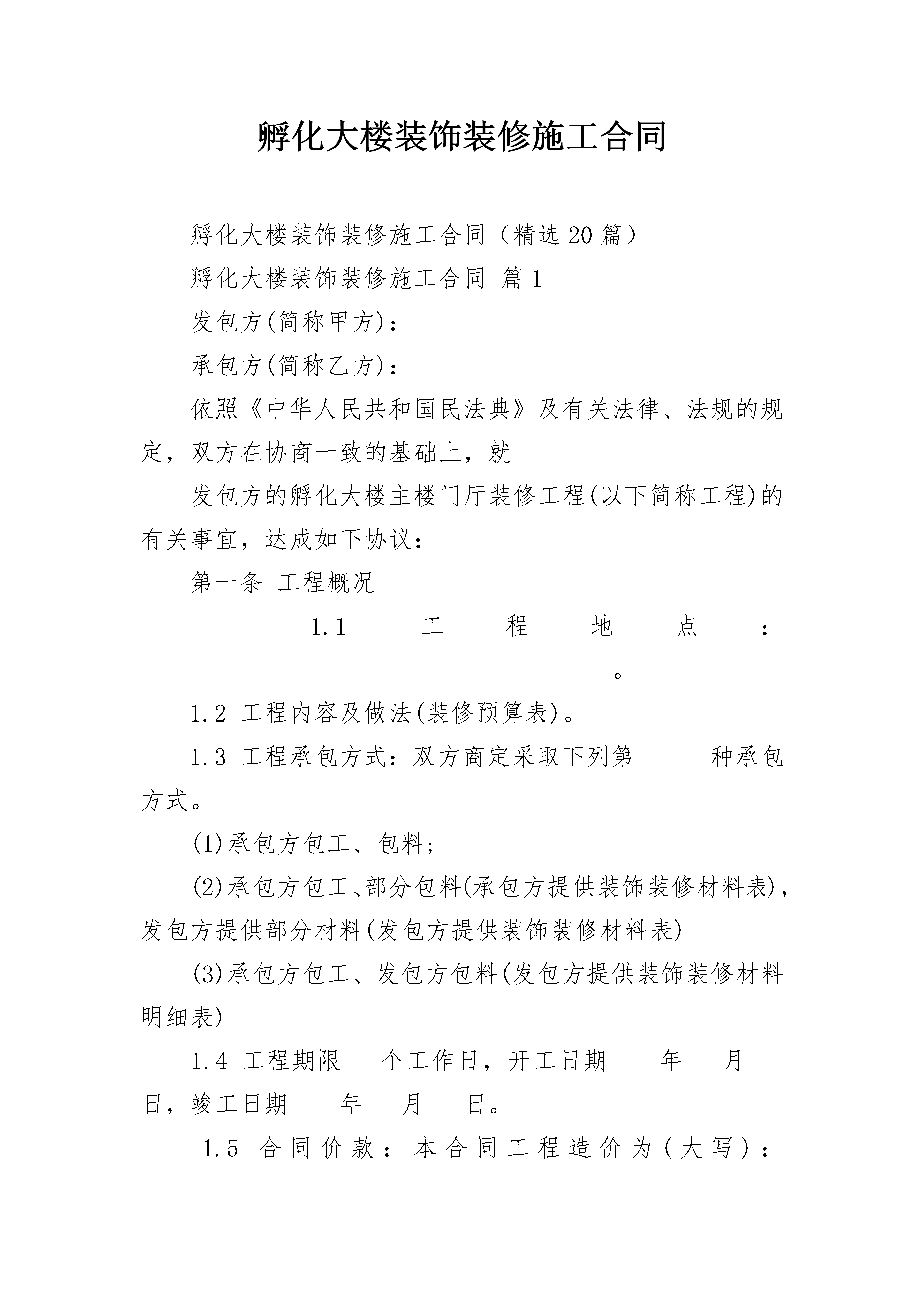孵化大楼装饰装修施工合同孵化大楼装饰装修施工合同(精选20篇)孵化大楼装饰装修施工合同篇1发包方(简称甲方):承包方(简称乙方):依照《中华人民共和国民法典》及有关法律、法规的规定,双方在协商一致的基础上,就发包方的孵化大楼主楼门厅装修工程(以下简称工程)的有关事宜,达成如下协议:第一条工程概况1.1工程地点:______________________________________。1.2工程内容及做法(装修预算表)。1.3工程承包方式:双方商定采取下列第______种承包方式。(1)承包方包工、包料;(2)承包方包工、部分包料(承包方提供装饰装修材料表),发包方提供部分材料(发包方提供装饰装修材料表)(3)承包方包工、发包方包料(发包方提供装饰装修材料明细表)1.4工程期限___个工作日,开工日期____年___月___日,竣工日期____年___月___日。1.5合同价款:本合同工程造价为(大写):________________________元,小写:______________元(室内装饰装修工程报价单)第二条施工图纸发包方委托承包方设计施工图纸,图纸一式二份,发包方、承包方各一份(详见装饰装修工程设计图纸),设计费用含在工程价款内第三条发包方义务3.1开工前_______天,为承包方入场施工创造条件,以不影响施工为原则;3.2提供施工期间的水源、电源;3.3负责协调施工队与周边邻居之间的关系;3.4不拆室内承重结构,如需拆改原建筑的非承重结构或设备管线,负责到有关部门办理相应的审批手续;3.5参与工程质量和施工进度的监督,负责材料进场、竣工验收。第四条承包方义务4.1施工中严格执行安全施工、防火规定及质量标准,按期保质完成工程;4.2严格执行有关施工现场管理的规定,不得扰民及污染环境;4.3保证室内上、下水管道的畅通;4.4保证施工现场的整洁,工程完工后负责清扫施工现场。第五条工程变更5.1工程项目及施工方式如需变更,双方应协商一致,签定书面变更协议(或变更项目预算表),同时调整相关工程费用及工期。第六条材料的提供6.1由发包方提供的材料、设备。发包方应在材料运到施工现场前通知承包方,双方共同验收并办理交接手续;6.2由承包方提供的材料、设备(承包方提供装饰装修材料表),承包方应在材料运到施工现场前通知发包方,并接受发包方检验第七条工期延误7.1对以下原因造成竣工日期延误,经发包方确认,工期相应顺延:(1)工程量变化和设计变更;(2)不可抗力;(3)发包方同意工期顺延的其他情况。7.2因发包方未按约定完成其应负责的工作而影响工期的,工期顺延;因发包方提供的材料、设备质量不合格而影响工程质量的,返工费用由发包方承担,工期顺延。7.3发包方未按期支付工程款,工期相应顺延。7.4因承包方责任不能按期开工或无故中途停工而影响工期的,工期不顺延;因承包方原因造成工程质量存在问题的,在三日内由甲方或甲方代表提出具体整改方案的,返工费用由承包方承担,工期协商顺延,同一质量问题第二次整改工期不顺延。第八条质量标准双方约定本工程施工质量标准:,施工过程中双方对工程质量发生争议,由襄阳市装饰协会主管部门对工程质量予以认证,经认证工程质量不符合合同约定的标准,认证过程支出的相关费用由承包方承担;经认证工程质量符合合同约定的标准,认证过程支出的相关费用由发包方承担。第九条工程验收和保修9.1双方约定在施工过程中分下列几个阶段对工程质量进行验收:(1)水电施工改造完工,开关插座定位验收;(2)泥工粉砌新墙完毕,墙、地砖铺贴完工;(3)木工吊顶,木制品完工;(4)油漆工程完工;(5)全部工程完工。承包方应提前两天通知发包方进行验收,阶段验收合格后应填写工程验收单(室内装饰装修工程验收单)。9.2工程竣工后,承包方应通知发包方验收,发包方应自接到验收通知后两天内组织验收,填写工程验收单(室内装饰装修工程验收单)。在工程款结清后,办理移交手续。9.3本工程自验收合格双方签字之日起保修期为12个月,12个月后收费保修。保修内容为本公司施工过的项目,因外力引起的损坏和其它单位提供的设备,工程项目收费维修。第十条工程款支付方式10.1双方约定按以下____方式支付工程款:1)合同签定后,发包方按约定直接向承包方支付工程款的50%预付款,即_________元;水电改造完工后,发包方按约定直接向承包方支付工程款的30%进度款,即___________元;油漆工程完工后发包方按约定直接向承包方支付工程款15%余额款,即_________元。全部工程完工后三天内支付余款5%,即_________元.2)其他支付方式:______________________________________________10.2工程验收合格后,承包方应向发包方提出
