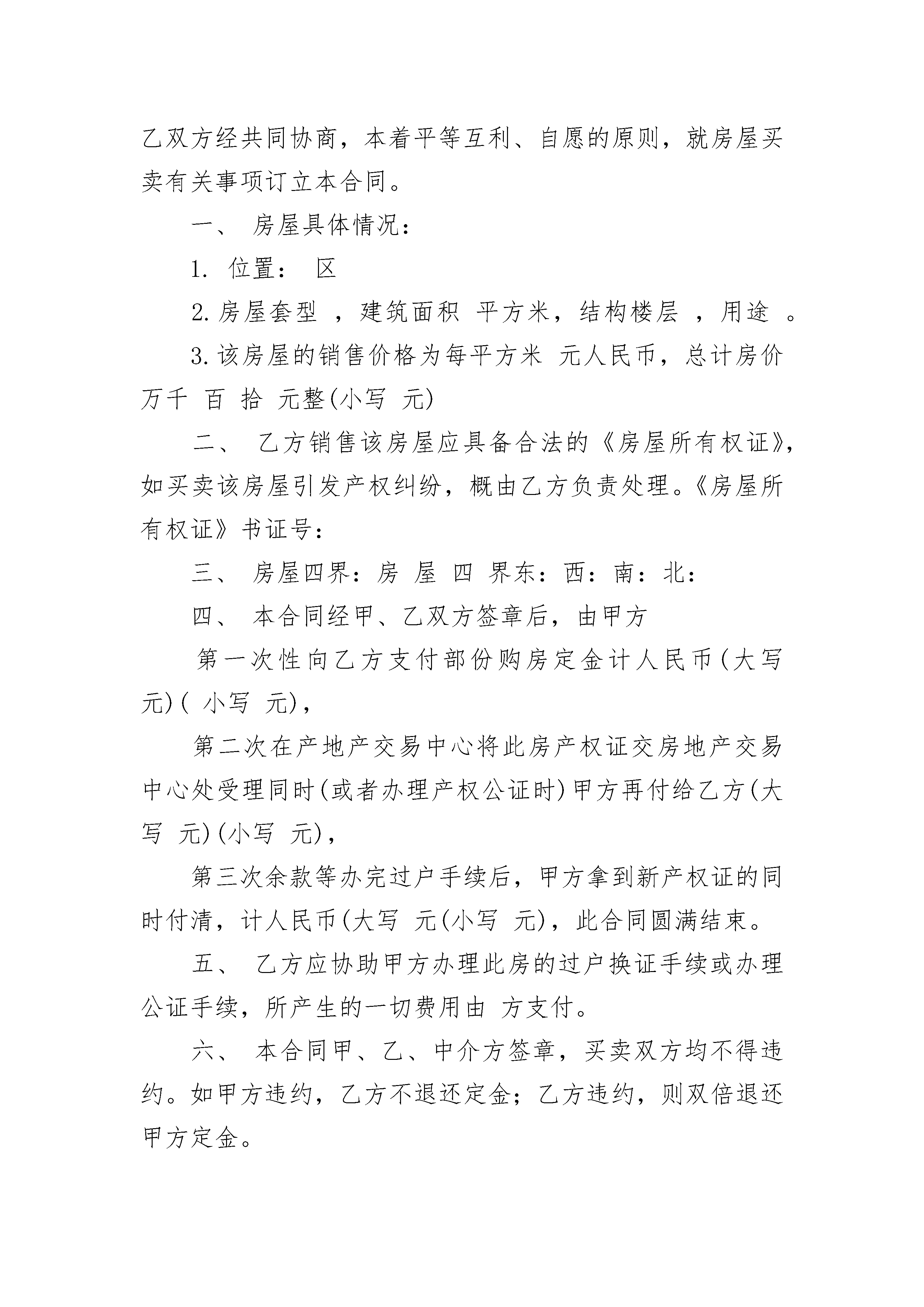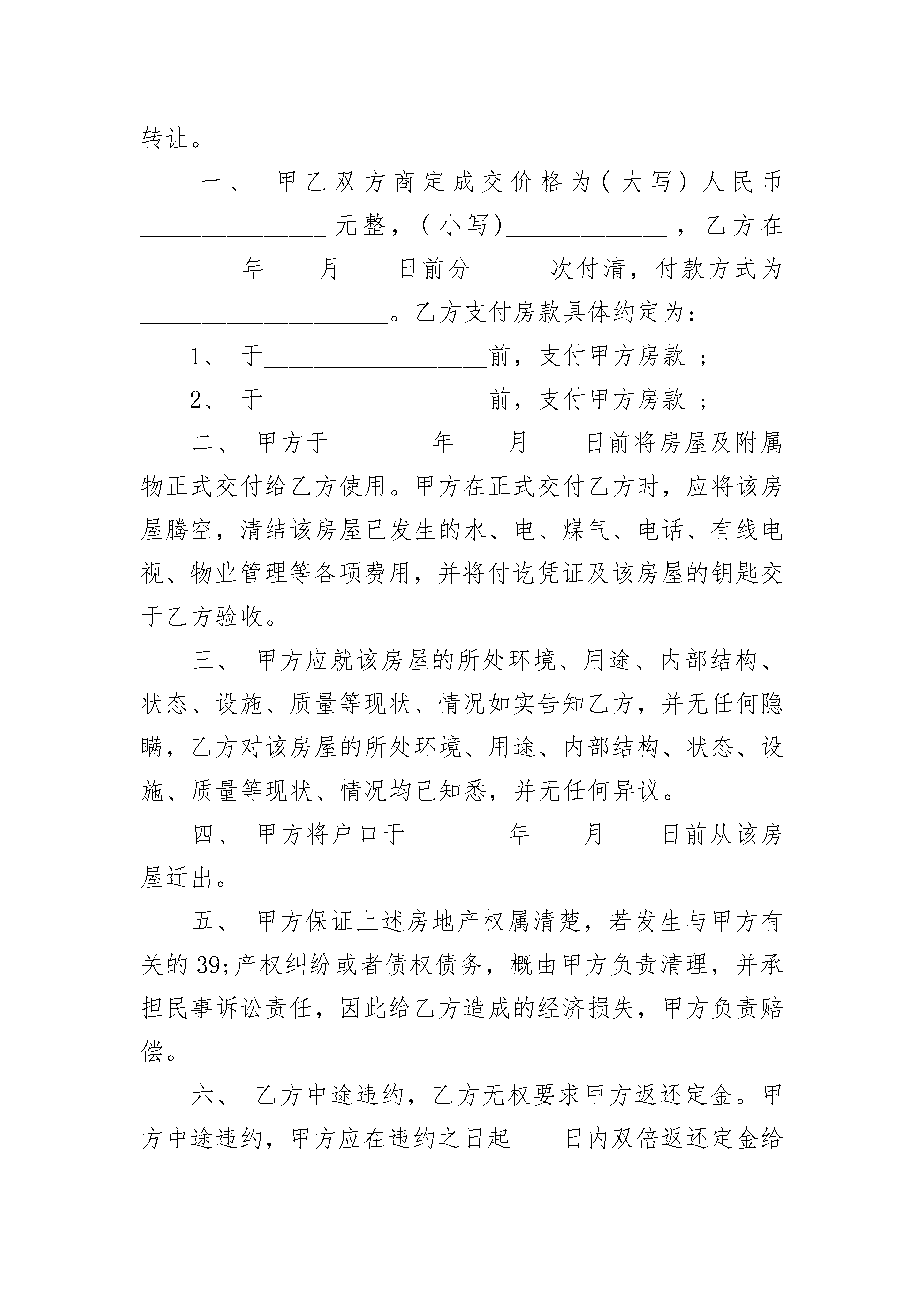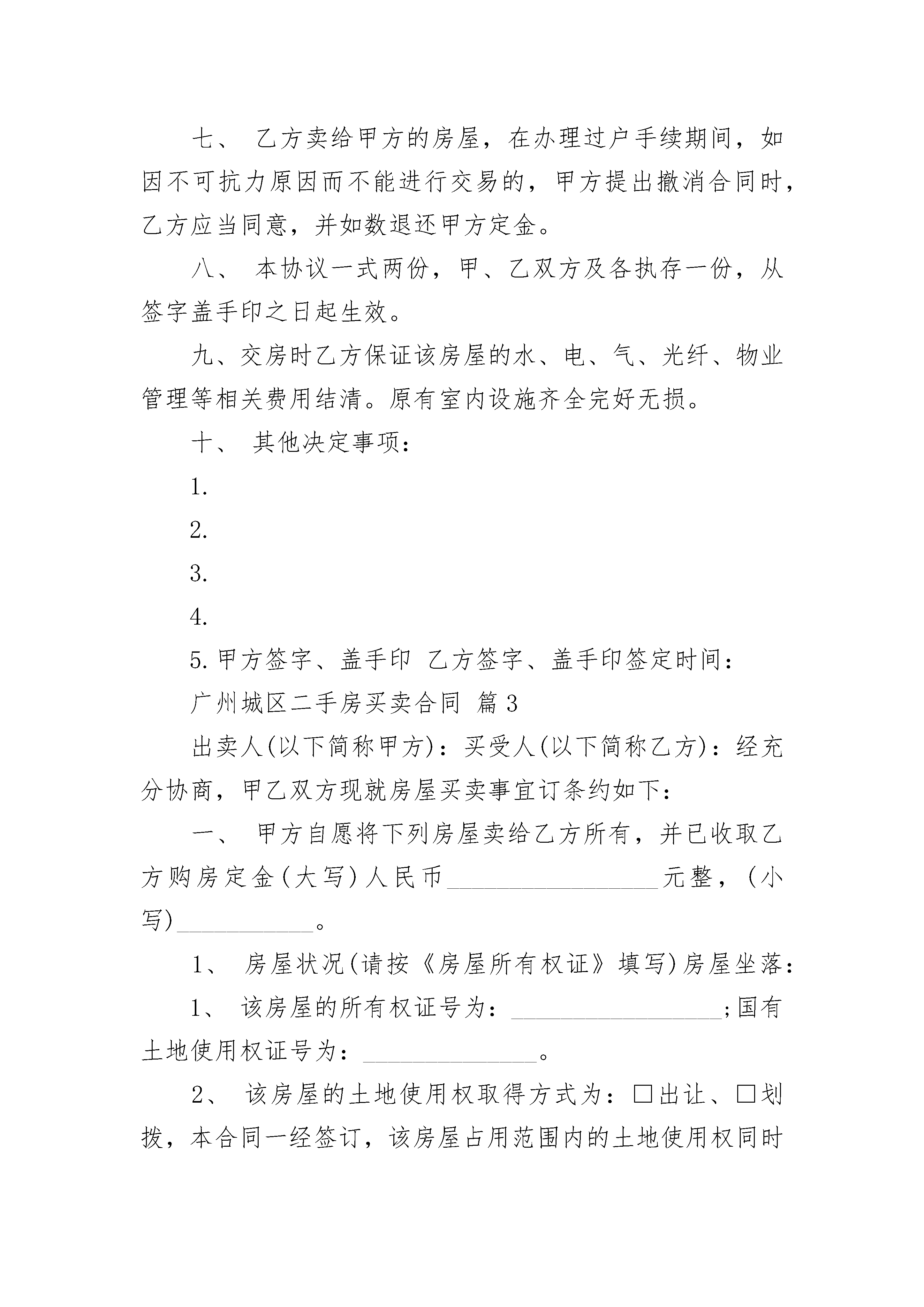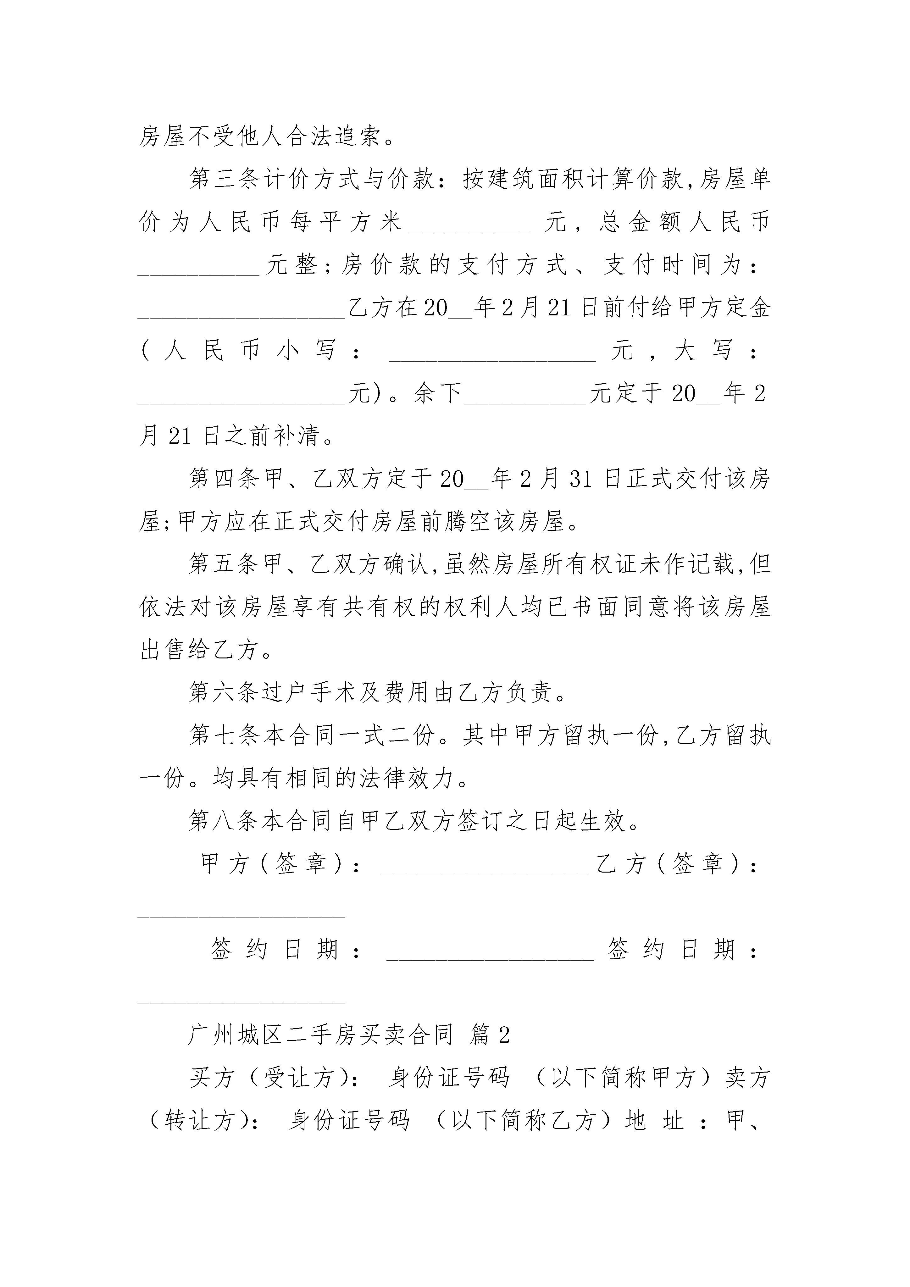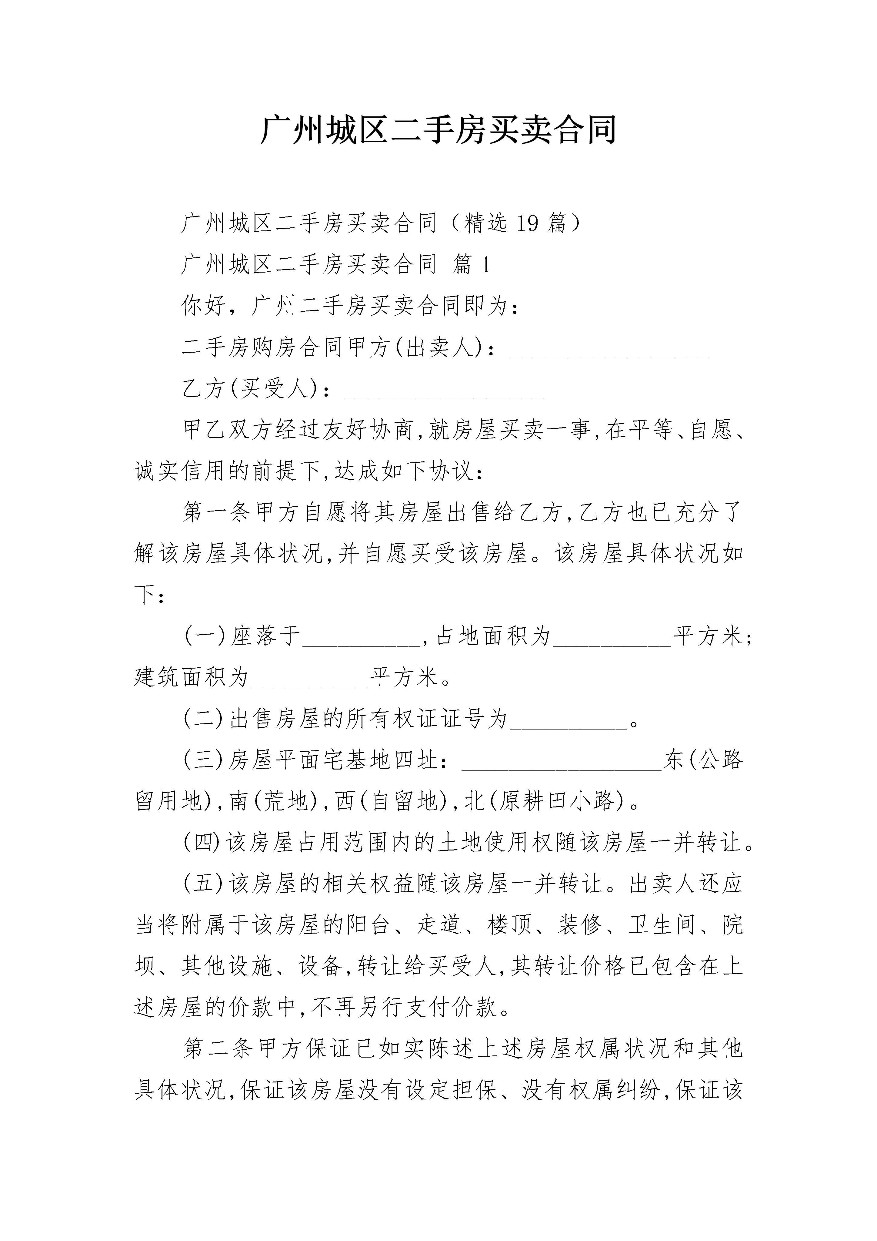 广州城区二手房买卖合同广州城区二手房买卖合同(精选19篇)广州城区二手房买卖合同篇1你好,广州二手房买卖合同即为:二手房购房合同甲方(出卖人):_________________乙方(买受人):_________________甲乙双方经过友好协商,就房屋买卖一事,在平等、自愿、诚实信用的前提下,达成如下协议:第一条甲方自愿将其房屋出售给乙方,乙方也已充分了解该房屋具体状况,并自愿买受该房屋。该房屋具体状况如下:(一)座落于__________,占地面积为__________平方米;建筑面积为__________平方米。(二)出售房屋的所有权证证号为__________。(三)房屋平面宅基地四址:_________________东(公路留用地),南(荒地),西(自留地),北(原耕田小路)。(四)该房屋占用范围内的土地使用权随该房屋一并转让。(五)该房屋的相关权益随该房屋一并转让。出卖人还应当将附属于该房屋的阳台、走道、楼顶、装修、卫生间、院坝、其他设施、设备,转让给买受人,其转让价格已包含在上述房屋的价款中,不再另行支付价款。第二条甲方保证已如实陈述上述房屋权属状况和其他具体状况,保证该房屋没有设定担保、没有权属纠纷,保证该房屋不受他人合法追索。第三条计价方式与价款:按建筑面积计算价款,房屋单价为人民币每平方米__________元,总金额人民币__________元整;房价款的支付方式、支付时间为:_________________乙方在20__年2月21日前付给甲方定金(人民币小写:_________________元,大写:_________________元)。余下__________元定于20__年2月21日之前补清。第四条甲、乙双方定于20__年2月31日正式交付该房屋;甲方应在正式交付房屋前腾空该房屋。第五条甲、乙双方确认,虽然房屋所有权证未作记载,但依法对该房屋享有共有权的权利人均已书面同意将该房屋出售给乙方。第六条过户手术及费用由乙方负责。第七条本合同一式二份。其中甲方留执一份,乙方留执一份。均具有相同的法律效力。第八条本合同自甲乙双方签订之日起生效。甲方(签章):_________________乙方(签章):_________________签约日期:_________________签约日期:_________________广州城区二手房买卖合同篇2买方(受让方):身份证号码(以下简称甲方)卖方(转让方):身份证号码(以下简称乙方)地址:甲、乙双方经共同协商,本着平等互利、自愿的原则,就房屋买卖有关事项订立本合同。一、房屋具体情况:1.位置:区2.房屋套型,建筑面积平方米,结构楼层,用途。3.该房屋的销售价格为每平方米元人民币,总计房价万千百拾元整(小写元)二、乙方销售该房屋应具备合法的《房屋所有权证》,如买卖该房屋引发产权纠纷,概由乙方负责处理。《房屋所有权证》书证号:三、房屋四界:房屋四界东:西:南:北:四、本合同经甲、乙双方签章后,由甲方第一次性向乙方支付部份购房定金计人民币(大写元)(小写元),第二次在产地产交易中心将此房产权证交房地产交易中心处受理同时(或者办理产权公证时)甲方再付给乙方(大写元)(小写元),第三次余款等办完过户手续后,甲方拿到新产权证的同时付清,计人民币(大写元(小写元),此合同圆满结束。五、乙方应协助甲方办理此房的过户换证手续或办理公证手续,所产生的一切费用由方支付。六、本合同甲、乙、中介方签章,买卖双方均不得违约。如甲方违约,乙方不退还定金;乙方违约,则双倍退还甲方定金。七、乙方卖给甲方的房屋,在办理过户手续期间,如因不可抗力原因而不能进行交易的,甲方提出撤消合同时,乙方应当同意,并如数退还甲方定金。八、本协议一式两份,甲、乙双方及各执存一份,从签字盖手印之日起生效。九、交房时乙方保证该房屋的水、电、气、光纤、物业管理等相关费用结清。原有室内设施齐全完好无损。十、其他决定事项:1.2.3.4.5.甲方签字、盖手印乙方签字、盖手印签定时间:广州城区二手房买卖合同篇3出卖人(以下简称甲方):买受人(以下简称乙方):经充分协商,甲乙双方现就房屋买卖事宜订条约如下:一、甲方自愿将下列房屋卖给乙方所有,并已收取乙方购房定金(大写)人民币_________________元整,(小写)___________。1、房屋状况(请按《房屋所有权证》填写)房屋坐落:1、该房屋的所有权证号为:_________________;国有土地使用权证号为:______________。2、该房屋的土地使用权取得方式为:□出让、□划拨,本合同一经签订,该房屋占用范围内的土地使用权同时转让。一、甲乙双方商定成交价格为(大写)人民币_______________元整,(小写)___________