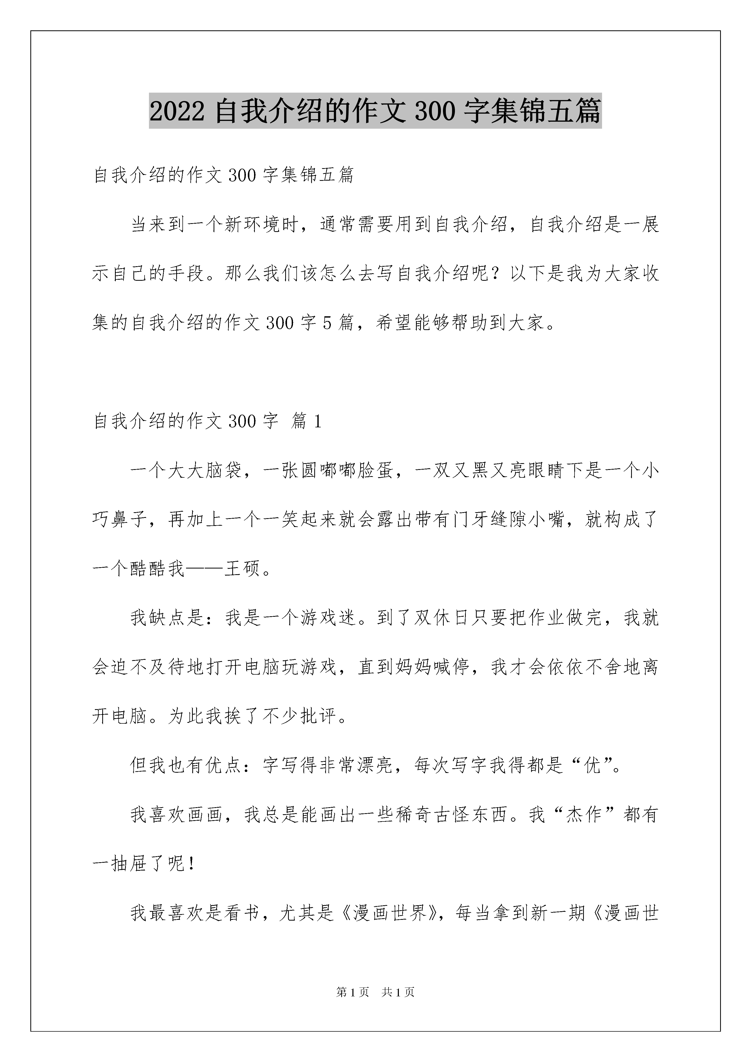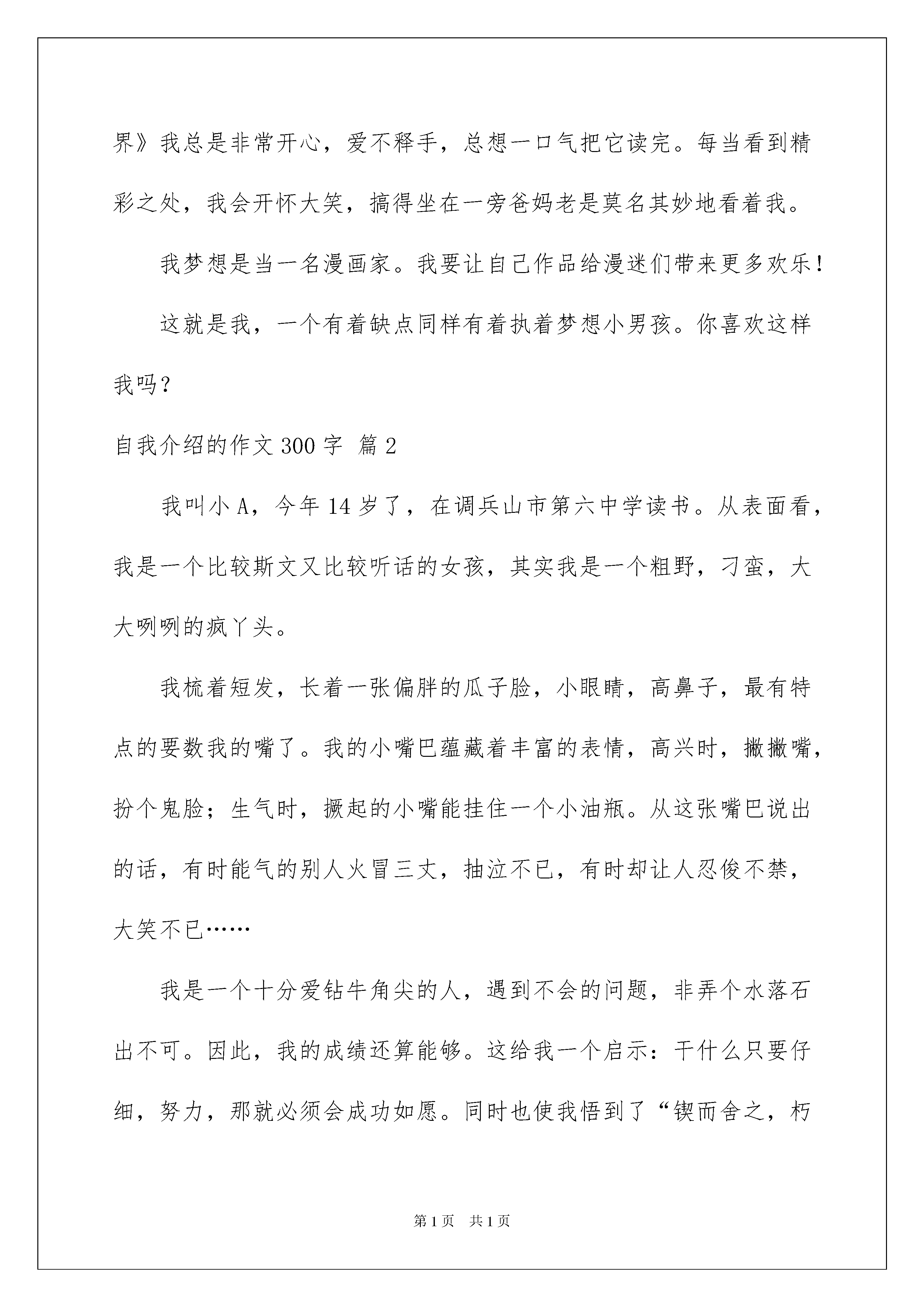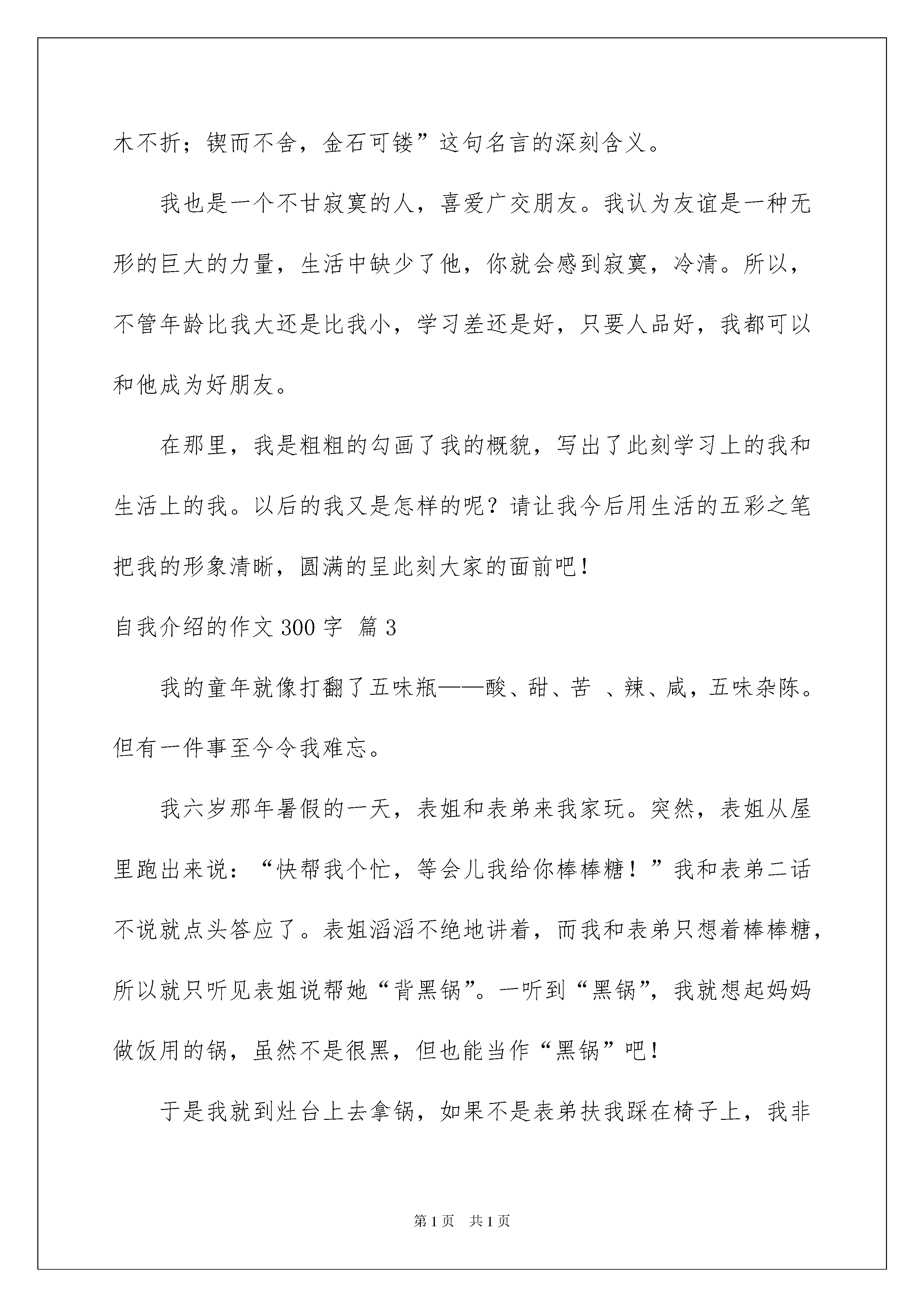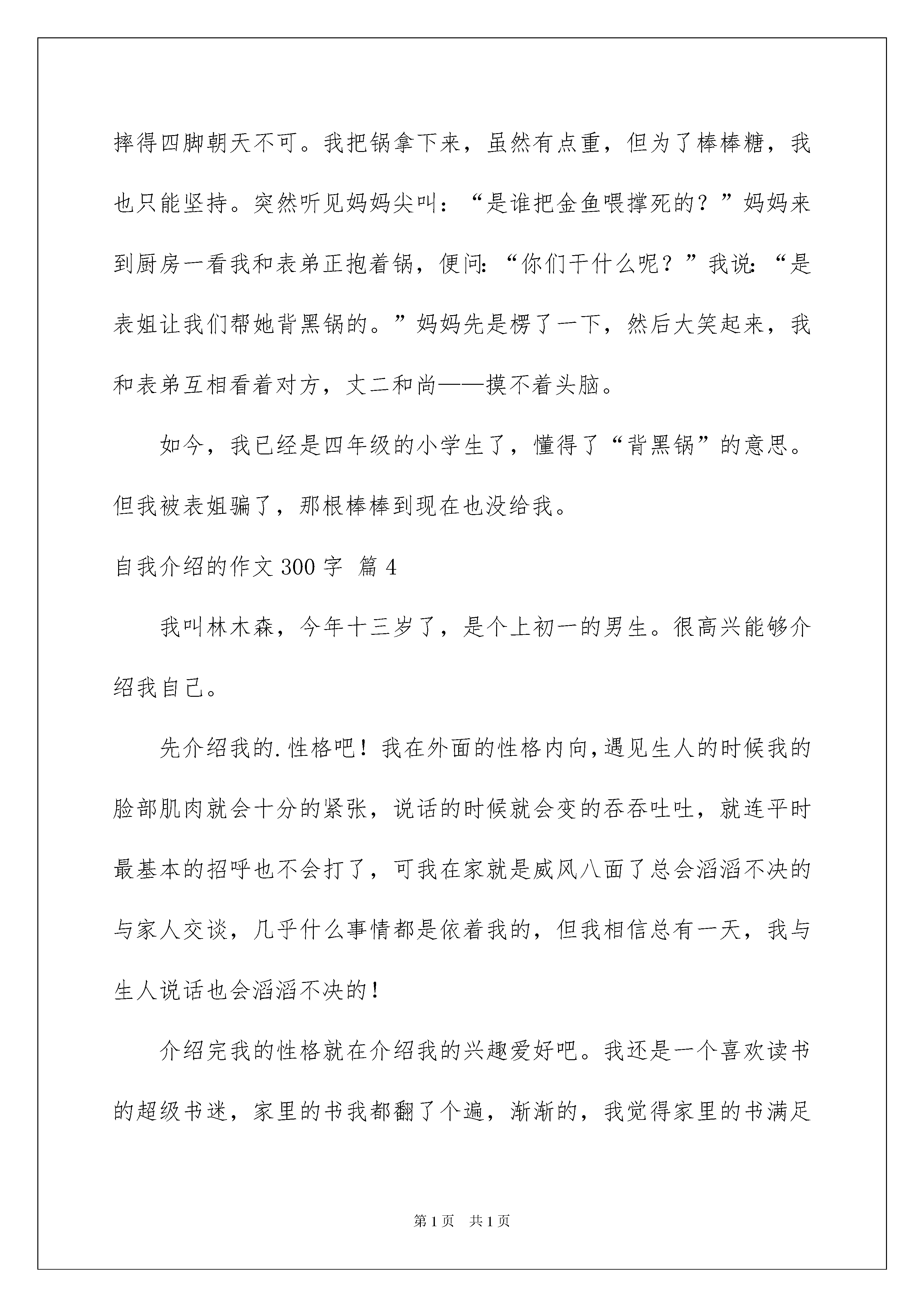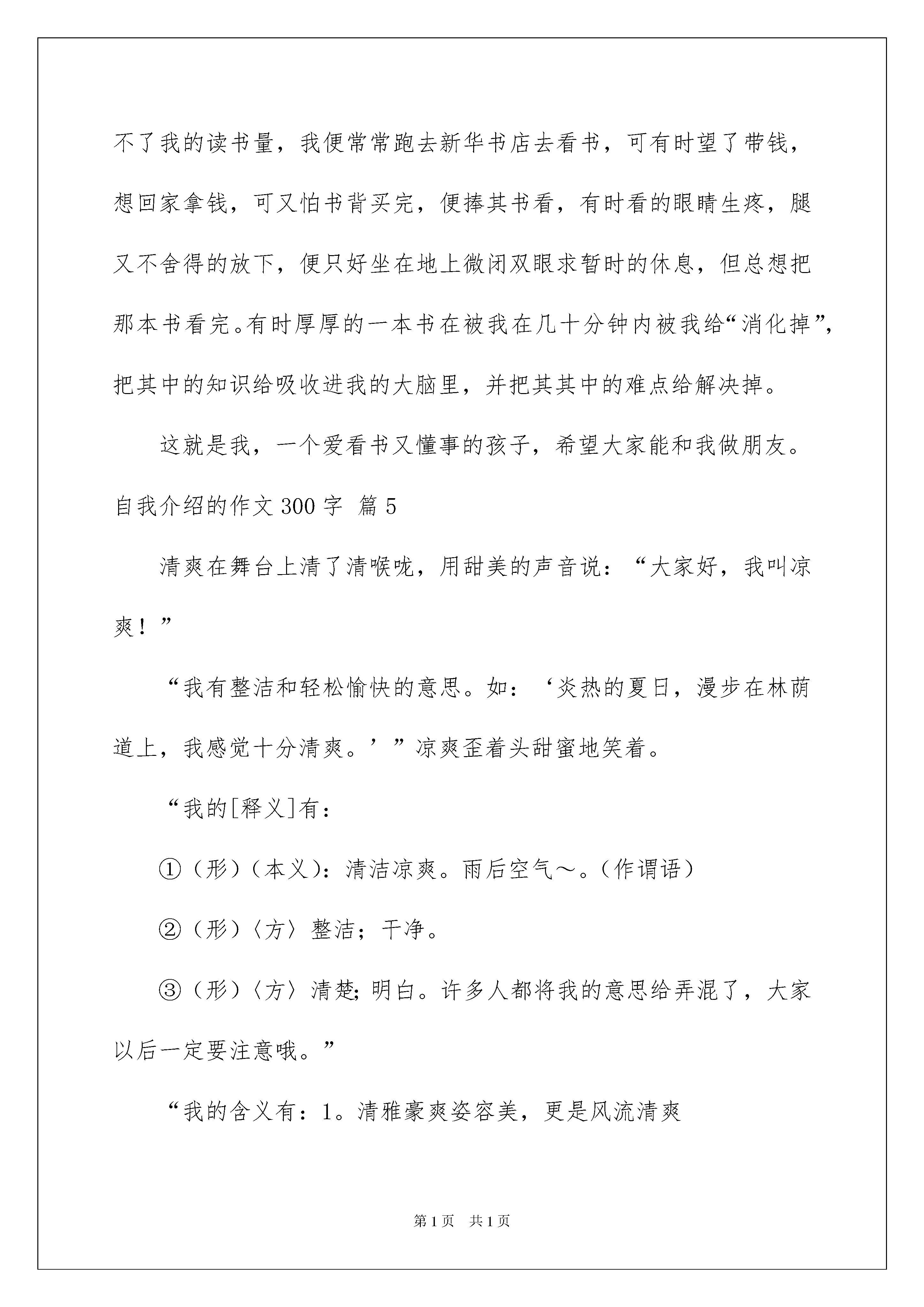 2022自我介绍的作文300字集锦五篇自我介绍的作文300字集锦五篇当来到一个新环境时,通常需要用到自我介绍,自我介绍是一展示自己的手段。那么我们该怎么去写自我介绍呢?以下是我为大家收集的自我介绍的作文300字5篇,希望能够帮助到大家。自我介绍的作文300字篇1一个大大脑袋,一张圆嘟嘟脸蛋,一双又黑又亮眼睛下是一个小巧鼻子,再加上一个一笑起来就会露出带有门牙缝隙小嘴,就构成了一个酷酷我——王硕。我缺点是:我是一个游戏迷。到了双休日只要把作业做完,我就会迫不及待地打开电脑玩游戏,直到妈妈喊停,我才会依依不舍地离开电脑。为此我挨了不少批评。但我也有优点:字写得非常漂亮,每次写字我得都是“优”。我喜欢画画,我总是能画出一些稀奇古怪东西。我“杰作”都有一抽屉了呢!我最喜欢是看书,尤其是《漫画世界》,每当拿到新一期《漫画世界》我总是非常开心,爱不释手,总想一口气把它读完。每当看到精彩之处,我会开怀大笑,搞得坐在一旁爸妈老是莫名其妙地看着我。我梦想是当一名漫画家。我要让自己作品给漫迷们带来更多欢乐!这就是我,一个有着缺点同样有着执着梦想小男孩。你喜欢这样我吗?自我介绍的作文300字篇2我叫小A,今年14岁了,在调兵山市第六中学读书。从表面看,我是一个比较斯文又比较听话的女孩,其实我是一个粗野,刁蛮,大大咧咧的疯丫头。我梳着短发,长着一张偏胖的瓜子脸,小眼睛,高鼻子,最有特点的要数我的嘴了。我的小嘴巴蕴藏着丰富的表情,高兴时,撇撇嘴,扮个鬼脸;生气时,撅起的小嘴能挂住一个小油瓶。从这张嘴巴说出的话,有时能气的别人火冒三丈,抽泣不已,有时却让人忍俊不禁,大笑不已……我是一个十分爱钻牛角尖的人,遇到不会的问题,非弄个水落石出不可。因此,我的成绩还算能够。这给我一个启示:干什么只要仔细,努力,那就必须会成功如愿。同时也使我悟到了“锲而舍之,朽木不折;锲而不舍,金石可镂”这句名言的深刻含义。我也是一个不甘寂寞的人,喜爱广交朋友。我认为友谊是一种无形的巨大的力量,生活中缺少了他,你就会感到寂寞,冷清。所以,不管年龄比我大还是比我小,学习差还是好,只要人品好,我都可以和他成为好朋友。在那里,我是粗粗的勾画了我的概貌,写出了此刻学习上的我和生活上的我。以后的我又是怎样的呢?请让我今后用生活的五彩之笔把我的形象清晰,圆满的呈此刻大家的面前吧!自我介绍的作文300字篇3我的童年就像打翻了五味瓶——酸、甜、苦、辣、咸,五味杂陈。但有一件事至今令我难忘。我六岁那年暑假的一天,表姐和表弟来我家玩。突然,表姐从屋里跑出来说:“快帮我个忙,等会儿我给你棒棒糖!”我和表弟二话不说就点头答应了。表姐滔滔不绝地讲着,而我和表弟只想着棒棒糖,所以就只听见表姐说帮她“背黑锅”。一听到“黑锅”,我就想起妈妈做饭用的锅,虽然不是很黑,但也能当作“黑锅”吧!于是我就到灶台上去拿锅,如果不是表弟扶我踩在椅子上,我非摔得四脚朝天不可。我把锅拿下来,虽然有点重,但为了棒棒糖,我也只能坚持。突然听见妈妈尖叫:“是谁把金鱼喂撑死的?”妈妈来到厨房一看我和表弟正抱着锅,便问:“你们干什么呢?”我说:“是表姐让我们帮她背黑锅的。”妈妈先是楞了一下,然后大笑起来,我和表弟互相看着对方,丈二和尚——摸不着头脑。如今,我已经是四年级的小学生了,懂得了“背黑锅”的意思。但我被表姐骗了,那根棒棒到现在也没给我。自我介绍的作文300字篇4我叫林木森,今年十三岁了,是个上初一的男生。很高兴能够介绍我自己。先介绍我的.性格吧!我在外面的性格内向,遇见生人的时候我的脸部肌肉就会十分的紧张,说话的时候就会变的吞吞吐吐,就连平时最基本的招呼也不会打了,可我在家就是威风八面了总会滔滔不决的与家人交谈,几乎什么事情都是依着我的,但我相信总有一天,我与生人说话也会滔滔不决的!介绍完我的性格就在介绍我的兴趣爱好吧。我还是一个喜欢读书的超级书迷,家里的书我都翻了个遍,渐渐的,我觉得家里的书满足不了我的读书量,我便常常跑去新华书店去看书,可有时望了带钱,想回家拿钱,可又怕书背买完,便捧其书看,有时看的眼睛生疼,腿又不舍得的放下,便只好坐在地上微闭双眼求暂时的休息,但总想把那本书看完。有时厚厚的一本书在被我在几十分钟内被我给“消化掉”,把其中的知识给吸收进我的大脑里,并把其其中的难点给解决掉。这就是我,一个爱看书又懂事的孩子,希望大家能和我做朋友。自我介绍的作文300字篇5清爽在舞台上清了清喉咙,用甜美的声音说:“大家好,我叫凉爽!”“我有整洁和轻松愉快的意思。如:‘炎热的夏日,漫步在林荫道上,我感觉十分清爽。’”凉爽歪着头甜蜜地笑着。“我的[释义]有:①(形)(本义):清洁凉