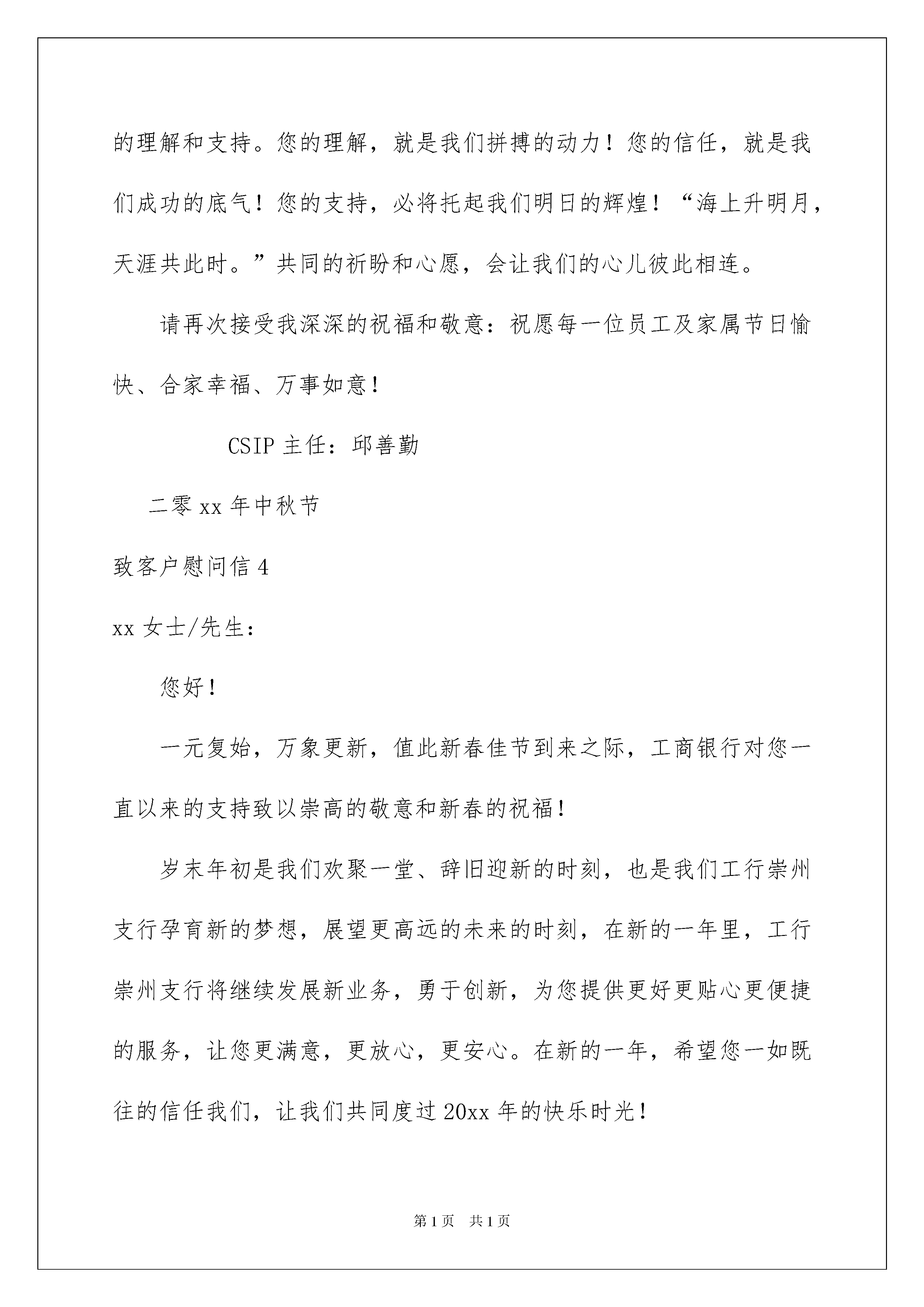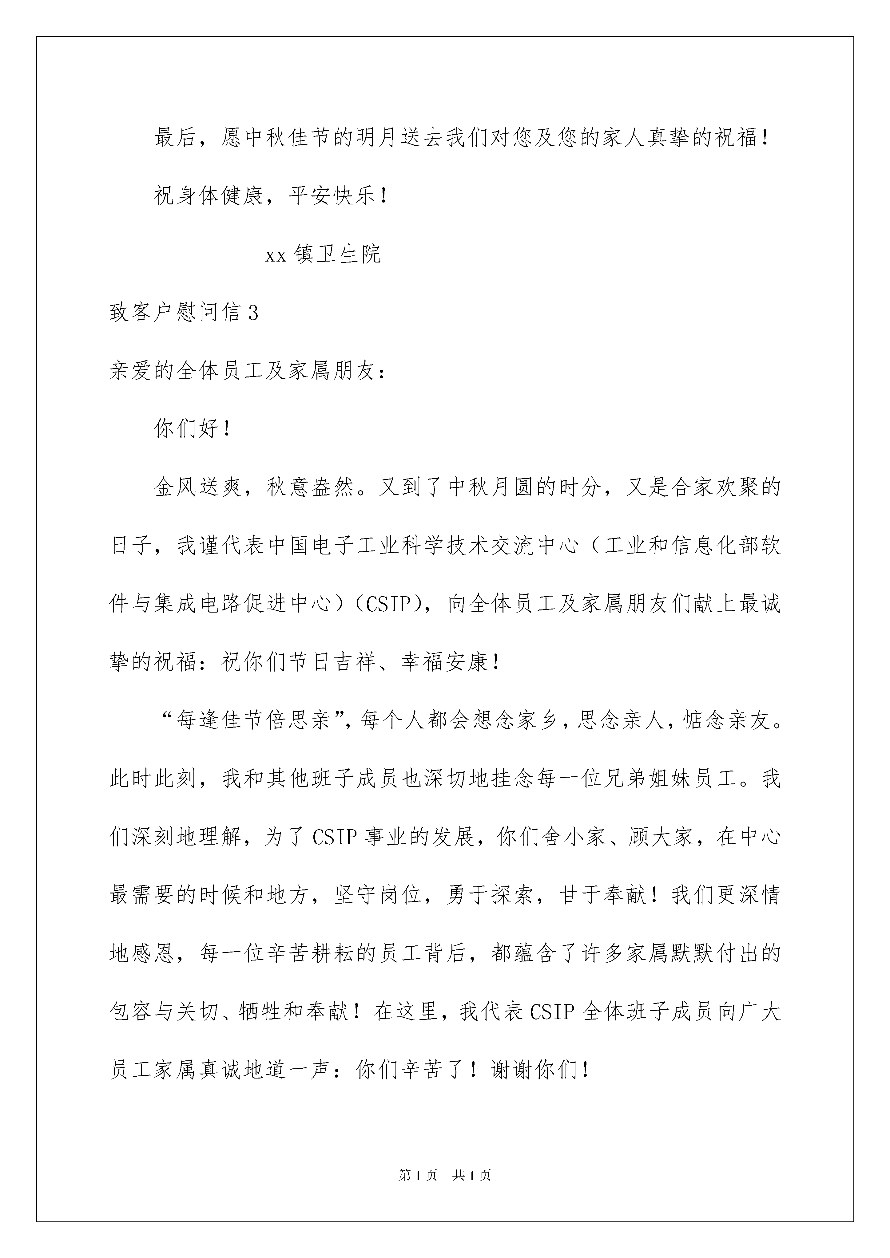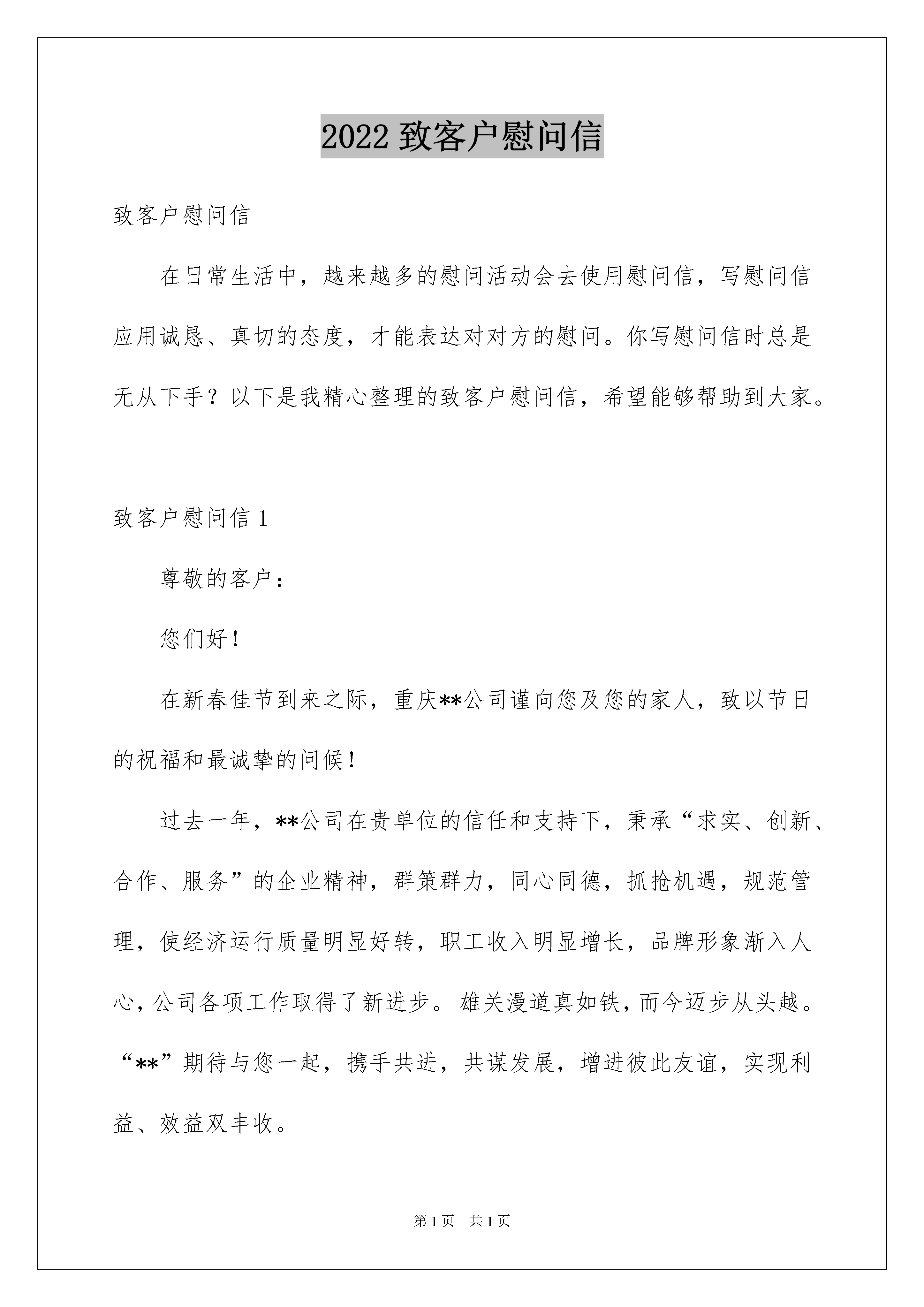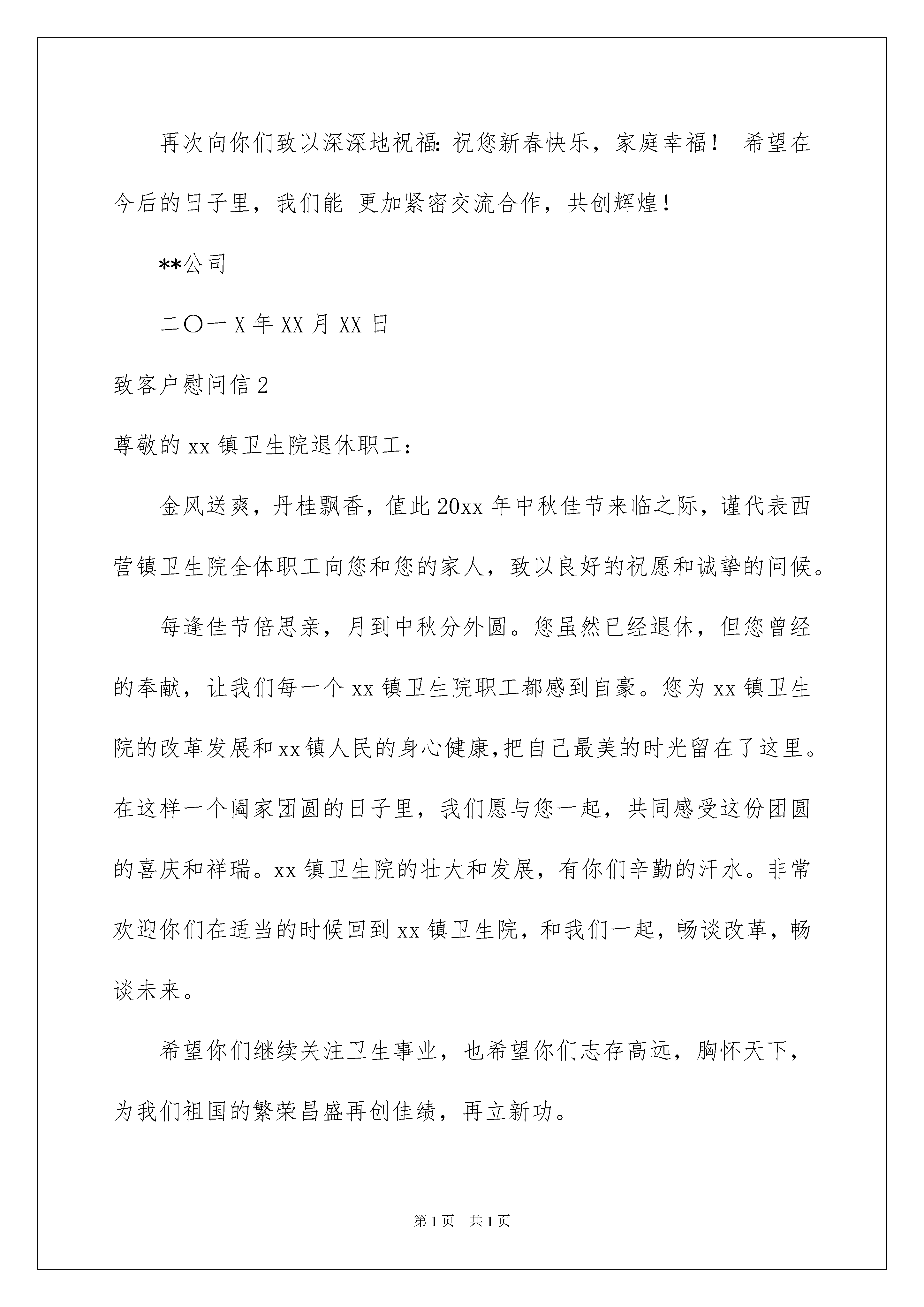 2022致客户慰问信致客户慰问信在日常生活中,越来越多的慰问活动会去使用慰问信,写慰问信应用诚恳、真切的态度,才能表达对对方的慰问。你写慰问信时总是无从下手?以下是我精心整理的致客户慰问信,希望能够帮助到大家。致客户慰问信1尊敬的客户:您们好!在新春佳节到来之际,重庆**公司谨向您及您的家人,致以节日的祝福和最诚挚的问候!过去一年,**公司在贵单位的信任和支持下,秉承“求实、创新、合作、服务”的企业精神,群策群力,同心同德,抓抢机遇,规范管理,使经济运行质量明显好转,职工收入明显增长,品牌形象渐入人心,公司各项工作取得了新进步。雄关漫道真如铁,而今迈步从头越。“**”期待与您一起,携手共进,共谋发展,增进彼此友谊,实现利益、效益双丰收。再次向你们致以深深地祝福:祝您新春快乐,家庭幸福!希望在今后的日子里,我们能更加紧密交流合作,共创辉煌!**公司二〇一X年XX月XX日致客户慰问信2尊敬的xx镇卫生院退休职工:金风送爽,丹桂飘香,值此20xx年中秋佳节来临之际,谨代表西营镇卫生院全体职工向您和您的家人,致以良好的祝愿和诚挚的问候。每逢佳节倍思亲,月到中秋分外圆。您虽然已经退休,但您曾经的奉献,让我们每一个xx镇卫生院职工都感到自豪。您为xx镇卫生院的改革发展和xx镇人民的身心健康,把自己最美的时光留在了这里。在这样一个阖家团圆的日子里,我们愿与您一起,共同感受这份团圆的喜庆和祥瑞。xx镇卫生院的壮大和发展,有你们辛勤的汗水。非常欢迎你们在适当的时候回到xx镇卫生院,和我们一起,畅谈改革,畅谈未来。希望你们继续关注卫生事业,也希望你们志存高远,胸怀天下,为我们祖国的繁荣昌盛再创佳绩,再立新功。最后,愿中秋佳节的明月送去我们对您及您的家人真挚的祝福!祝身体健康,平安快乐!xx镇卫生院致客户慰问信3亲爱的全体员工及家属朋友:你们好!金风送爽,秋意盎然。又到了中秋月圆的时分,又是合家欢聚的日子,我谨代表中国电子工业科学技术交流中心(工业和信息化部软件与集成电路促进中心)(CSIP),向全体员工及家属朋友们献上最诚挚的祝福:祝你们节日吉祥、幸福安康!“每逢佳节倍思亲”,每个人都会想念家乡,思念亲人,惦念亲友。此时此刻,我和其他班子成员也深切地挂念每一位兄弟姐妹员工。我们深刻地理解,为了CSIP事业的发展,你们舍小家、顾大家,在中心最需要的时候和地方,坚守岗位,勇于探索,甘于奉献!我们更深情地感恩,每一位辛苦耕耘的员工背后,都蕴含了许多家属默默付出的包容与关切、牺牲和奉献!在这里,我代表CSIP全体班子成员向广大员工家属真诚地道一声:你们辛苦了!谢谢你们!弹指间,我与大家已经一起携手走过六载征程,共同见证了CSIP破茧成蝶的辉煌历程。六年来,CSIP从一张白纸,发展成为资产达两亿、员工近二百人、业务遍及全国各地、受到业界广为赞誉的部属事业单位,这是全体员工同心同德、励精图治、共同努力的结果,也饱含着员工家属的无私支持和倾情奉献,这是我们大家共同的荣耀。回望六年的风雨,成绩属于过去;展望未来,我们充满必胜的豪情!当下正值中国电子工业科学技术交流中心、工业和信息化部软件与集成电路促进中心合并整合之际,新班子,新起点,新气象,前进的道路充满机遇和挑战,我坚信,每一个CSIP员工都会继续秉承“奉献创新务实卓越”的理念,始终保持一种昂扬向上、奋发有为的精神状态,坚持一贯的勤奋认真与团结求实,志存高远,精诚合作,以更加饱满的激情和更加专业的水准投入到工作中,共同打造“中国赛普”新品牌,团结开创CSIP的美好未来!而我,也将会团结班子成员,继续优化整合现有资源,为员工想得更多、更细,从物质上、精神上尽力为大家营造一个良好的工作氛围!CSIP必能公平、公正地给每一位员工,提供更为广阔的发展空间和展示才华的舞台!尊敬的每一位员工家属:CSIP的发展和进步,离不开您一如既往的理解和支持。您的理解,就是我们拼搏的动力!您的信任,就是我们成功的底气!您的支持,必将托起我们明日的辉煌!“海上升明月,天涯共此时。”共同的祈盼和心愿,会让我们的心儿彼此相连。请再次接受我深深的祝福和敬意:祝愿每一位员工及家属节日愉快、合家幸福、万事如意!CSIP主任:邱善勤二零xx年中秋节致客户慰问信4xx女士/先生:您好!一元复始,万象更新,值此新春佳节到来之际,工商银行对您一直以来的支持致以崇高的敬意和新春的祝福!岁末年初是我们欢聚一堂、辞旧迎新的时刻,也是我们工行崇州支行孕育新的梦想,展望更高远的未来的时刻,在新的一年里,工行崇州支行将继续发展新业务,勇于创新,为您提供更好更贴心更便捷的服务,让您更满意,更放心,更安心。在新的