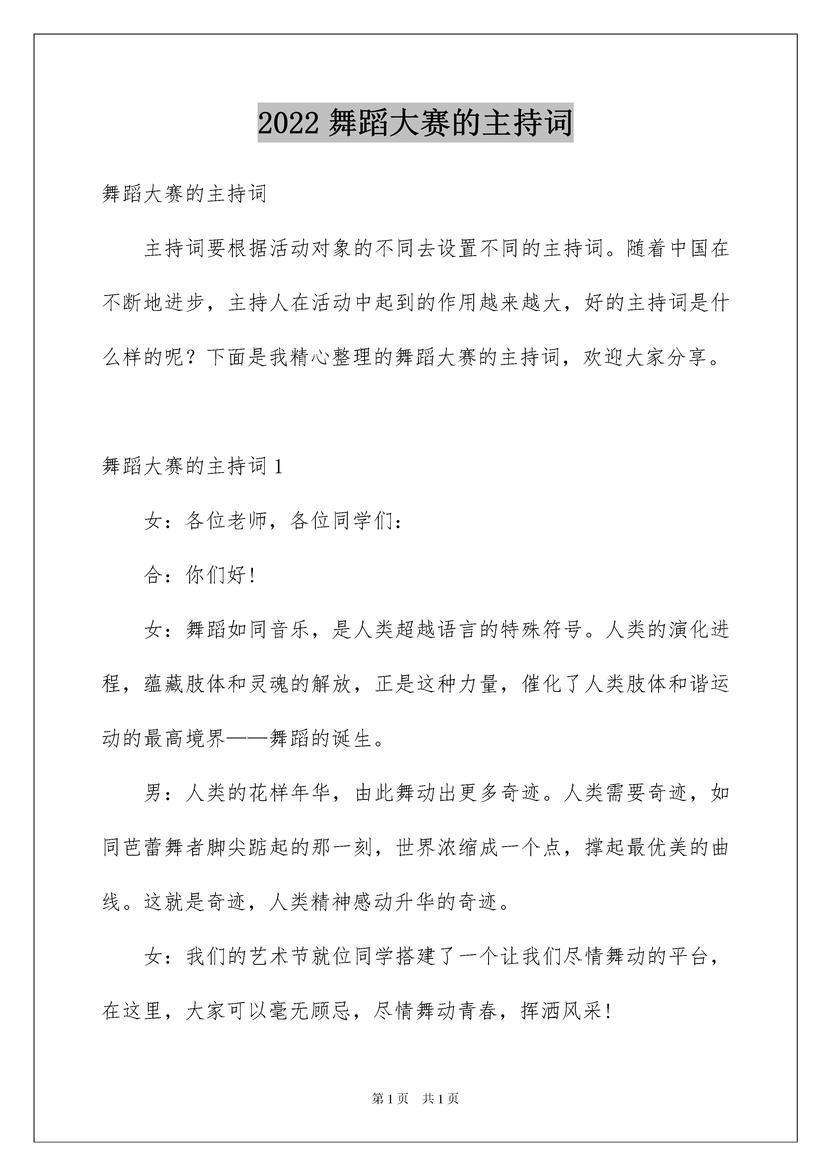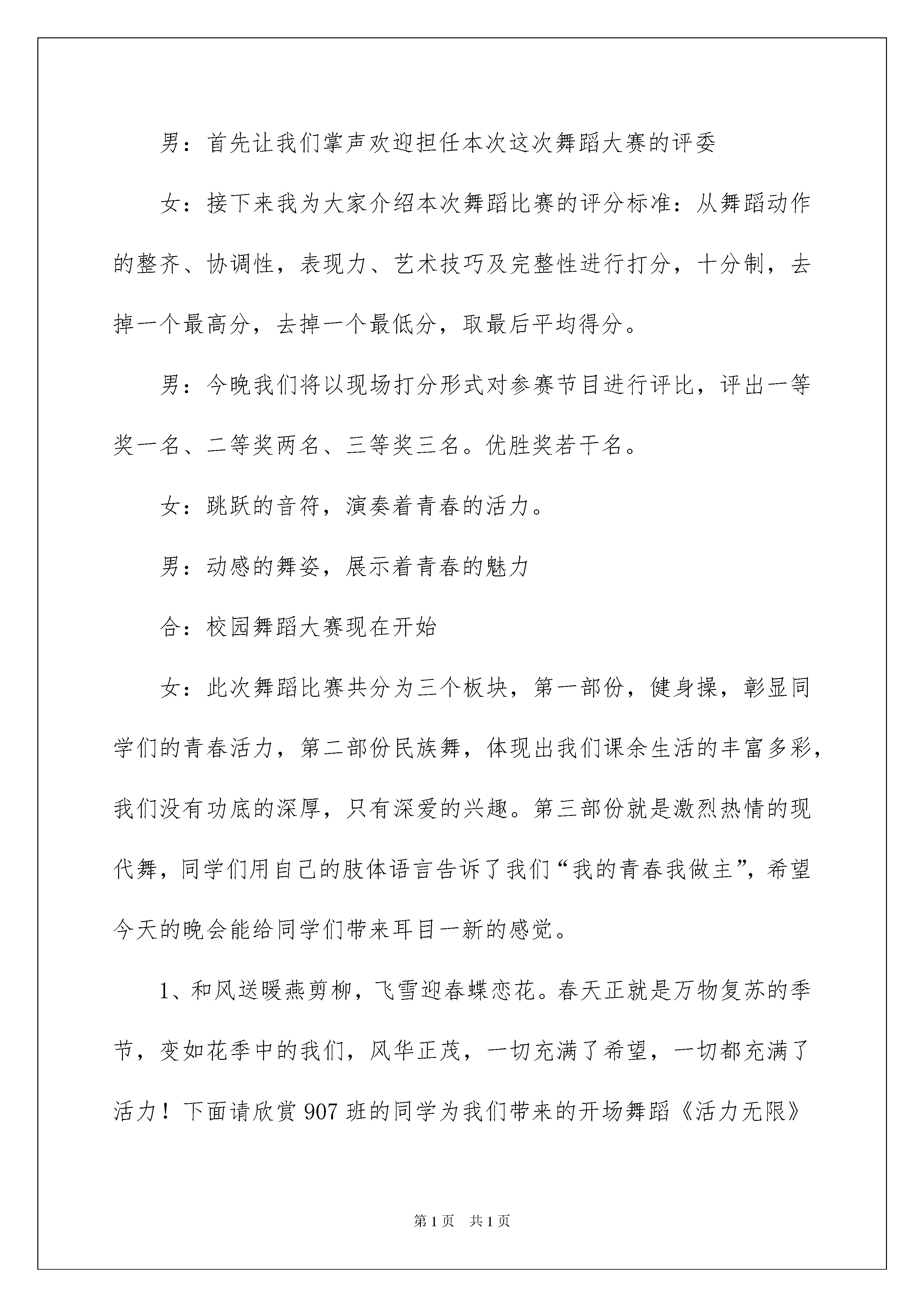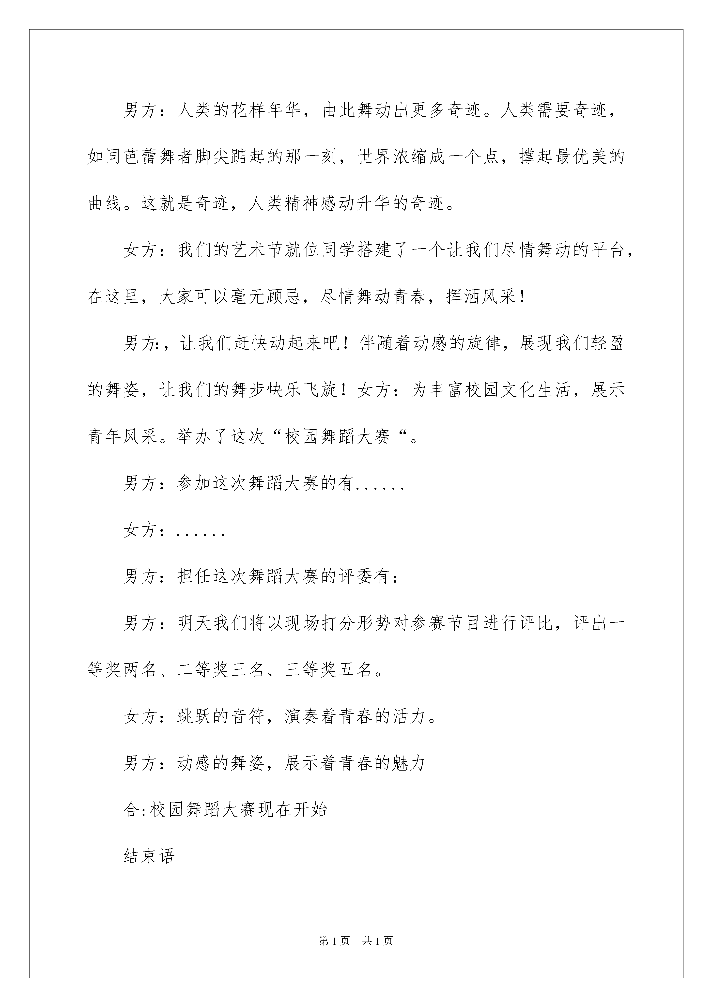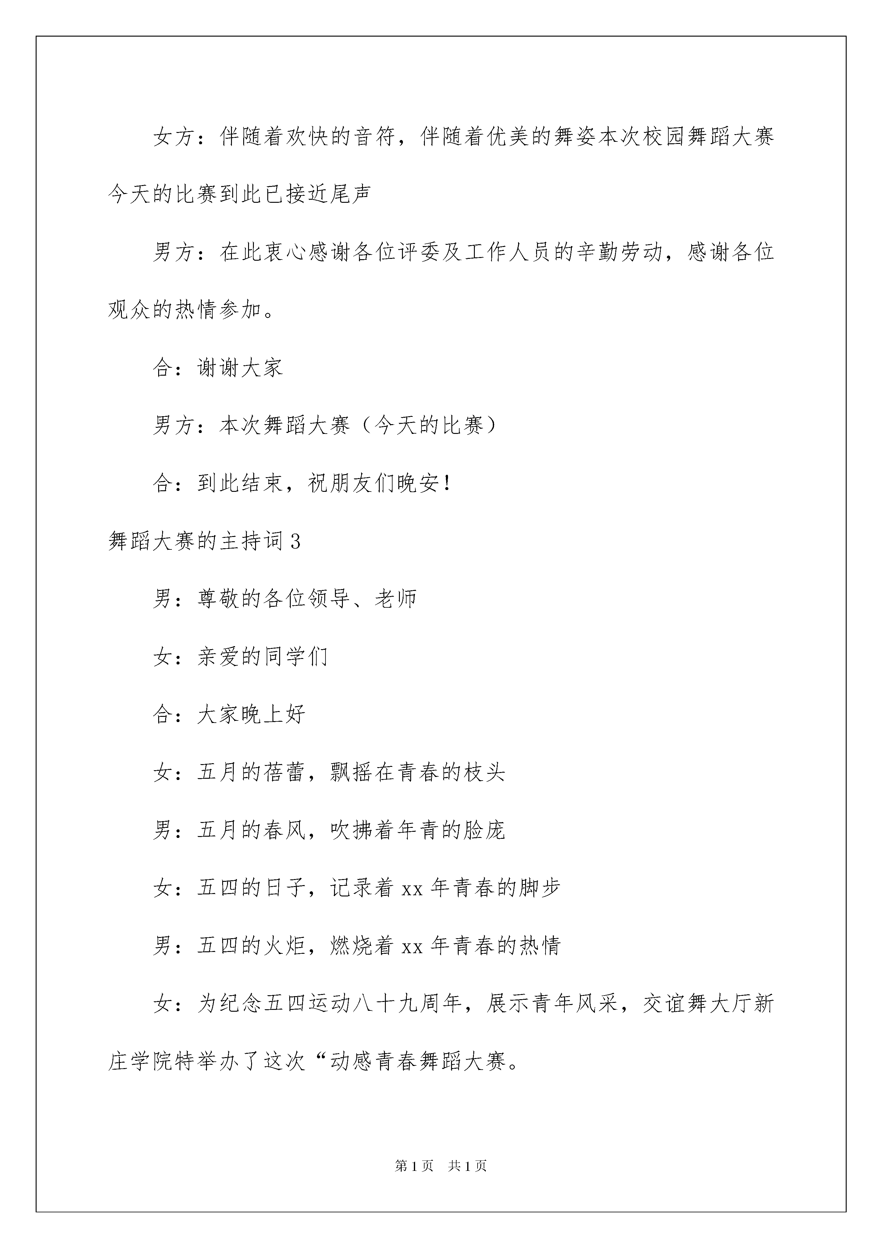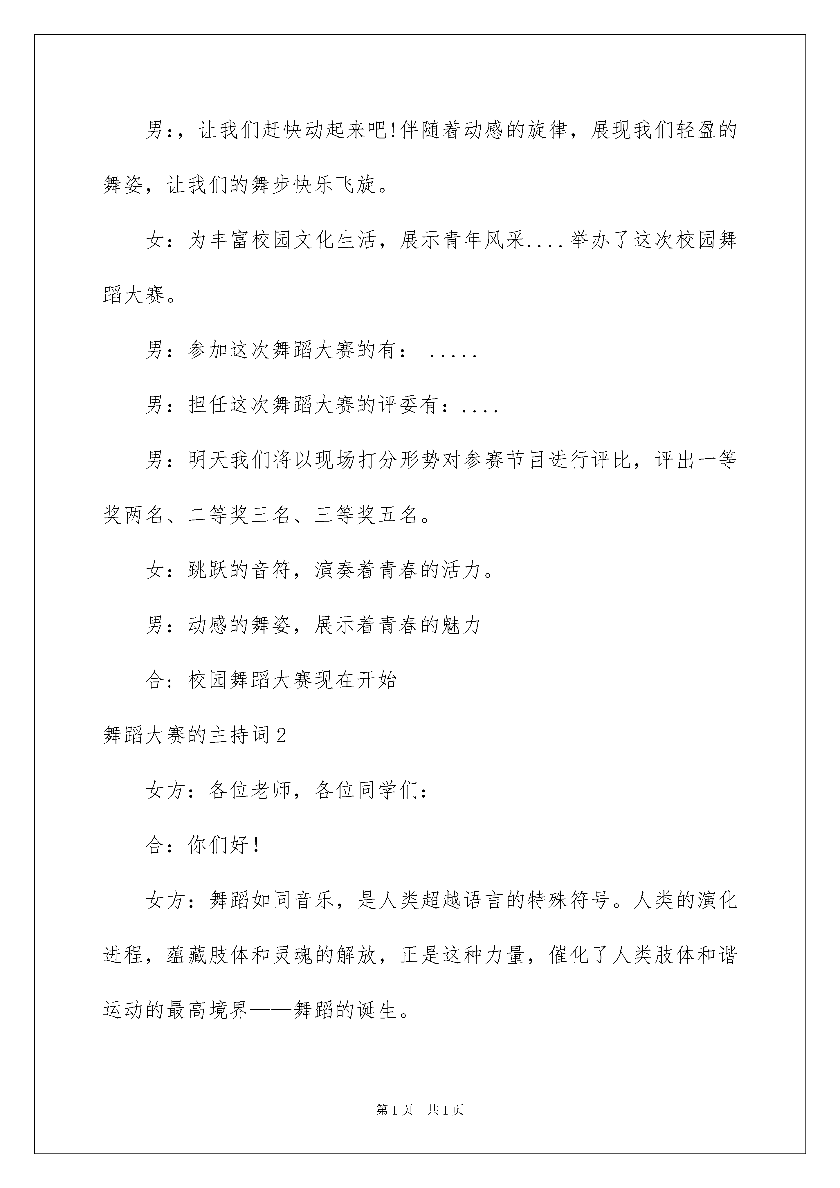 2022舞蹈大赛的主持词舞蹈大赛的主持词主持词要根据活动对象的不同去设置不同的主持词。随着中国在不断地进步,主持人在活动中起到的作用越来越大,好的主持词是什么样的呢?下面是我精心整理的舞蹈大赛的主持词,欢迎大家分享。舞蹈大赛的主持词1女:各位老师,各位同学们:合:你们好!女:舞蹈如同音乐,是人类超越语言的特殊符号。人类的演化进程,蕴藏肢体和灵魂的解放,正是这种力量,催化了人类肢体和谐运动的最高境界——舞蹈的诞生。男:人类的花样年华,由此舞动出更多奇迹。人类需要奇迹,如同芭蕾舞者脚尖踮起的那一刻,世界浓缩成一个点,撑起最优美的曲线。这就是奇迹,人类精神感动升华的奇迹。女:我们的艺术节就位同学搭建了一个让我们尽情舞动的平台,在这里,大家可以毫无顾忌,尽情舞动青春,挥洒风采!男:,让我们赶快动起来吧!伴随着动感的旋律,展现我们轻盈的舞姿,让我们的舞步快乐飞旋。女:为丰富校园文化生活,展示青年风采....举办了这次校园舞蹈大赛。男:参加这次舞蹈大赛的有:.....男:担任这次舞蹈大赛的评委有:....男:明天我们将以现场打分形势对参赛节目进行评比,评出一等奖两名、二等奖三名、三等奖五名。女:跳跃的音符,演奏着青春的活力。男:动感的舞姿,展示着青春的魅力合:校园舞蹈大赛现在开始舞蹈大赛的主持词2女方:各位老师,各位同学们:合:你们好!女方:舞蹈如同音乐,是人类超越语言的特殊符号。人类的演化进程,蕴藏肢体和灵魂的解放,正是这种力量,催化了人类肢体和谐运动的最高境界——舞蹈的诞生。男方:人类的花样年华,由此舞动出更多奇迹。人类需要奇迹,如同芭蕾舞者脚尖踮起的那一刻,世界浓缩成一个点,撑起最优美的曲线。这就是奇迹,人类精神感动升华的奇迹。女方:我们的艺术节就位同学搭建了一个让我们尽情舞动的平台,在这里,大家可以毫无顾忌,尽情舞动青春,挥洒风采!男方:,让我们赶快动起来吧!伴随着动感的旋律,展现我们轻盈的舞姿,让我们的舞步快乐飞旋!女方:为丰富校园文化生活,展示青年风采。举办了这次“校园舞蹈大赛“。男方:参加这次舞蹈大赛的有......女方:......男方:担任这次舞蹈大赛的评委有:男方:明天我们将以现场打分形势对参赛节目进行评比,评出一等奖两名、二等奖三名、三等奖五名。女方:跳跃的音符,演奏着青春的活力。男方:动感的舞姿,展示着青春的魅力合:校园舞蹈大赛现在开始结束语女方:伴随着欢快的音符,伴随着优美的舞姿本次校园舞蹈大赛今天的比赛到此已接近尾声男方:在此衷心感谢各位评委及工作人员的辛勤劳动,感谢各位观众的热情参加。合:谢谢大家男方:本次舞蹈大赛(今天的比赛)合:到此结束,祝朋友们晚安!舞蹈大赛的主持词3男:尊敬的各位领导、老师女:亲爱的同学们合:大家晚上好女:五月的蓓蕾,飘摇在青春的枝头男:五月的春风,吹拂着年青的脸庞女:五四的日子,记录着xx年青春的脚步男:五四的火炬,燃烧着xx年青春的热情女:为纪念五四运动八十九周年,展示青年风采,交谊舞大厅新庄学院特举办了这次“动感青春舞蹈大赛。男:首先让我们掌声欢迎担任本次这次舞蹈大赛的评委女:接下来我为大家介绍本次舞蹈比赛的评分标准:从舞蹈动作的整齐、协调性,表现力、艺术技巧及完整性进行打分,十分制,去掉一个最高分,去掉一个最低分,取最后平均得分。男:今晚我们将以现场打分形式对参赛节目进行评比,评出一等奖一名、二等奖两名、三等奖三名。优胜奖若干名。女:跳跃的音符,演奏着青春的活力。男:动感的舞姿,展示着青春的魅力合:校园舞蹈大赛现在开始女:此次舞蹈比赛共分为三个板块,第一部份,健身操,彰显同学们的青春活力,第二部份民族舞,体现出我们课余生活的丰富多彩,我们没有功底的深厚,只有深爱的兴趣。第三部份就是激烈热情的现代舞,同学们用自己的肢体语言告诉了我们“我的青春我做主”,希望今天的晚会能给同学们带来耳目一新的感觉。1、和风送暖燕剪柳,飞雪迎春蝶恋花。春天正就是万物复苏的季节,变如花季中的我们,风华正茂,一切充满了希望,一切都充满了活力!下面请欣赏907班的同学为我们带来的开场舞蹈《活力无限》2、904,5,7班的同学马上就要离开学校步入社会了,相信他们已将自己全部的精力都准备好投入到新的生活方式中去。此刻不拼搏,更待何时?下面请欣赏由904班的健儿们为我们带来尽显真我风彩的《搏击操》表演。3、人们常说:“笑一笑,十年少”可偏偏就有那么一些人对此有另外的说法,到底就是“笑比哭好”还就是“哭比笑好”让我们听听104班同学为我们带来的精彩辩论。4、舞蹈就是八大艺术之一,就是于三度空间中以身体为语言作心智交流现象之人体的运动表达艺术,以有节奏的动作为主